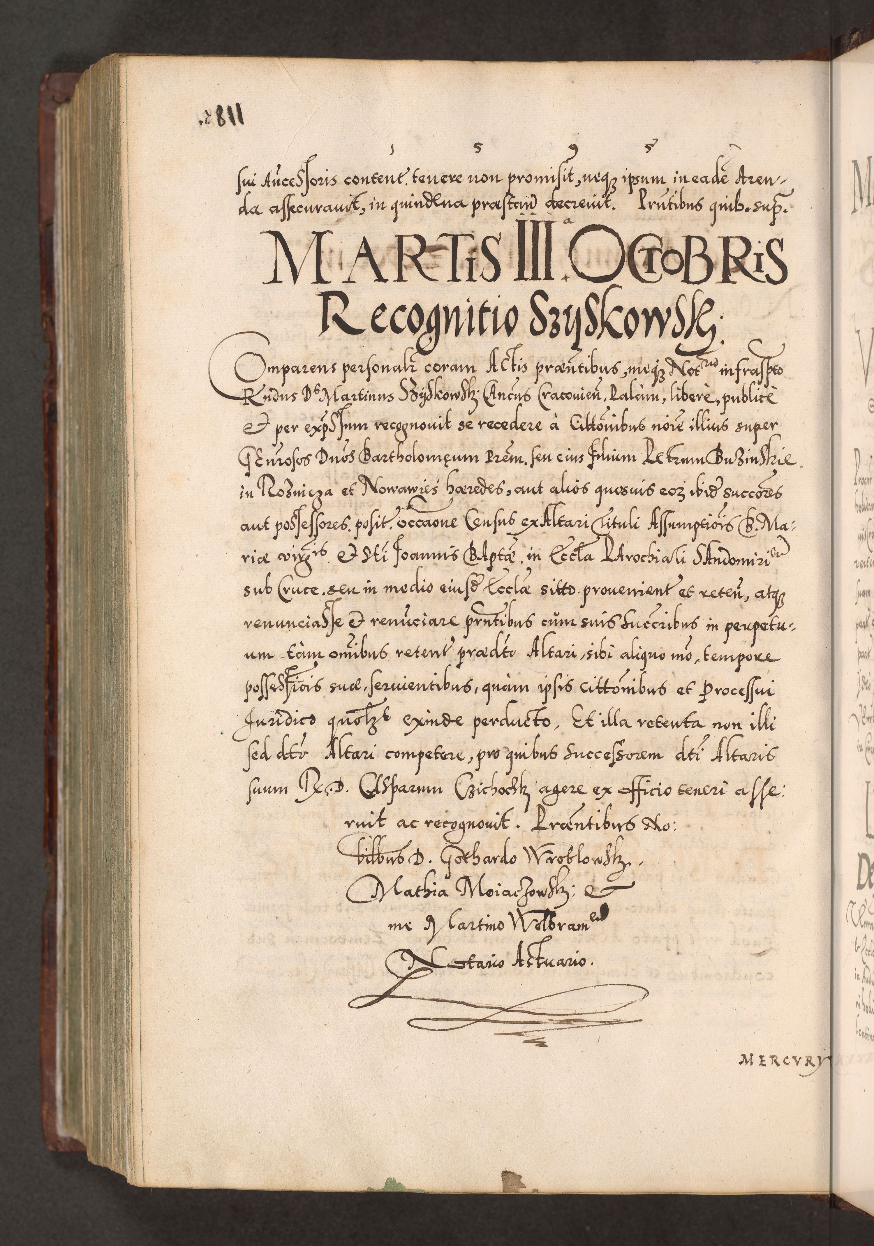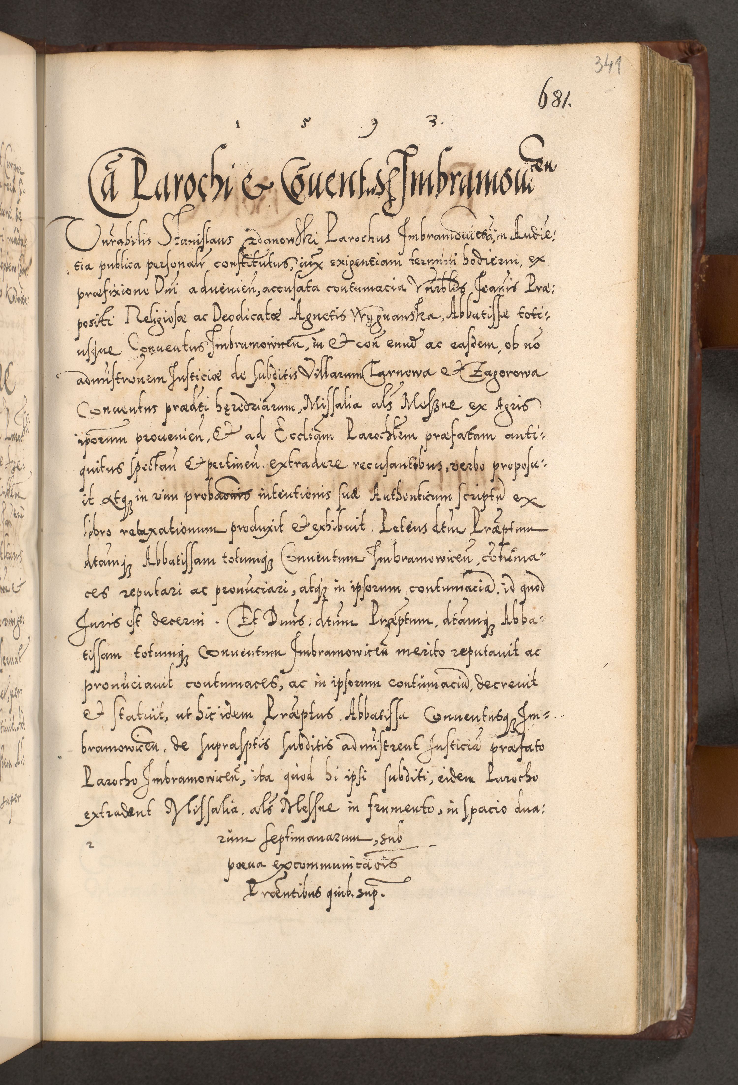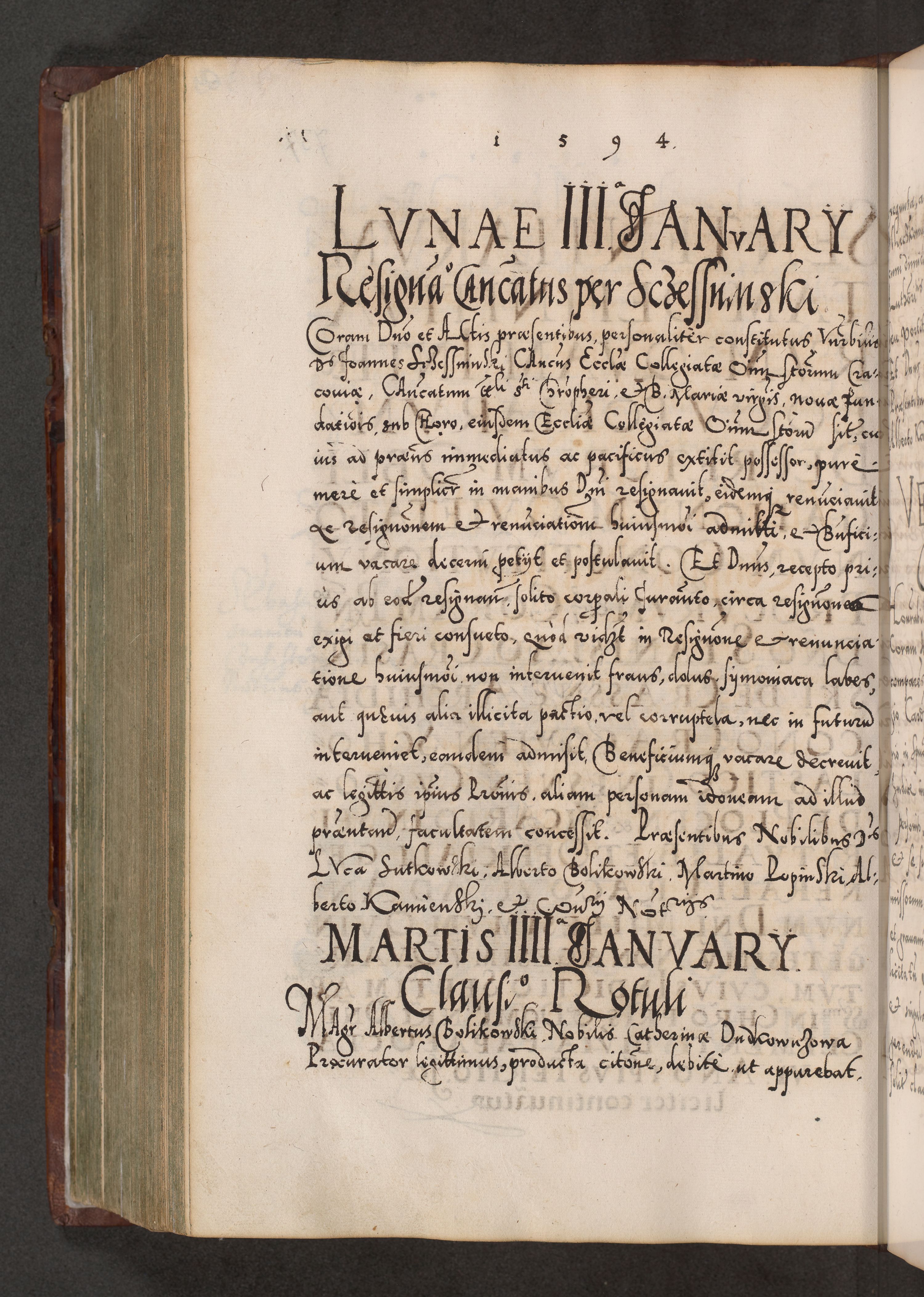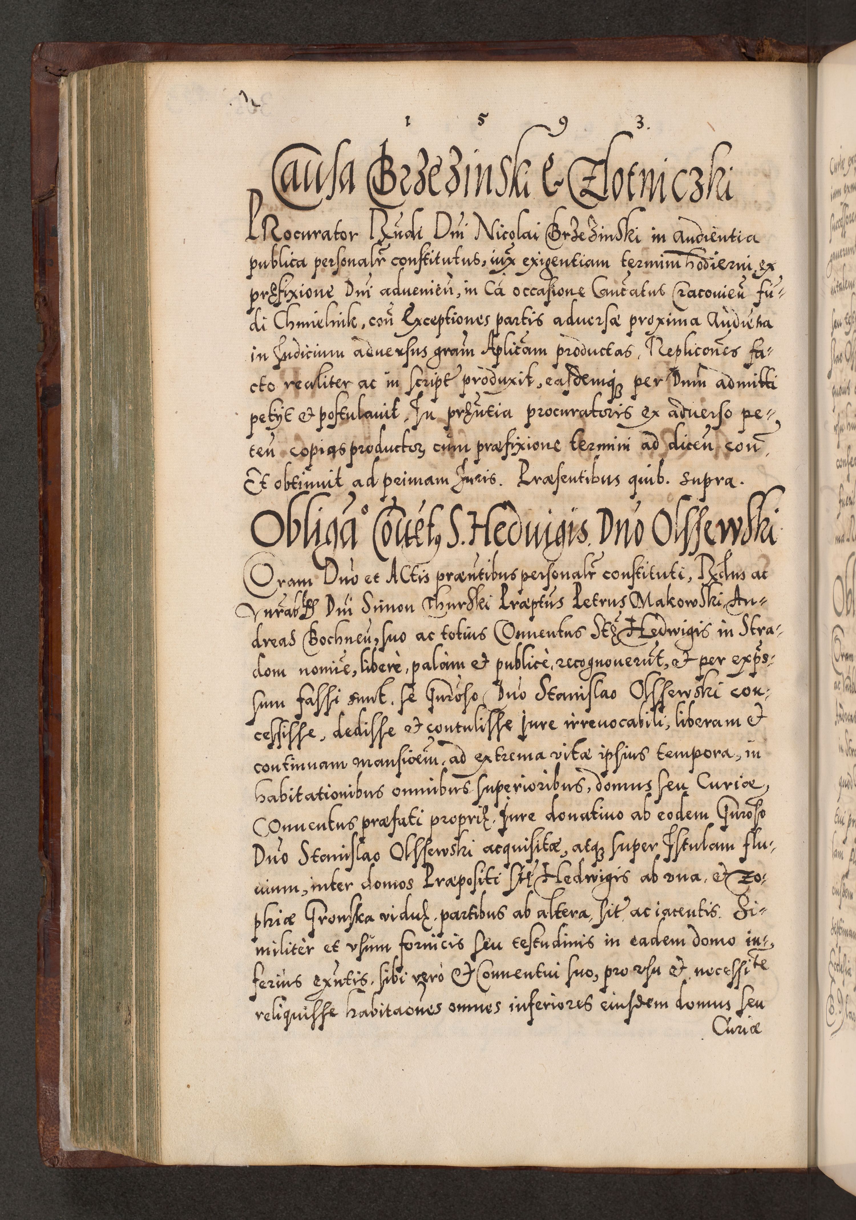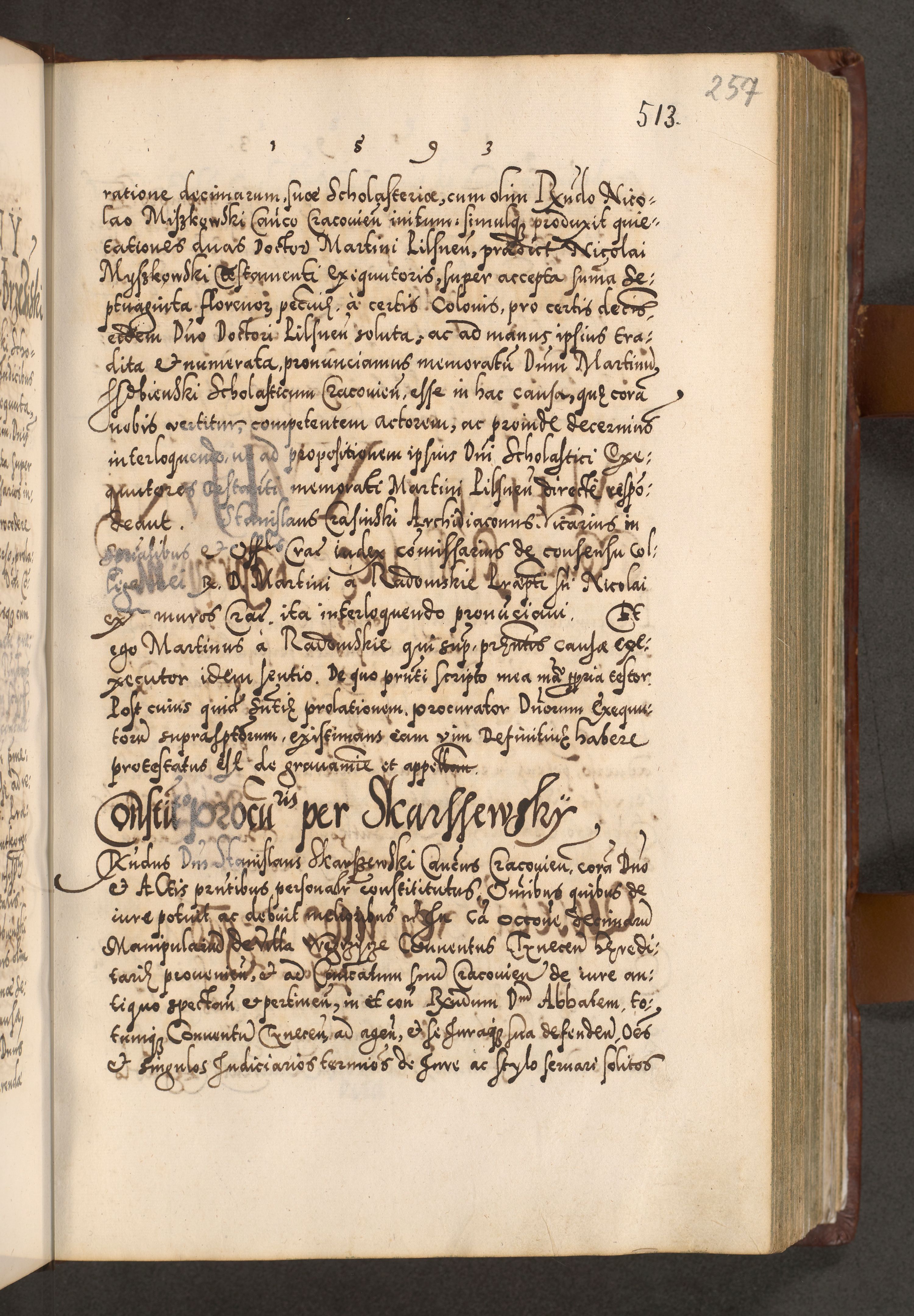Illistrissimo et revedissimo in Christo Patre Domino Domino Georgio Rzadziwił Miserone Divina Sacrostae R. E. Tituli S. Sixti Presbitero Cardinali Duce in Olyka et Niesswiesz ad Gubernacula Ecclessiae Cracoviensis cuius administratorialem a Sancta Sede Apostolica obtinverat feliciter sedente. Acta actorum, causarum, sententiarum tam deffinitivarum quam interloquutoriarum decretorum, obligationum, quietationum, recognitionum, constitutionum procuratorum etc. coram Reverendo Domino Stanislao Crassinskz de Crasne Archidiacono Cracoviensis, Scholastico Gnesnesis, Custode Plocensis etc. Vicario et Officiali Generali Cracoviensi in Ano Domini Millesimo Quingentesimo Nonagesimo Primo cuius indictio quarta pontificatus SS. Domini Nostri Gregorii XIIII Anno I psius prio feliciter incipiut