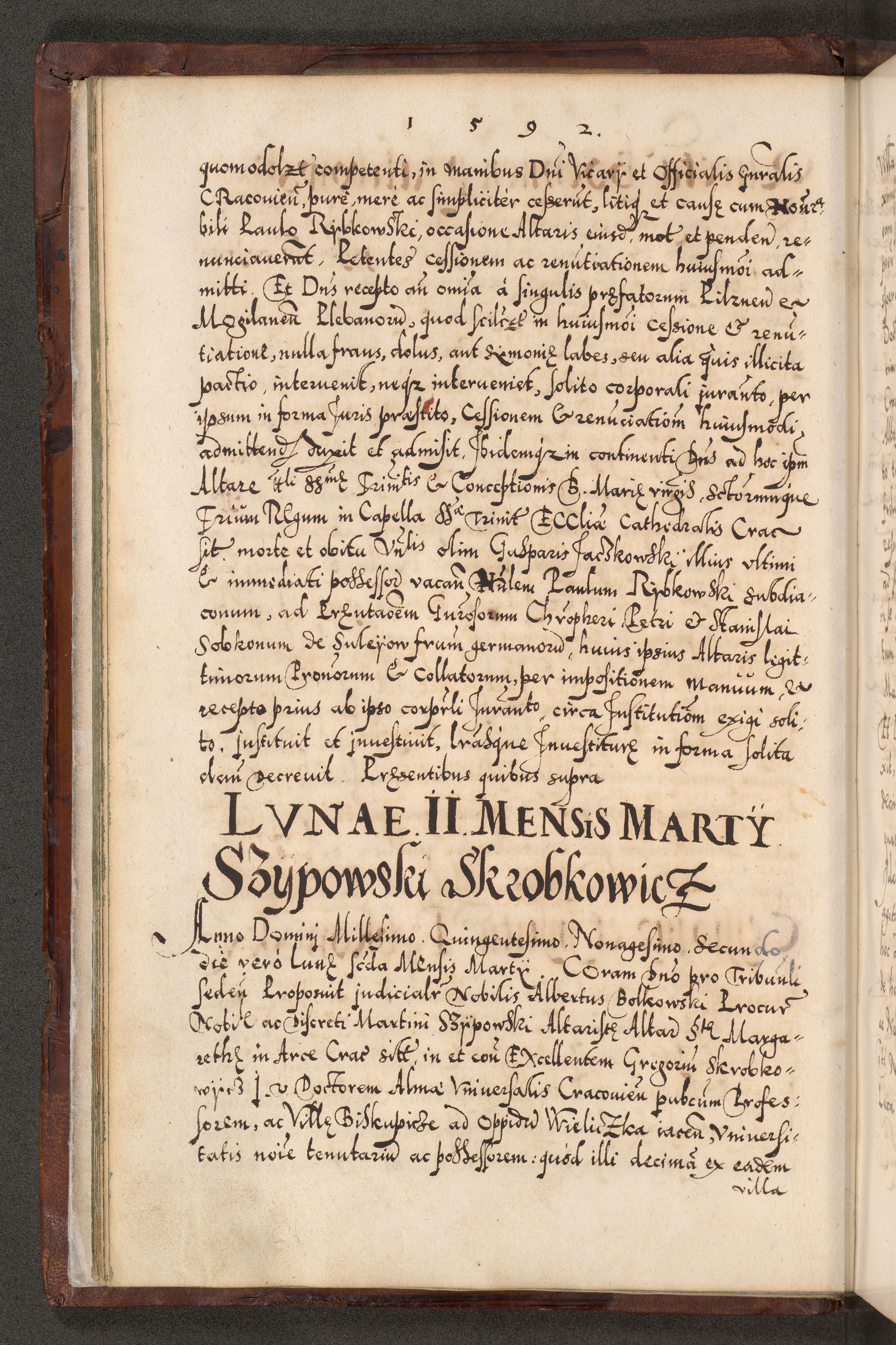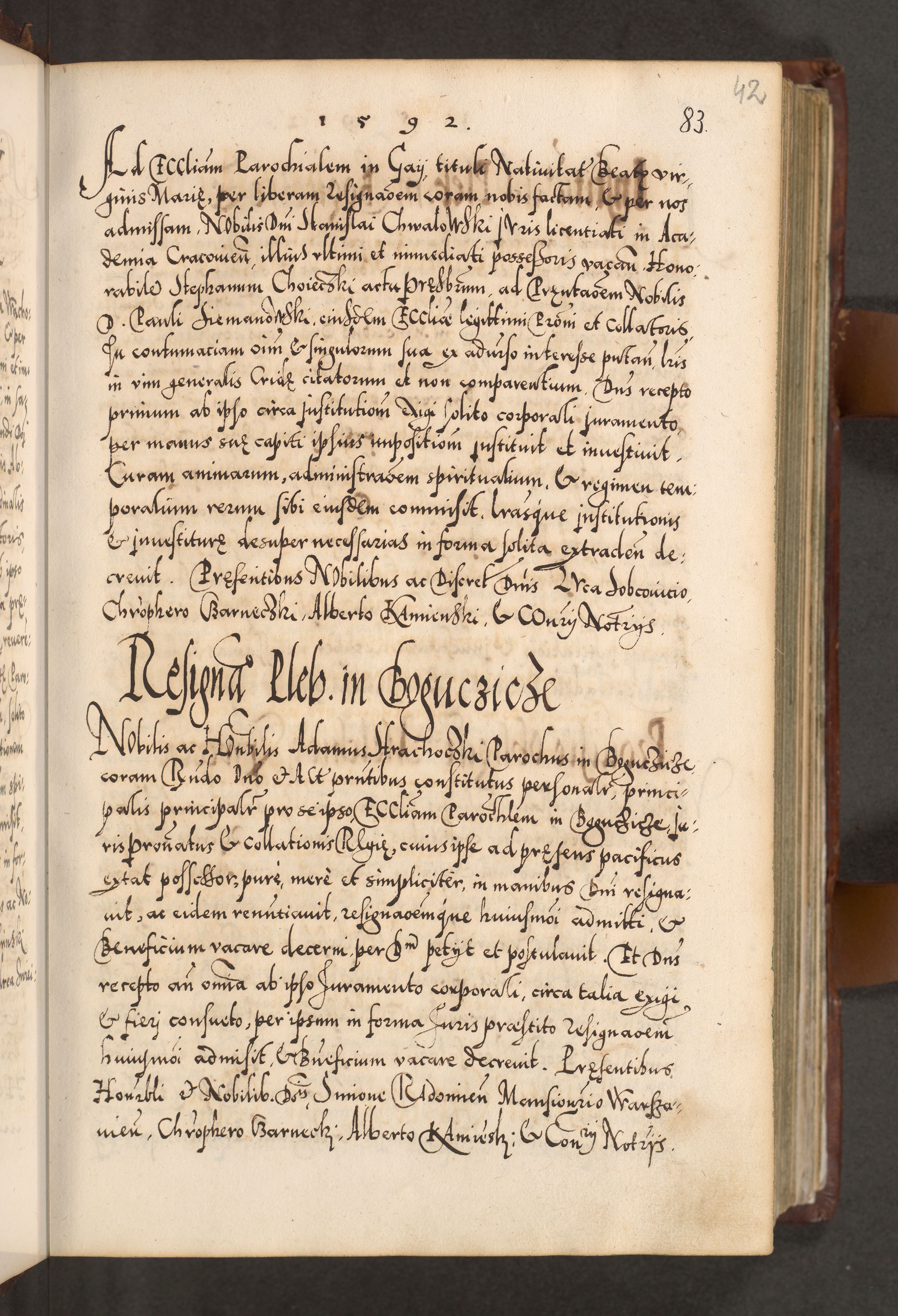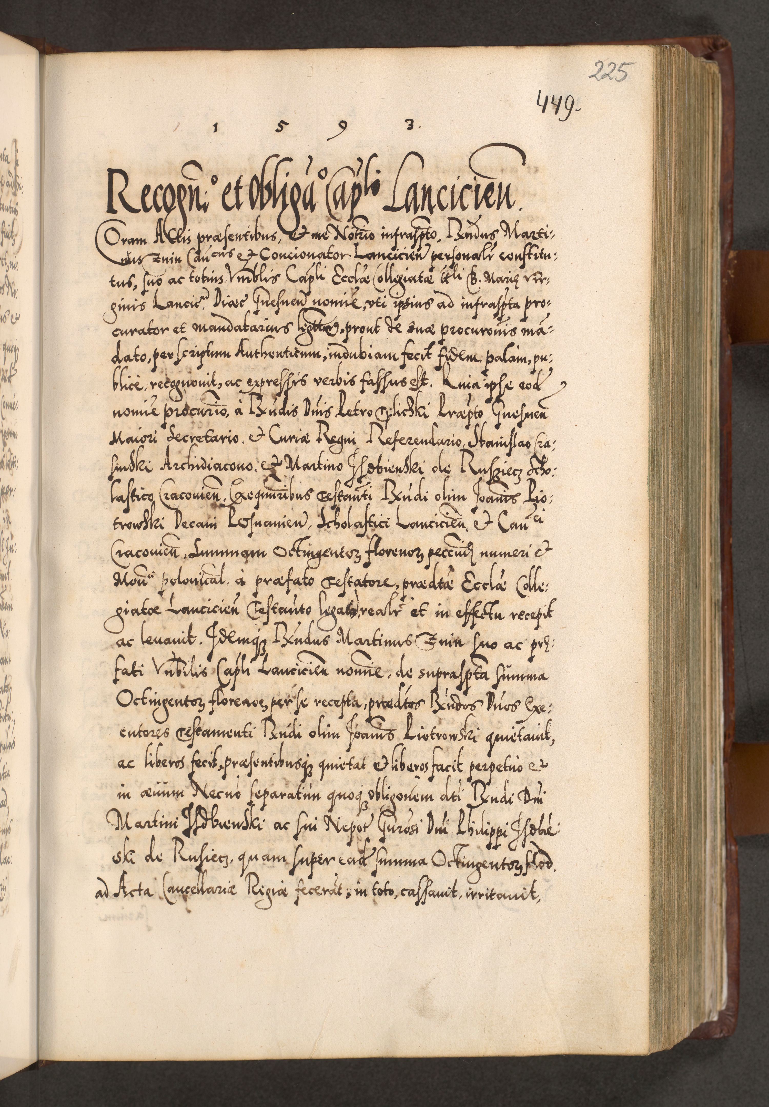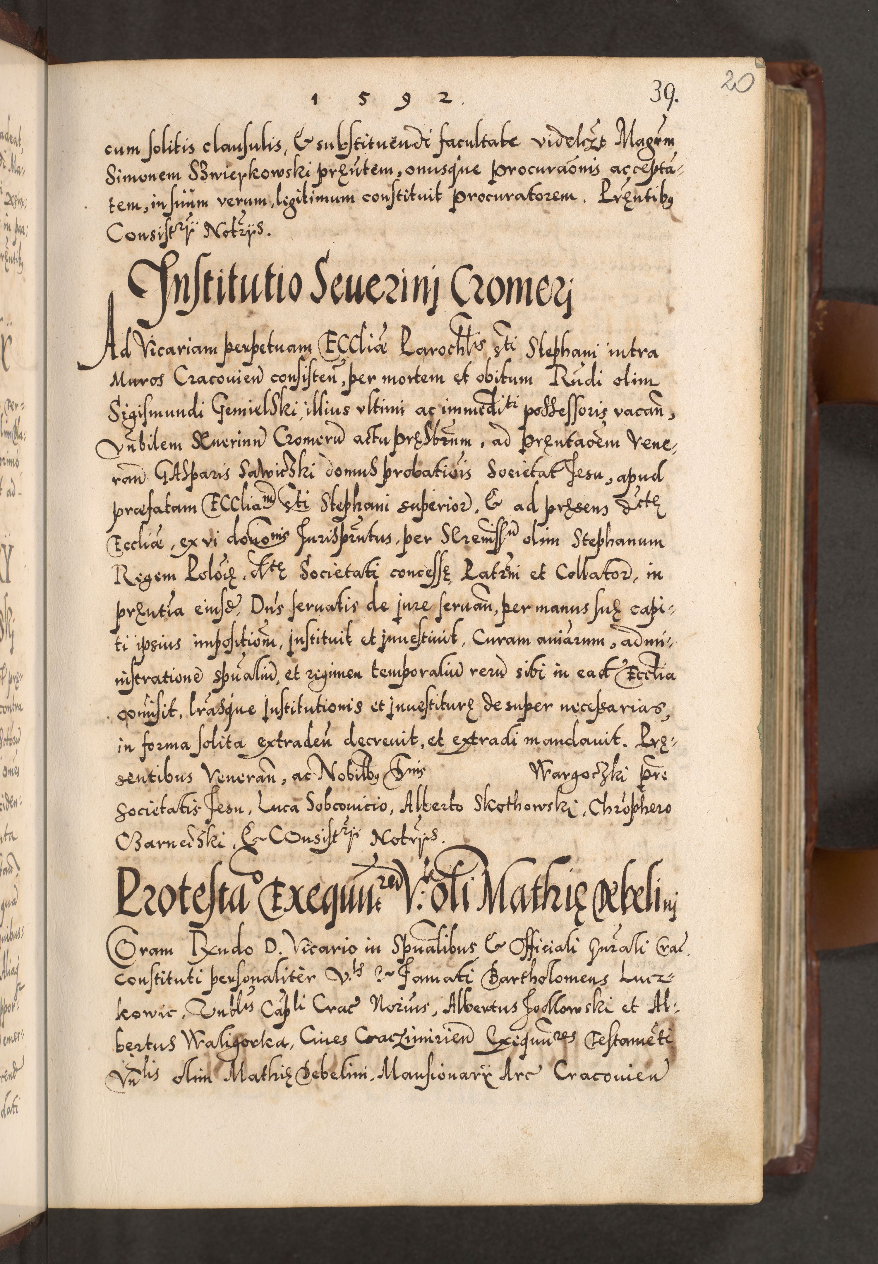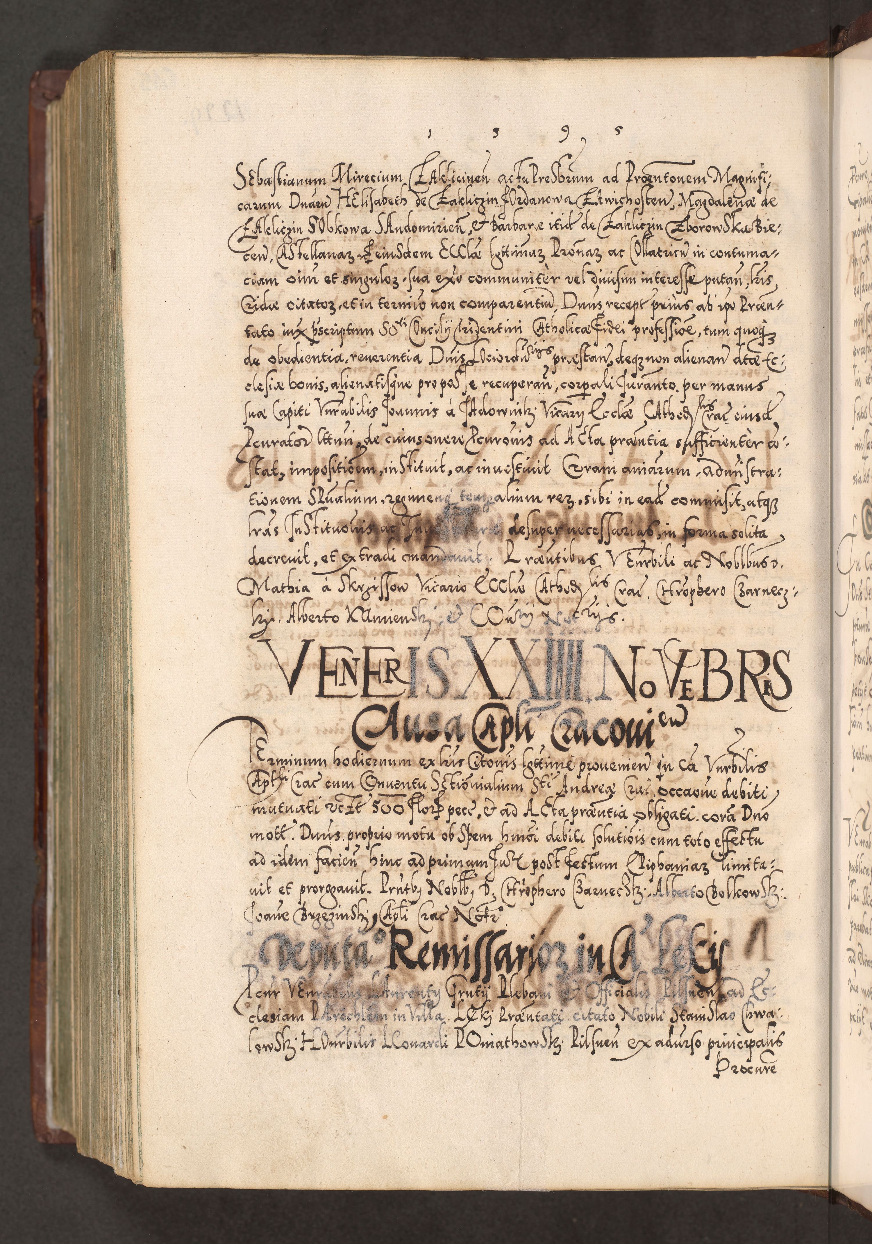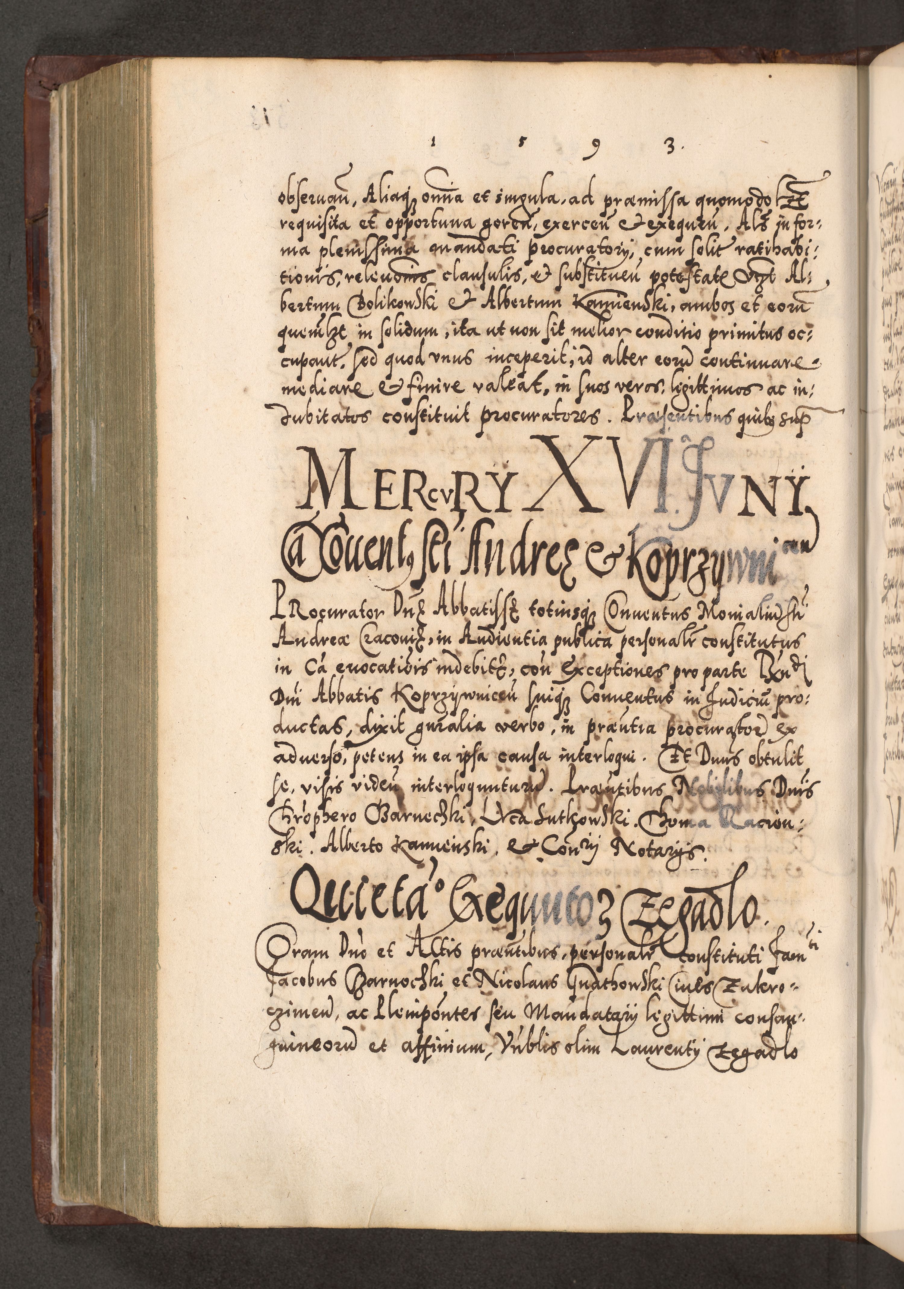 Illistrissimo et revedissimo in Christo Patre Domino Domino Georgio Rzadziwił Miserone Divina Sacrostae R. E. Tituli S. Sixti Presbitero Cardinali Duce in Olyka et Niesswiesz ad Gubernacula Ecclessiae Cracoviensis cuius administratorialem a Sancta Sede Apostolica obtinverat feliciter sedente. Acta actorum, causarum, sententiarum tam deffinitivarum quam interloquutoriarum decretorum, obligationum, quietationum, recognitionum, constitutionum procuratorum etc. coram Reverendo Domino Stanislao Crassinskz de Crasne Archidiacono Cracoviensis, Scholastico Gnesnesis, Custode Plocensis etc. Vicario et Officiali Generali Cracoviensi in Ano Domini Millesimo Quingentesimo Nonagesimo Primo cuius indictio quarta pontificatus SS. Domini Nostri Gregorii XIIII Anno I psius prio feliciter incipiut
