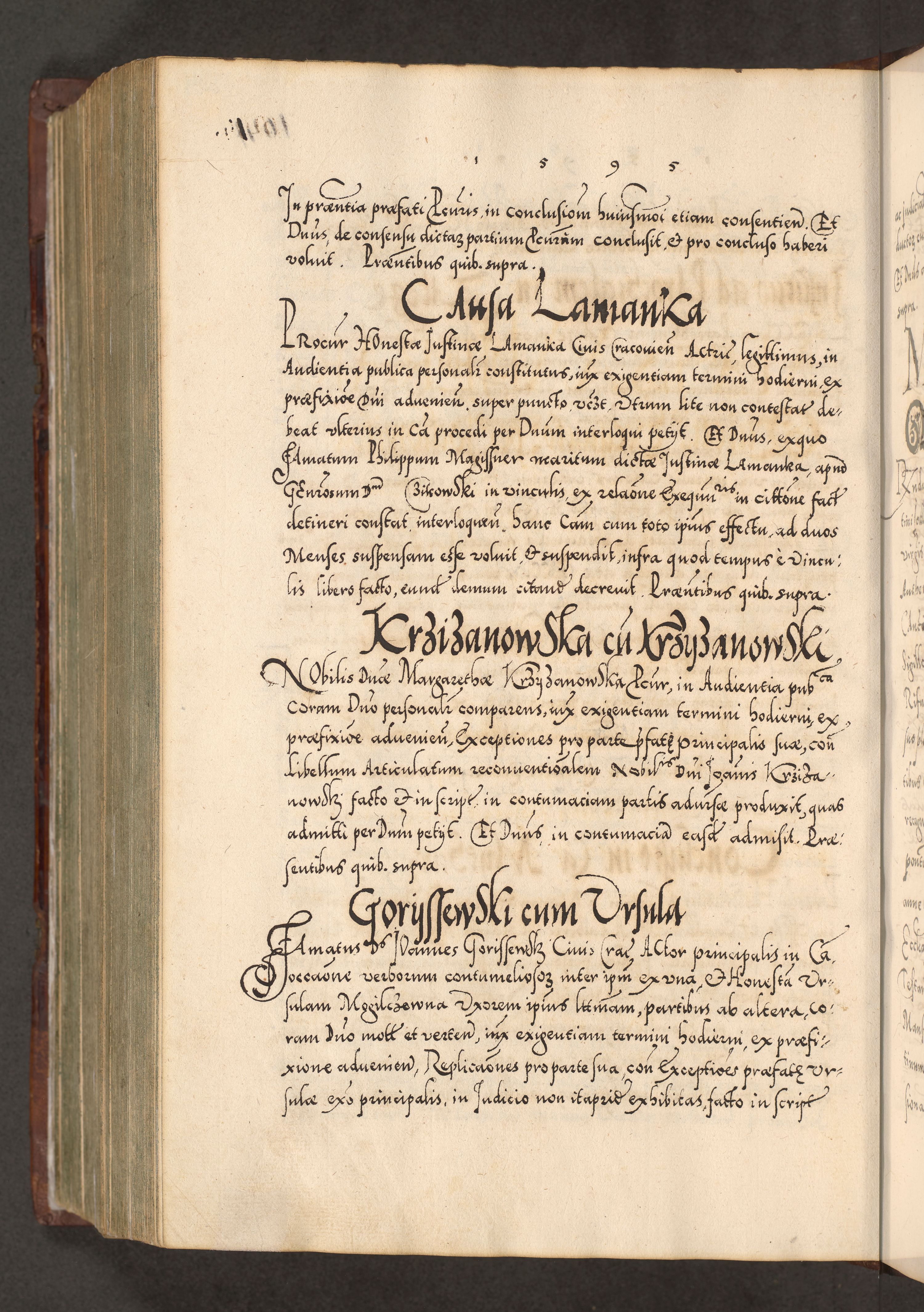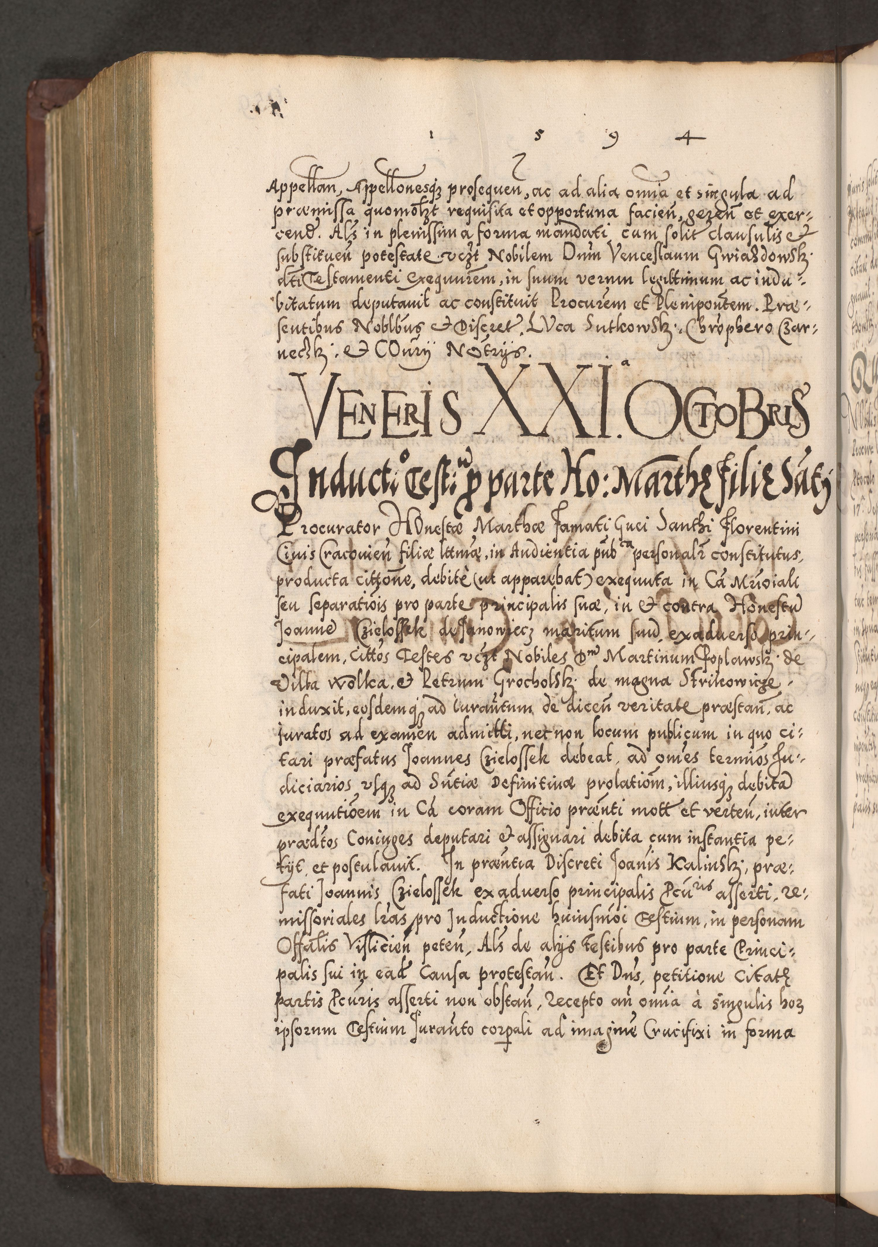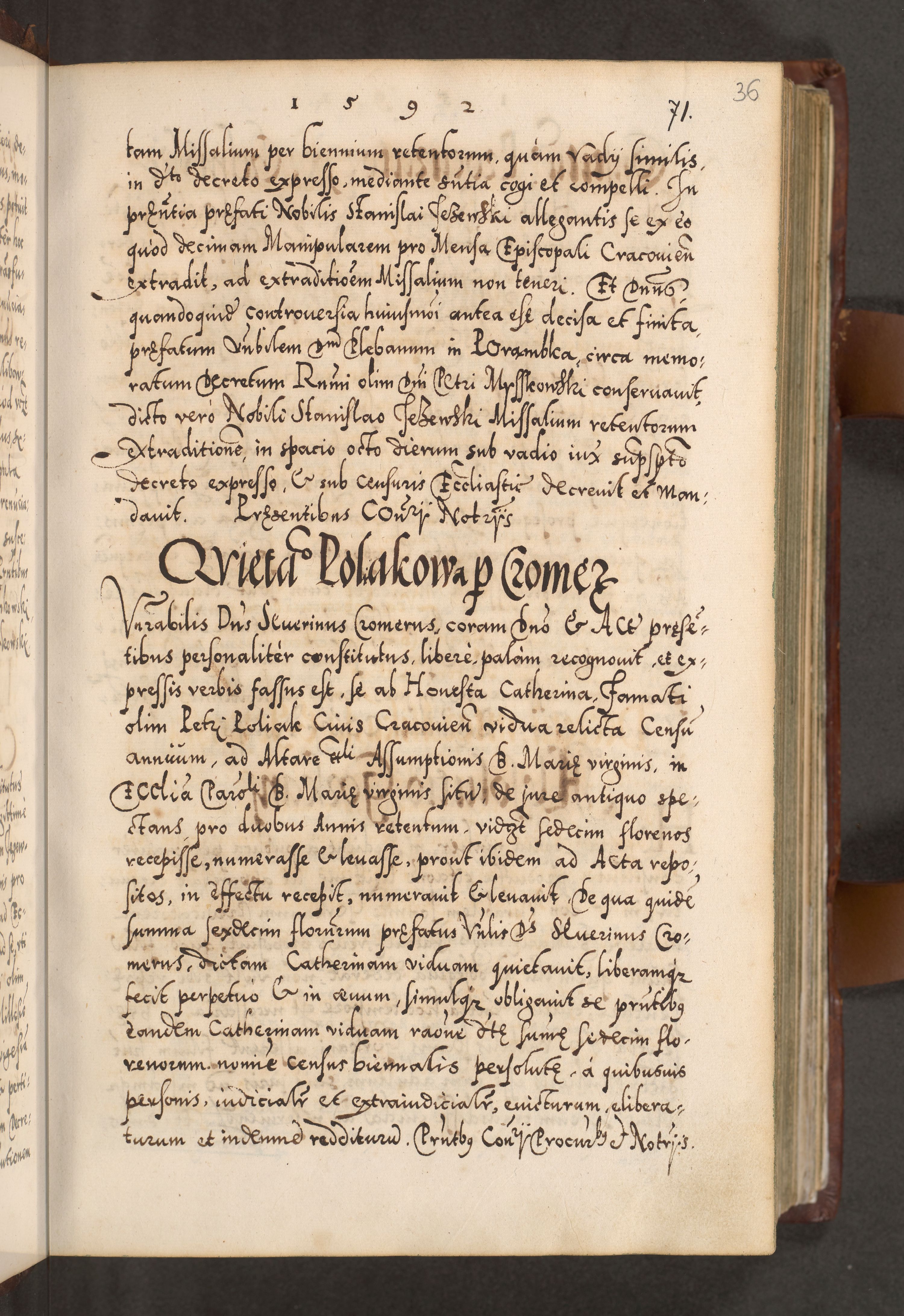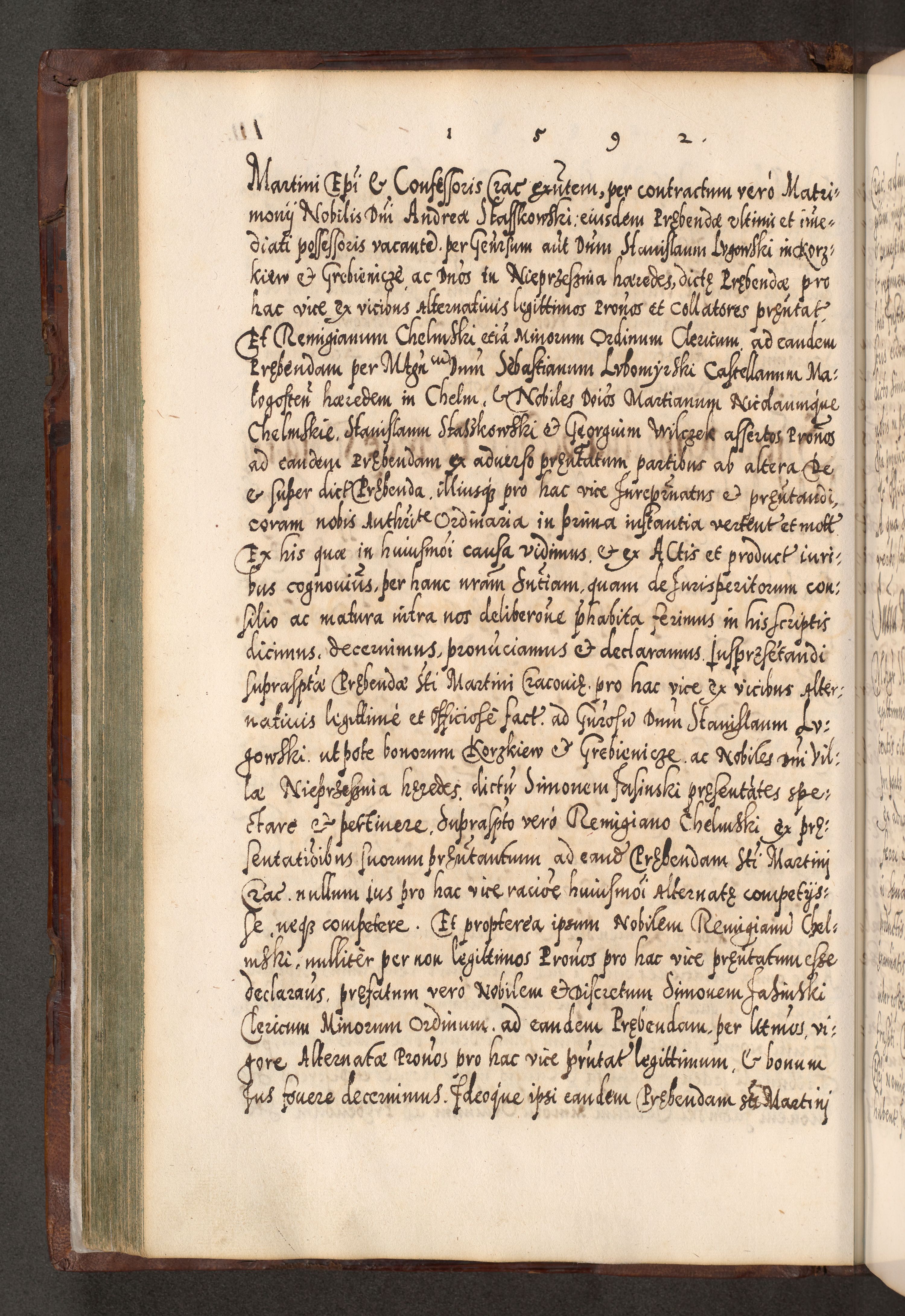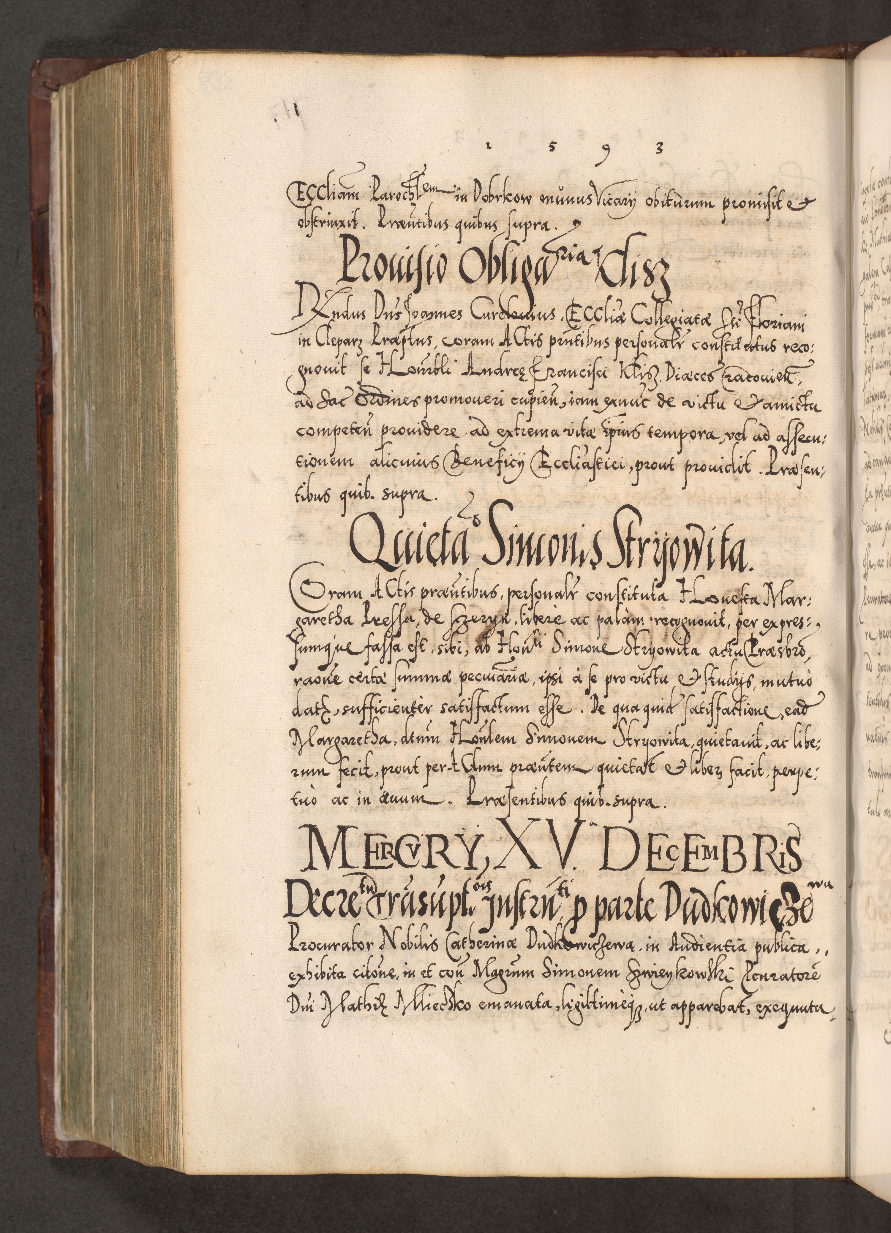 Illistrissimo et revedissimo in Christo Patre Domino Domino Georgio Rzadziwił Miserone Divina Sacrostae R. E. Tituli S. Sixti Presbitero Cardinali Duce in Olyka et Niesswiesz ad Gubernacula Ecclessiae Cracoviensis cuius administratorialem a Sancta Sede Apostolica obtinverat feliciter sedente. Acta actorum, causarum, sententiarum tam deffinitivarum quam interloquutoriarum decretorum, obligationum, quietationum, recognitionum, constitutionum procuratorum etc. coram Reverendo Domino Stanislao Crassinskz de Crasne Archidiacono Cracoviensis, Scholastico Gnesnesis, Custode Plocensis etc. Vicario et Officiali Generali Cracoviensi in Ano Domini Millesimo Quingentesimo Nonagesimo Primo cuius indictio quarta pontificatus SS. Domini Nostri Gregorii XIIII Anno I psius prio feliciter incipiut