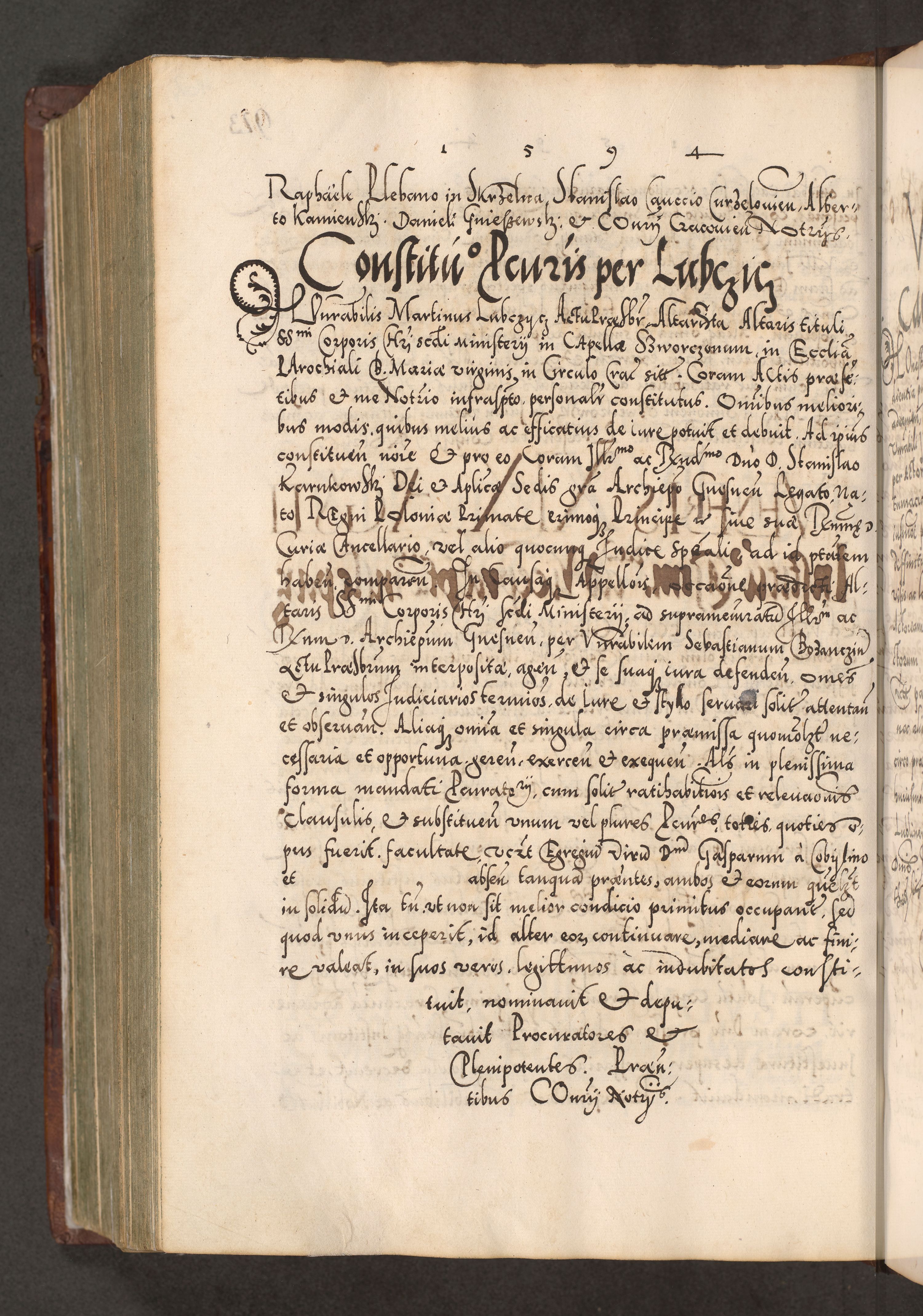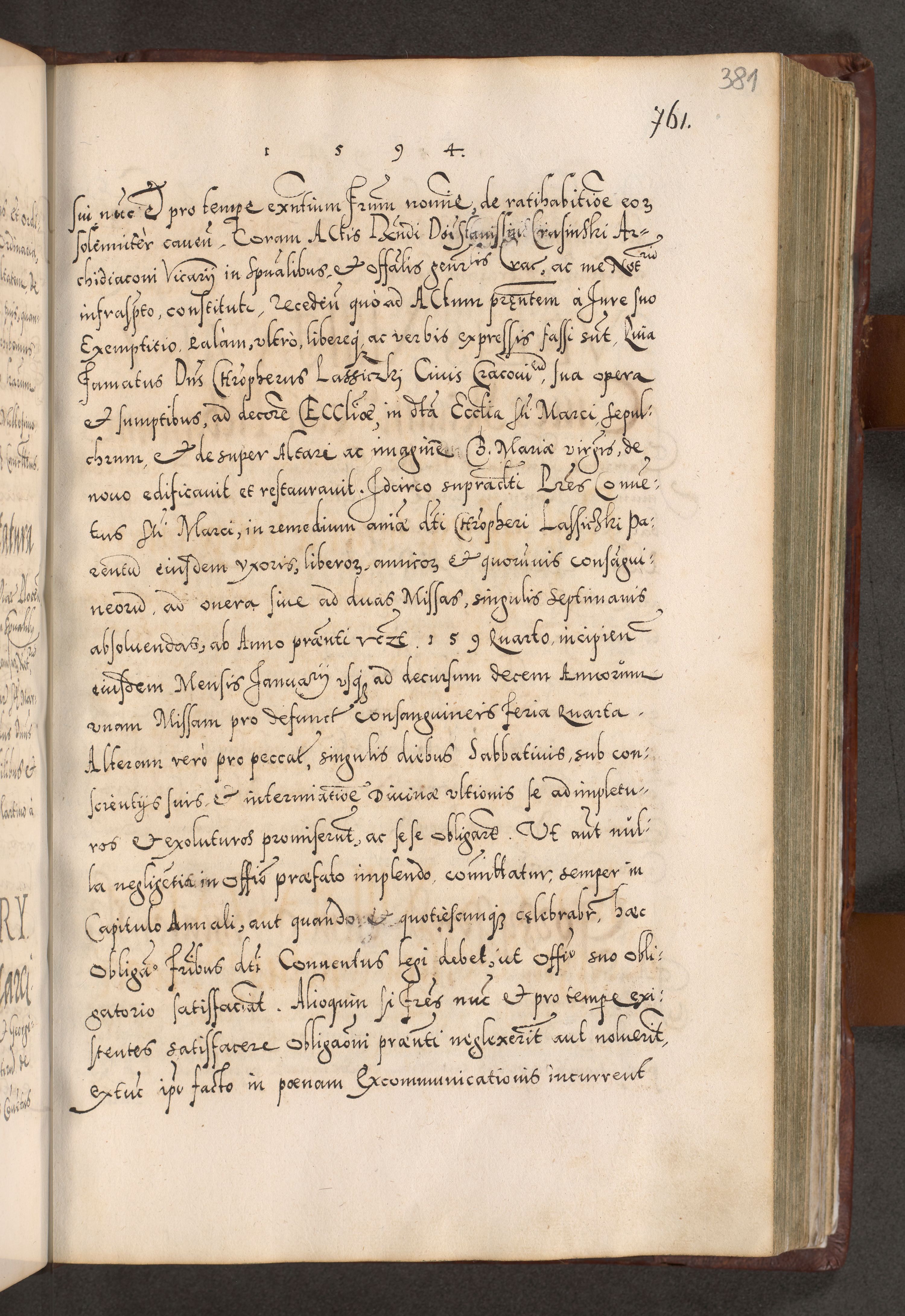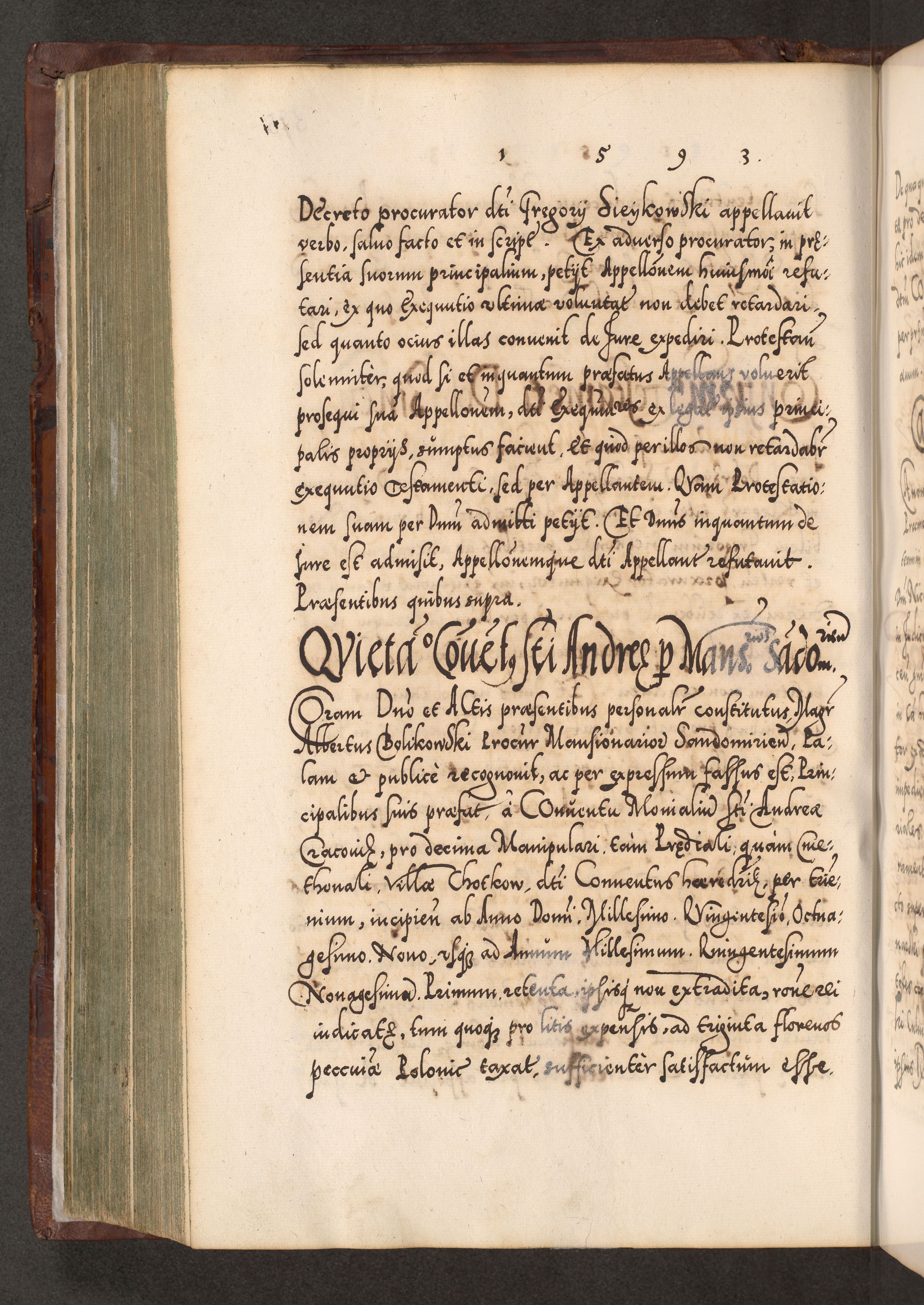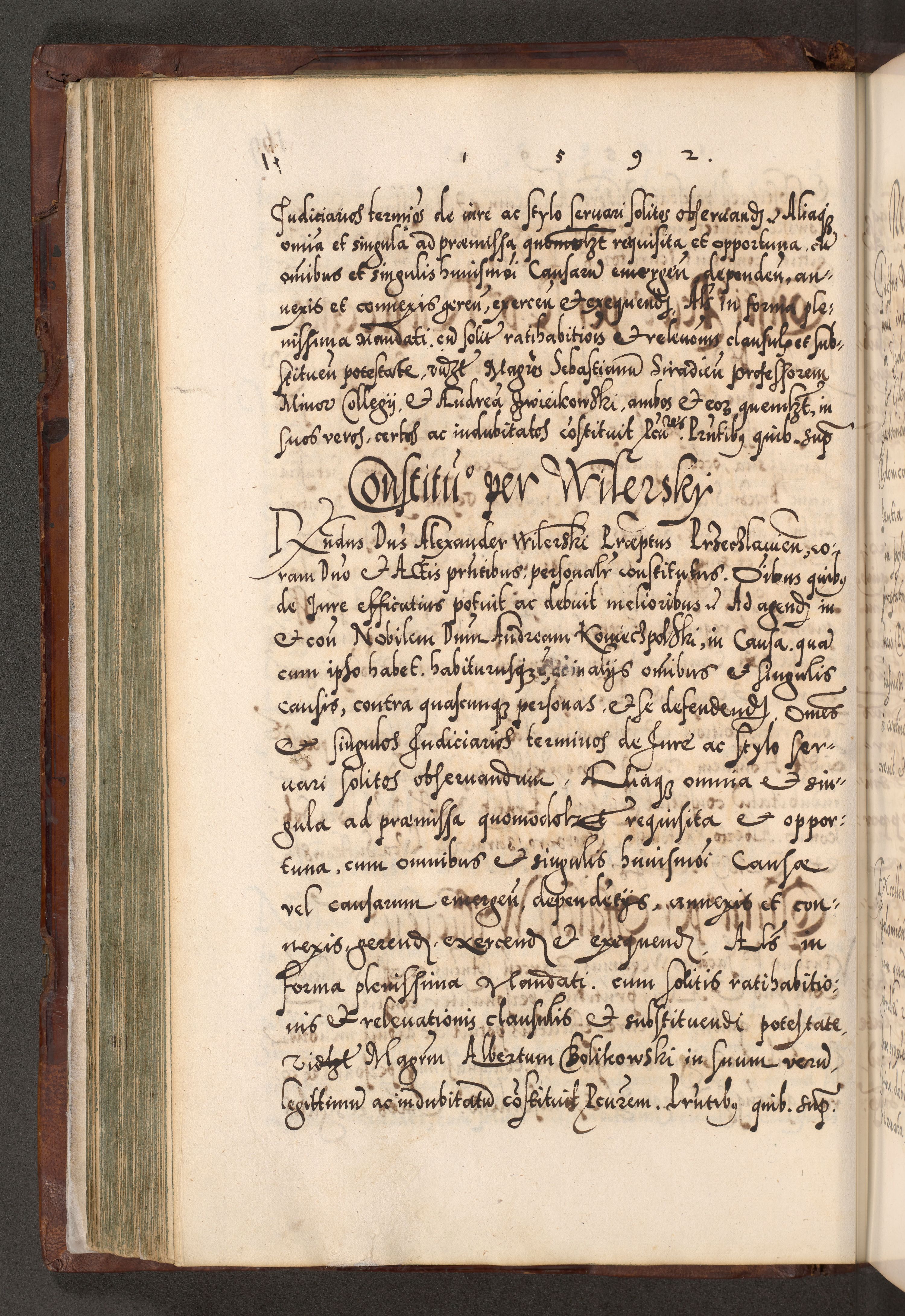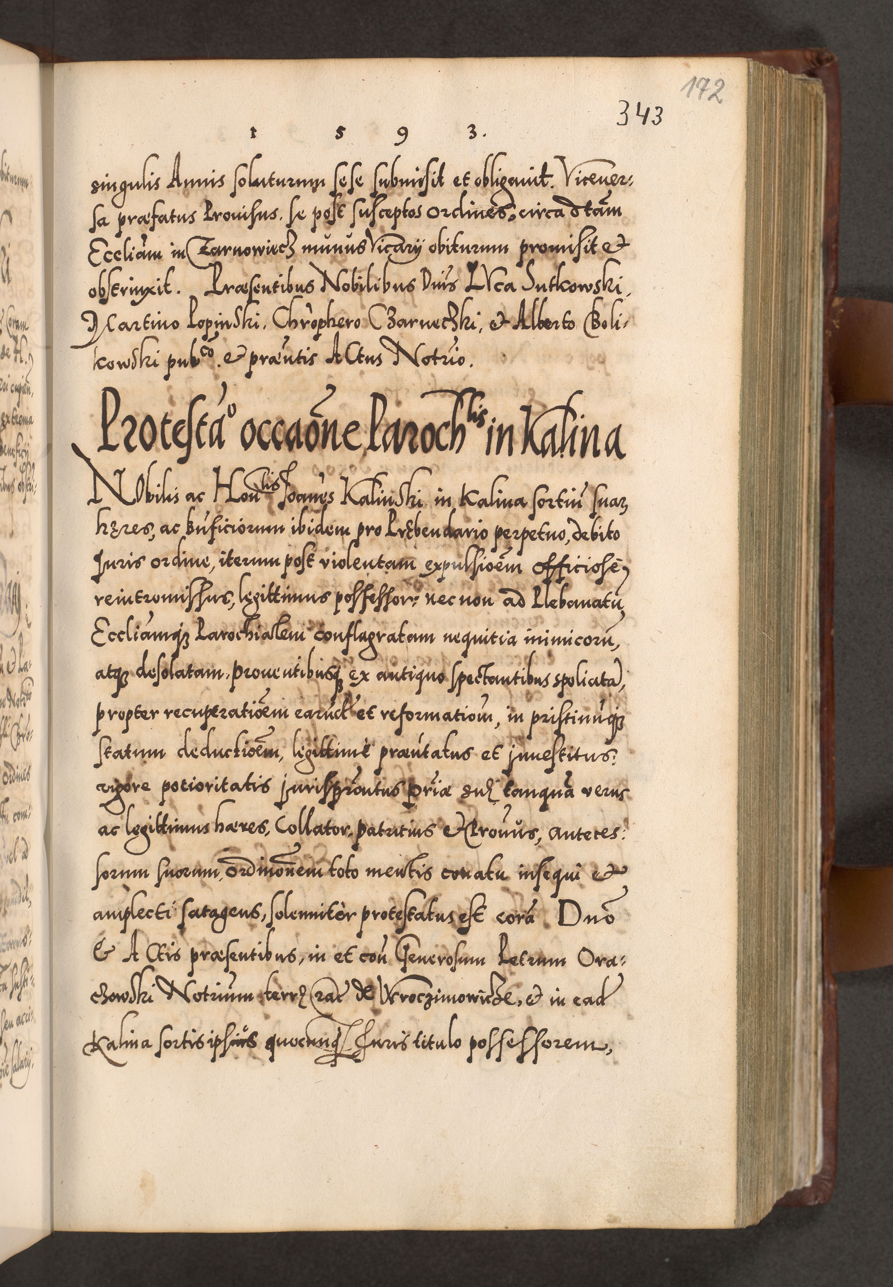 Illistrissimo et revedissimo in Christo Patre Domino Domino Georgio Rzadziwił Miserone Divina Sacrostae R. E. Tituli S. Sixti Presbitero Cardinali Duce in Olyka et Niesswiesz ad Gubernacula Ecclessiae Cracoviensis cuius administratorialem a Sancta Sede Apostolica obtinverat feliciter sedente. Acta actorum, causarum, sententiarum tam deffinitivarum quam interloquutoriarum decretorum, obligationum, quietationum, recognitionum, constitutionum procuratorum etc. coram Reverendo Domino Stanislao Crassinskz de Crasne Archidiacono Cracoviensis, Scholastico Gnesnesis, Custode Plocensis etc. Vicario et Officiali Generali Cracoviensi in Ano Domini Millesimo Quingentesimo Nonagesimo Primo cuius indictio quarta pontificatus SS. Domini Nostri Gregorii XIIII Anno I psius prio feliciter incipiut