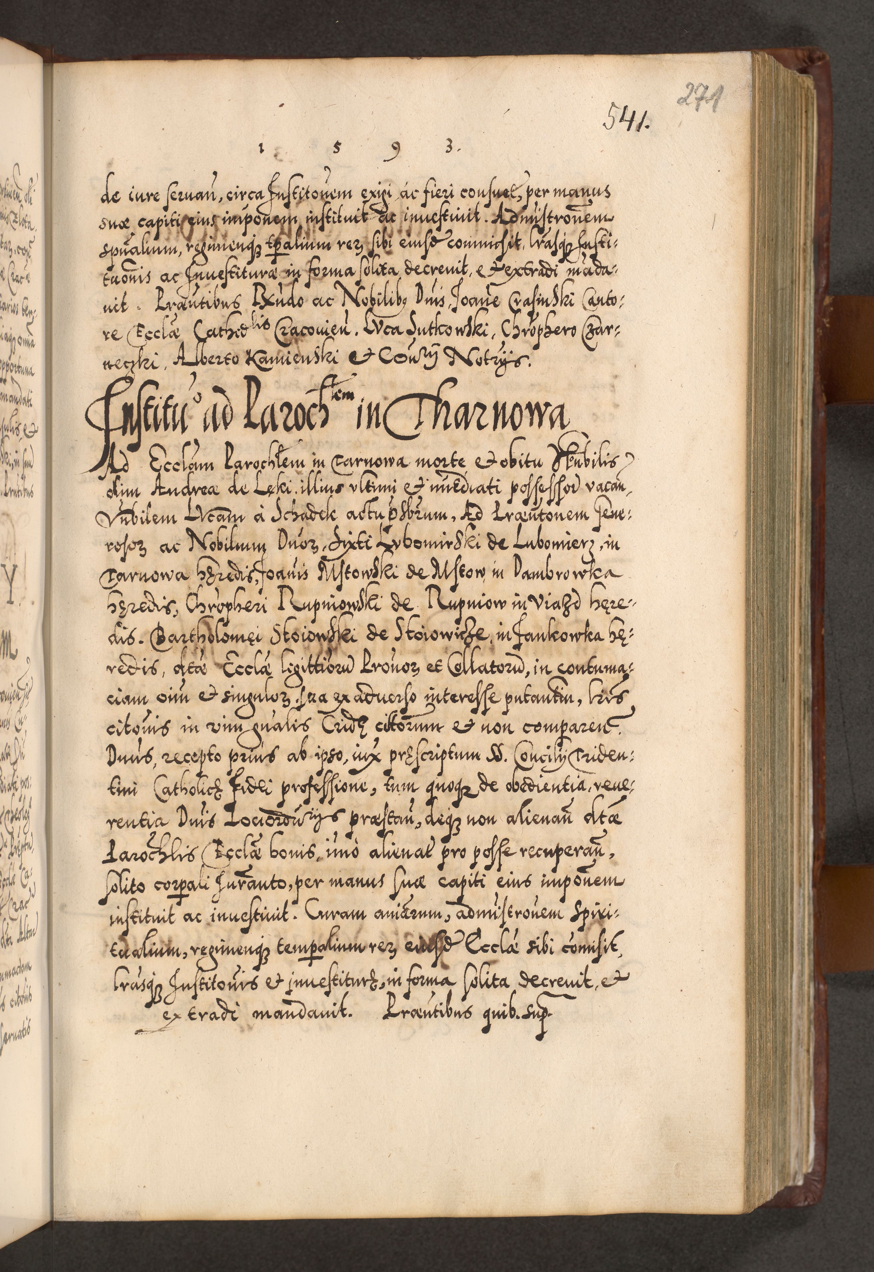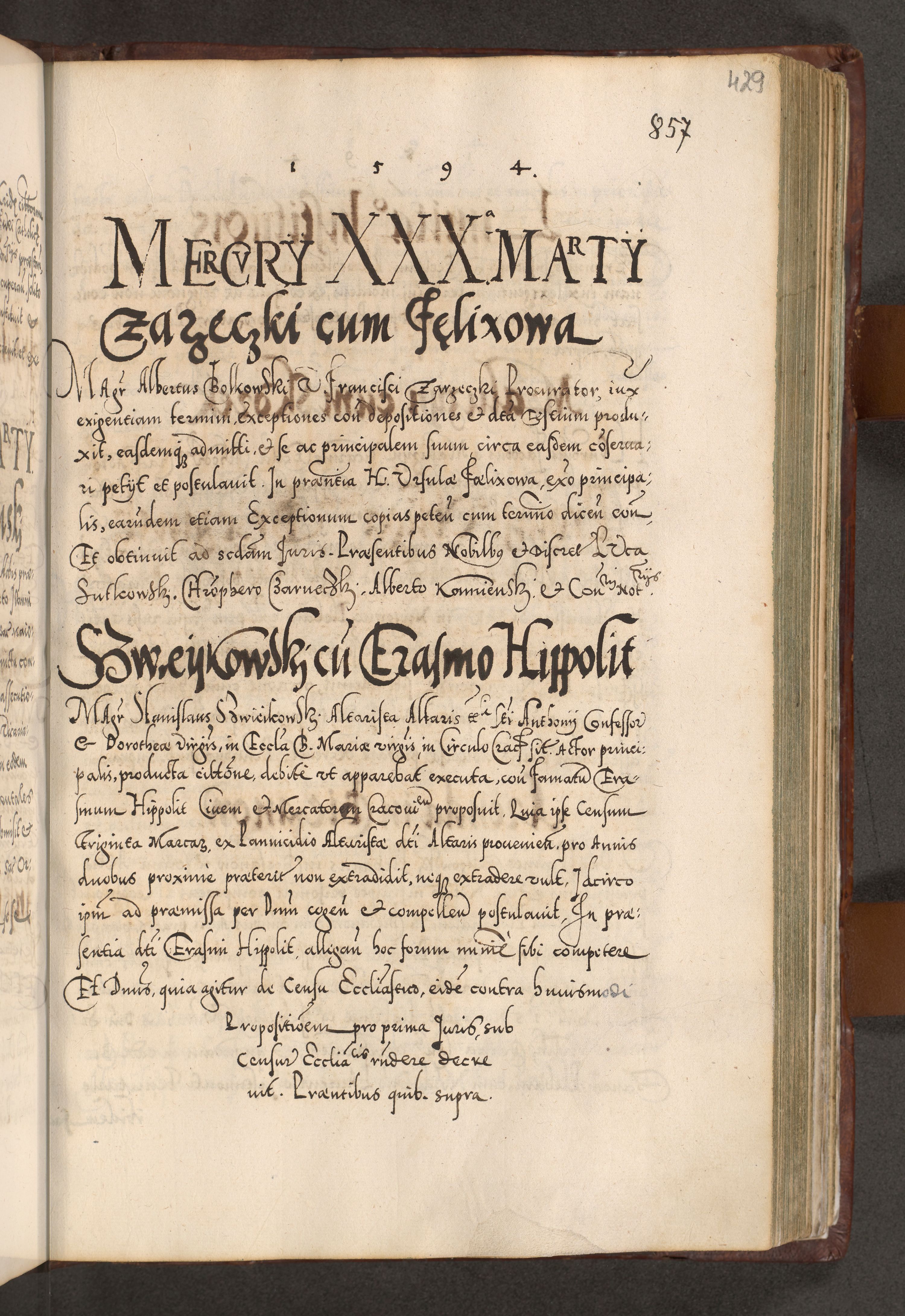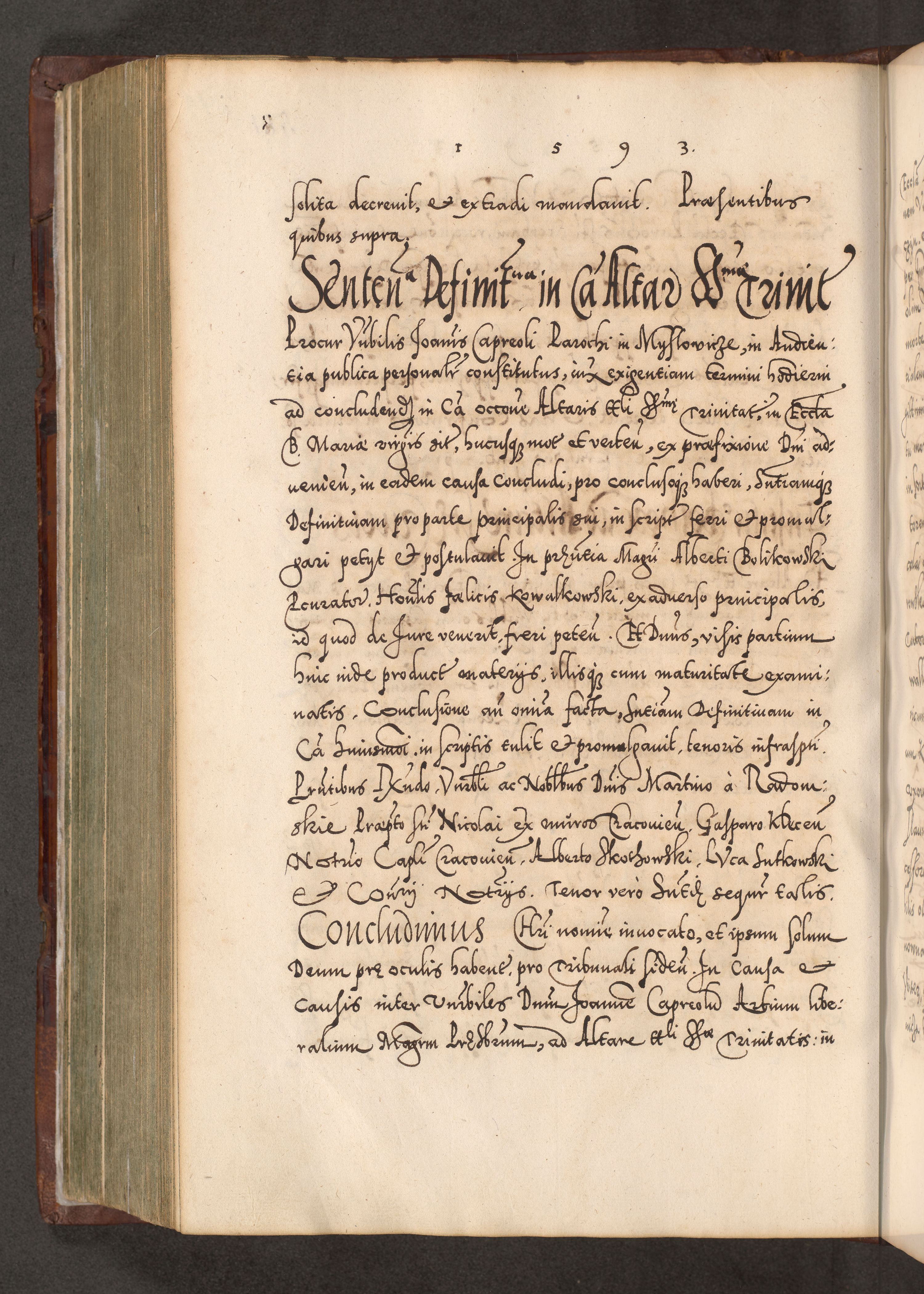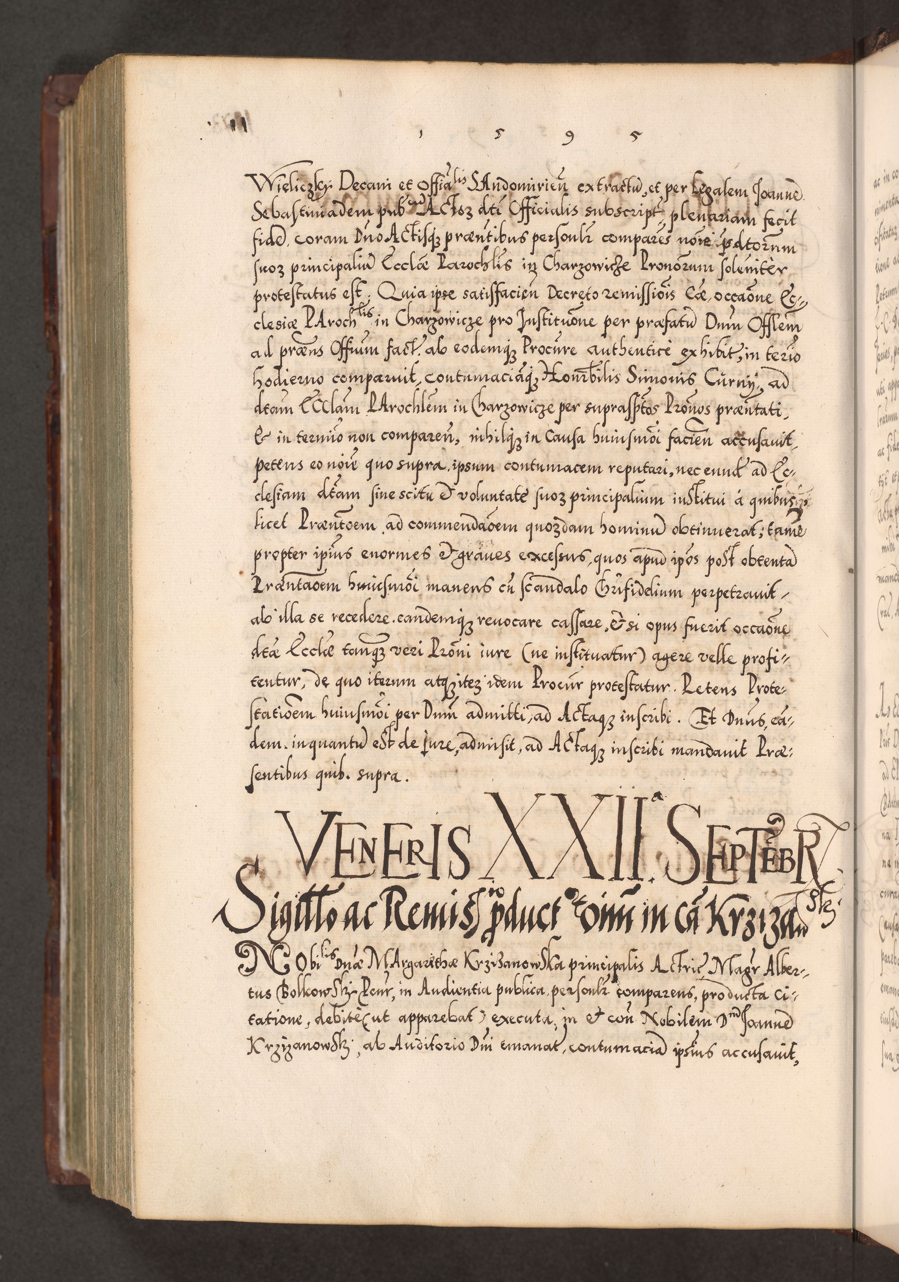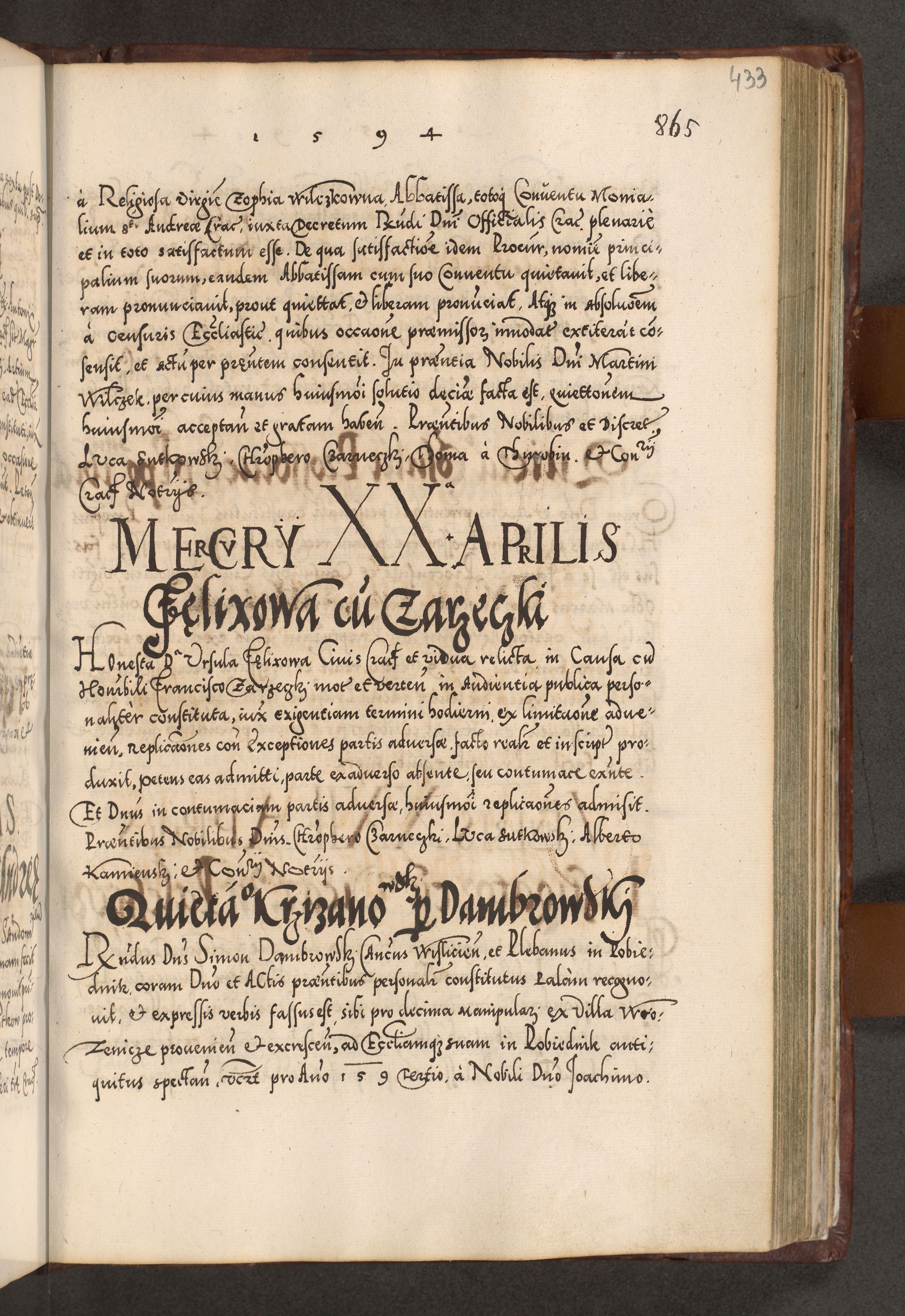 Illistrissimo et revedissimo in Christo Patre Domino Domino Georgio Rzadziwił Miserone Divina Sacrostae R. E. Tituli S. Sixti Presbitero Cardinali Duce in Olyka et Niesswiesz ad Gubernacula Ecclessiae Cracoviensis cuius administratorialem a Sancta Sede Apostolica obtinverat feliciter sedente. Acta actorum, causarum, sententiarum tam deffinitivarum quam interloquutoriarum decretorum, obligationum, quietationum, recognitionum, constitutionum procuratorum etc. coram Reverendo Domino Stanislao Crassinskz de Crasne Archidiacono Cracoviensis, Scholastico Gnesnesis, Custode Plocensis etc. Vicario et Officiali Generali Cracoviensi in Ano Domini Millesimo Quingentesimo Nonagesimo Primo cuius indictio quarta pontificatus SS. Domini Nostri Gregorii XIIII Anno I psius prio feliciter incipiut