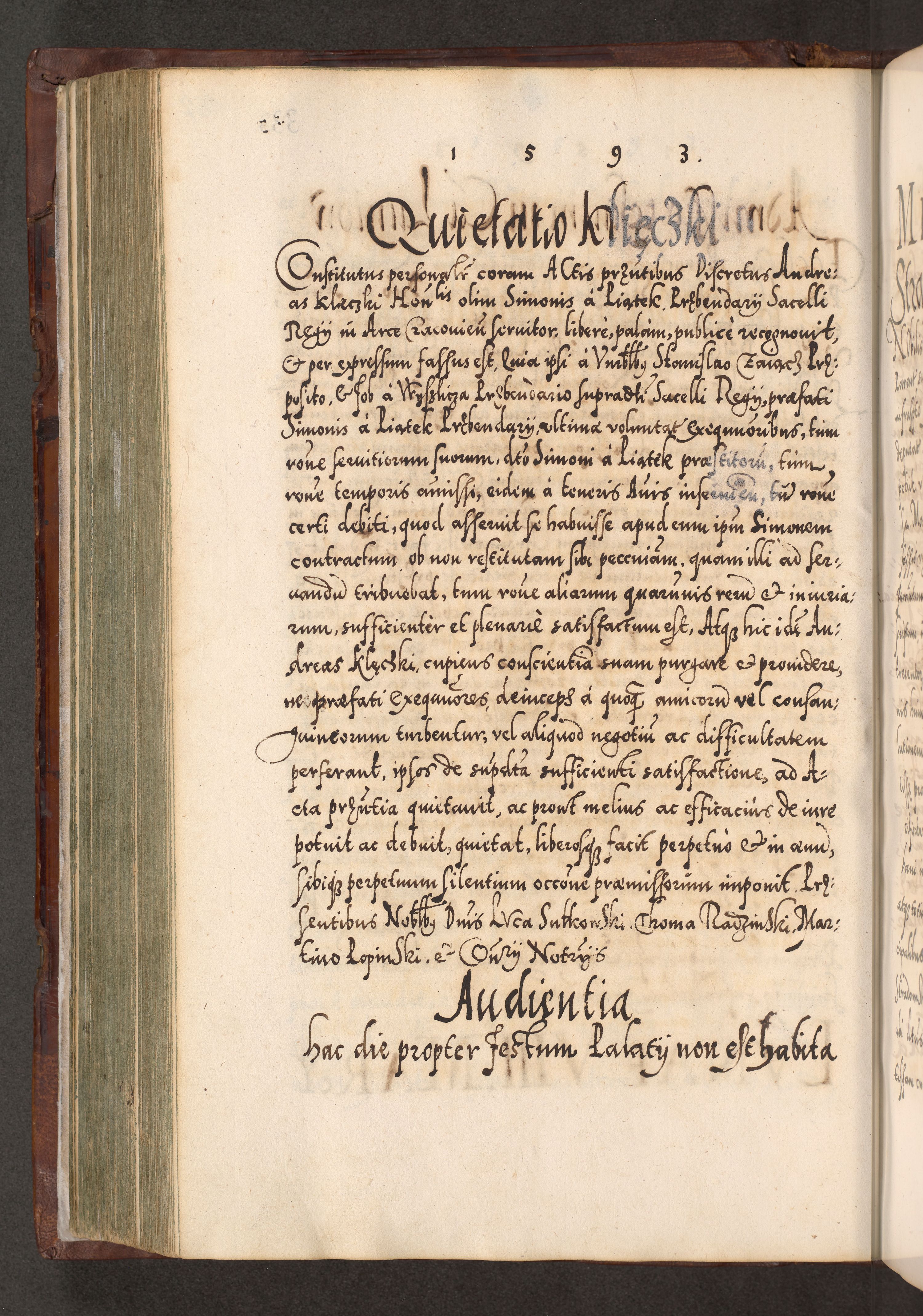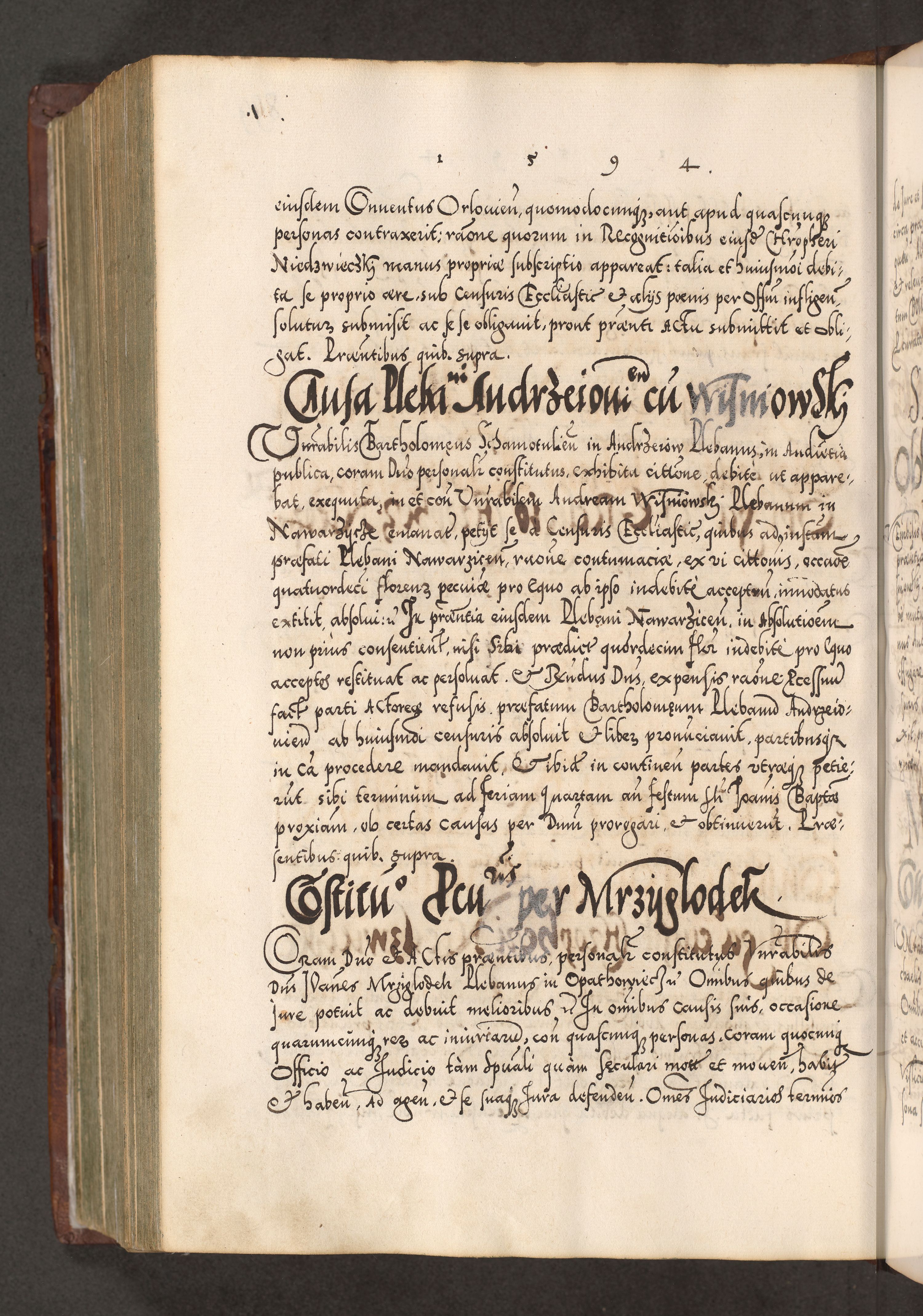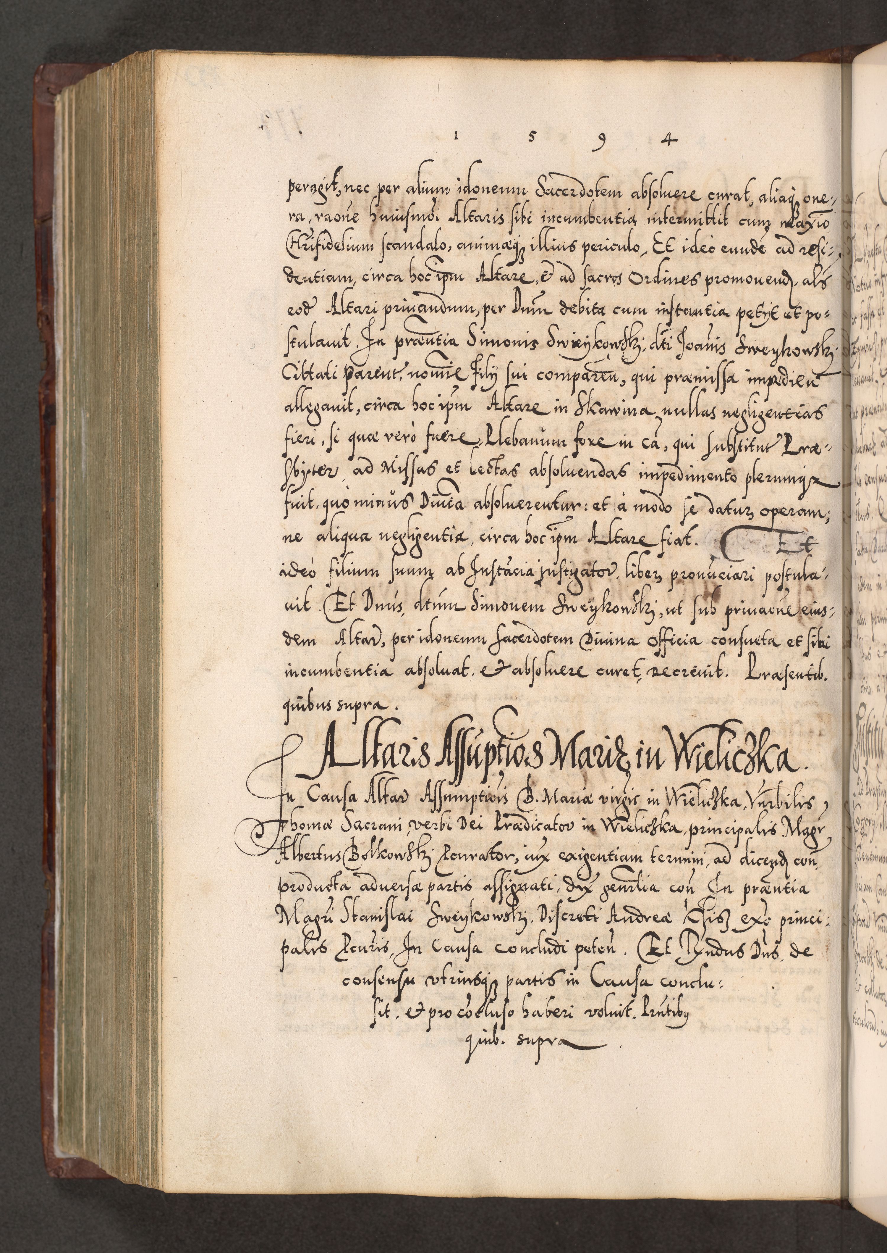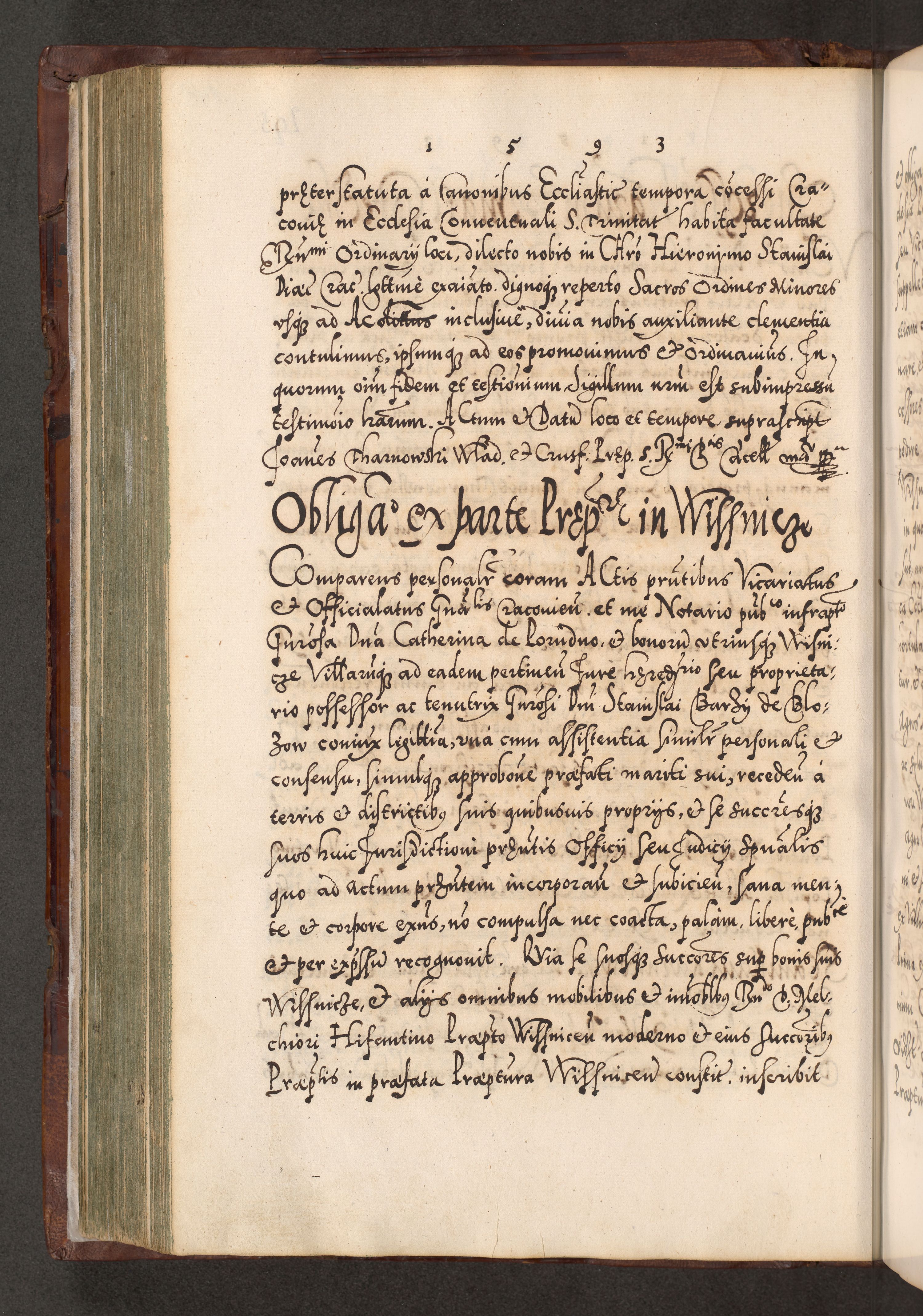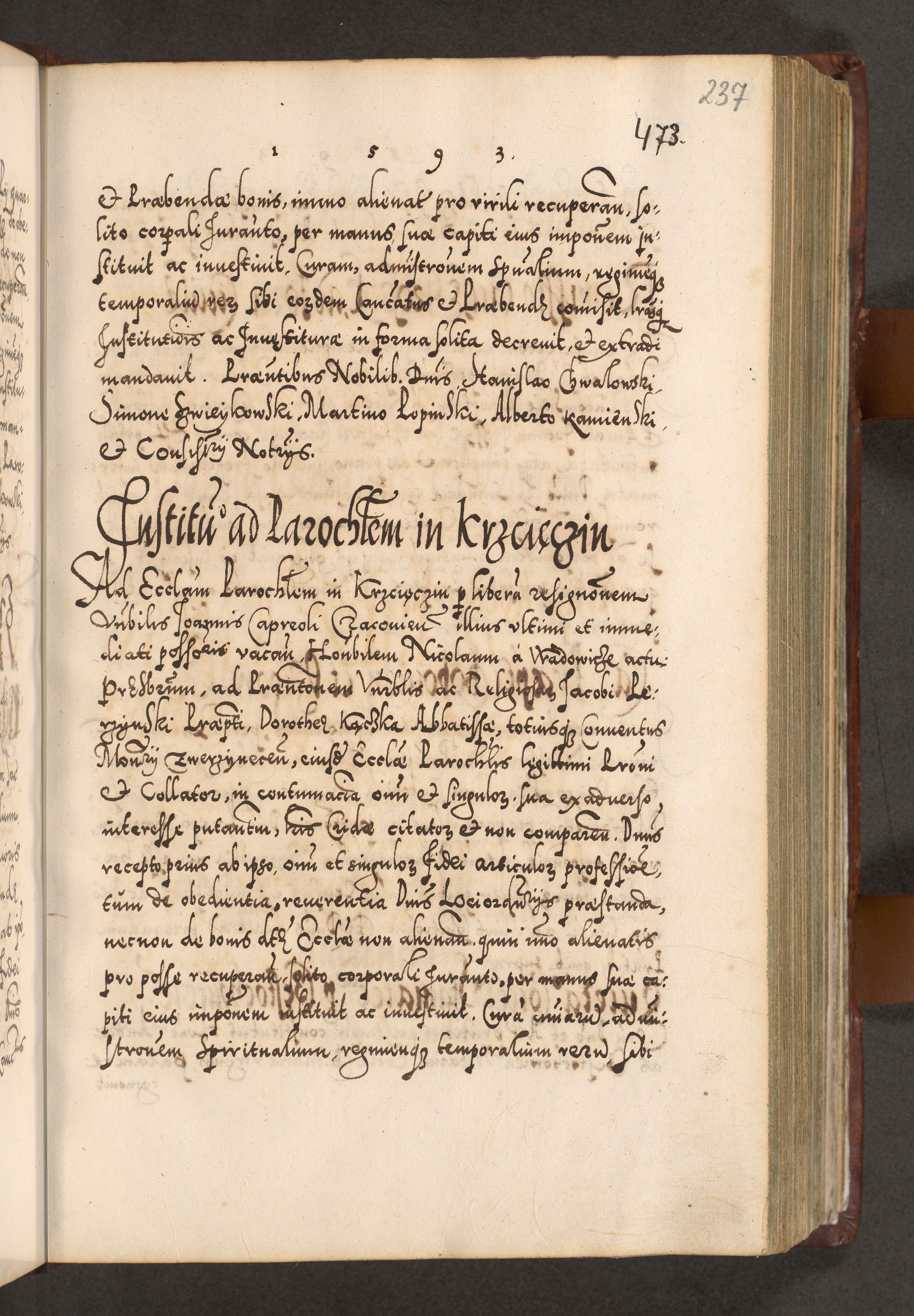 Illistrissimo et revedissimo in Christo Patre Domino Domino Georgio Rzadziwił Miserone Divina Sacrostae R. E. Tituli S. Sixti Presbitero Cardinali Duce in Olyka et Niesswiesz ad Gubernacula Ecclessiae Cracoviensis cuius administratorialem a Sancta Sede Apostolica obtinverat feliciter sedente. Acta actorum, causarum, sententiarum tam deffinitivarum quam interloquutoriarum decretorum, obligationum, quietationum, recognitionum, constitutionum procuratorum etc. coram Reverendo Domino Stanislao Crassinskz de Crasne Archidiacono Cracoviensis, Scholastico Gnesnesis, Custode Plocensis etc. Vicario et Officiali Generali Cracoviensi in Ano Domini Millesimo Quingentesimo Nonagesimo Primo cuius indictio quarta pontificatus SS. Domini Nostri Gregorii XIIII Anno I psius prio feliciter incipiut