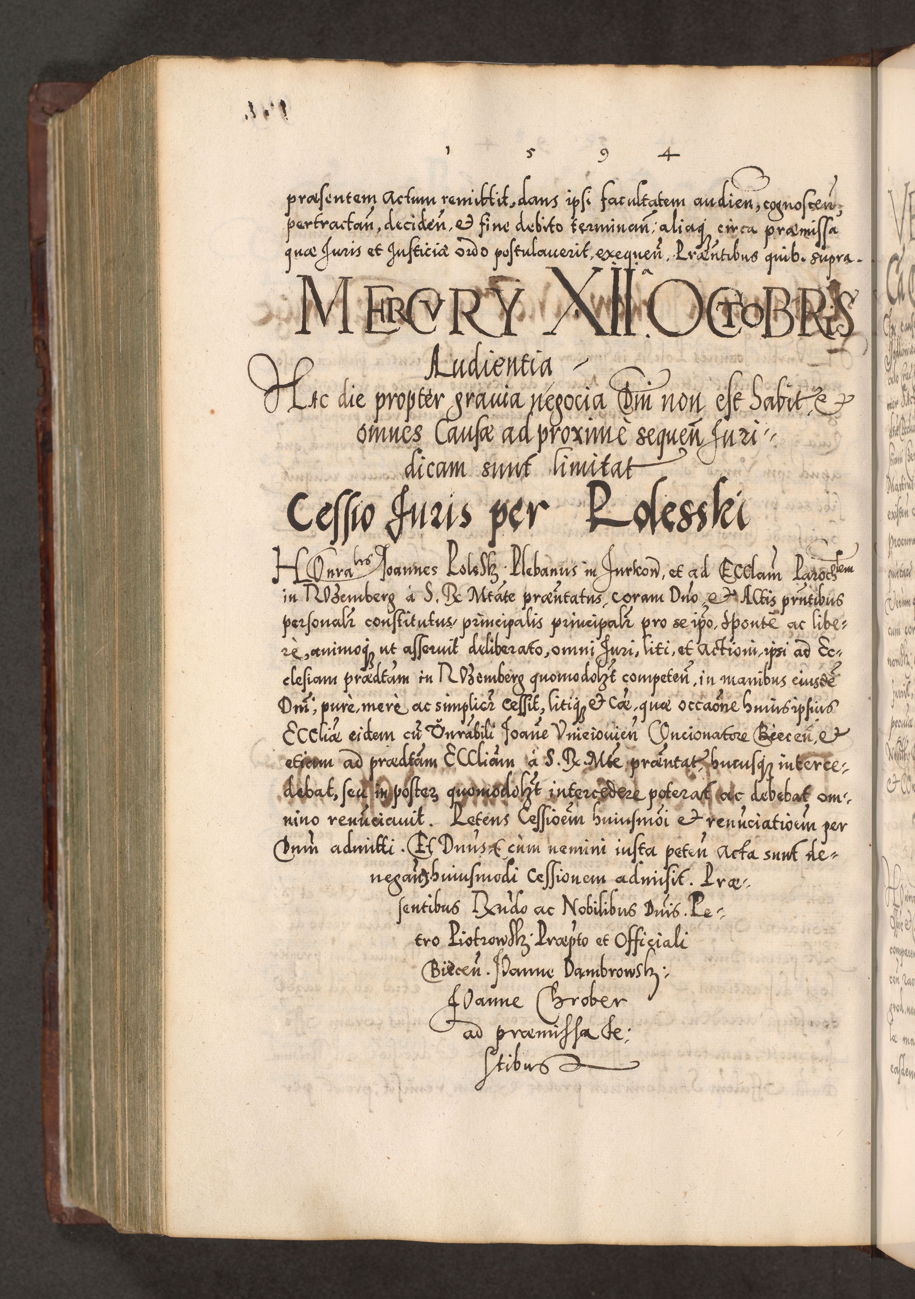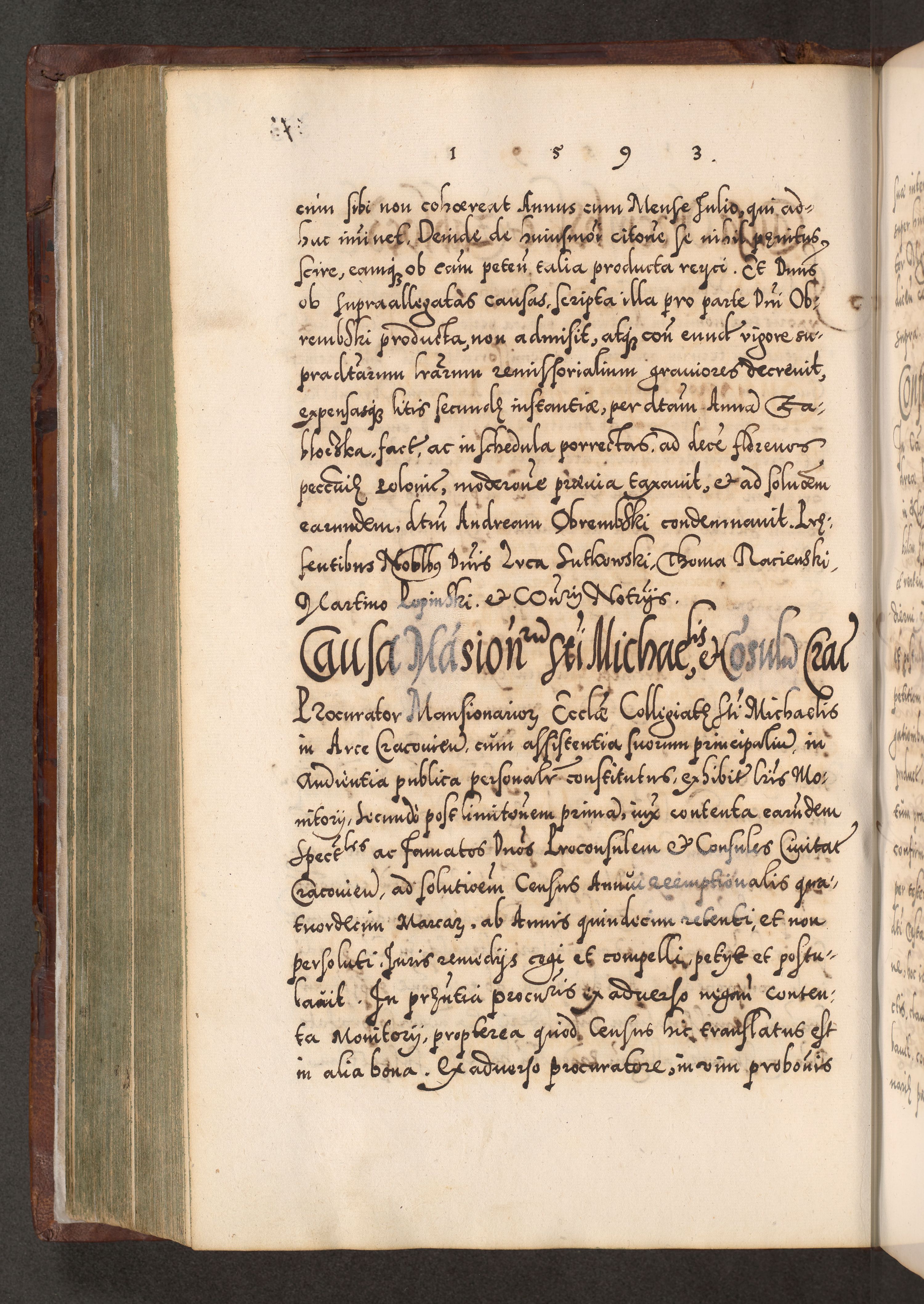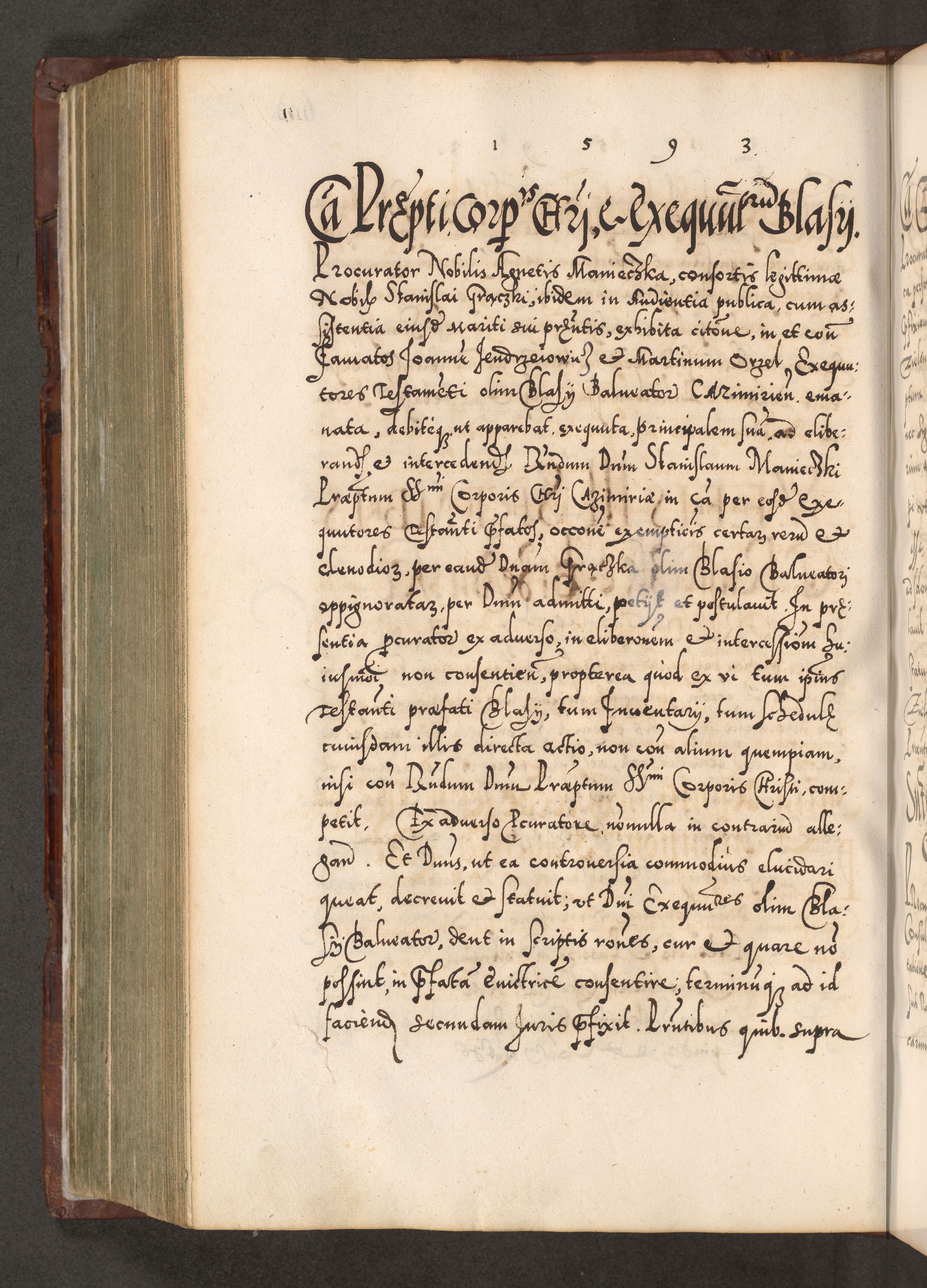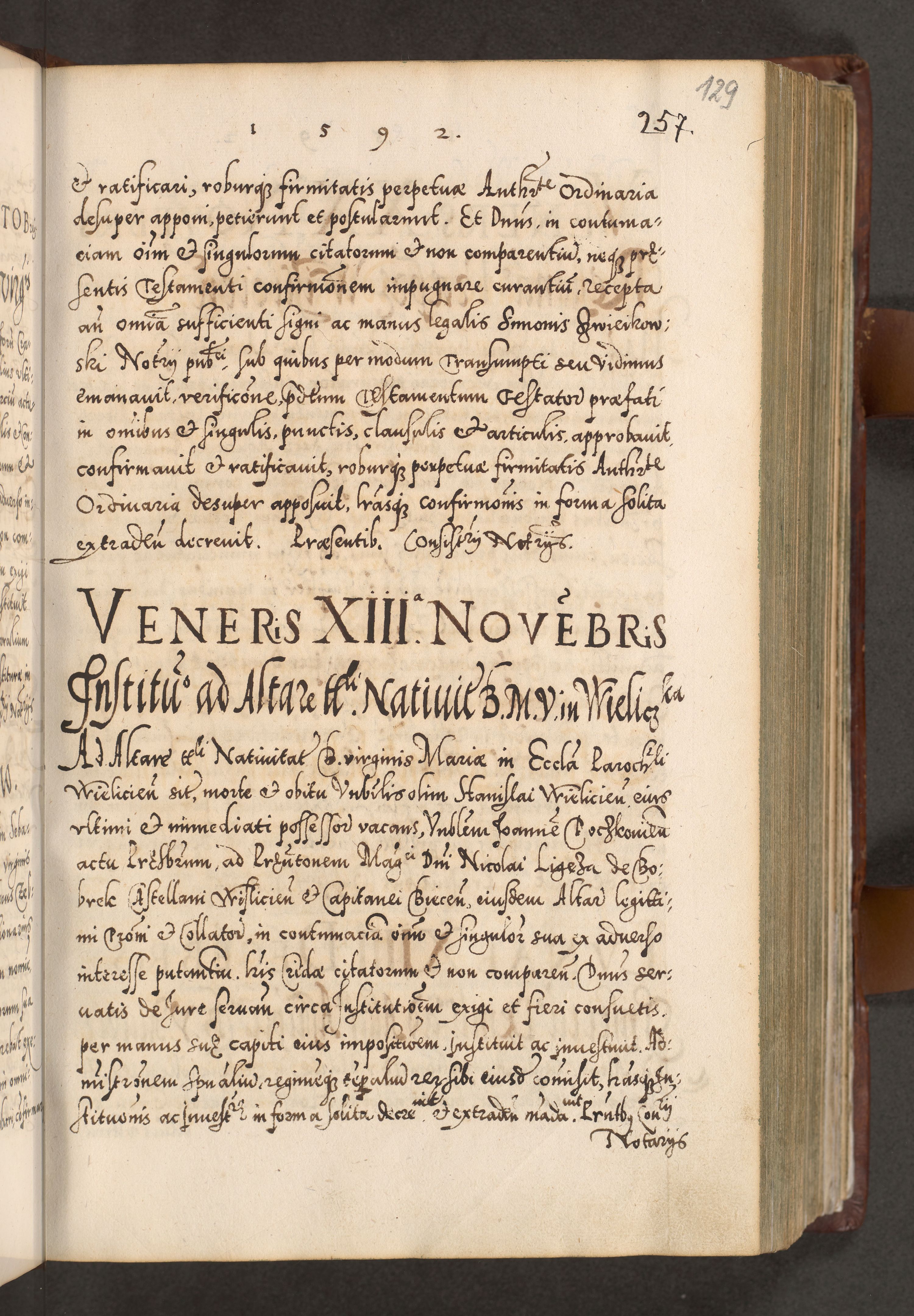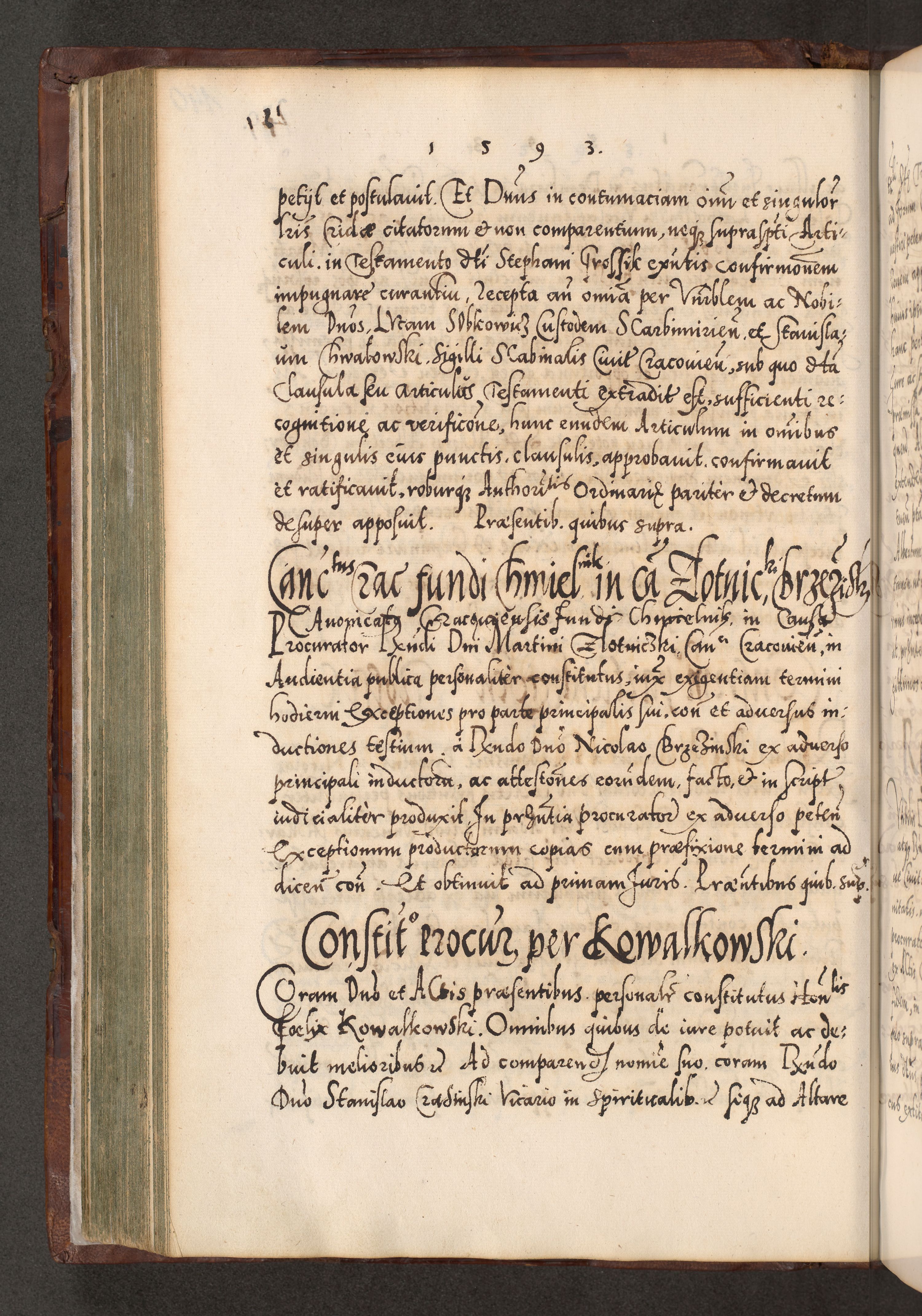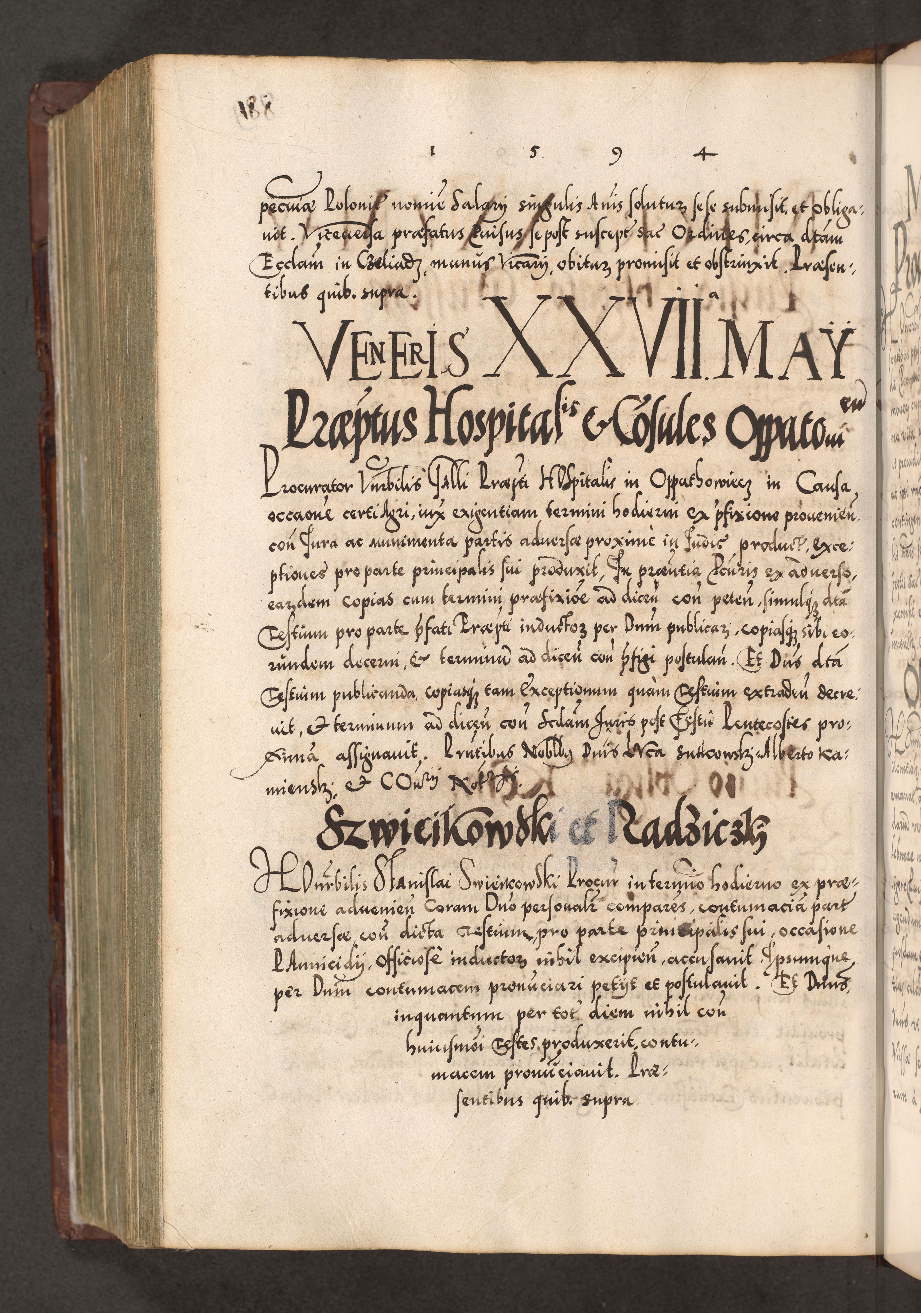 Illistrissimo et revedissimo in Christo Patre Domino Domino Georgio Rzadziwił Miserone Divina Sacrostae R. E. Tituli S. Sixti Presbitero Cardinali Duce in Olyka et Niesswiesz ad Gubernacula Ecclessiae Cracoviensis cuius administratorialem a Sancta Sede Apostolica obtinverat feliciter sedente. Acta actorum, causarum, sententiarum tam deffinitivarum quam interloquutoriarum decretorum, obligationum, quietationum, recognitionum, constitutionum procuratorum etc. coram Reverendo Domino Stanislao Crassinskz de Crasne Archidiacono Cracoviensis, Scholastico Gnesnesis, Custode Plocensis etc. Vicario et Officiali Generali Cracoviensi in Ano Domini Millesimo Quingentesimo Nonagesimo Primo cuius indictio quarta pontificatus SS. Domini Nostri Gregorii XIIII Anno I psius prio feliciter incipiut