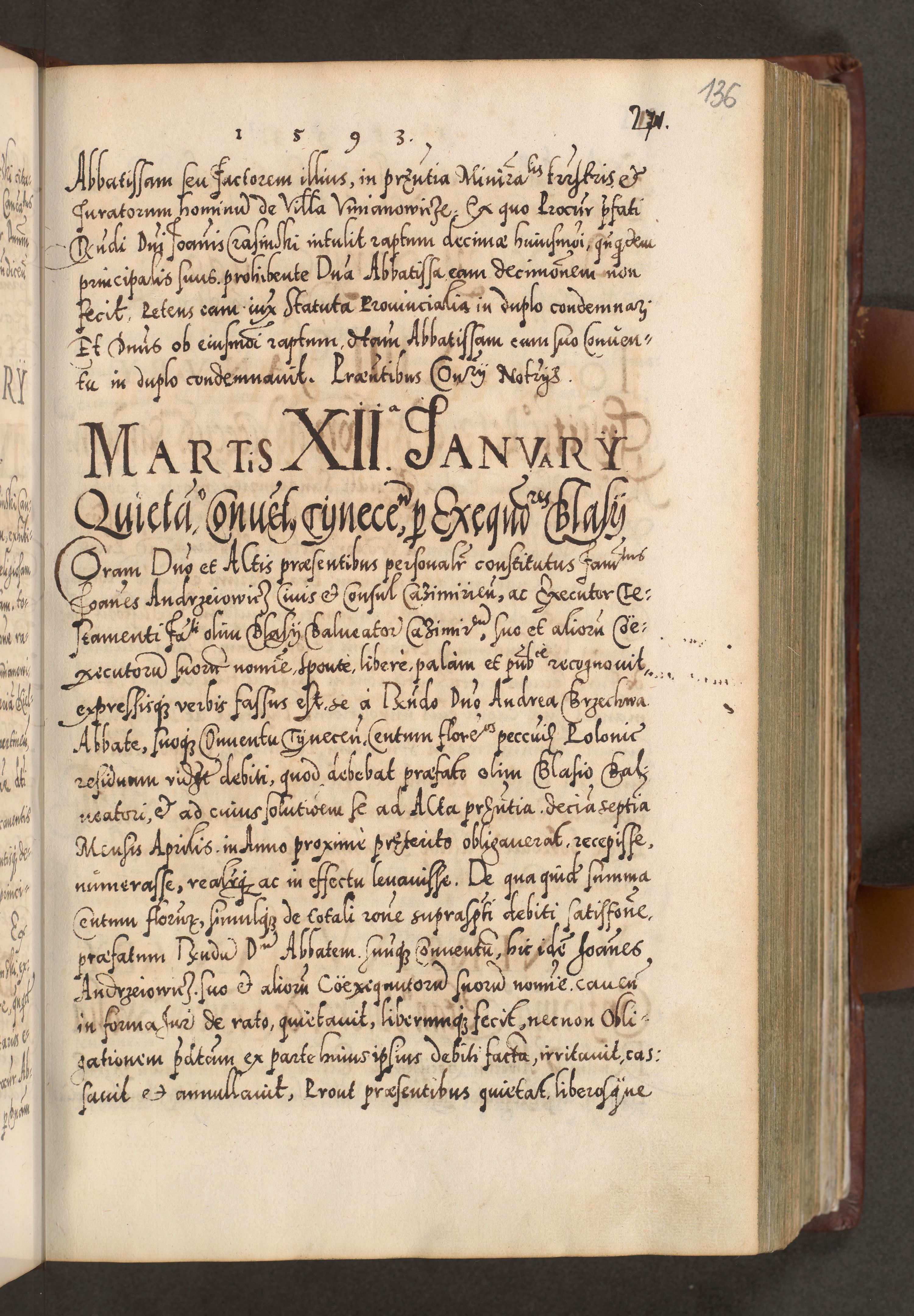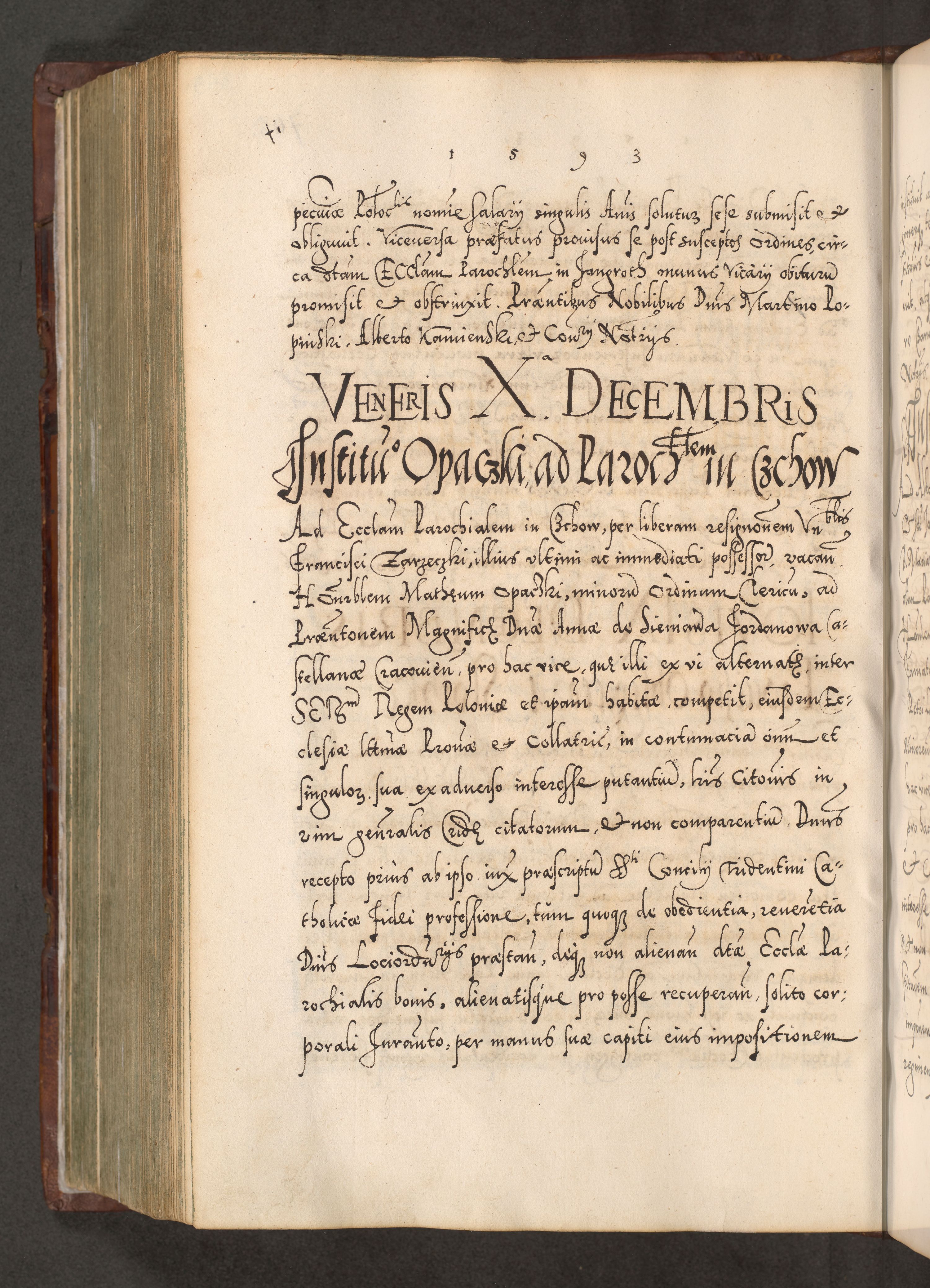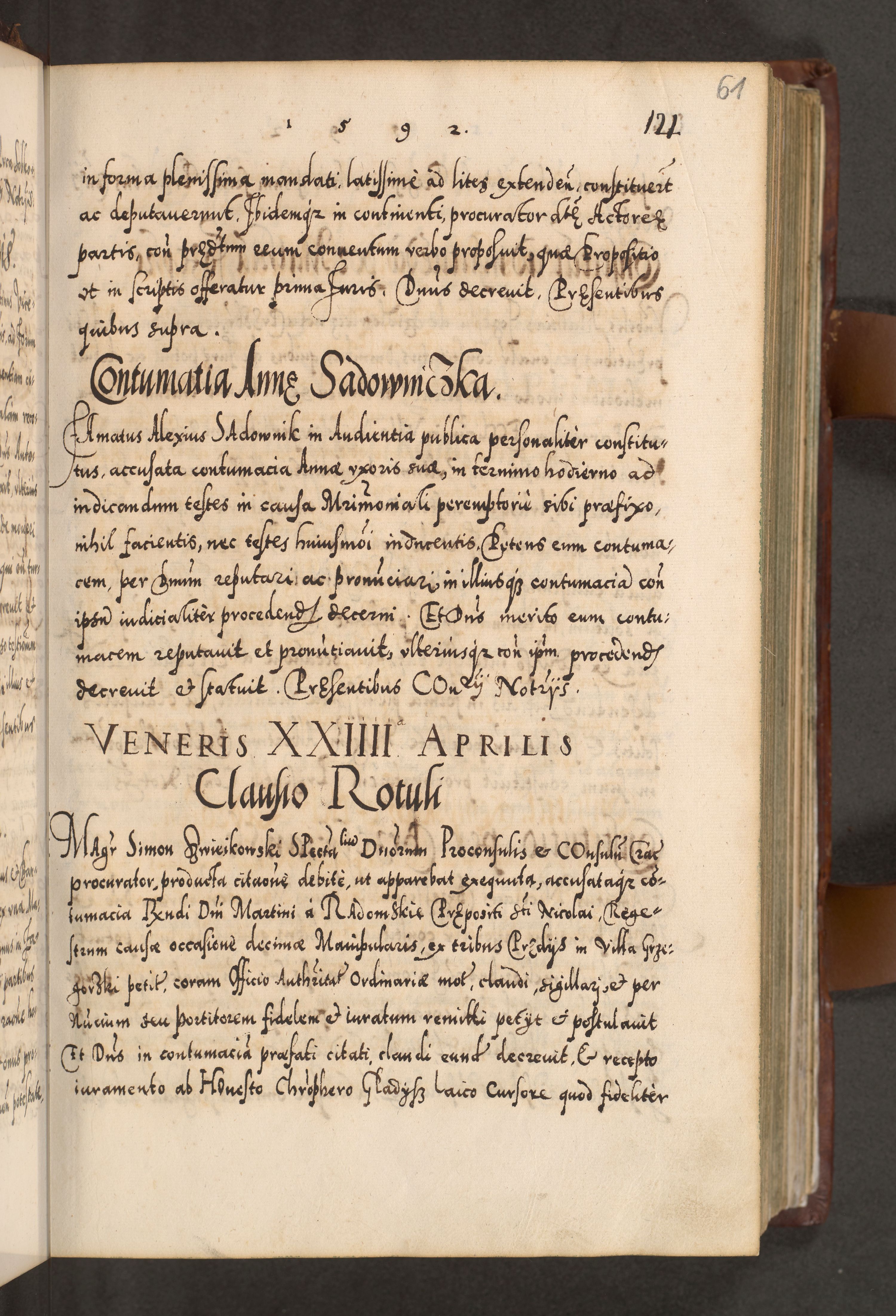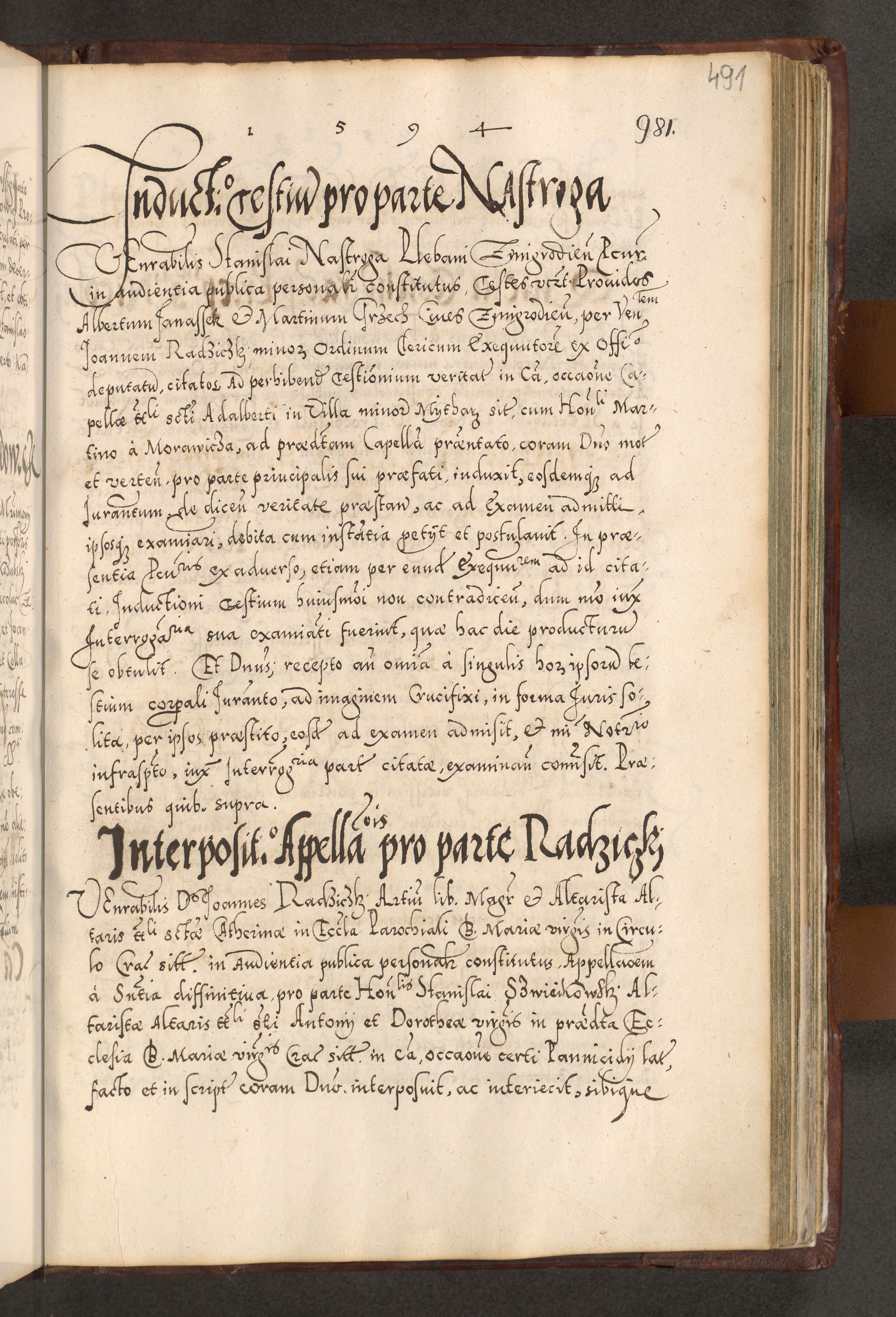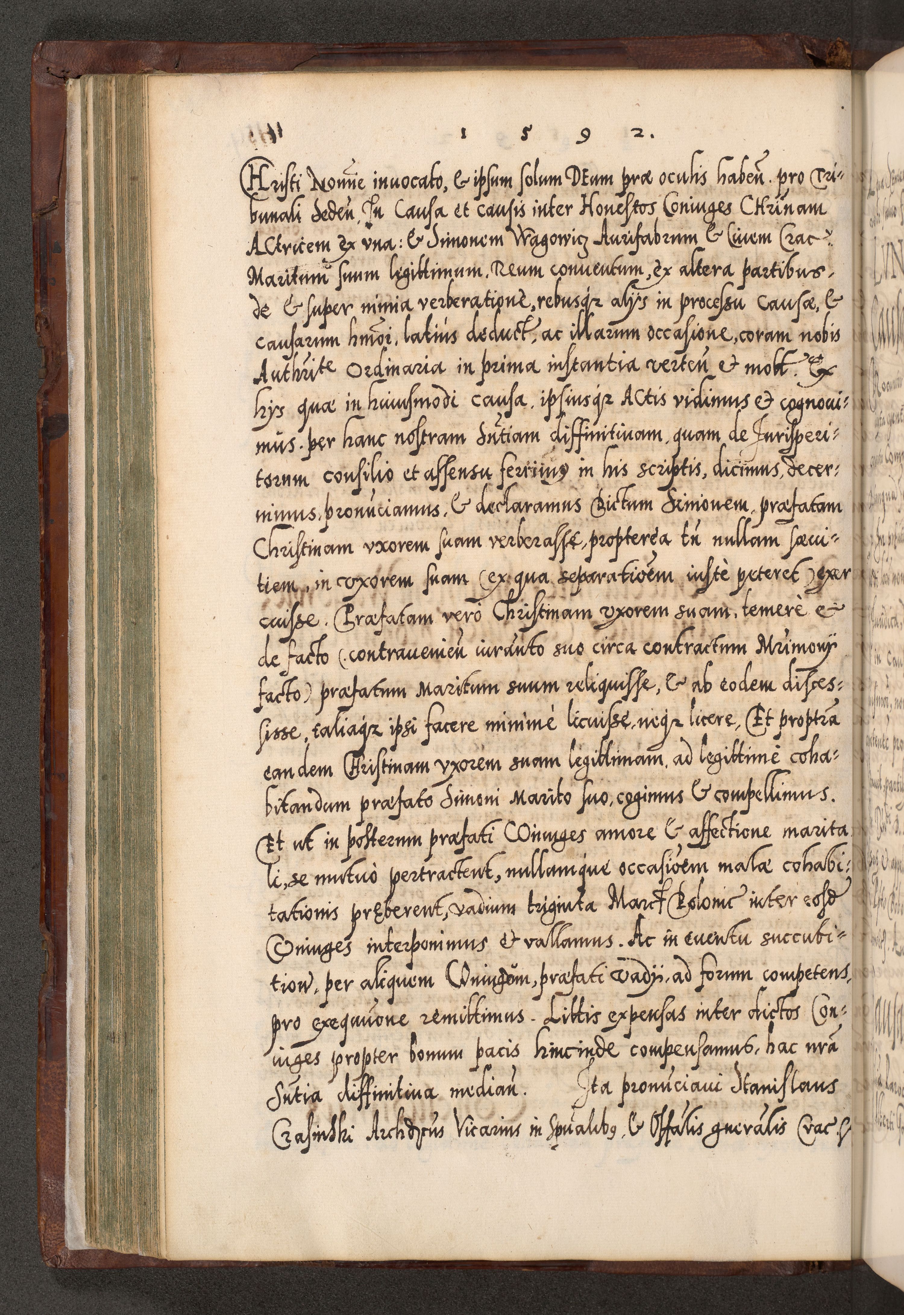 Illistrissimo et revedissimo in Christo Patre Domino Domino Georgio Rzadziwił Miserone Divina Sacrostae R. E. Tituli S. Sixti Presbitero Cardinali Duce in Olyka et Niesswiesz ad Gubernacula Ecclessiae Cracoviensis cuius administratorialem a Sancta Sede Apostolica obtinverat feliciter sedente. Acta actorum, causarum, sententiarum tam deffinitivarum quam interloquutoriarum decretorum, obligationum, quietationum, recognitionum, constitutionum procuratorum etc. coram Reverendo Domino Stanislao Crassinskz de Crasne Archidiacono Cracoviensis, Scholastico Gnesnesis, Custode Plocensis etc. Vicario et Officiali Generali Cracoviensi in Ano Domini Millesimo Quingentesimo Nonagesimo Primo cuius indictio quarta pontificatus SS. Domini Nostri Gregorii XIIII Anno I psius prio feliciter incipiut