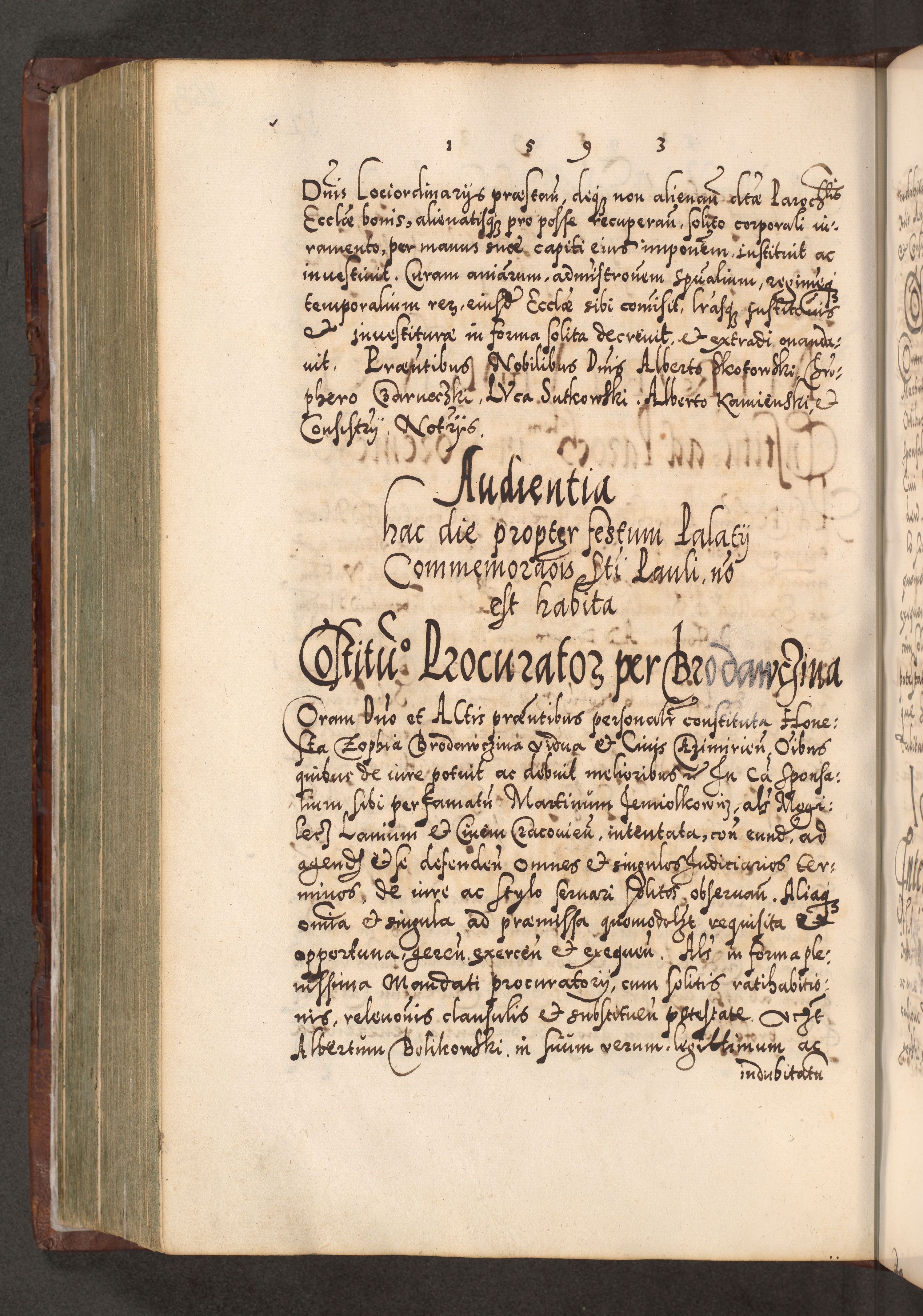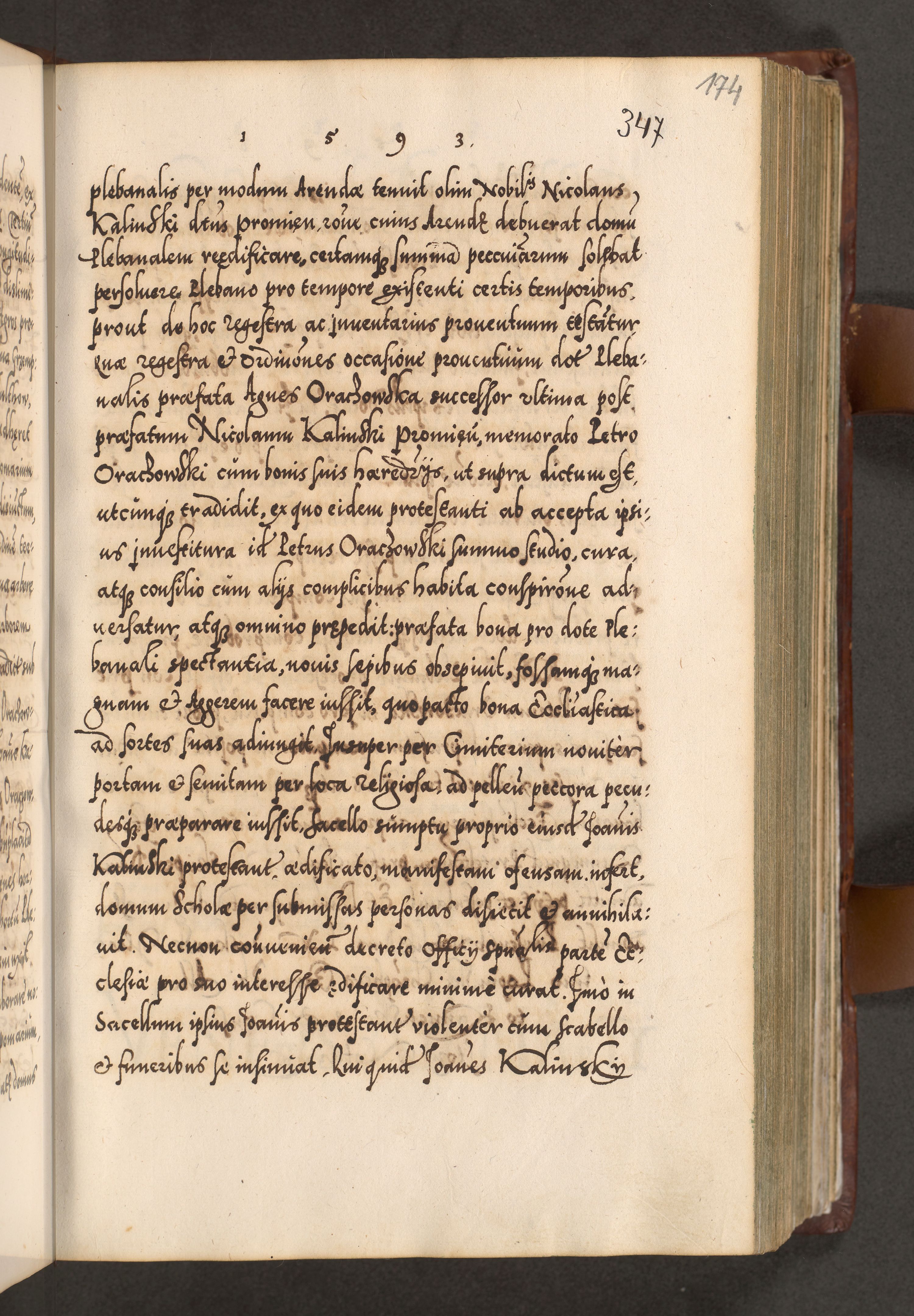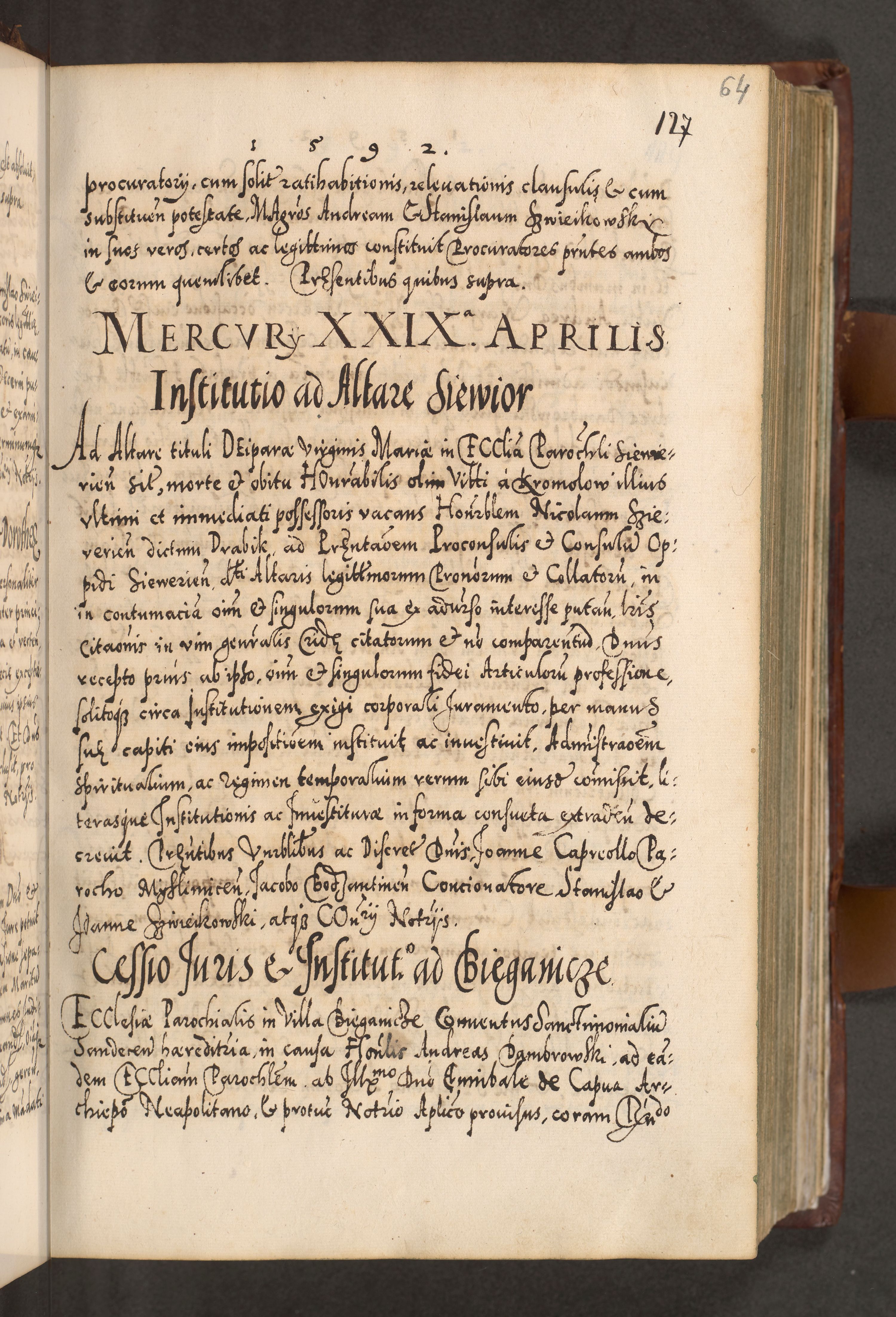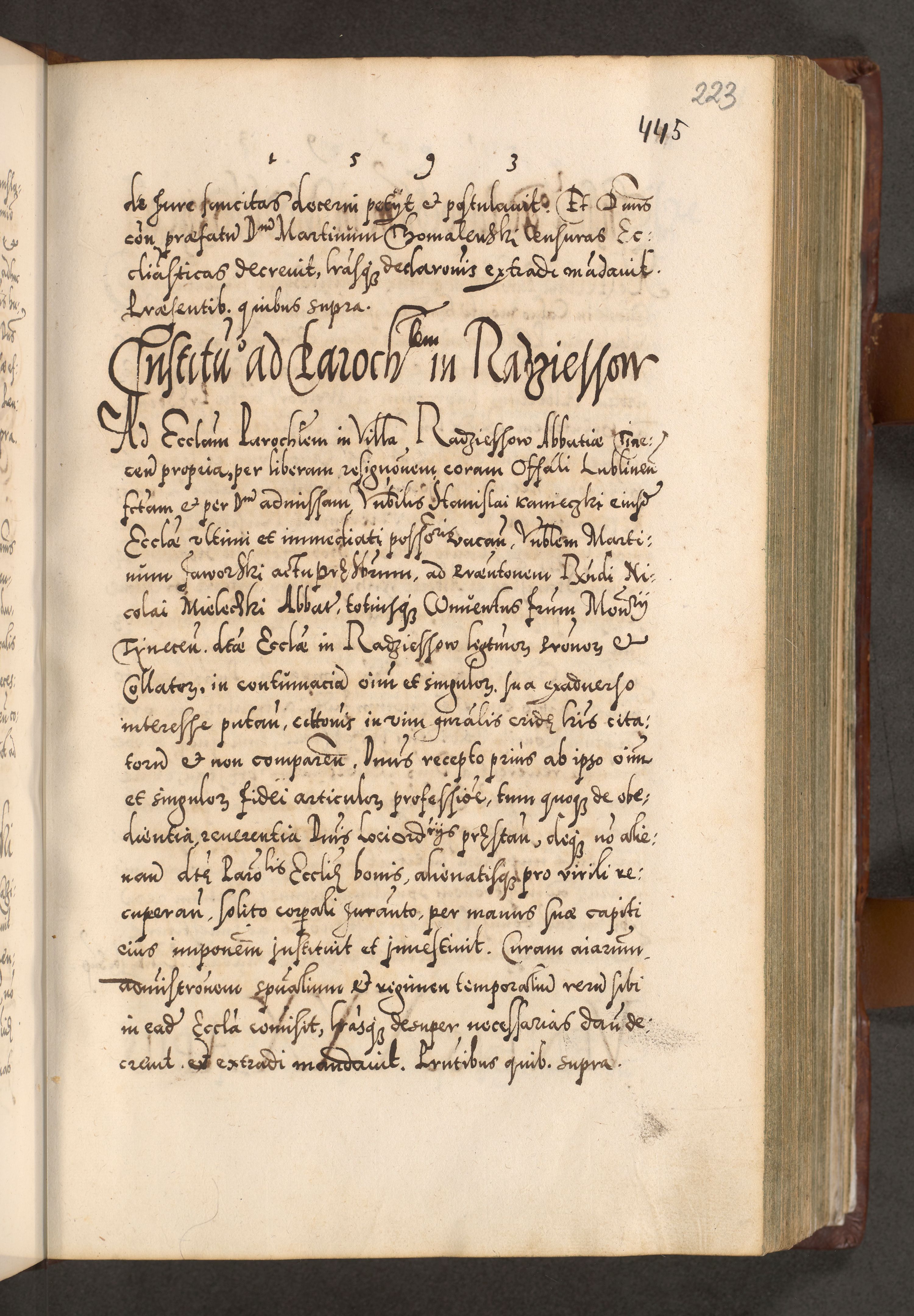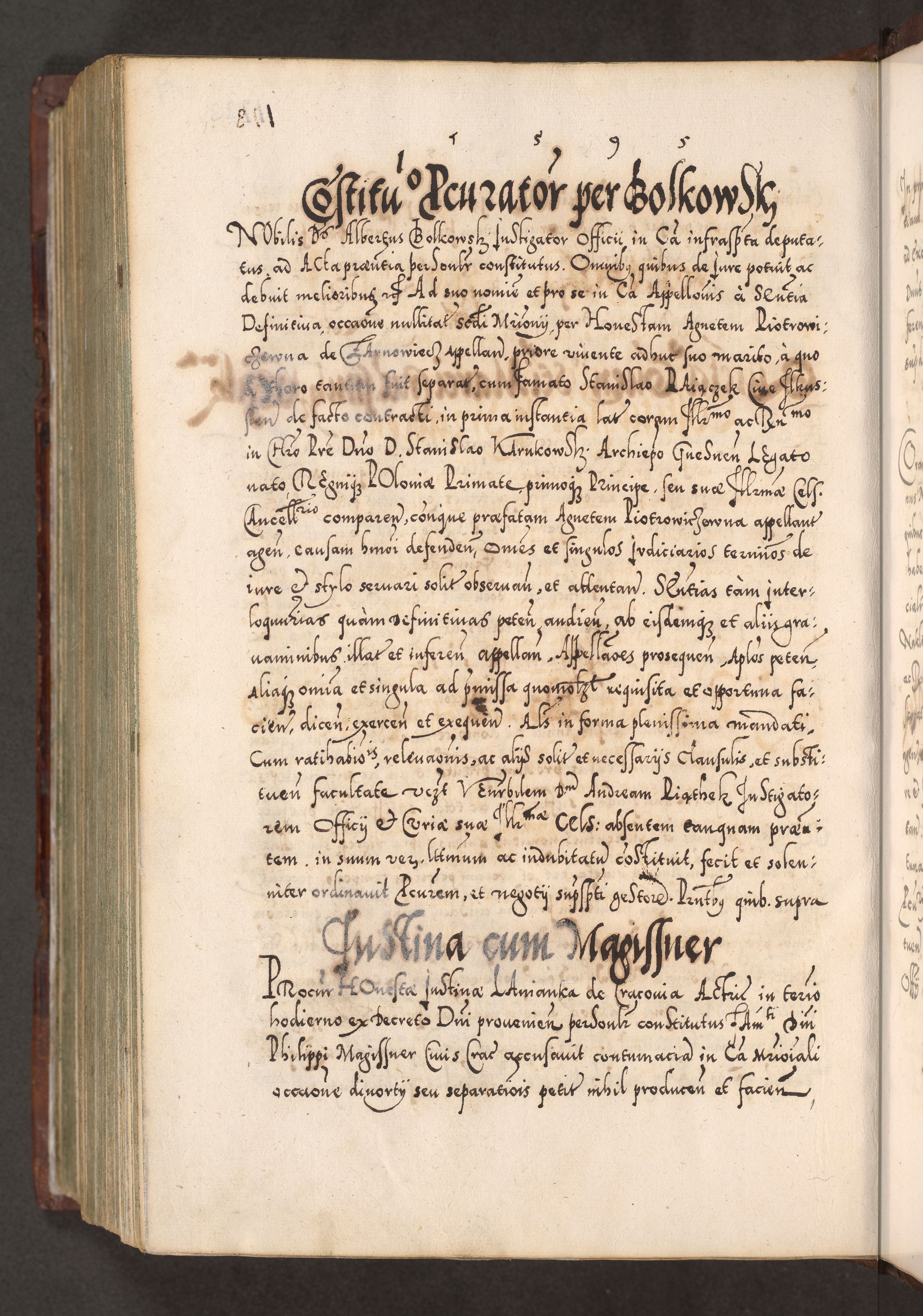 Illistrissimo et revedissimo in Christo Patre Domino Domino Georgio Rzadziwił Miserone Divina Sacrostae R. E. Tituli S. Sixti Presbitero Cardinali Duce in Olyka et Niesswiesz ad Gubernacula Ecclessiae Cracoviensis cuius administratorialem a Sancta Sede Apostolica obtinverat feliciter sedente. Acta actorum, causarum, sententiarum tam deffinitivarum quam interloquutoriarum decretorum, obligationum, quietationum, recognitionum, constitutionum procuratorum etc. coram Reverendo Domino Stanislao Crassinskz de Crasne Archidiacono Cracoviensis, Scholastico Gnesnesis, Custode Plocensis etc. Vicario et Officiali Generali Cracoviensi in Ano Domini Millesimo Quingentesimo Nonagesimo Primo cuius indictio quarta pontificatus SS. Domini Nostri Gregorii XIIII Anno I psius prio feliciter incipiut