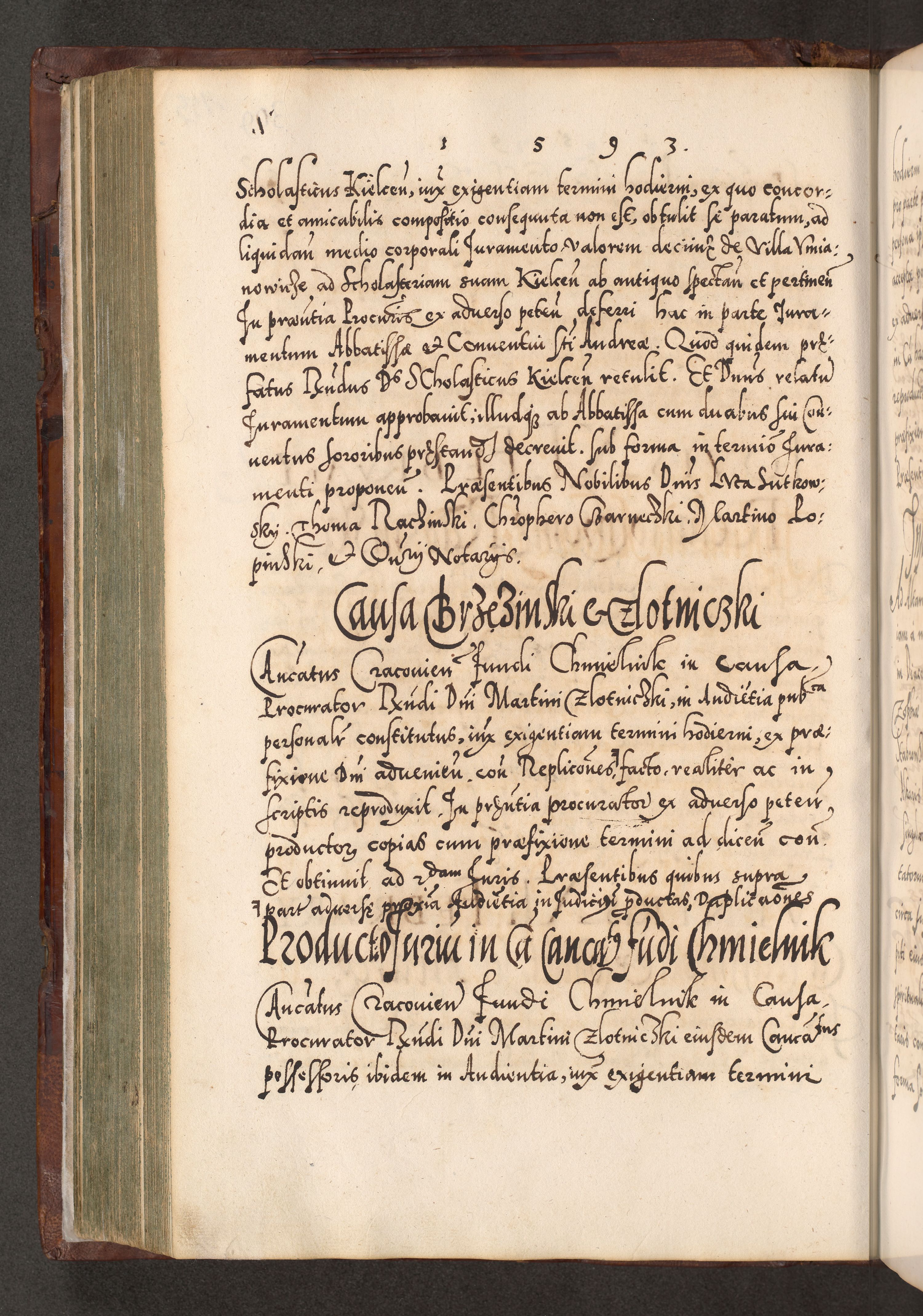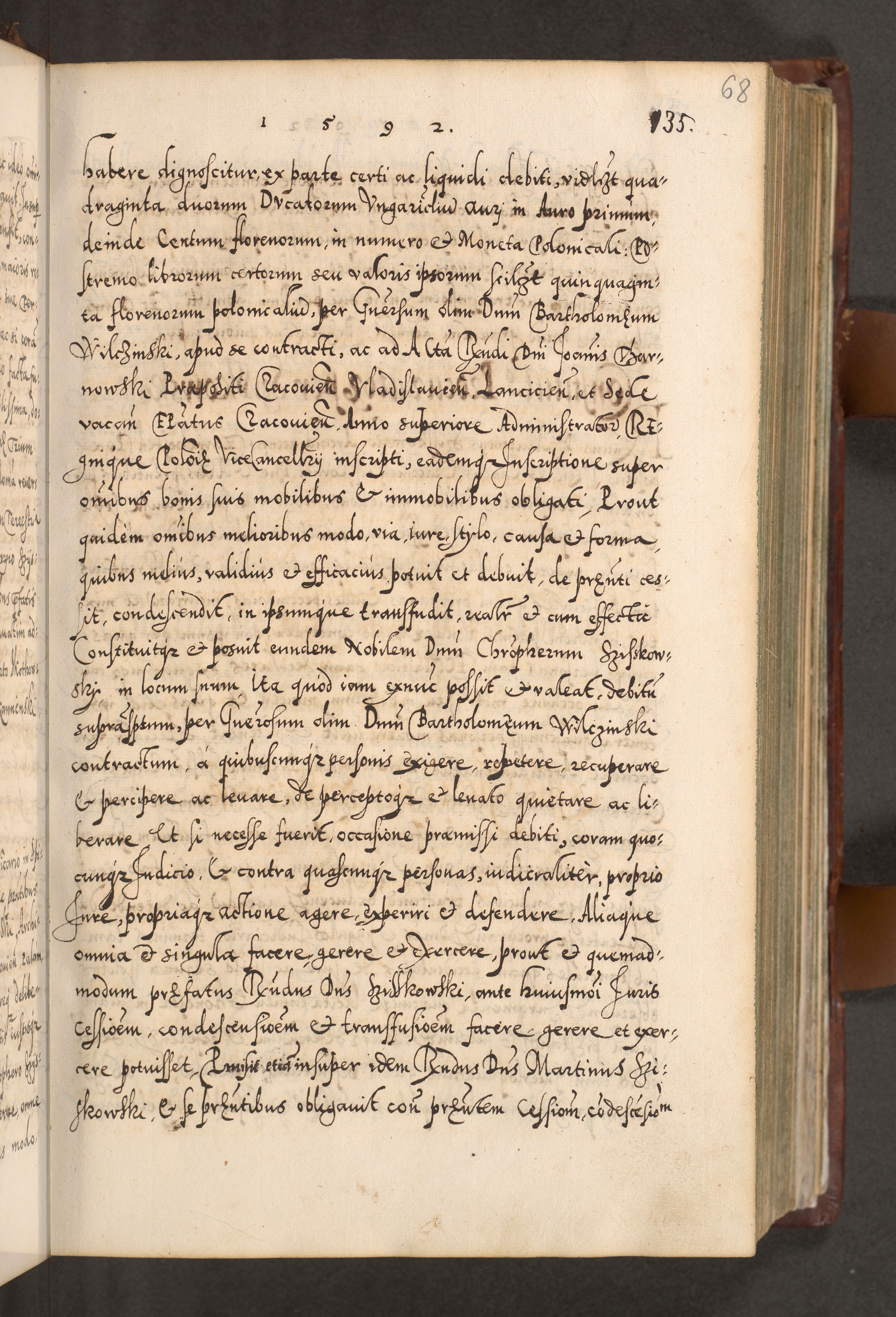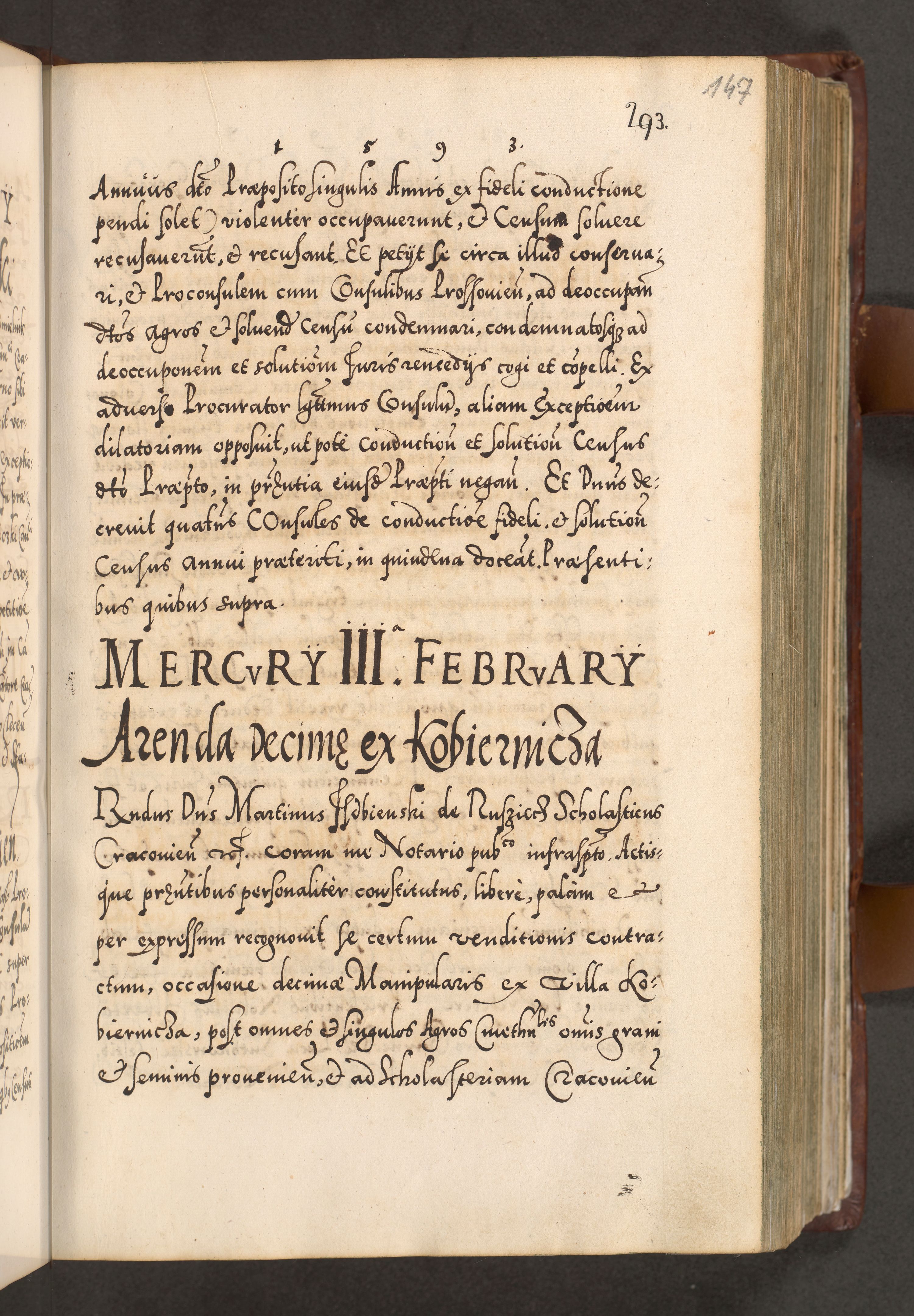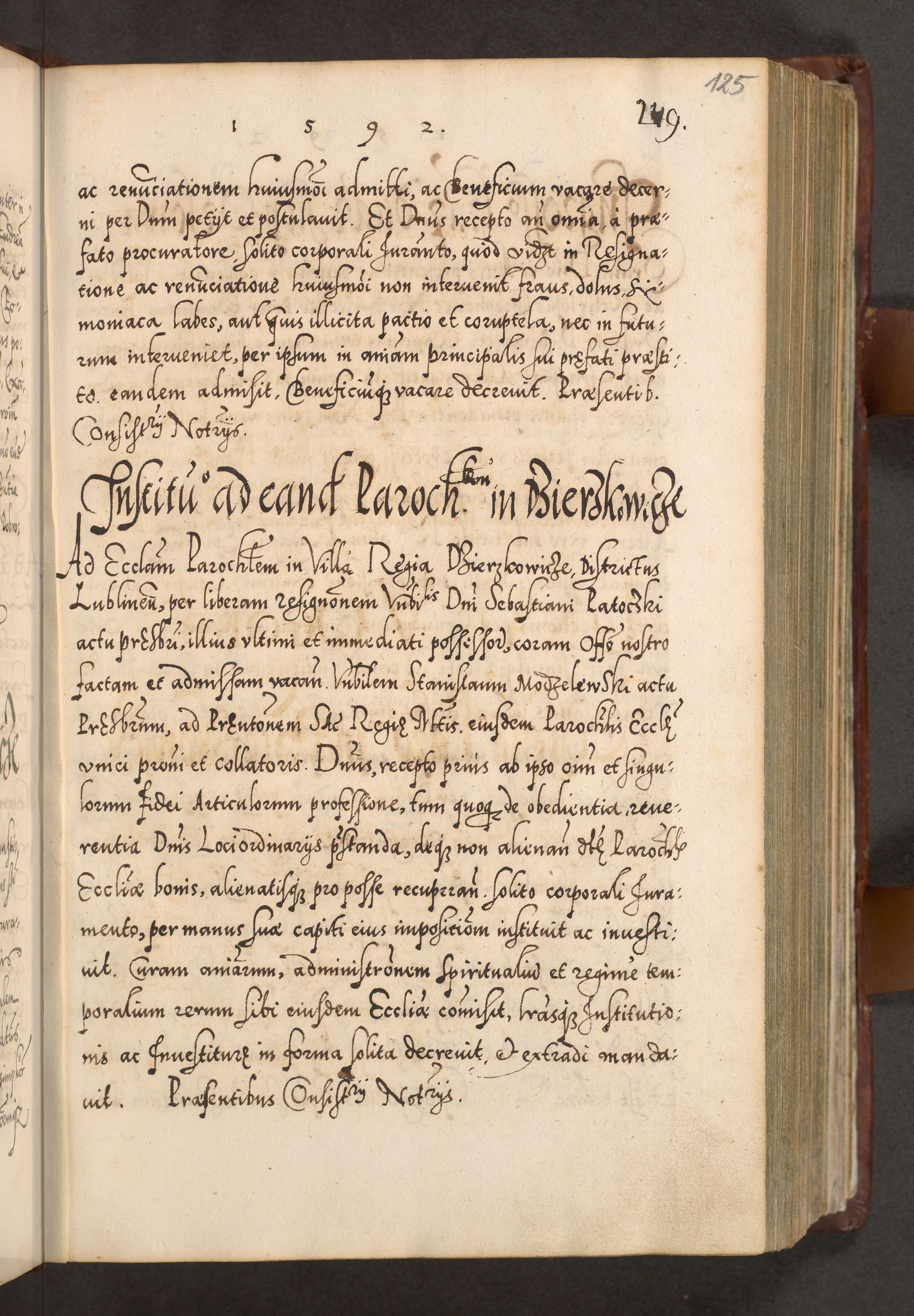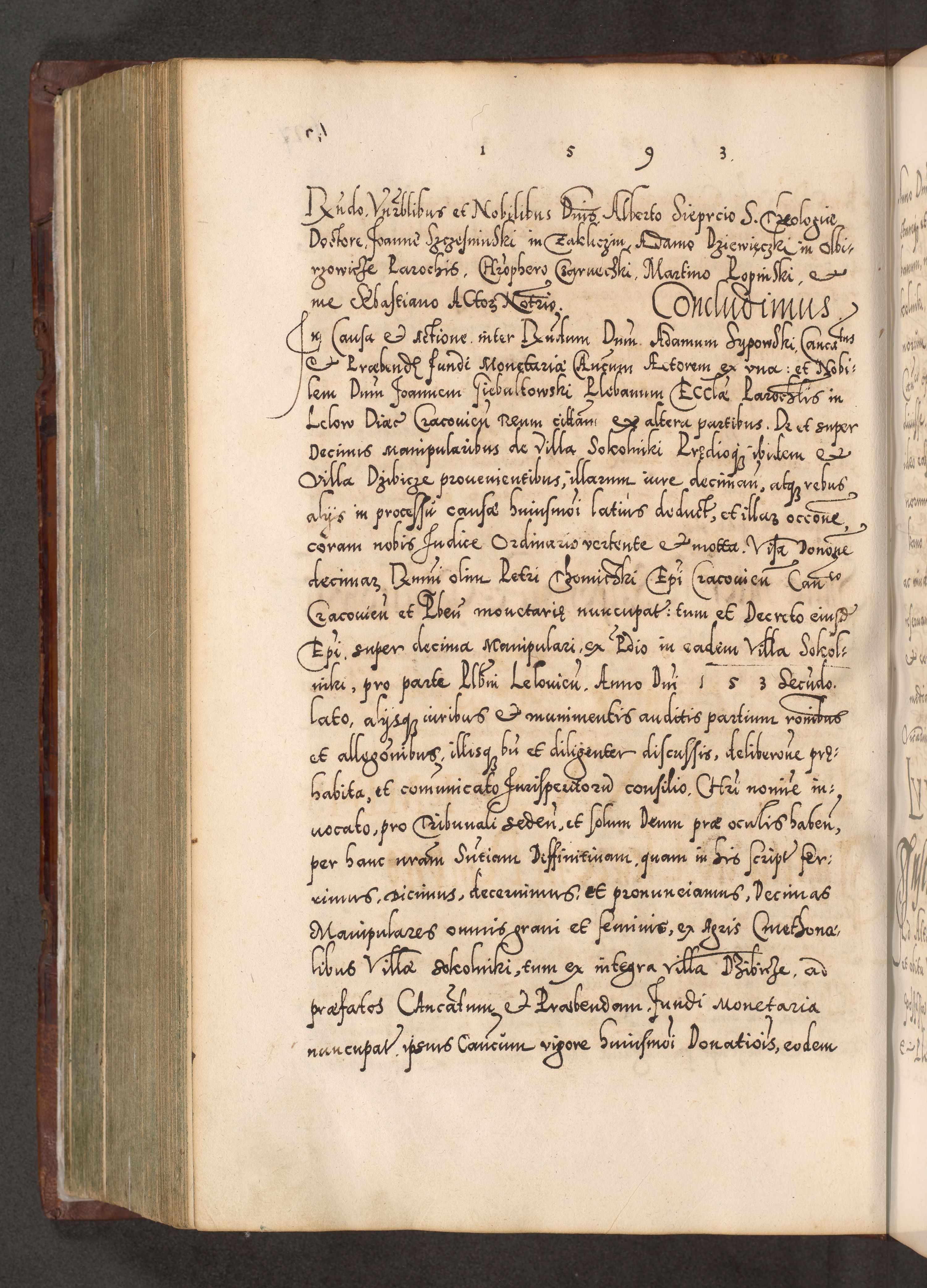 Illistrissimo et revedissimo in Christo Patre Domino Domino Georgio Rzadziwił Miserone Divina Sacrostae R. E. Tituli S. Sixti Presbitero Cardinali Duce in Olyka et Niesswiesz ad Gubernacula Ecclessiae Cracoviensis cuius administratorialem a Sancta Sede Apostolica obtinverat feliciter sedente. Acta actorum, causarum, sententiarum tam deffinitivarum quam interloquutoriarum decretorum, obligationum, quietationum, recognitionum, constitutionum procuratorum etc. coram Reverendo Domino Stanislao Crassinskz de Crasne Archidiacono Cracoviensis, Scholastico Gnesnesis, Custode Plocensis etc. Vicario et Officiali Generali Cracoviensi in Ano Domini Millesimo Quingentesimo Nonagesimo Primo cuius indictio quarta pontificatus SS. Domini Nostri Gregorii XIIII Anno I psius prio feliciter incipiut