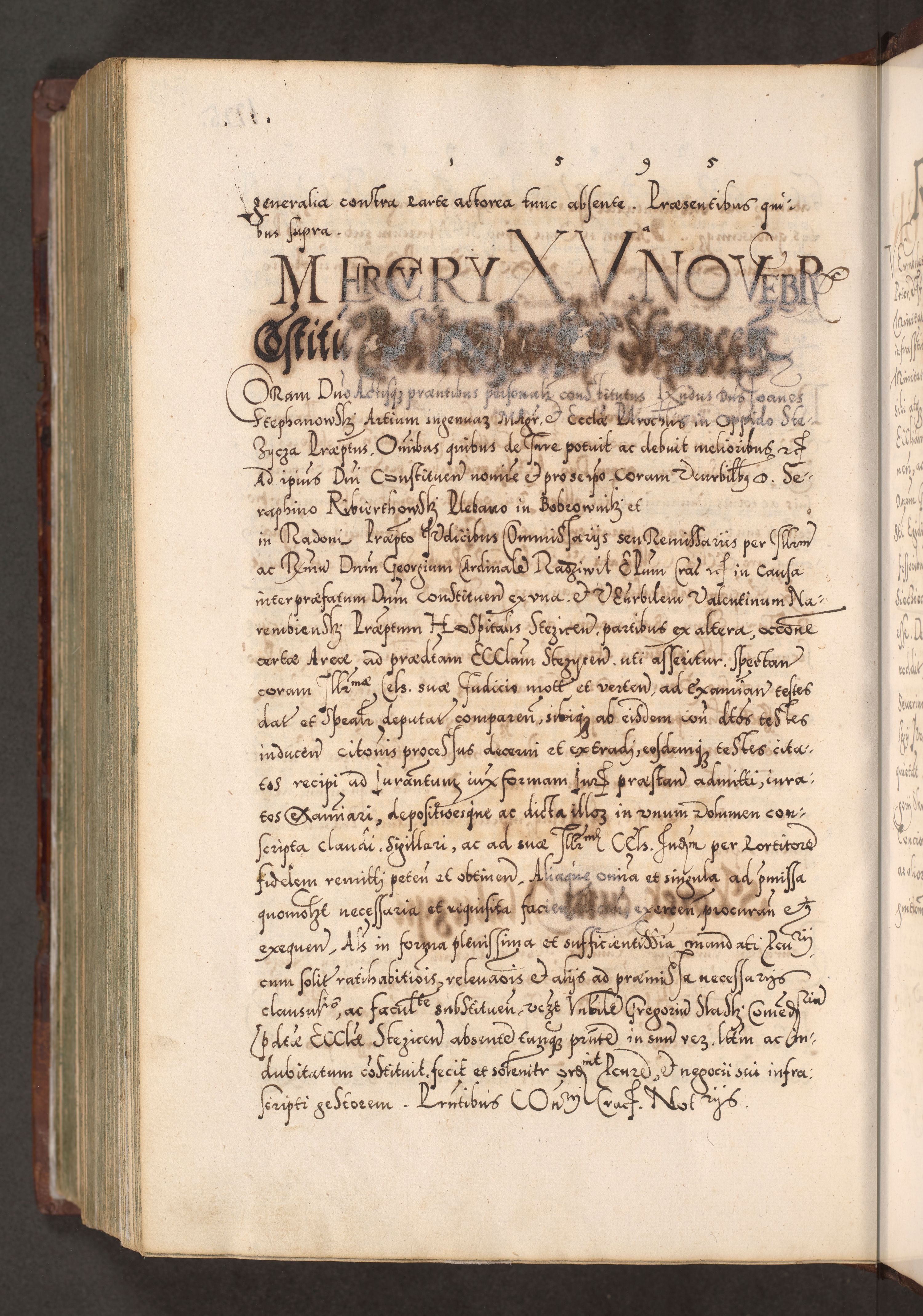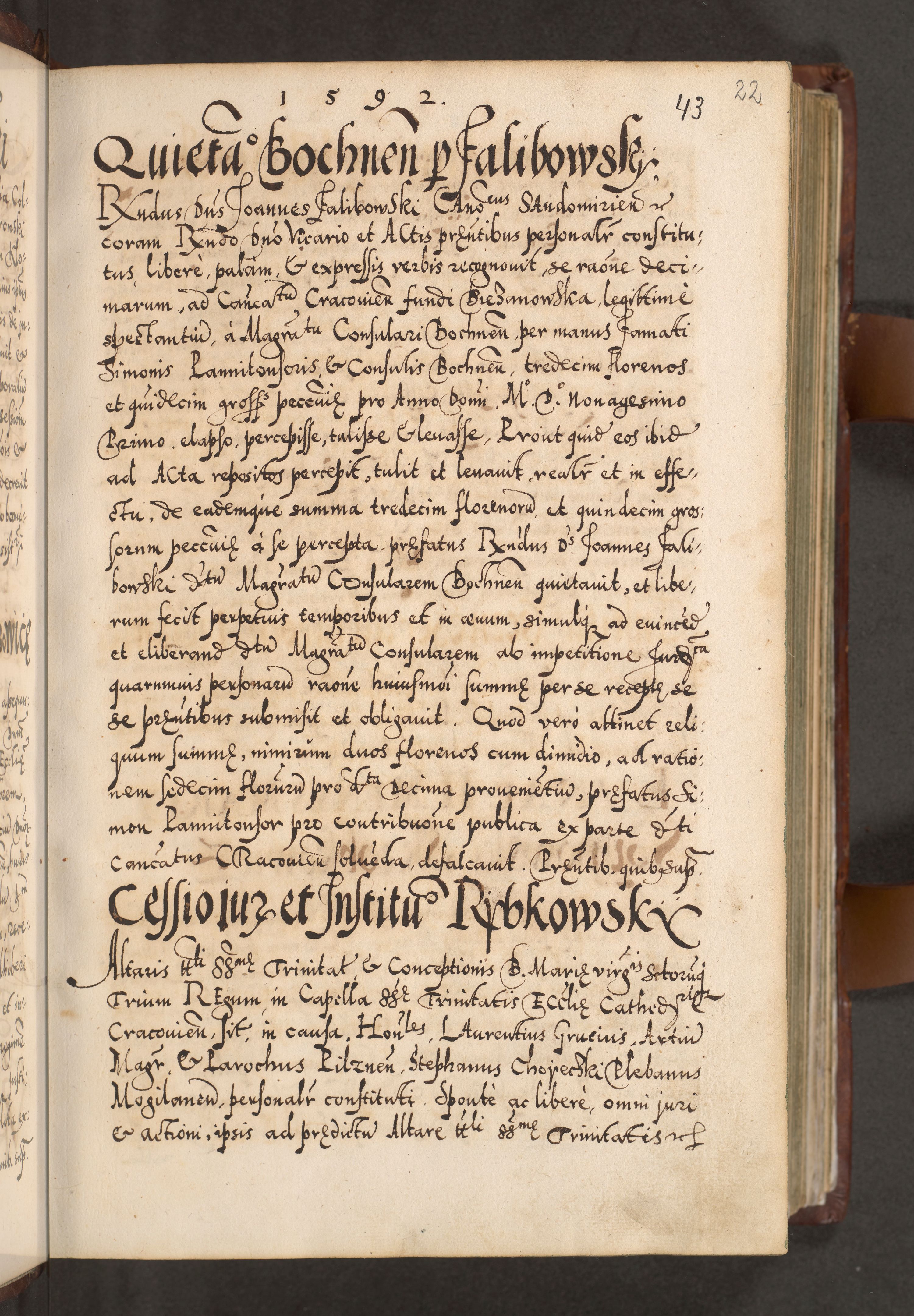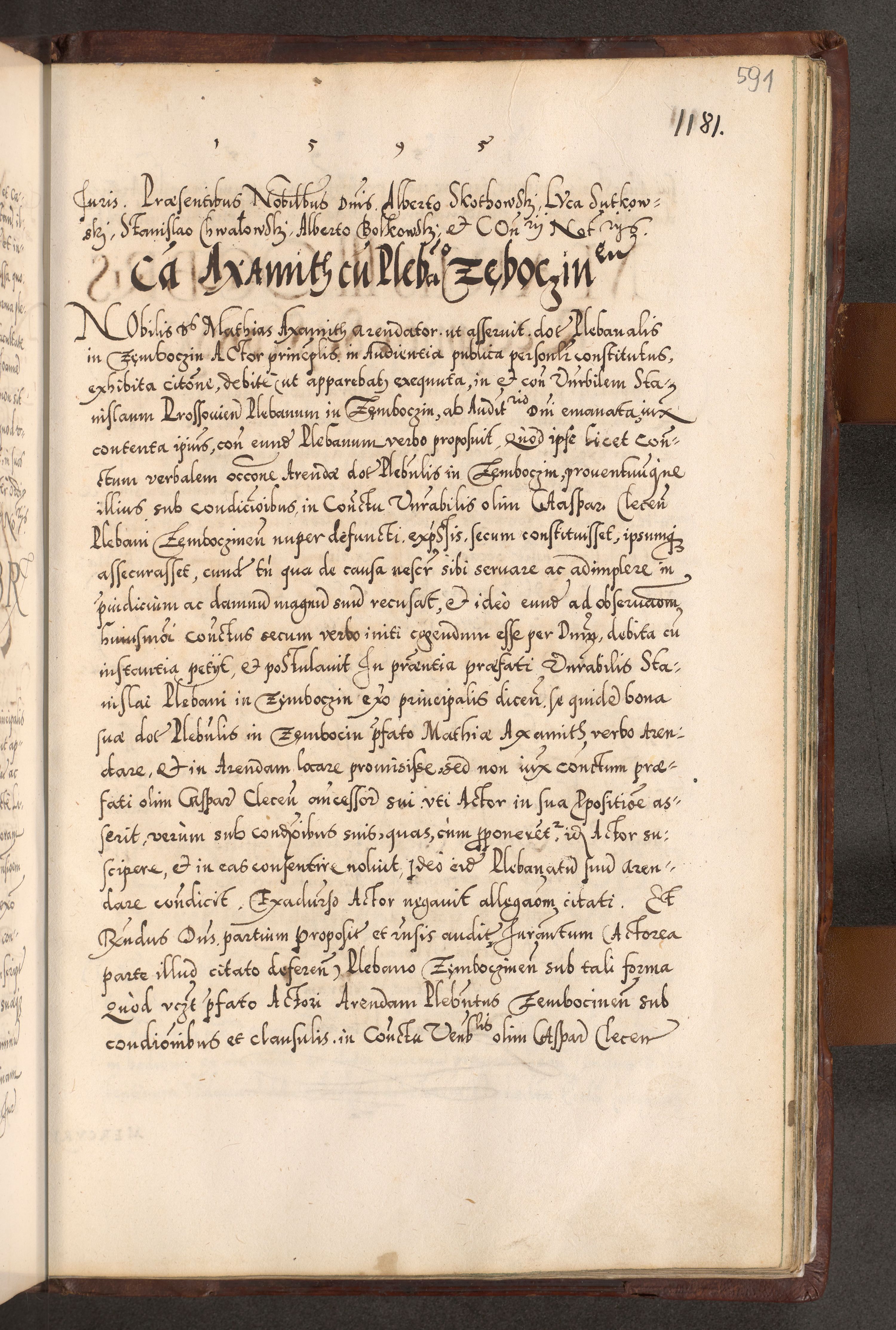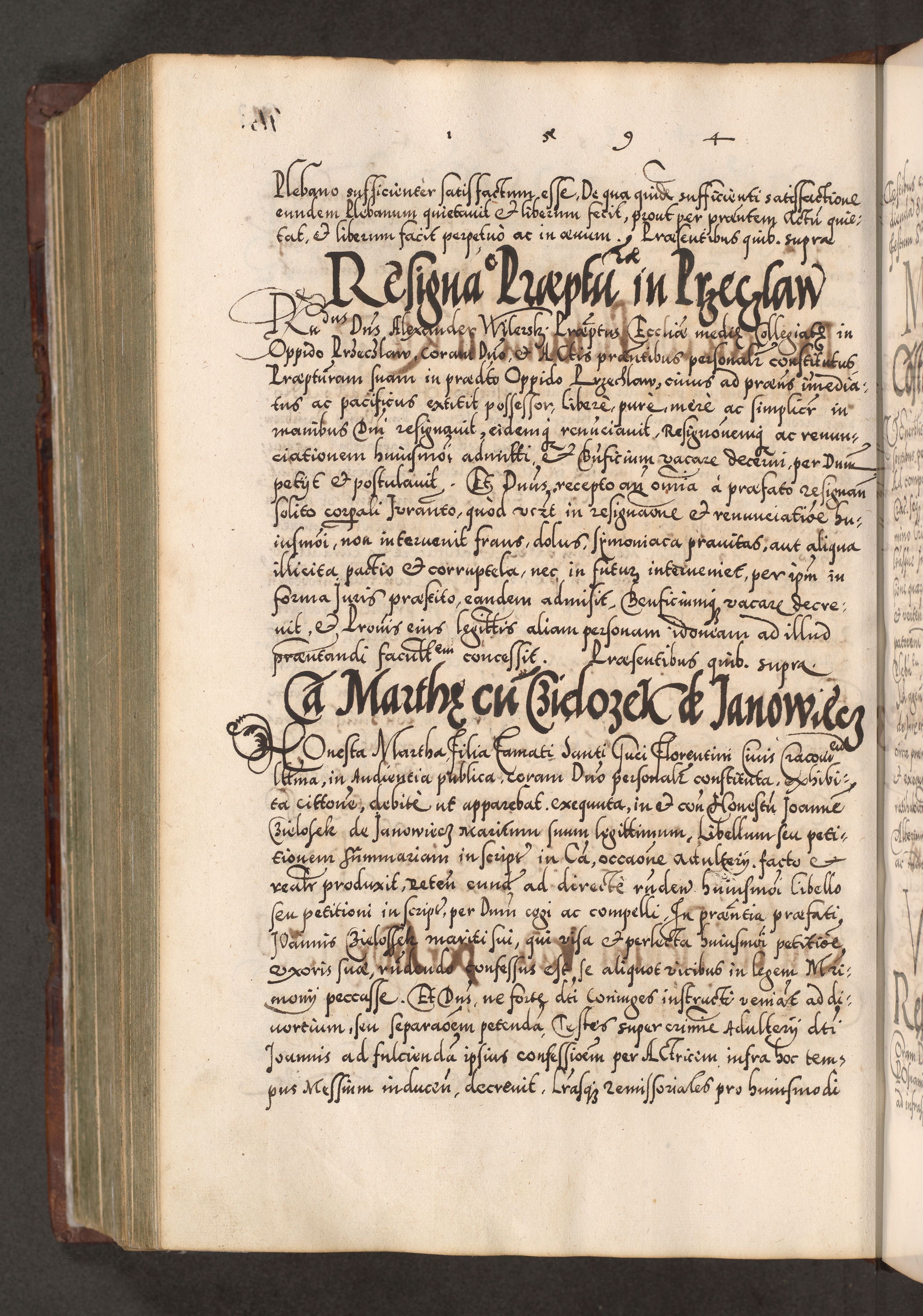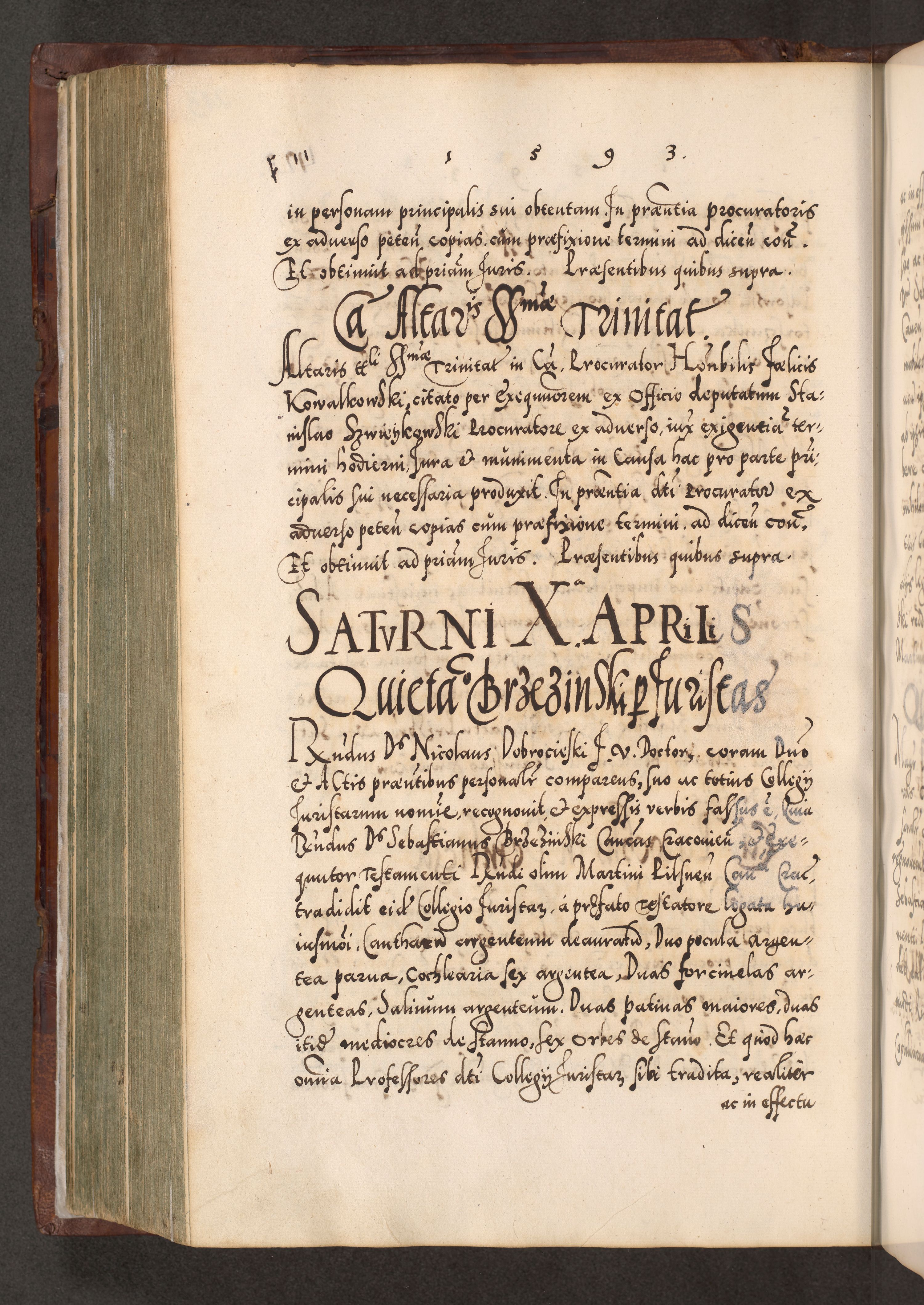 Illistrissimo et revedissimo in Christo Patre Domino Domino Georgio Rzadziwił Miserone Divina Sacrostae R. E. Tituli S. Sixti Presbitero Cardinali Duce in Olyka et Niesswiesz ad Gubernacula Ecclessiae Cracoviensis cuius administratorialem a Sancta Sede Apostolica obtinverat feliciter sedente. Acta actorum, causarum, sententiarum tam deffinitivarum quam interloquutoriarum decretorum, obligationum, quietationum, recognitionum, constitutionum procuratorum etc. coram Reverendo Domino Stanislao Crassinskz de Crasne Archidiacono Cracoviensis, Scholastico Gnesnesis, Custode Plocensis etc. Vicario et Officiali Generali Cracoviensi in Ano Domini Millesimo Quingentesimo Nonagesimo Primo cuius indictio quarta pontificatus SS. Domini Nostri Gregorii XIIII Anno I psius prio feliciter incipiut