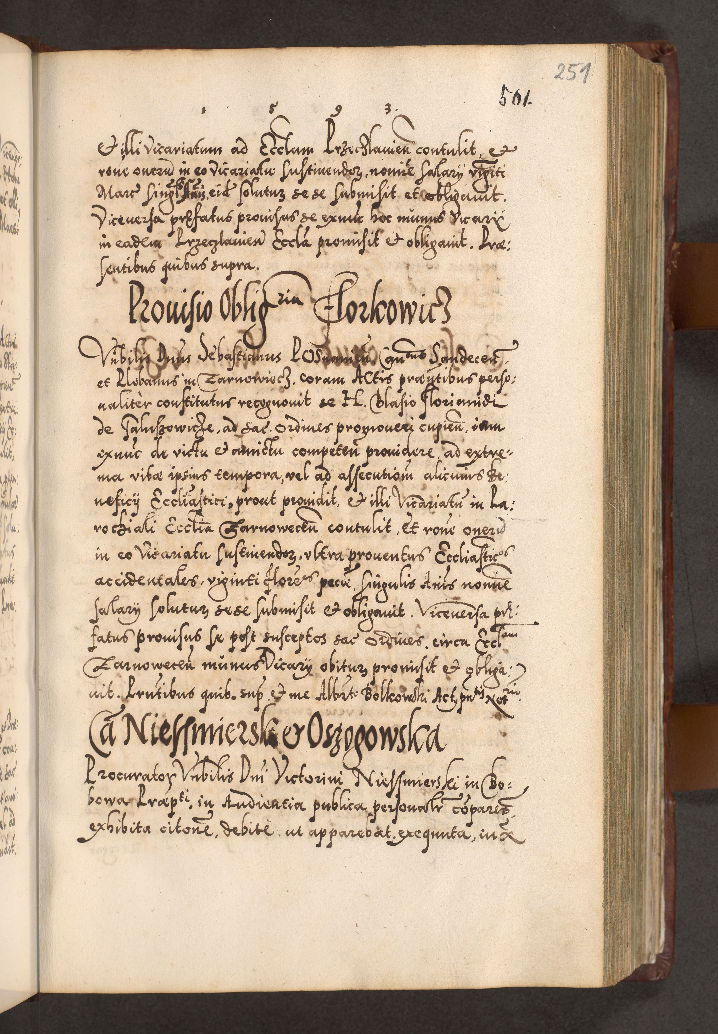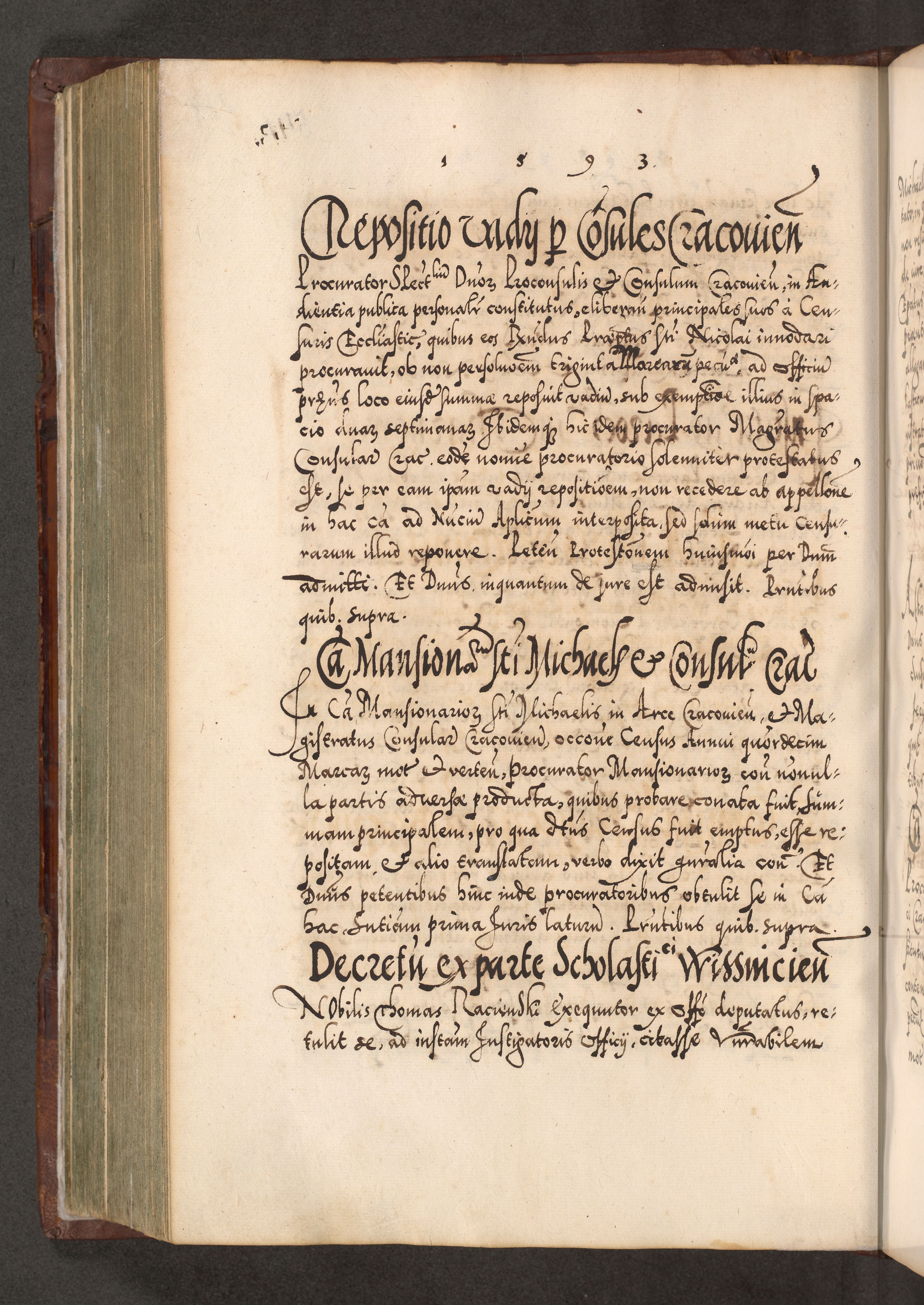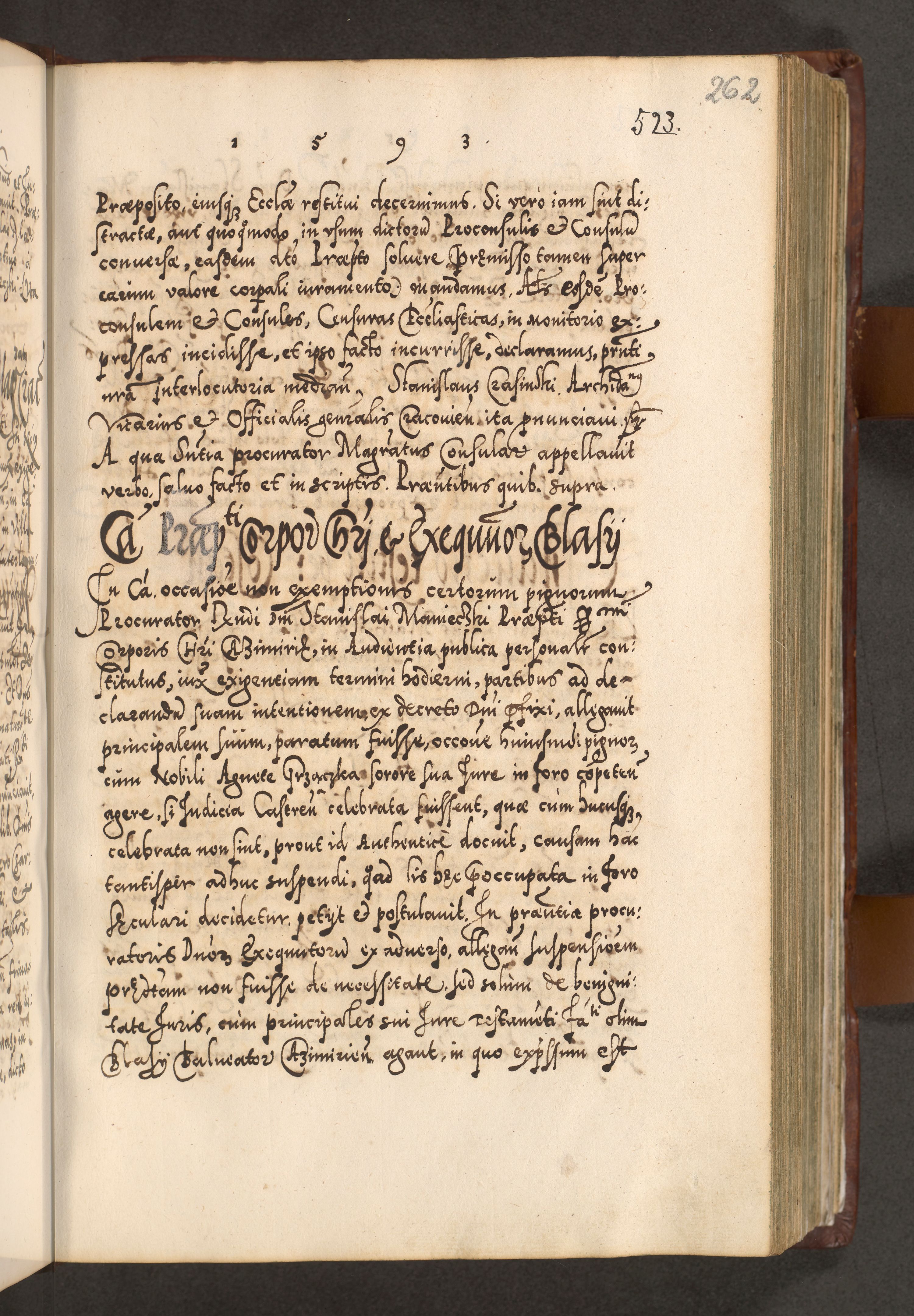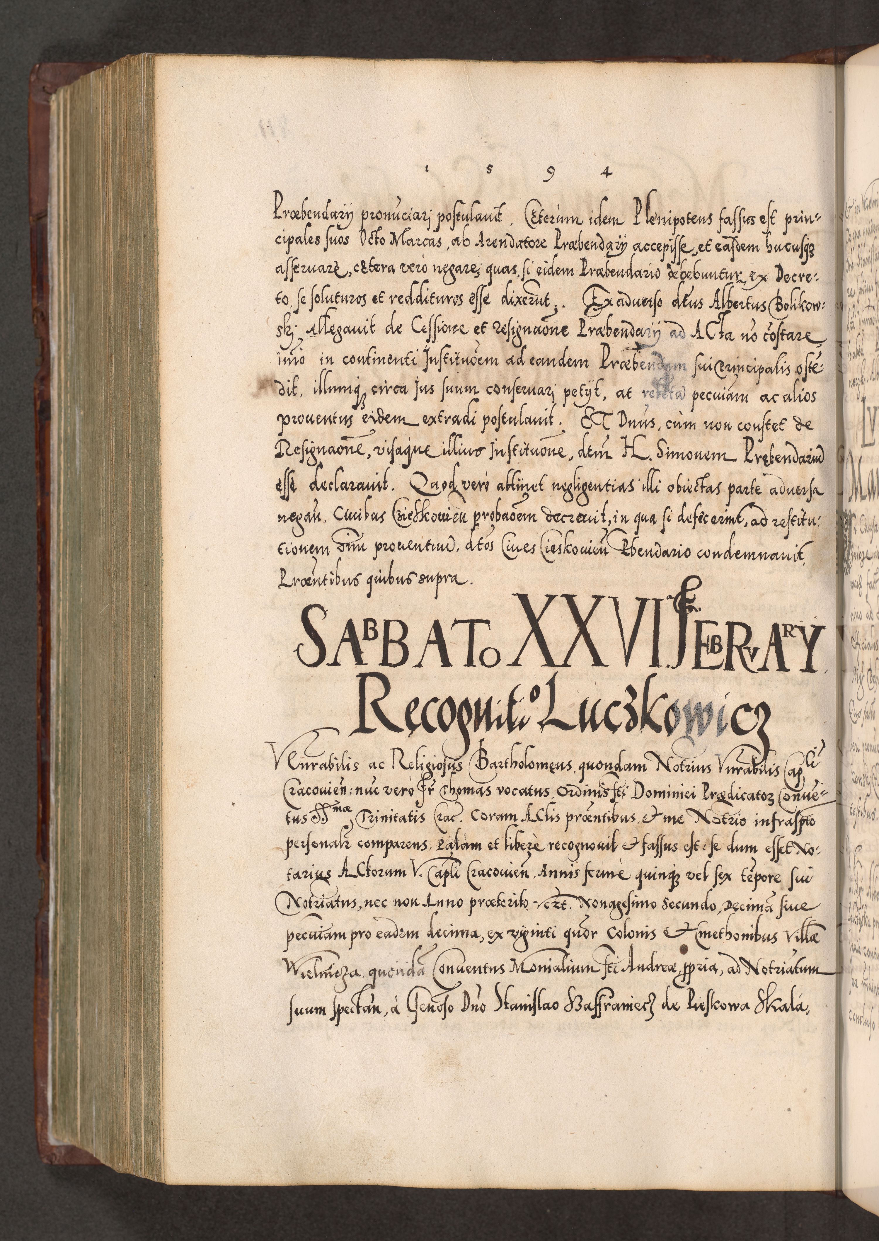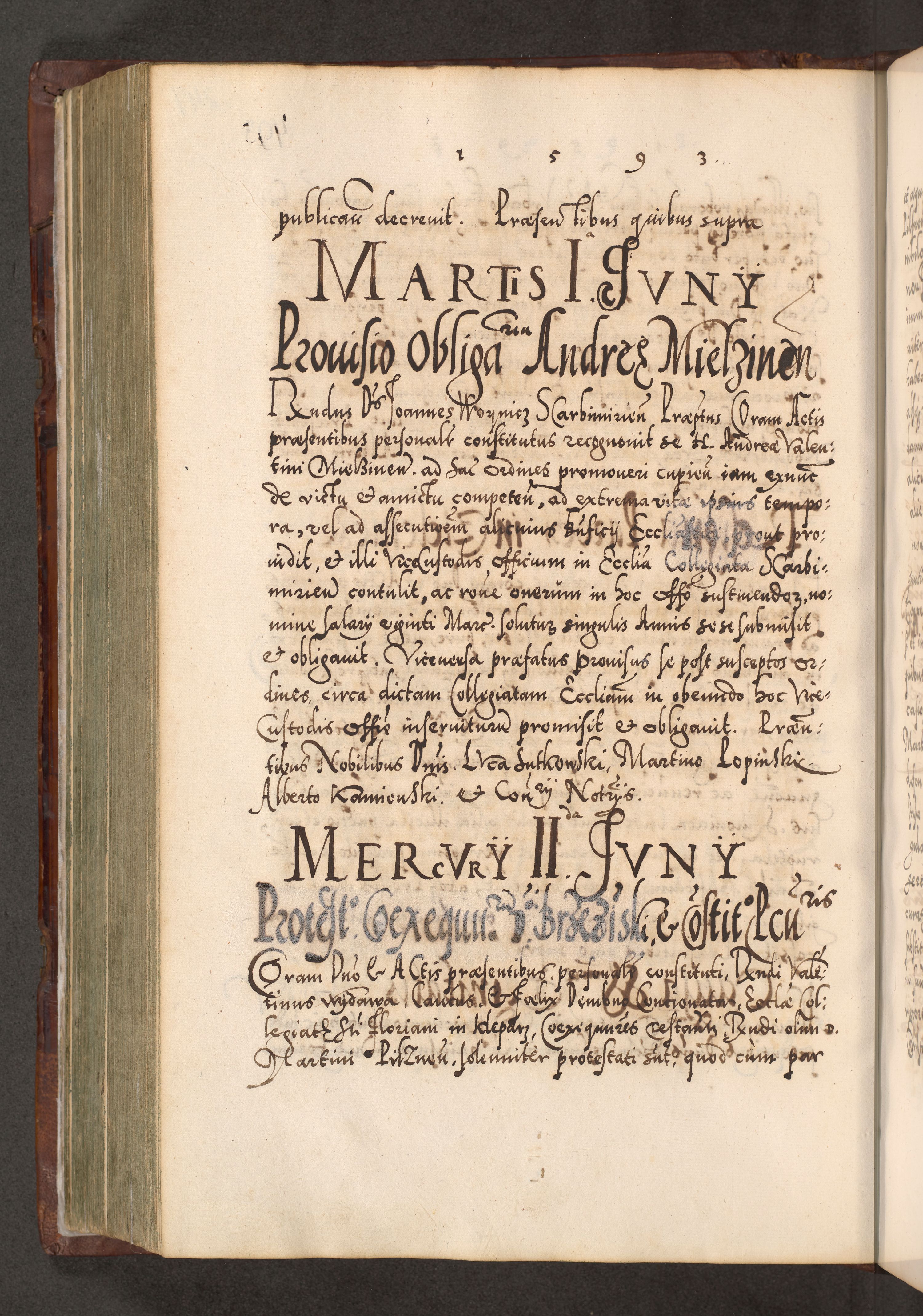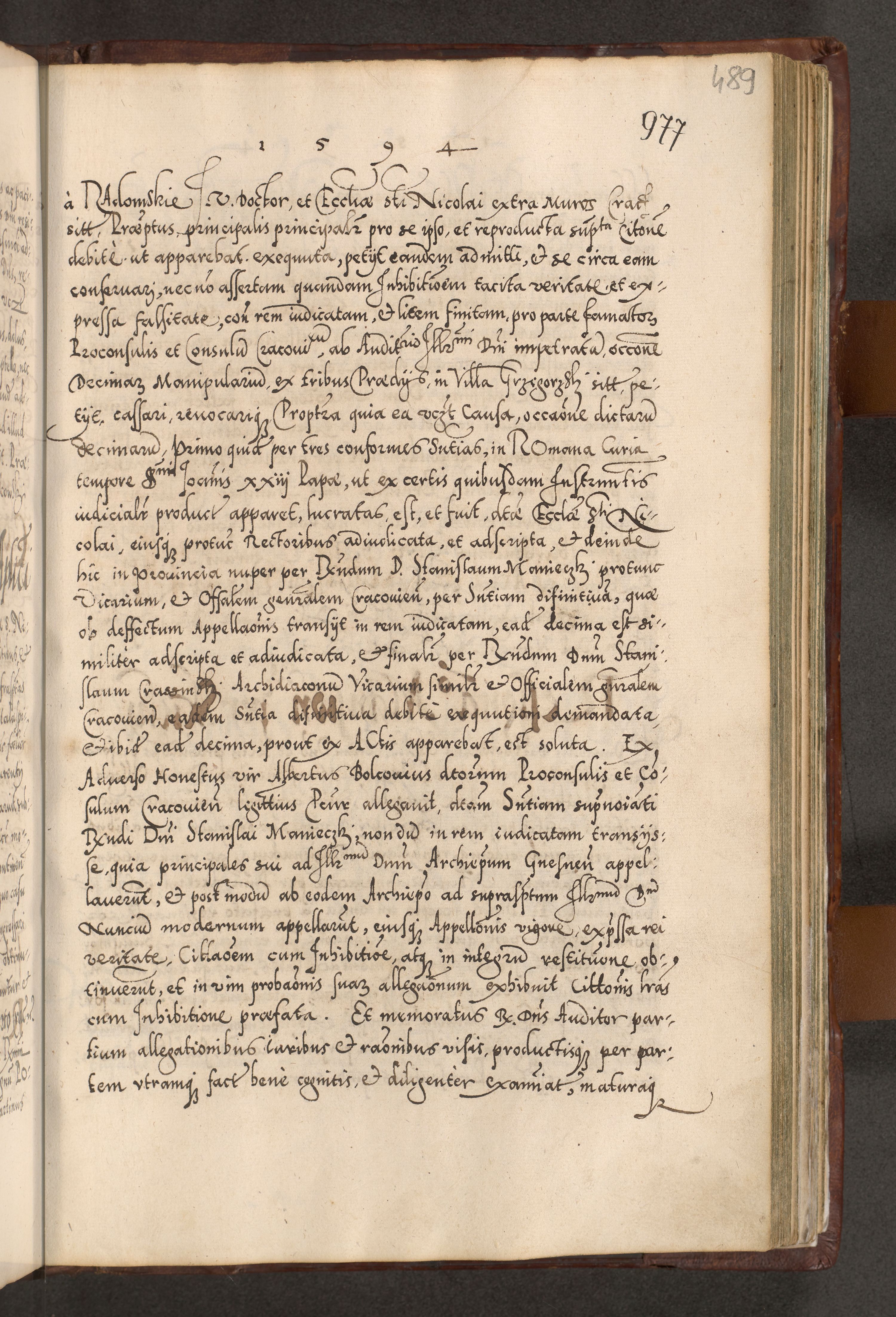 Illistrissimo et revedissimo in Christo Patre Domino Domino Georgio Rzadziwił Miserone Divina Sacrostae R. E. Tituli S. Sixti Presbitero Cardinali Duce in Olyka et Niesswiesz ad Gubernacula Ecclessiae Cracoviensis cuius administratorialem a Sancta Sede Apostolica obtinverat feliciter sedente. Acta actorum, causarum, sententiarum tam deffinitivarum quam interloquutoriarum decretorum, obligationum, quietationum, recognitionum, constitutionum procuratorum etc. coram Reverendo Domino Stanislao Crassinskz de Crasne Archidiacono Cracoviensis, Scholastico Gnesnesis, Custode Plocensis etc. Vicario et Officiali Generali Cracoviensi in Ano Domini Millesimo Quingentesimo Nonagesimo Primo cuius indictio quarta pontificatus SS. Domini Nostri Gregorii XIIII Anno I psius prio feliciter incipiut