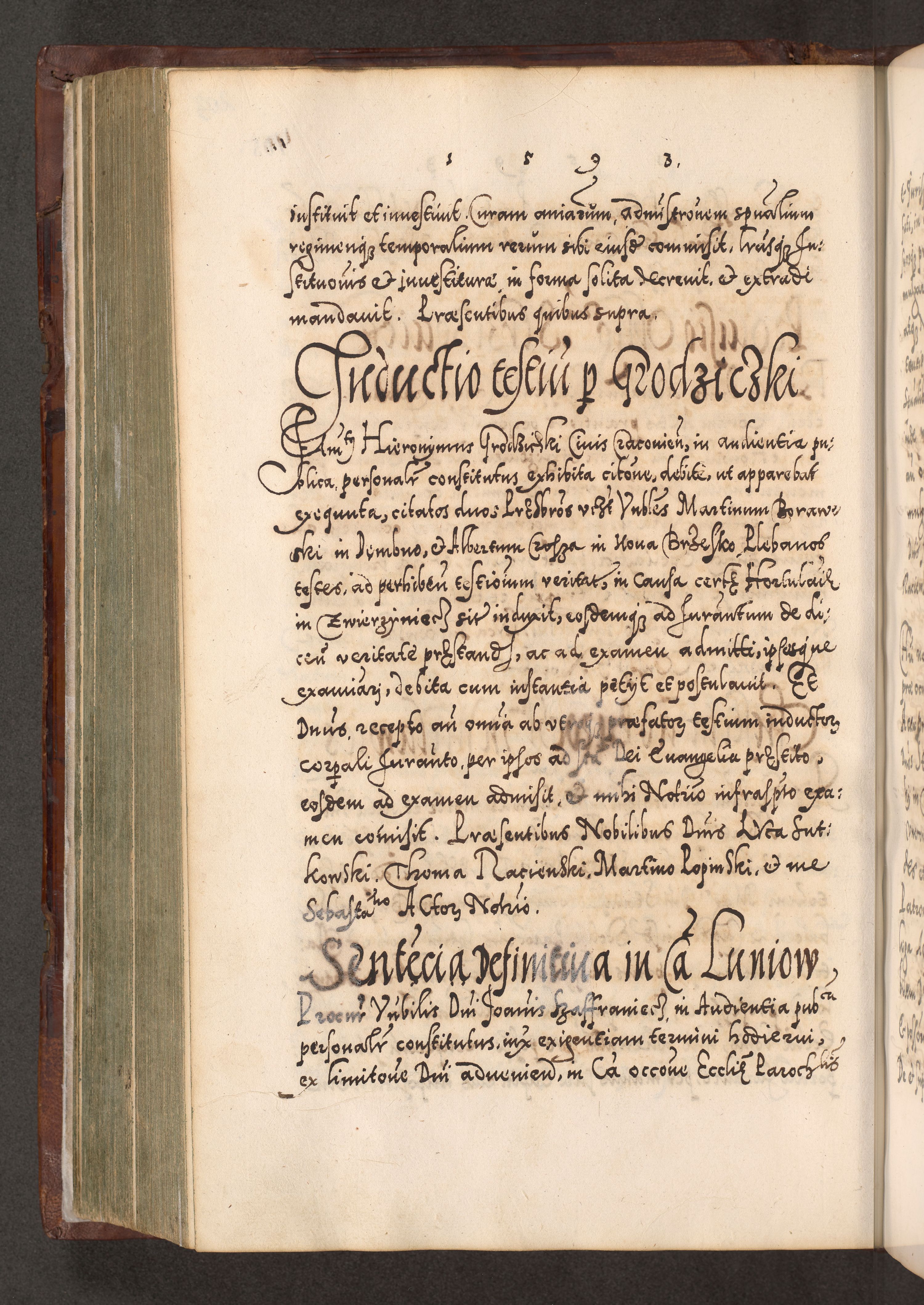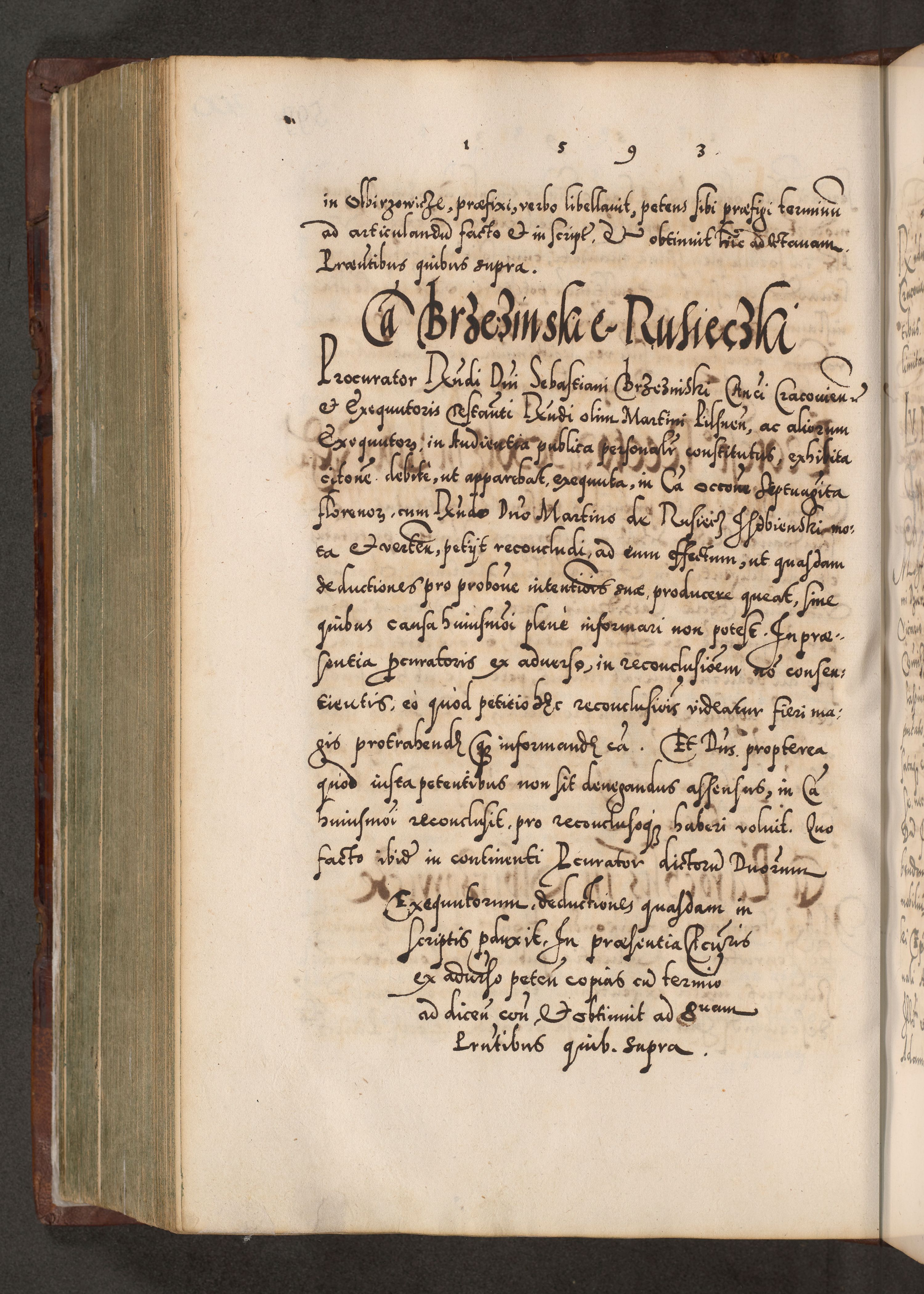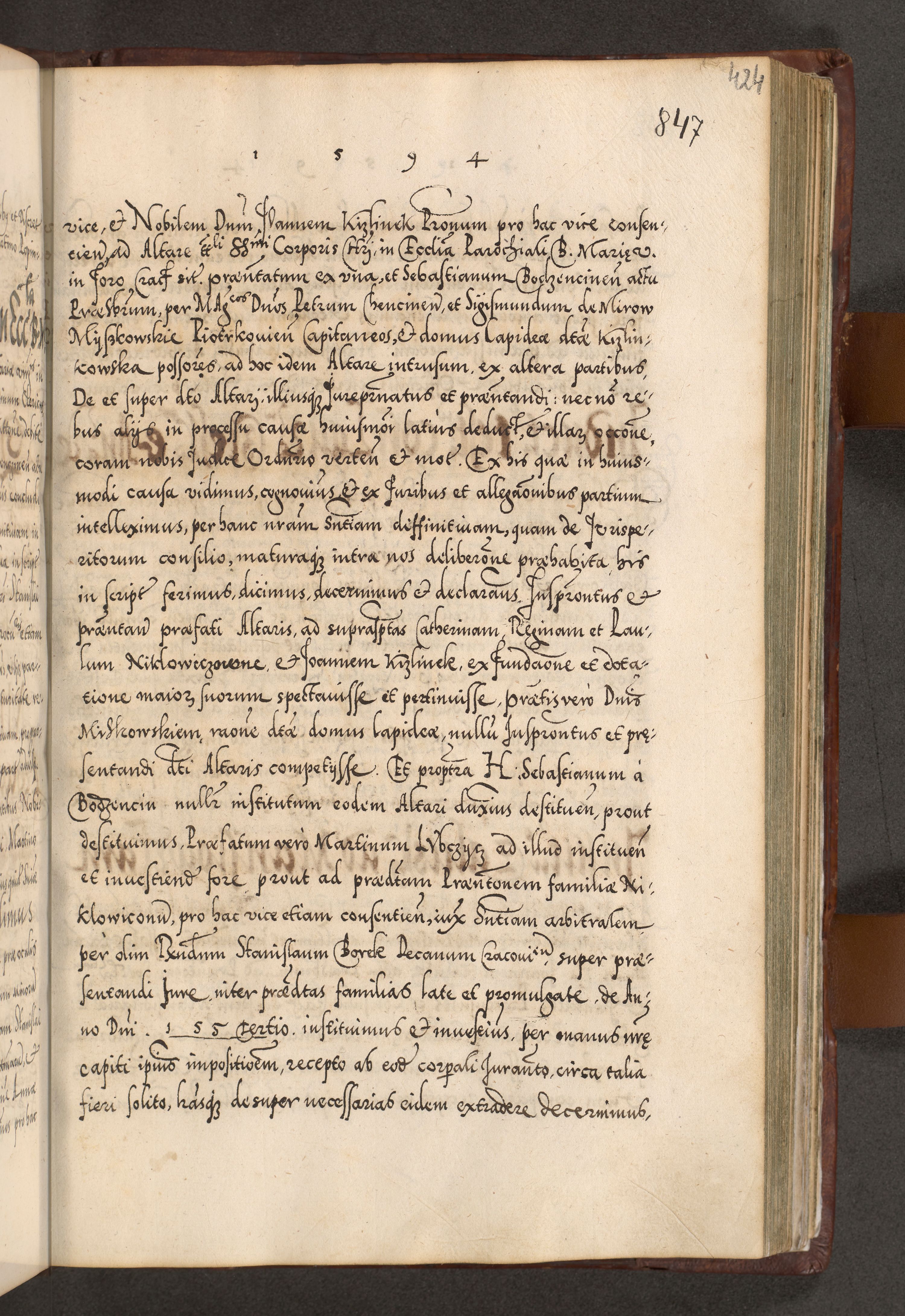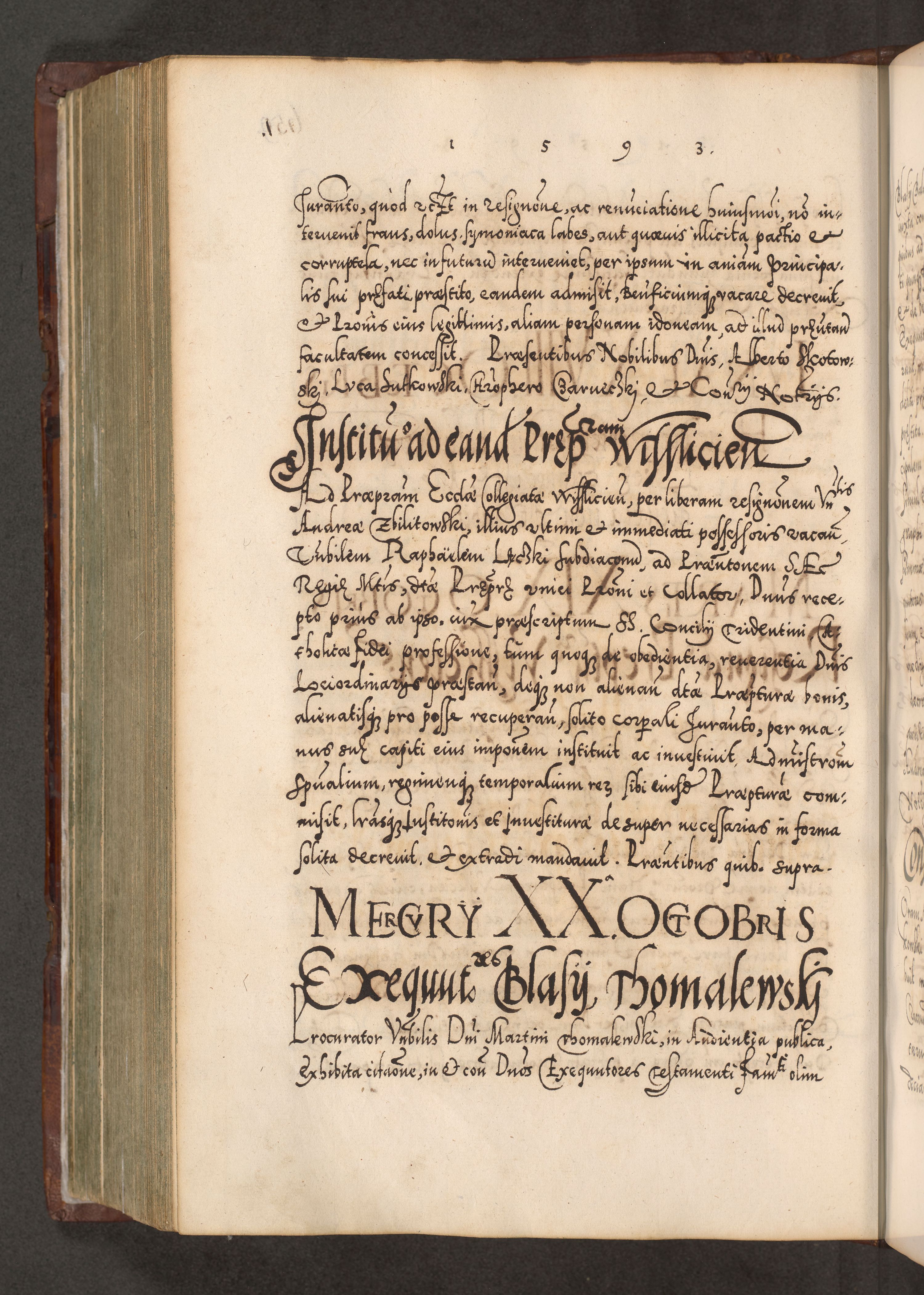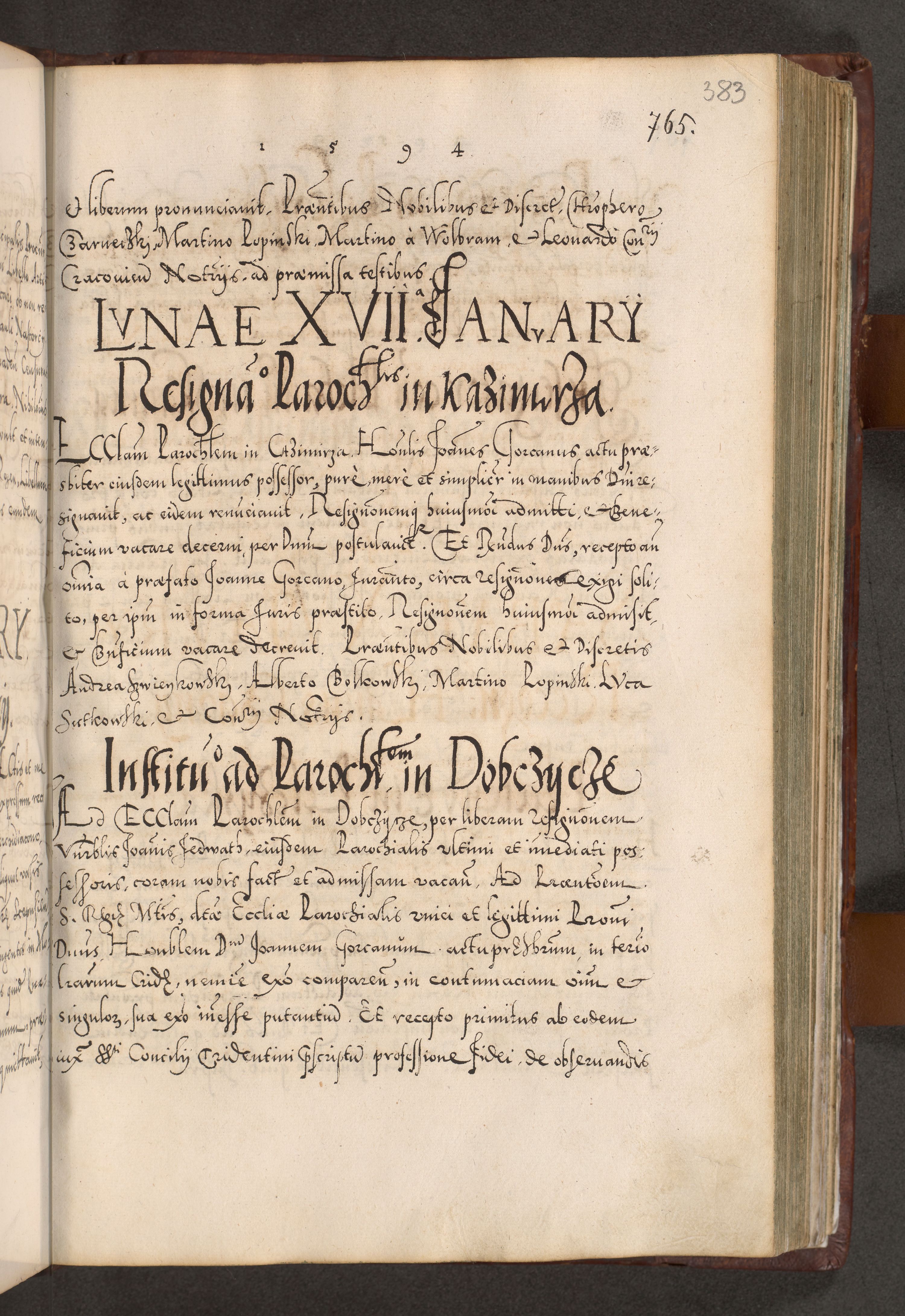 Illistrissimo et revedissimo in Christo Patre Domino Domino Georgio Rzadziwił Miserone Divina Sacrostae R. E. Tituli S. Sixti Presbitero Cardinali Duce in Olyka et Niesswiesz ad Gubernacula Ecclessiae Cracoviensis cuius administratorialem a Sancta Sede Apostolica obtinverat feliciter sedente. Acta actorum, causarum, sententiarum tam deffinitivarum quam interloquutoriarum decretorum, obligationum, quietationum, recognitionum, constitutionum procuratorum etc. coram Reverendo Domino Stanislao Crassinskz de Crasne Archidiacono Cracoviensis, Scholastico Gnesnesis, Custode Plocensis etc. Vicario et Officiali Generali Cracoviensi in Ano Domini Millesimo Quingentesimo Nonagesimo Primo cuius indictio quarta pontificatus SS. Domini Nostri Gregorii XIIII Anno I psius prio feliciter incipiut