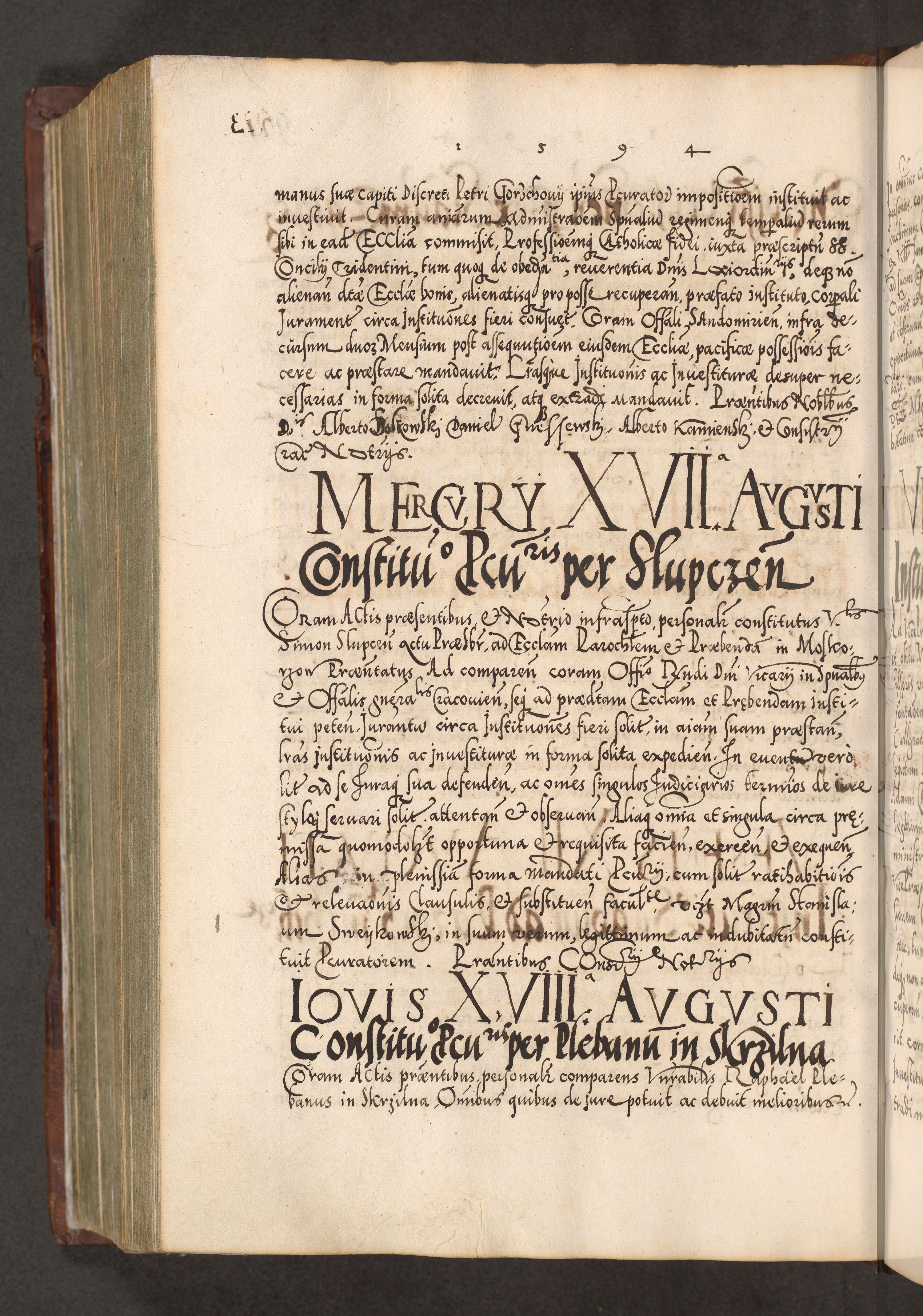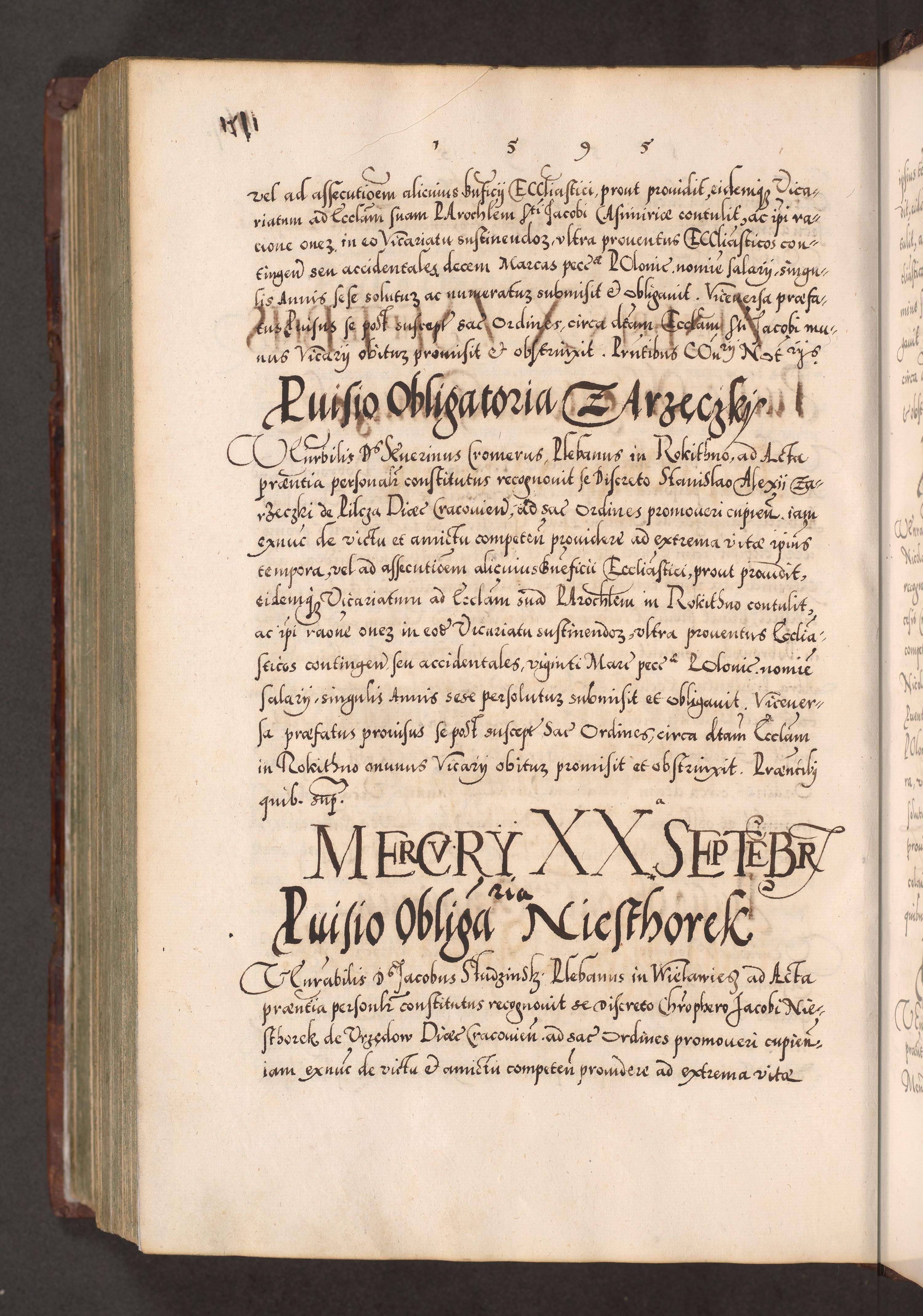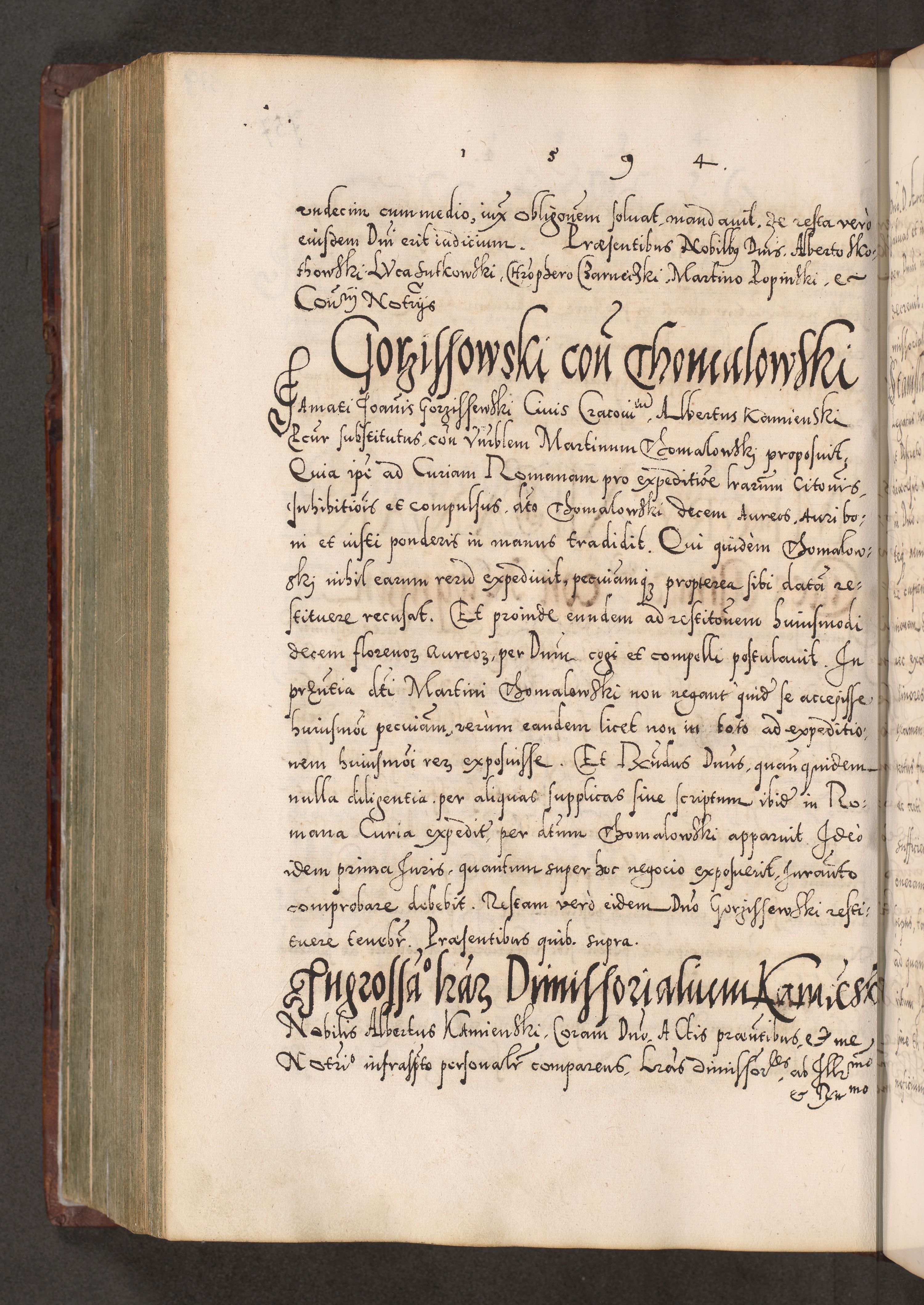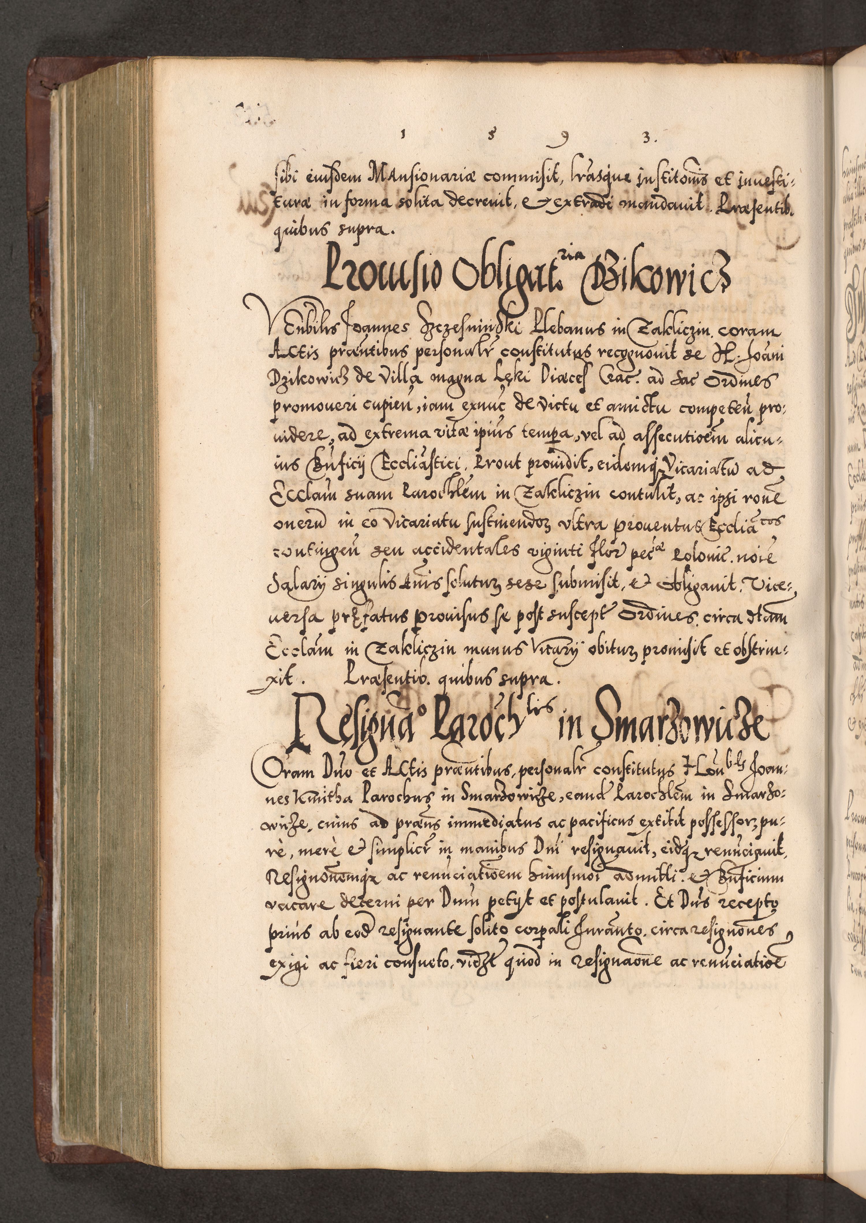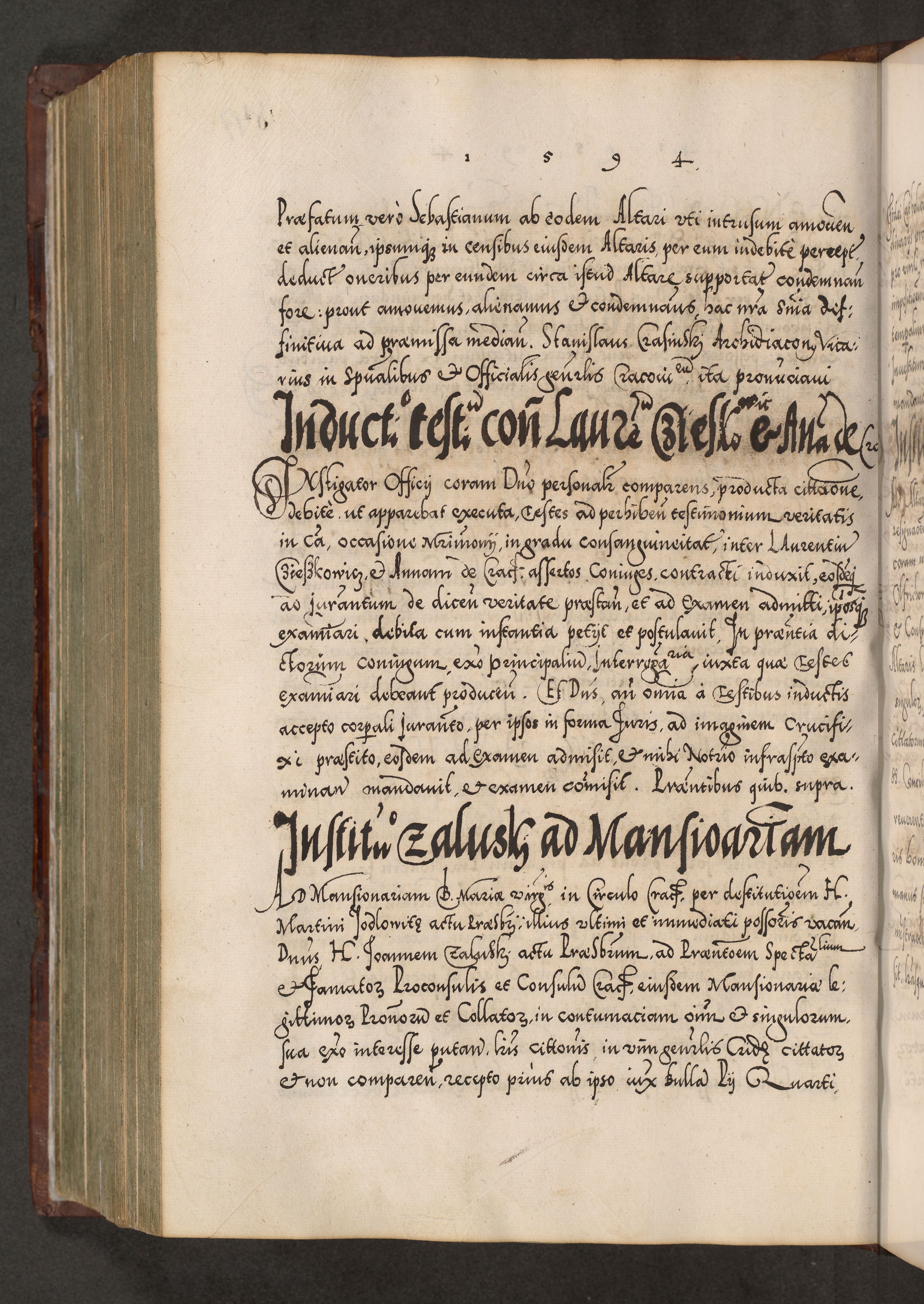 Illistrissimo et revedissimo in Christo Patre Domino Domino Georgio Rzadziwił Miserone Divina Sacrostae R. E. Tituli S. Sixti Presbitero Cardinali Duce in Olyka et Niesswiesz ad Gubernacula Ecclessiae Cracoviensis cuius administratorialem a Sancta Sede Apostolica obtinverat feliciter sedente. Acta actorum, causarum, sententiarum tam deffinitivarum quam interloquutoriarum decretorum, obligationum, quietationum, recognitionum, constitutionum procuratorum etc. coram Reverendo Domino Stanislao Crassinskz de Crasne Archidiacono Cracoviensis, Scholastico Gnesnesis, Custode Plocensis etc. Vicario et Officiali Generali Cracoviensi in Ano Domini Millesimo Quingentesimo Nonagesimo Primo cuius indictio quarta pontificatus SS. Domini Nostri Gregorii XIIII Anno I psius prio feliciter incipiut