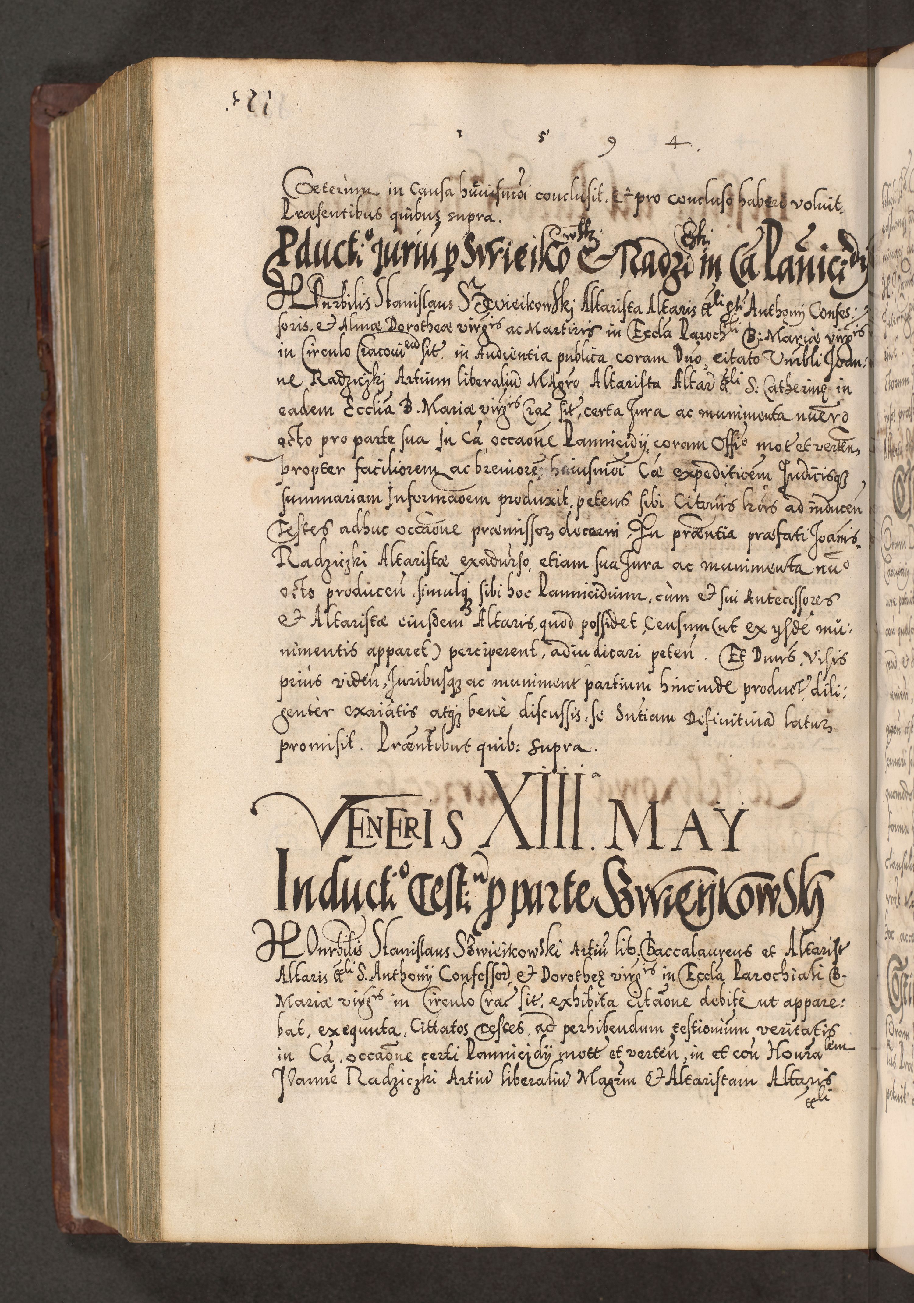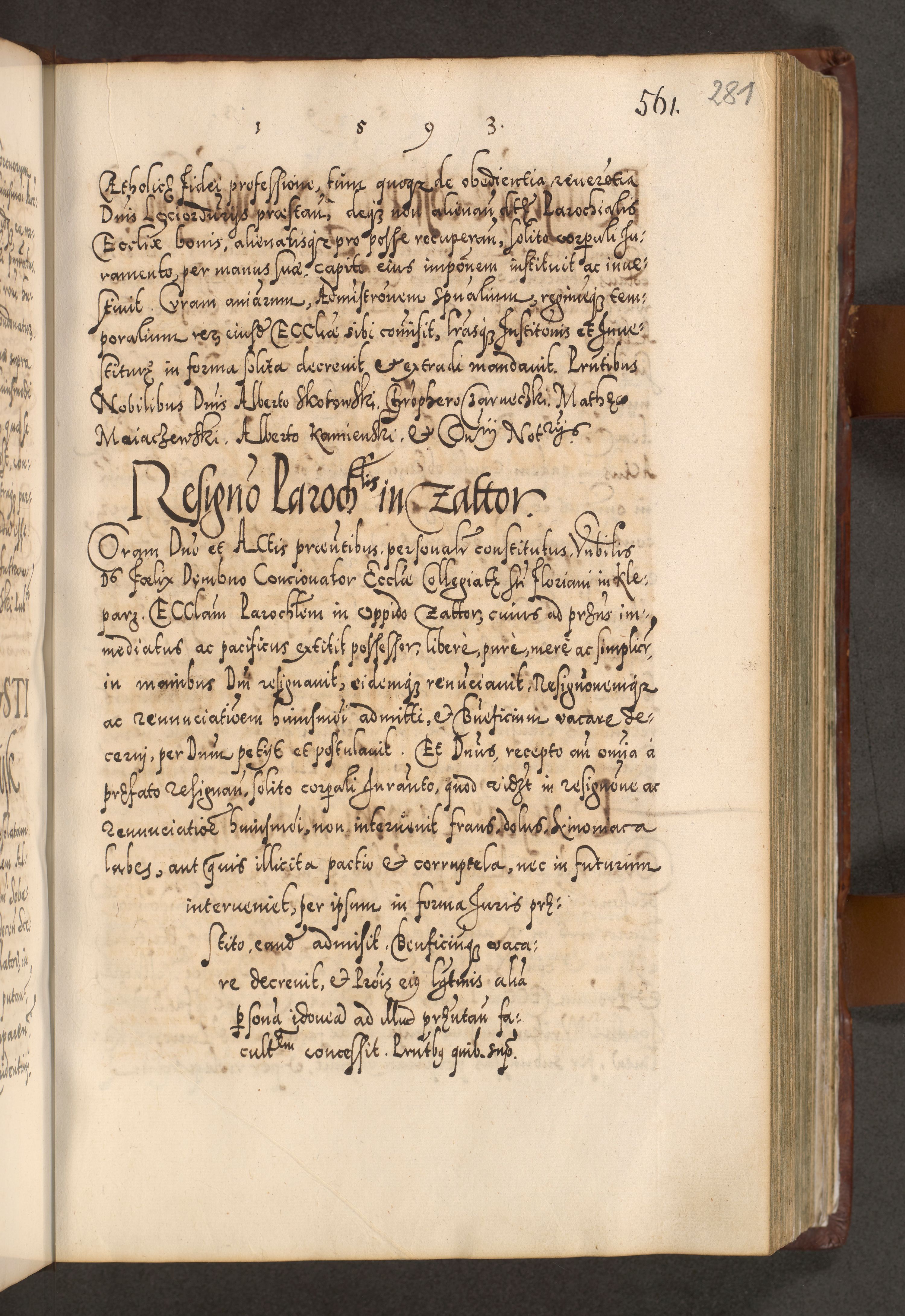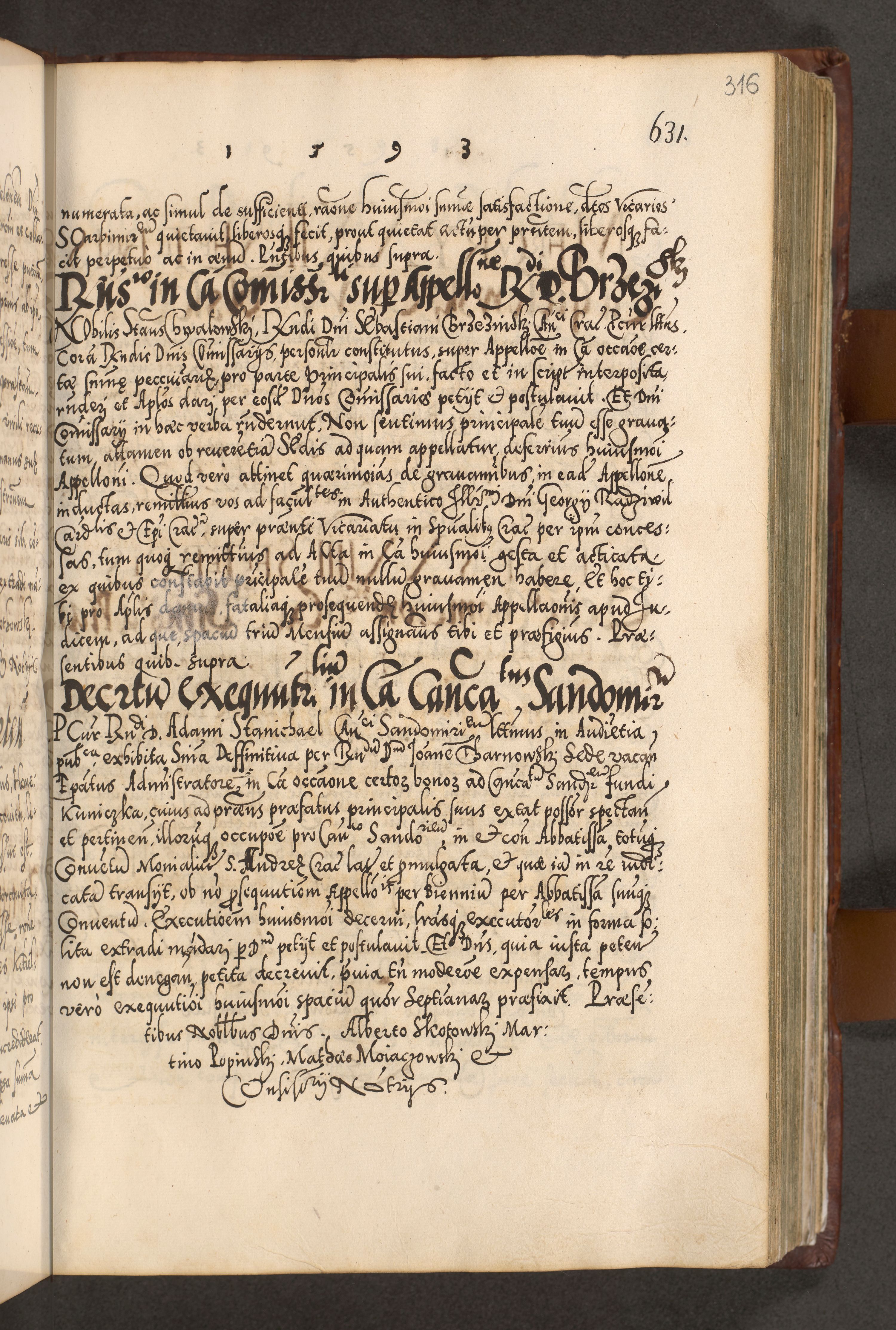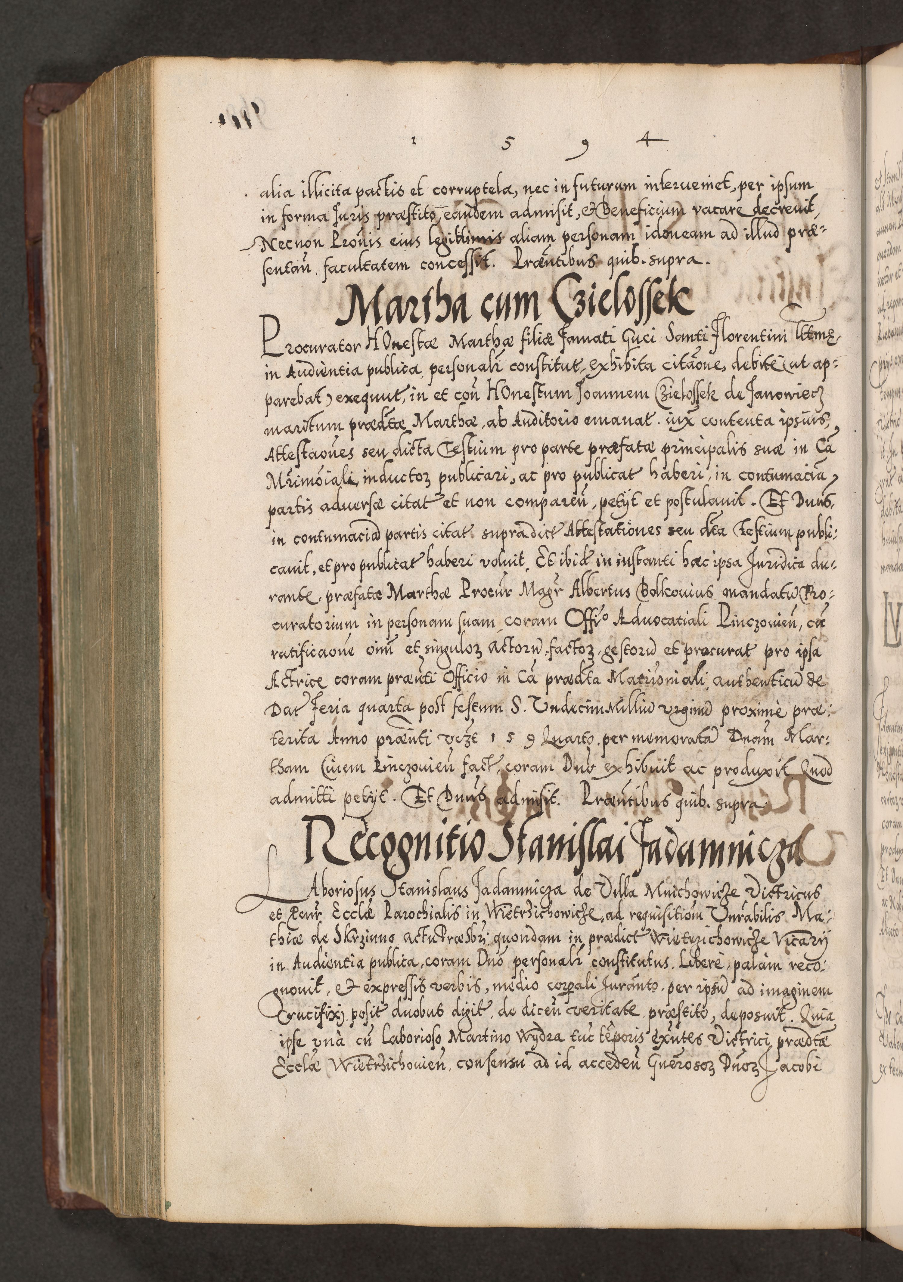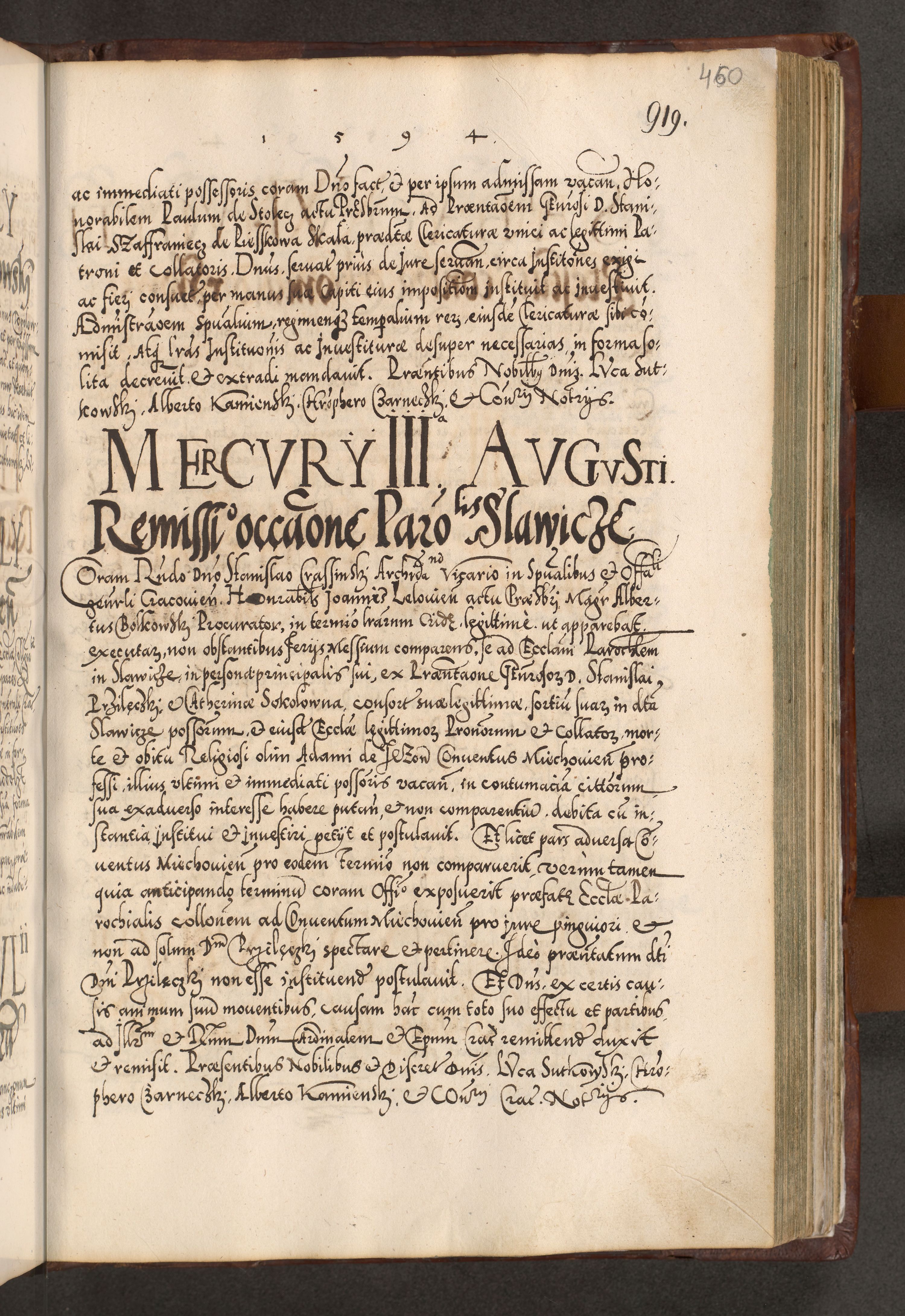 Illistrissimo et revedissimo in Christo Patre Domino Domino Georgio Rzadziwił Miserone Divina Sacrostae R. E. Tituli S. Sixti Presbitero Cardinali Duce in Olyka et Niesswiesz ad Gubernacula Ecclessiae Cracoviensis cuius administratorialem a Sancta Sede Apostolica obtinverat feliciter sedente. Acta actorum, causarum, sententiarum tam deffinitivarum quam interloquutoriarum decretorum, obligationum, quietationum, recognitionum, constitutionum procuratorum etc. coram Reverendo Domino Stanislao Crassinskz de Crasne Archidiacono Cracoviensis, Scholastico Gnesnesis, Custode Plocensis etc. Vicario et Officiali Generali Cracoviensi in Ano Domini Millesimo Quingentesimo Nonagesimo Primo cuius indictio quarta pontificatus SS. Domini Nostri Gregorii XIIII Anno I psius prio feliciter incipiut