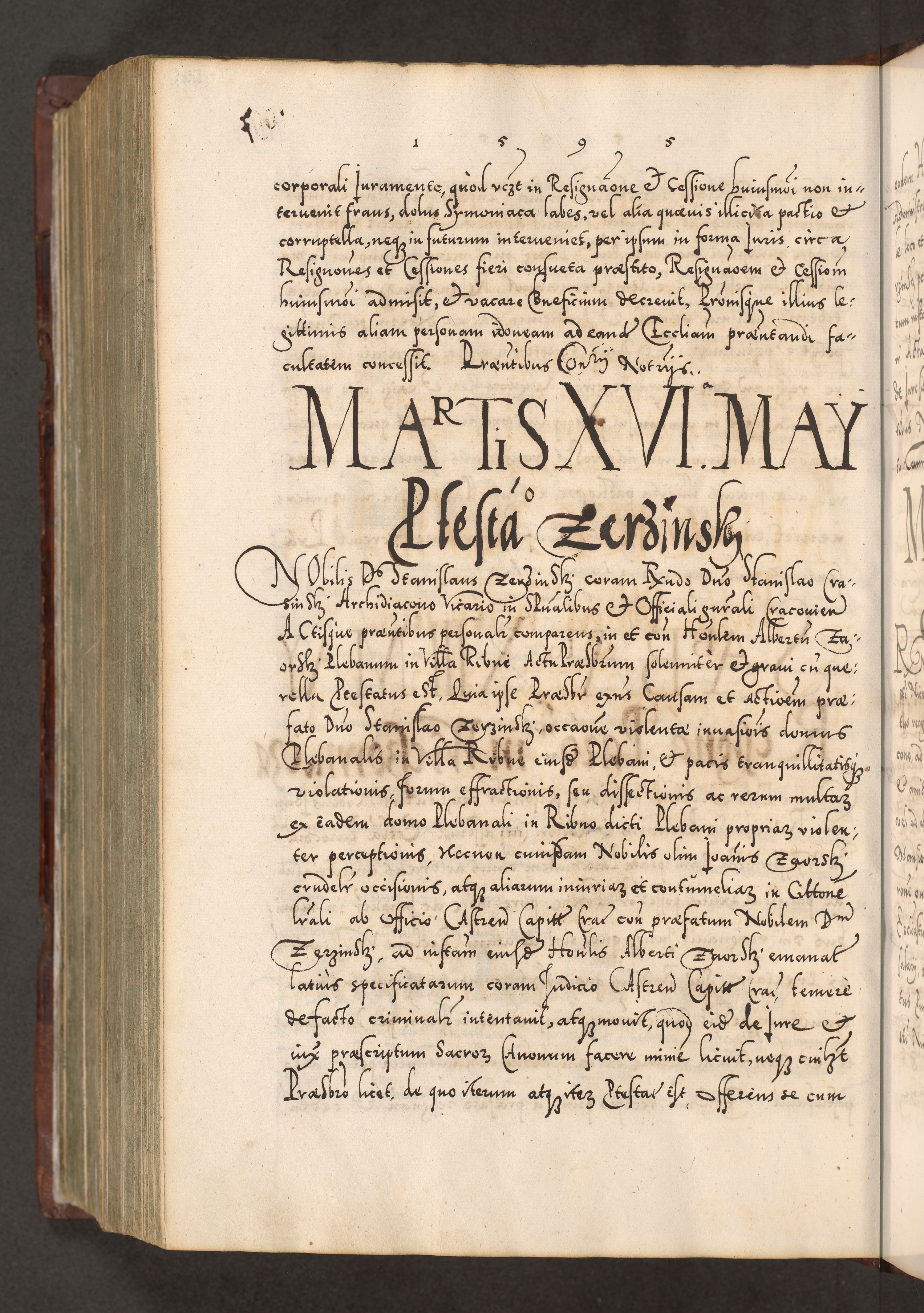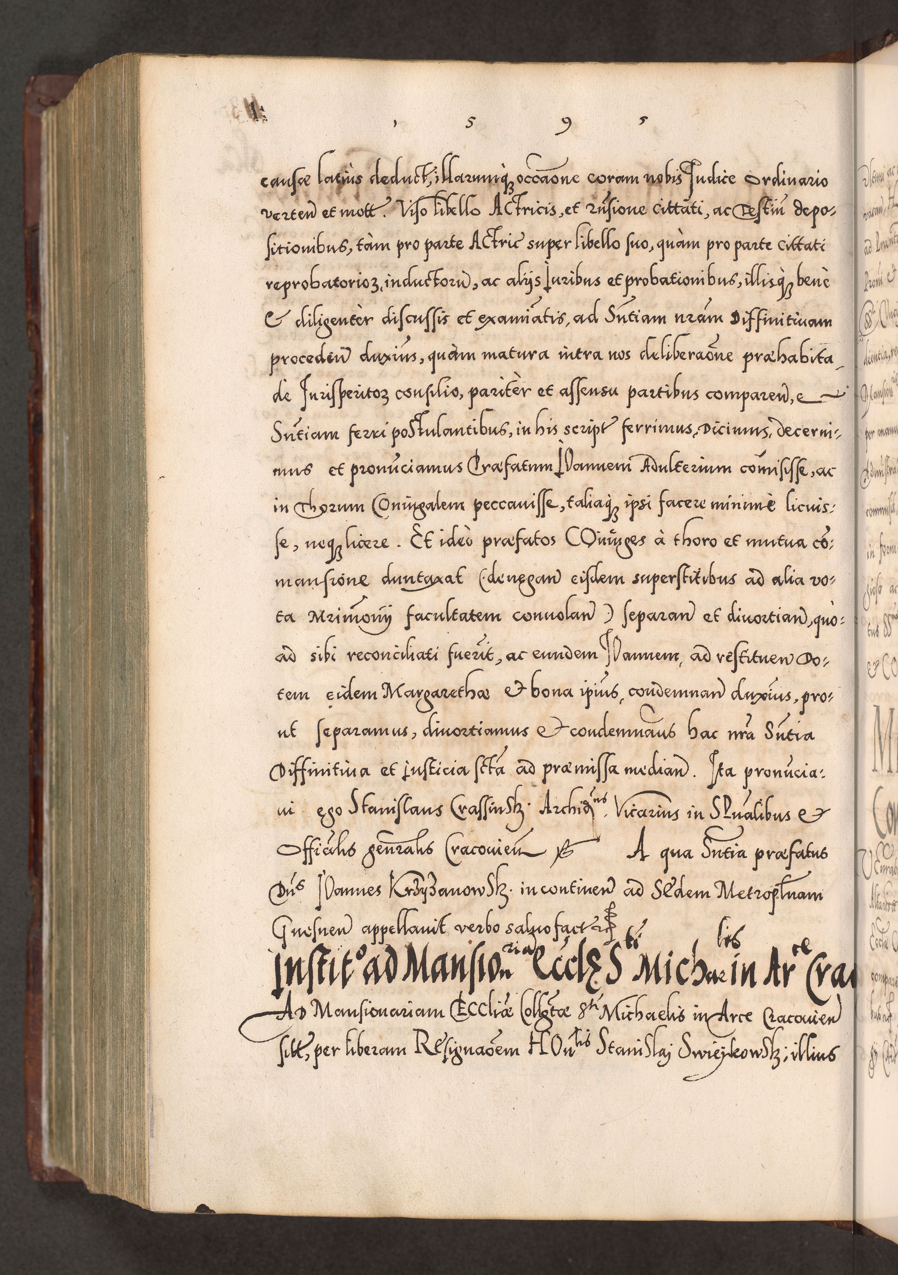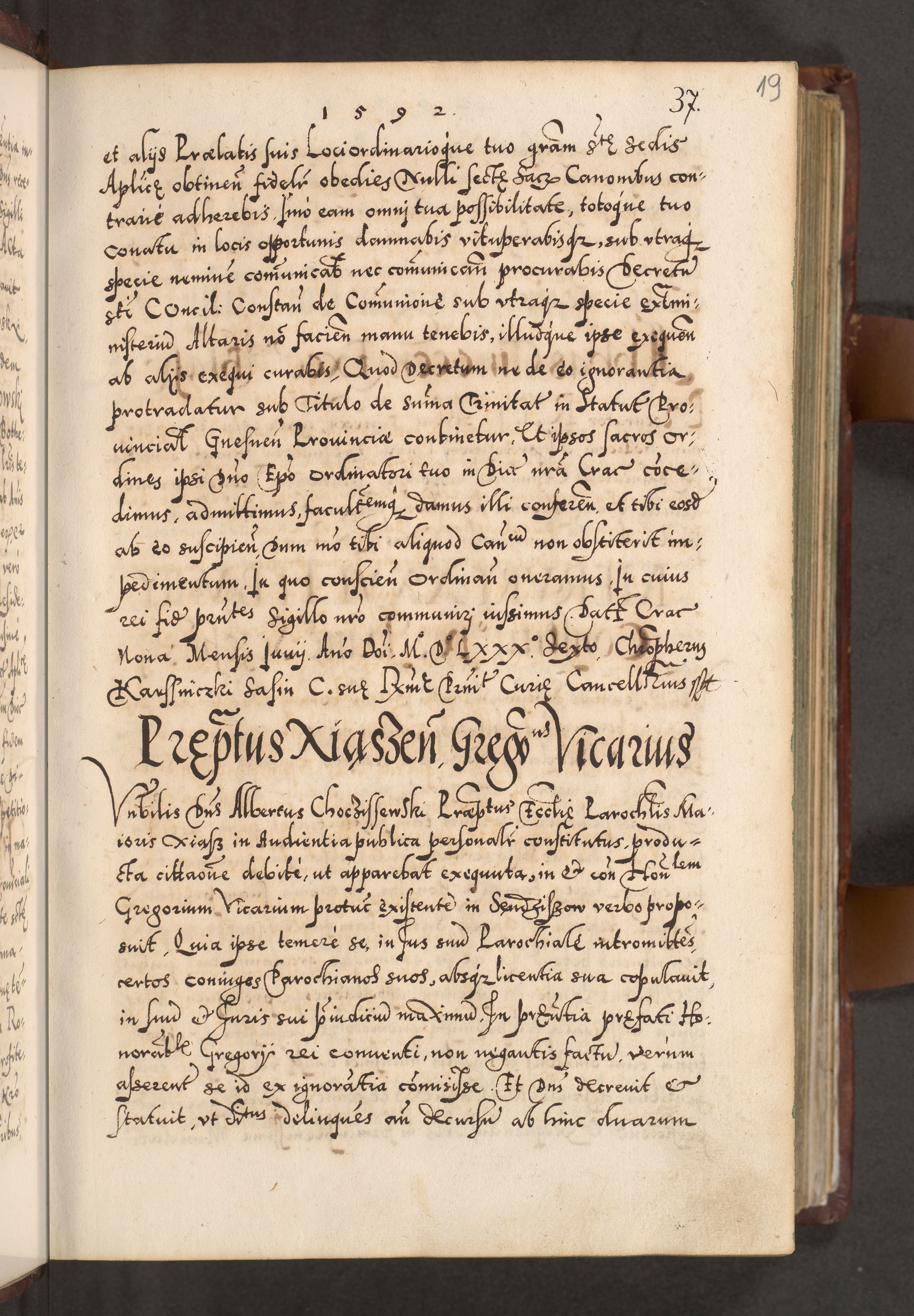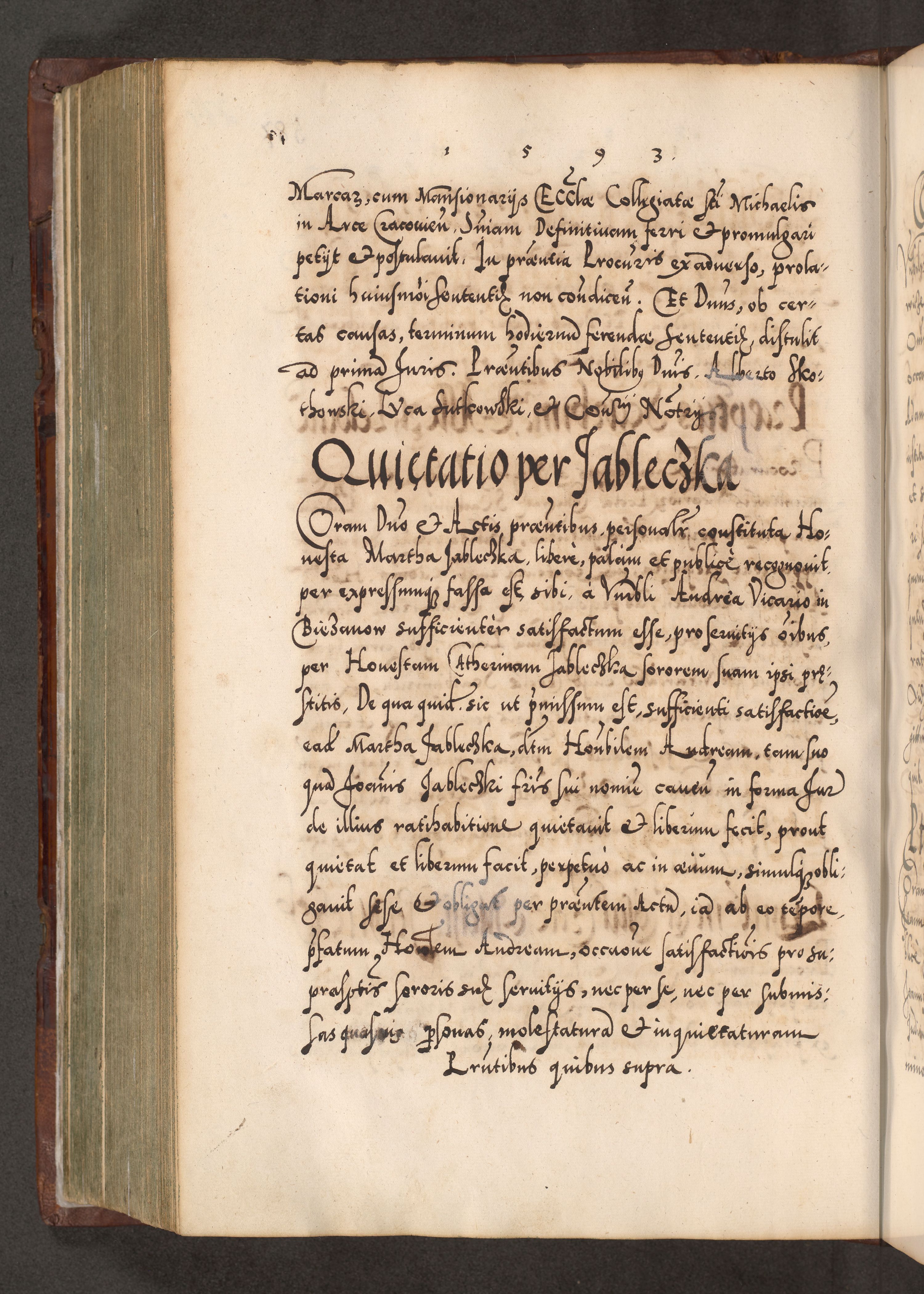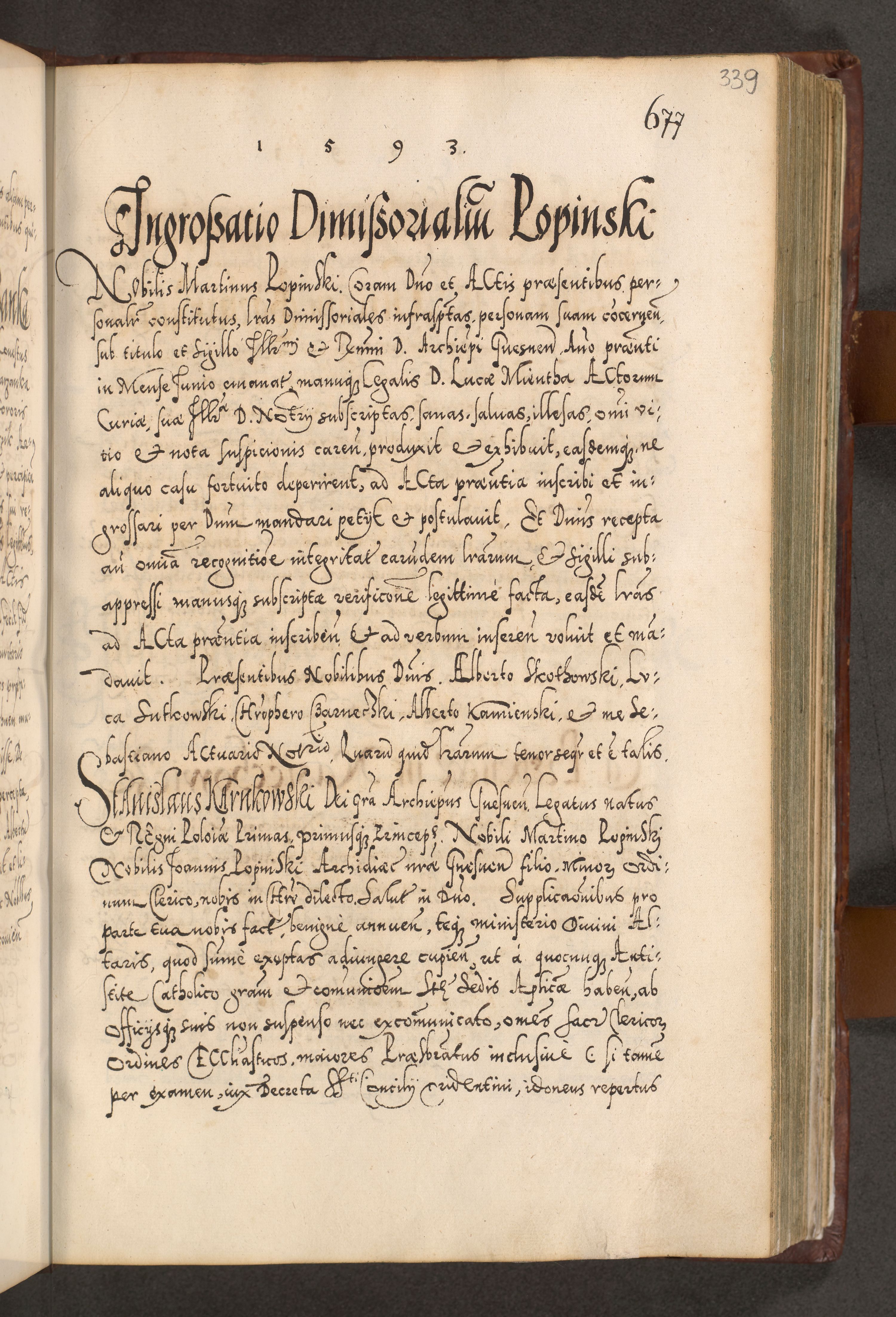 Illistrissimo et revedissimo in Christo Patre Domino Domino Georgio Rzadziwił Miserone Divina Sacrostae R. E. Tituli S. Sixti Presbitero Cardinali Duce in Olyka et Niesswiesz ad Gubernacula Ecclessiae Cracoviensis cuius administratorialem a Sancta Sede Apostolica obtinverat feliciter sedente. Acta actorum, causarum, sententiarum tam deffinitivarum quam interloquutoriarum decretorum, obligationum, quietationum, recognitionum, constitutionum procuratorum etc. coram Reverendo Domino Stanislao Crassinskz de Crasne Archidiacono Cracoviensis, Scholastico Gnesnesis, Custode Plocensis etc. Vicario et Officiali Generali Cracoviensi in Ano Domini Millesimo Quingentesimo Nonagesimo Primo cuius indictio quarta pontificatus SS. Domini Nostri Gregorii XIIII Anno I psius prio feliciter incipiut