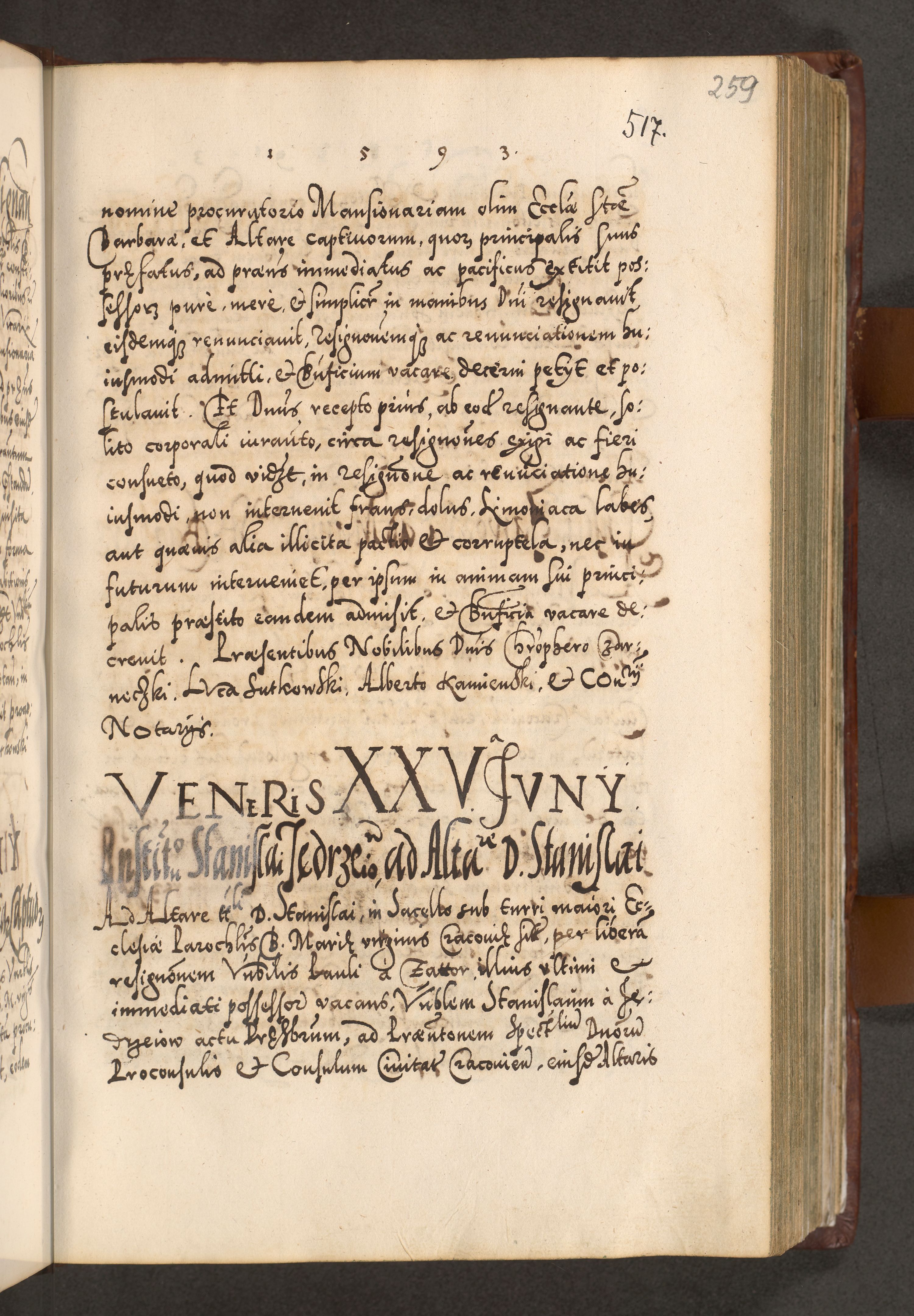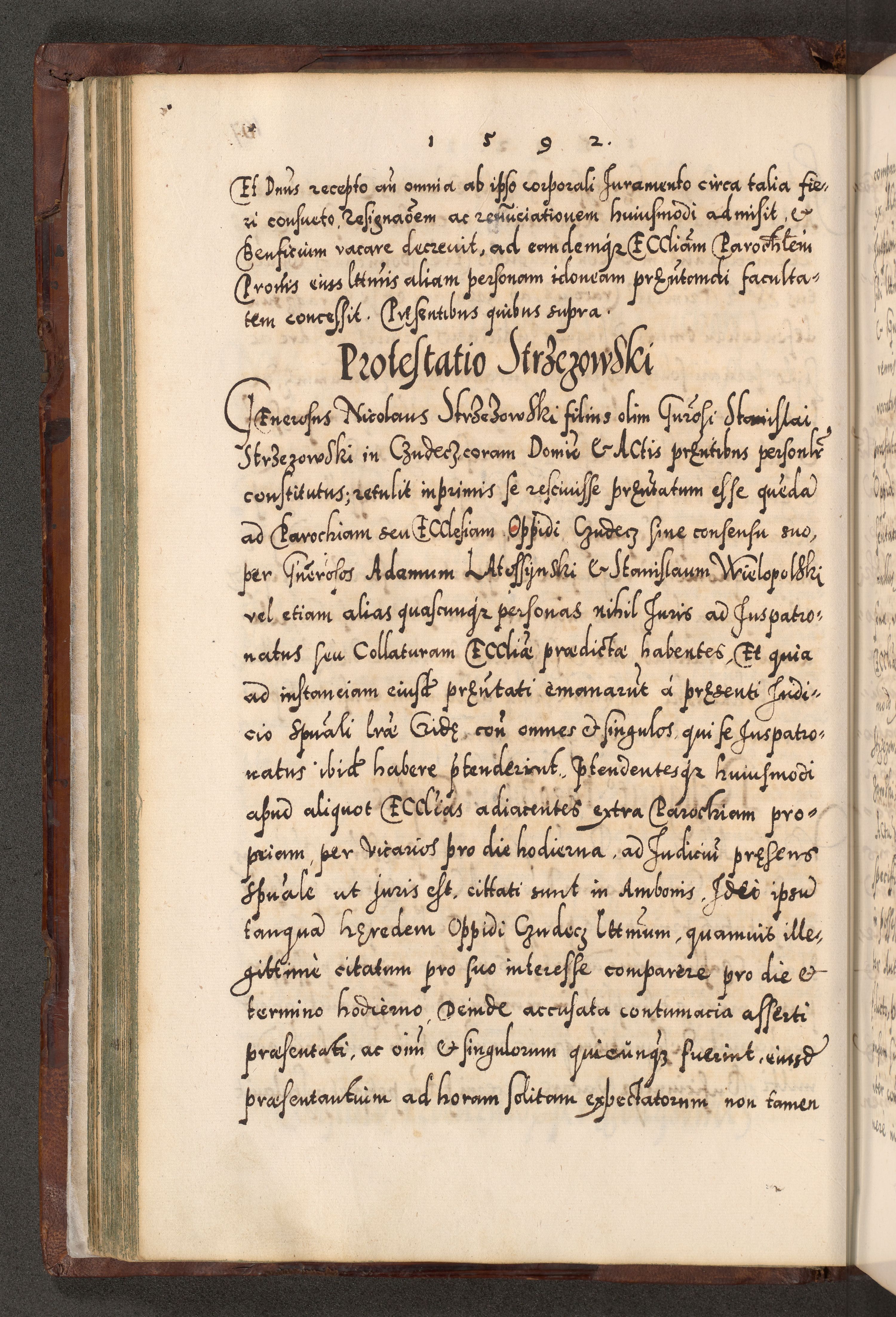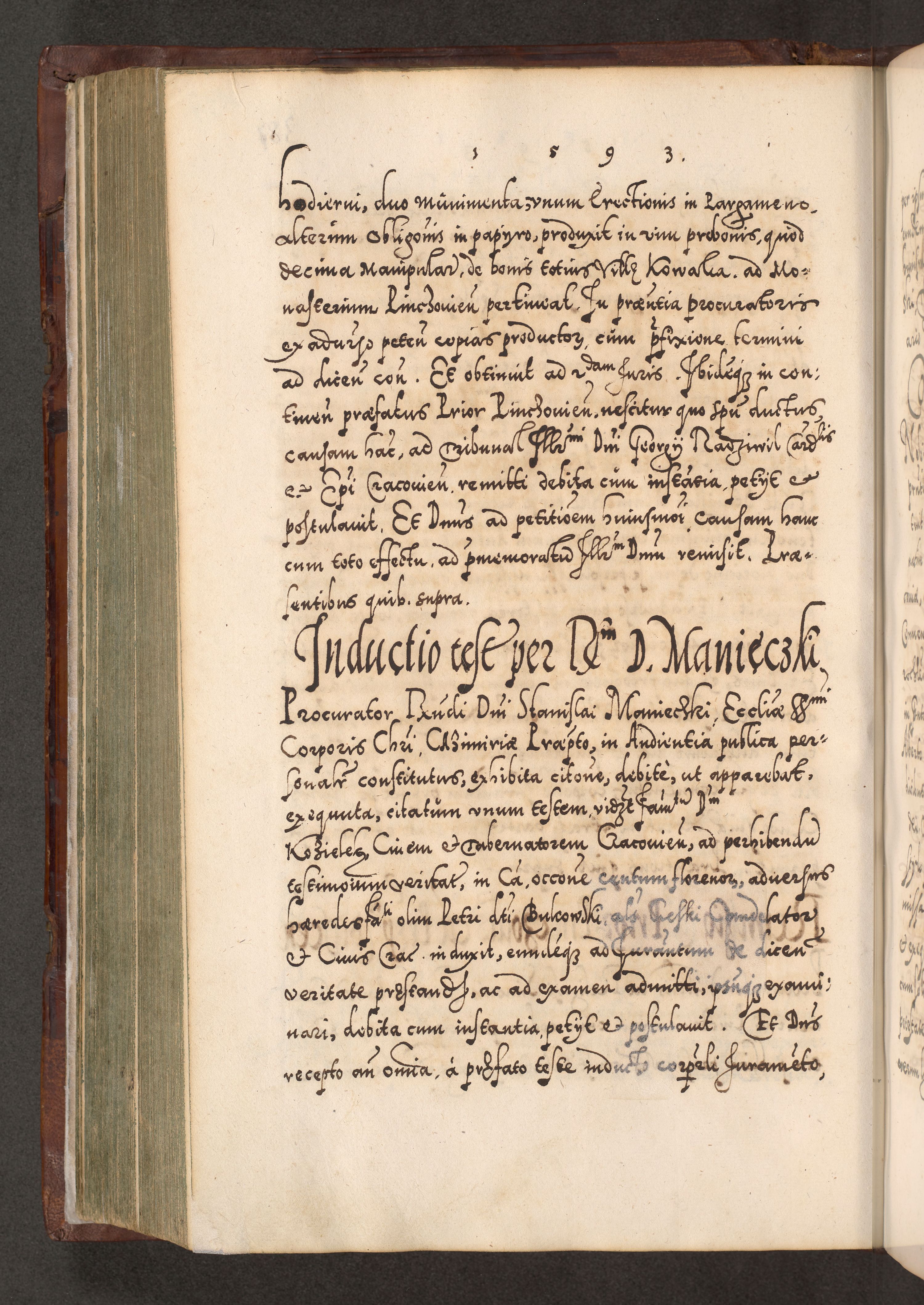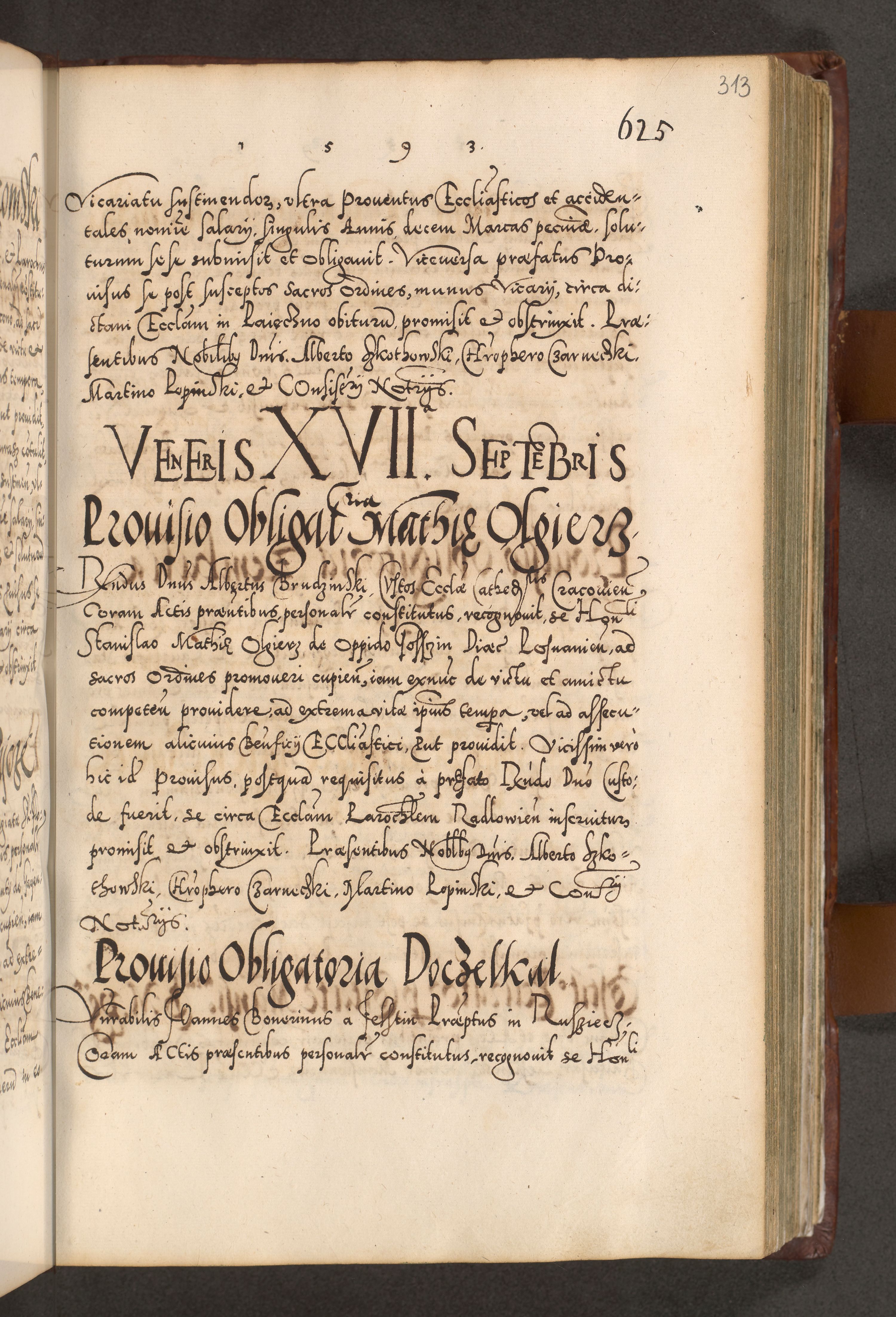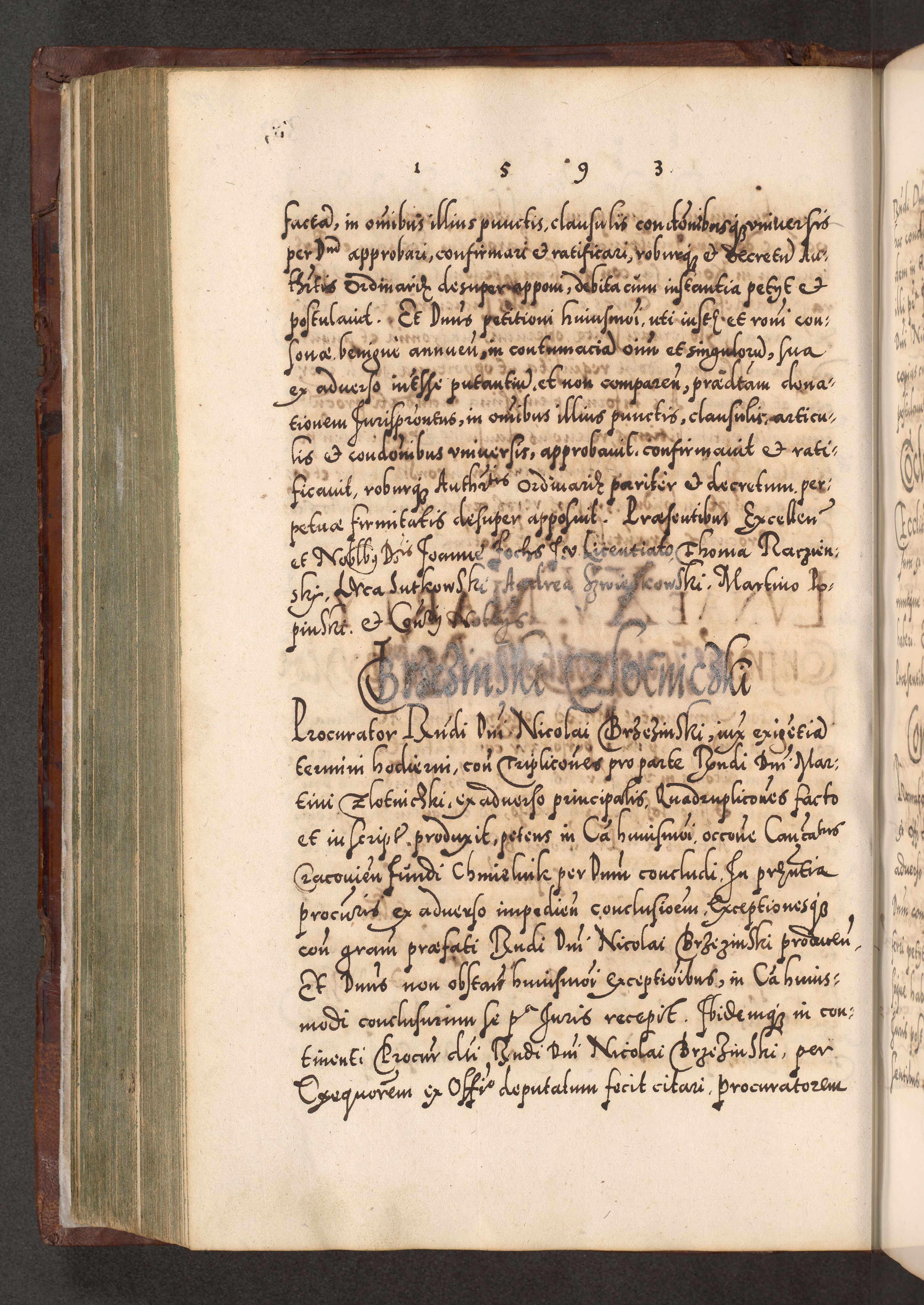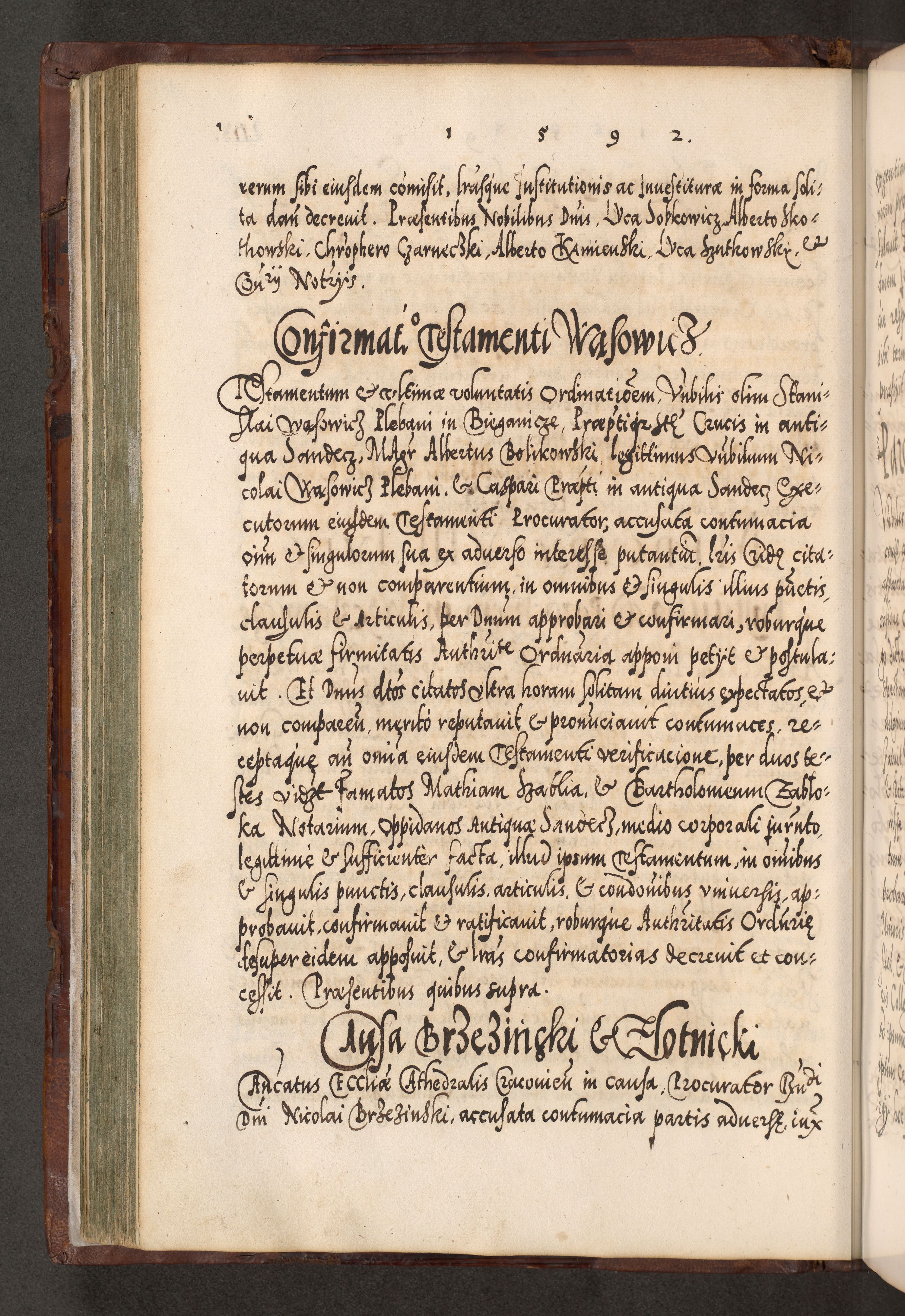 Illistrissimo et revedissimo in Christo Patre Domino Domino Georgio Rzadziwił Miserone Divina Sacrostae R. E. Tituli S. Sixti Presbitero Cardinali Duce in Olyka et Niesswiesz ad Gubernacula Ecclessiae Cracoviensis cuius administratorialem a Sancta Sede Apostolica obtinverat feliciter sedente. Acta actorum, causarum, sententiarum tam deffinitivarum quam interloquutoriarum decretorum, obligationum, quietationum, recognitionum, constitutionum procuratorum etc. coram Reverendo Domino Stanislao Crassinskz de Crasne Archidiacono Cracoviensis, Scholastico Gnesnesis, Custode Plocensis etc. Vicario et Officiali Generali Cracoviensi in Ano Domini Millesimo Quingentesimo Nonagesimo Primo cuius indictio quarta pontificatus SS. Domini Nostri Gregorii XIIII Anno I psius prio feliciter incipiut