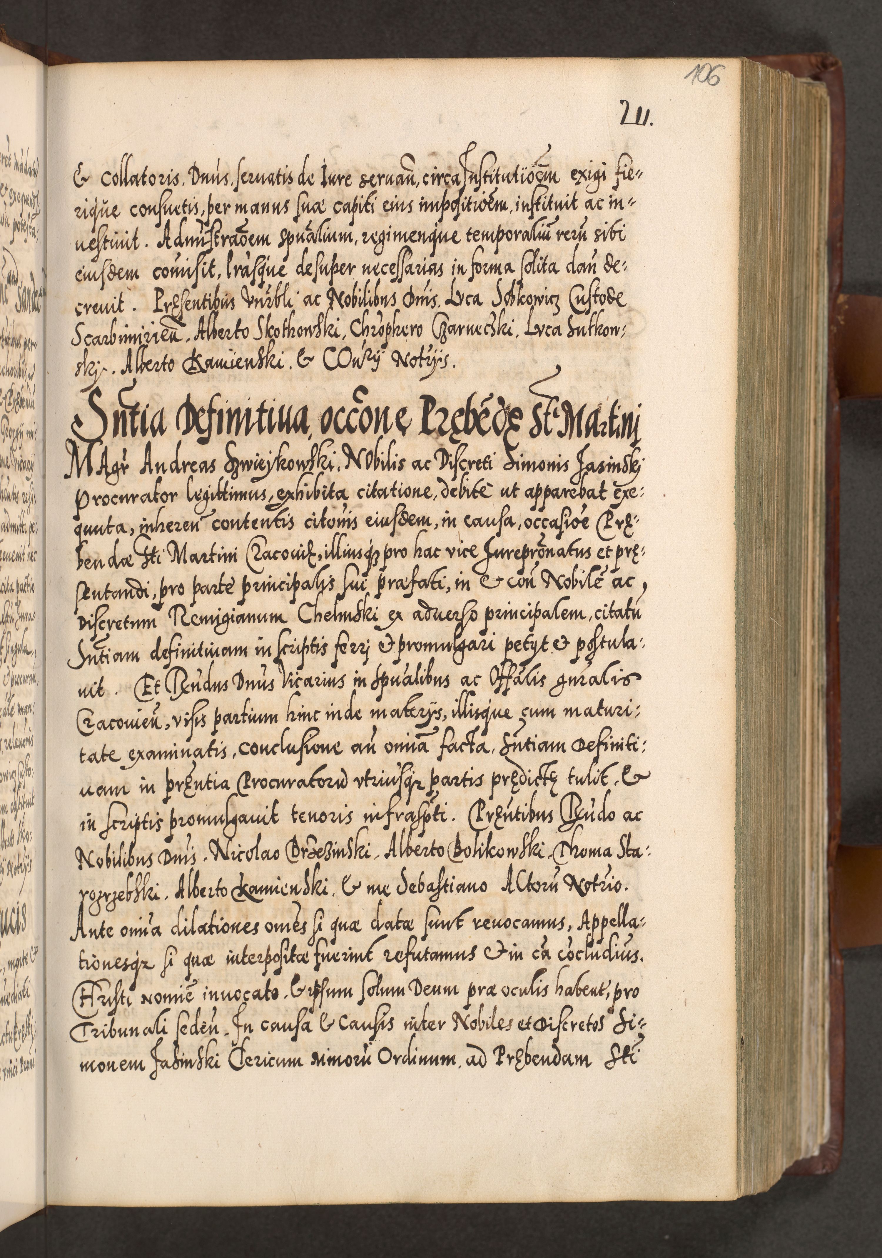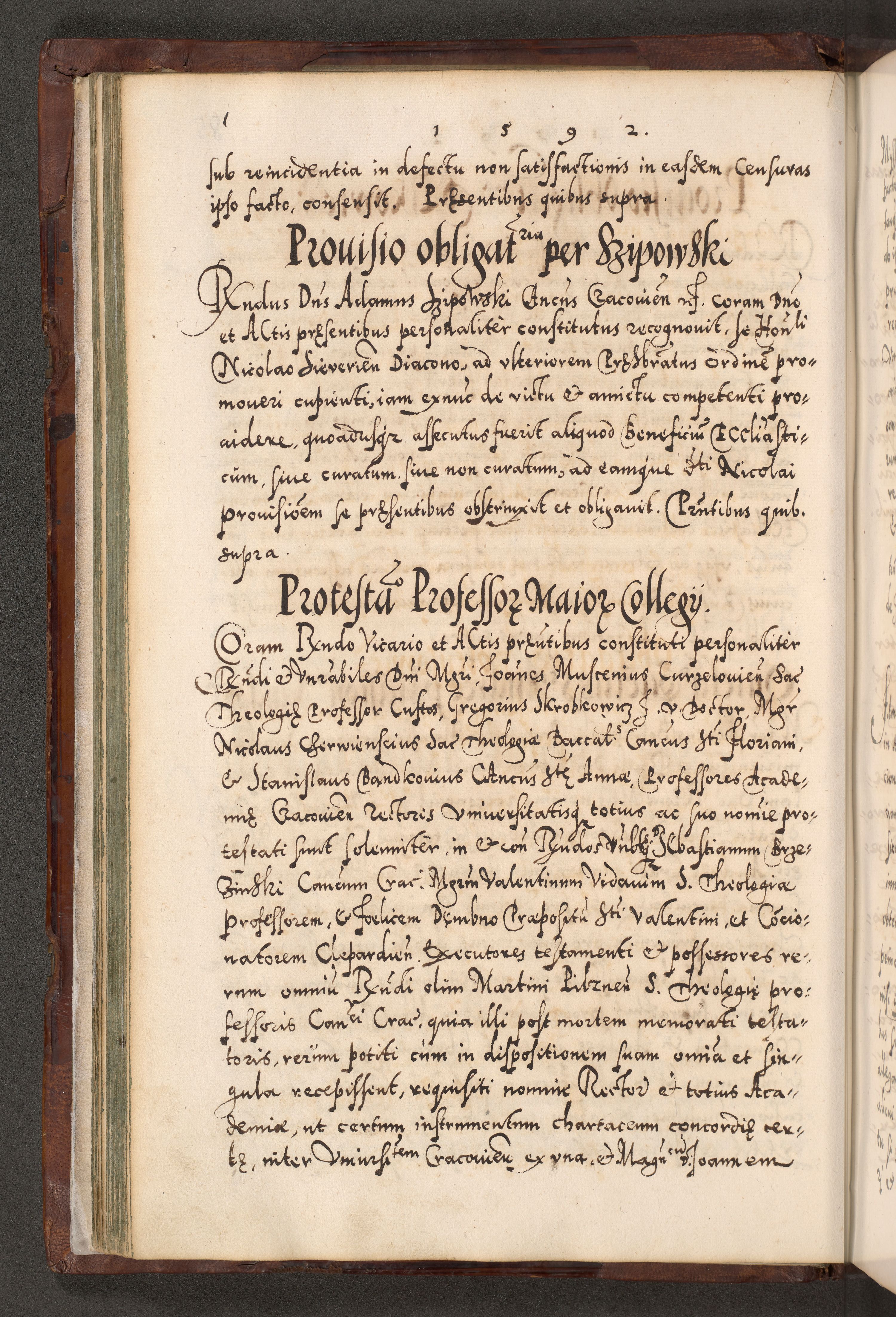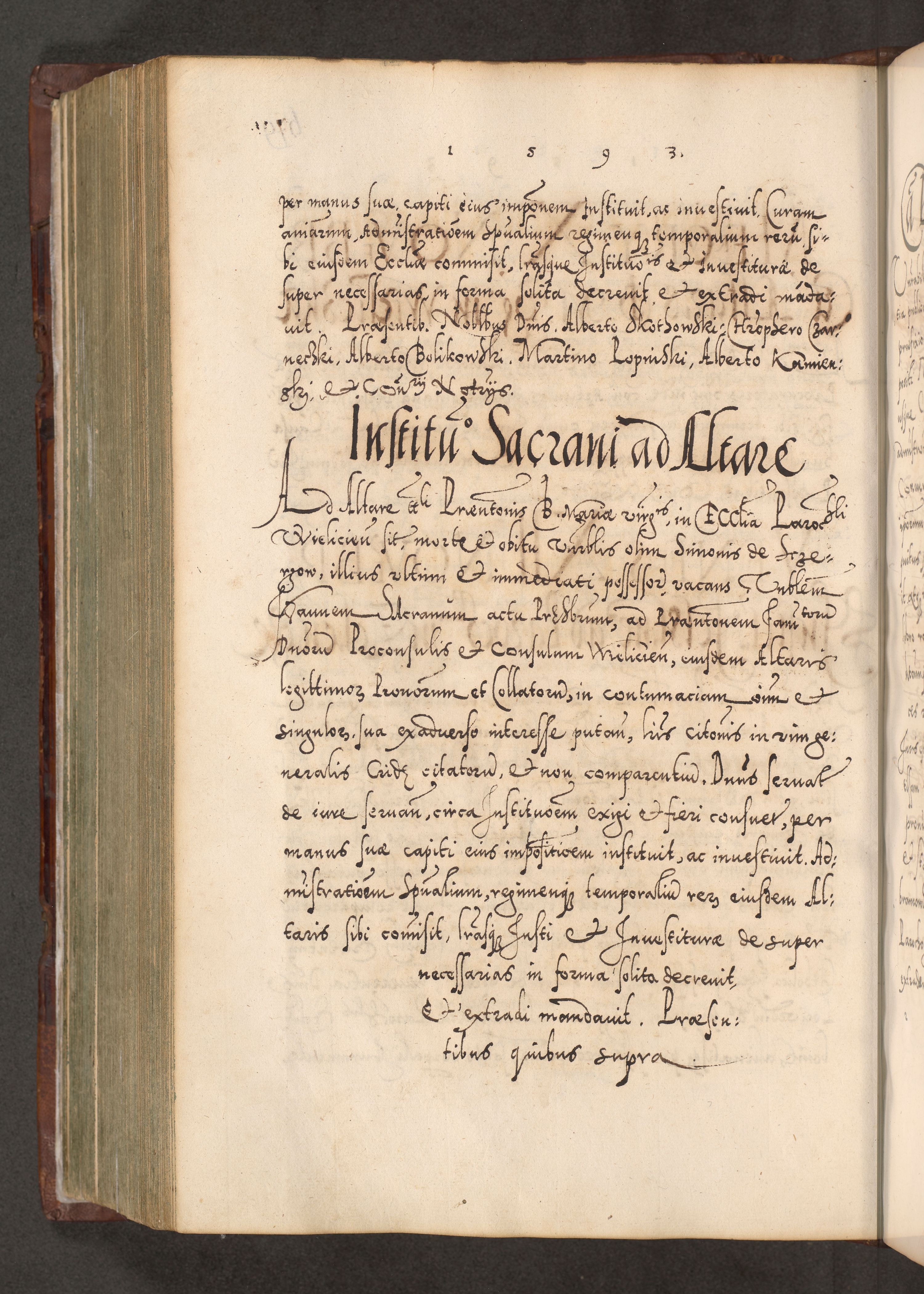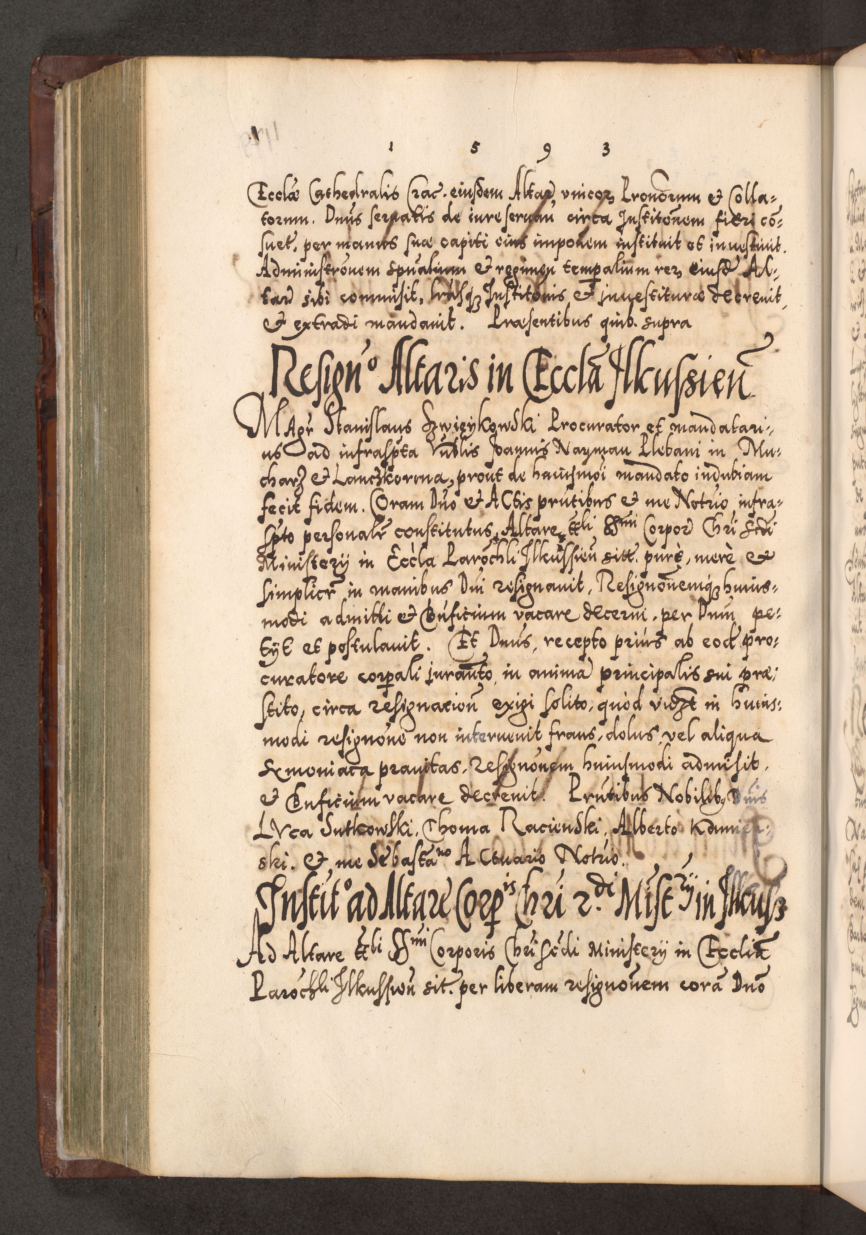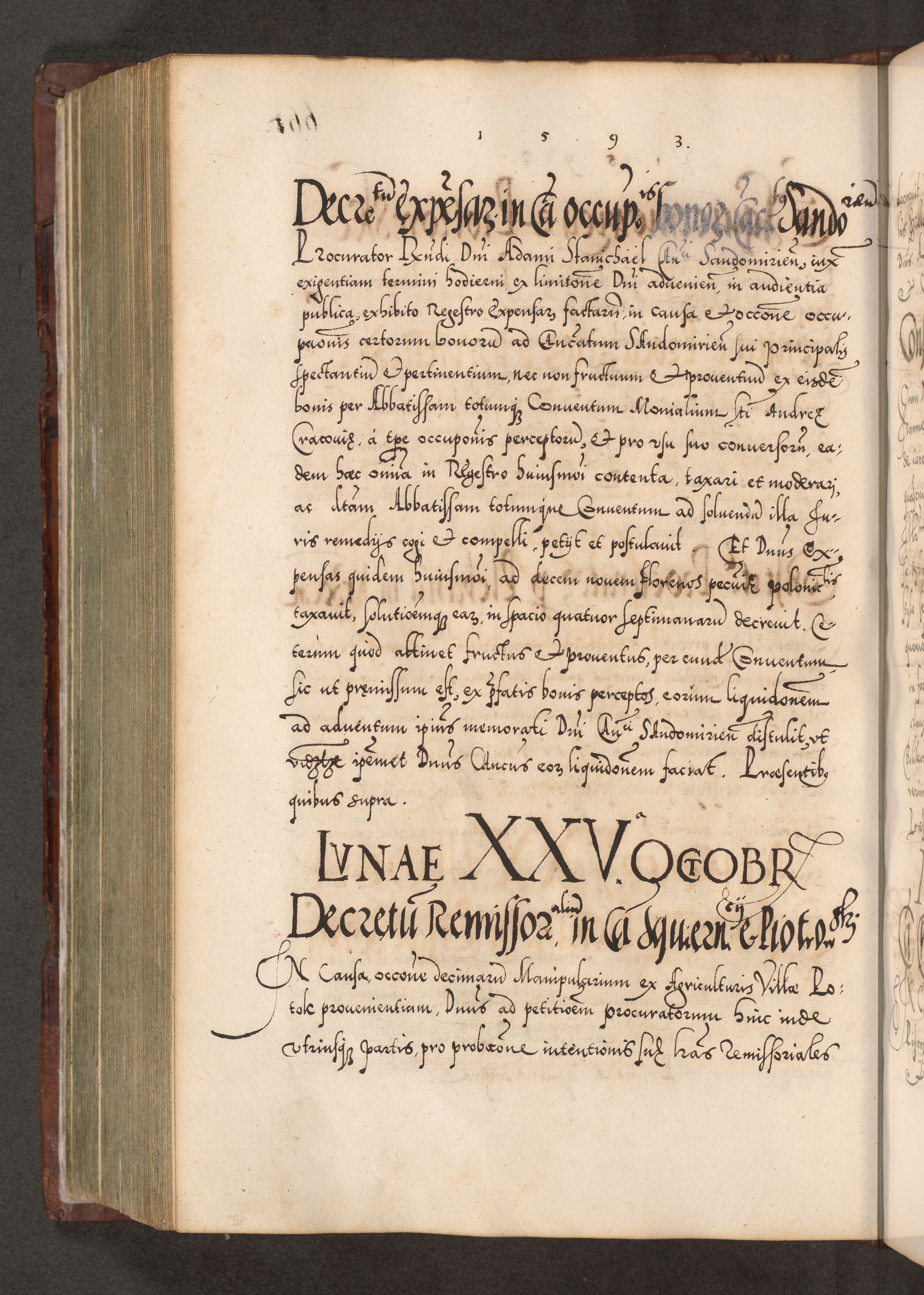Illistrissimo et revedissimo in Christo Patre Domino Domino Georgio Rzadziwił Miserone Divina Sacrostae R. E. Tituli S. Sixti Presbitero Cardinali Duce in Olyka et Niesswiesz ad Gubernacula Ecclessiae Cracoviensis cuius administratorialem a Sancta Sede Apostolica obtinverat feliciter sedente. Acta actorum, causarum, sententiarum tam deffinitivarum quam interloquutoriarum decretorum, obligationum, quietationum, recognitionum, constitutionum procuratorum etc. coram Reverendo Domino Stanislao Crassinskz de Crasne Archidiacono Cracoviensis, Scholastico Gnesnesis, Custode Plocensis etc. Vicario et Officiali Generali Cracoviensi in Ano Domini Millesimo Quingentesimo Nonagesimo Primo cuius indictio quarta pontificatus SS. Domini Nostri Gregorii XIIII Anno I psius prio feliciter incipiut