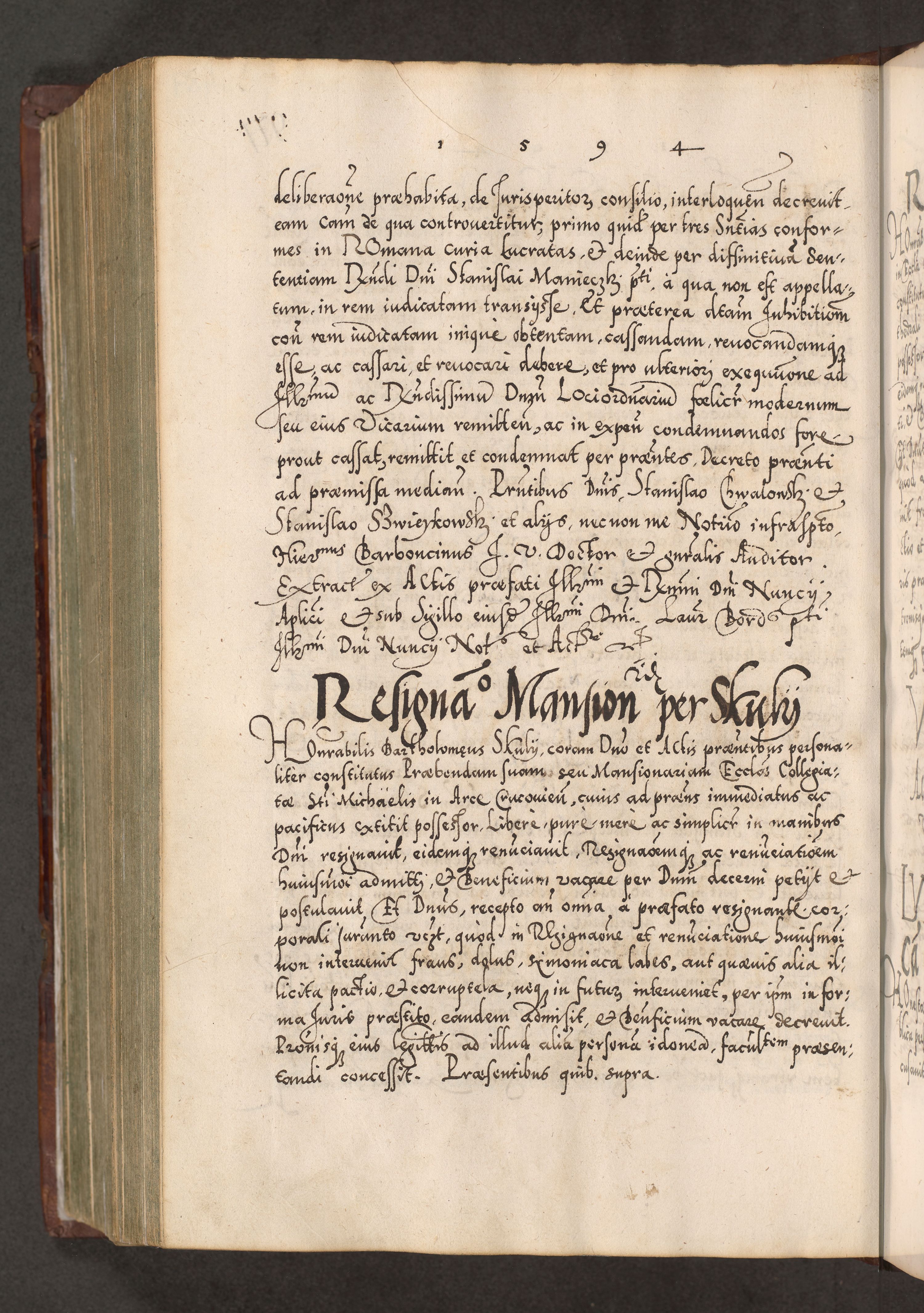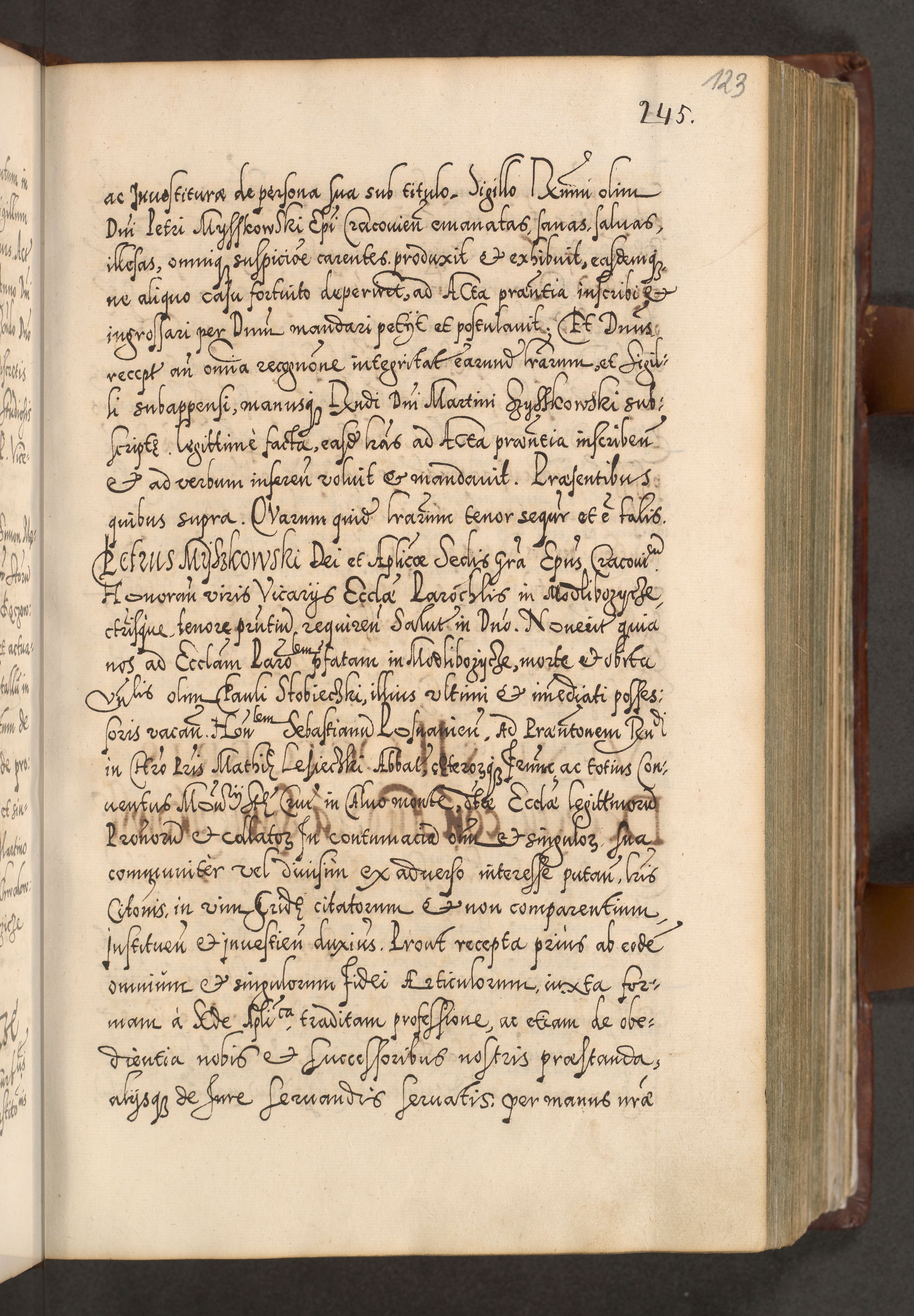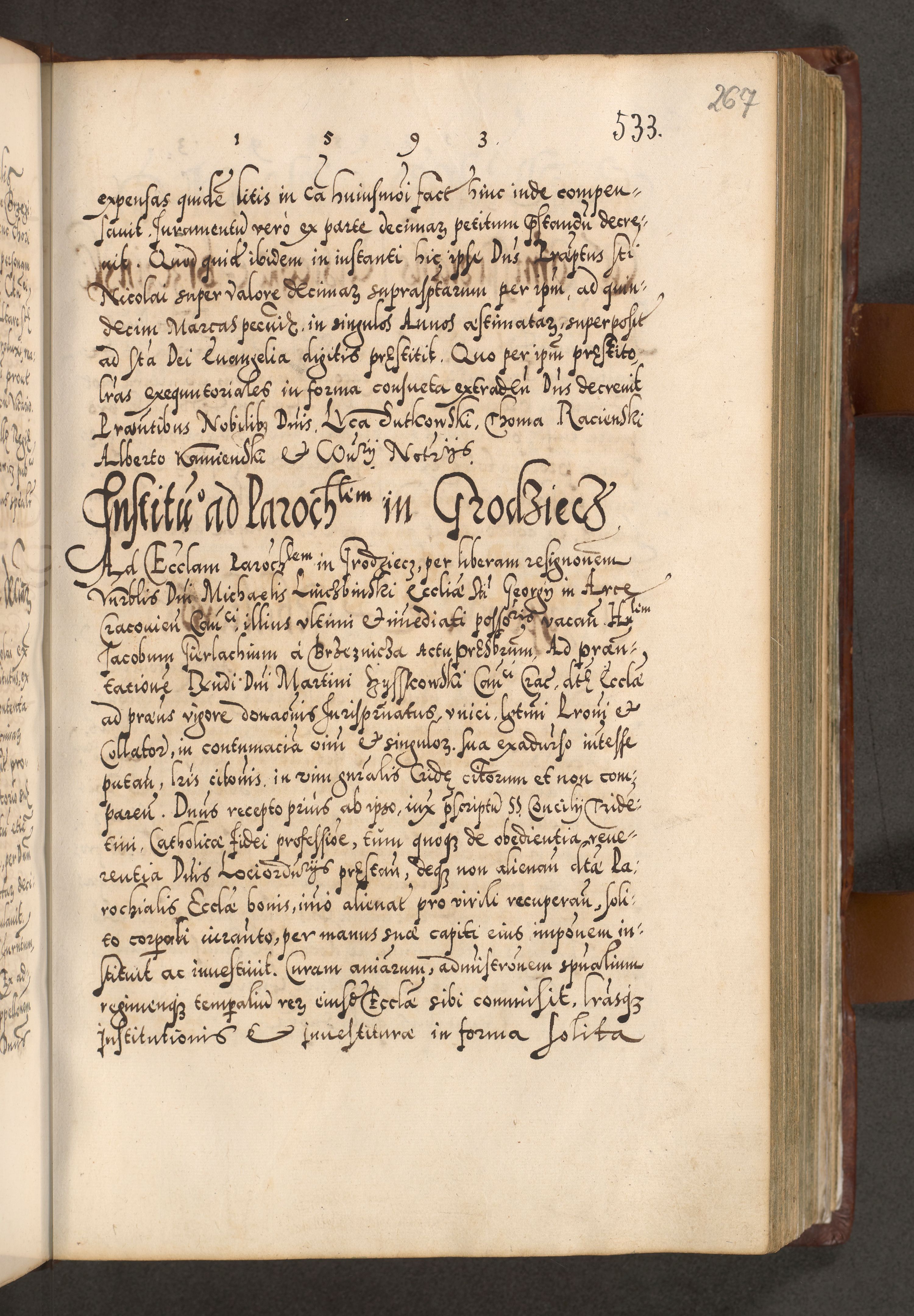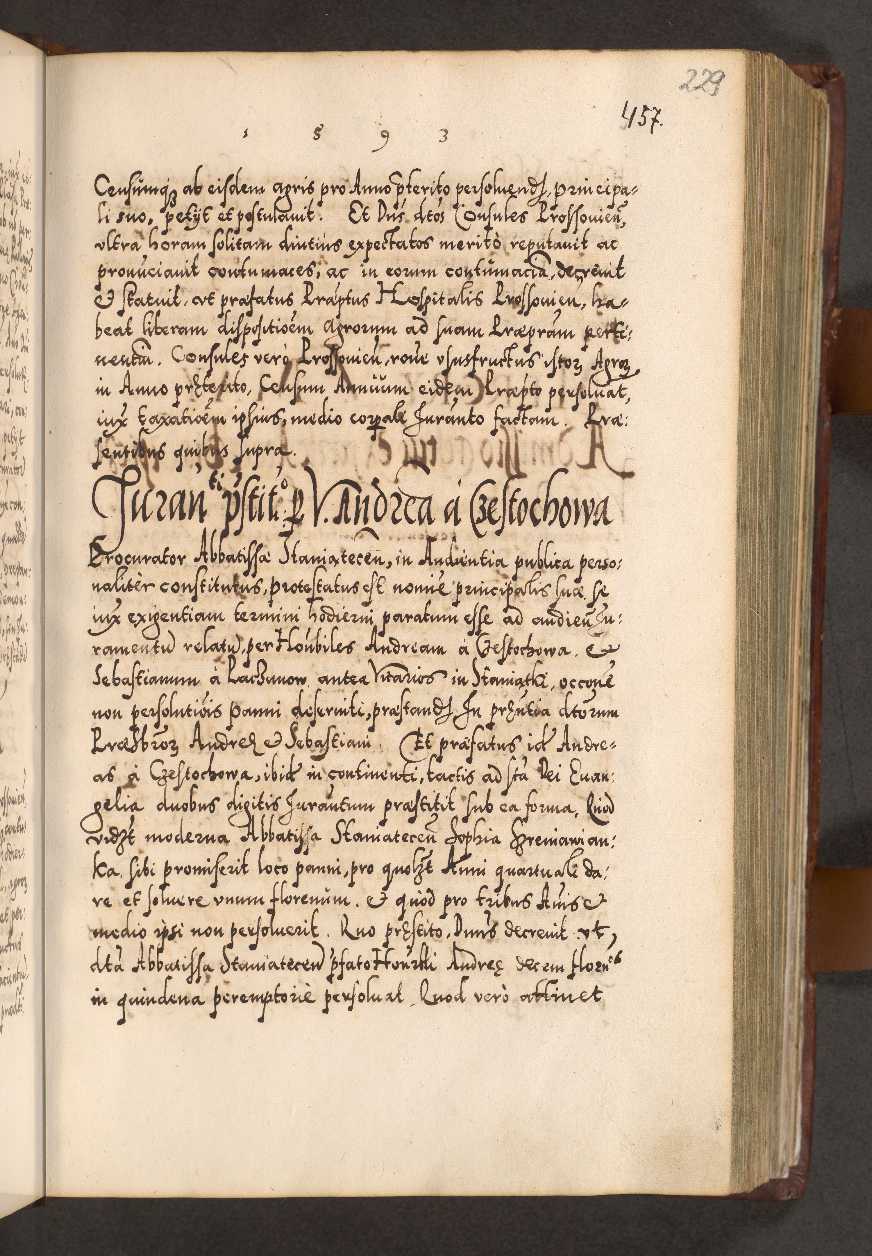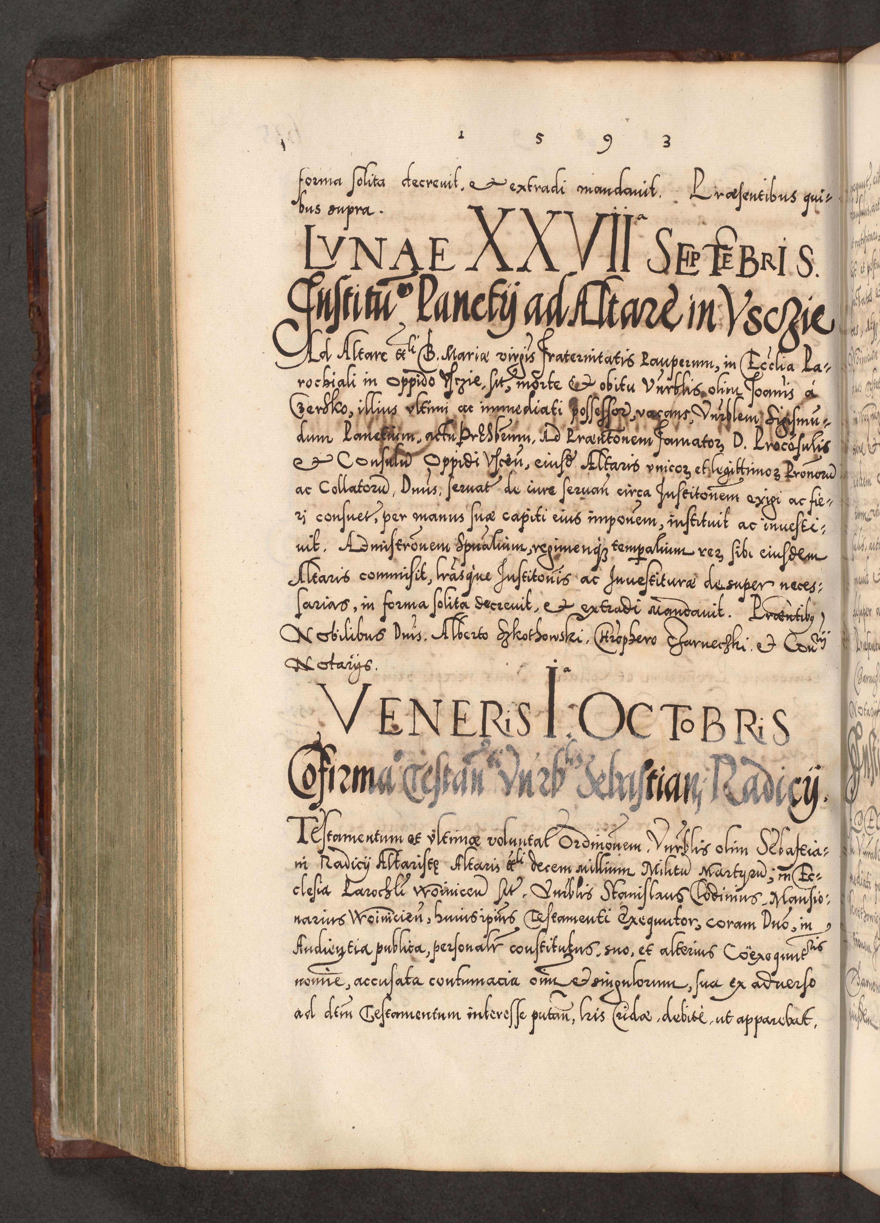 Illistrissimo et revedissimo in Christo Patre Domino Domino Georgio Rzadziwił Miserone Divina Sacrostae R. E. Tituli S. Sixti Presbitero Cardinali Duce in Olyka et Niesswiesz ad Gubernacula Ecclessiae Cracoviensis cuius administratorialem a Sancta Sede Apostolica obtinverat feliciter sedente. Acta actorum, causarum, sententiarum tam deffinitivarum quam interloquutoriarum decretorum, obligationum, quietationum, recognitionum, constitutionum procuratorum etc. coram Reverendo Domino Stanislao Crassinskz de Crasne Archidiacono Cracoviensis, Scholastico Gnesnesis, Custode Plocensis etc. Vicario et Officiali Generali Cracoviensi in Ano Domini Millesimo Quingentesimo Nonagesimo Primo cuius indictio quarta pontificatus SS. Domini Nostri Gregorii XIIII Anno I psius prio feliciter incipiut