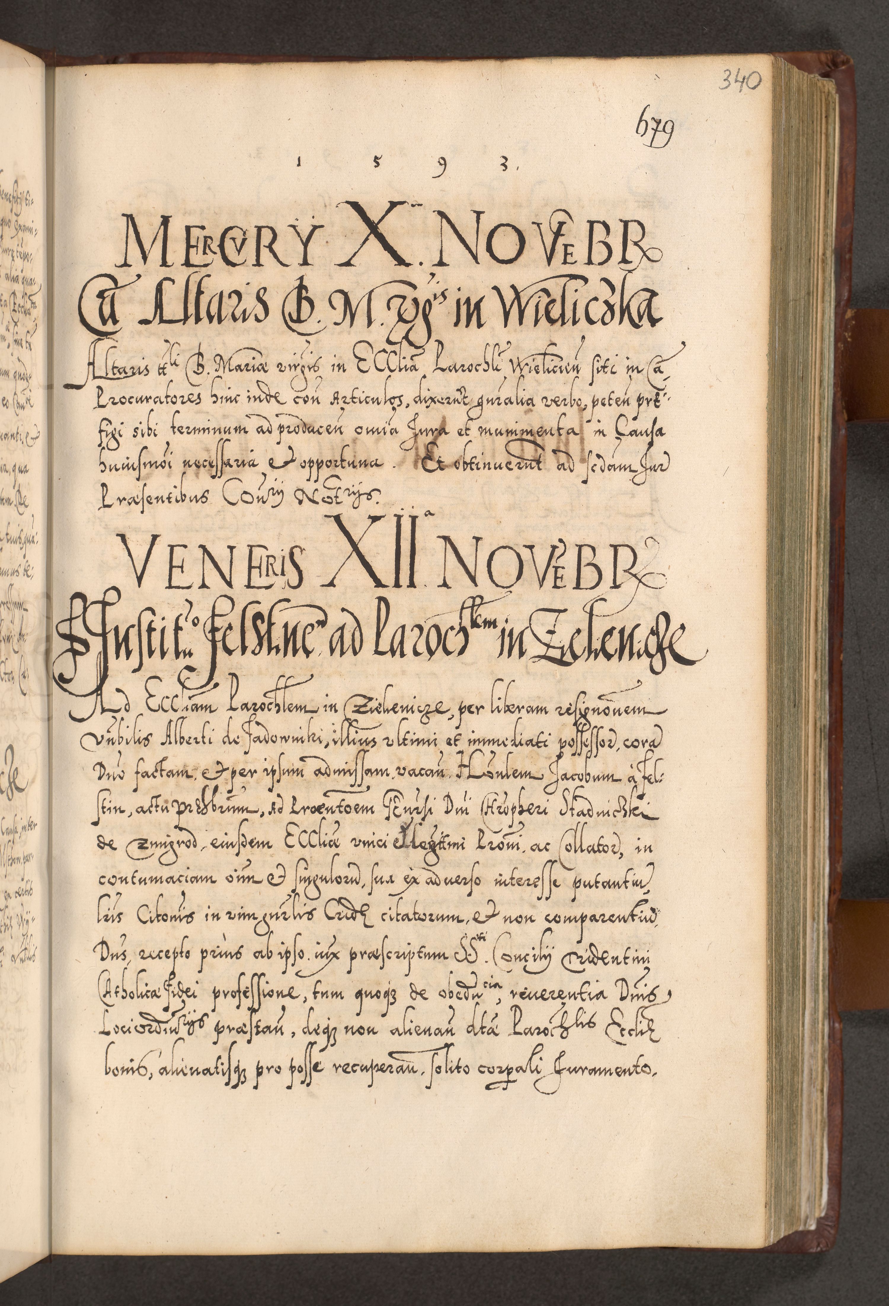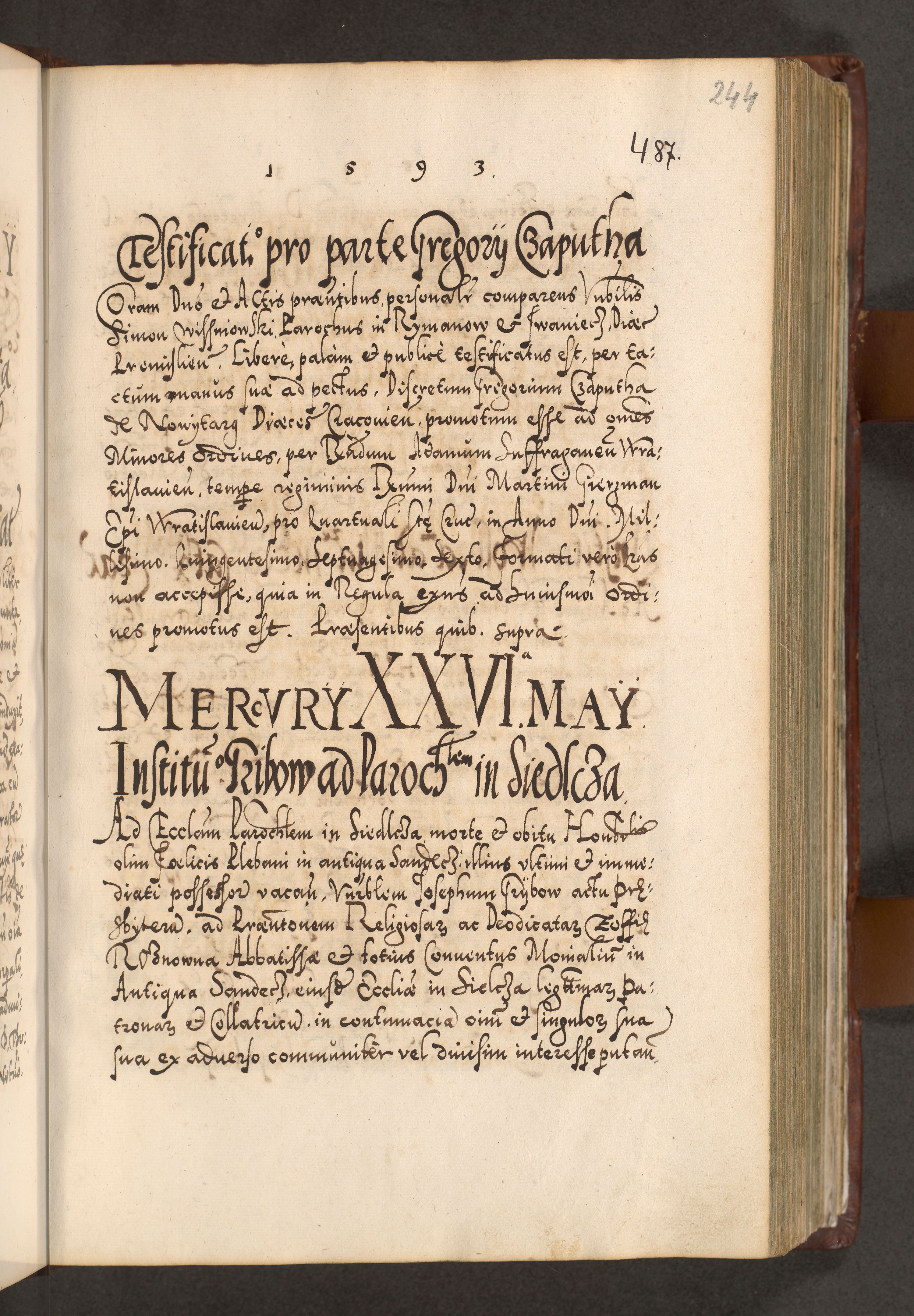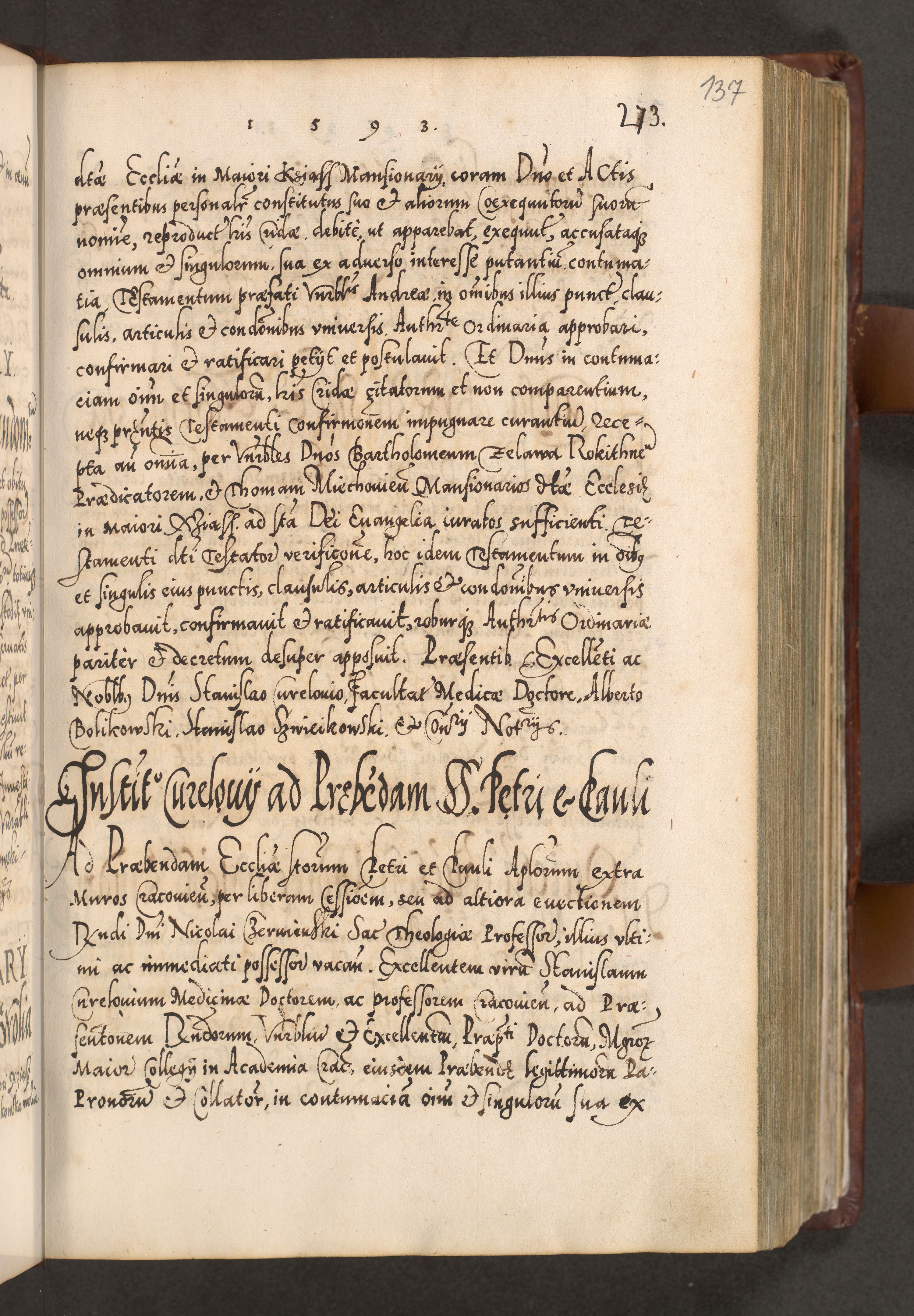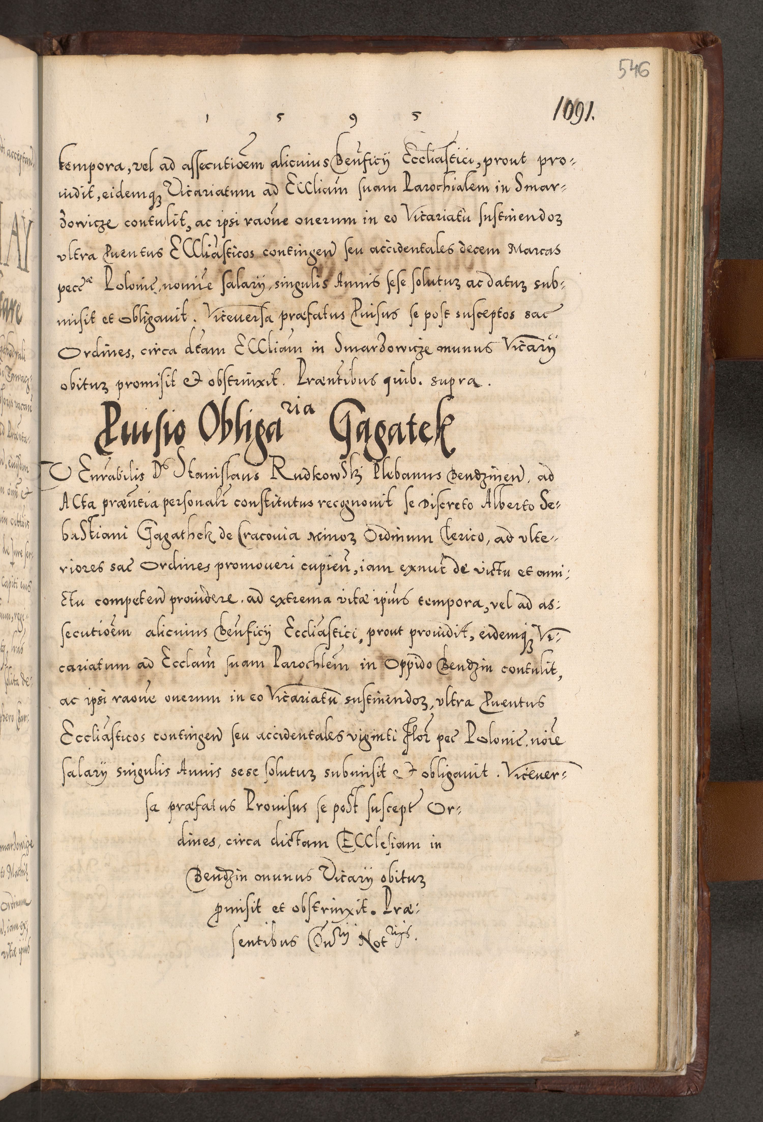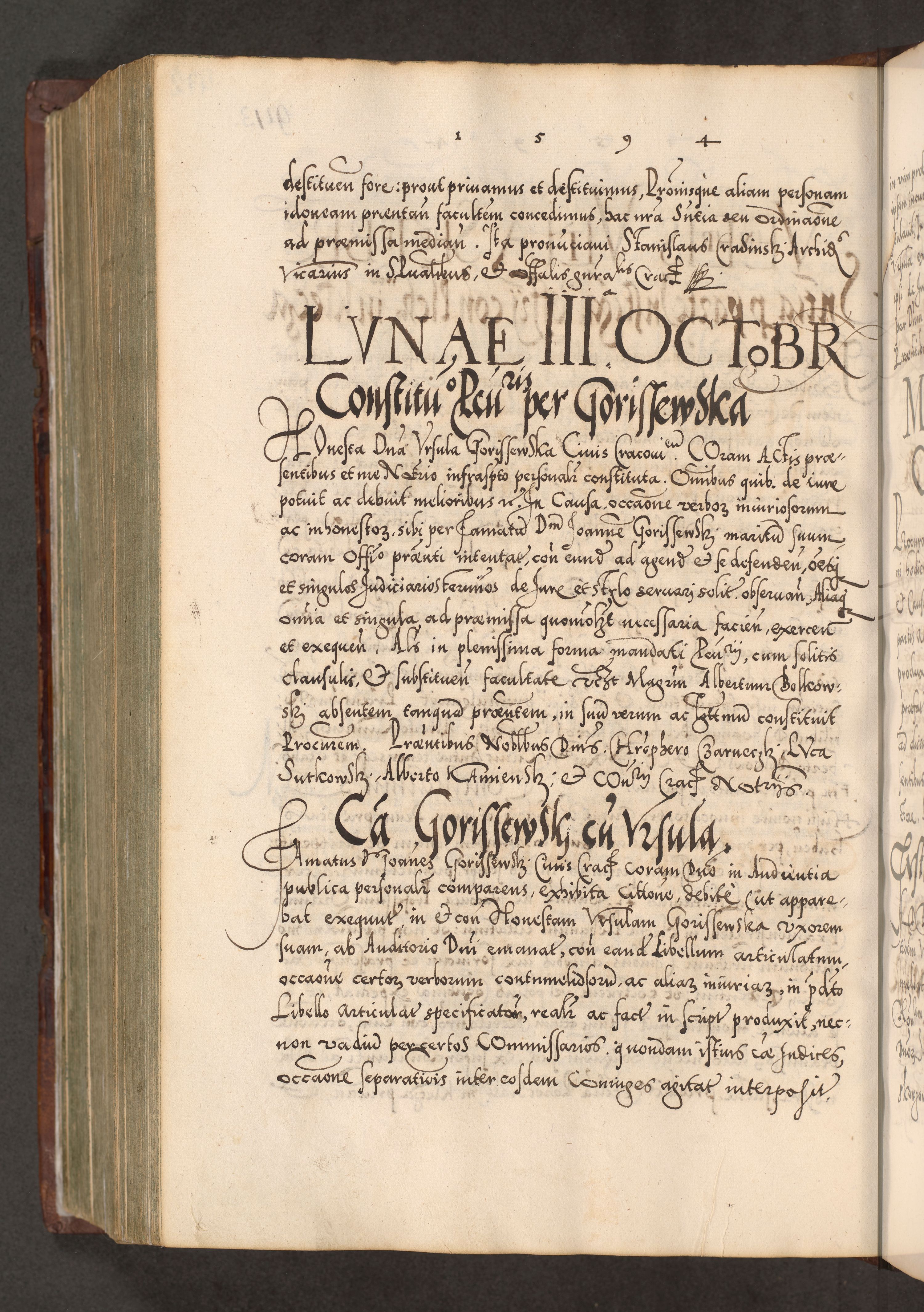 Illistrissimo et revedissimo in Christo Patre Domino Domino Georgio Rzadziwił Miserone Divina Sacrostae R. E. Tituli S. Sixti Presbitero Cardinali Duce in Olyka et Niesswiesz ad Gubernacula Ecclessiae Cracoviensis cuius administratorialem a Sancta Sede Apostolica obtinverat feliciter sedente. Acta actorum, causarum, sententiarum tam deffinitivarum quam interloquutoriarum decretorum, obligationum, quietationum, recognitionum, constitutionum procuratorum etc. coram Reverendo Domino Stanislao Crassinskz de Crasne Archidiacono Cracoviensis, Scholastico Gnesnesis, Custode Plocensis etc. Vicario et Officiali Generali Cracoviensi in Ano Domini Millesimo Quingentesimo Nonagesimo Primo cuius indictio quarta pontificatus SS. Domini Nostri Gregorii XIIII Anno I psius prio feliciter incipiut