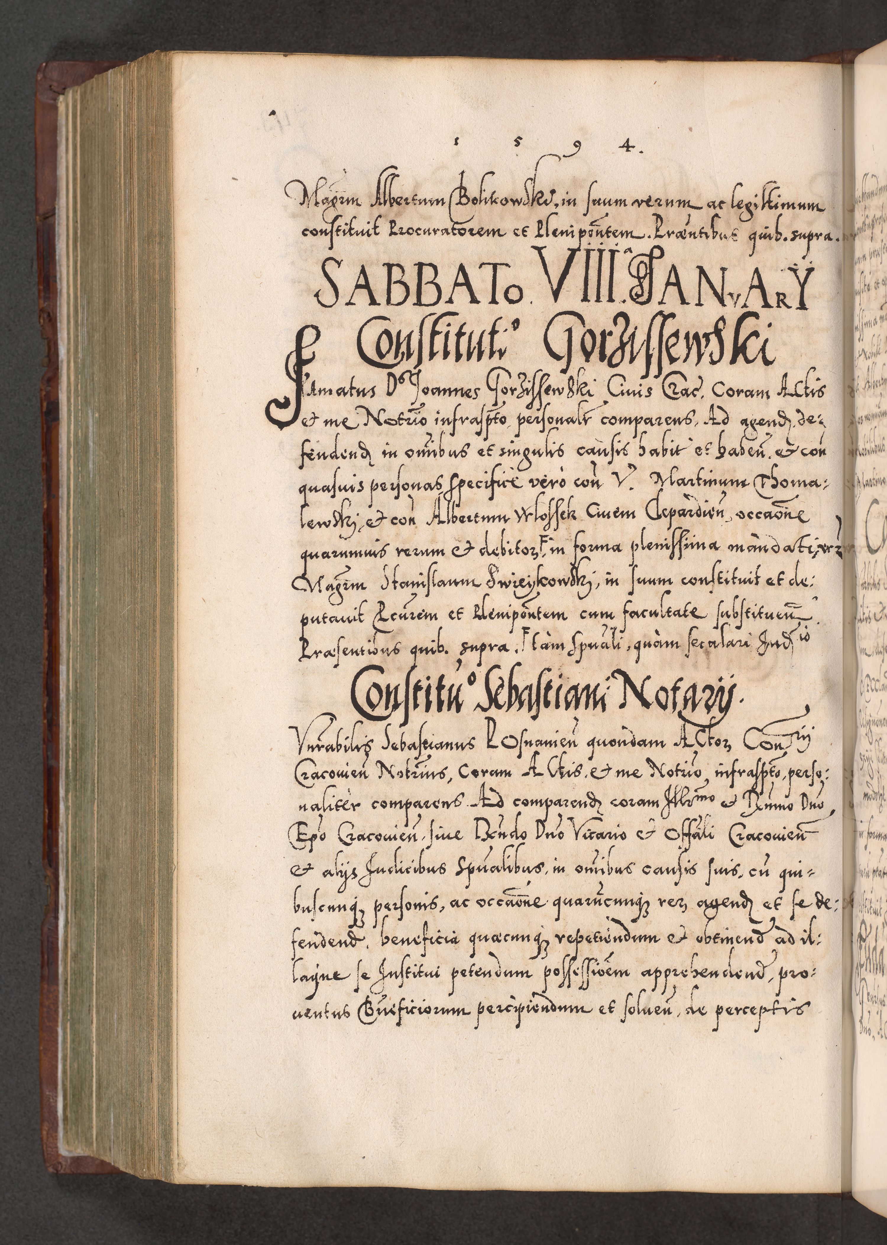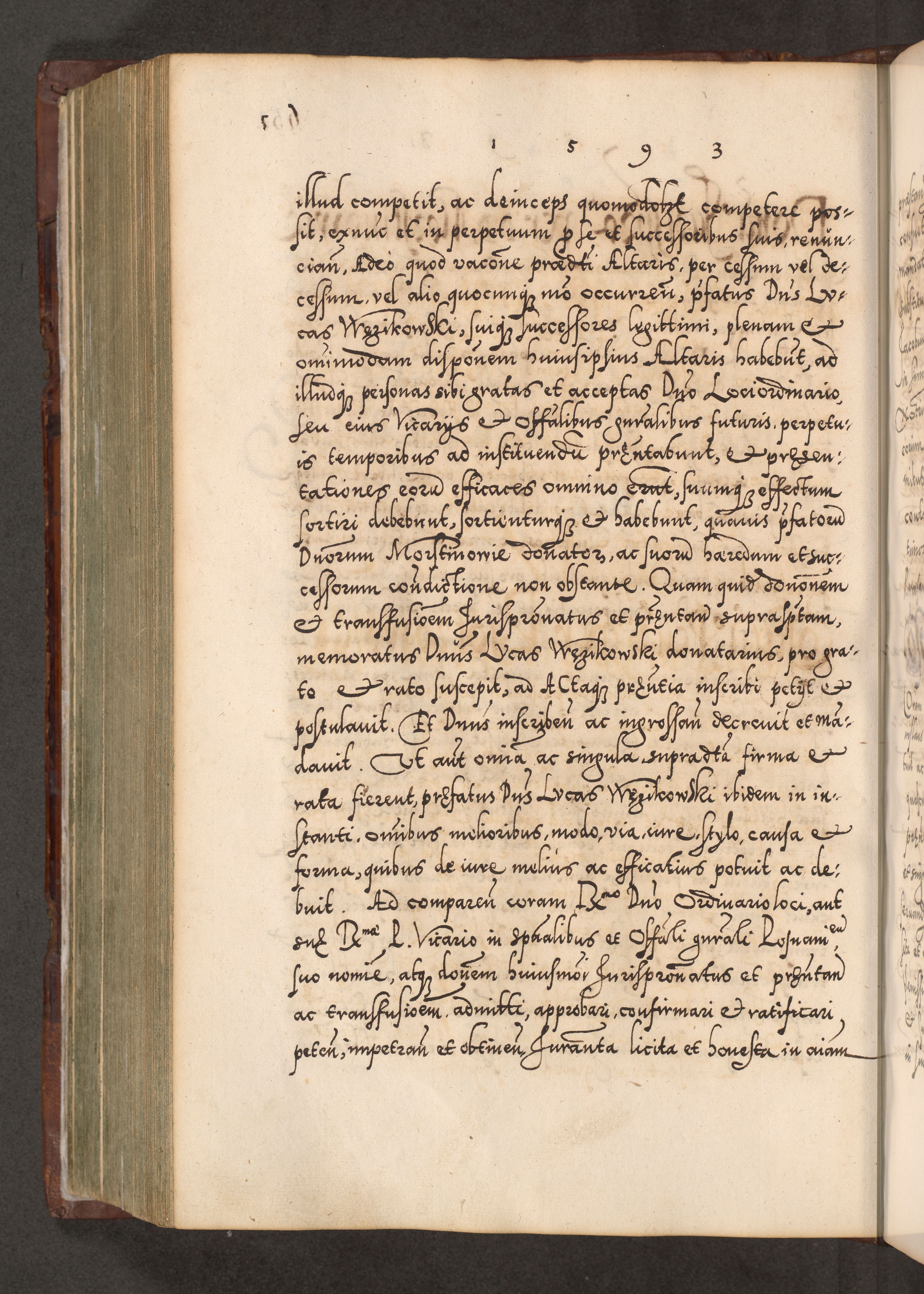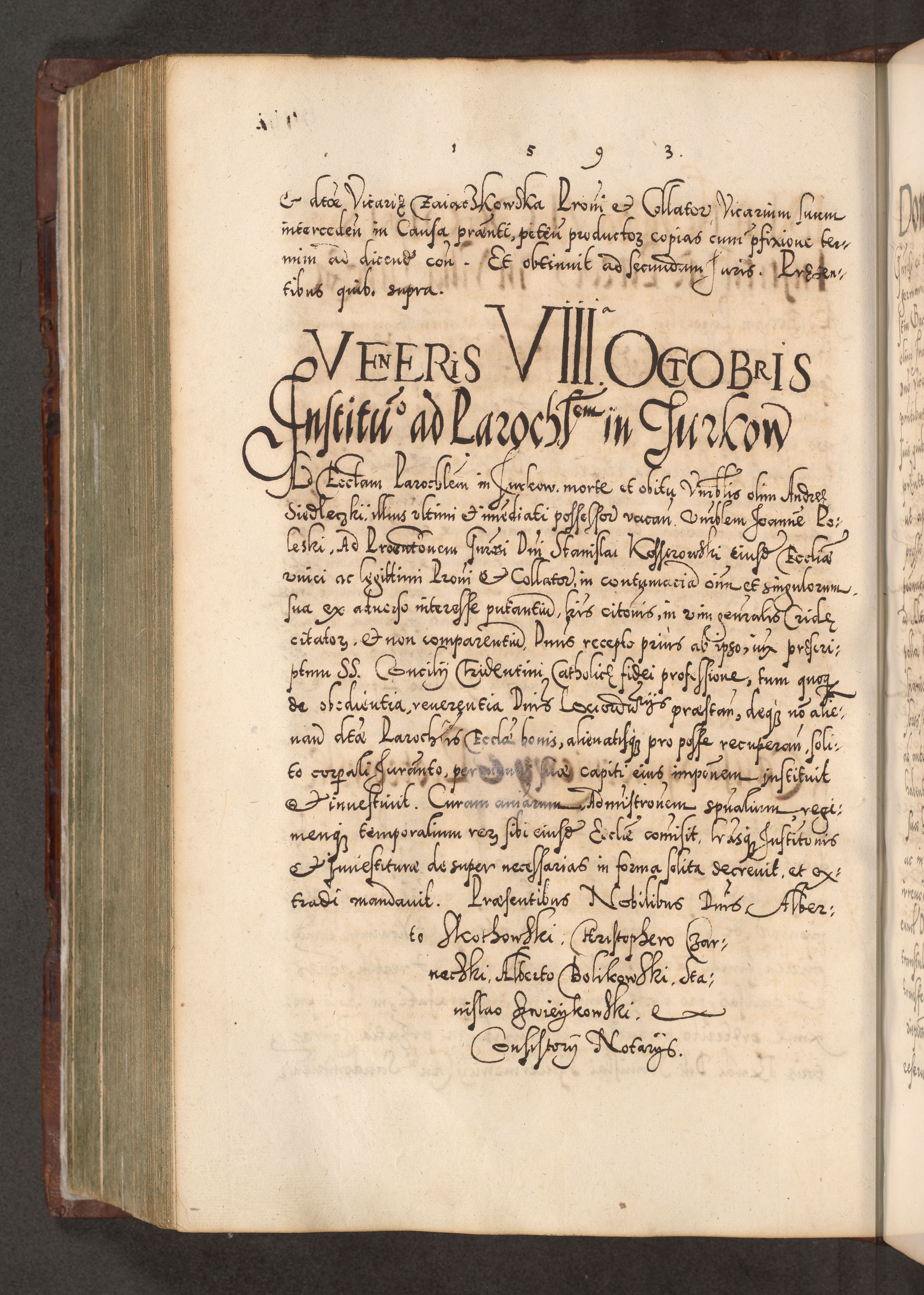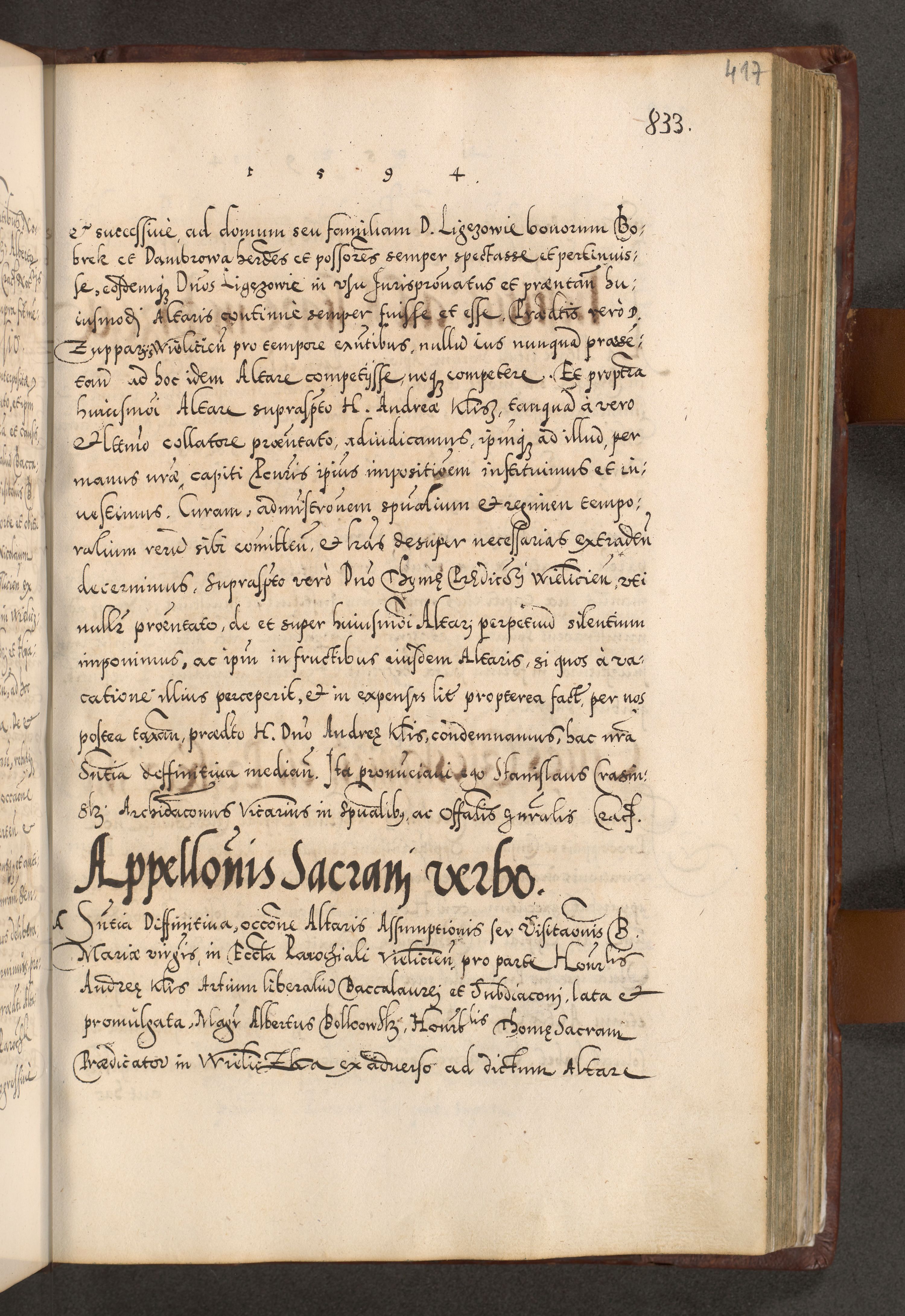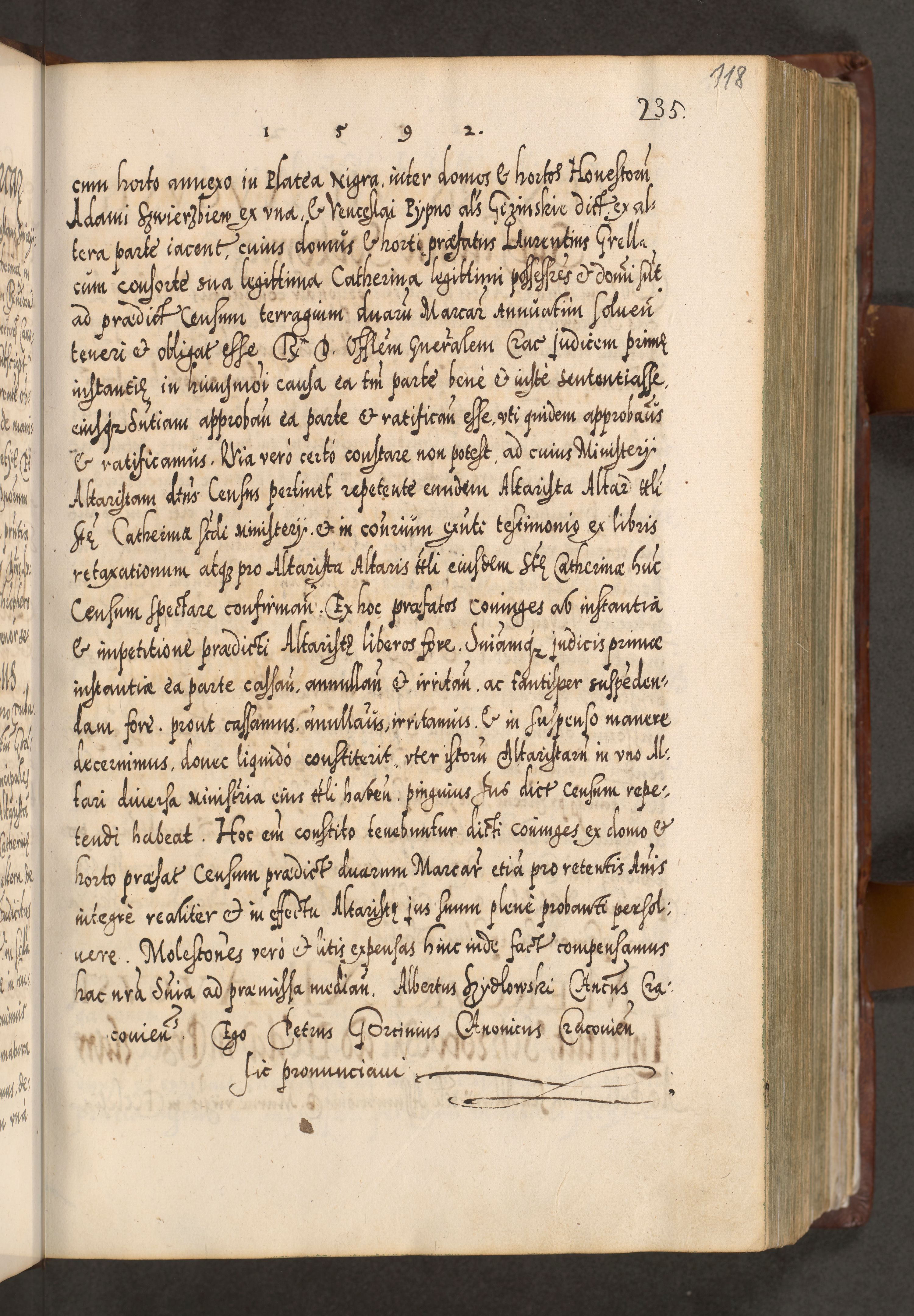 Illistrissimo et revedissimo in Christo Patre Domino Domino Georgio Rzadziwił Miserone Divina Sacrostae R. E. Tituli S. Sixti Presbitero Cardinali Duce in Olyka et Niesswiesz ad Gubernacula Ecclessiae Cracoviensis cuius administratorialem a Sancta Sede Apostolica obtinverat feliciter sedente. Acta actorum, causarum, sententiarum tam deffinitivarum quam interloquutoriarum decretorum, obligationum, quietationum, recognitionum, constitutionum procuratorum etc. coram Reverendo Domino Stanislao Crassinskz de Crasne Archidiacono Cracoviensis, Scholastico Gnesnesis, Custode Plocensis etc. Vicario et Officiali Generali Cracoviensi in Ano Domini Millesimo Quingentesimo Nonagesimo Primo cuius indictio quarta pontificatus SS. Domini Nostri Gregorii XIIII Anno I psius prio feliciter incipiut