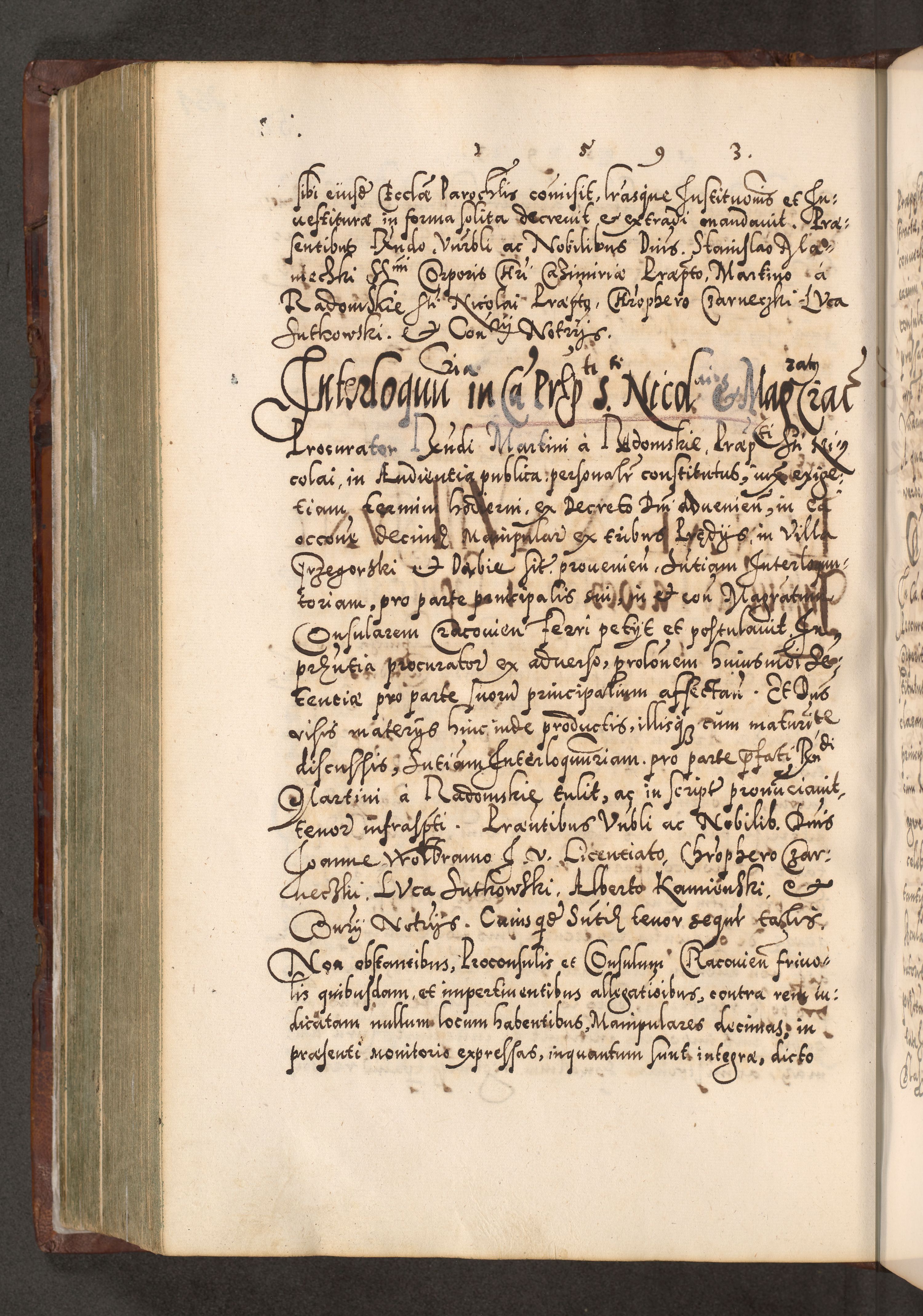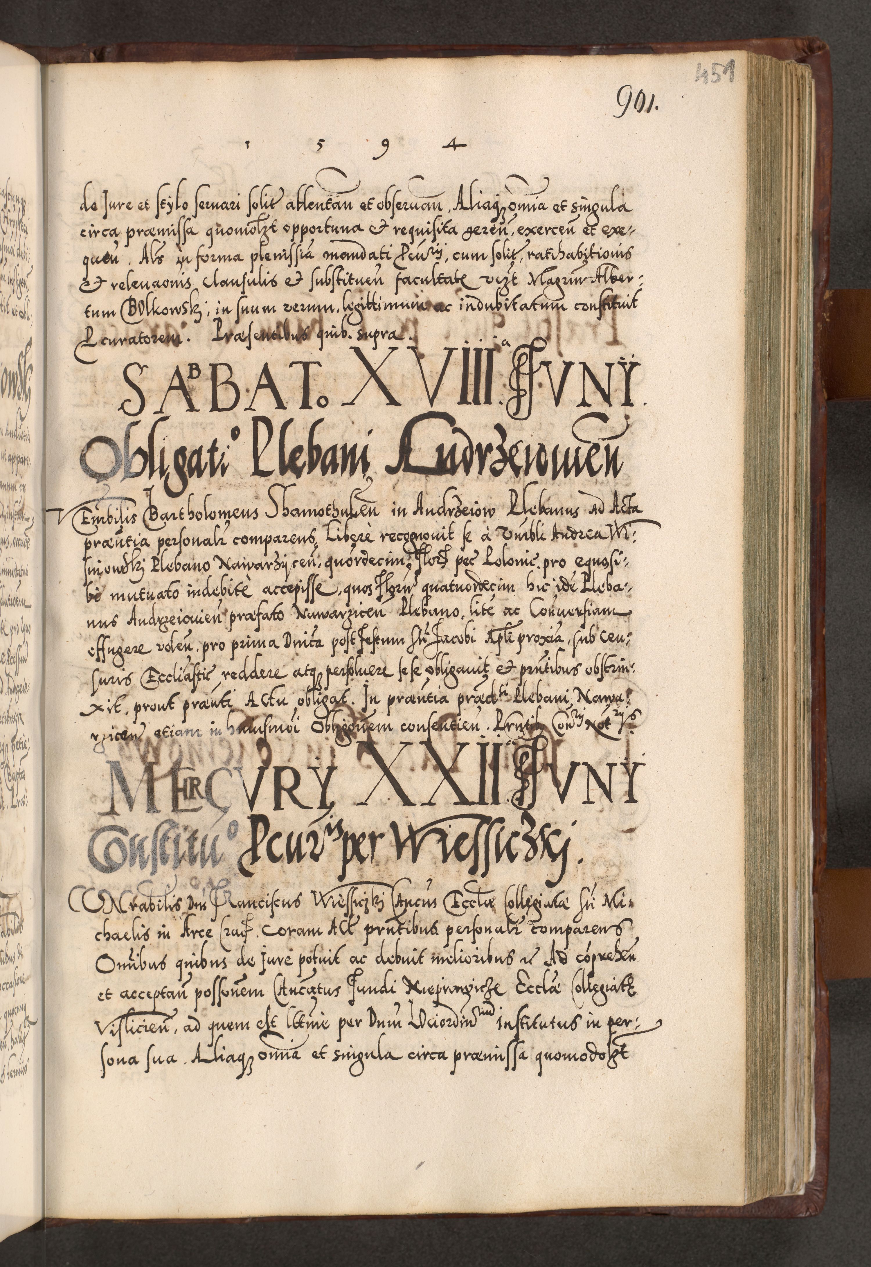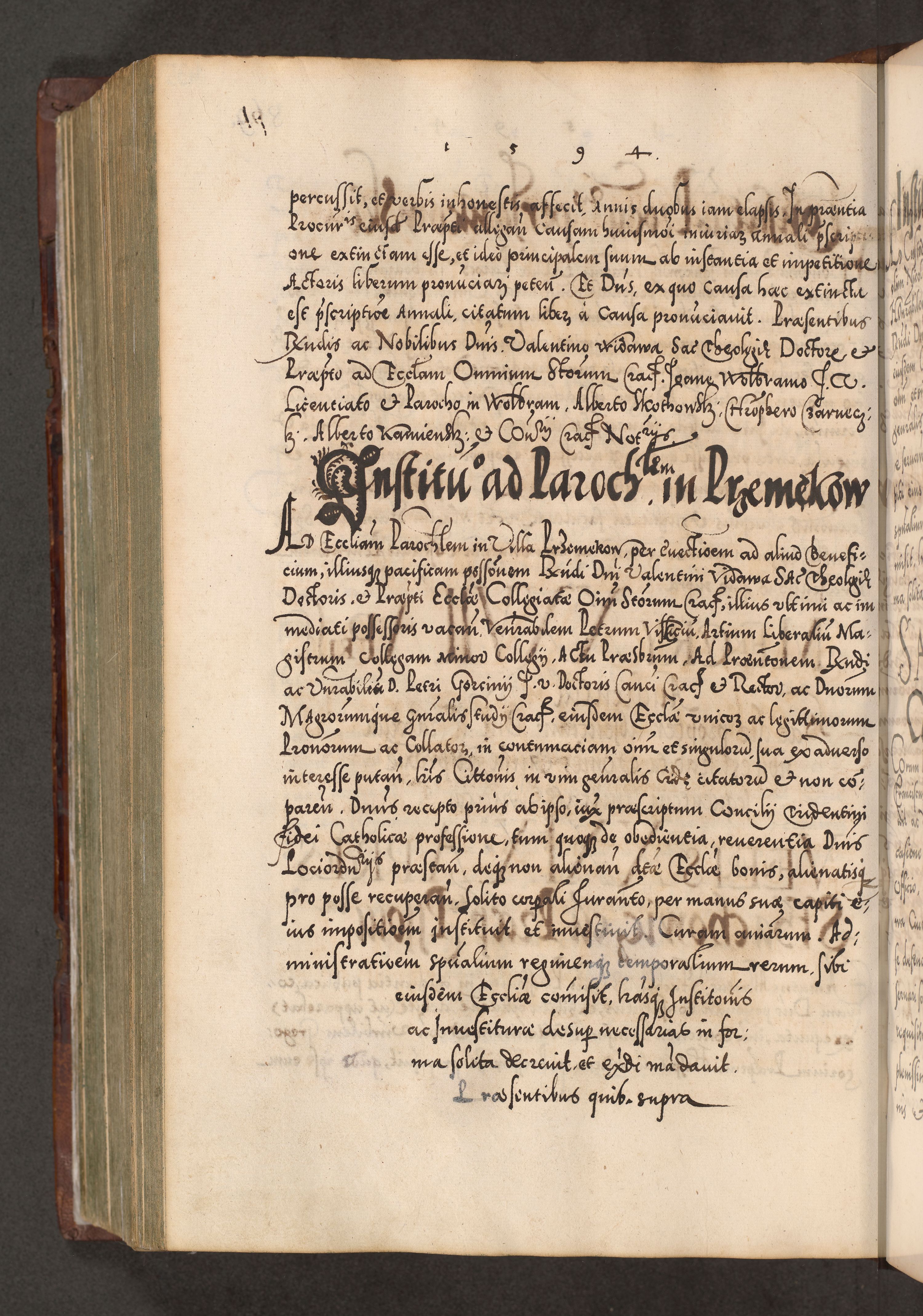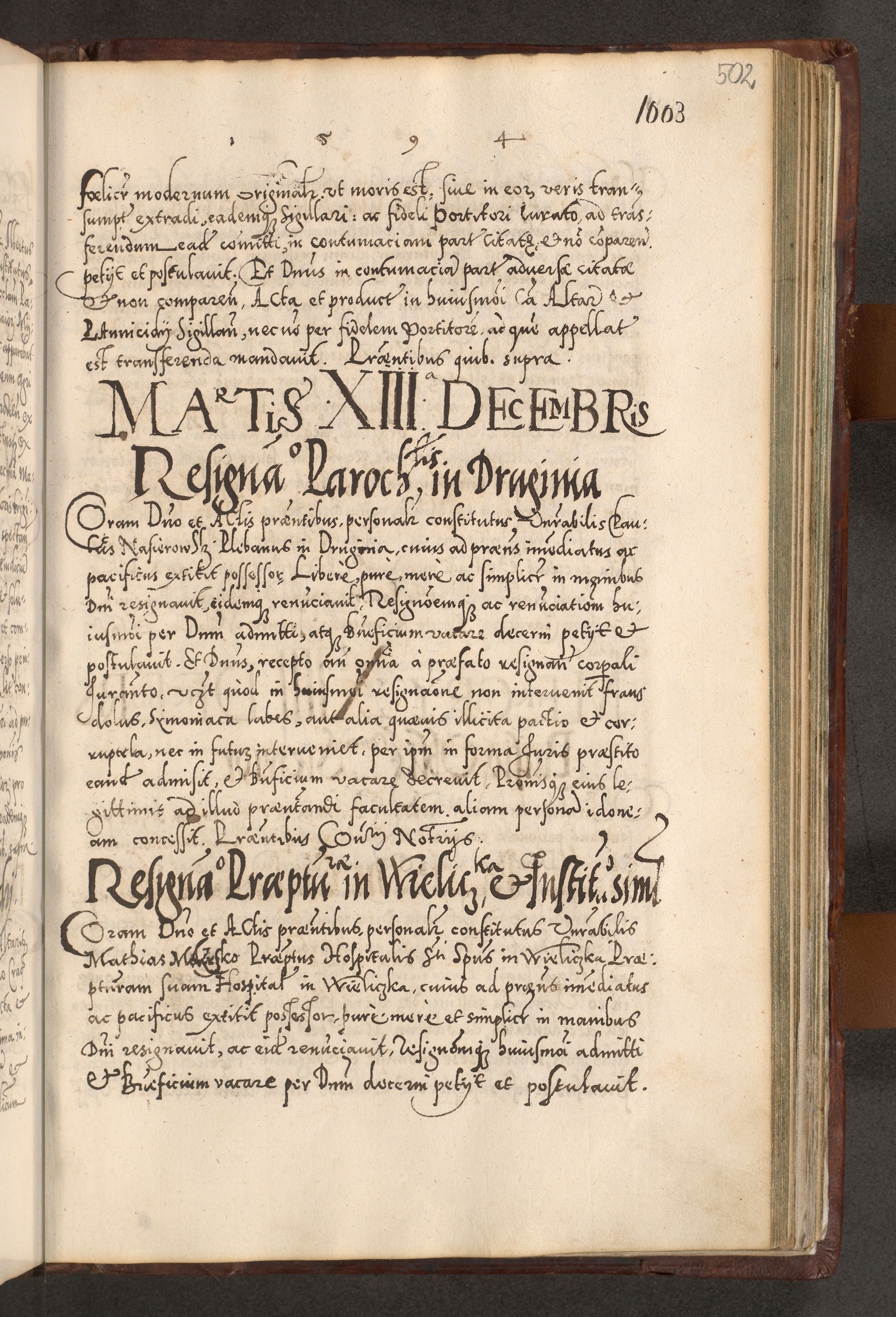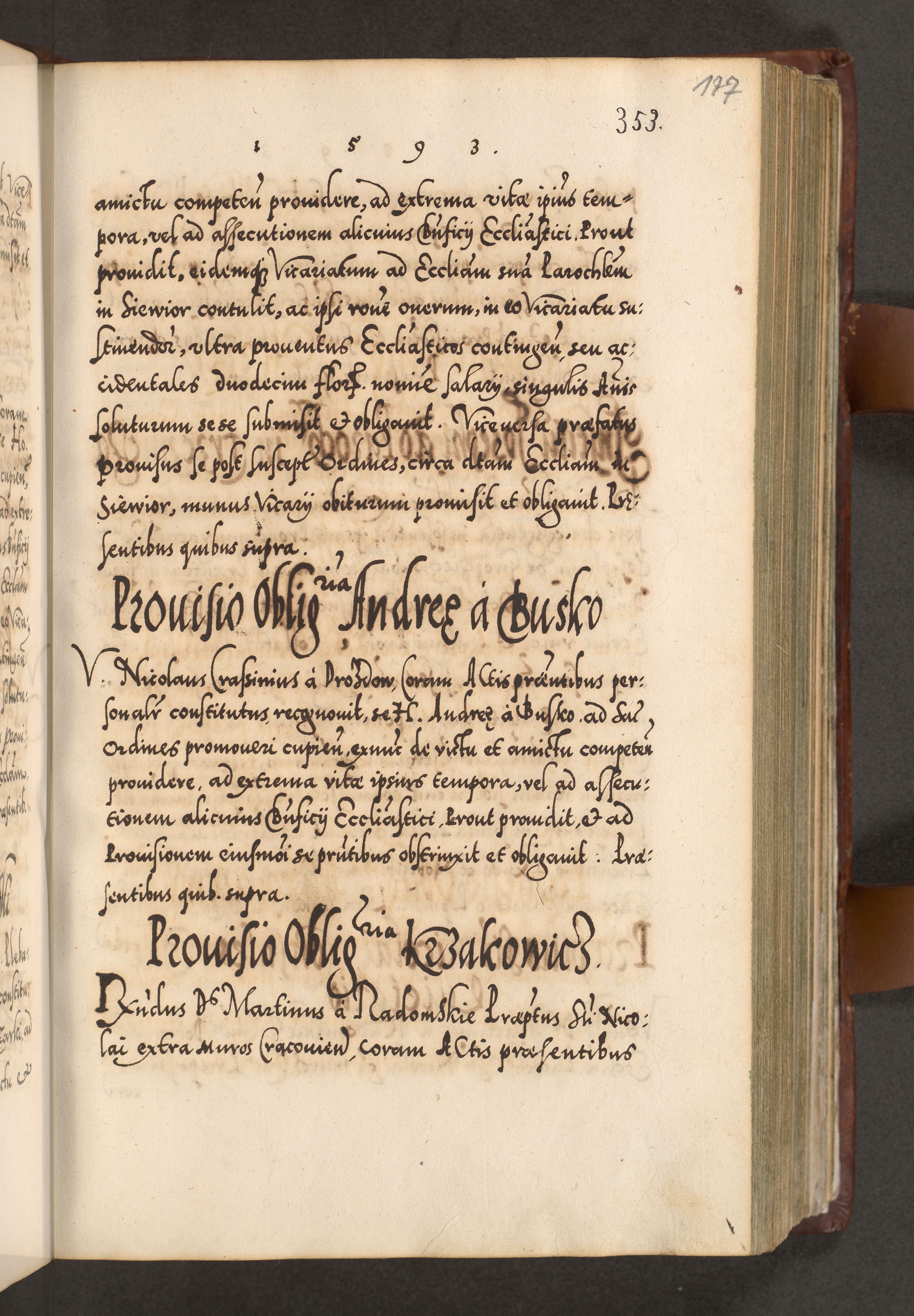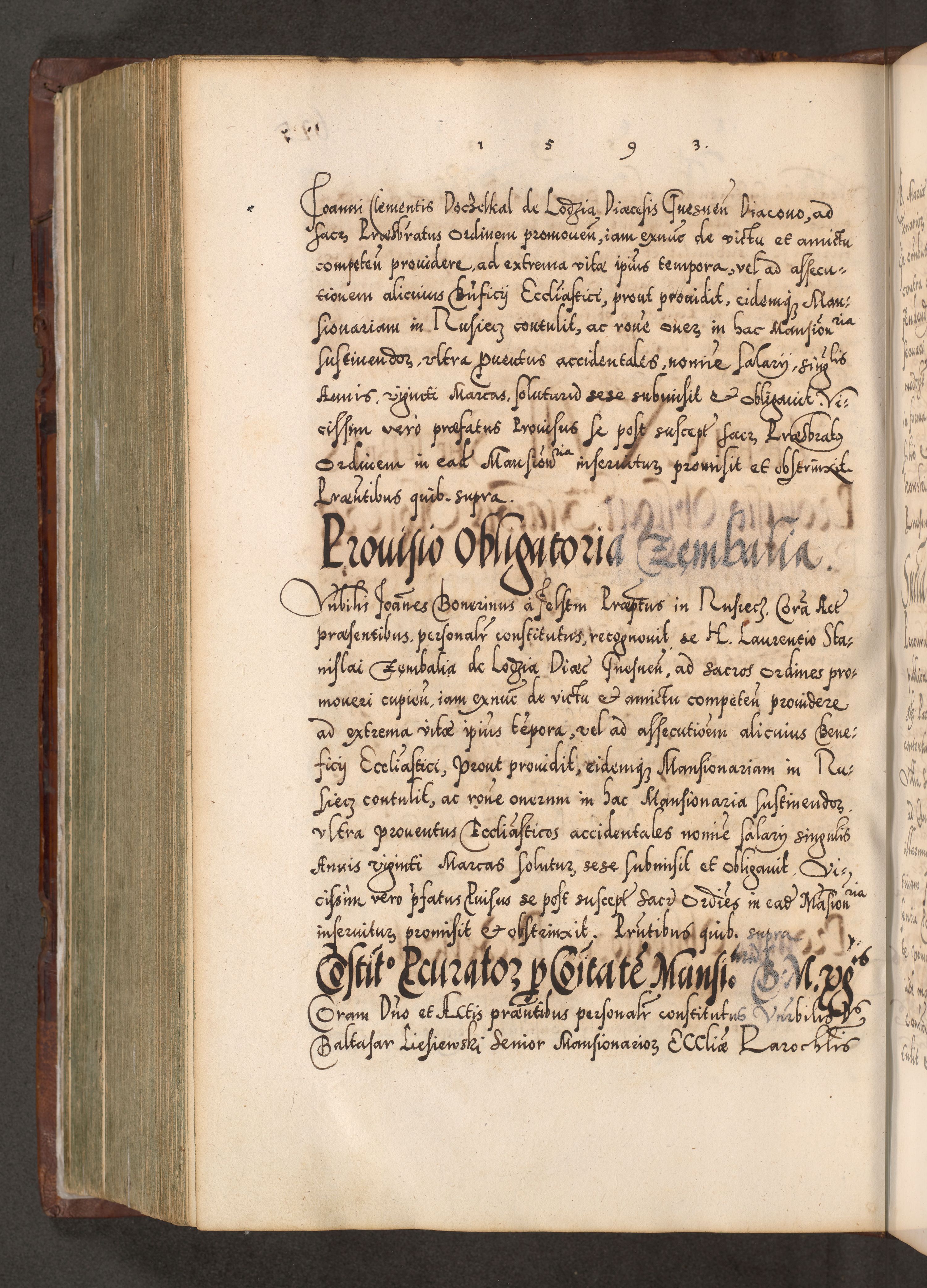 Illistrissimo et revedissimo in Christo Patre Domino Domino Georgio Rzadziwił Miserone Divina Sacrostae R. E. Tituli S. Sixti Presbitero Cardinali Duce in Olyka et Niesswiesz ad Gubernacula Ecclessiae Cracoviensis cuius administratorialem a Sancta Sede Apostolica obtinverat feliciter sedente. Acta actorum, causarum, sententiarum tam deffinitivarum quam interloquutoriarum decretorum, obligationum, quietationum, recognitionum, constitutionum procuratorum etc. coram Reverendo Domino Stanislao Crassinskz de Crasne Archidiacono Cracoviensis, Scholastico Gnesnesis, Custode Plocensis etc. Vicario et Officiali Generali Cracoviensi in Ano Domini Millesimo Quingentesimo Nonagesimo Primo cuius indictio quarta pontificatus SS. Domini Nostri Gregorii XIIII Anno I psius prio feliciter incipiut