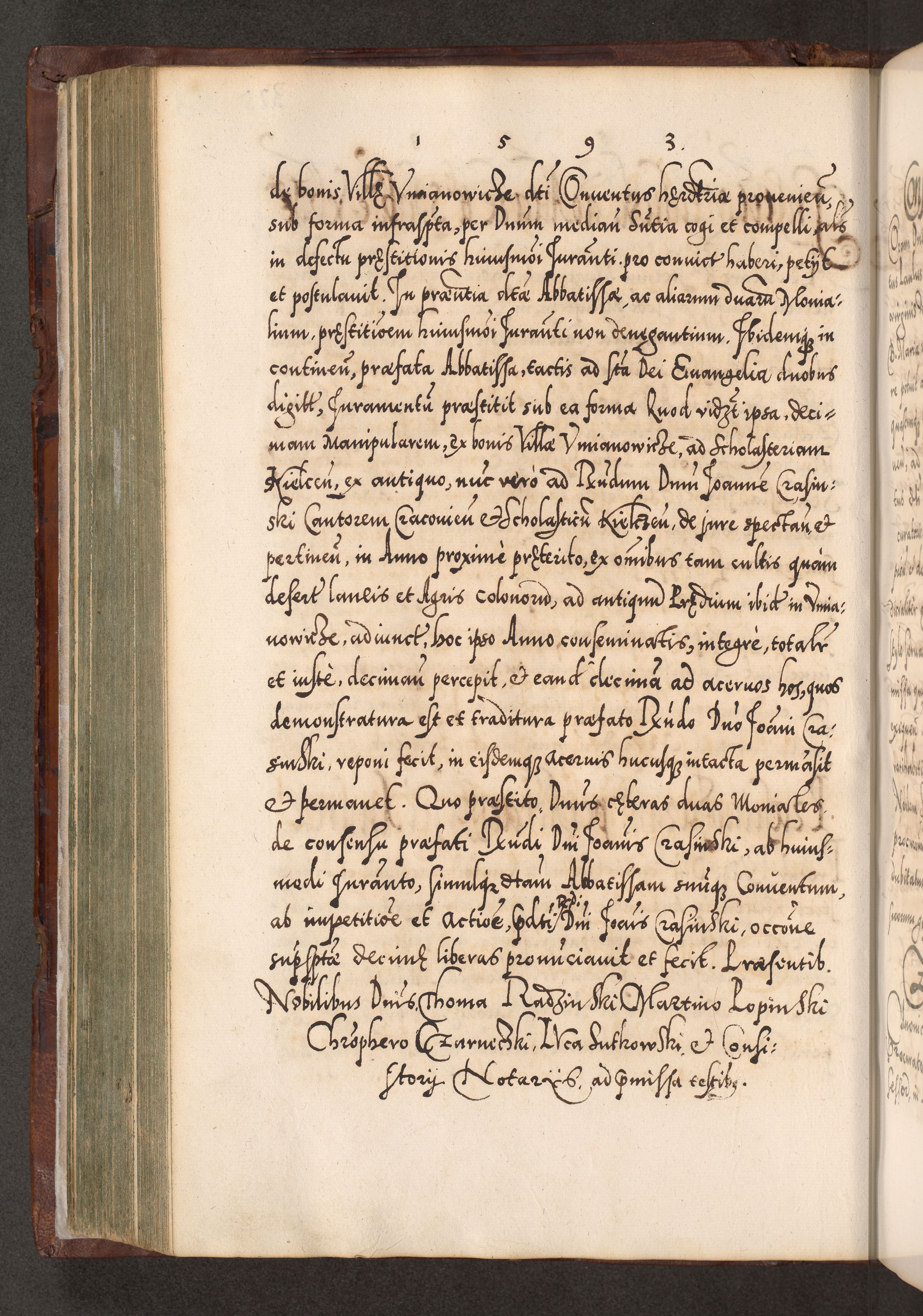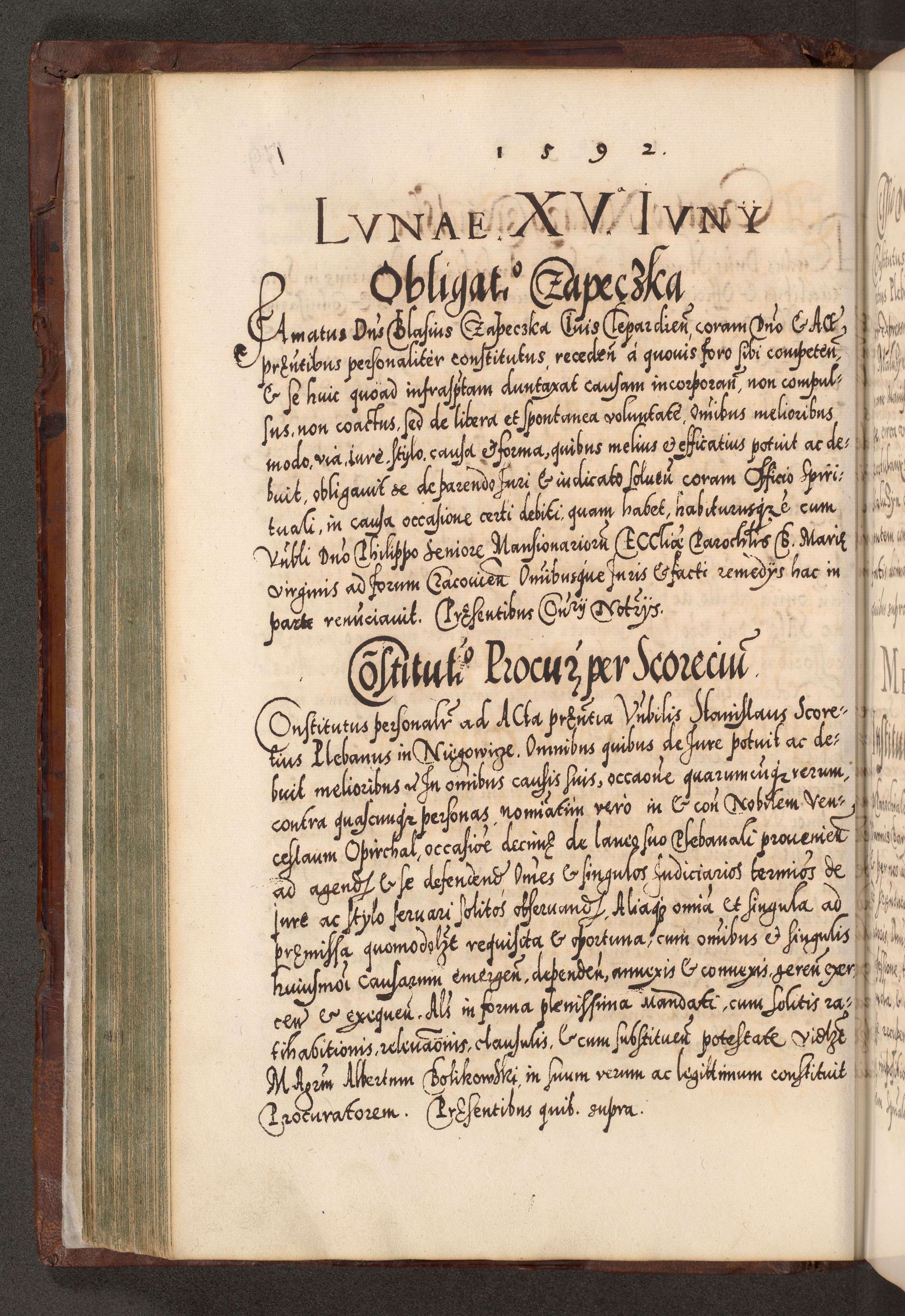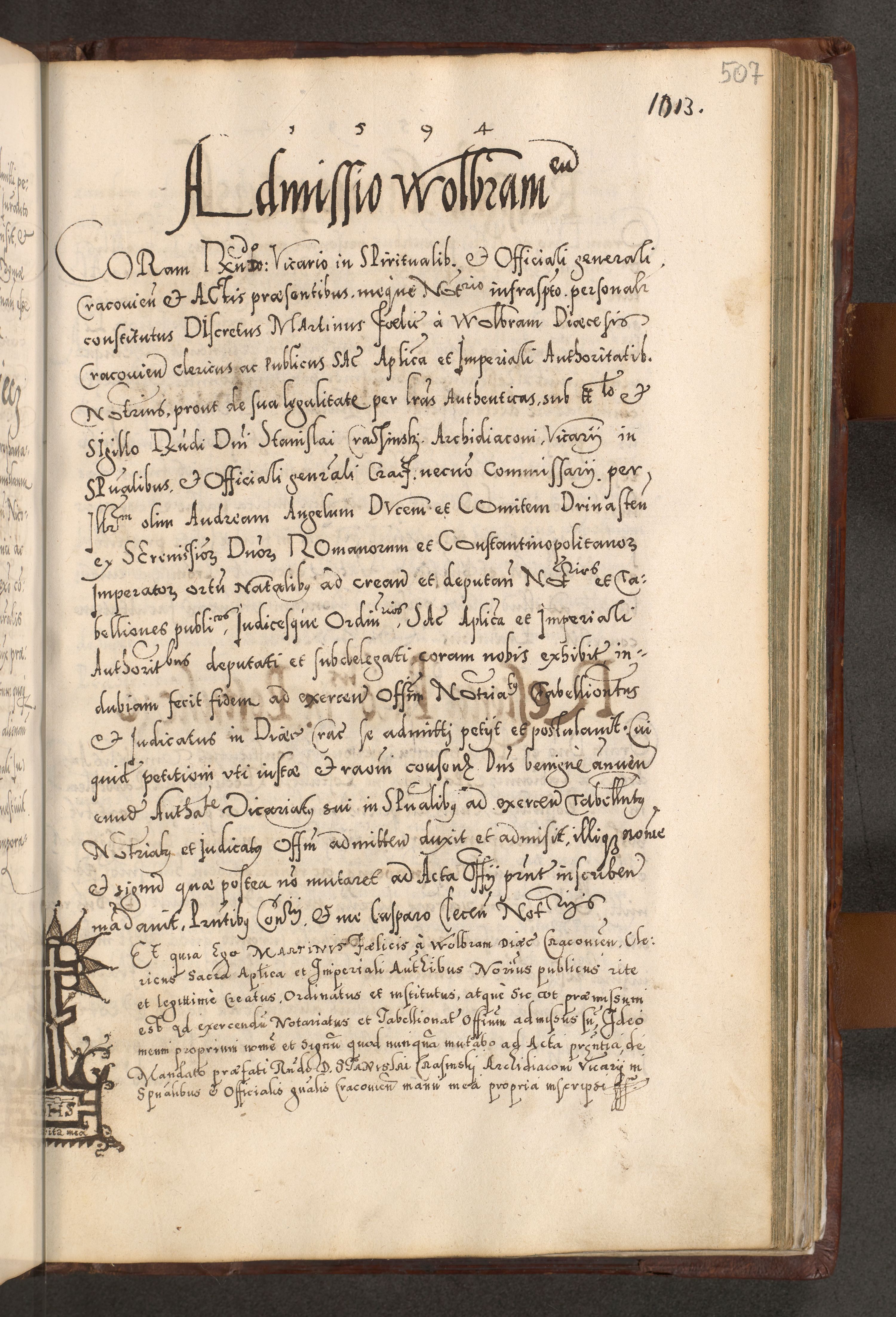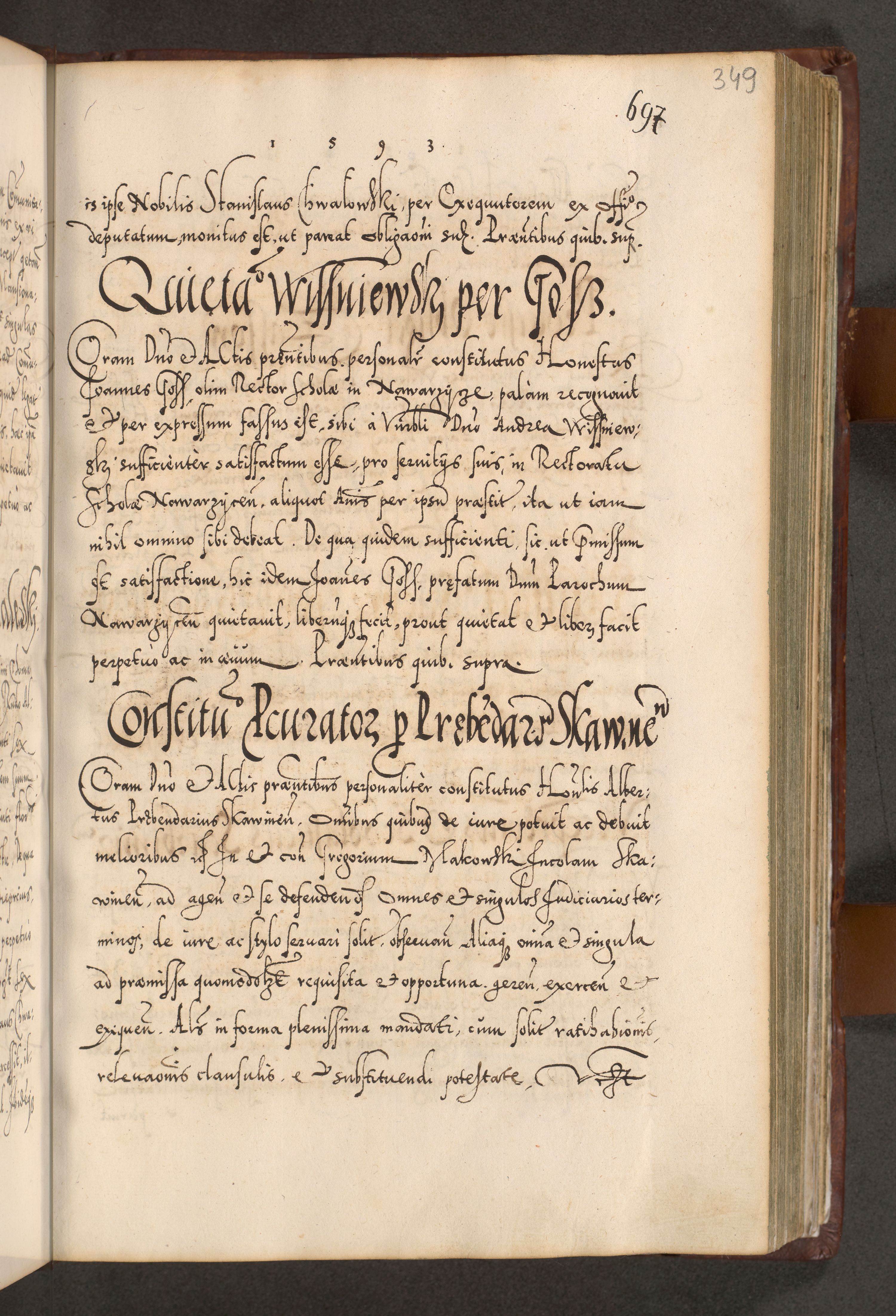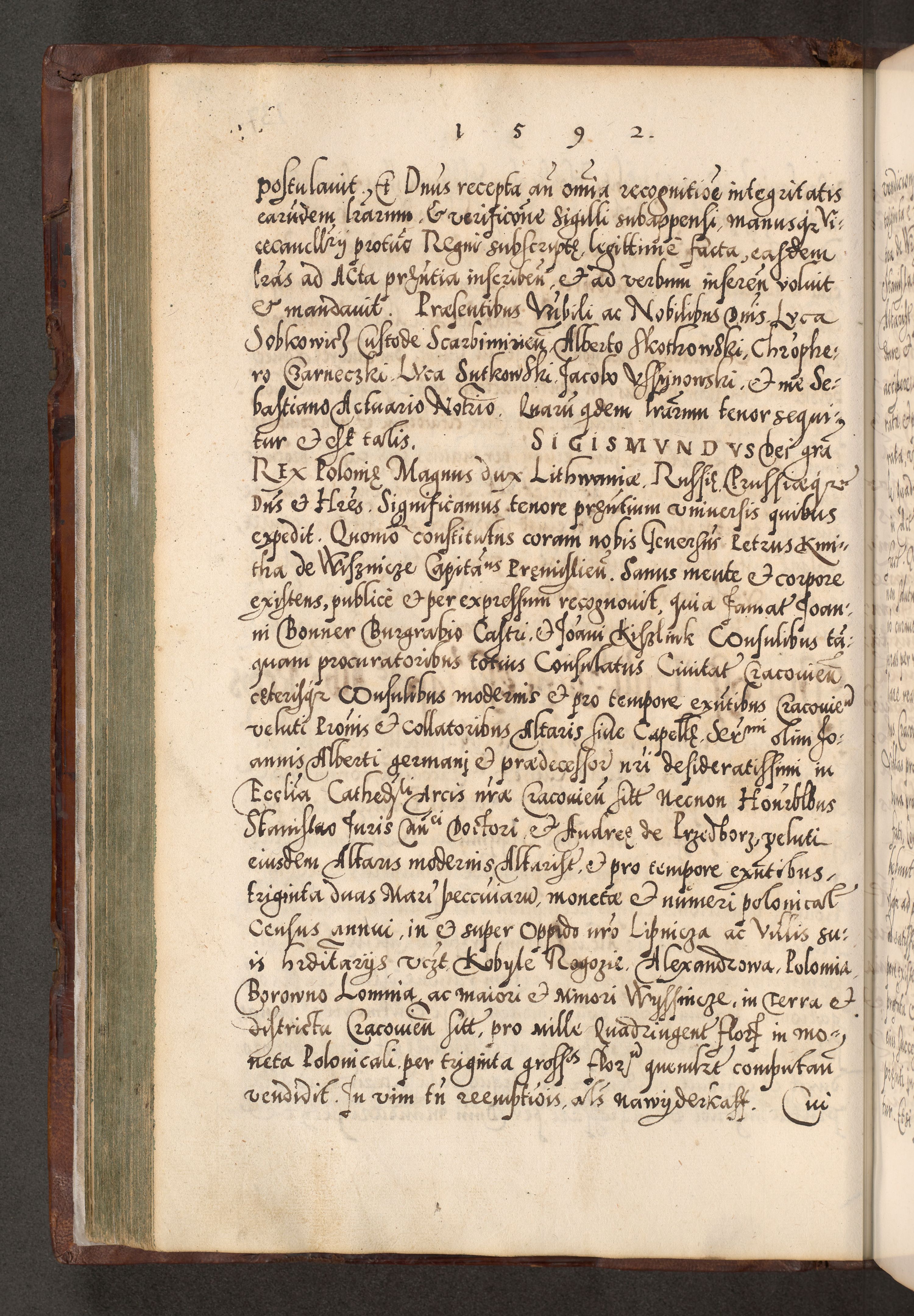 Illistrissimo et revedissimo in Christo Patre Domino Domino Georgio Rzadziwił Miserone Divina Sacrostae R. E. Tituli S. Sixti Presbitero Cardinali Duce in Olyka et Niesswiesz ad Gubernacula Ecclessiae Cracoviensis cuius administratorialem a Sancta Sede Apostolica obtinverat feliciter sedente. Acta actorum, causarum, sententiarum tam deffinitivarum quam interloquutoriarum decretorum, obligationum, quietationum, recognitionum, constitutionum procuratorum etc. coram Reverendo Domino Stanislao Crassinskz de Crasne Archidiacono Cracoviensis, Scholastico Gnesnesis, Custode Plocensis etc. Vicario et Officiali Generali Cracoviensi in Ano Domini Millesimo Quingentesimo Nonagesimo Primo cuius indictio quarta pontificatus SS. Domini Nostri Gregorii XIIII Anno I psius prio feliciter incipiut
