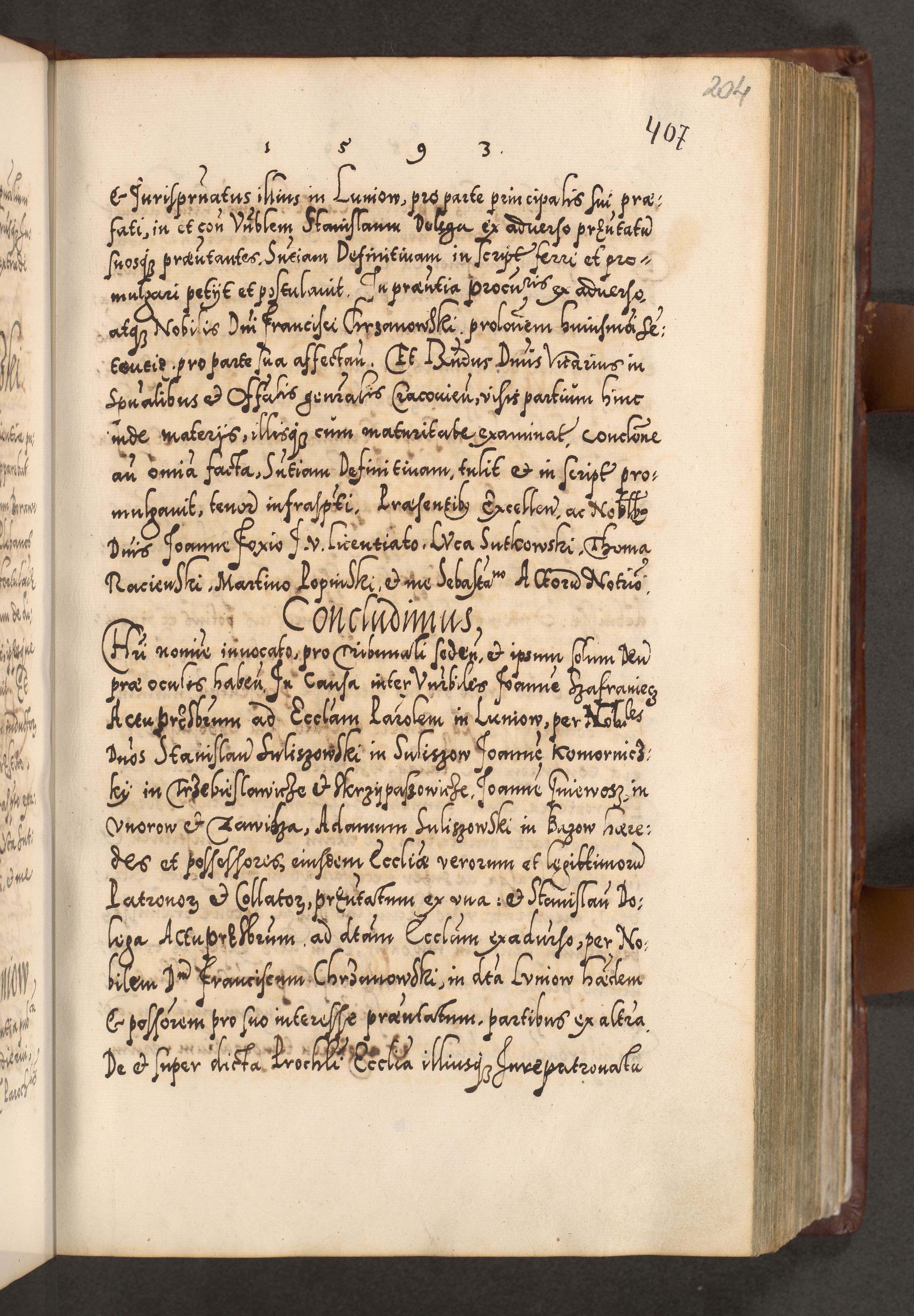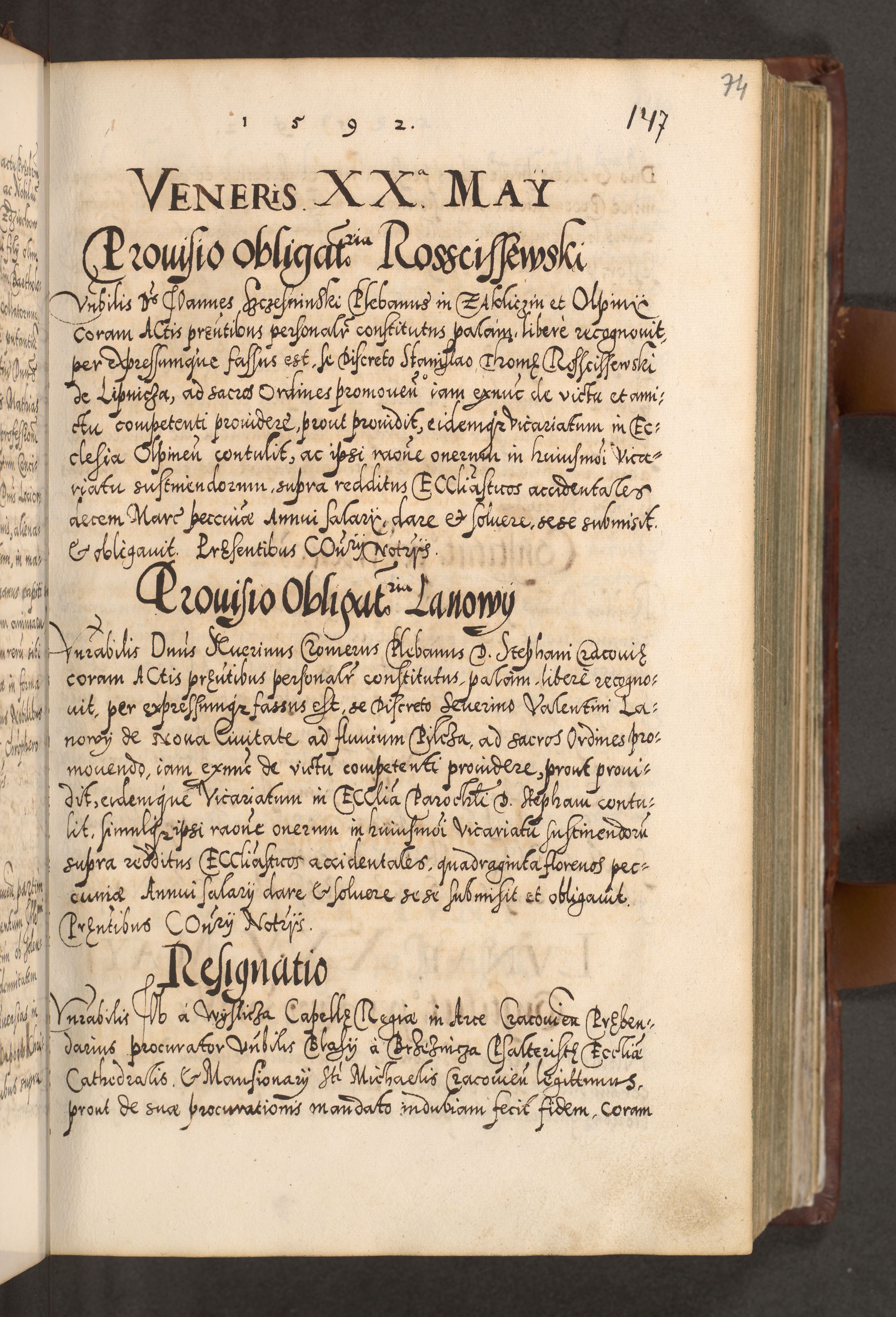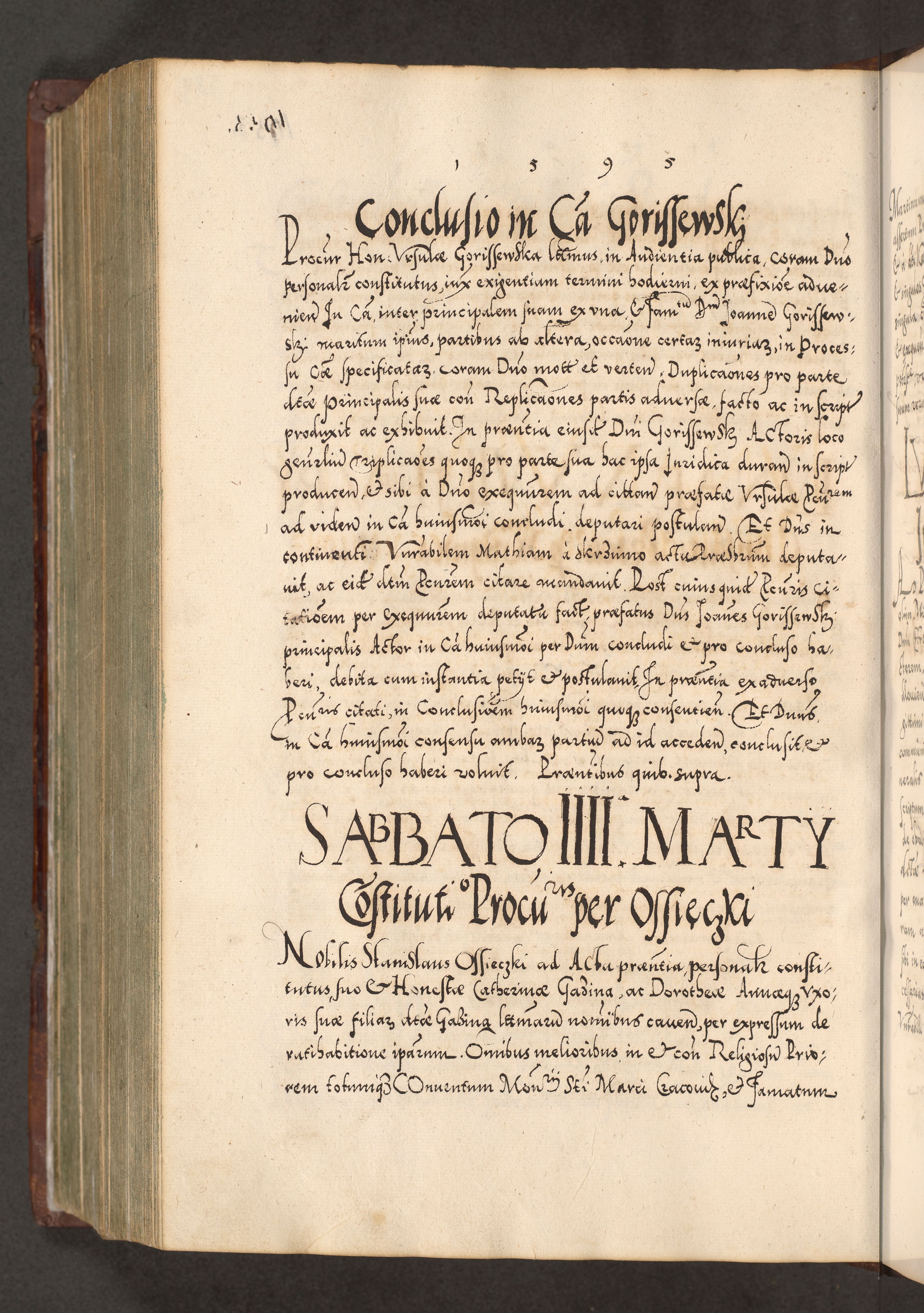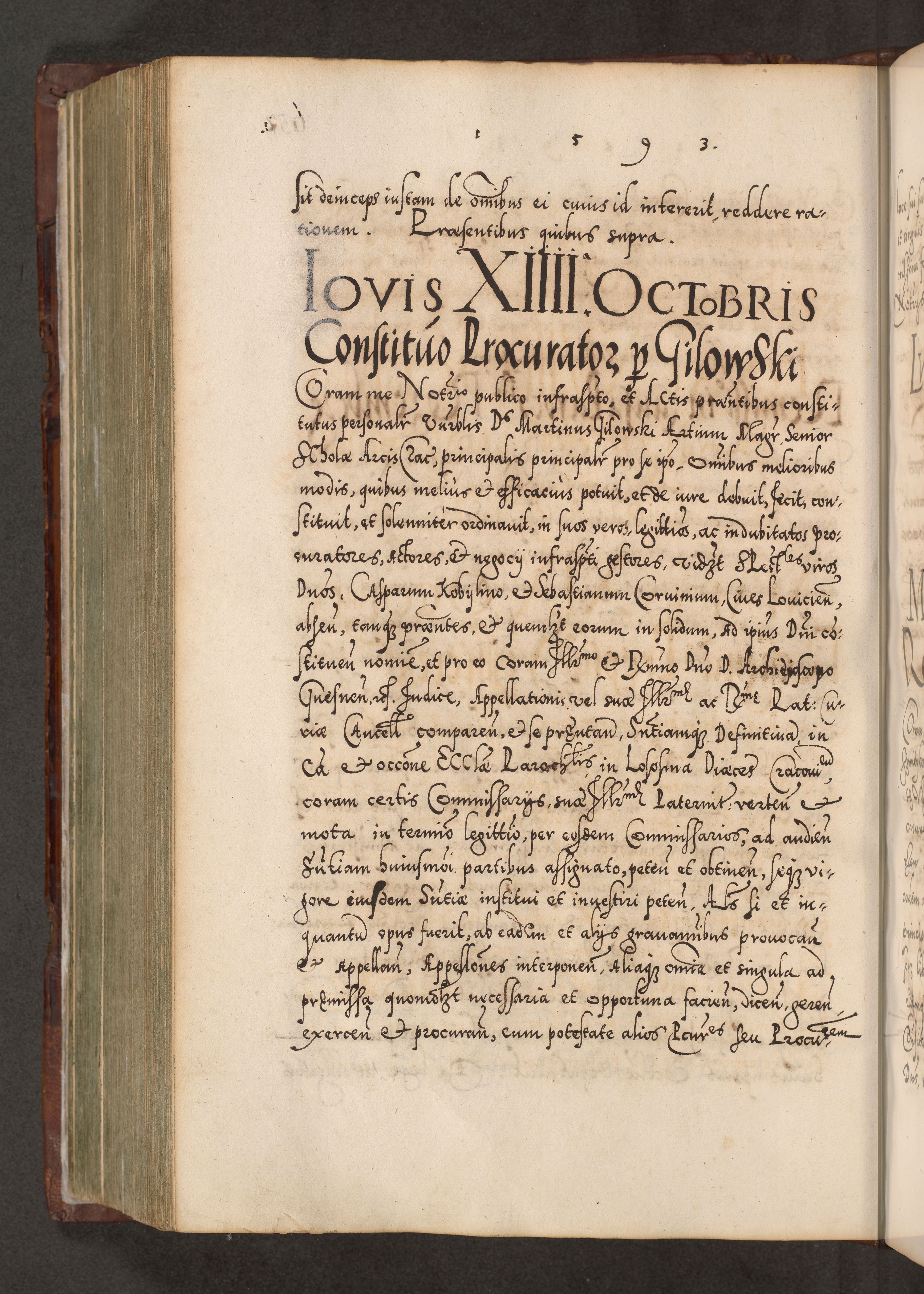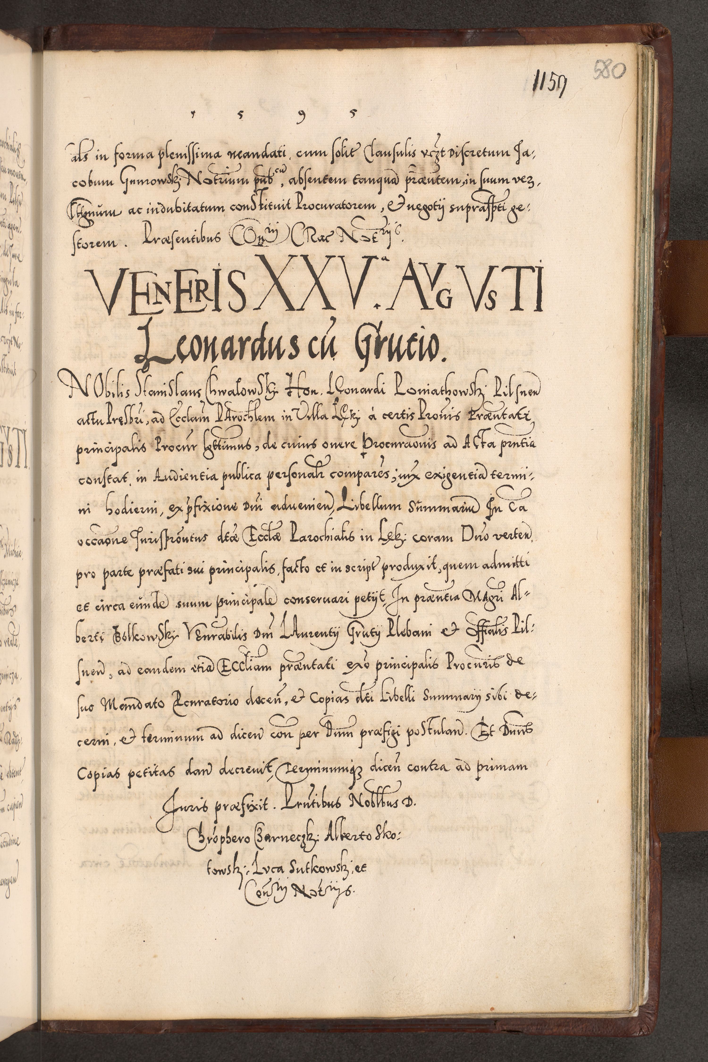 Illistrissimo et revedissimo in Christo Patre Domino Domino Georgio Rzadziwił Miserone Divina Sacrostae R. E. Tituli S. Sixti Presbitero Cardinali Duce in Olyka et Niesswiesz ad Gubernacula Ecclessiae Cracoviensis cuius administratorialem a Sancta Sede Apostolica obtinverat feliciter sedente. Acta actorum, causarum, sententiarum tam deffinitivarum quam interloquutoriarum decretorum, obligationum, quietationum, recognitionum, constitutionum procuratorum etc. coram Reverendo Domino Stanislao Crassinskz de Crasne Archidiacono Cracoviensis, Scholastico Gnesnesis, Custode Plocensis etc. Vicario et Officiali Generali Cracoviensi in Ano Domini Millesimo Quingentesimo Nonagesimo Primo cuius indictio quarta pontificatus SS. Domini Nostri Gregorii XIIII Anno I psius prio feliciter incipiut