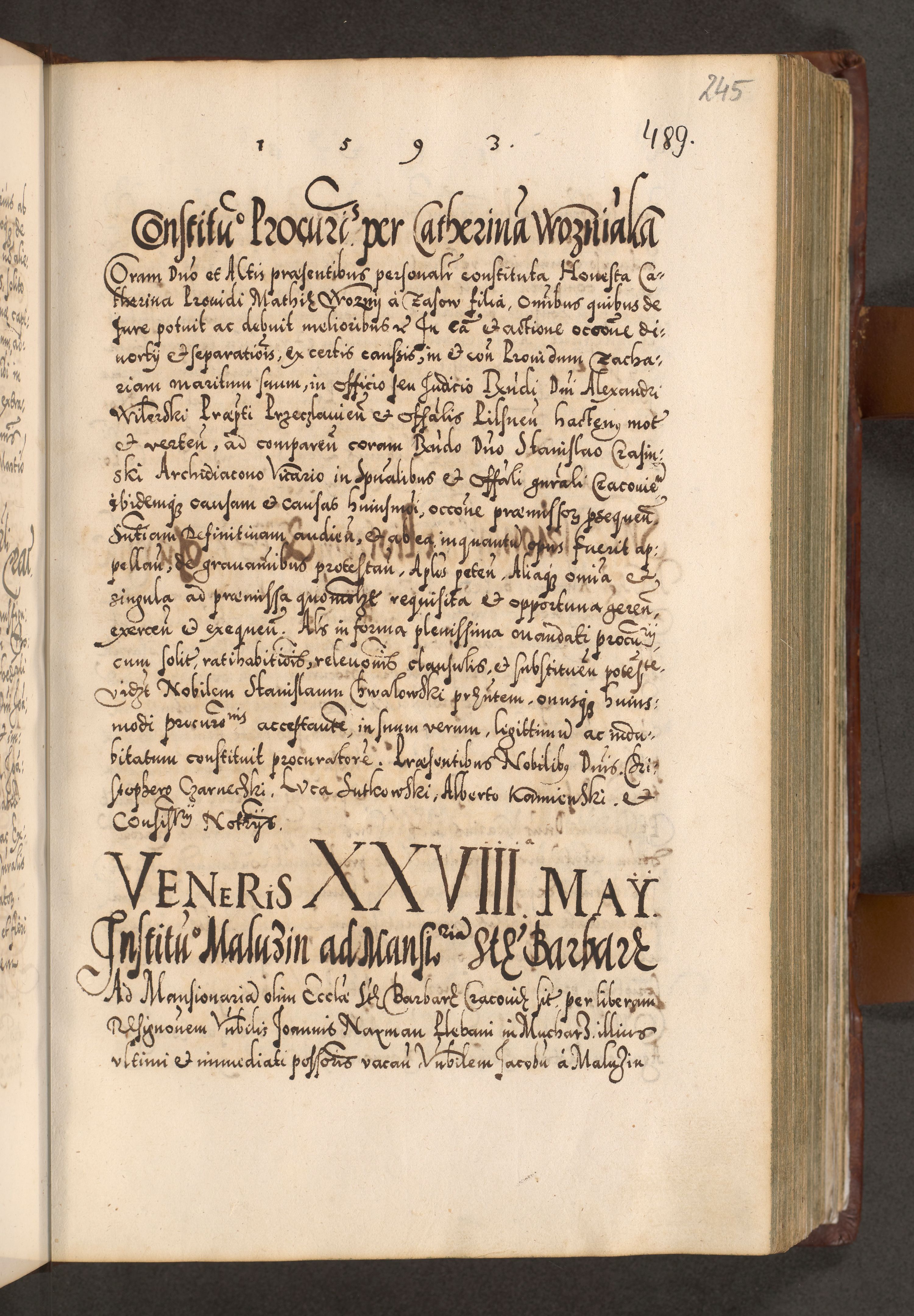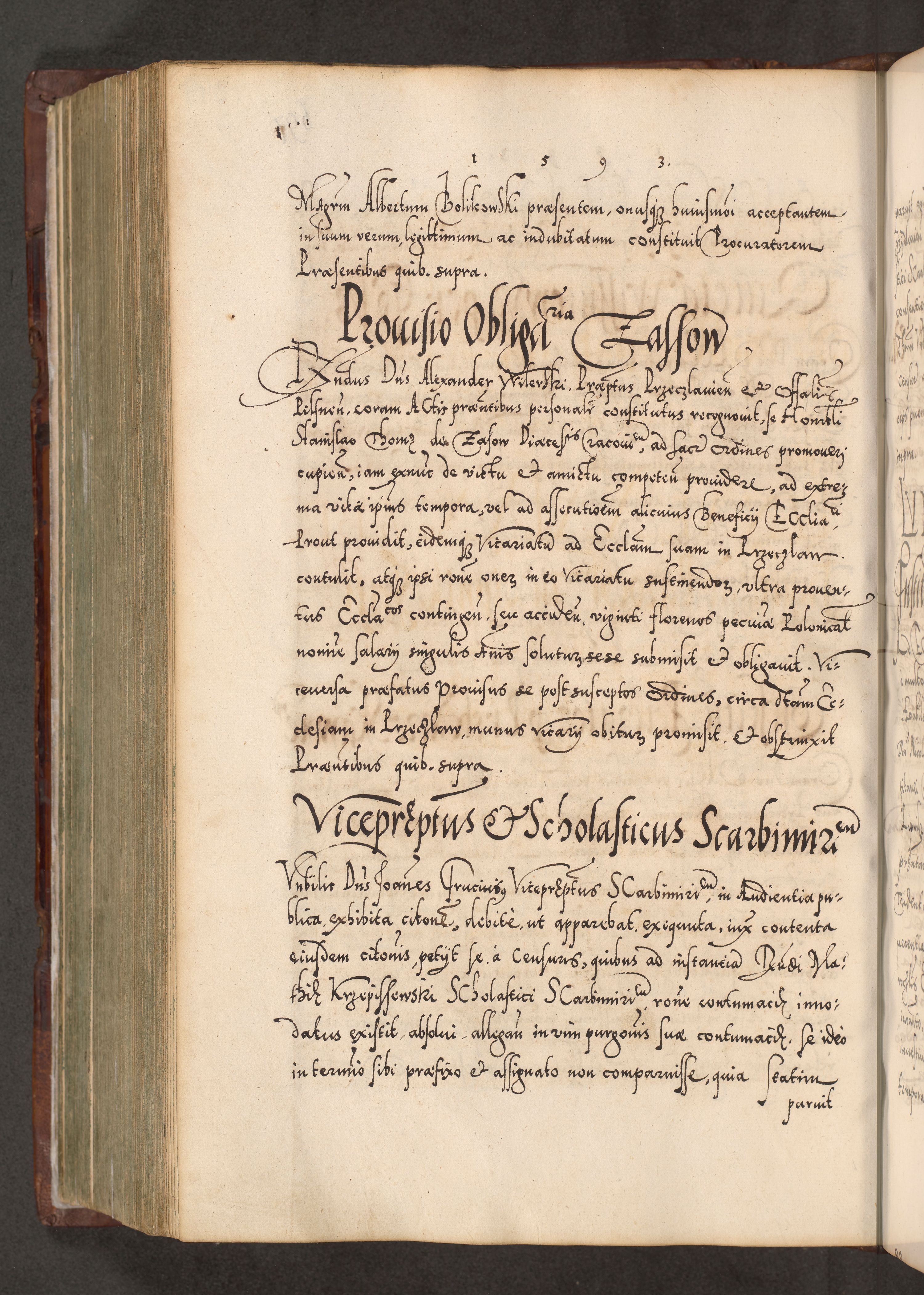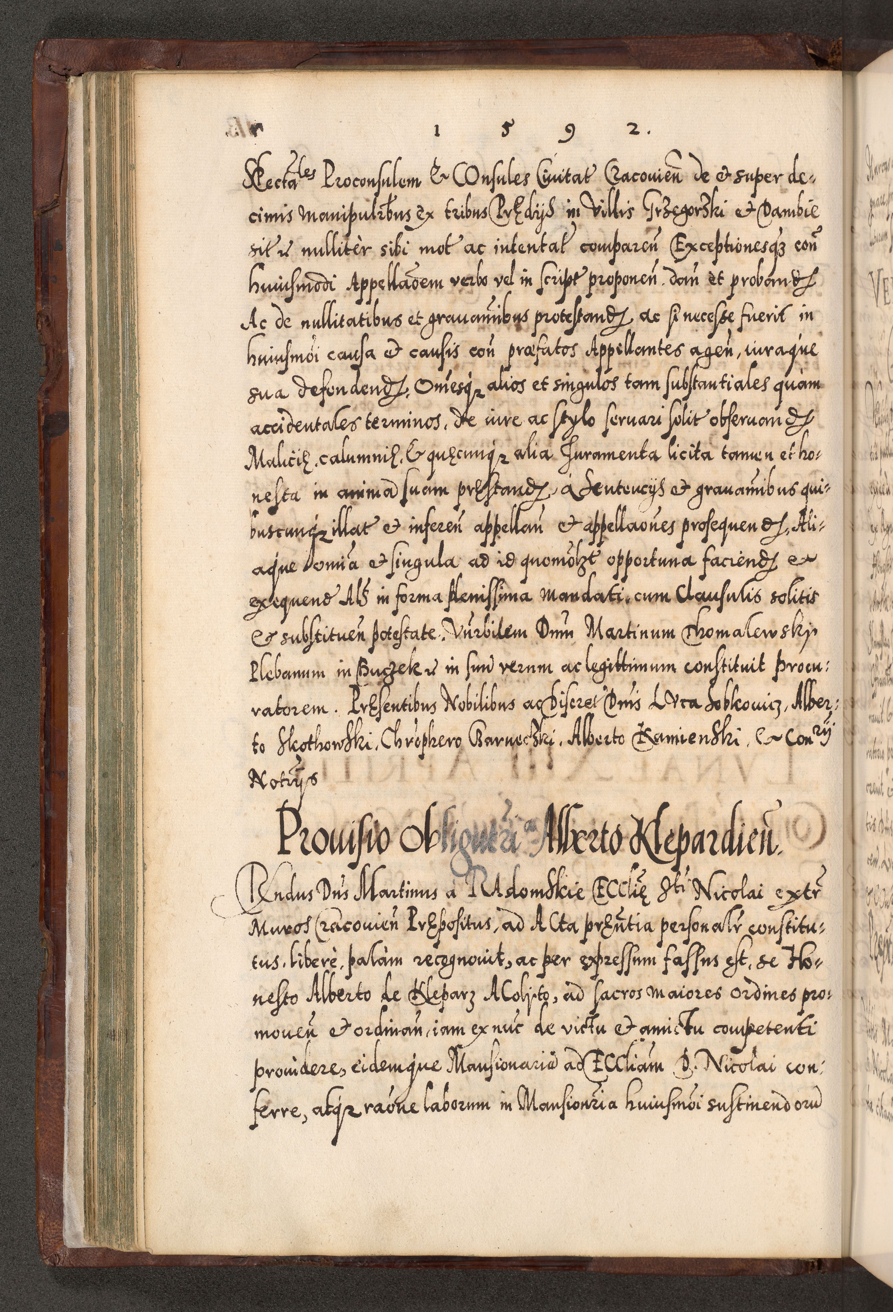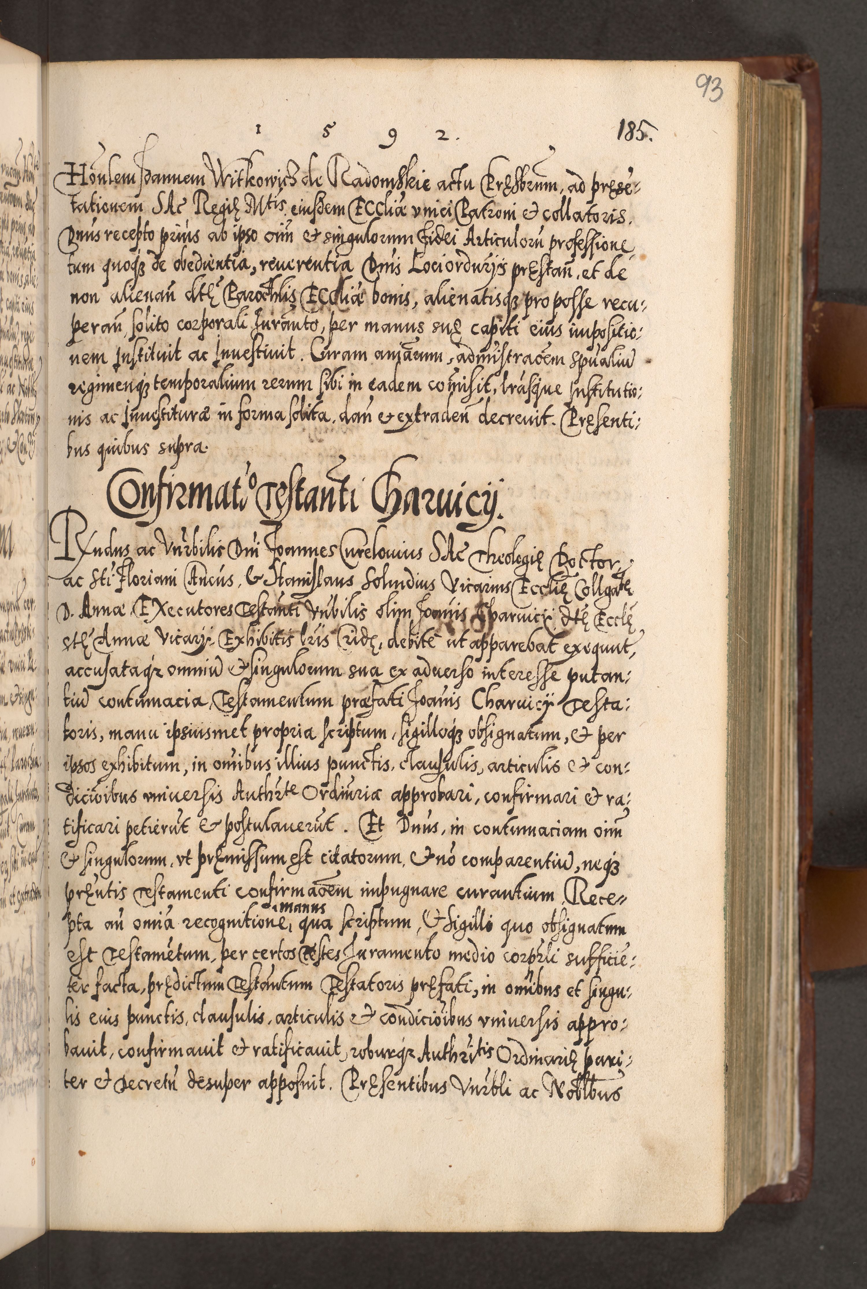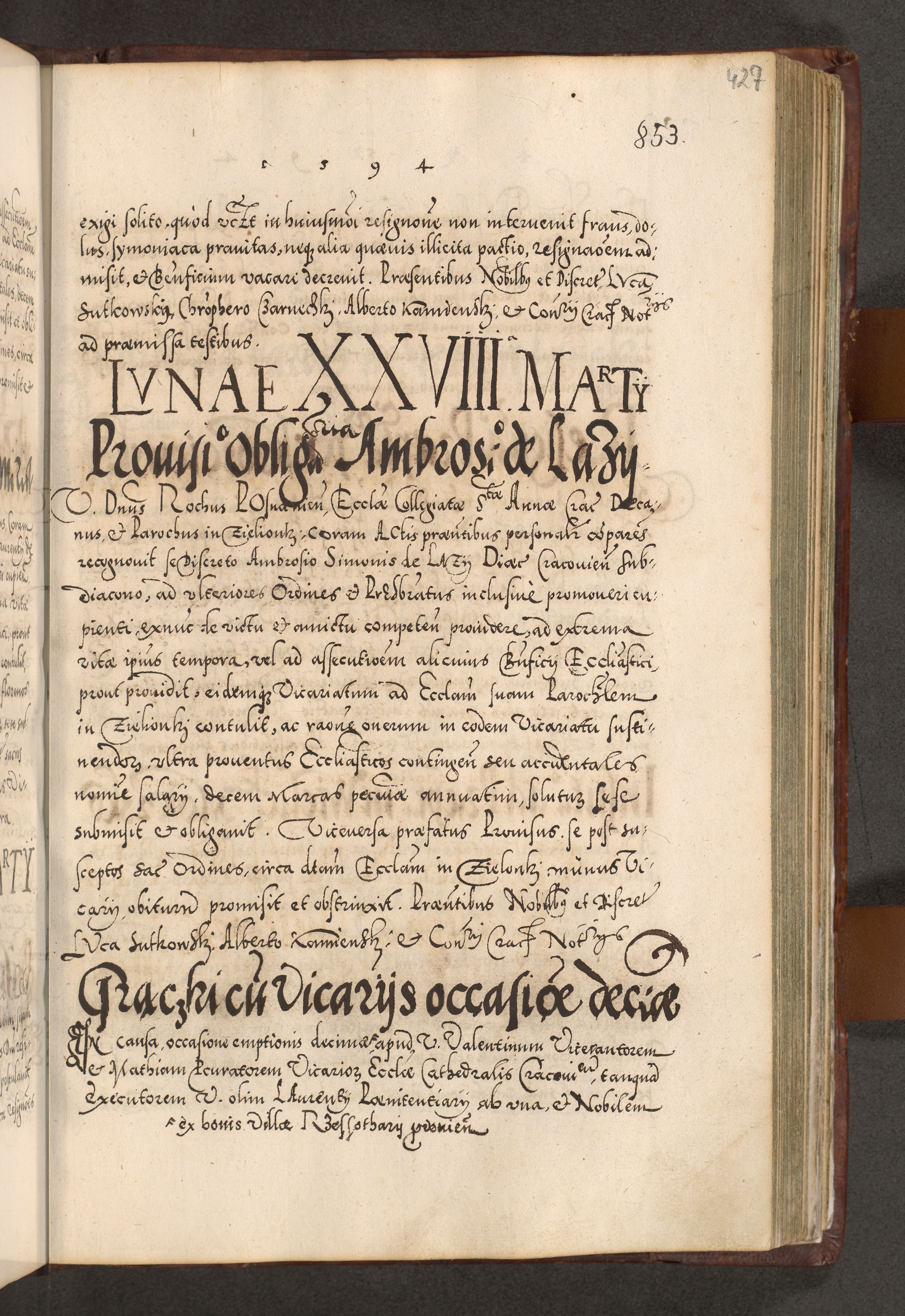 Illistrissimo et revedissimo in Christo Patre Domino Domino Georgio Rzadziwił Miserone Divina Sacrostae R. E. Tituli S. Sixti Presbitero Cardinali Duce in Olyka et Niesswiesz ad Gubernacula Ecclessiae Cracoviensis cuius administratorialem a Sancta Sede Apostolica obtinverat feliciter sedente. Acta actorum, causarum, sententiarum tam deffinitivarum quam interloquutoriarum decretorum, obligationum, quietationum, recognitionum, constitutionum procuratorum etc. coram Reverendo Domino Stanislao Crassinskz de Crasne Archidiacono Cracoviensis, Scholastico Gnesnesis, Custode Plocensis etc. Vicario et Officiali Generali Cracoviensi in Ano Domini Millesimo Quingentesimo Nonagesimo Primo cuius indictio quarta pontificatus SS. Domini Nostri Gregorii XIIII Anno I psius prio feliciter incipiut