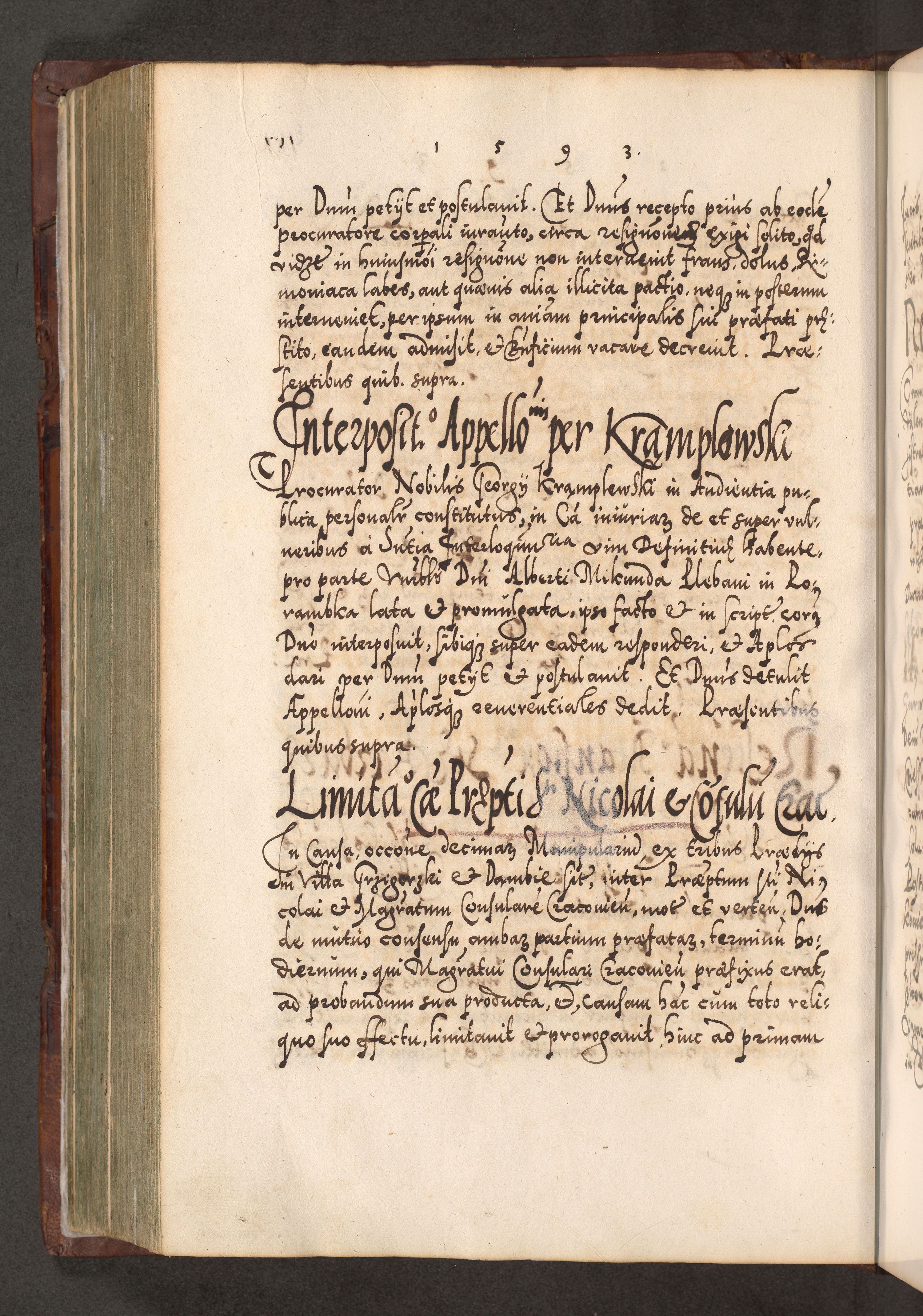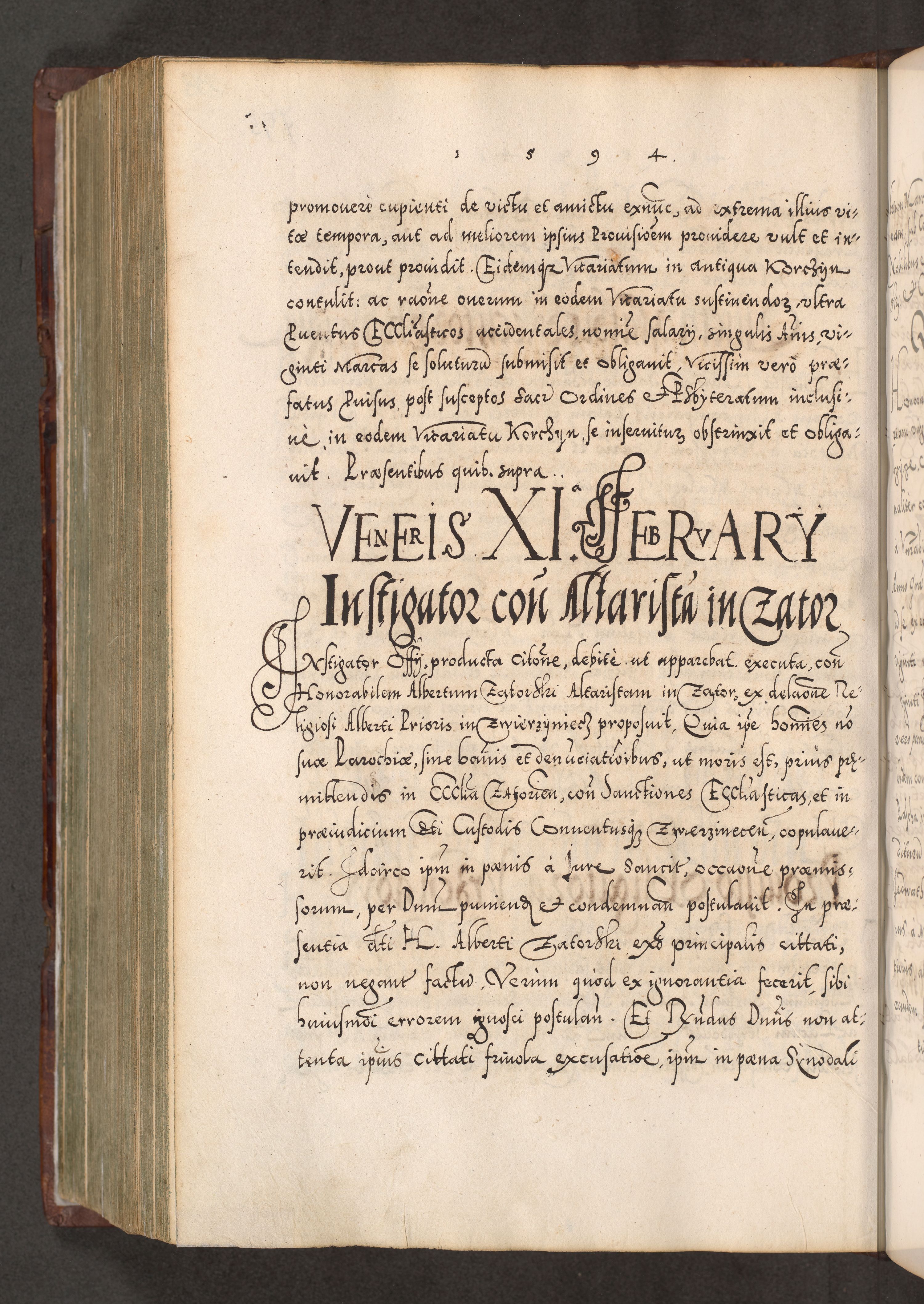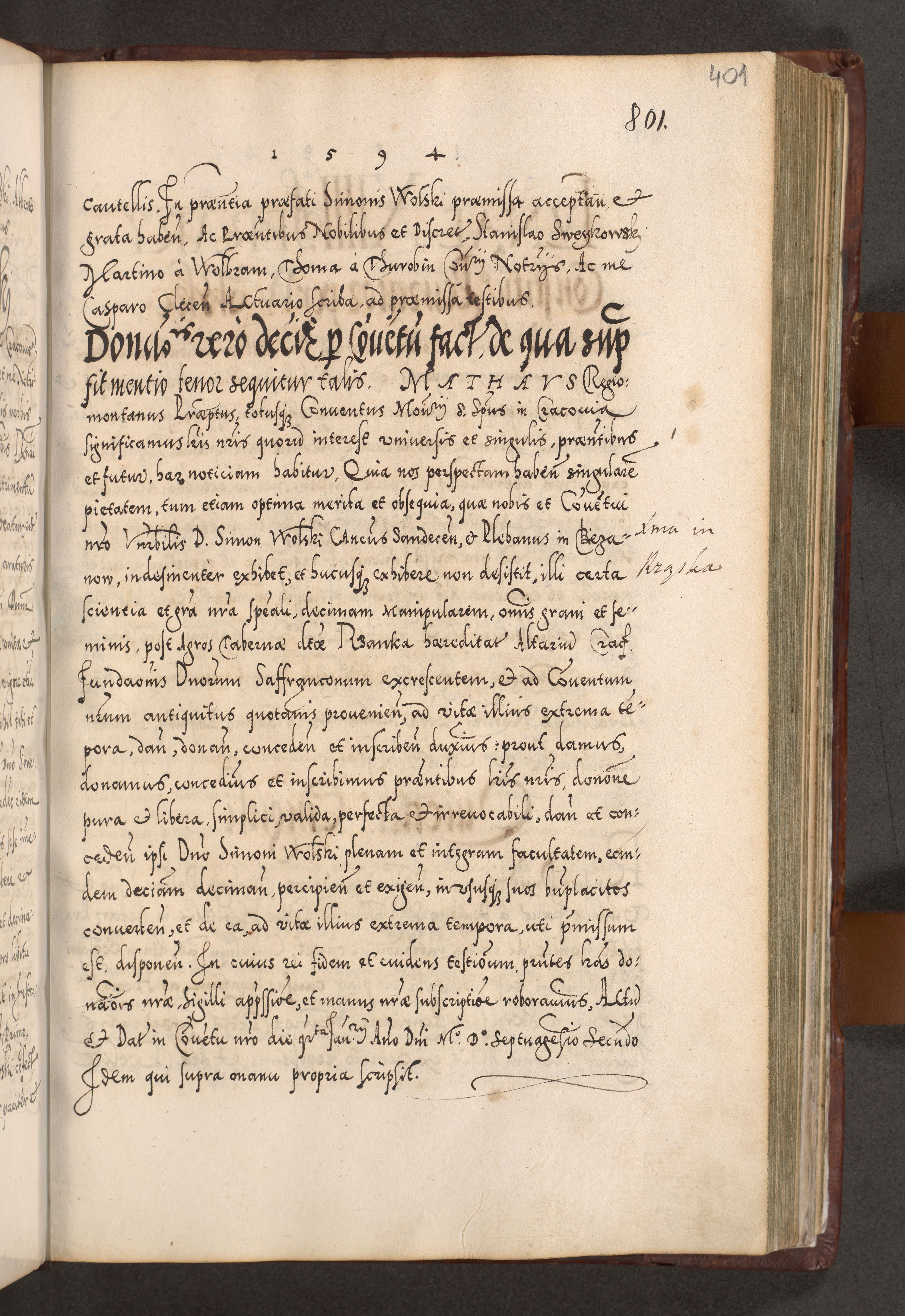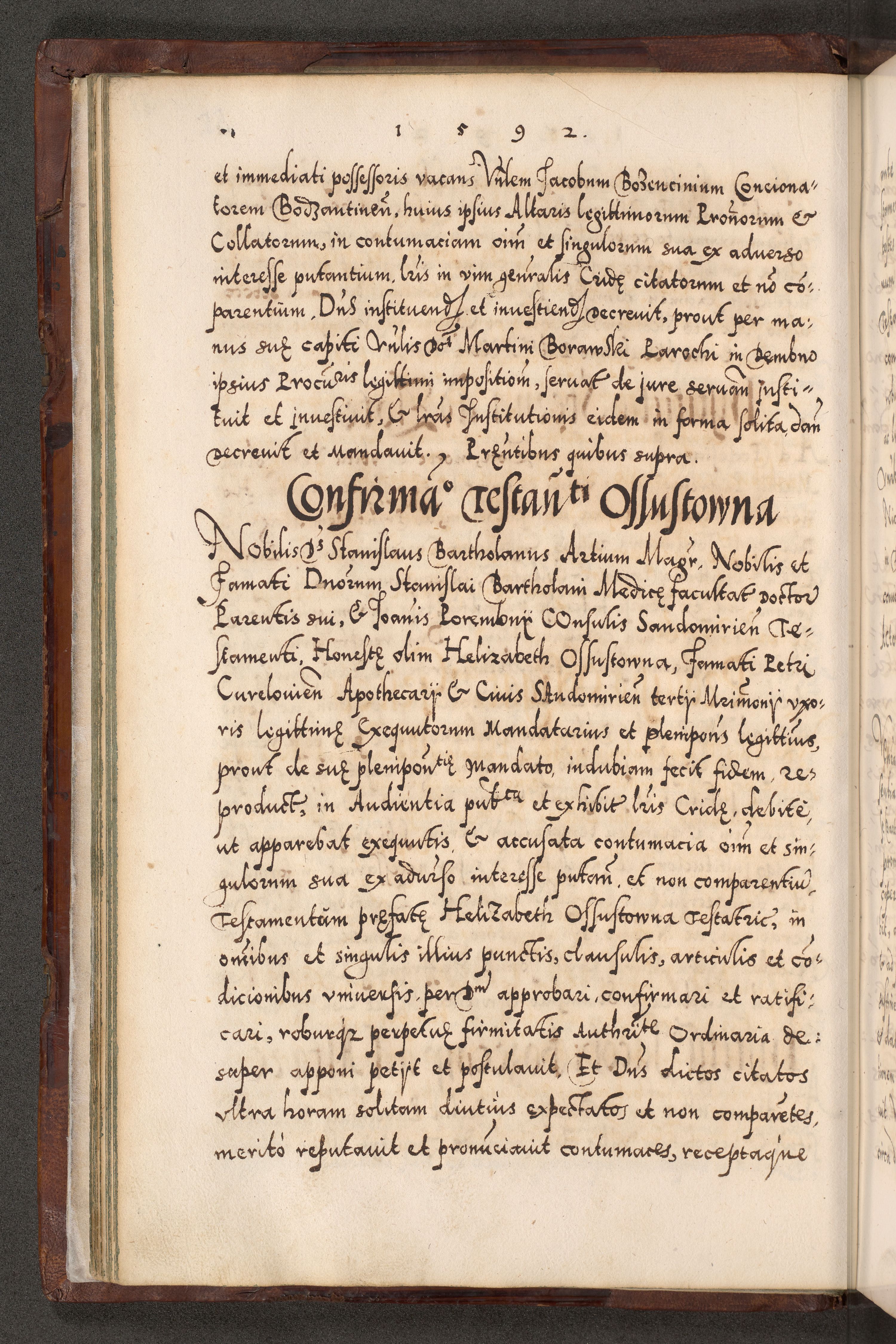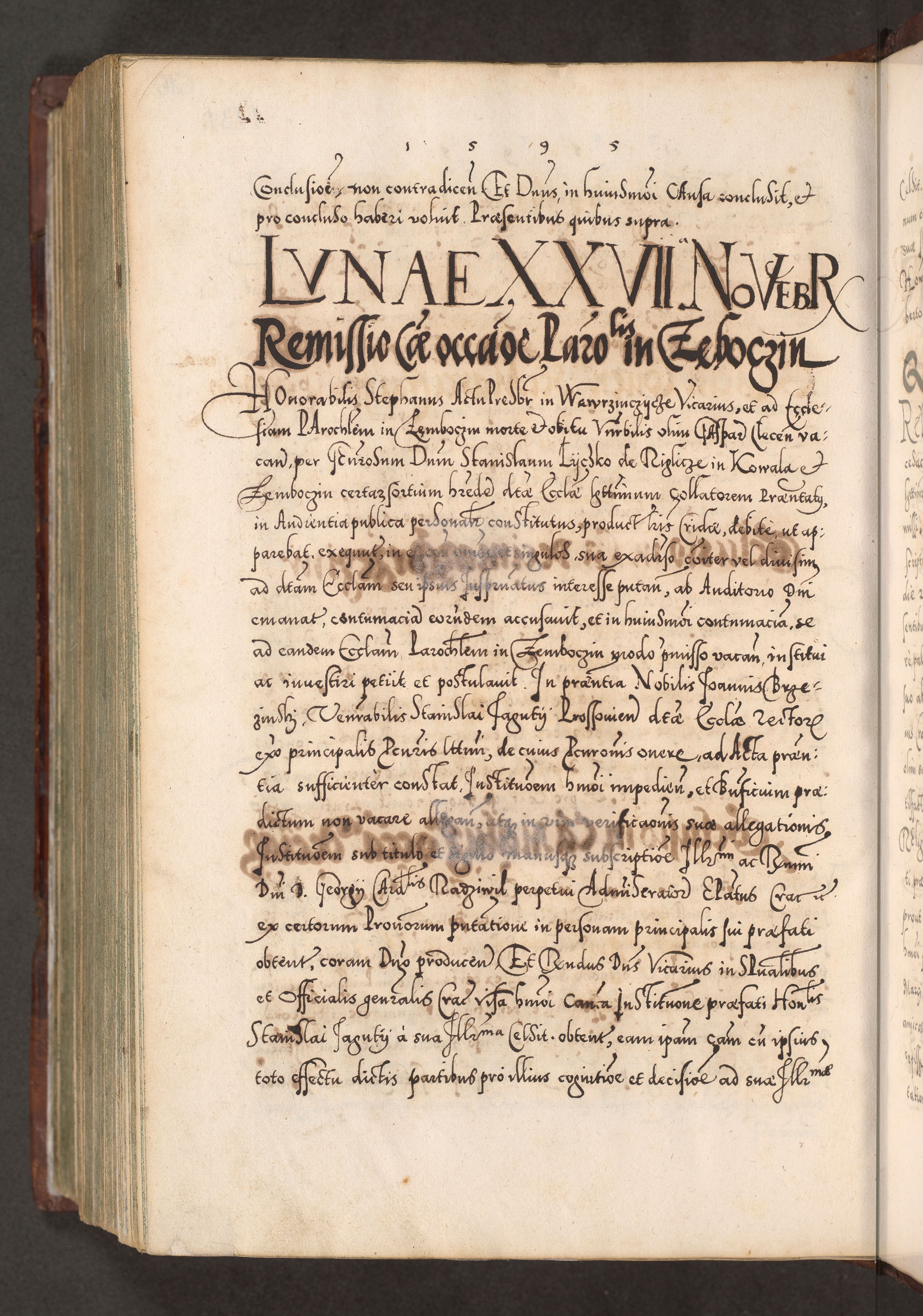 Illistrissimo et revedissimo in Christo Patre Domino Domino Georgio Rzadziwił Miserone Divina Sacrostae R. E. Tituli S. Sixti Presbitero Cardinali Duce in Olyka et Niesswiesz ad Gubernacula Ecclessiae Cracoviensis cuius administratorialem a Sancta Sede Apostolica obtinverat feliciter sedente. Acta actorum, causarum, sententiarum tam deffinitivarum quam interloquutoriarum decretorum, obligationum, quietationum, recognitionum, constitutionum procuratorum etc. coram Reverendo Domino Stanislao Crassinskz de Crasne Archidiacono Cracoviensis, Scholastico Gnesnesis, Custode Plocensis etc. Vicario et Officiali Generali Cracoviensi in Ano Domini Millesimo Quingentesimo Nonagesimo Primo cuius indictio quarta pontificatus SS. Domini Nostri Gregorii XIIII Anno I psius prio feliciter incipiut