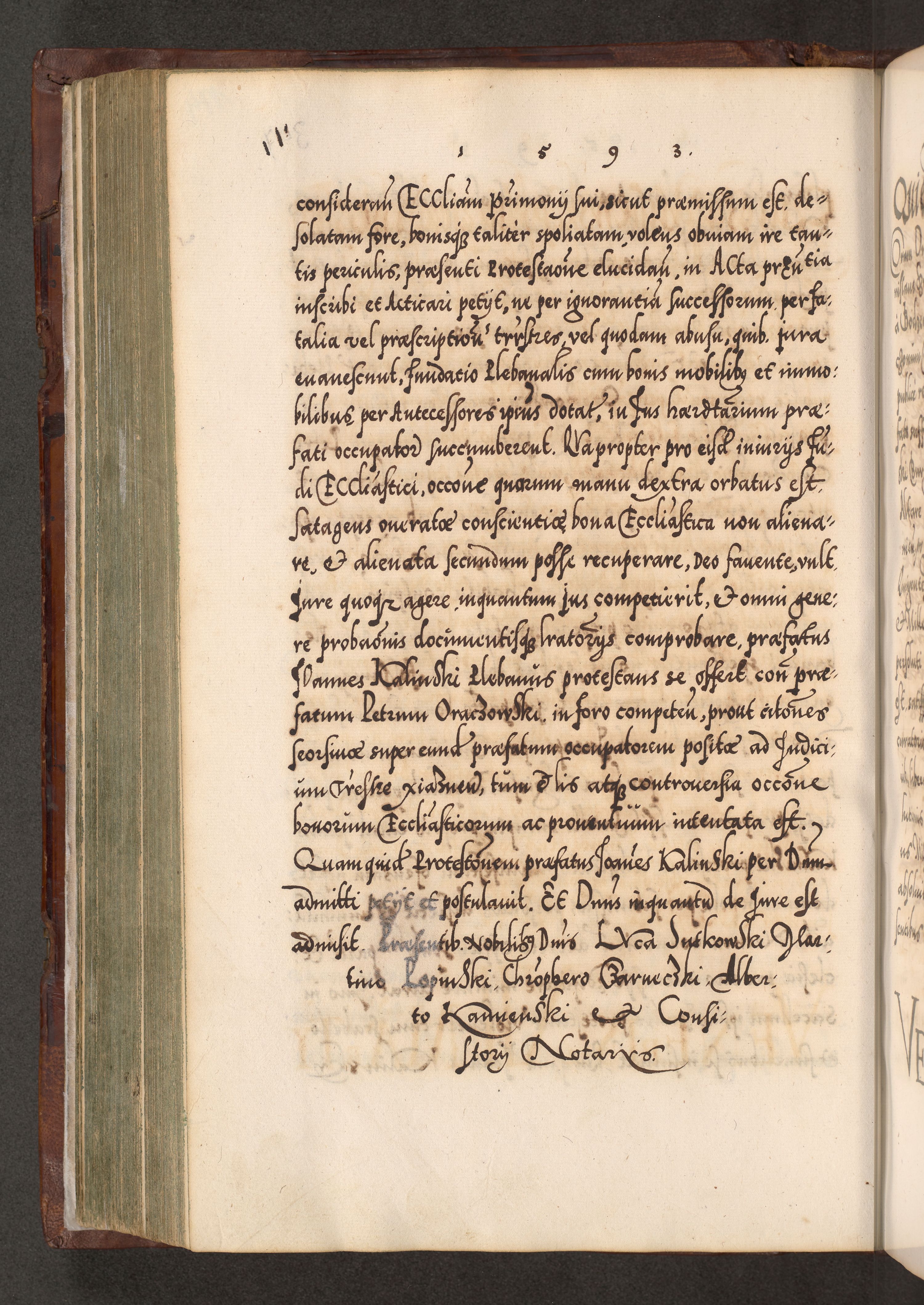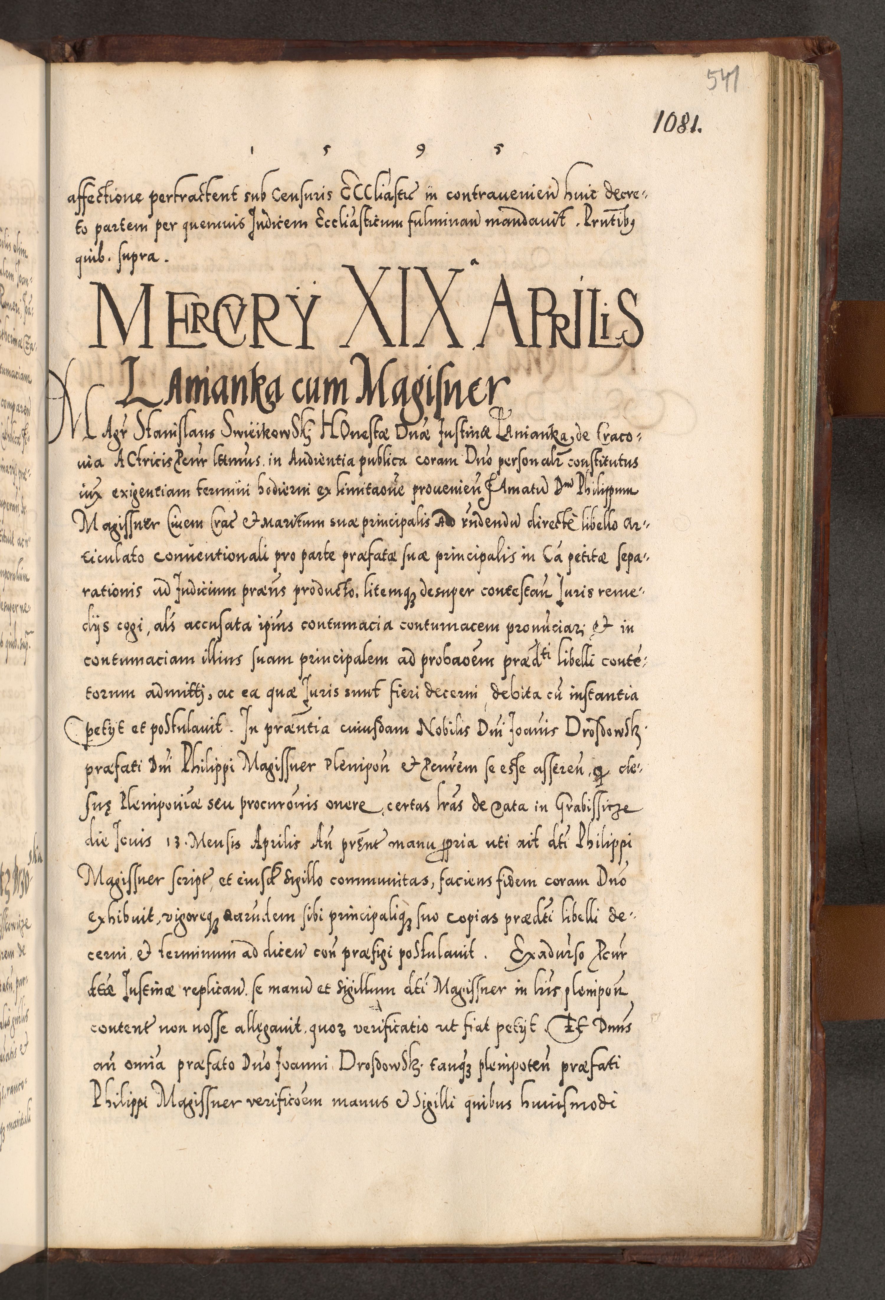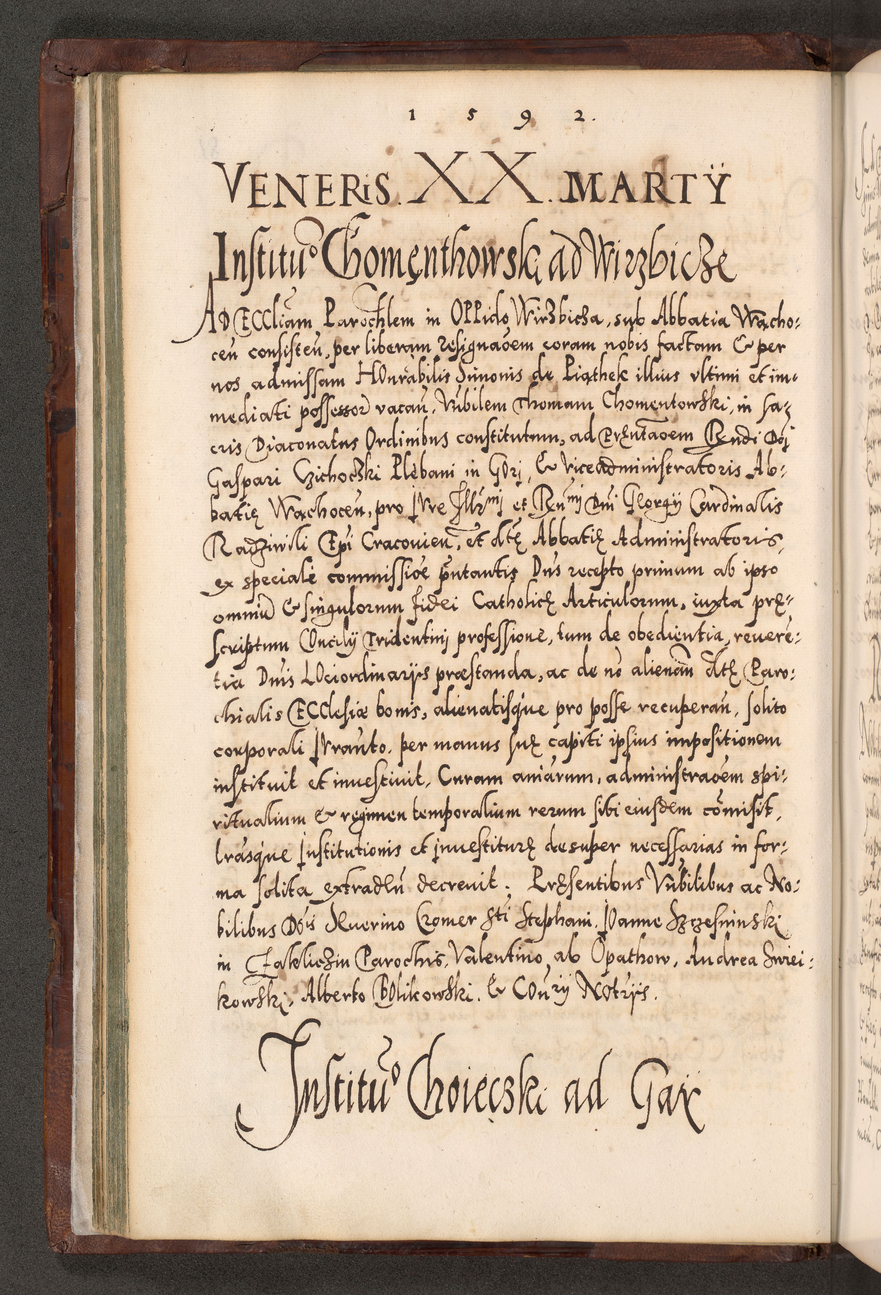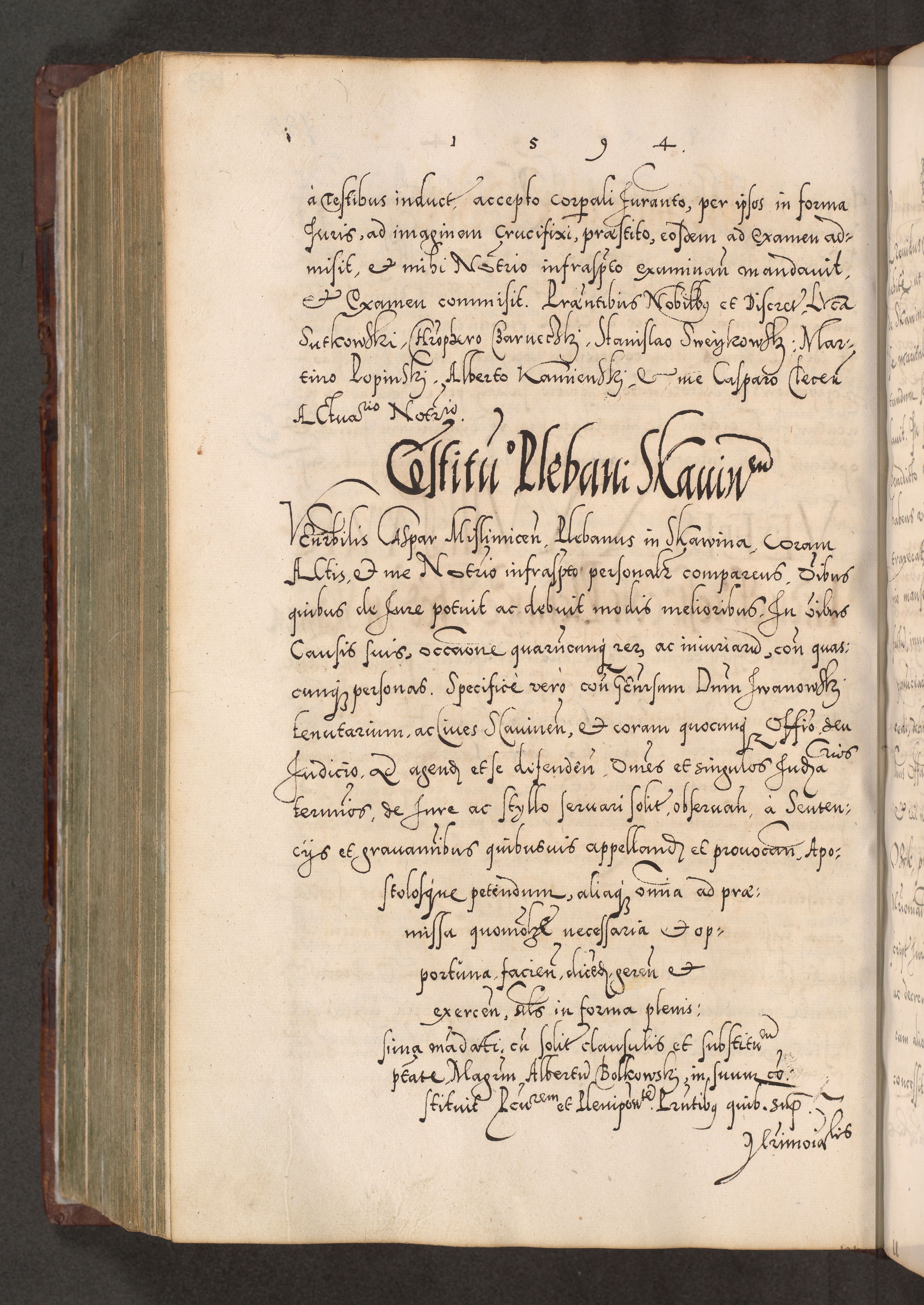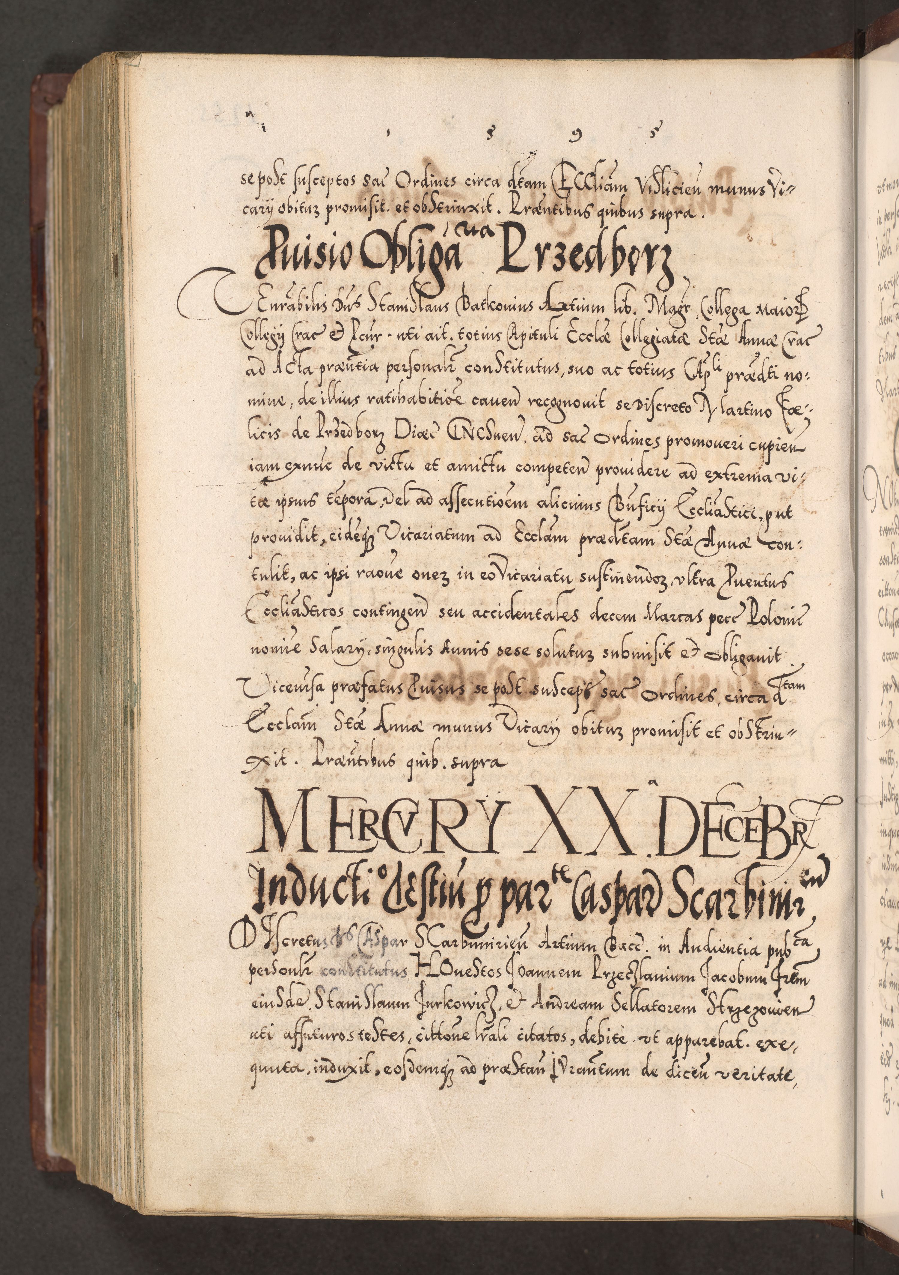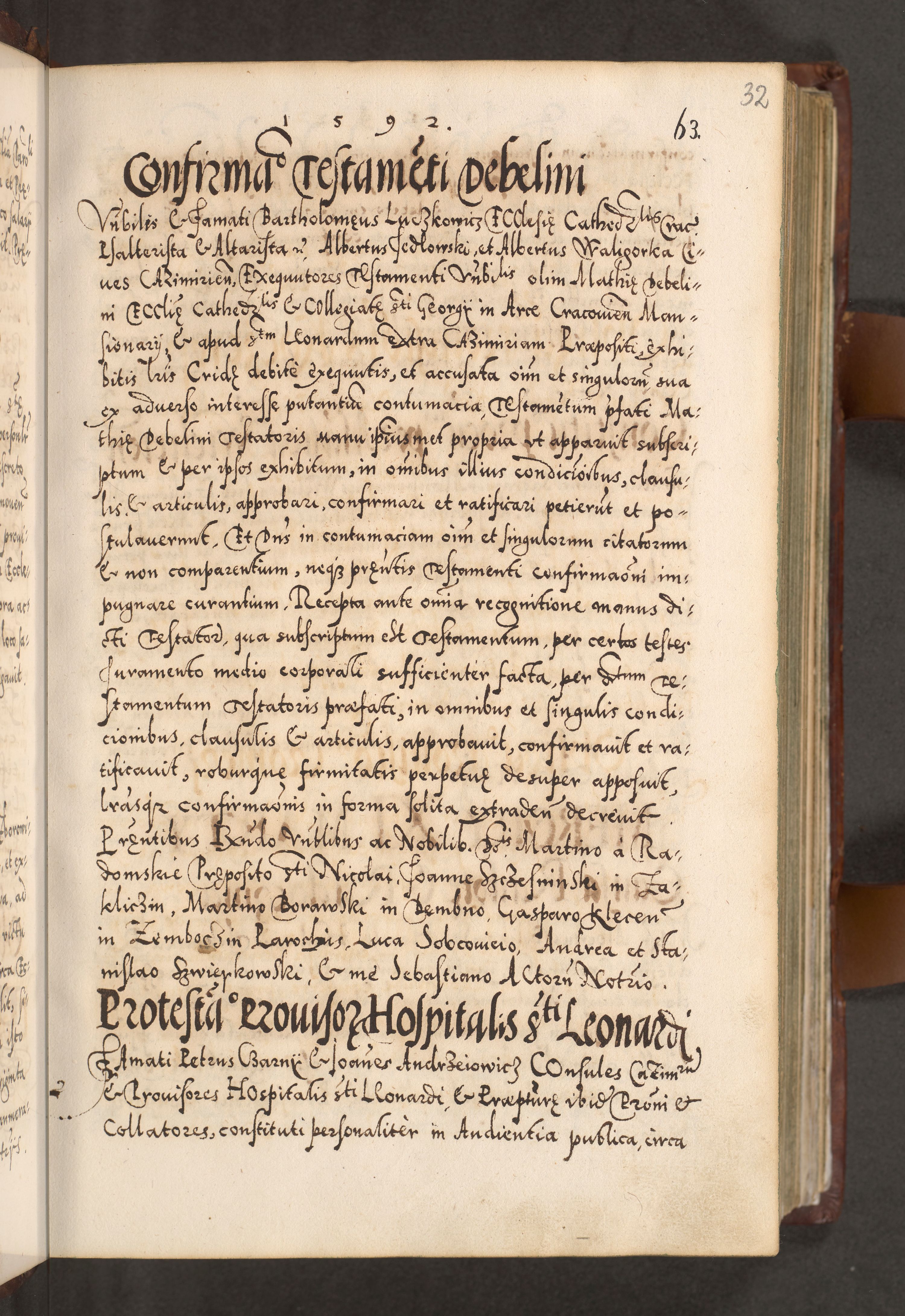 Illistrissimo et revedissimo in Christo Patre Domino Domino Georgio Rzadziwił Miserone Divina Sacrostae R. E. Tituli S. Sixti Presbitero Cardinali Duce in Olyka et Niesswiesz ad Gubernacula Ecclessiae Cracoviensis cuius administratorialem a Sancta Sede Apostolica obtinverat feliciter sedente. Acta actorum, causarum, sententiarum tam deffinitivarum quam interloquutoriarum decretorum, obligationum, quietationum, recognitionum, constitutionum procuratorum etc. coram Reverendo Domino Stanislao Crassinskz de Crasne Archidiacono Cracoviensis, Scholastico Gnesnesis, Custode Plocensis etc. Vicario et Officiali Generali Cracoviensi in Ano Domini Millesimo Quingentesimo Nonagesimo Primo cuius indictio quarta pontificatus SS. Domini Nostri Gregorii XIIII Anno I psius prio feliciter incipiut
