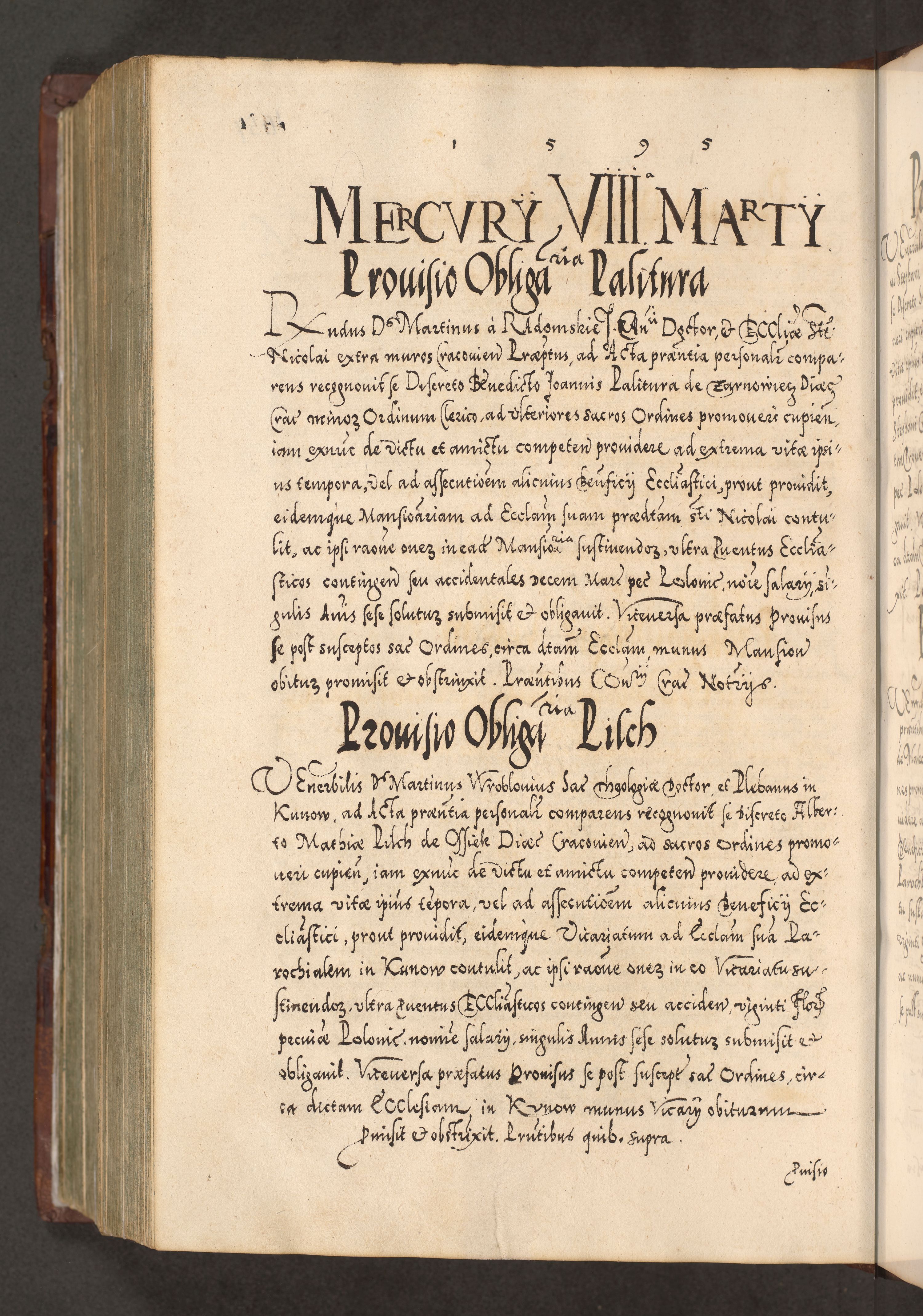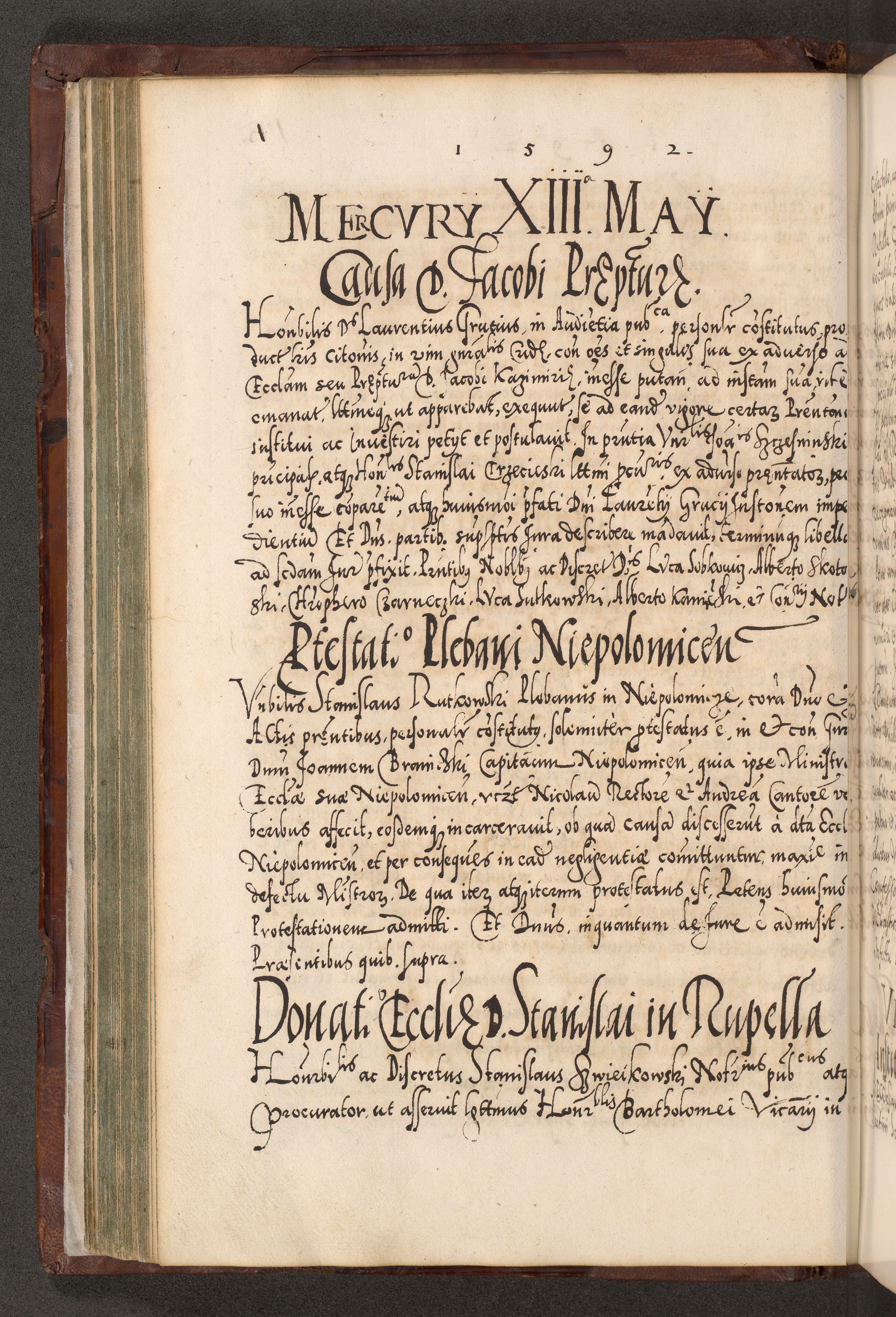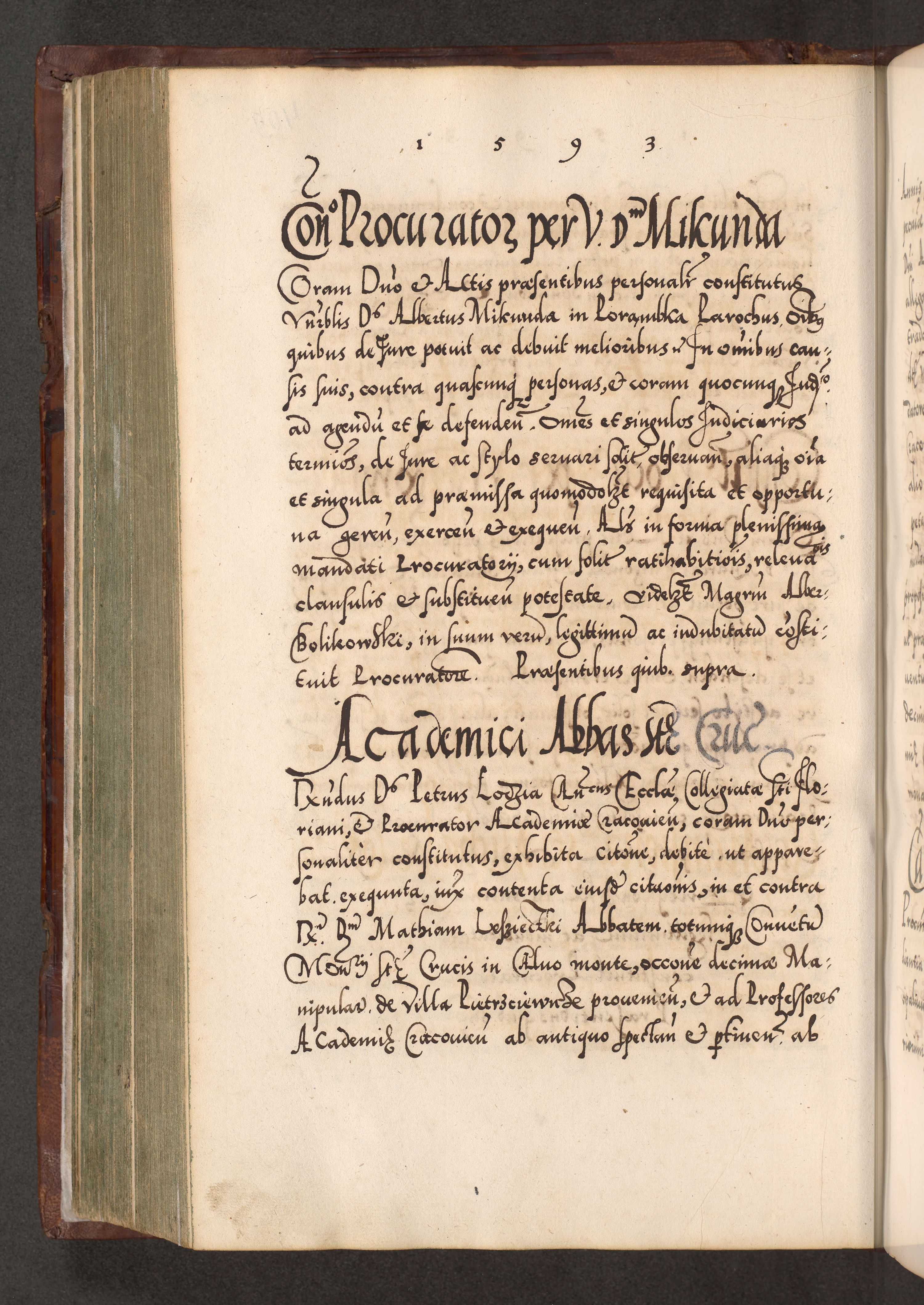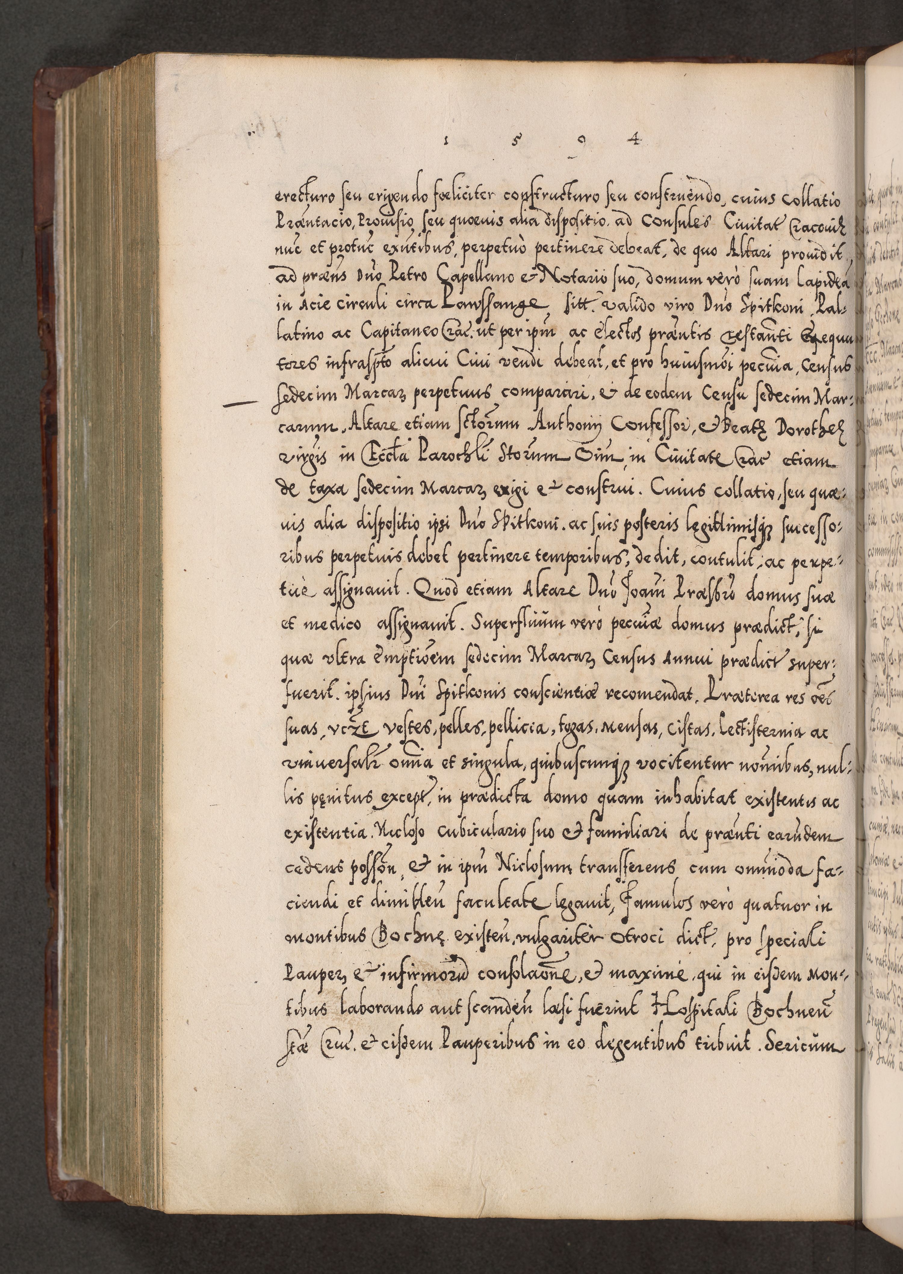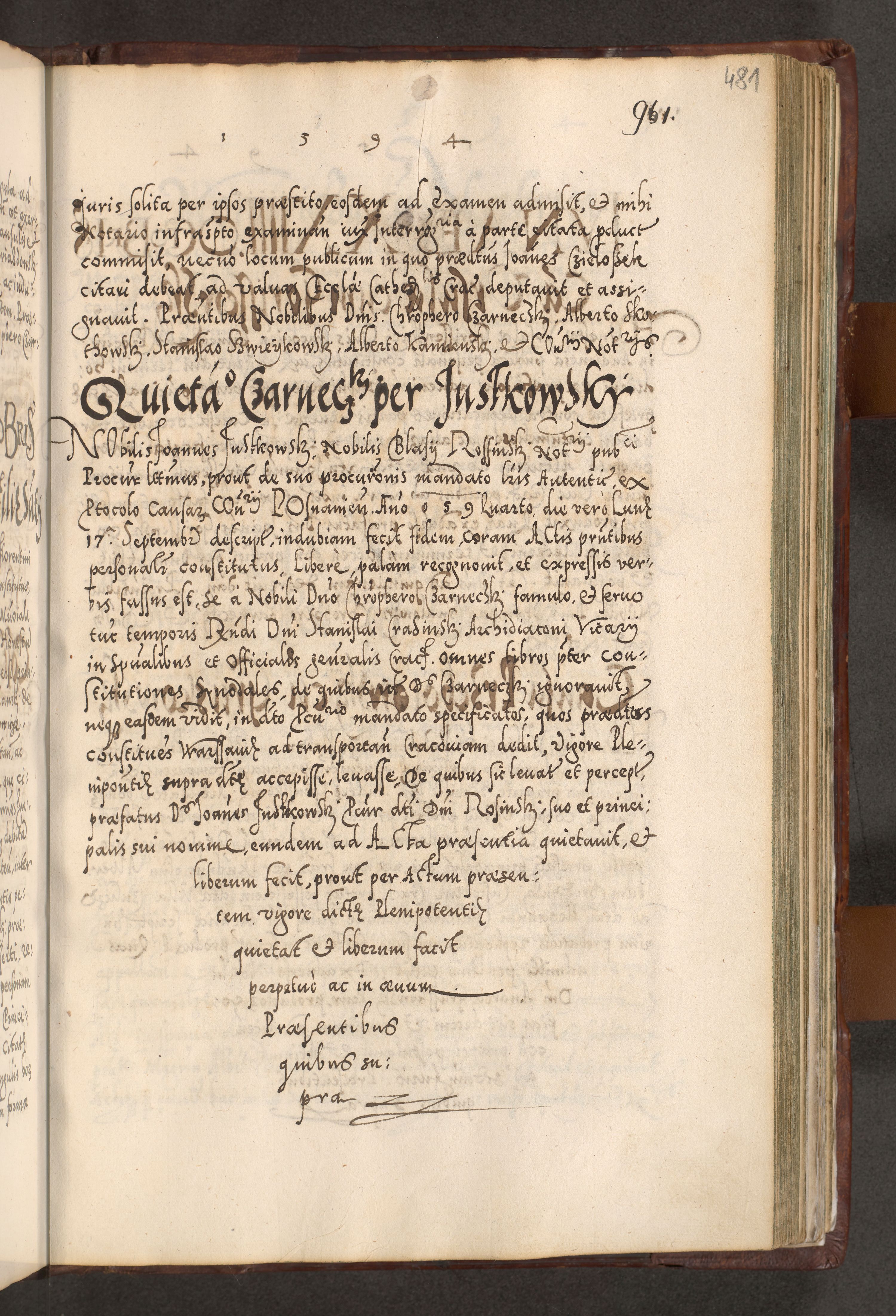 Illistrissimo et revedissimo in Christo Patre Domino Domino Georgio Rzadziwił Miserone Divina Sacrostae R. E. Tituli S. Sixti Presbitero Cardinali Duce in Olyka et Niesswiesz ad Gubernacula Ecclessiae Cracoviensis cuius administratorialem a Sancta Sede Apostolica obtinverat feliciter sedente. Acta actorum, causarum, sententiarum tam deffinitivarum quam interloquutoriarum decretorum, obligationum, quietationum, recognitionum, constitutionum procuratorum etc. coram Reverendo Domino Stanislao Crassinskz de Crasne Archidiacono Cracoviensis, Scholastico Gnesnesis, Custode Plocensis etc. Vicario et Officiali Generali Cracoviensi in Ano Domini Millesimo Quingentesimo Nonagesimo Primo cuius indictio quarta pontificatus SS. Domini Nostri Gregorii XIIII Anno I psius prio feliciter incipiut