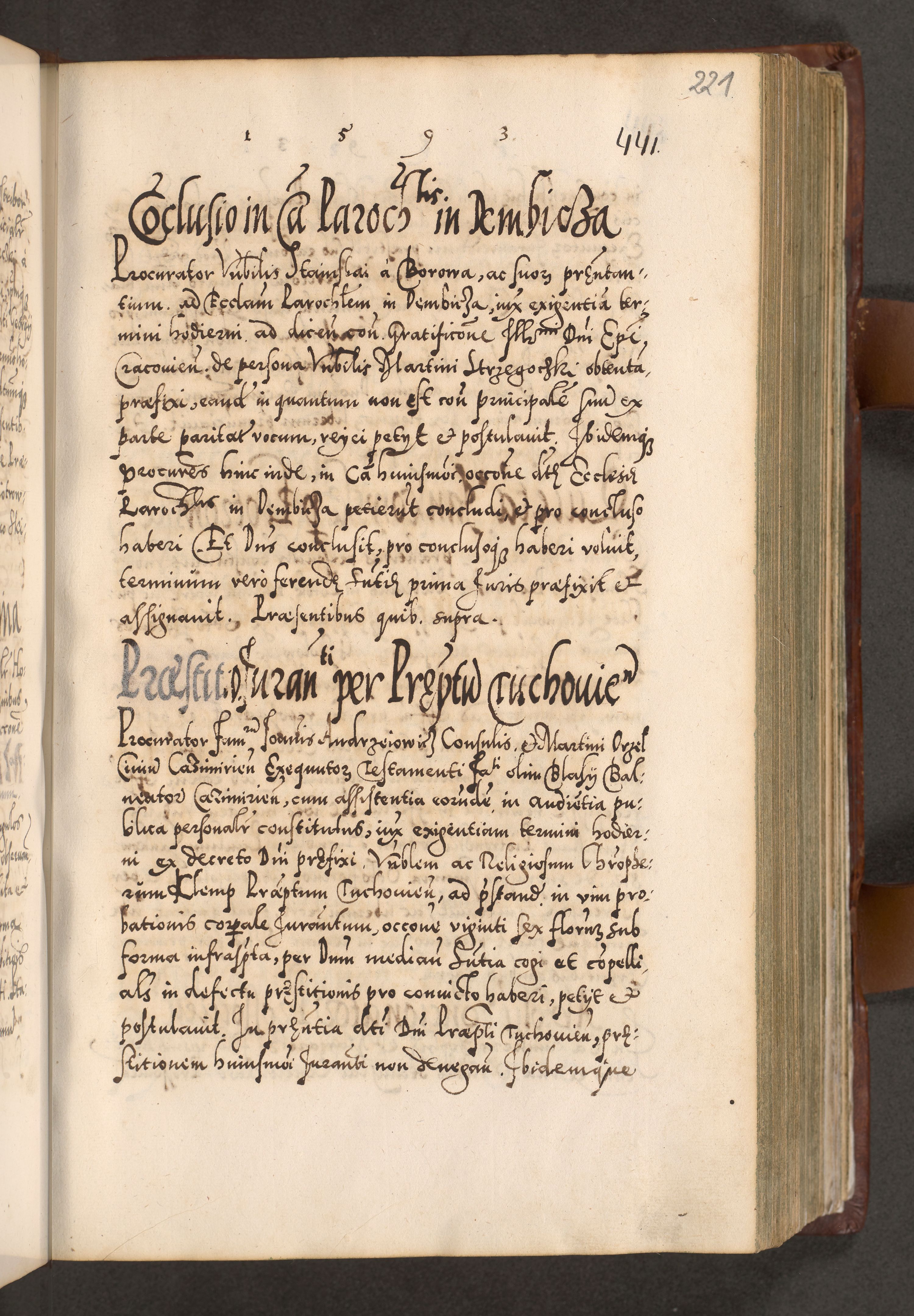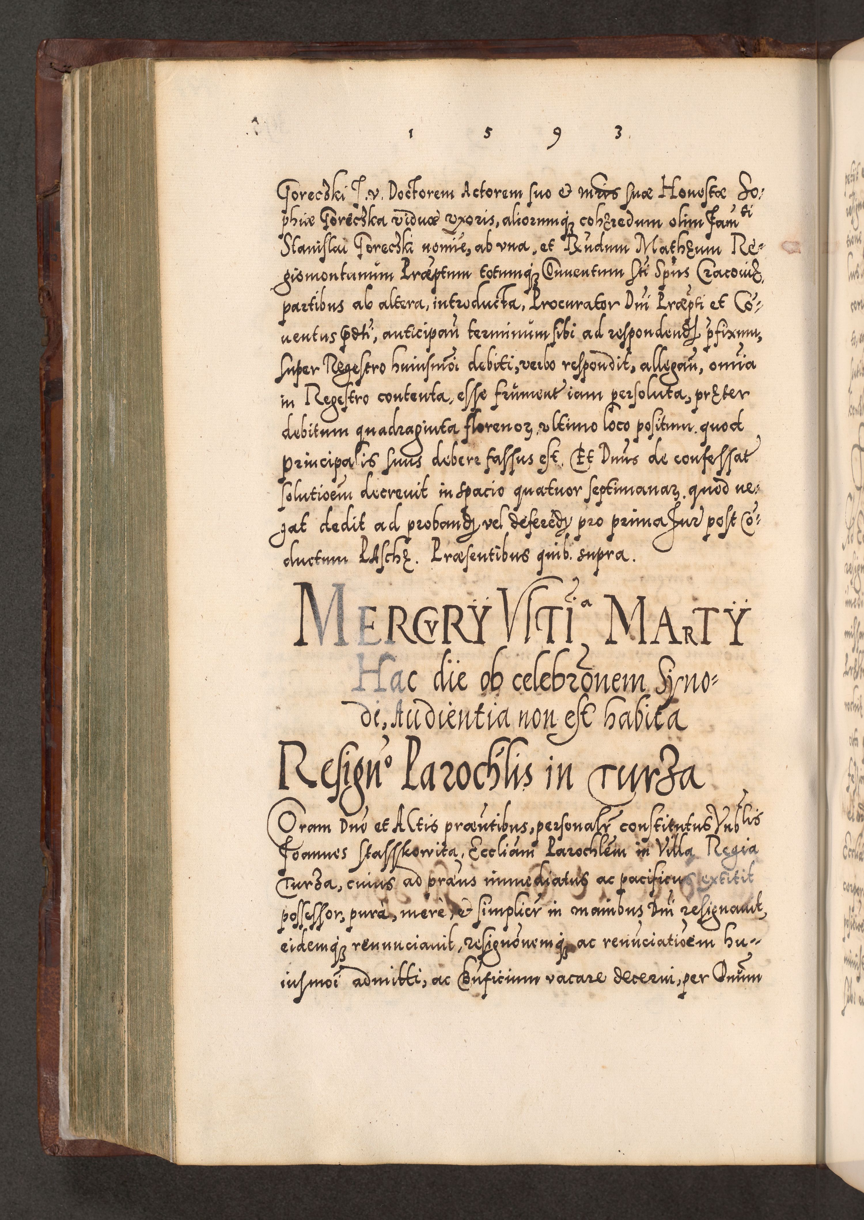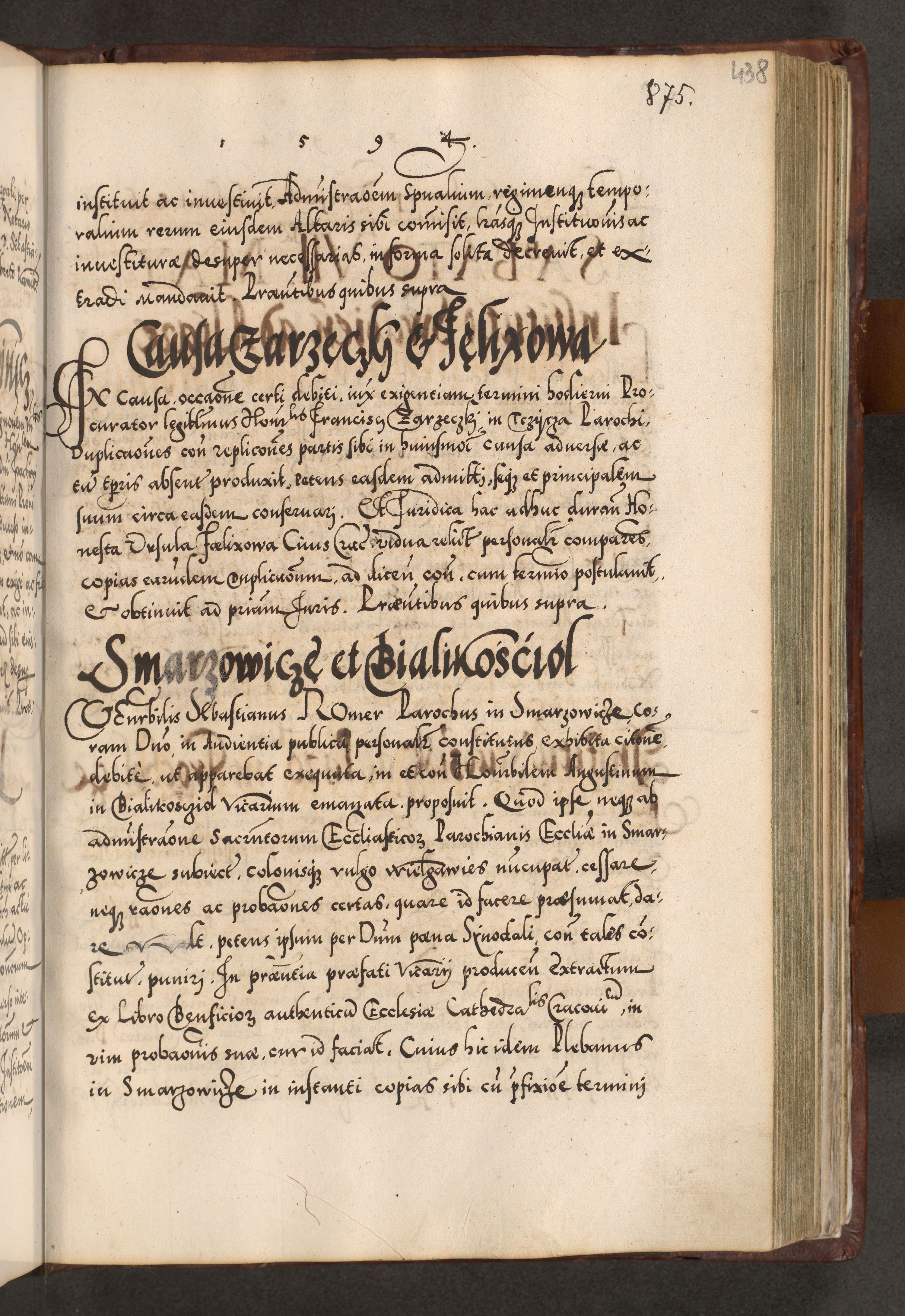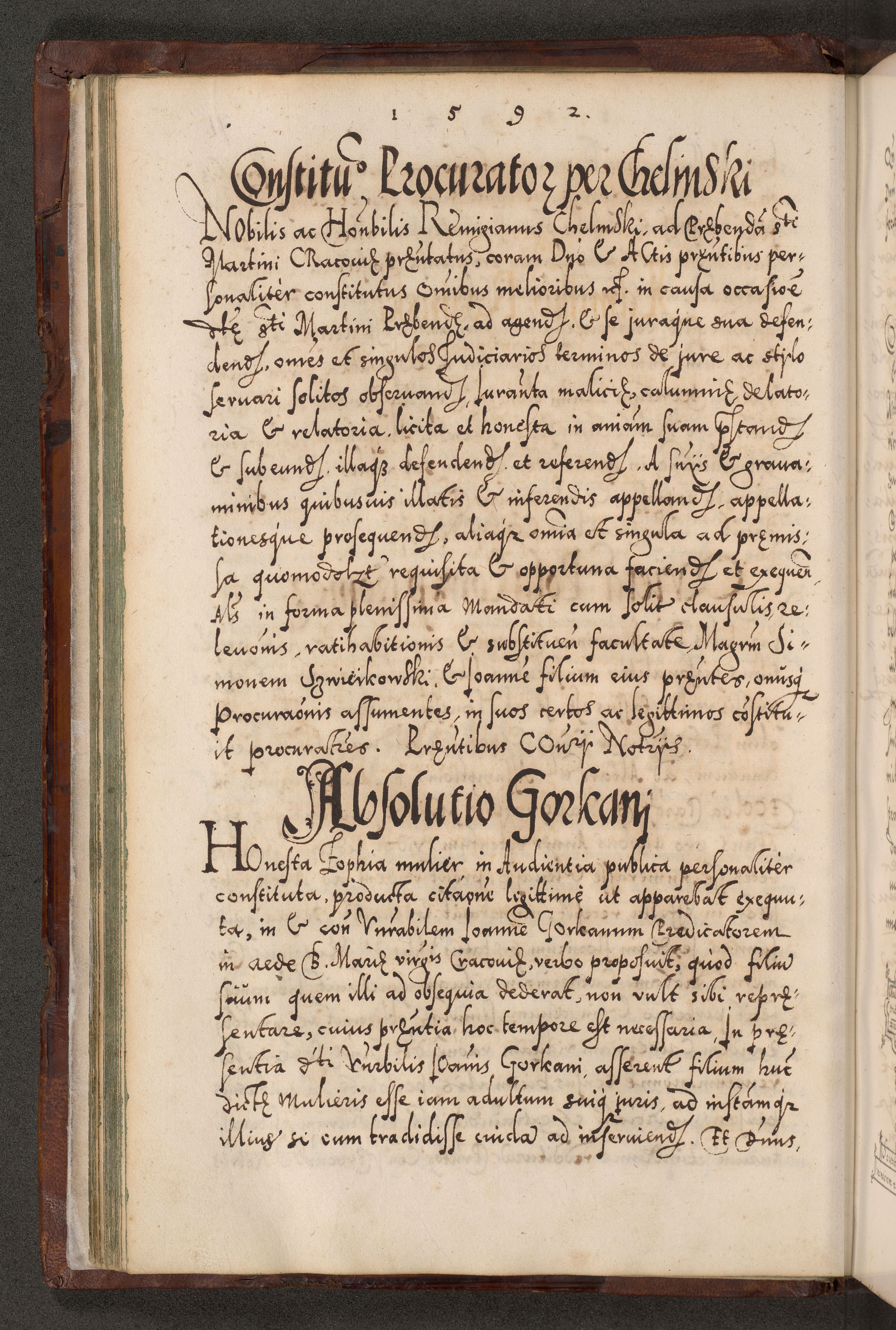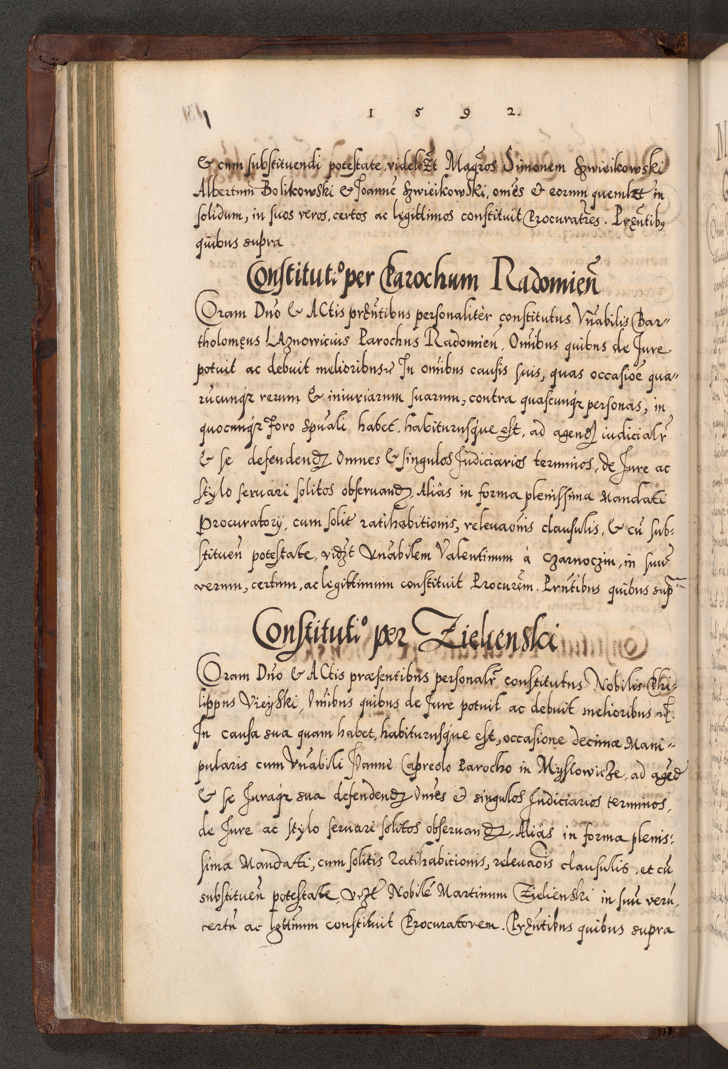 Illistrissimo et revedissimo in Christo Patre Domino Domino Georgio Rzadziwił Miserone Divina Sacrostae R. E. Tituli S. Sixti Presbitero Cardinali Duce in Olyka et Niesswiesz ad Gubernacula Ecclessiae Cracoviensis cuius administratorialem a Sancta Sede Apostolica obtinverat feliciter sedente. Acta actorum, causarum, sententiarum tam deffinitivarum quam interloquutoriarum decretorum, obligationum, quietationum, recognitionum, constitutionum procuratorum etc. coram Reverendo Domino Stanislao Crassinskz de Crasne Archidiacono Cracoviensis, Scholastico Gnesnesis, Custode Plocensis etc. Vicario et Officiali Generali Cracoviensi in Ano Domini Millesimo Quingentesimo Nonagesimo Primo cuius indictio quarta pontificatus SS. Domini Nostri Gregorii XIIII Anno I psius prio feliciter incipiut