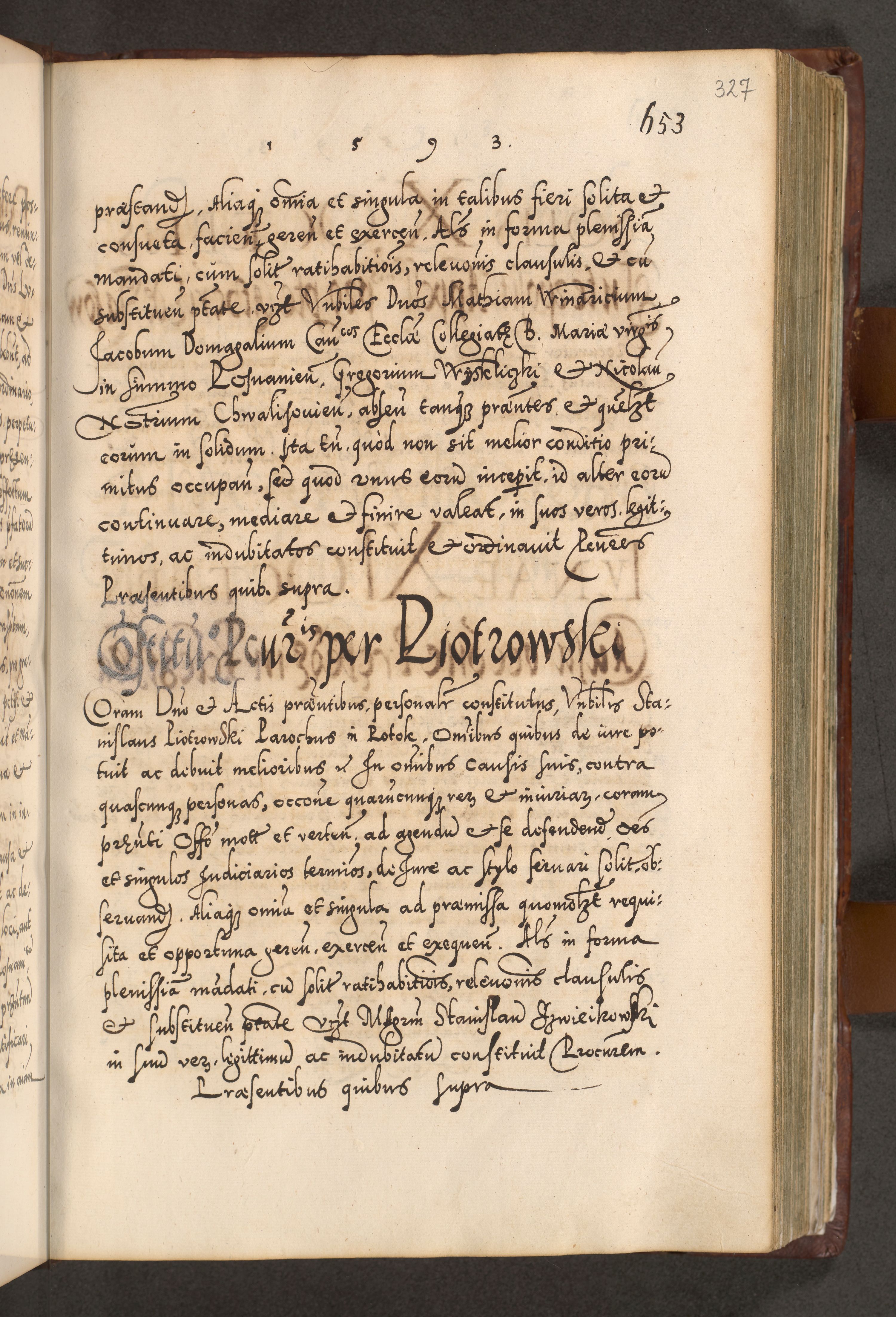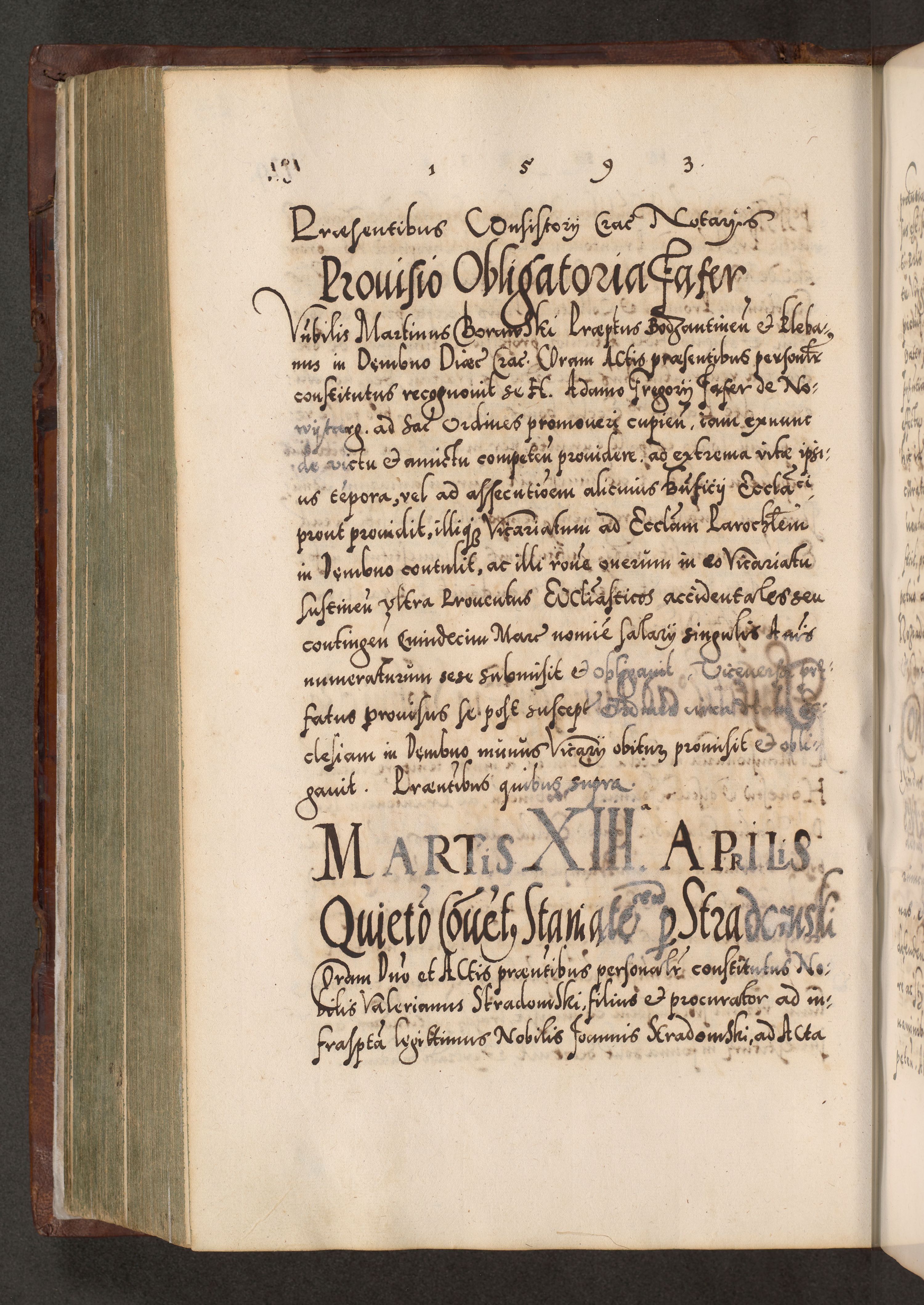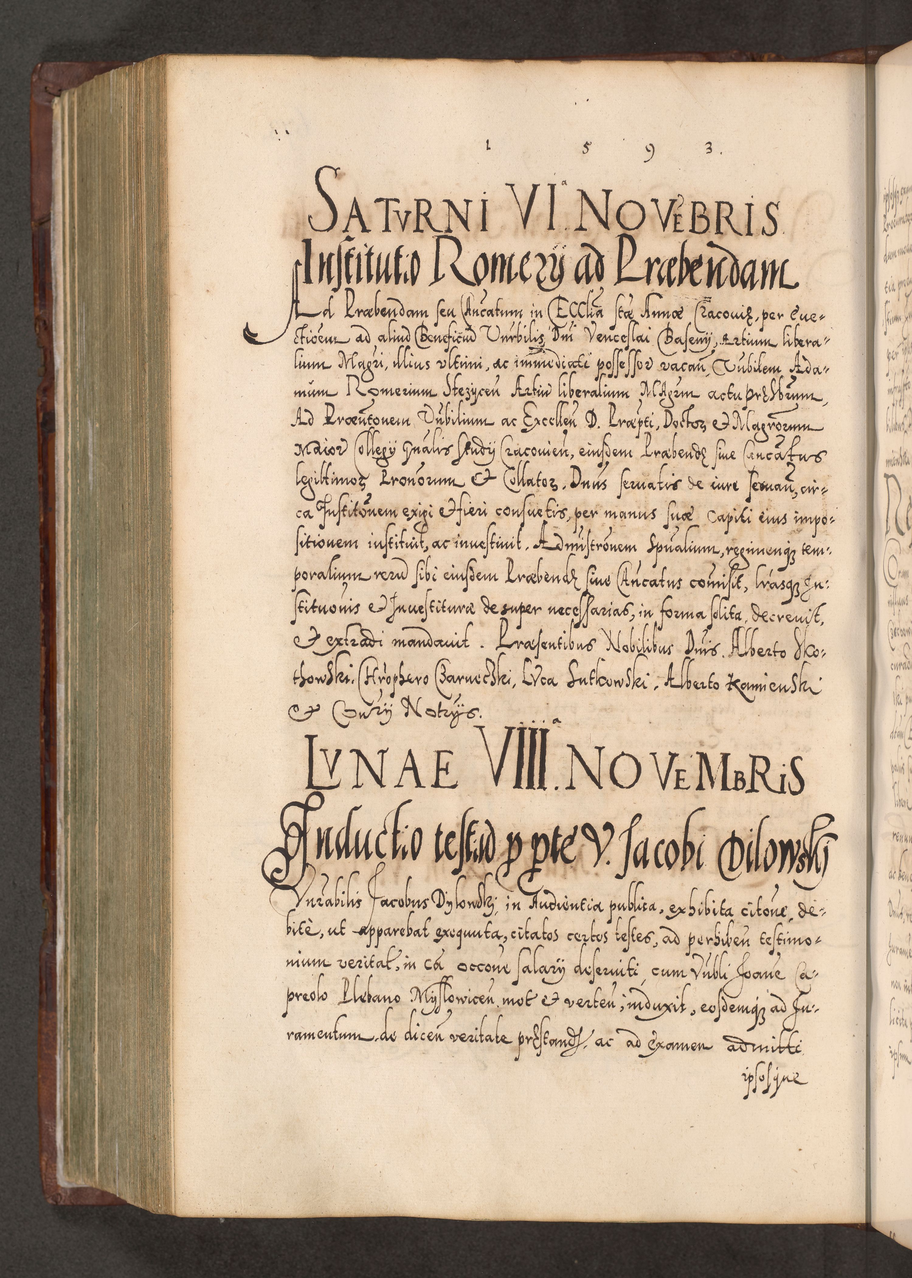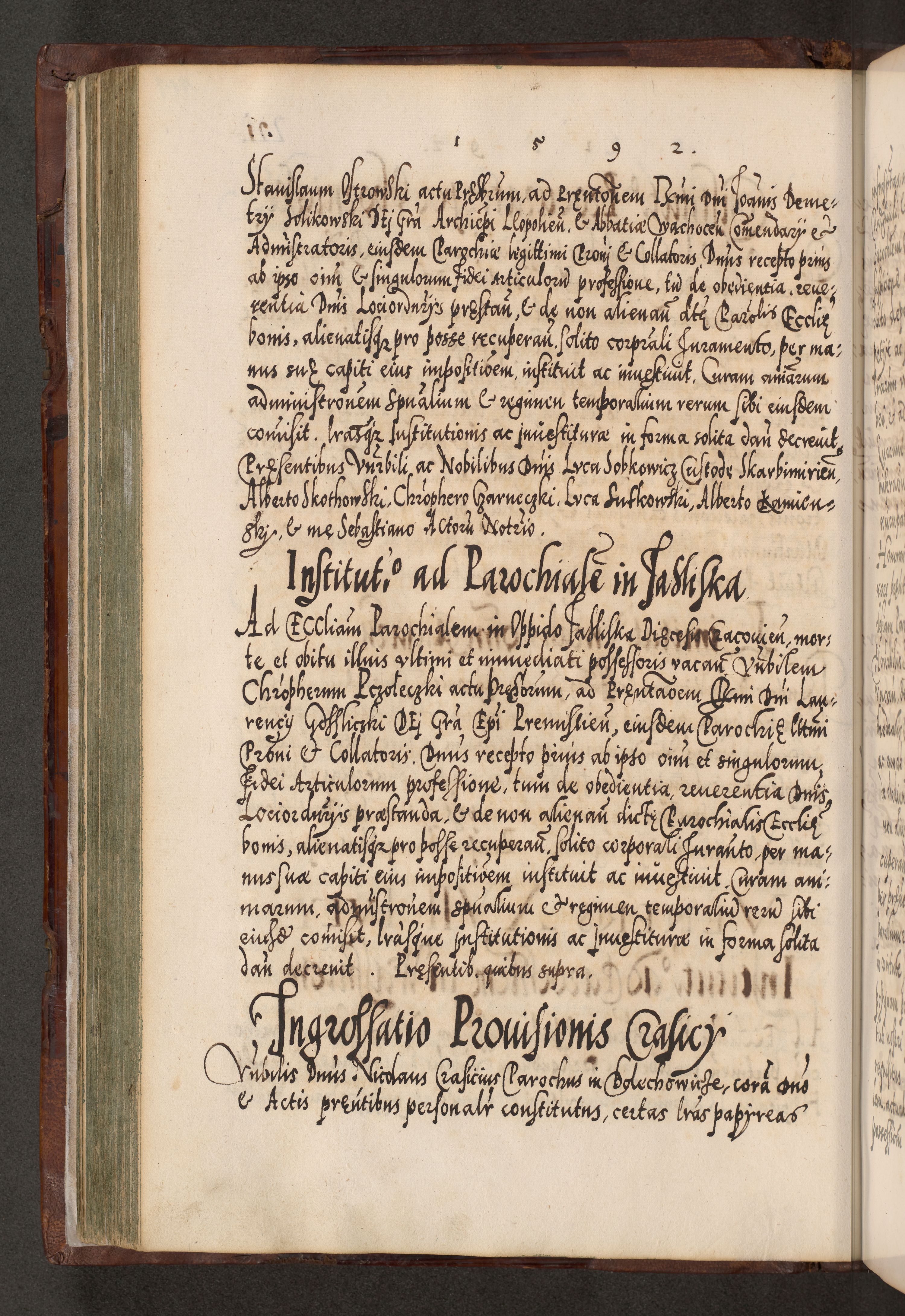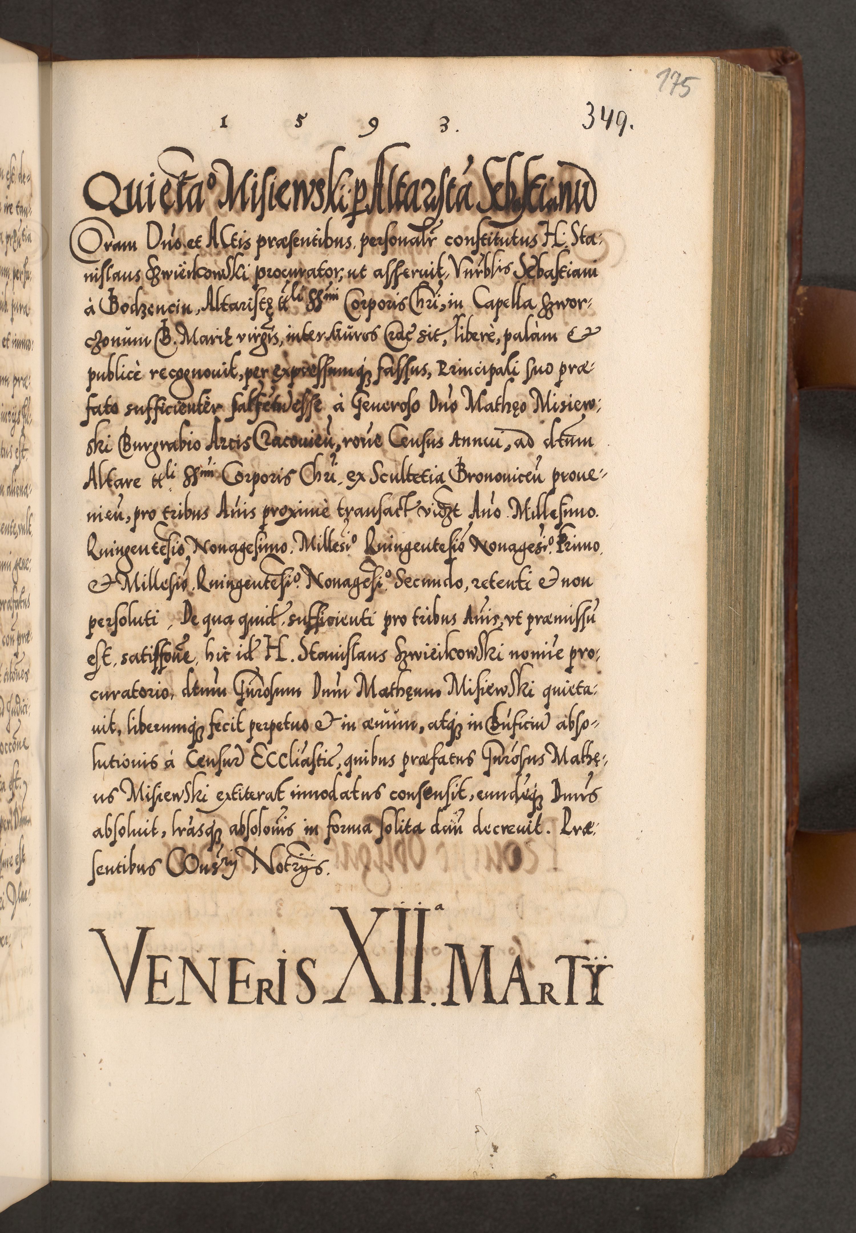 Illistrissimo et revedissimo in Christo Patre Domino Domino Georgio Rzadziwił Miserone Divina Sacrostae R. E. Tituli S. Sixti Presbitero Cardinali Duce in Olyka et Niesswiesz ad Gubernacula Ecclessiae Cracoviensis cuius administratorialem a Sancta Sede Apostolica obtinverat feliciter sedente. Acta actorum, causarum, sententiarum tam deffinitivarum quam interloquutoriarum decretorum, obligationum, quietationum, recognitionum, constitutionum procuratorum etc. coram Reverendo Domino Stanislao Crassinskz de Crasne Archidiacono Cracoviensis, Scholastico Gnesnesis, Custode Plocensis etc. Vicario et Officiali Generali Cracoviensi in Ano Domini Millesimo Quingentesimo Nonagesimo Primo cuius indictio quarta pontificatus SS. Domini Nostri Gregorii XIIII Anno I psius prio feliciter incipiut