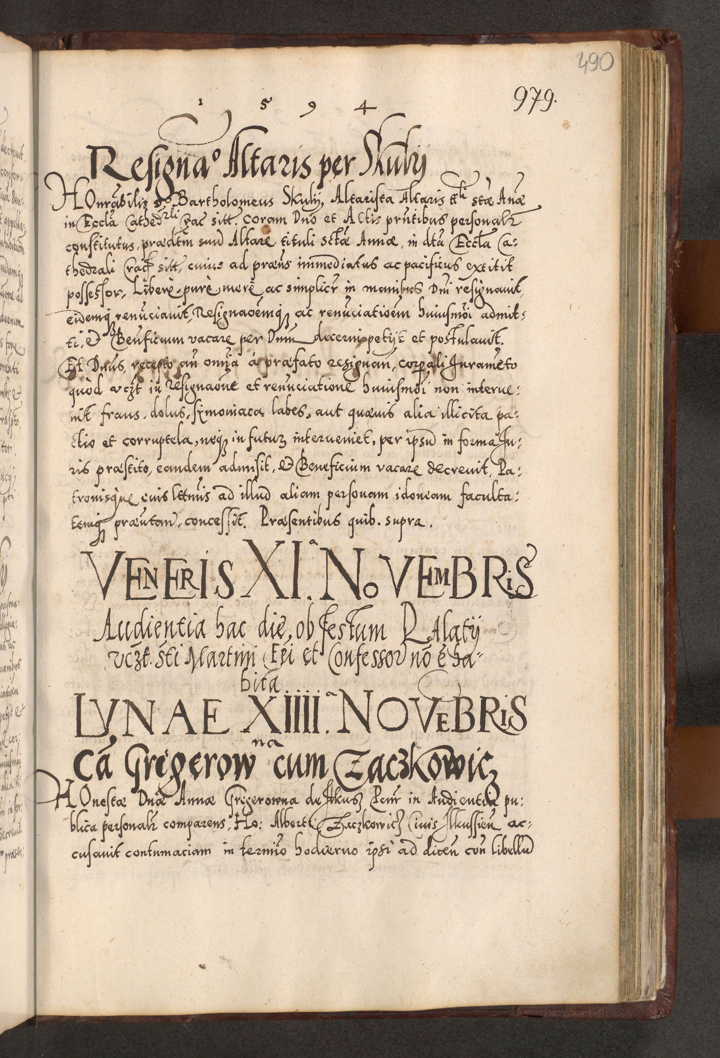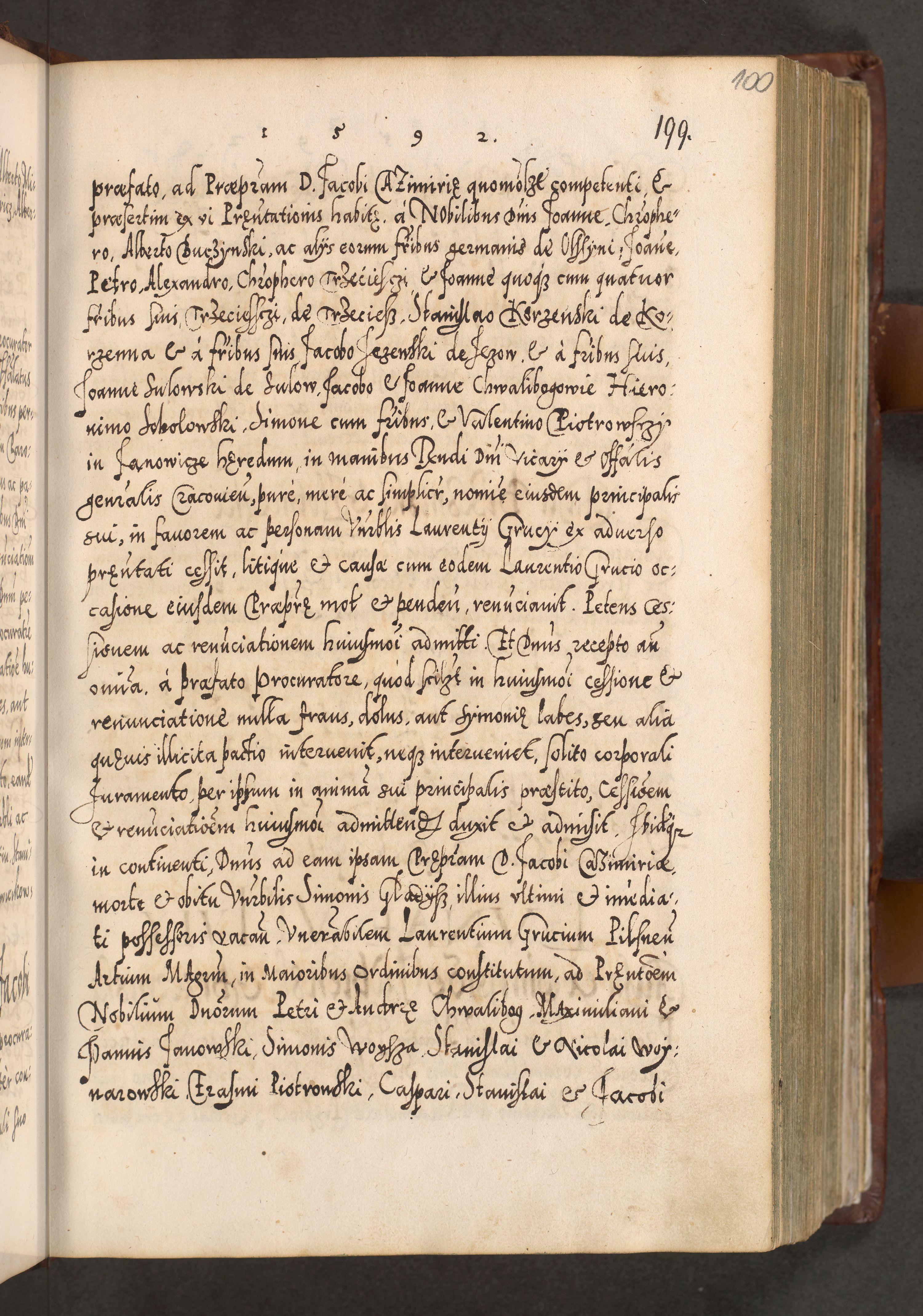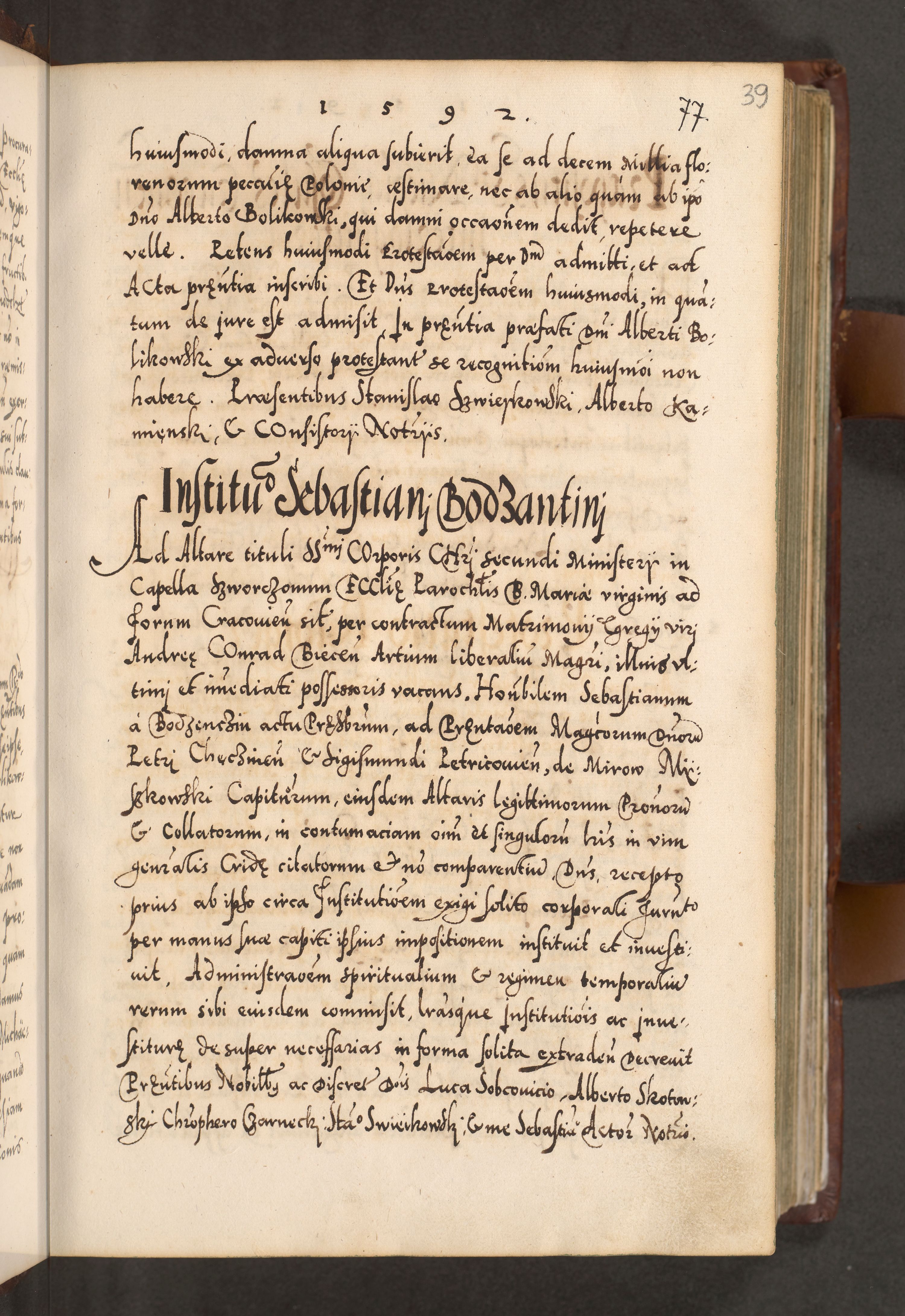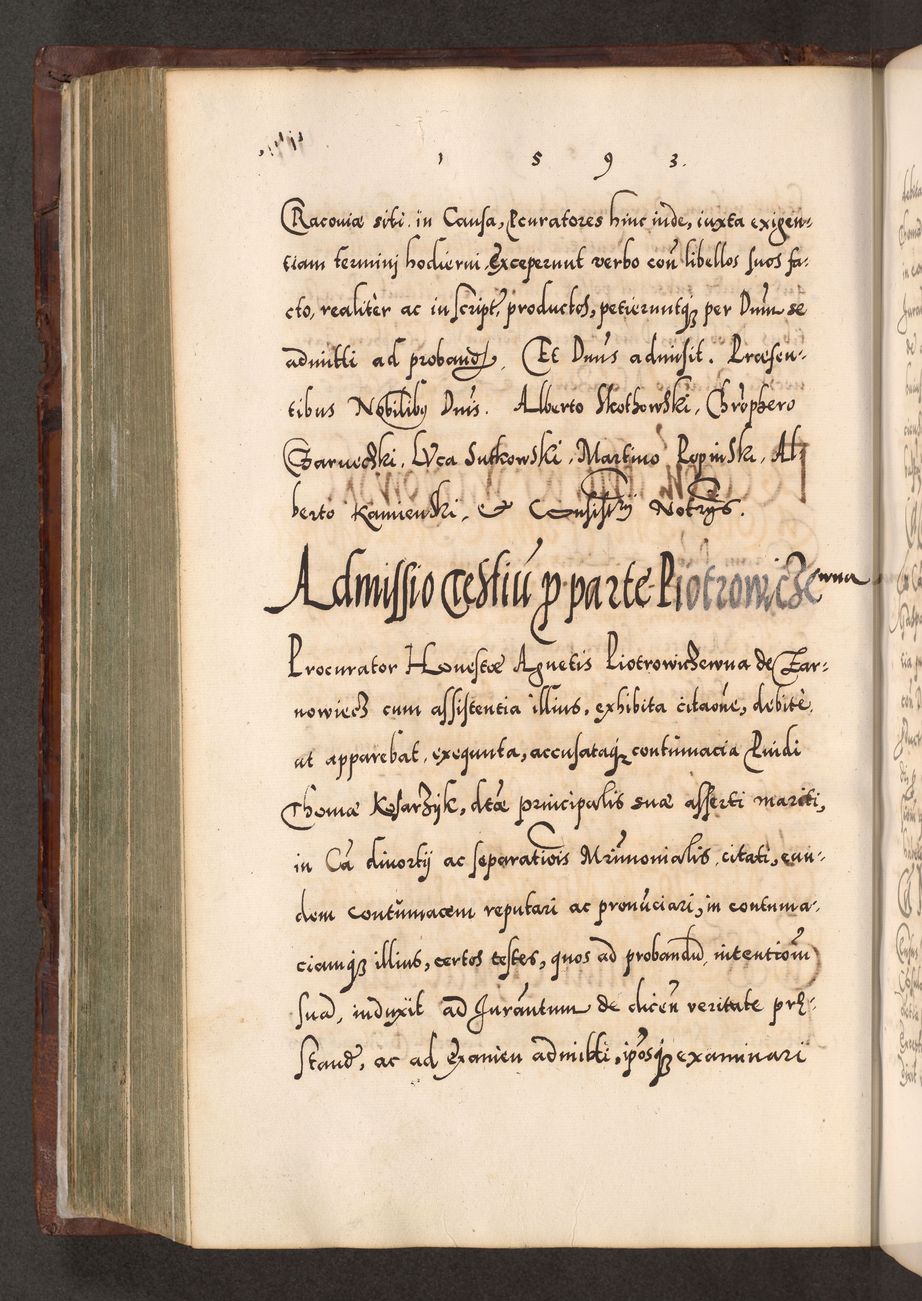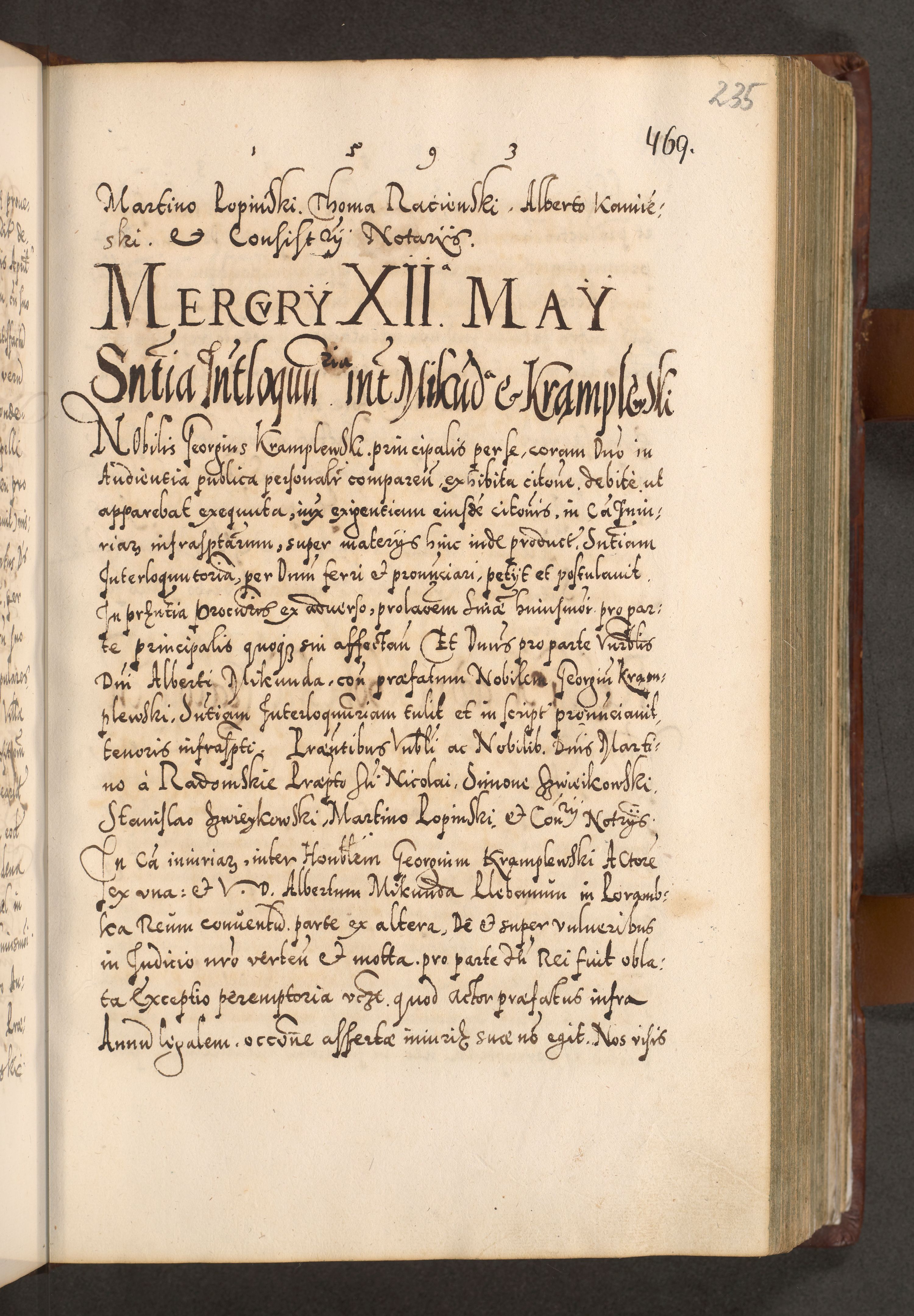 Illistrissimo et revedissimo in Christo Patre Domino Domino Georgio Rzadziwił Miserone Divina Sacrostae R. E. Tituli S. Sixti Presbitero Cardinali Duce in Olyka et Niesswiesz ad Gubernacula Ecclessiae Cracoviensis cuius administratorialem a Sancta Sede Apostolica obtinverat feliciter sedente. Acta actorum, causarum, sententiarum tam deffinitivarum quam interloquutoriarum decretorum, obligationum, quietationum, recognitionum, constitutionum procuratorum etc. coram Reverendo Domino Stanislao Crassinskz de Crasne Archidiacono Cracoviensis, Scholastico Gnesnesis, Custode Plocensis etc. Vicario et Officiali Generali Cracoviensi in Ano Domini Millesimo Quingentesimo Nonagesimo Primo cuius indictio quarta pontificatus SS. Domini Nostri Gregorii XIIII Anno I psius prio feliciter incipiut