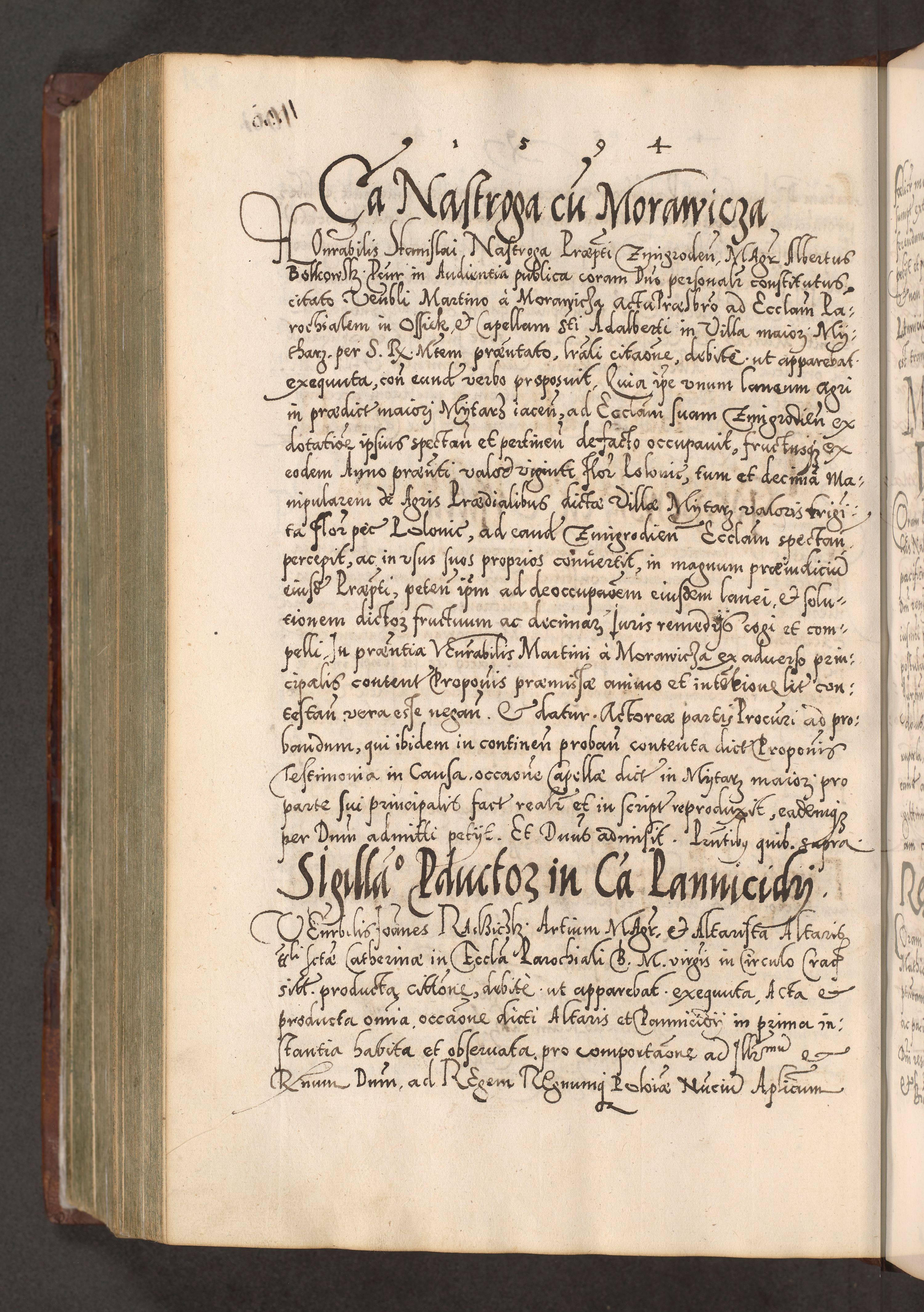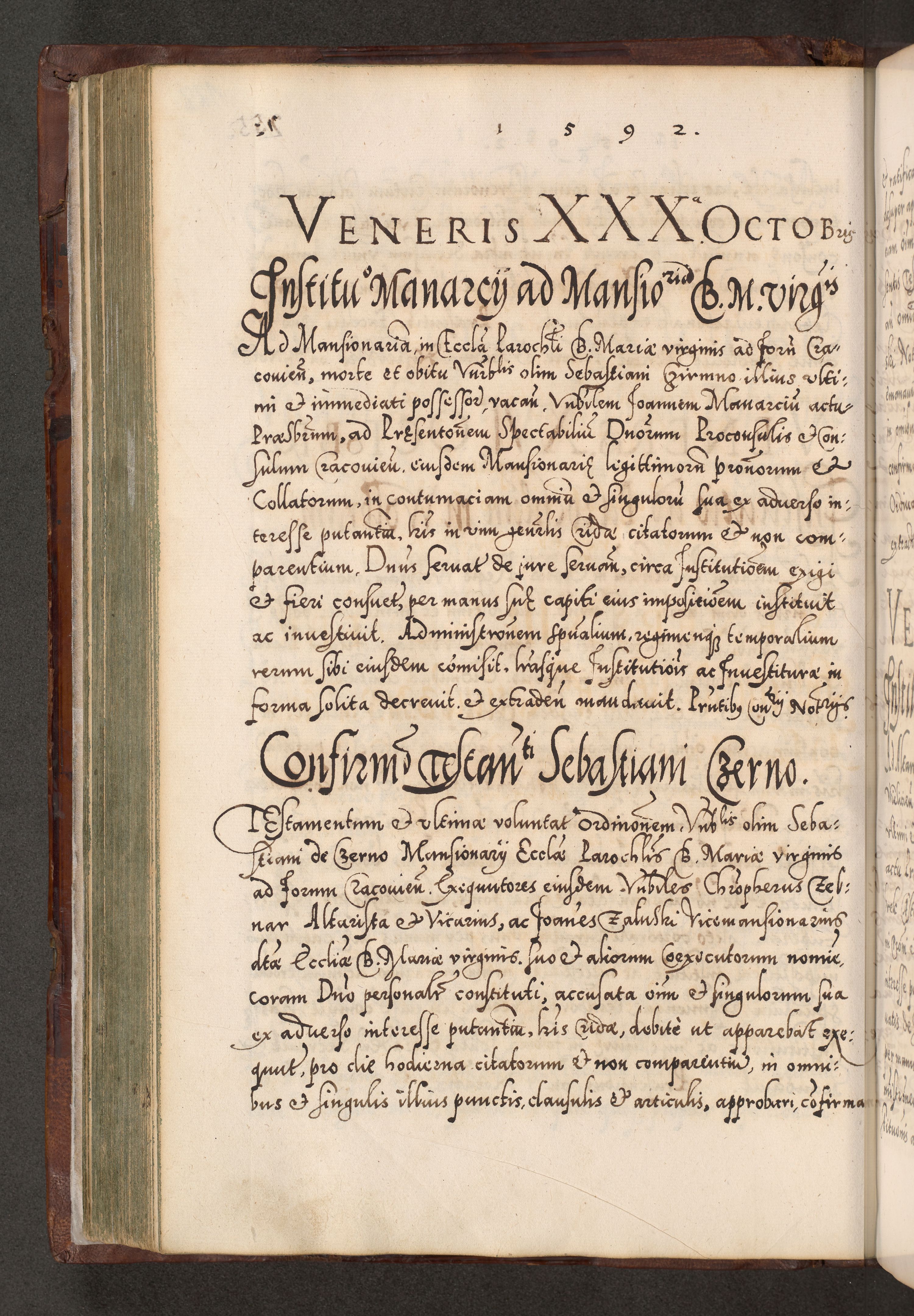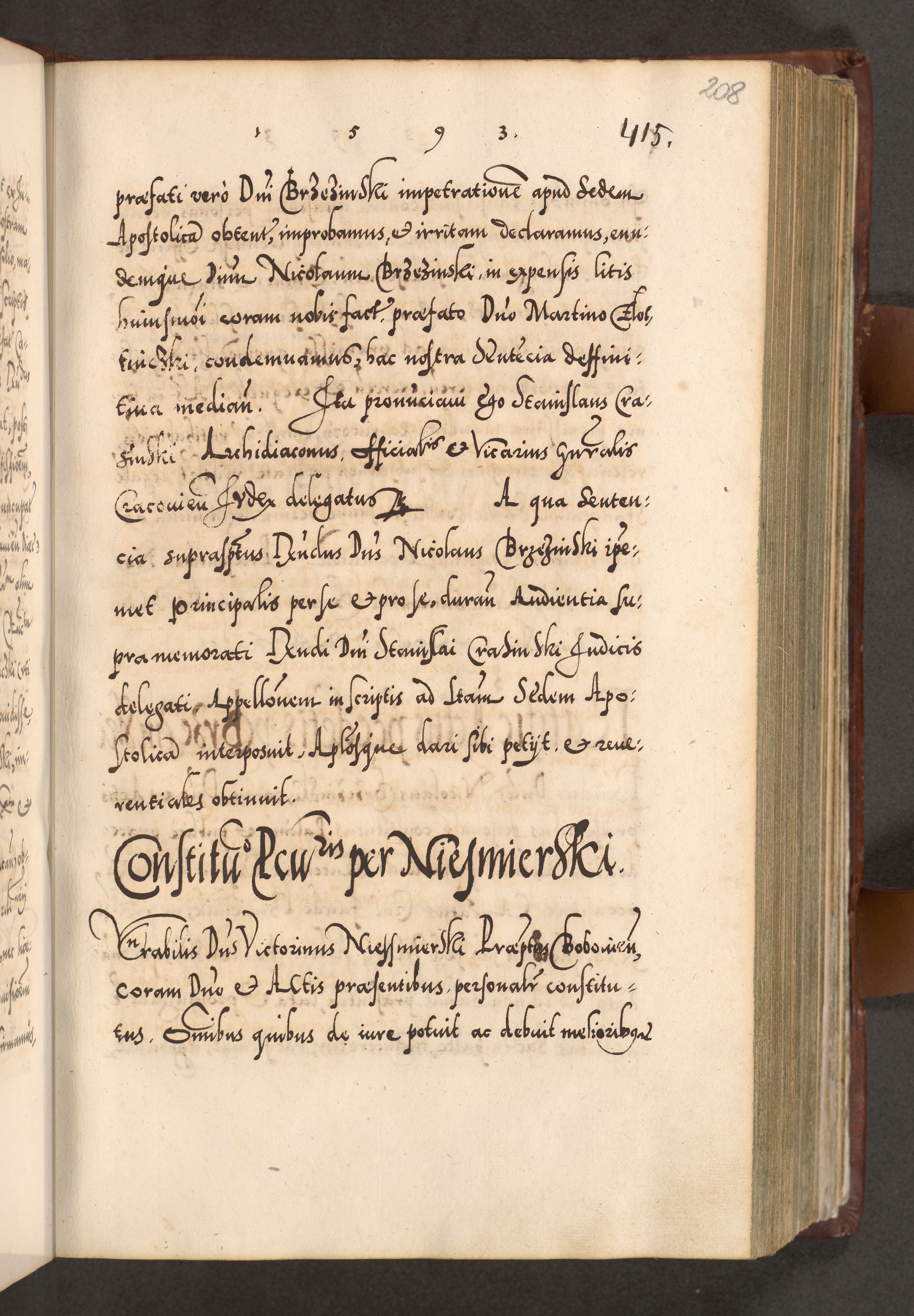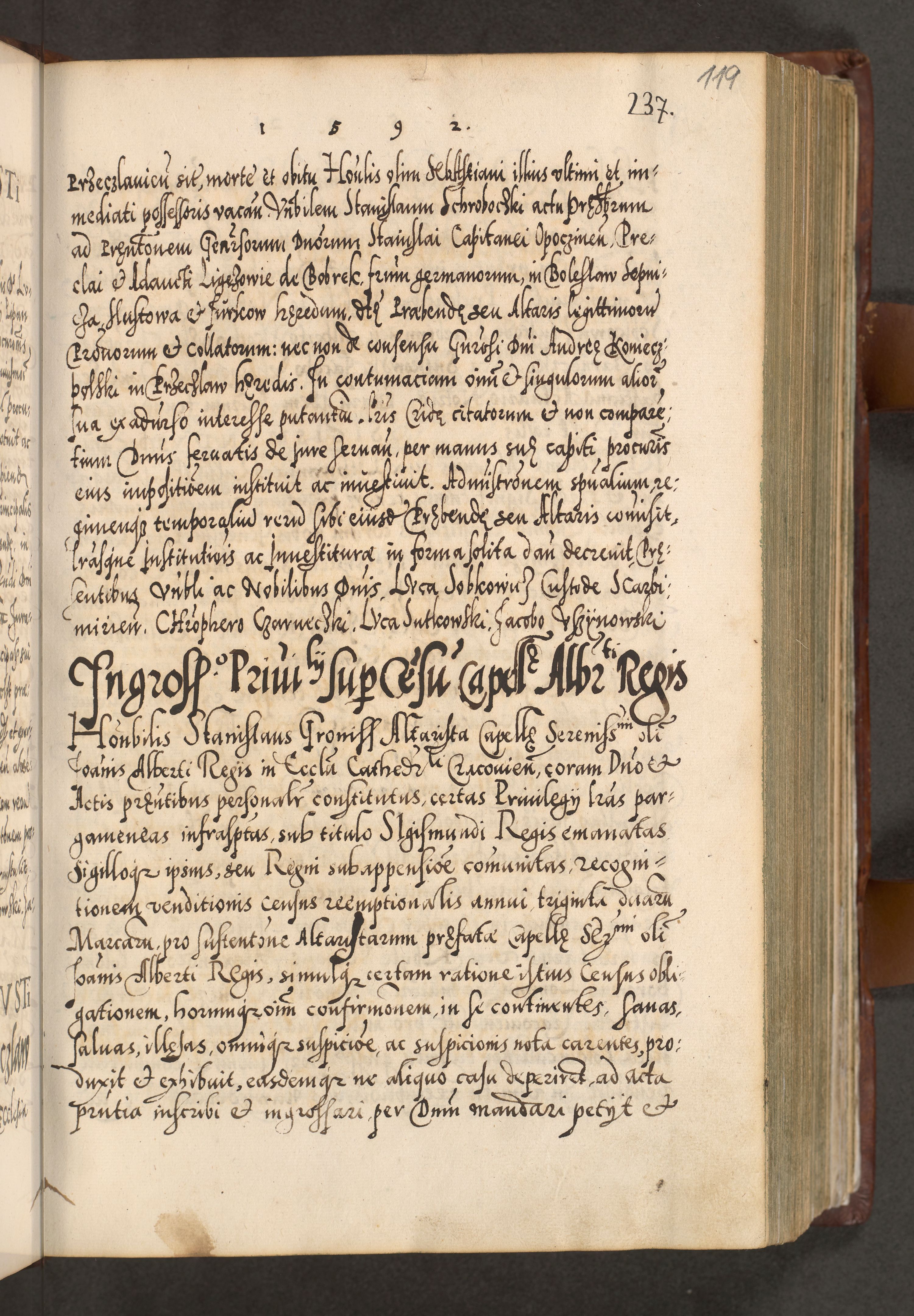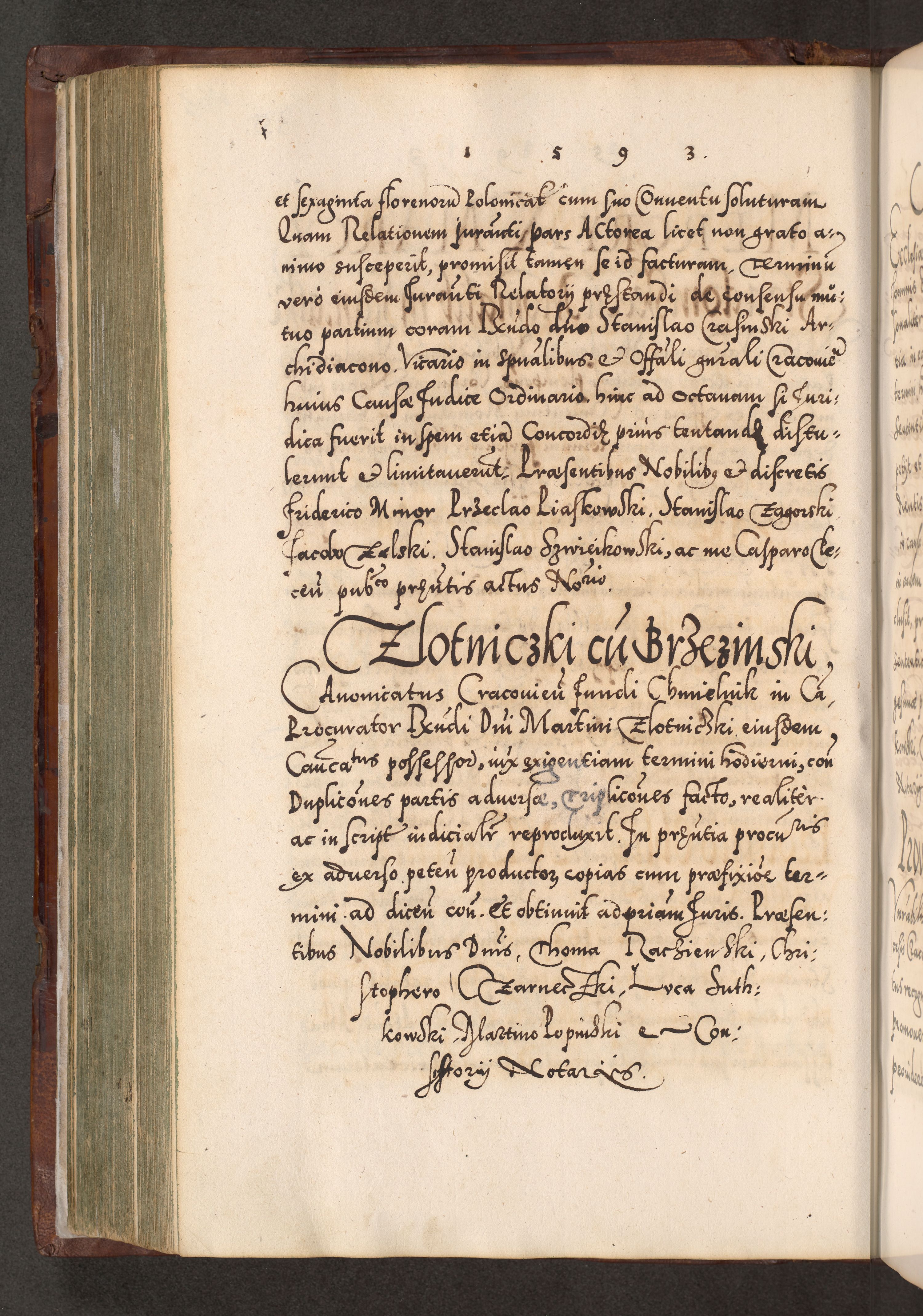 Illistrissimo et revedissimo in Christo Patre Domino Domino Georgio Rzadziwił Miserone Divina Sacrostae R. E. Tituli S. Sixti Presbitero Cardinali Duce in Olyka et Niesswiesz ad Gubernacula Ecclessiae Cracoviensis cuius administratorialem a Sancta Sede Apostolica obtinverat feliciter sedente. Acta actorum, causarum, sententiarum tam deffinitivarum quam interloquutoriarum decretorum, obligationum, quietationum, recognitionum, constitutionum procuratorum etc. coram Reverendo Domino Stanislao Crassinskz de Crasne Archidiacono Cracoviensis, Scholastico Gnesnesis, Custode Plocensis etc. Vicario et Officiali Generali Cracoviensi in Ano Domini Millesimo Quingentesimo Nonagesimo Primo cuius indictio quarta pontificatus SS. Domini Nostri Gregorii XIIII Anno I psius prio feliciter incipiut