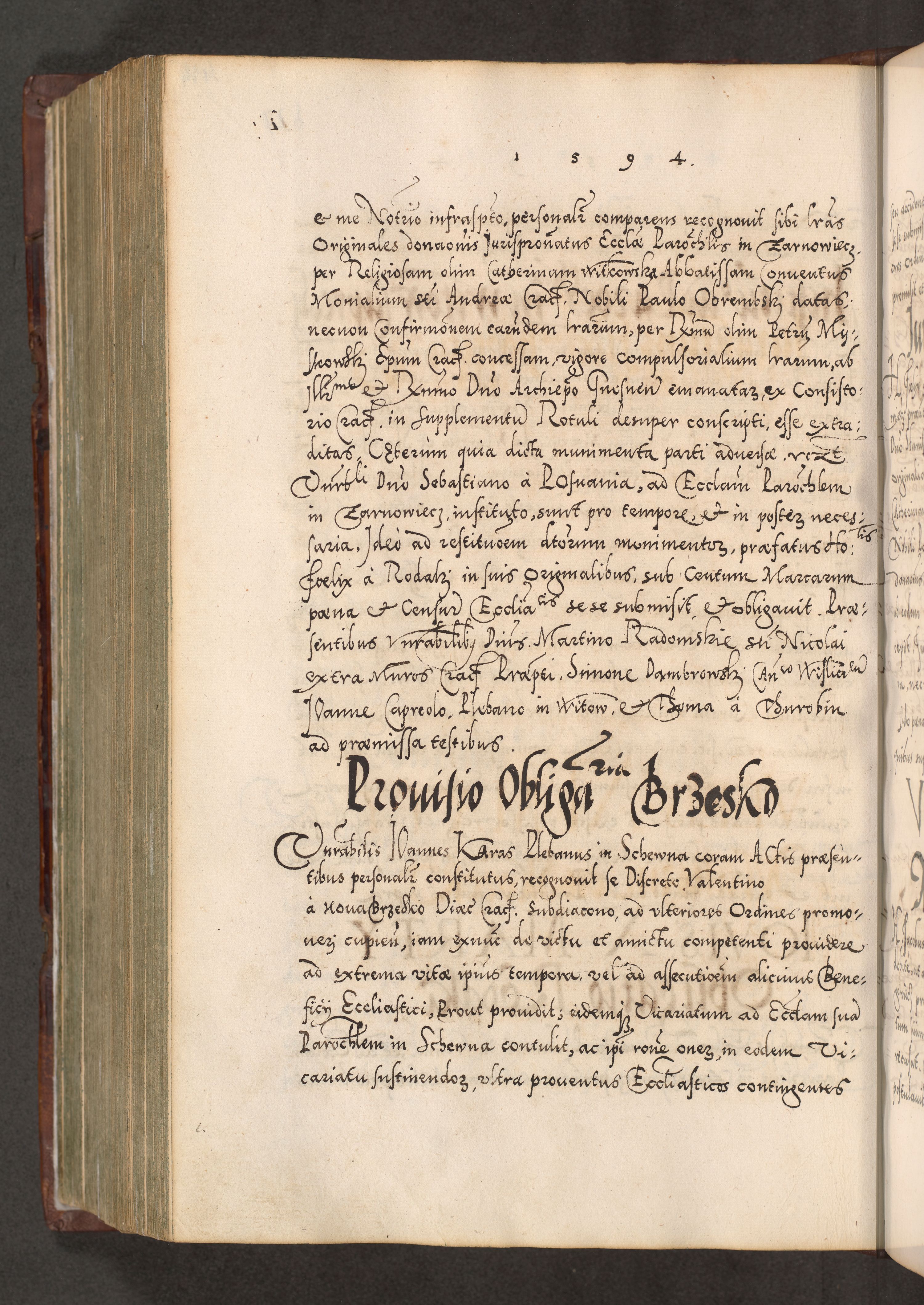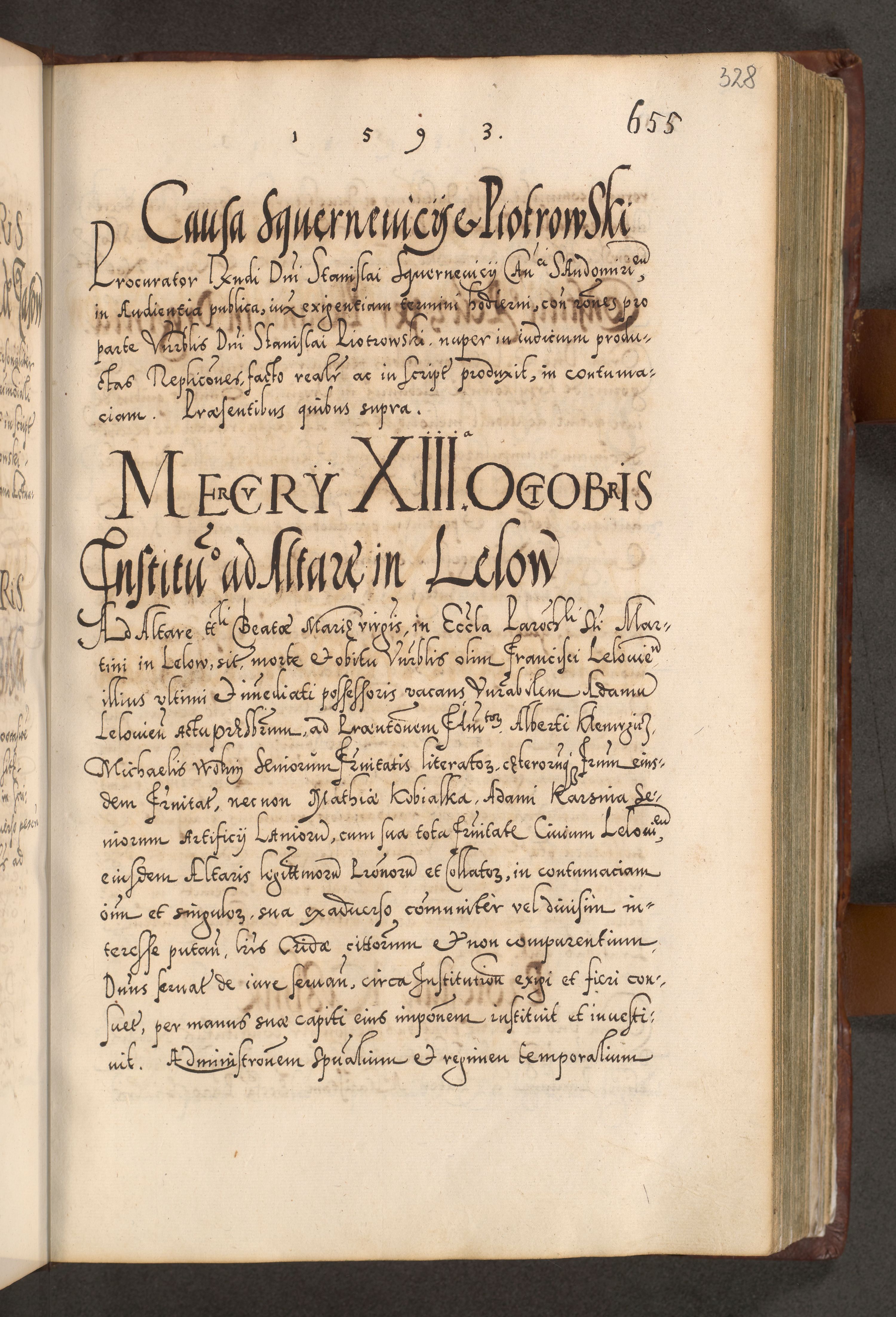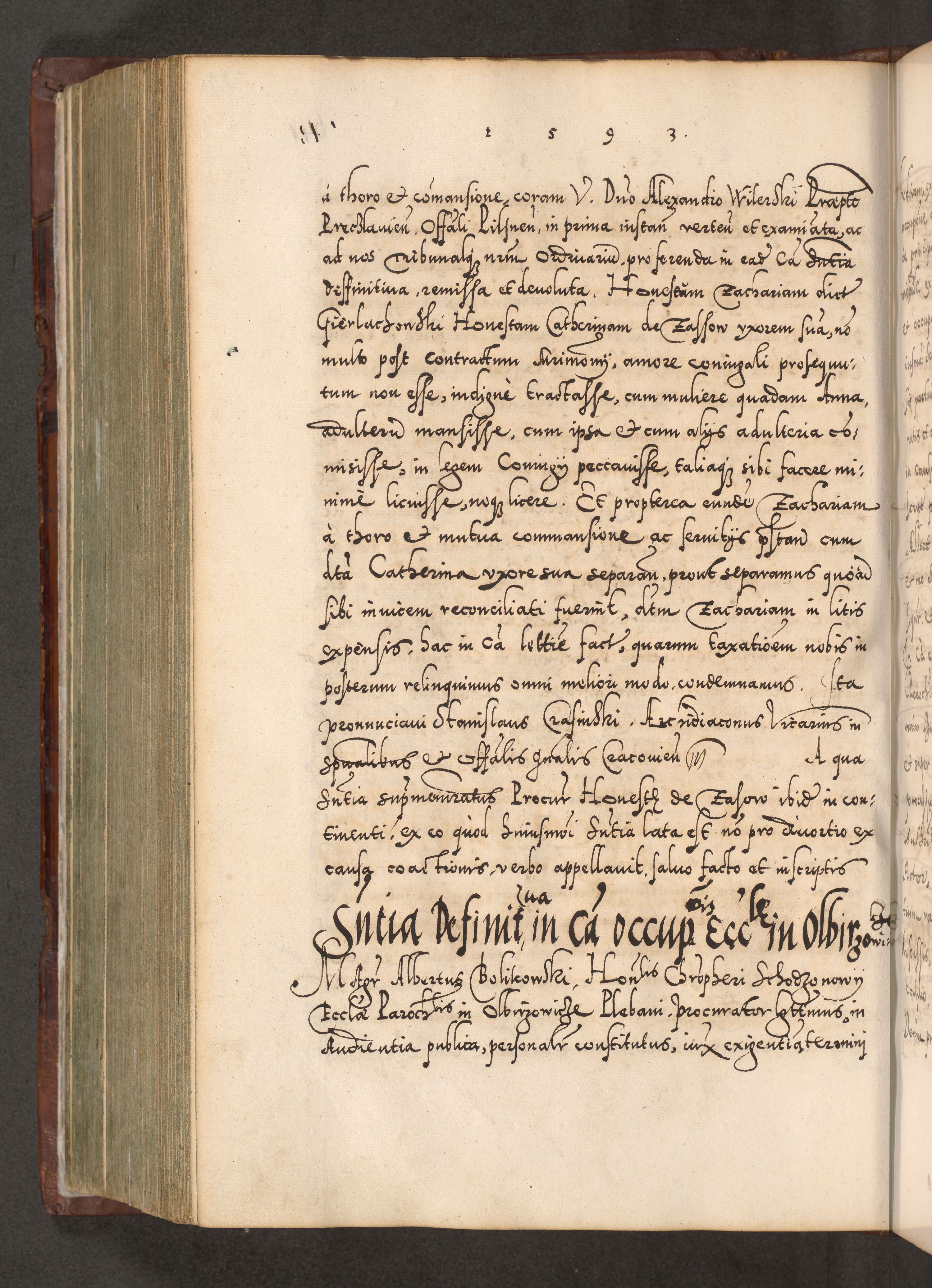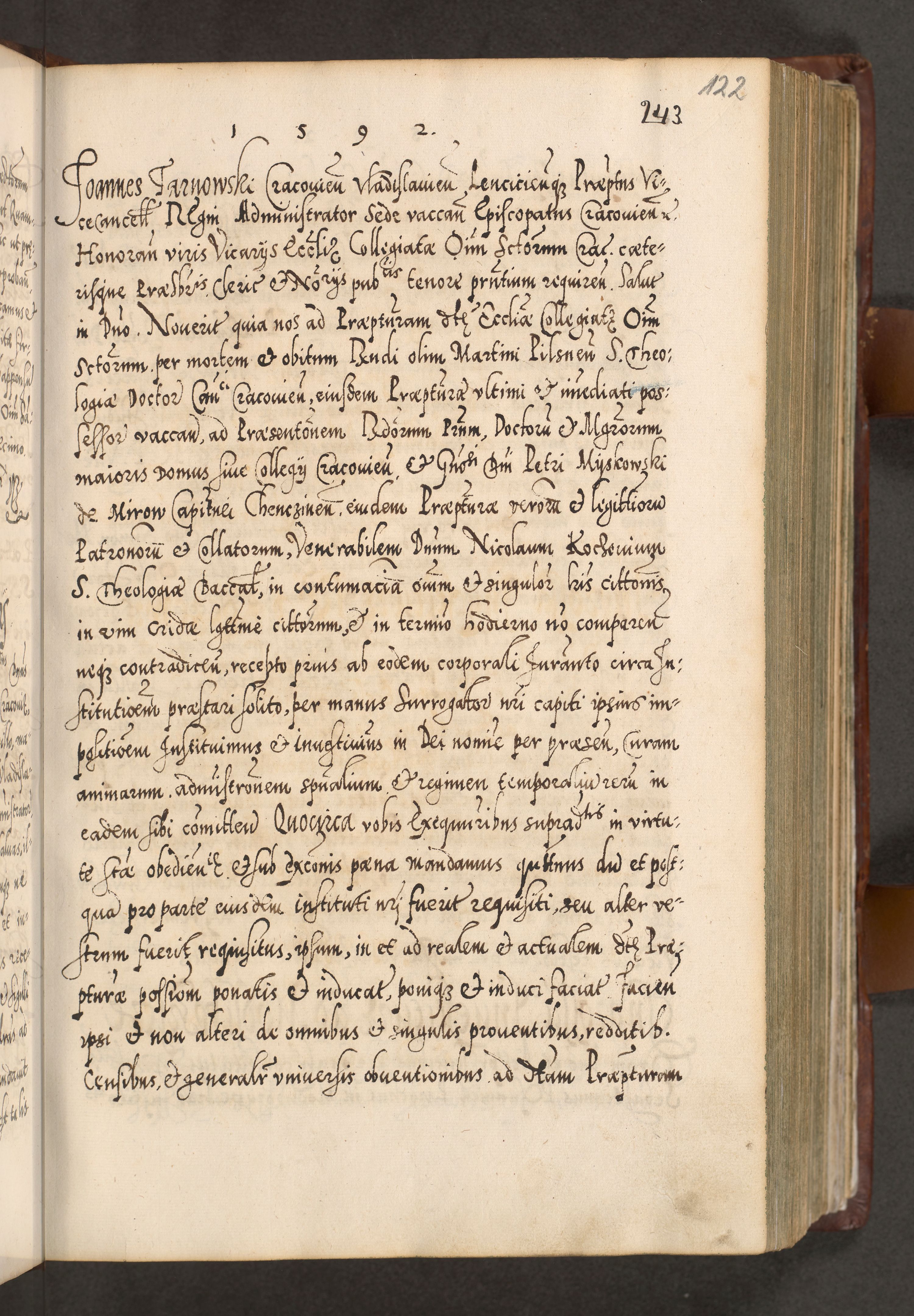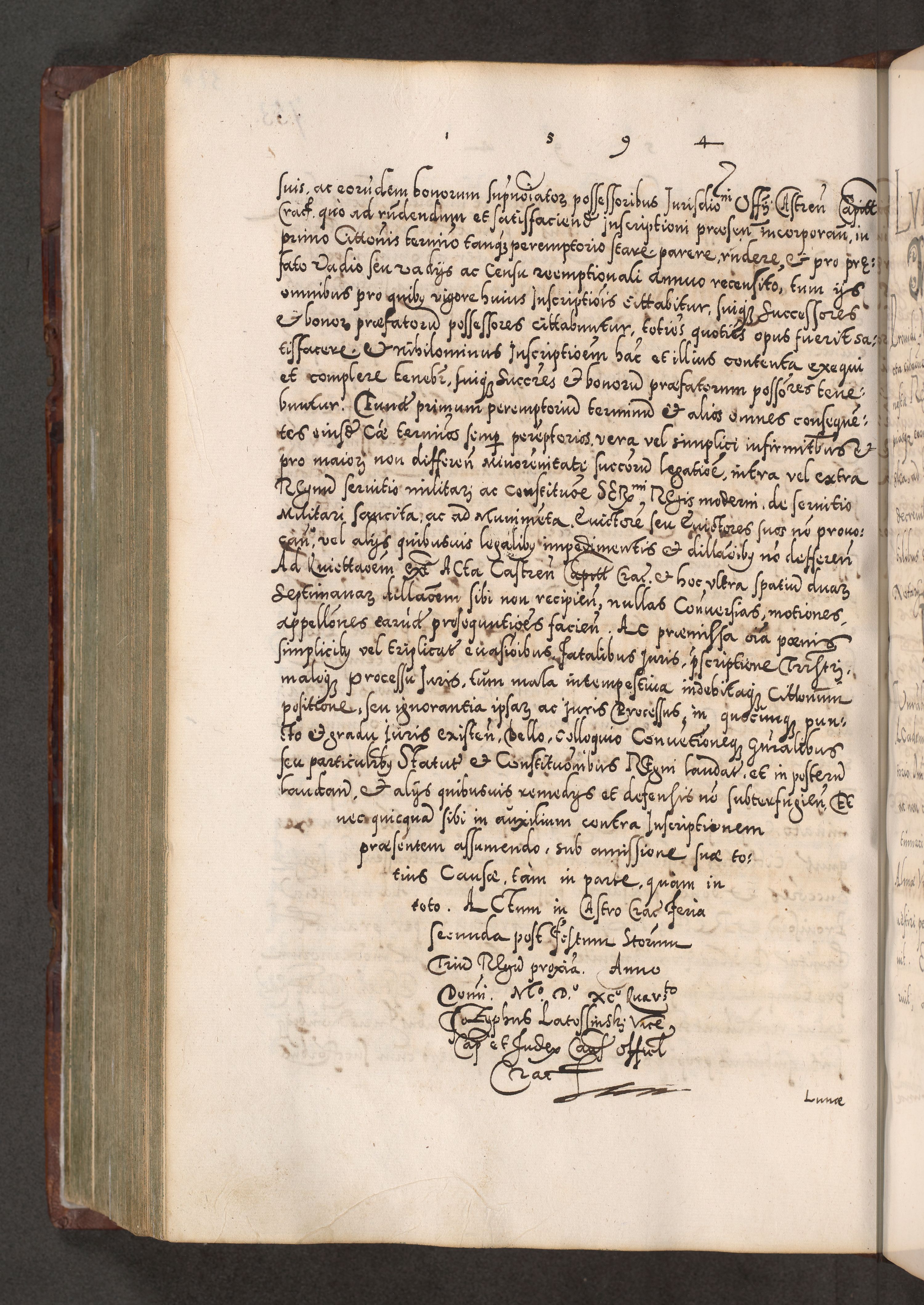 Illistrissimo et revedissimo in Christo Patre Domino Domino Georgio Rzadziwił Miserone Divina Sacrostae R. E. Tituli S. Sixti Presbitero Cardinali Duce in Olyka et Niesswiesz ad Gubernacula Ecclessiae Cracoviensis cuius administratorialem a Sancta Sede Apostolica obtinverat feliciter sedente. Acta actorum, causarum, sententiarum tam deffinitivarum quam interloquutoriarum decretorum, obligationum, quietationum, recognitionum, constitutionum procuratorum etc. coram Reverendo Domino Stanislao Crassinskz de Crasne Archidiacono Cracoviensis, Scholastico Gnesnesis, Custode Plocensis etc. Vicario et Officiali Generali Cracoviensi in Ano Domini Millesimo Quingentesimo Nonagesimo Primo cuius indictio quarta pontificatus SS. Domini Nostri Gregorii XIIII Anno I psius prio feliciter incipiut