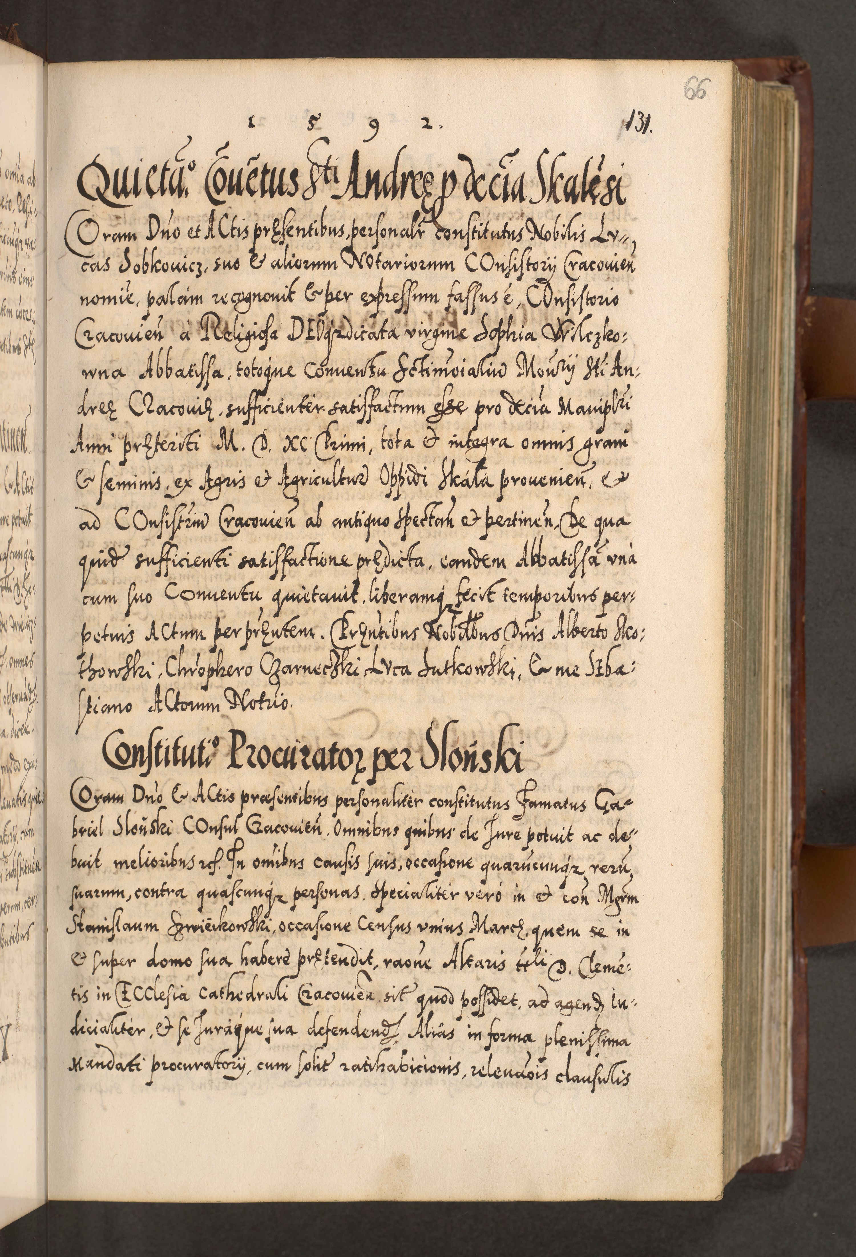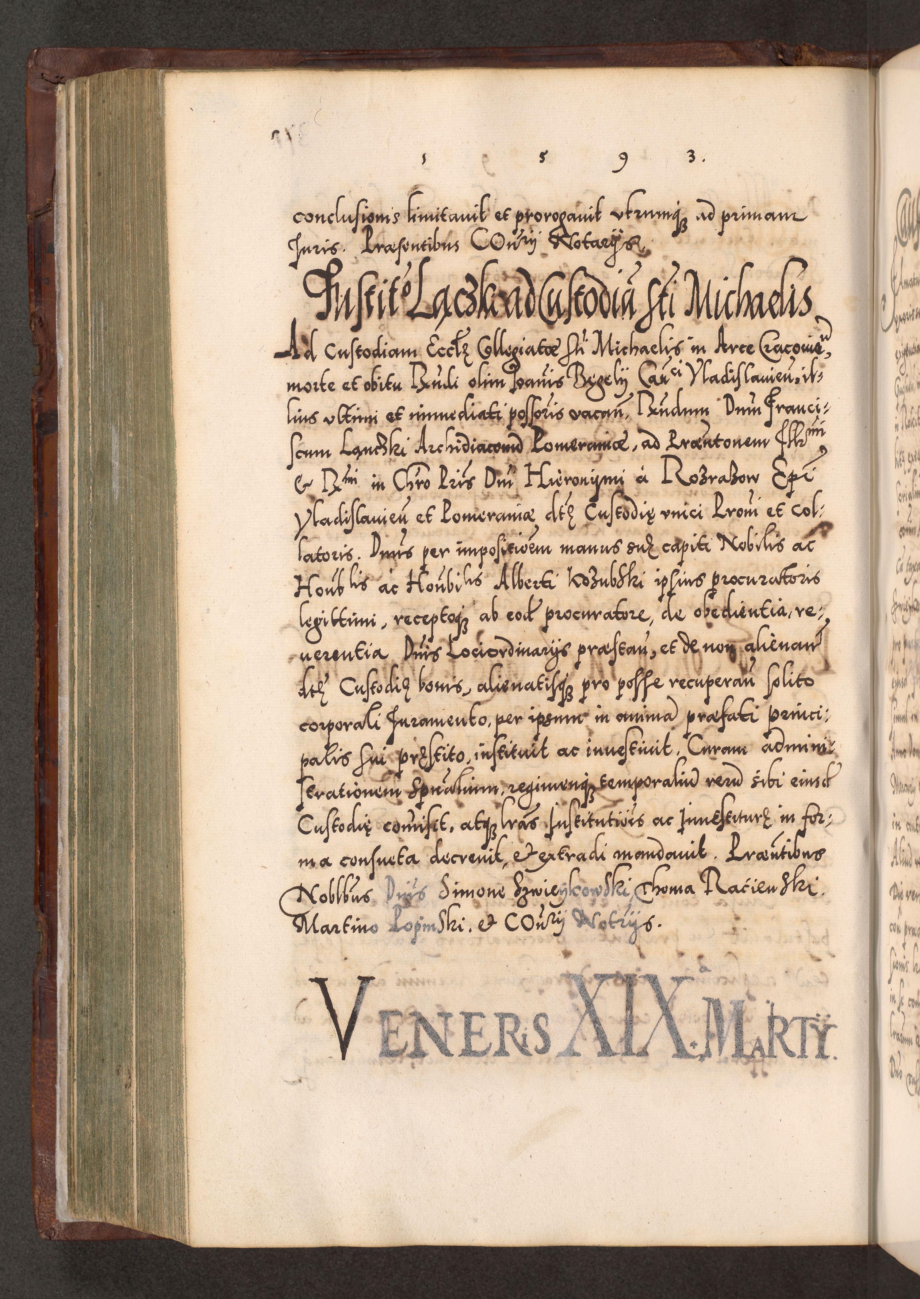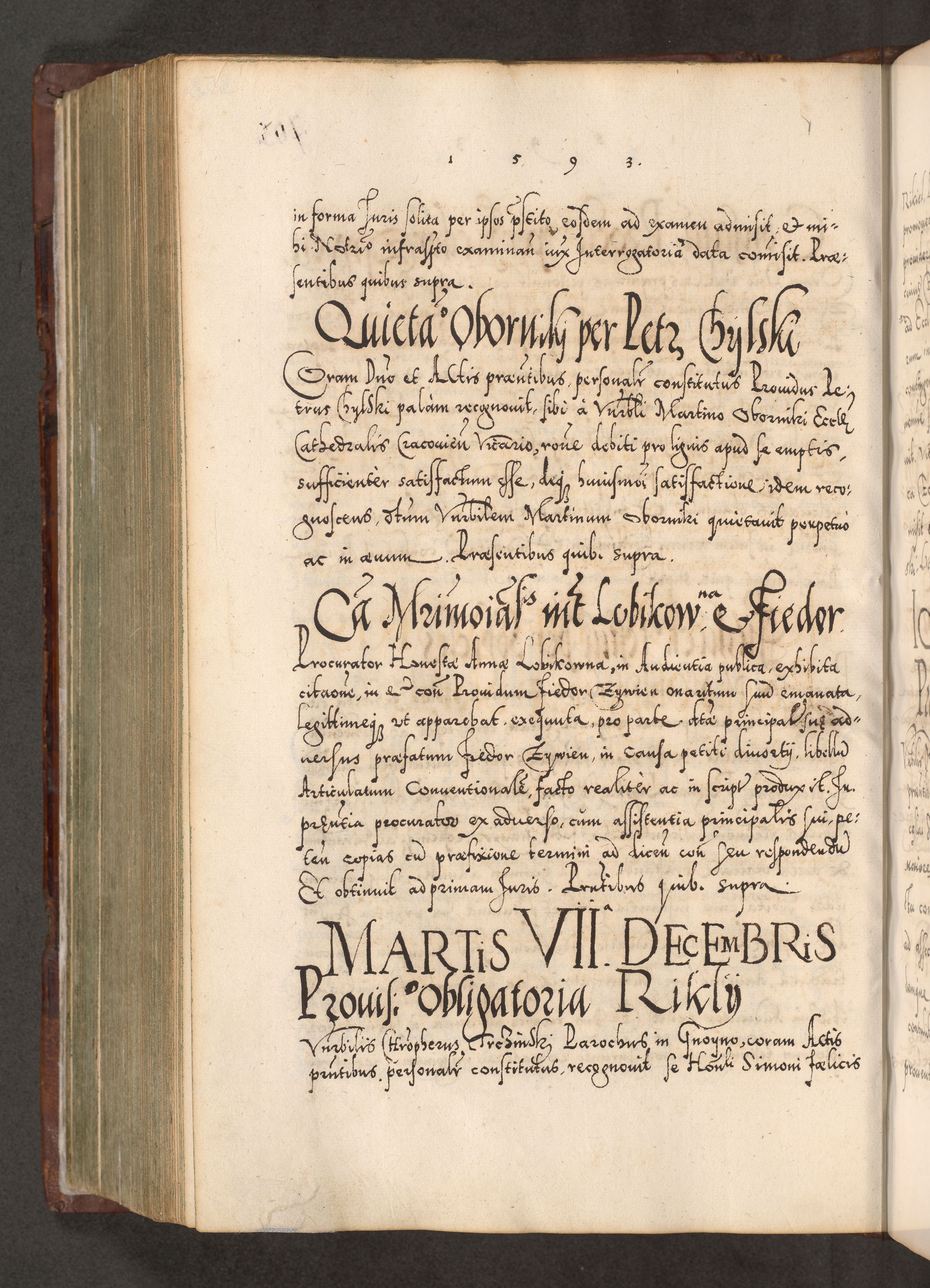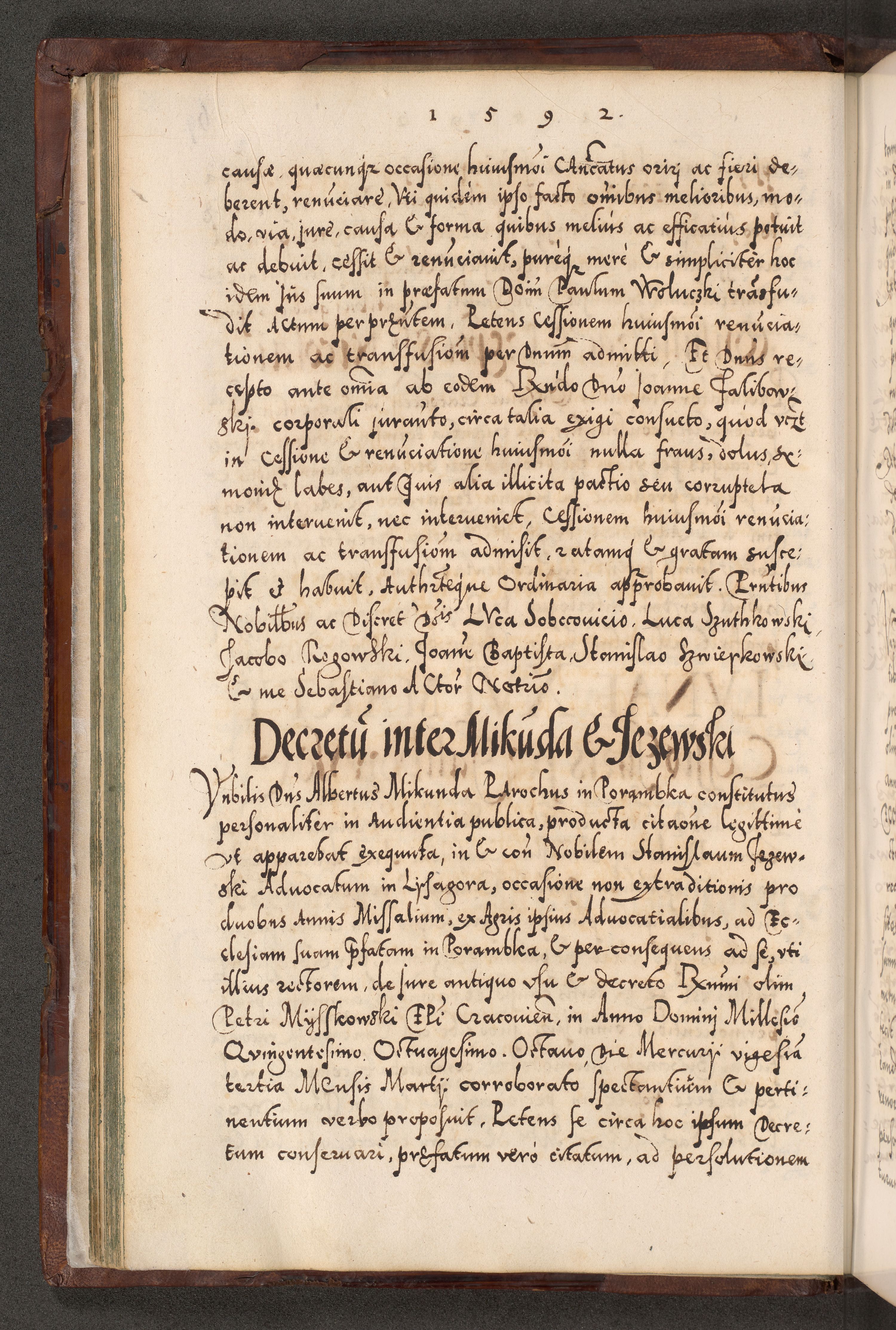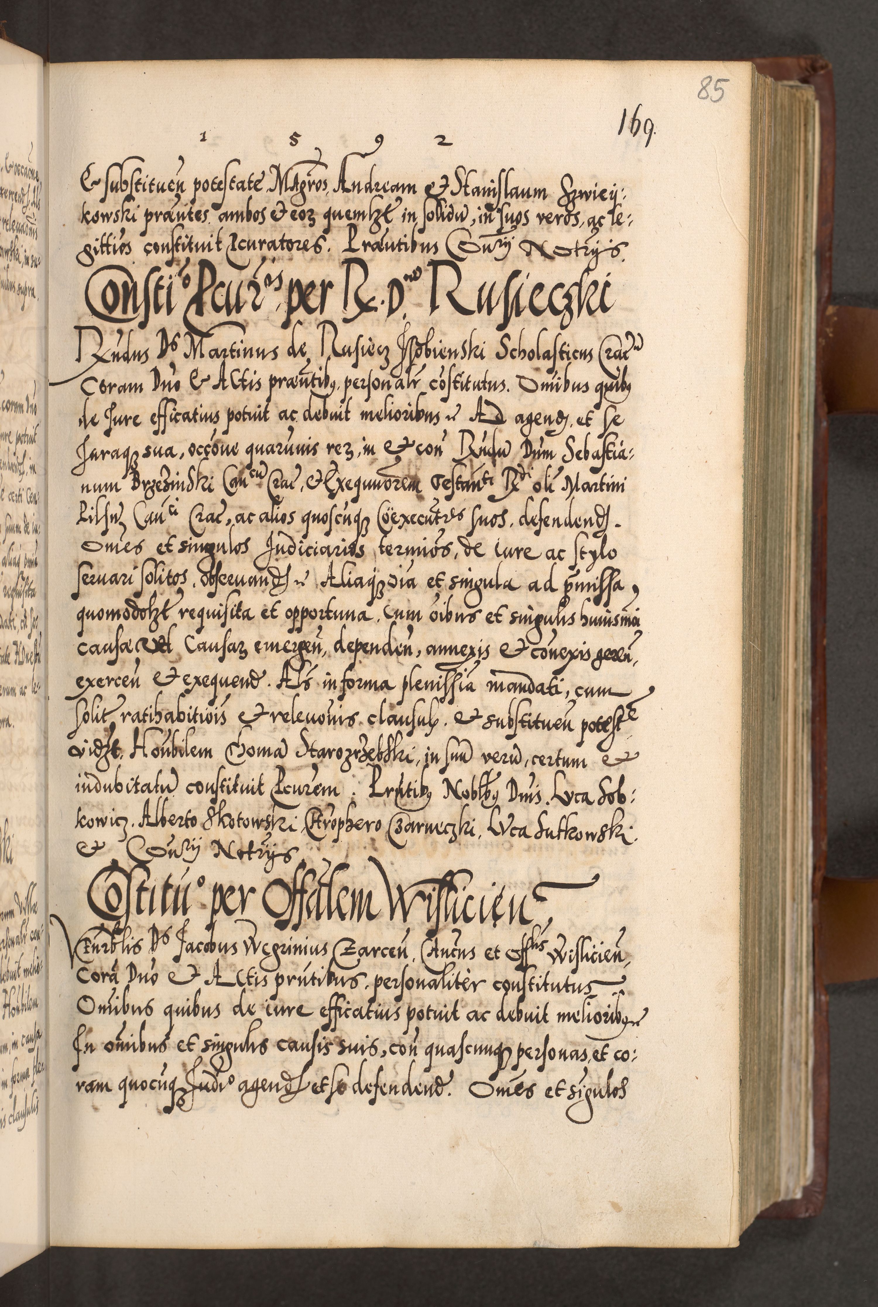 Illistrissimo et revedissimo in Christo Patre Domino Domino Georgio Rzadziwił Miserone Divina Sacrostae R. E. Tituli S. Sixti Presbitero Cardinali Duce in Olyka et Niesswiesz ad Gubernacula Ecclessiae Cracoviensis cuius administratorialem a Sancta Sede Apostolica obtinverat feliciter sedente. Acta actorum, causarum, sententiarum tam deffinitivarum quam interloquutoriarum decretorum, obligationum, quietationum, recognitionum, constitutionum procuratorum etc. coram Reverendo Domino Stanislao Crassinskz de Crasne Archidiacono Cracoviensis, Scholastico Gnesnesis, Custode Plocensis etc. Vicario et Officiali Generali Cracoviensi in Ano Domini Millesimo Quingentesimo Nonagesimo Primo cuius indictio quarta pontificatus SS. Domini Nostri Gregorii XIIII Anno I psius prio feliciter incipiut