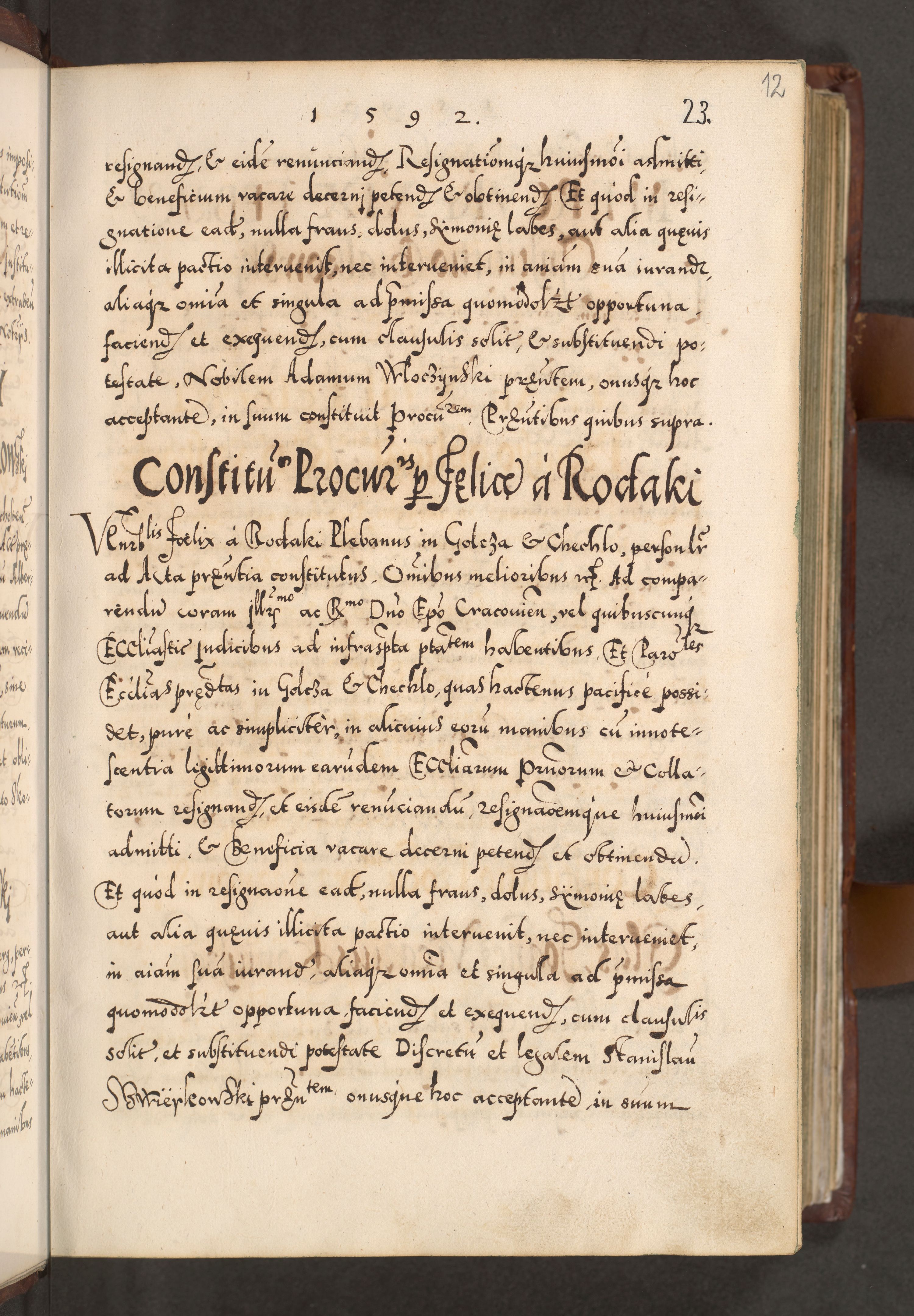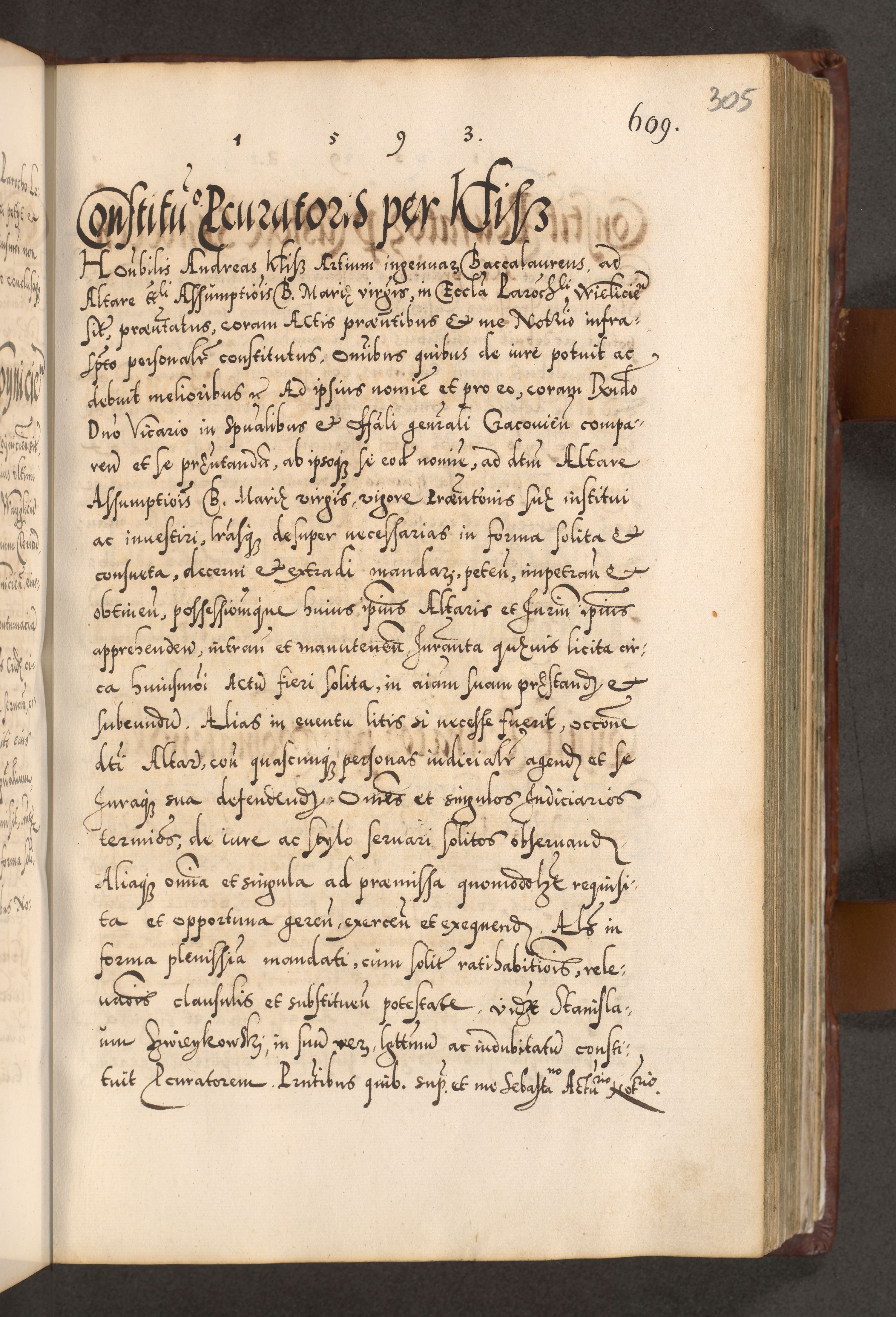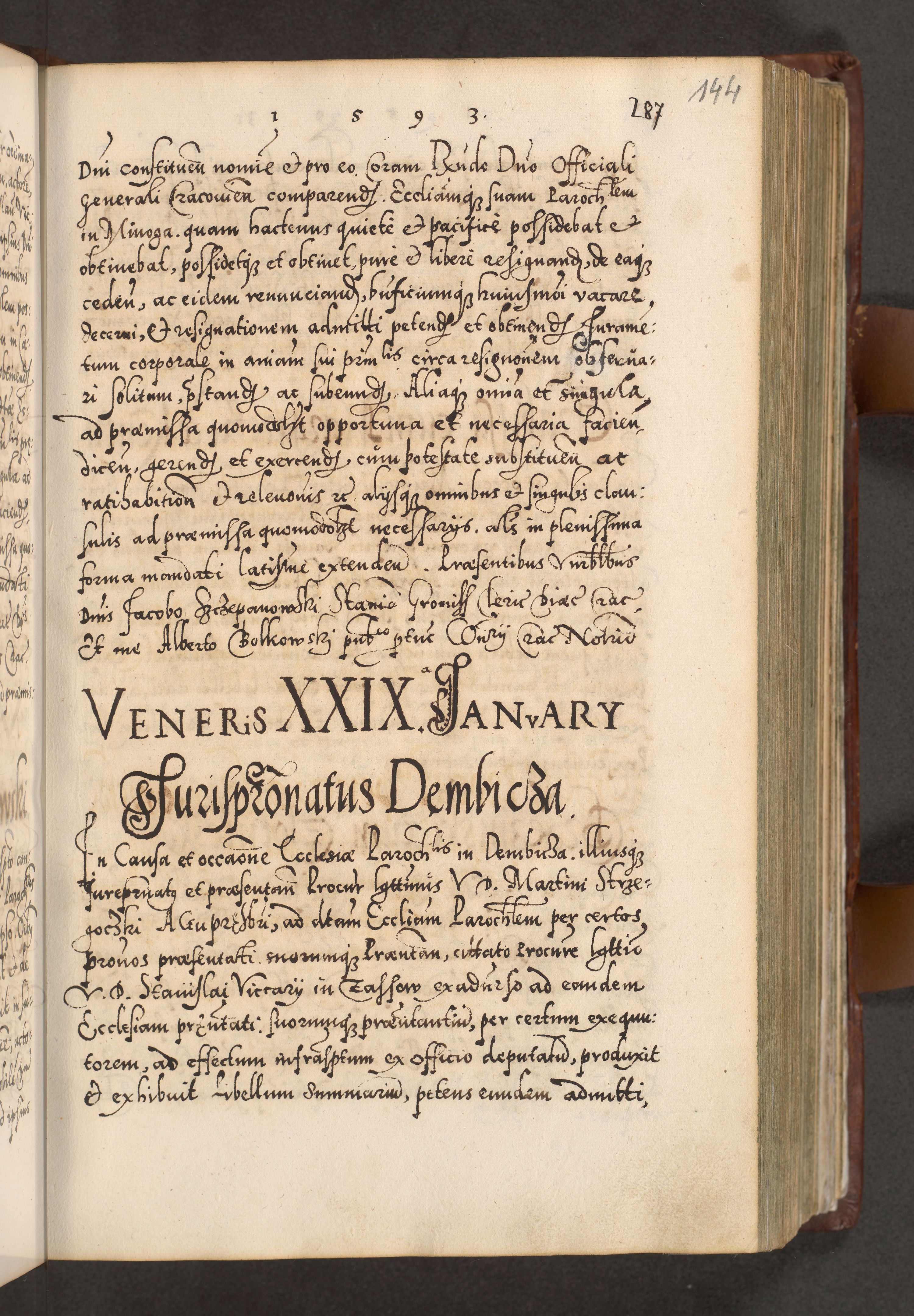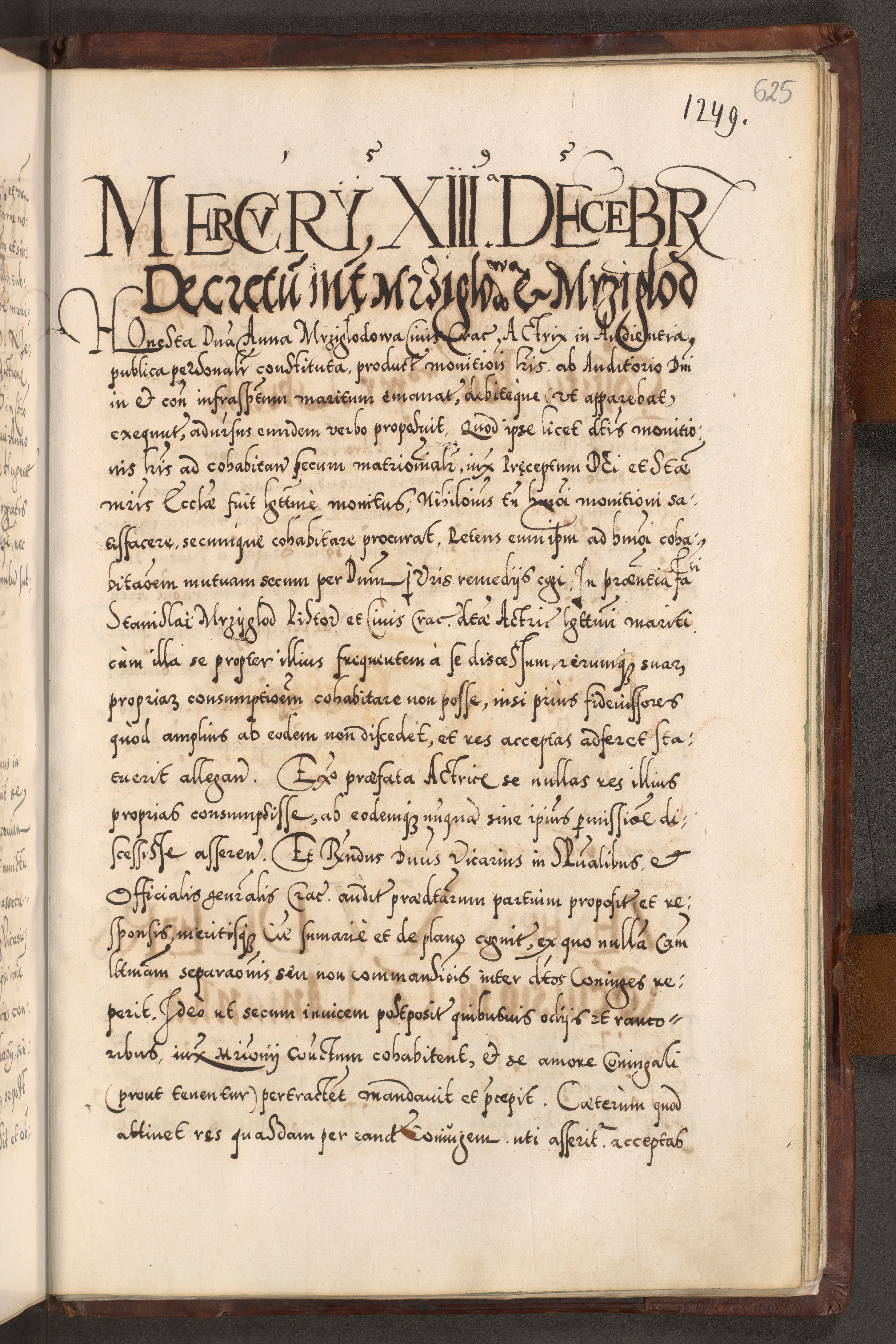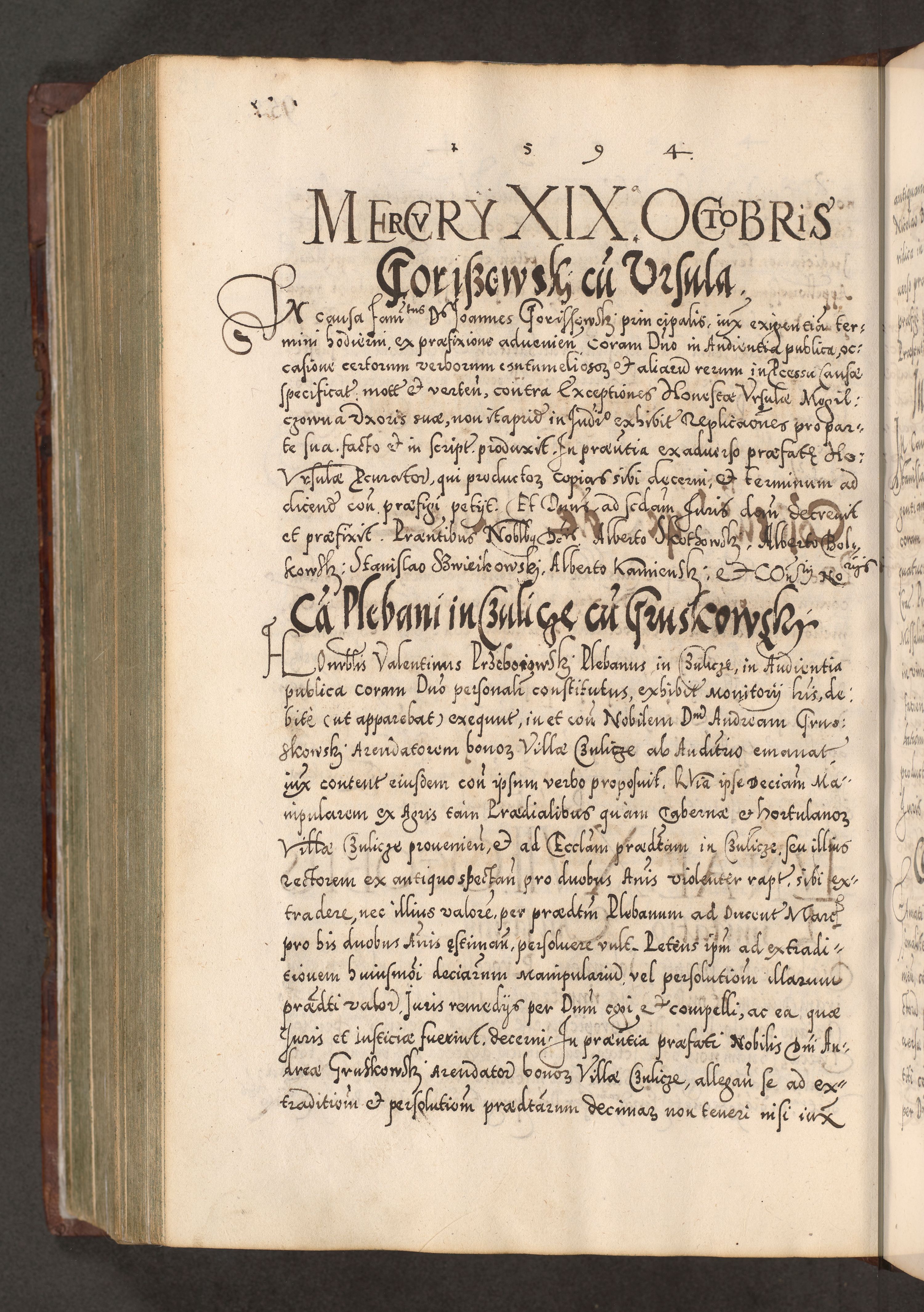 Illistrissimo et revedissimo in Christo Patre Domino Domino Georgio Rzadziwił Miserone Divina Sacrostae R. E. Tituli S. Sixti Presbitero Cardinali Duce in Olyka et Niesswiesz ad Gubernacula Ecclessiae Cracoviensis cuius administratorialem a Sancta Sede Apostolica obtinverat feliciter sedente. Acta actorum, causarum, sententiarum tam deffinitivarum quam interloquutoriarum decretorum, obligationum, quietationum, recognitionum, constitutionum procuratorum etc. coram Reverendo Domino Stanislao Crassinskz de Crasne Archidiacono Cracoviensis, Scholastico Gnesnesis, Custode Plocensis etc. Vicario et Officiali Generali Cracoviensi in Ano Domini Millesimo Quingentesimo Nonagesimo Primo cuius indictio quarta pontificatus SS. Domini Nostri Gregorii XIIII Anno I psius prio feliciter incipiut