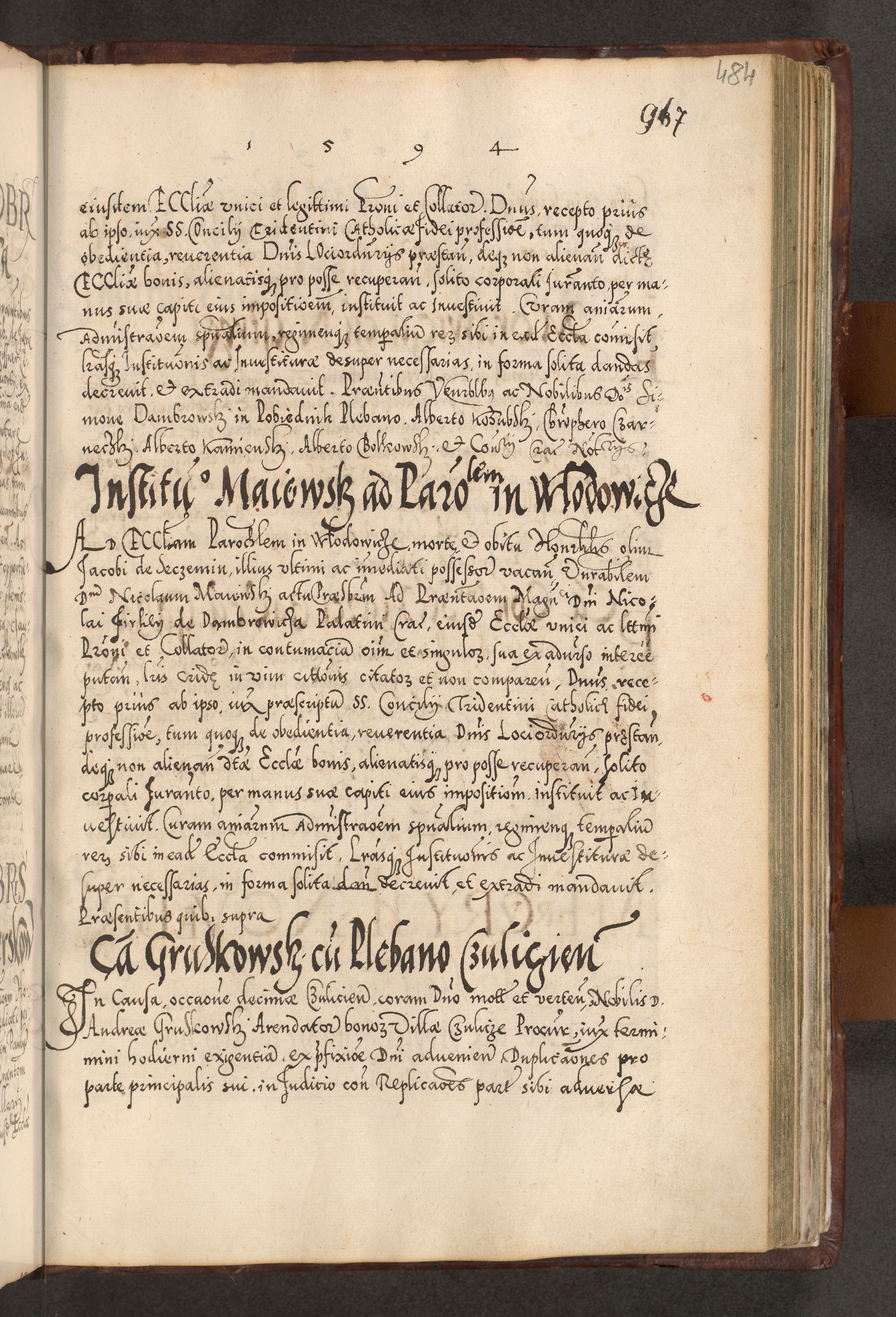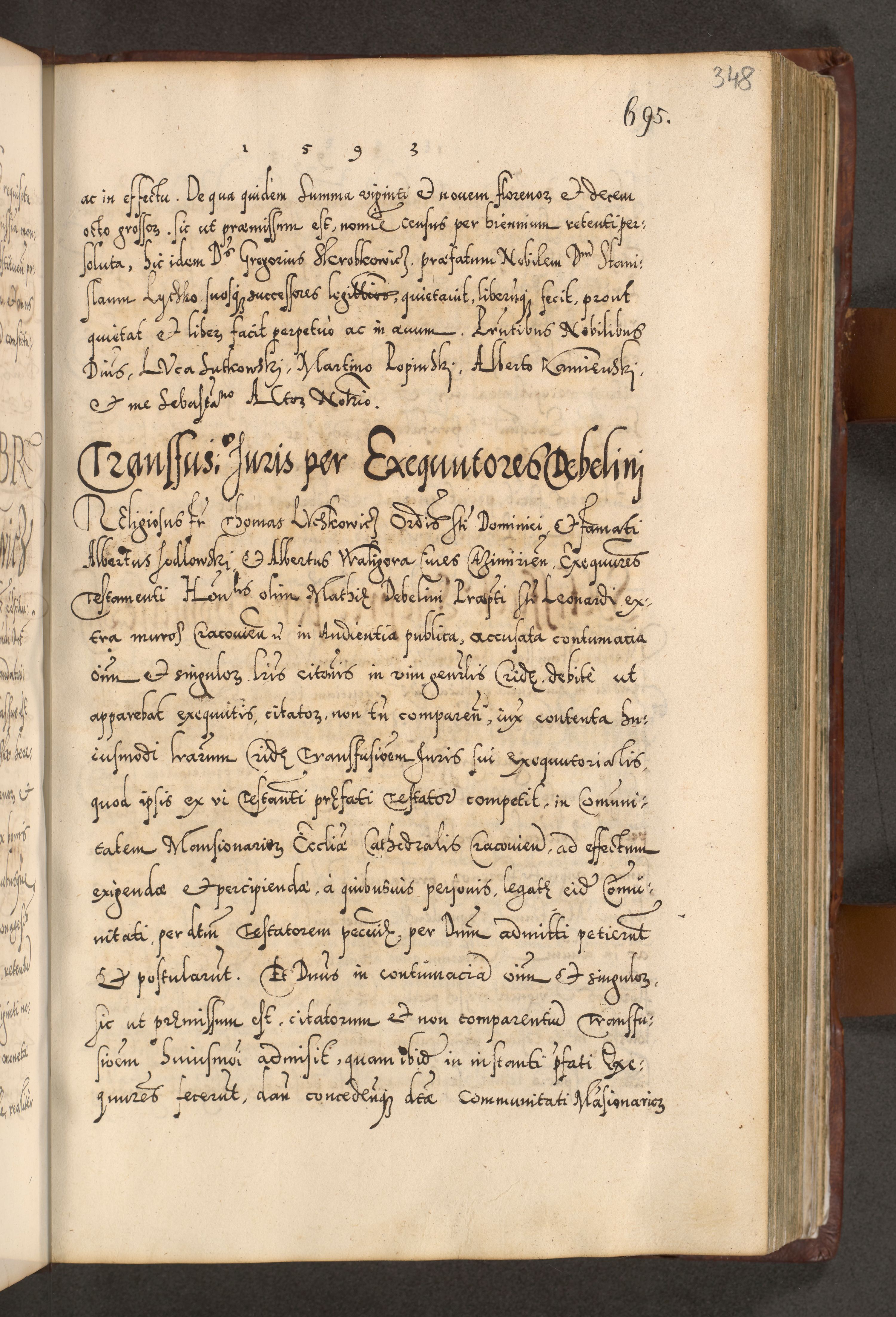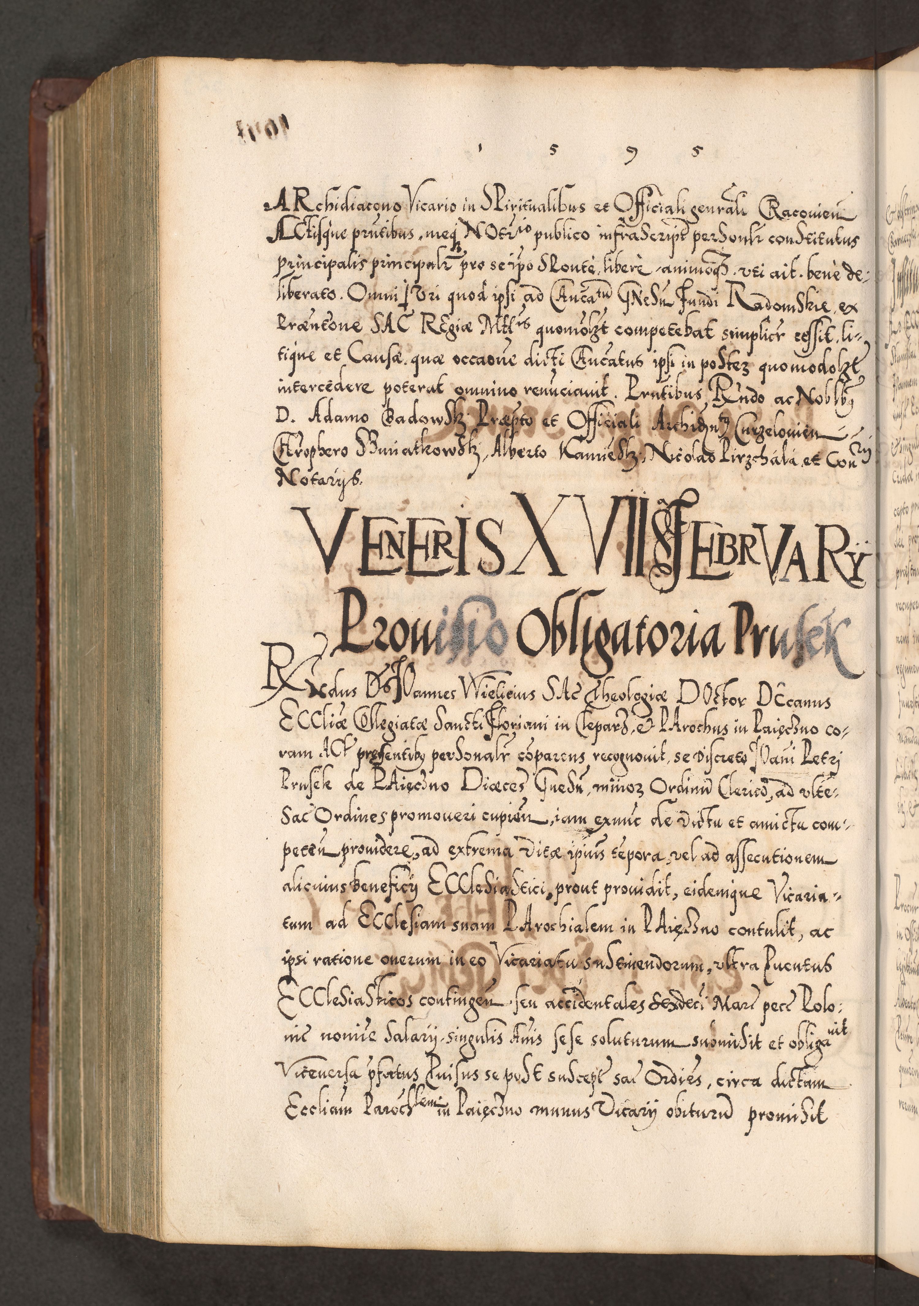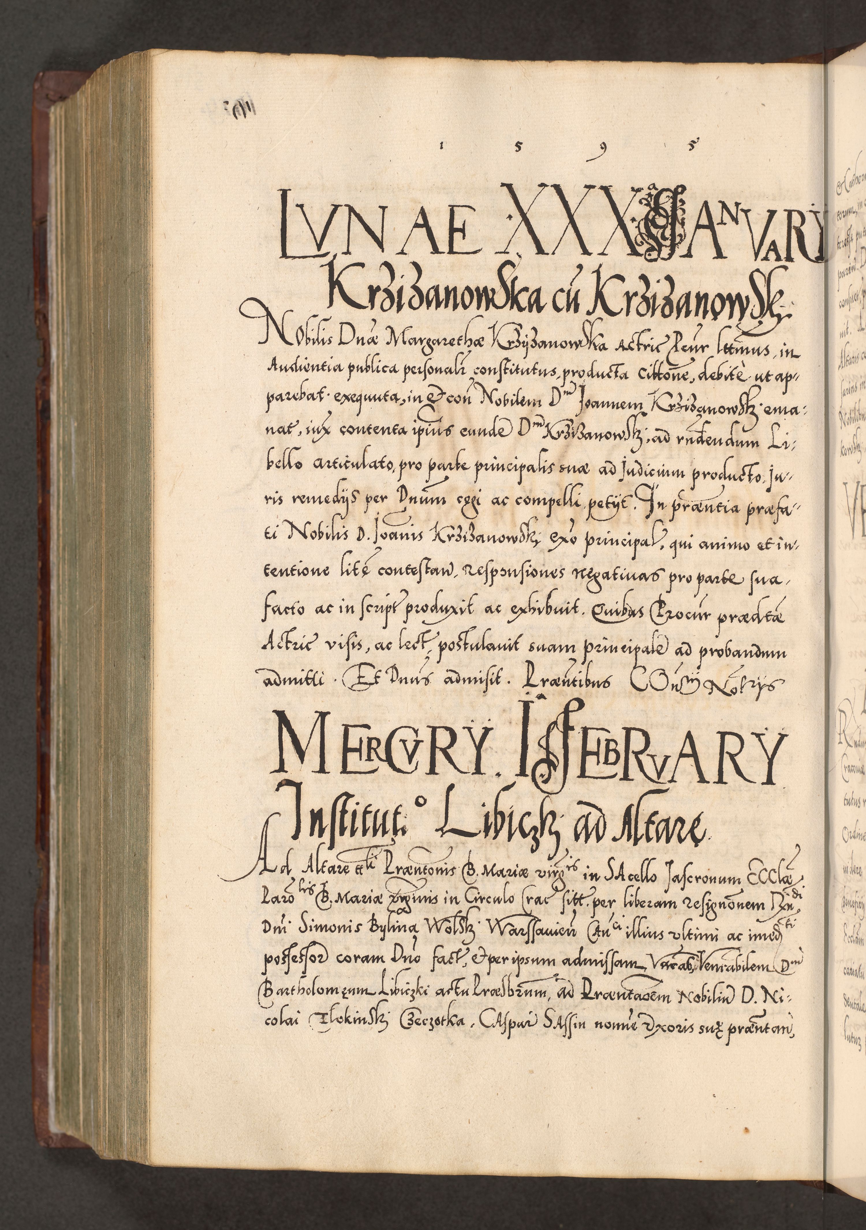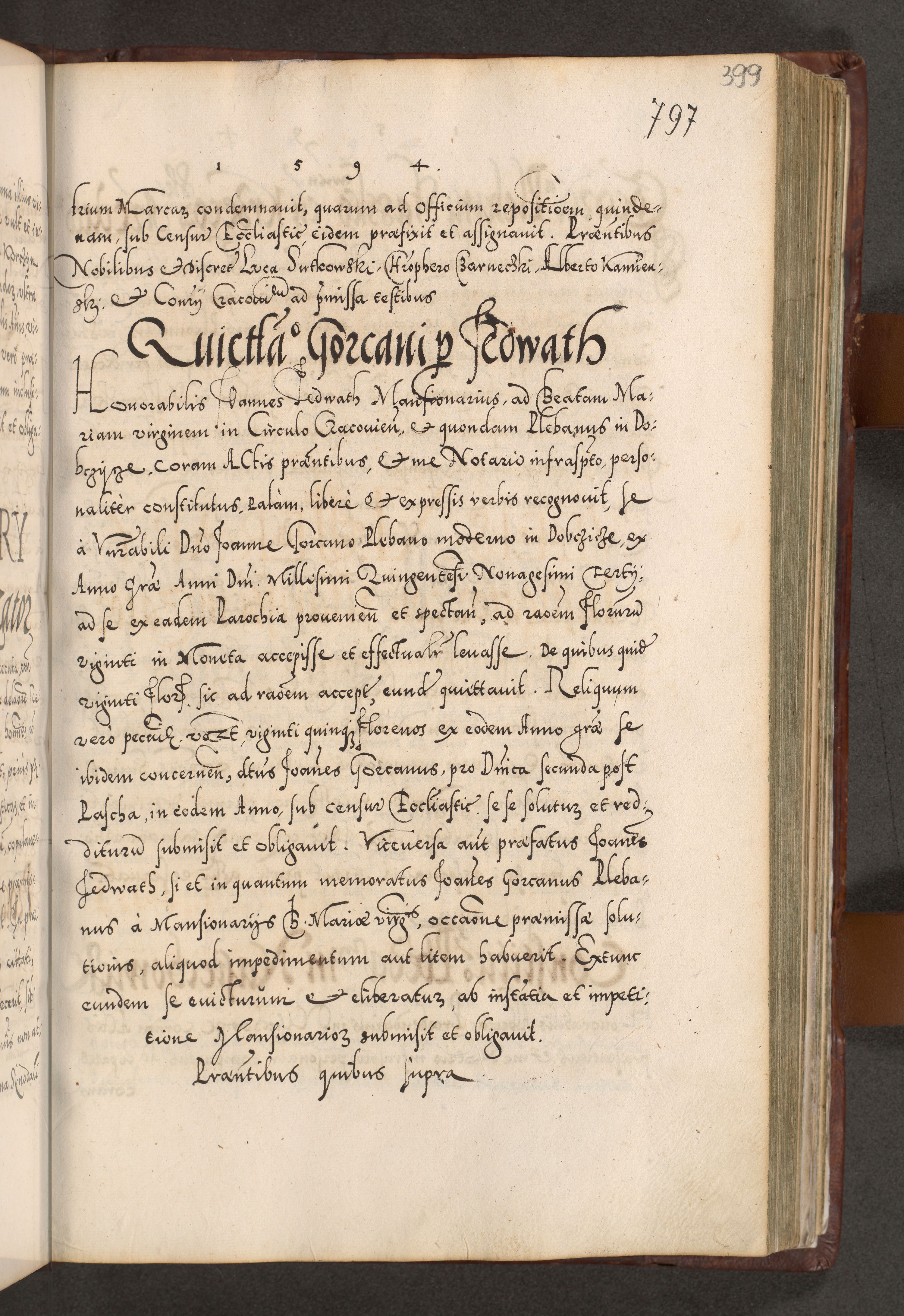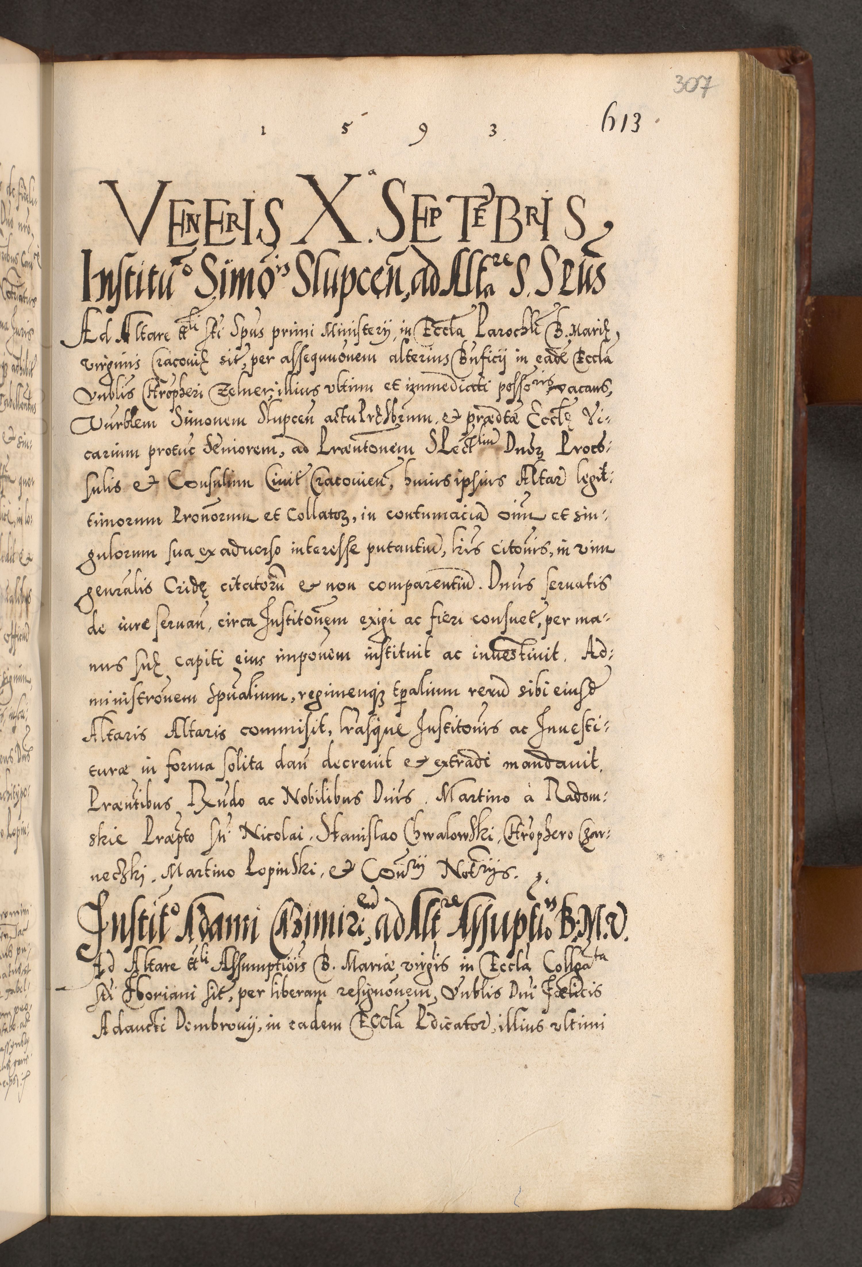 Illistrissimo et revedissimo in Christo Patre Domino Domino Georgio Rzadziwił Miserone Divina Sacrostae R. E. Tituli S. Sixti Presbitero Cardinali Duce in Olyka et Niesswiesz ad Gubernacula Ecclessiae Cracoviensis cuius administratorialem a Sancta Sede Apostolica obtinverat feliciter sedente. Acta actorum, causarum, sententiarum tam deffinitivarum quam interloquutoriarum decretorum, obligationum, quietationum, recognitionum, constitutionum procuratorum etc. coram Reverendo Domino Stanislao Crassinskz de Crasne Archidiacono Cracoviensis, Scholastico Gnesnesis, Custode Plocensis etc. Vicario et Officiali Generali Cracoviensi in Ano Domini Millesimo Quingentesimo Nonagesimo Primo cuius indictio quarta pontificatus SS. Domini Nostri Gregorii XIIII Anno I psius prio feliciter incipiut