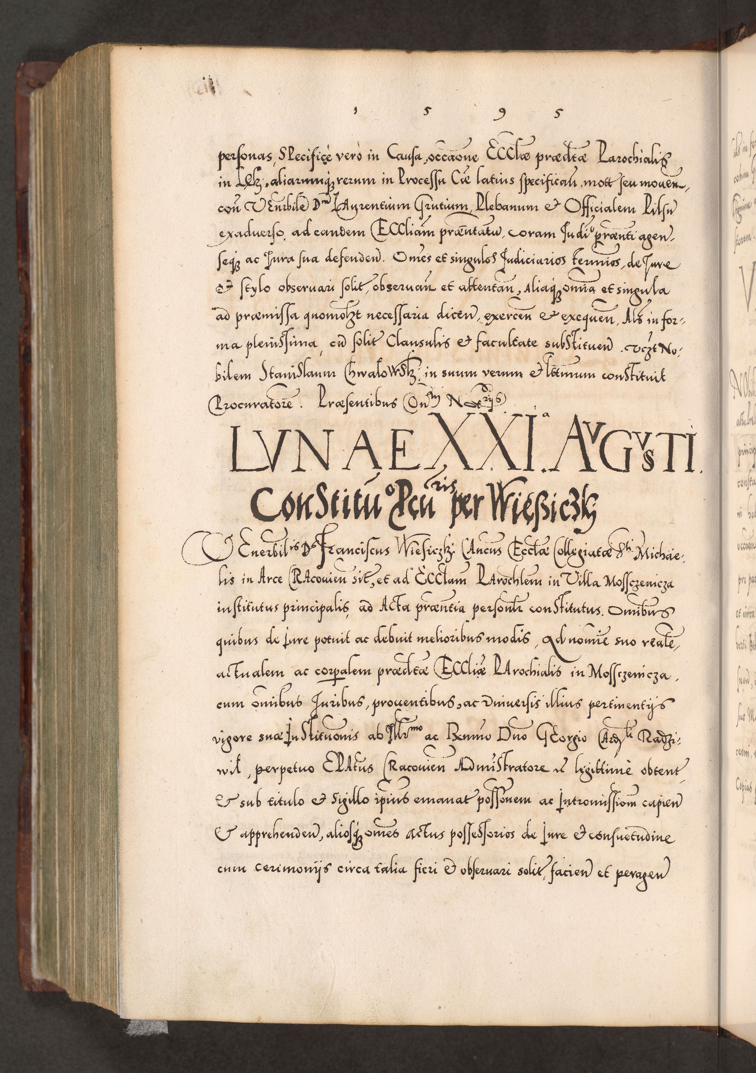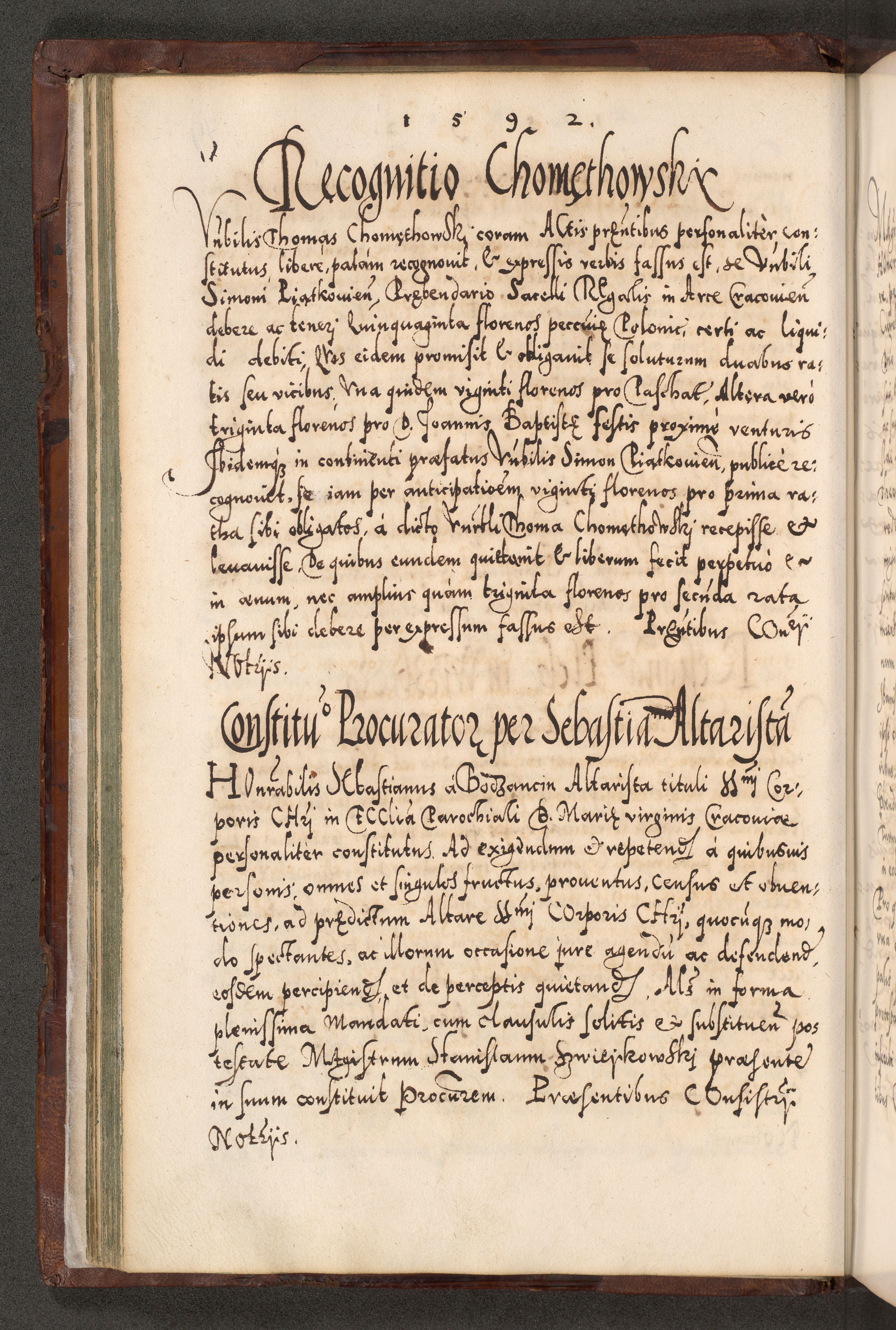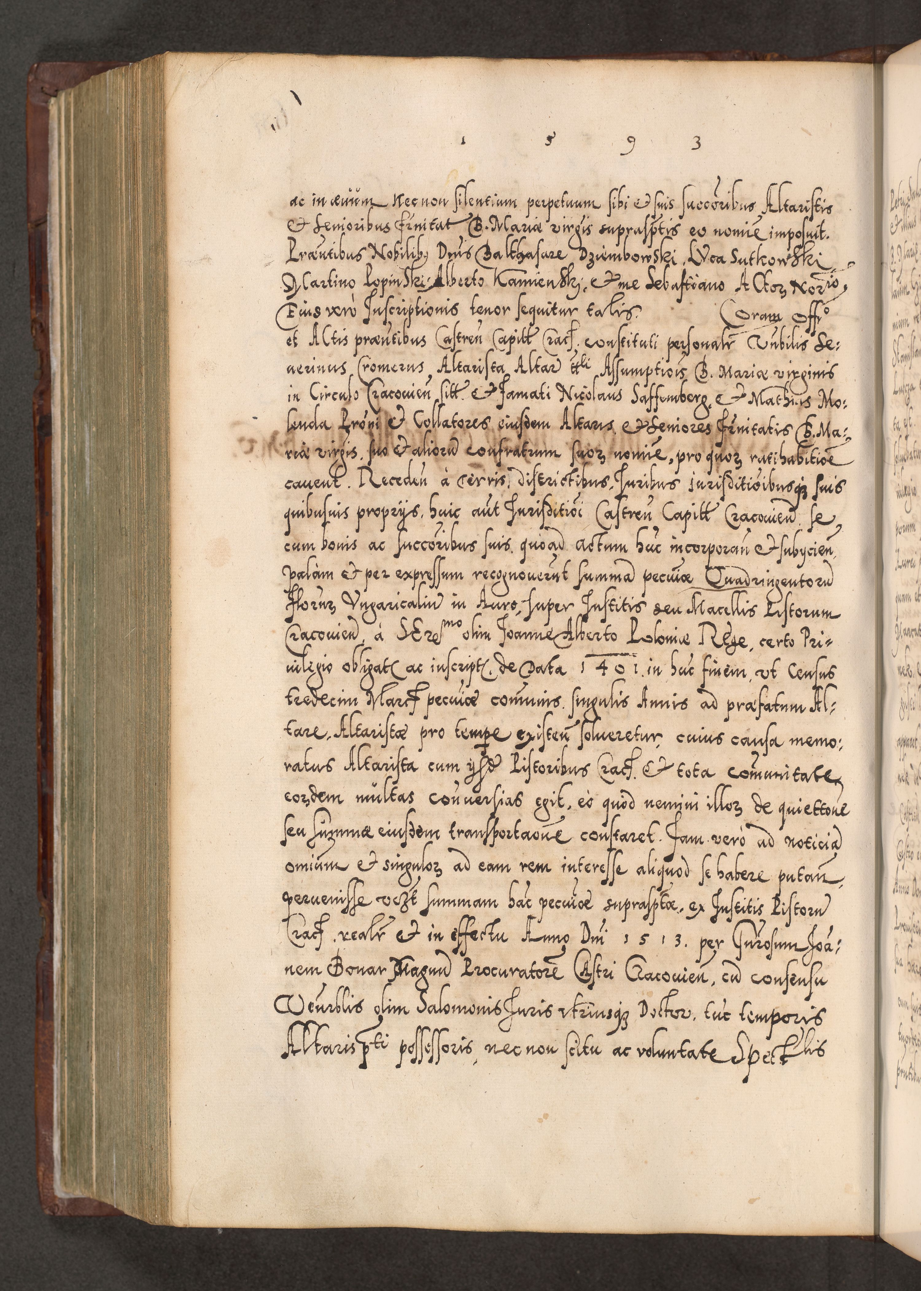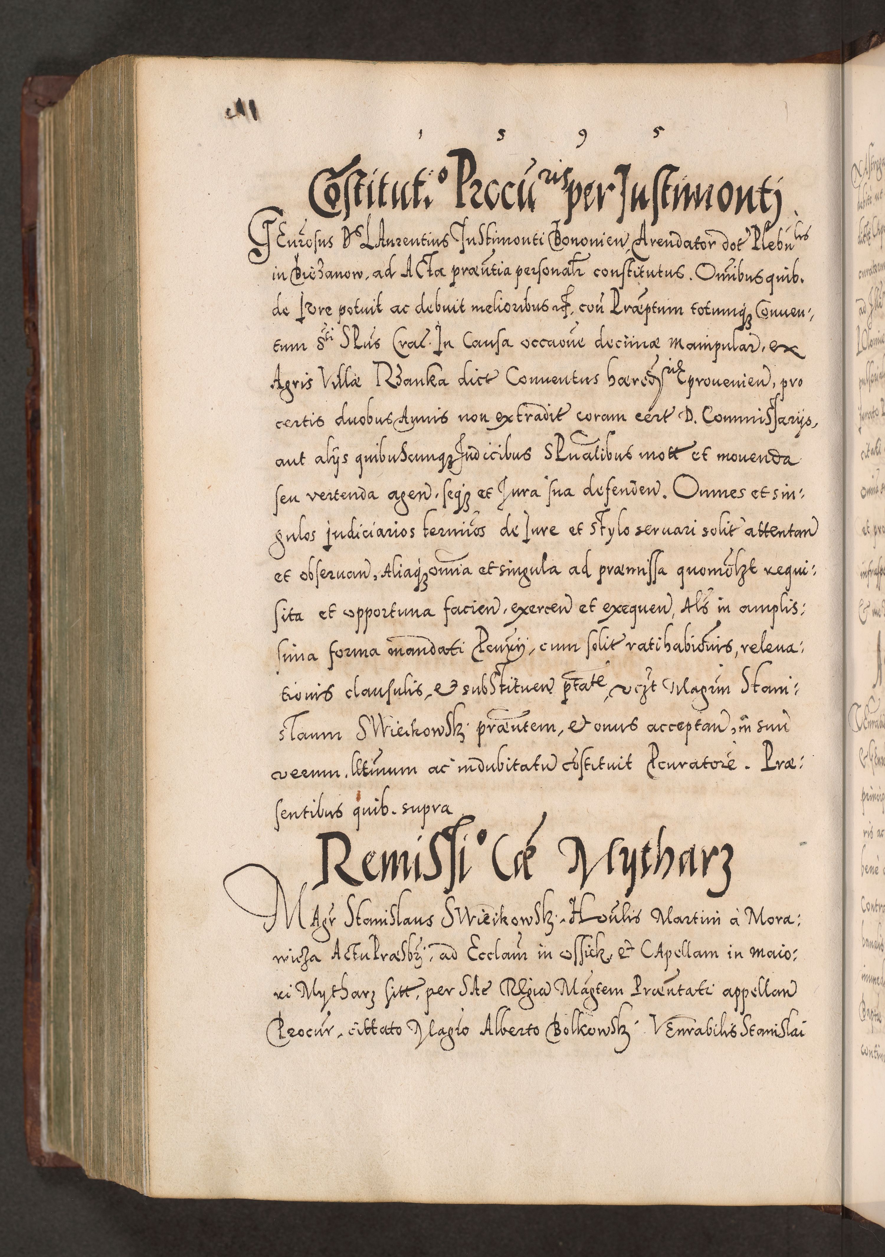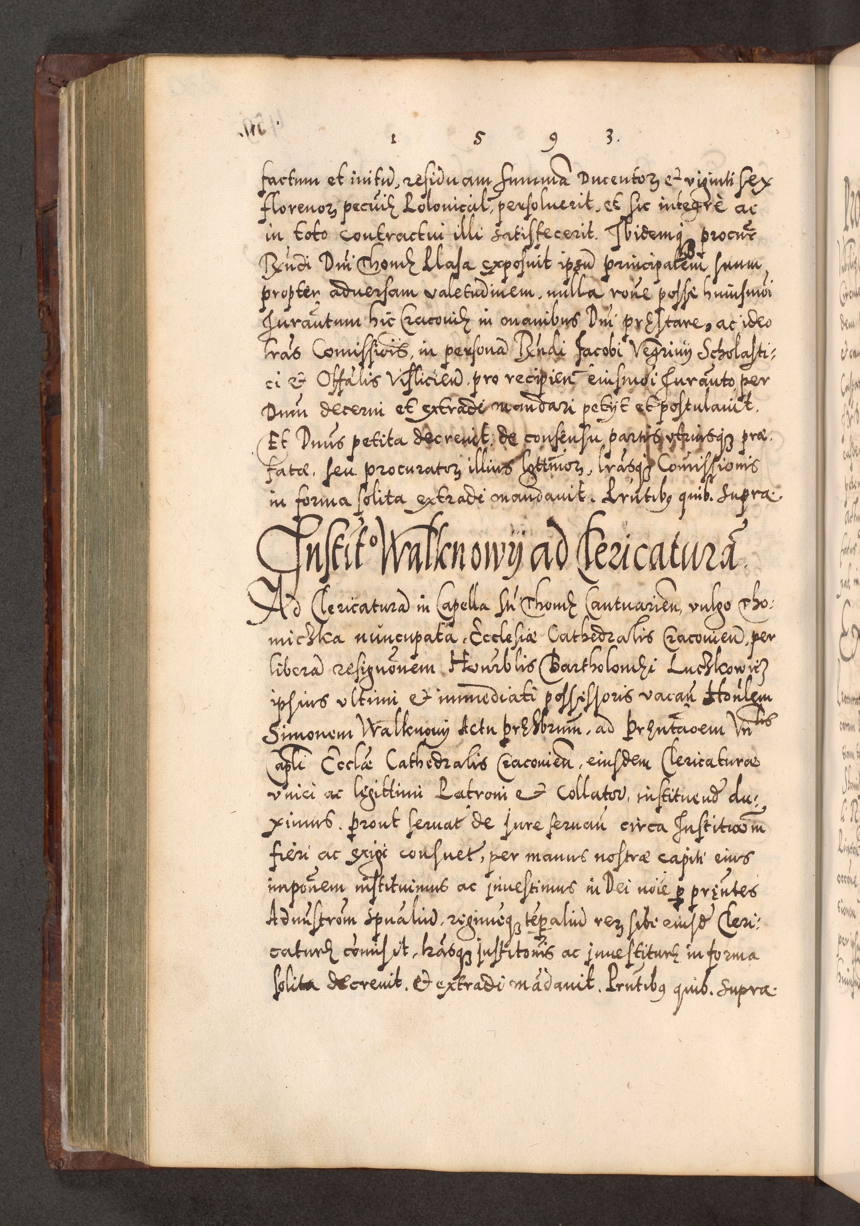 Illistrissimo et revedissimo in Christo Patre Domino Domino Georgio Rzadziwił Miserone Divina Sacrostae R. E. Tituli S. Sixti Presbitero Cardinali Duce in Olyka et Niesswiesz ad Gubernacula Ecclessiae Cracoviensis cuius administratorialem a Sancta Sede Apostolica obtinverat feliciter sedente. Acta actorum, causarum, sententiarum tam deffinitivarum quam interloquutoriarum decretorum, obligationum, quietationum, recognitionum, constitutionum procuratorum etc. coram Reverendo Domino Stanislao Crassinskz de Crasne Archidiacono Cracoviensis, Scholastico Gnesnesis, Custode Plocensis etc. Vicario et Officiali Generali Cracoviensi in Ano Domini Millesimo Quingentesimo Nonagesimo Primo cuius indictio quarta pontificatus SS. Domini Nostri Gregorii XIIII Anno I psius prio feliciter incipiut