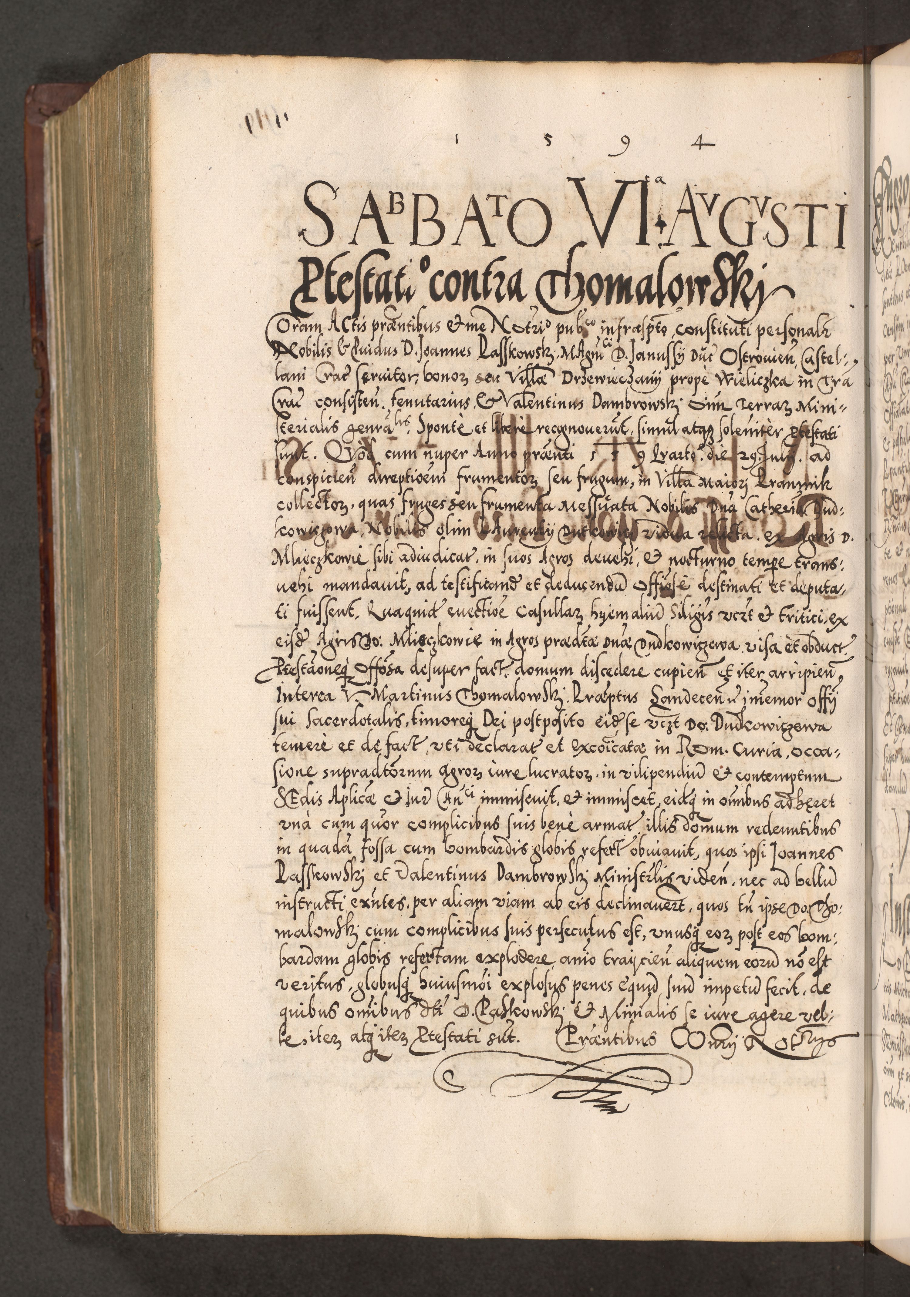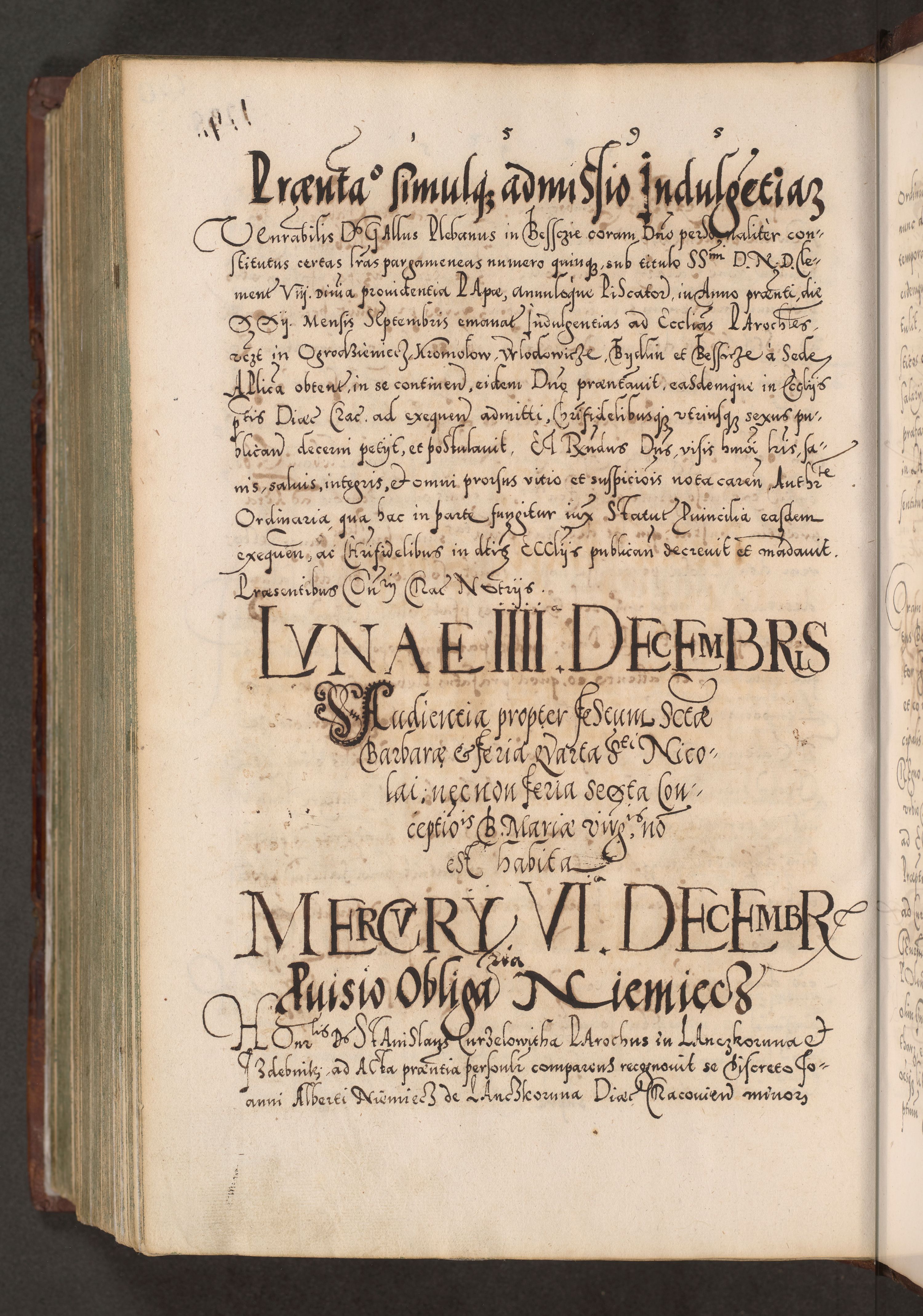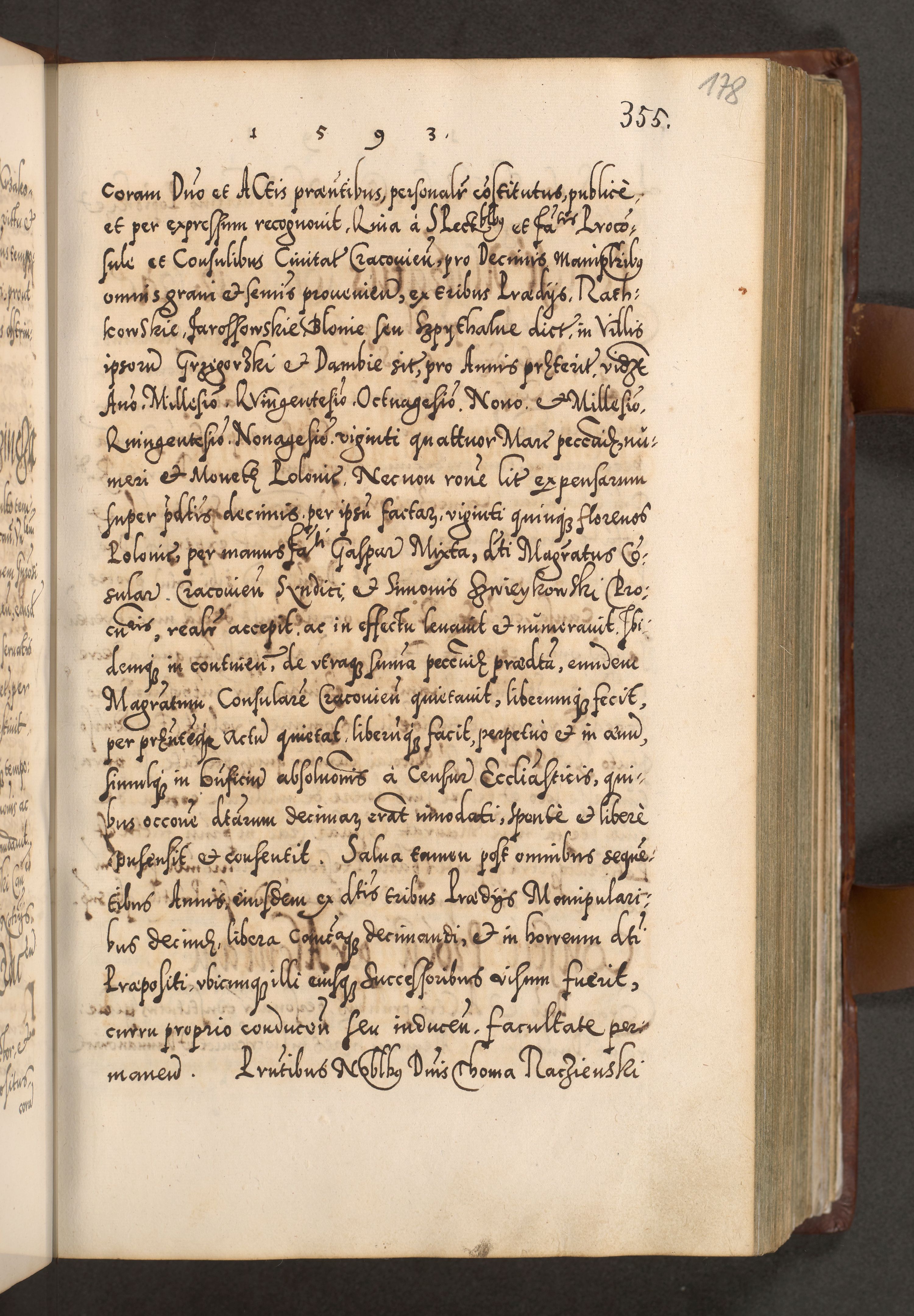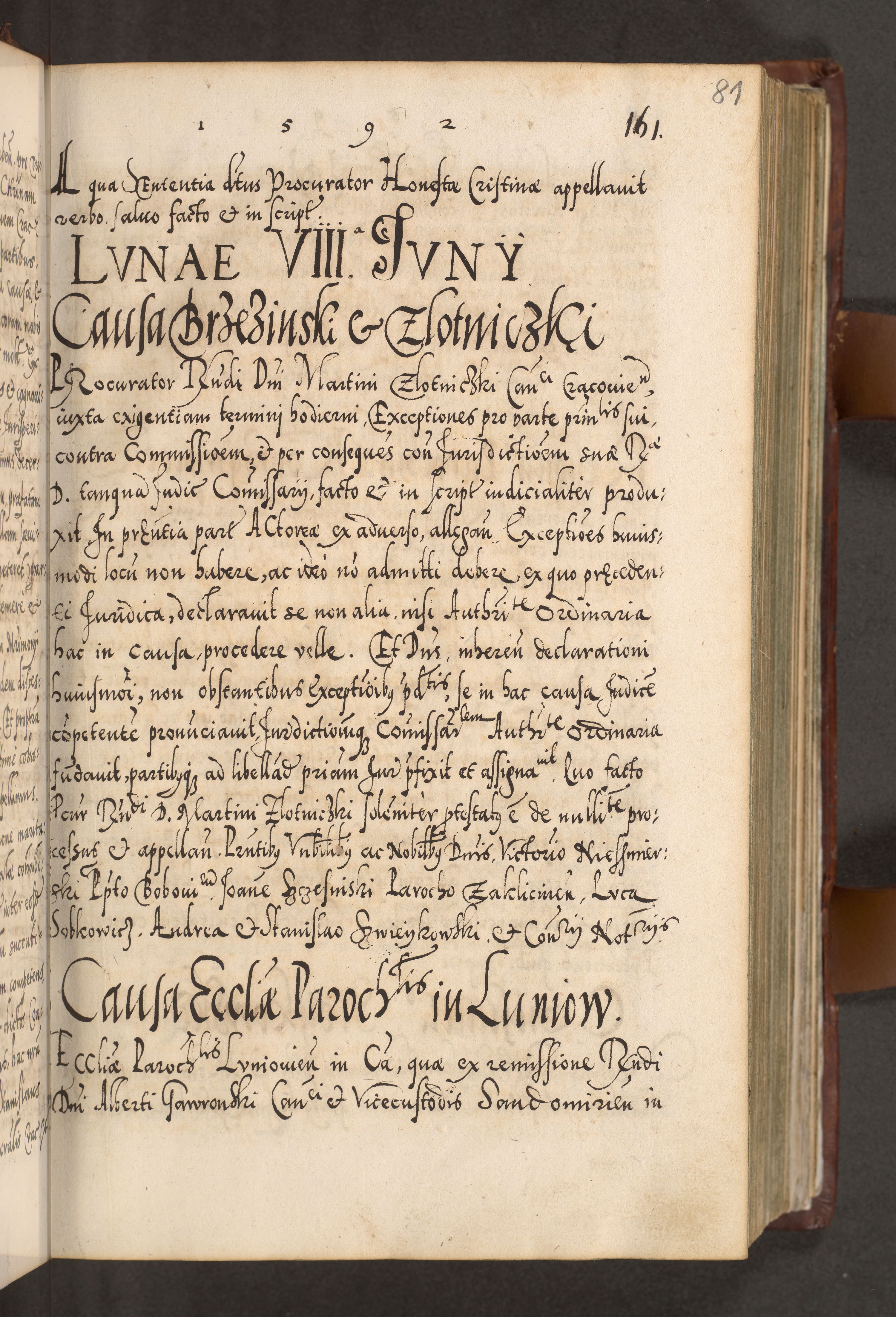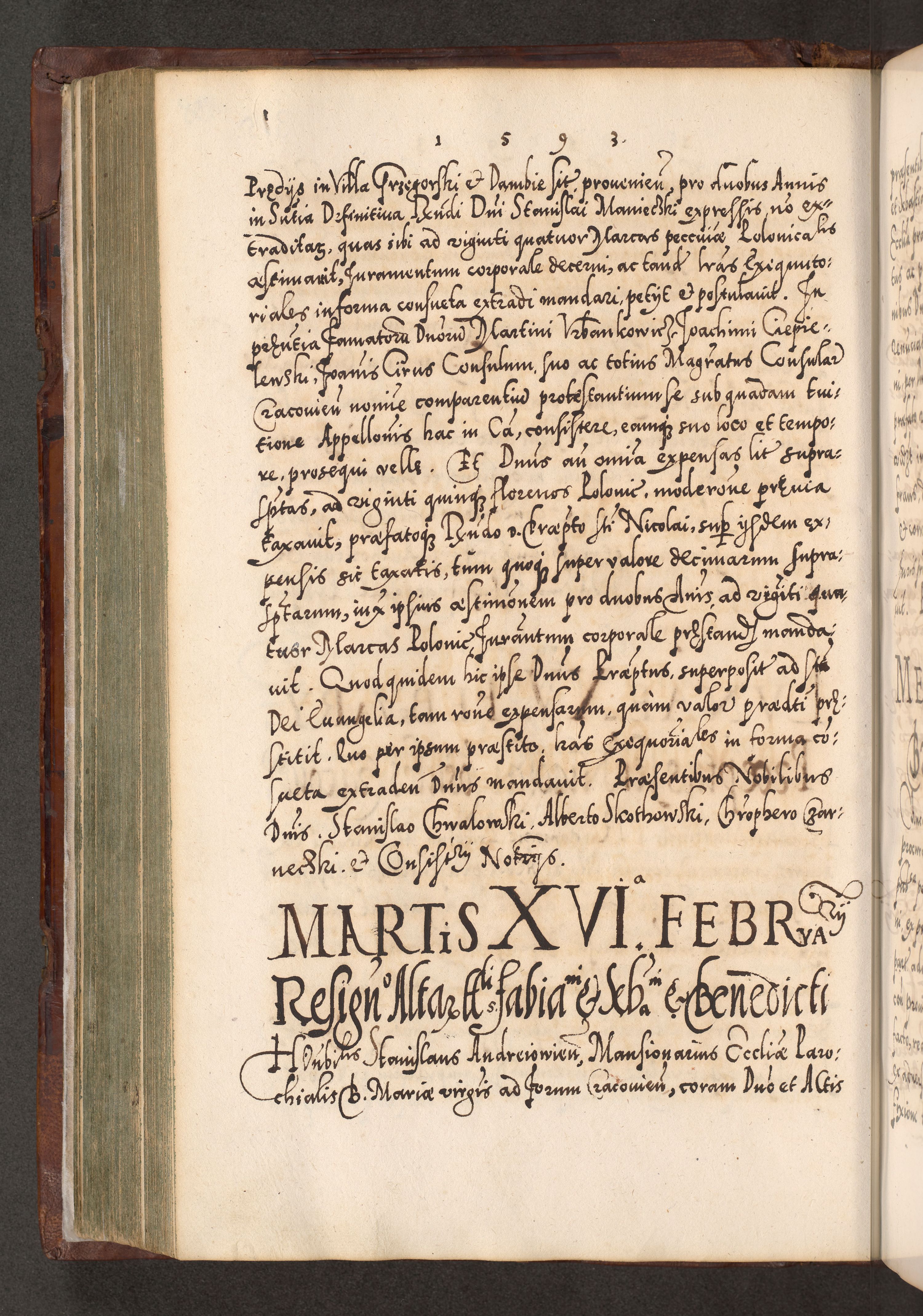 Illistrissimo et revedissimo in Christo Patre Domino Domino Georgio Rzadziwił Miserone Divina Sacrostae R. E. Tituli S. Sixti Presbitero Cardinali Duce in Olyka et Niesswiesz ad Gubernacula Ecclessiae Cracoviensis cuius administratorialem a Sancta Sede Apostolica obtinverat feliciter sedente. Acta actorum, causarum, sententiarum tam deffinitivarum quam interloquutoriarum decretorum, obligationum, quietationum, recognitionum, constitutionum procuratorum etc. coram Reverendo Domino Stanislao Crassinskz de Crasne Archidiacono Cracoviensis, Scholastico Gnesnesis, Custode Plocensis etc. Vicario et Officiali Generali Cracoviensi in Ano Domini Millesimo Quingentesimo Nonagesimo Primo cuius indictio quarta pontificatus SS. Domini Nostri Gregorii XIIII Anno I psius prio feliciter incipiut