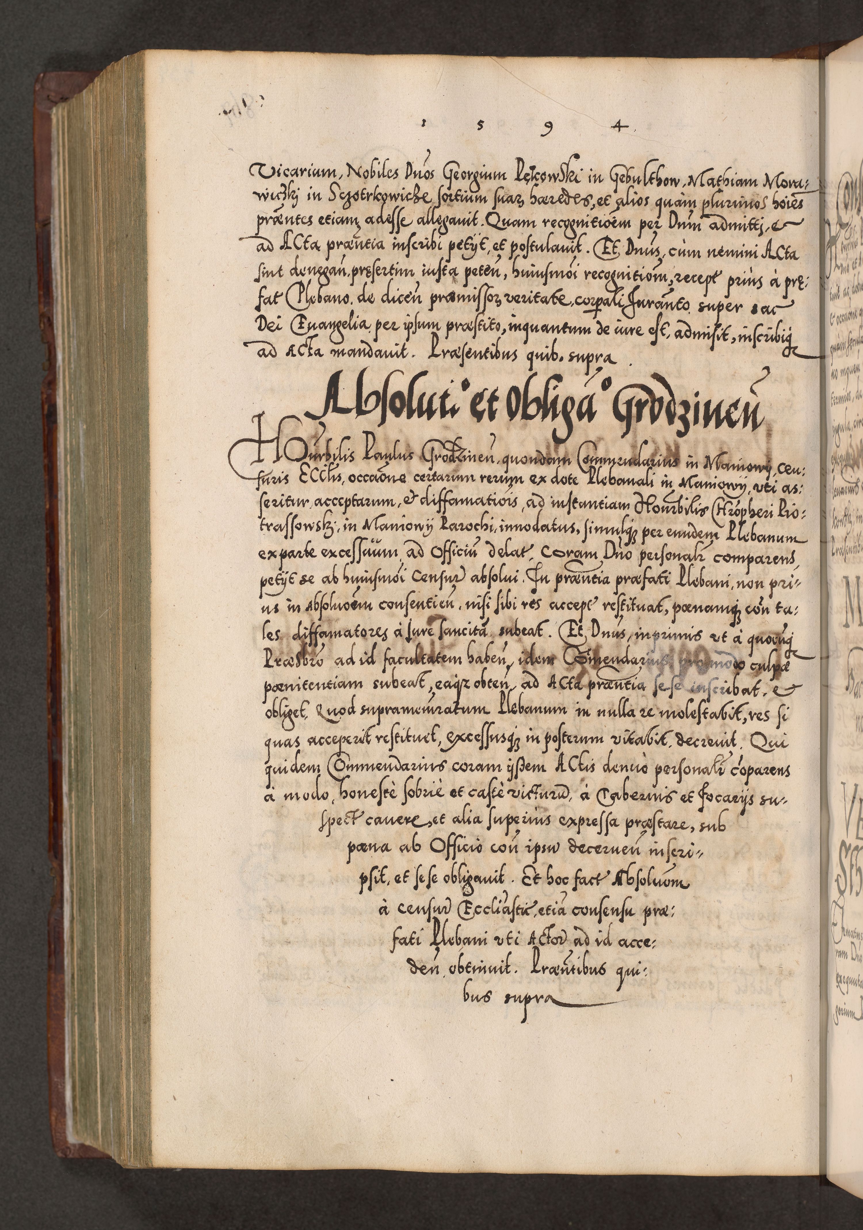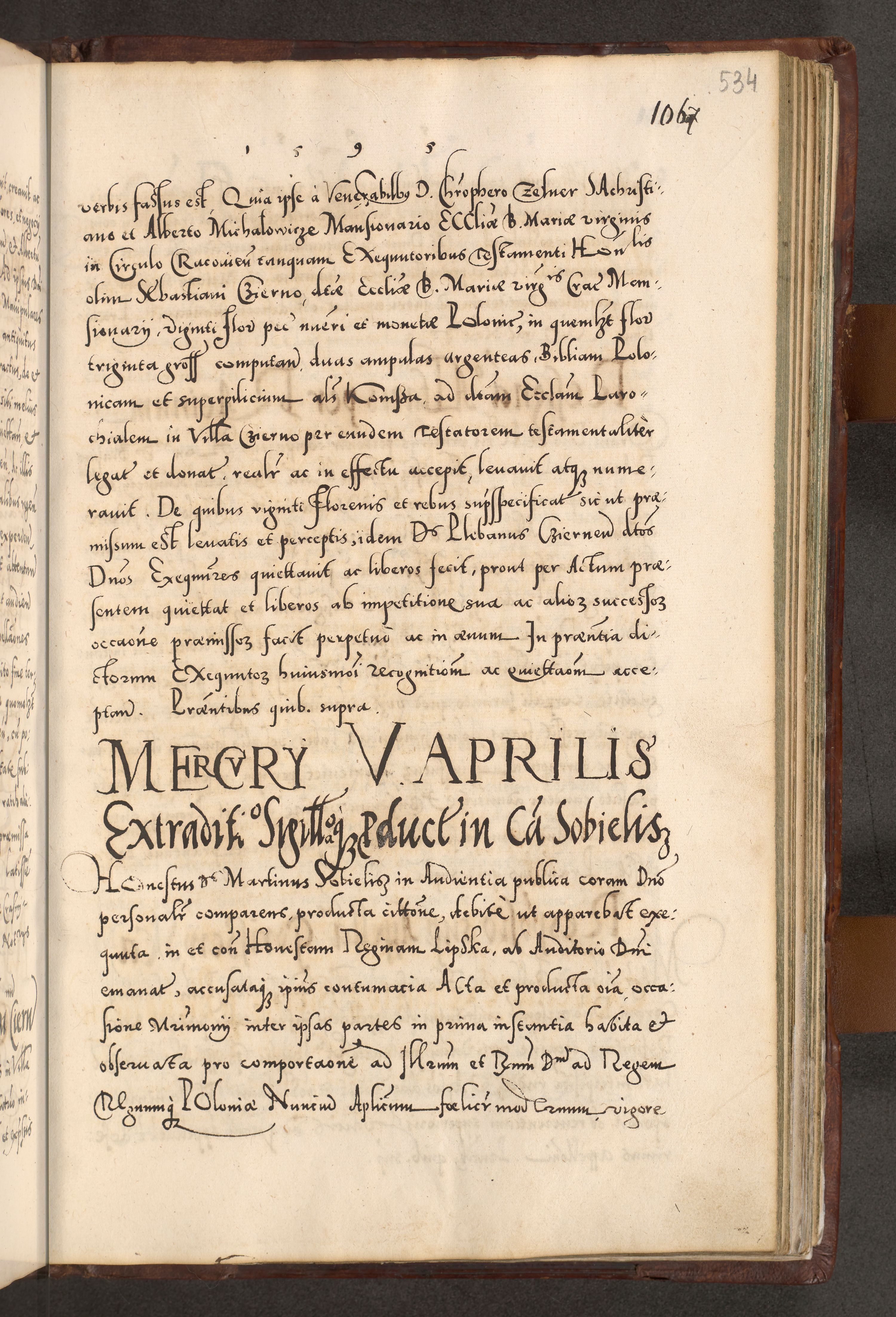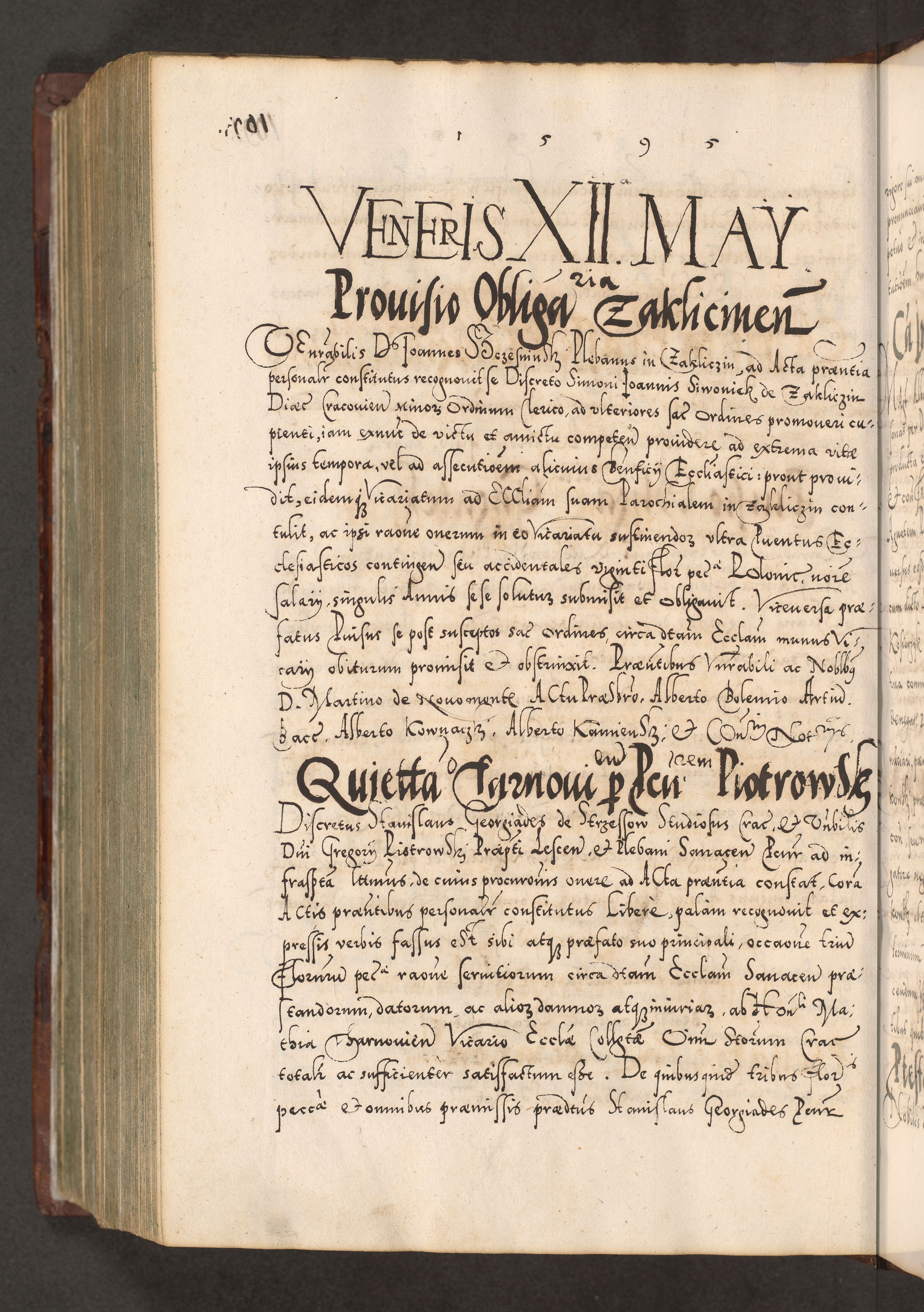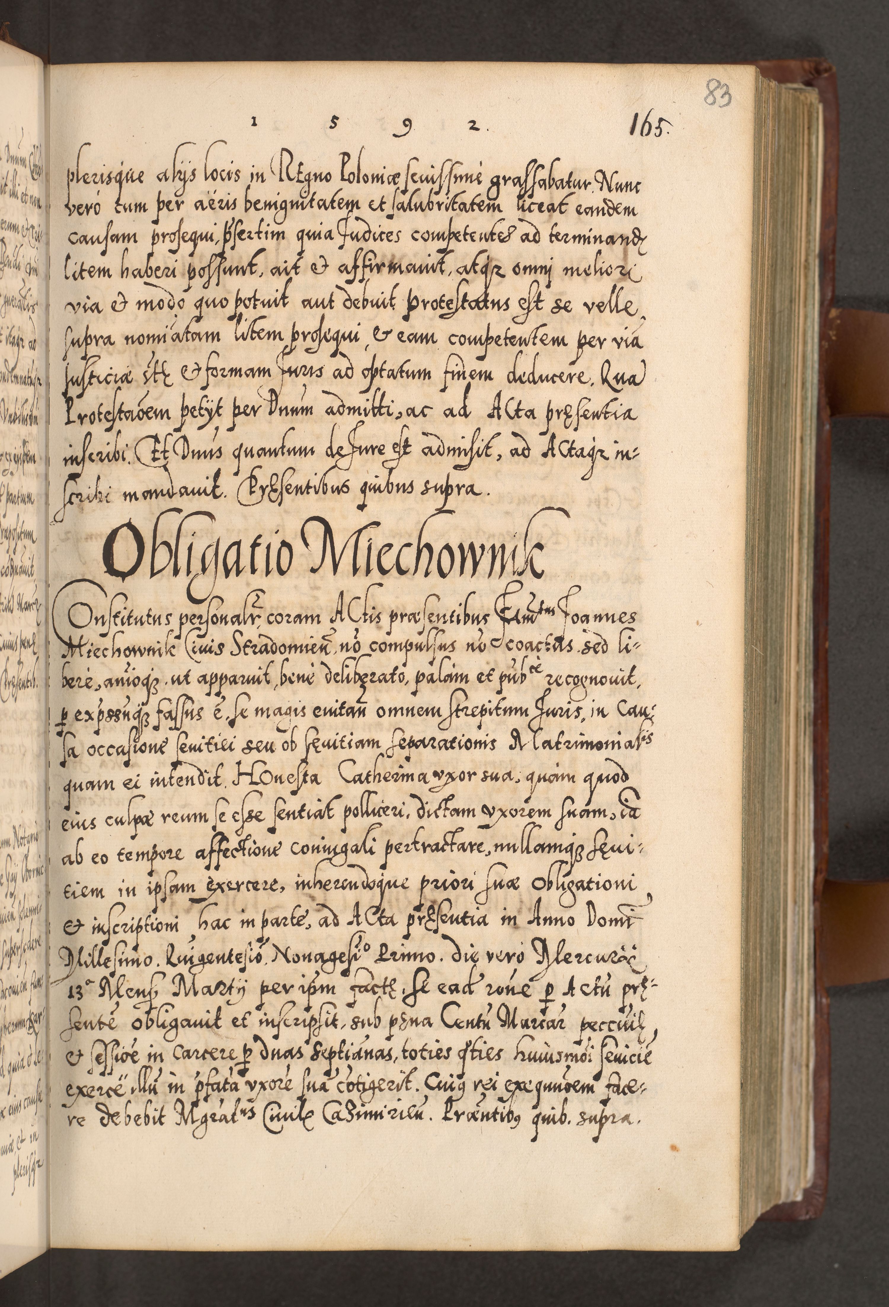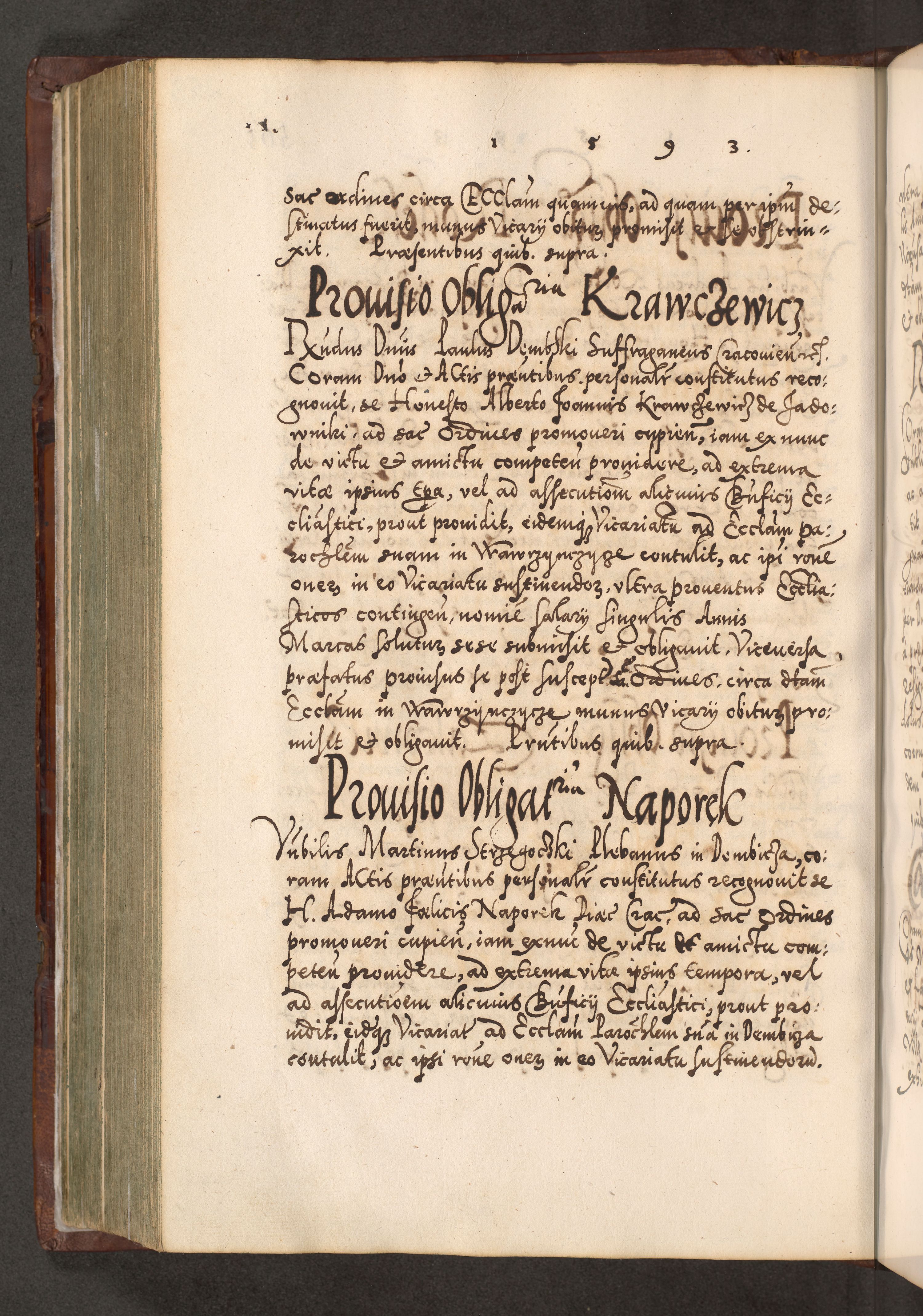 Illistrissimo et revedissimo in Christo Patre Domino Domino Georgio Rzadziwił Miserone Divina Sacrostae R. E. Tituli S. Sixti Presbitero Cardinali Duce in Olyka et Niesswiesz ad Gubernacula Ecclessiae Cracoviensis cuius administratorialem a Sancta Sede Apostolica obtinverat feliciter sedente. Acta actorum, causarum, sententiarum tam deffinitivarum quam interloquutoriarum decretorum, obligationum, quietationum, recognitionum, constitutionum procuratorum etc. coram Reverendo Domino Stanislao Crassinskz de Crasne Archidiacono Cracoviensis, Scholastico Gnesnesis, Custode Plocensis etc. Vicario et Officiali Generali Cracoviensi in Ano Domini Millesimo Quingentesimo Nonagesimo Primo cuius indictio quarta pontificatus SS. Domini Nostri Gregorii XIIII Anno I psius prio feliciter incipiut