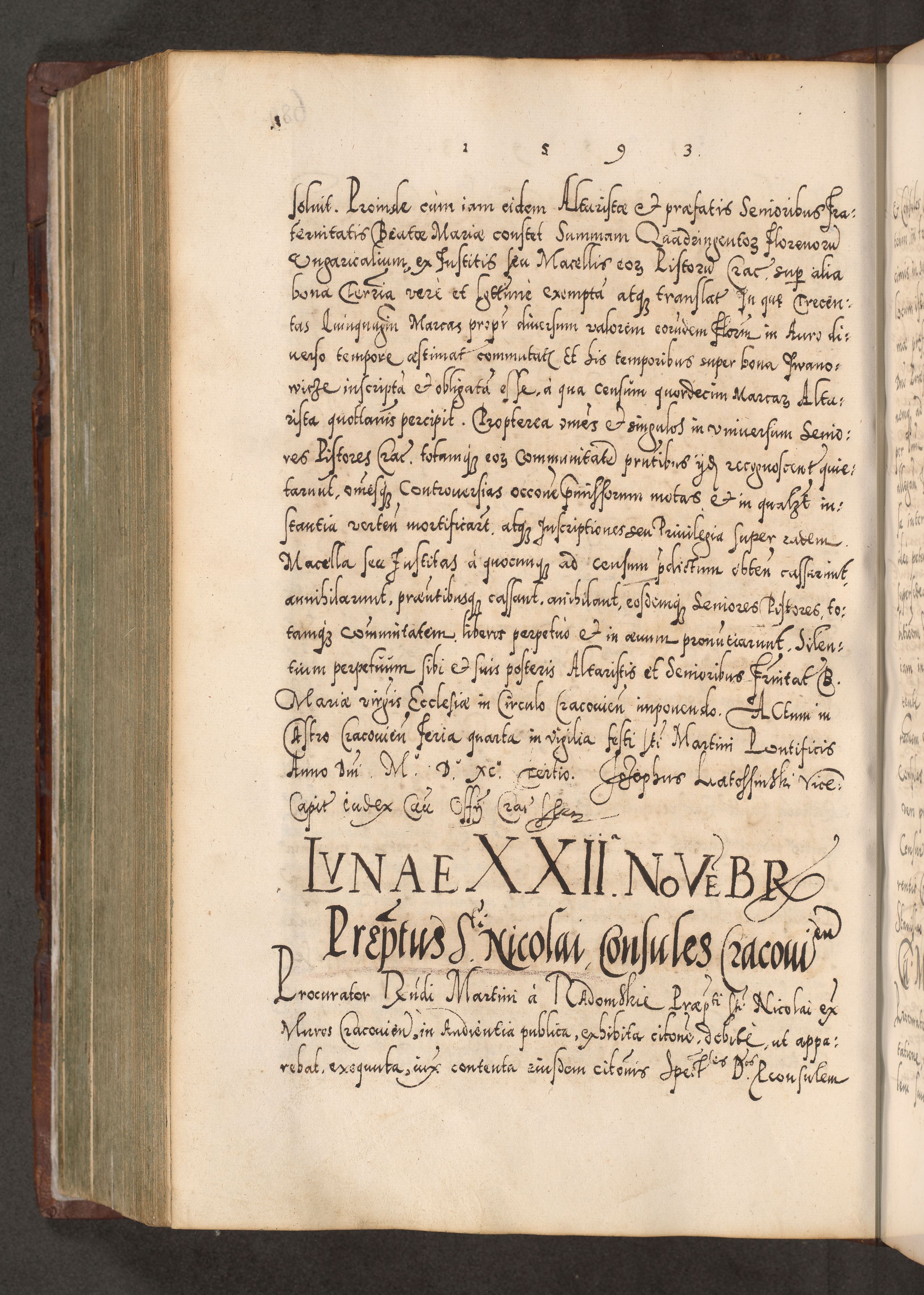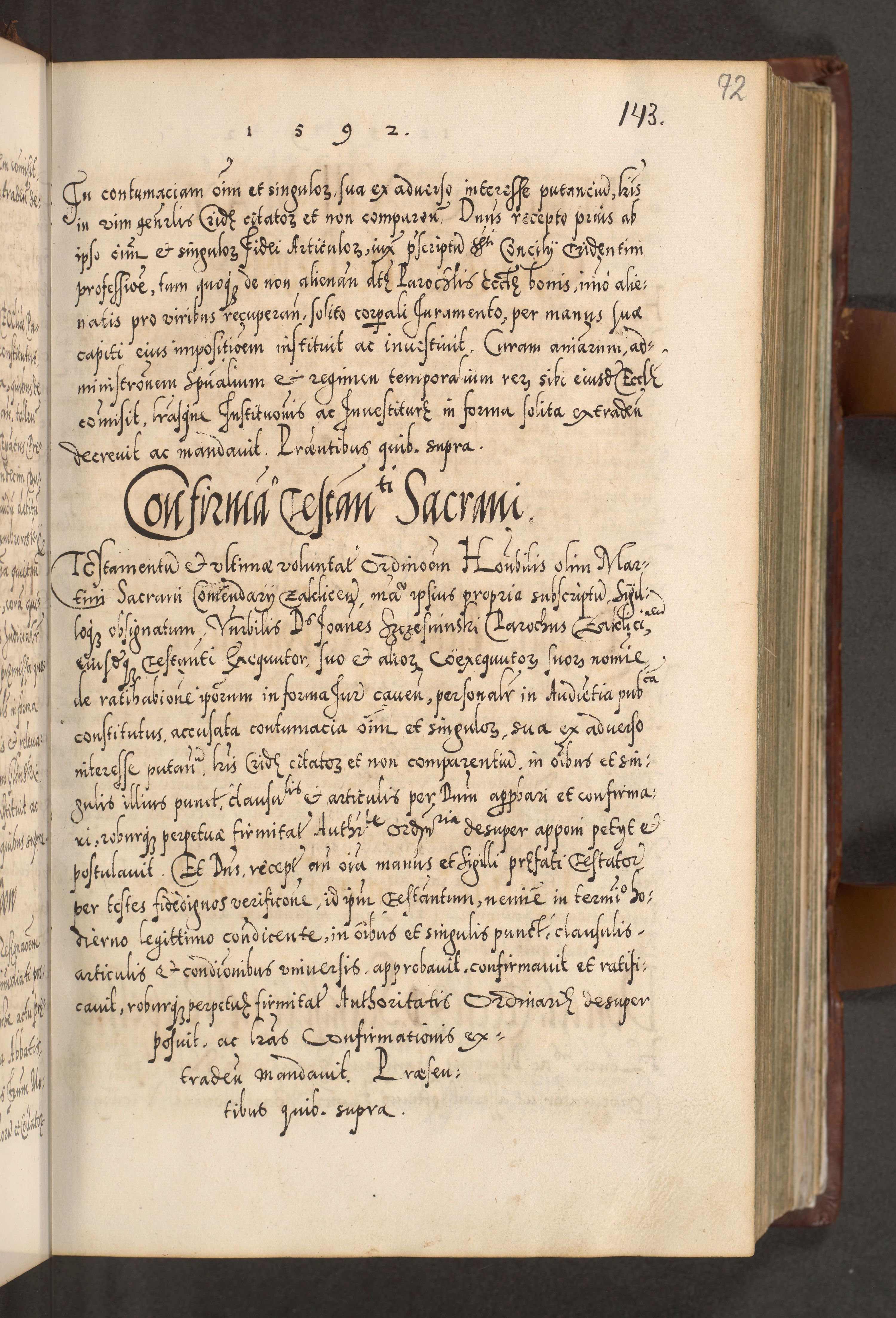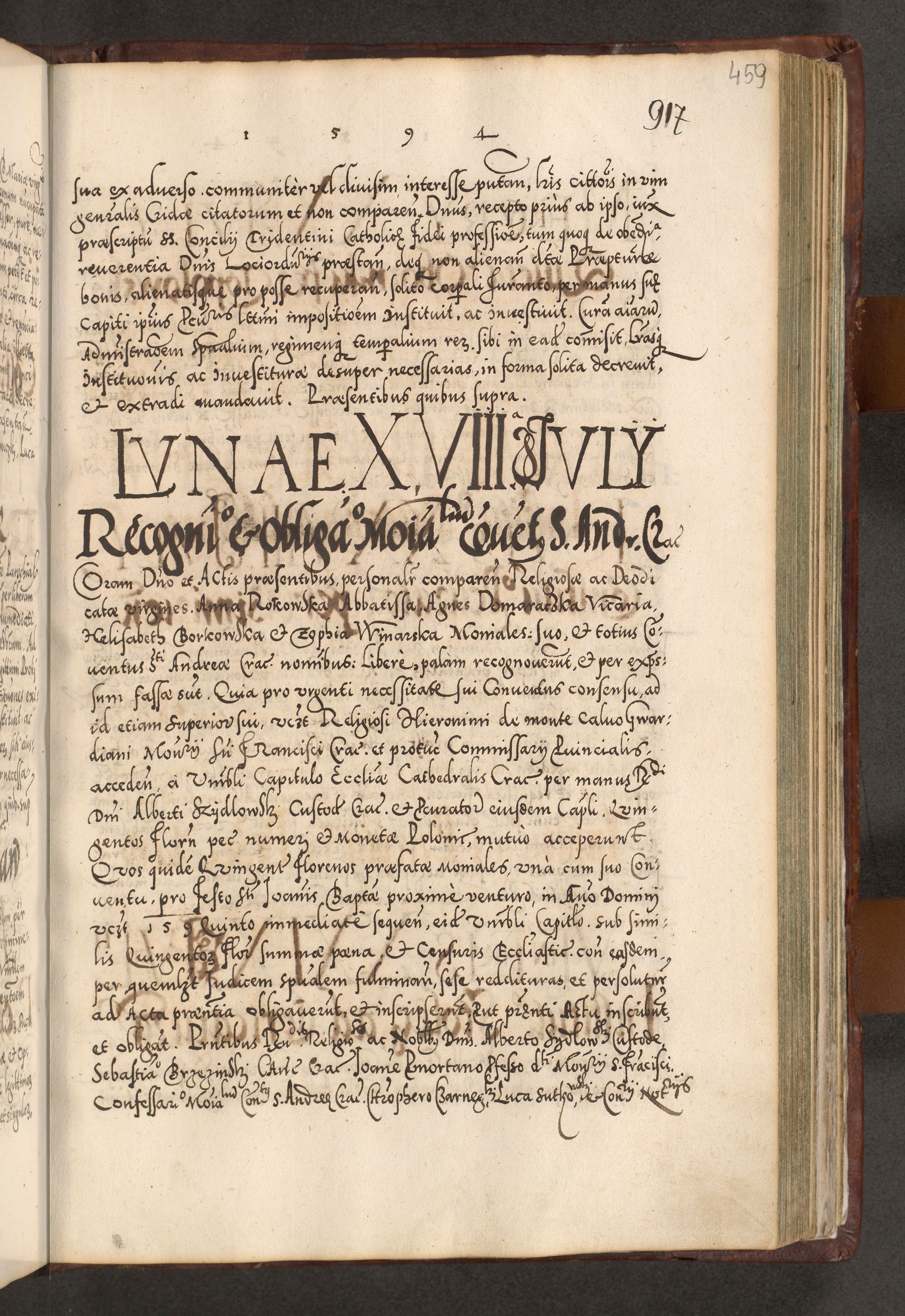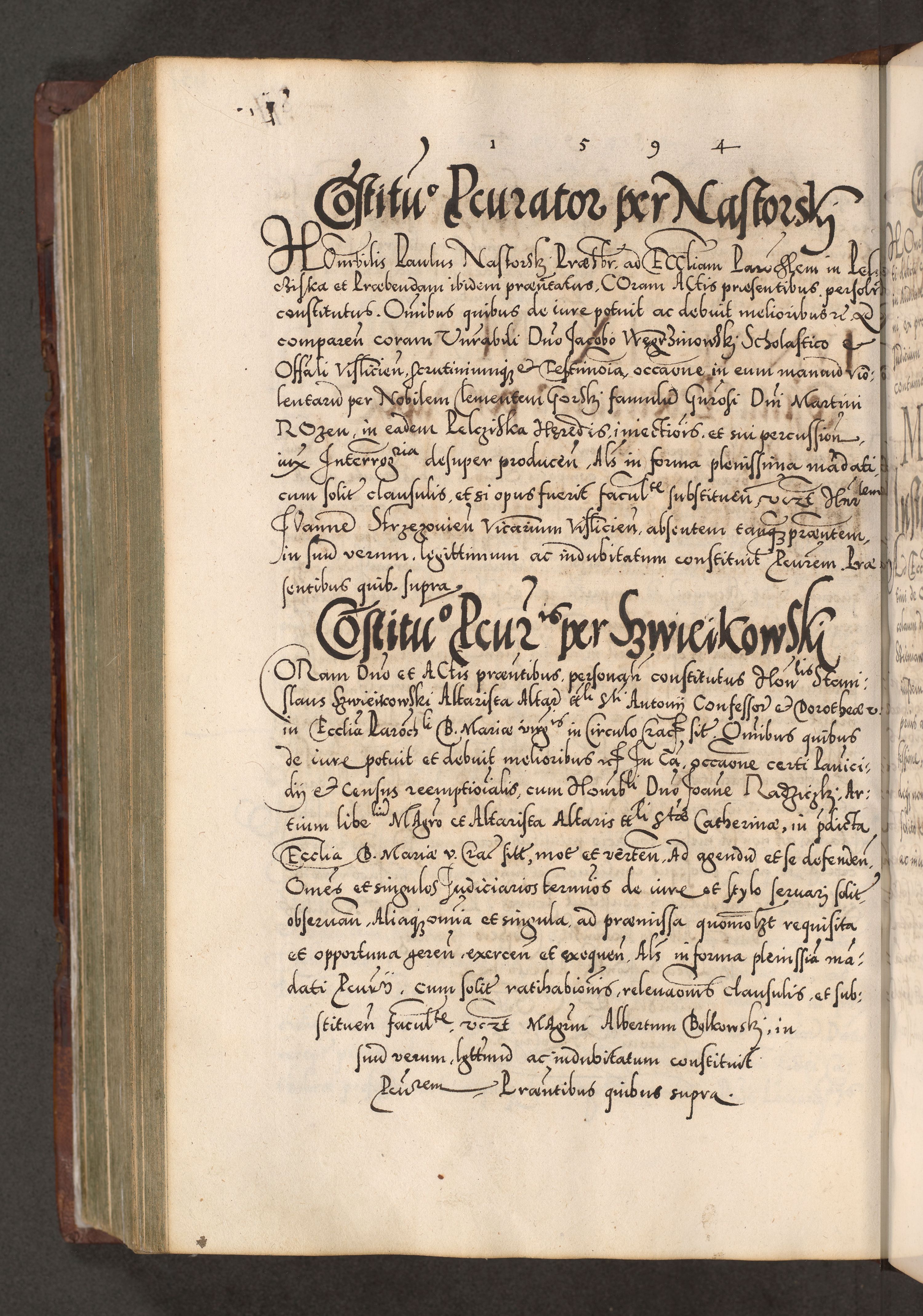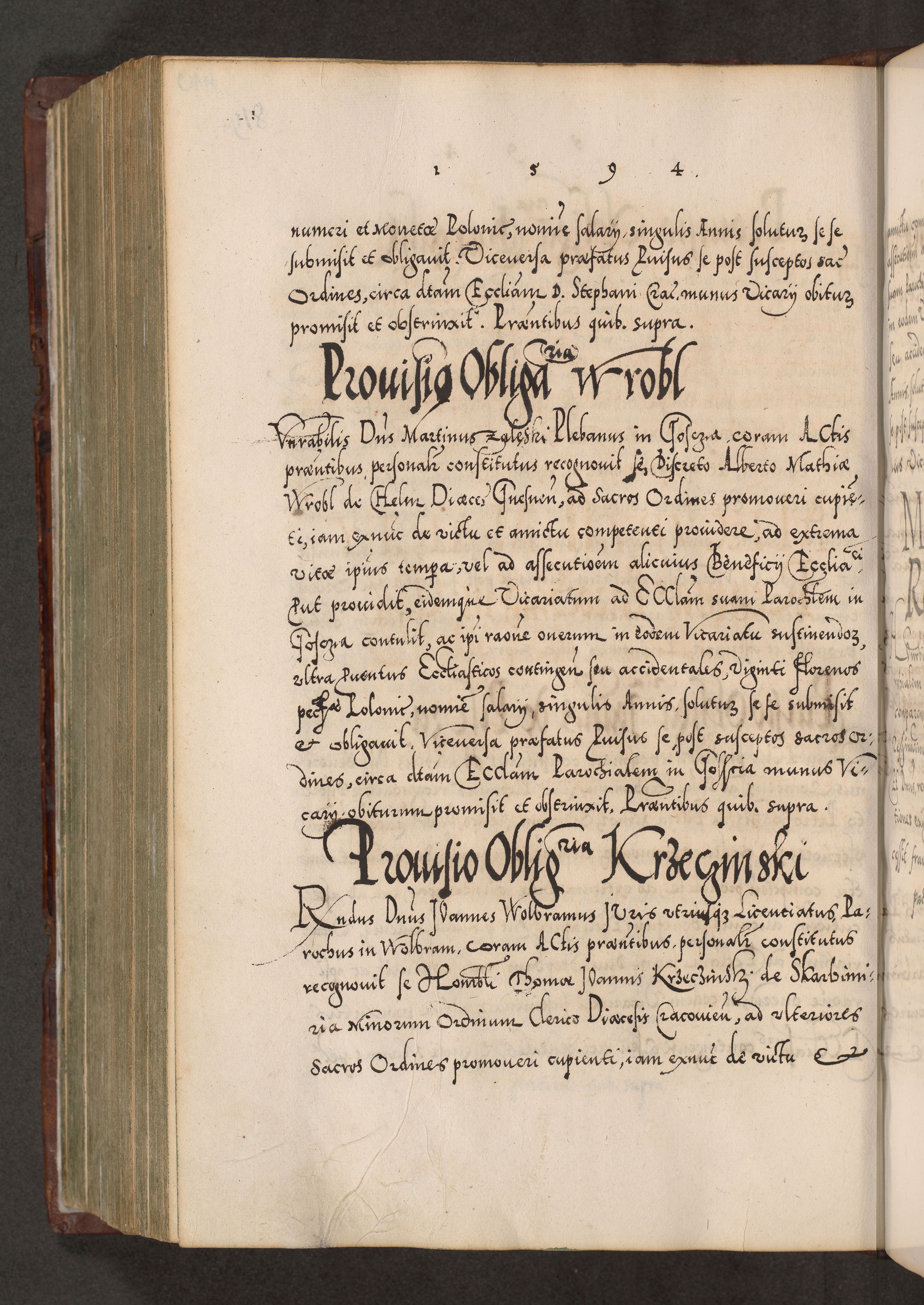 Illistrissimo et revedissimo in Christo Patre Domino Domino Georgio Rzadziwił Miserone Divina Sacrostae R. E. Tituli S. Sixti Presbitero Cardinali Duce in Olyka et Niesswiesz ad Gubernacula Ecclessiae Cracoviensis cuius administratorialem a Sancta Sede Apostolica obtinverat feliciter sedente. Acta actorum, causarum, sententiarum tam deffinitivarum quam interloquutoriarum decretorum, obligationum, quietationum, recognitionum, constitutionum procuratorum etc. coram Reverendo Domino Stanislao Crassinskz de Crasne Archidiacono Cracoviensis, Scholastico Gnesnesis, Custode Plocensis etc. Vicario et Officiali Generali Cracoviensi in Ano Domini Millesimo Quingentesimo Nonagesimo Primo cuius indictio quarta pontificatus SS. Domini Nostri Gregorii XIIII Anno I psius prio feliciter incipiut