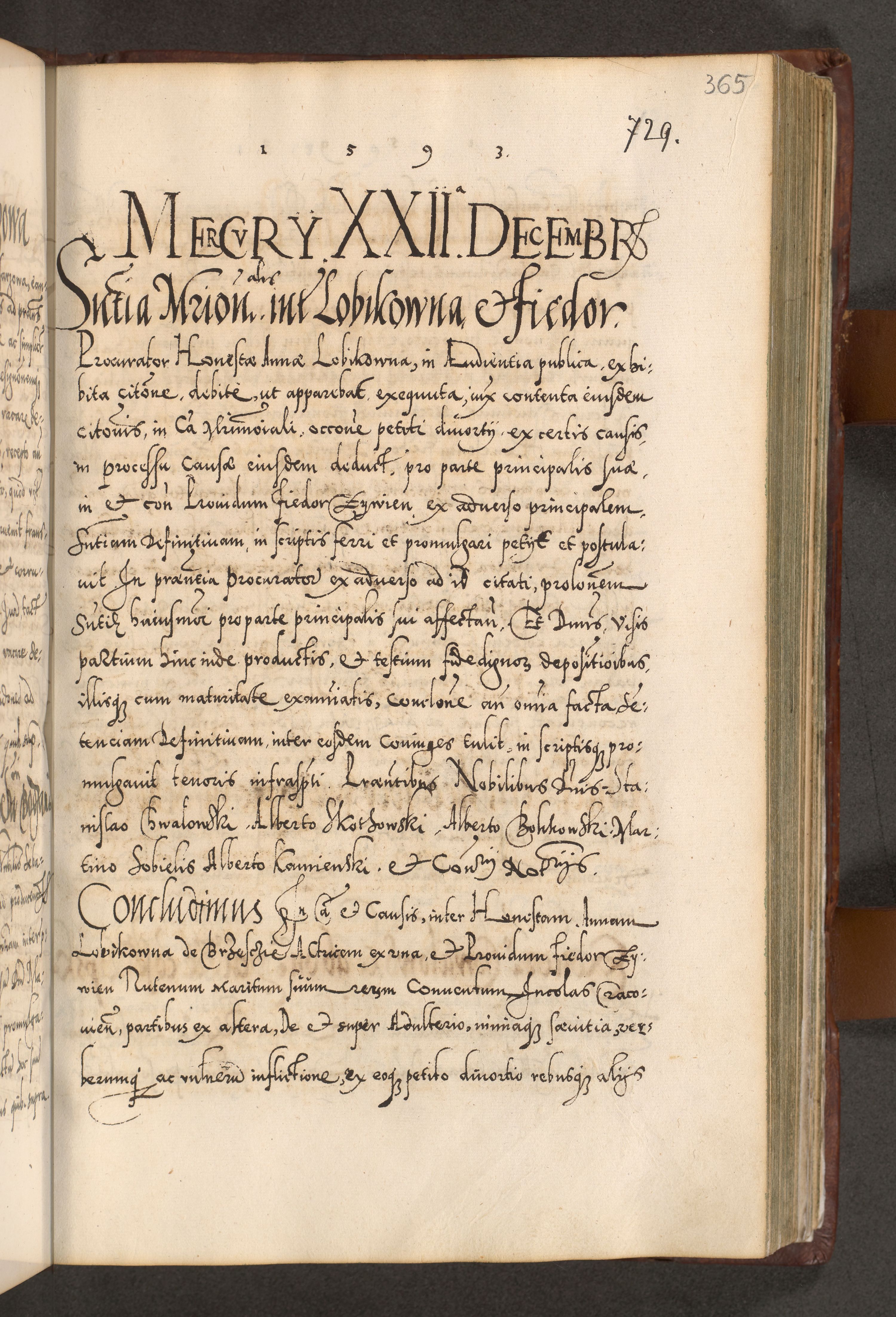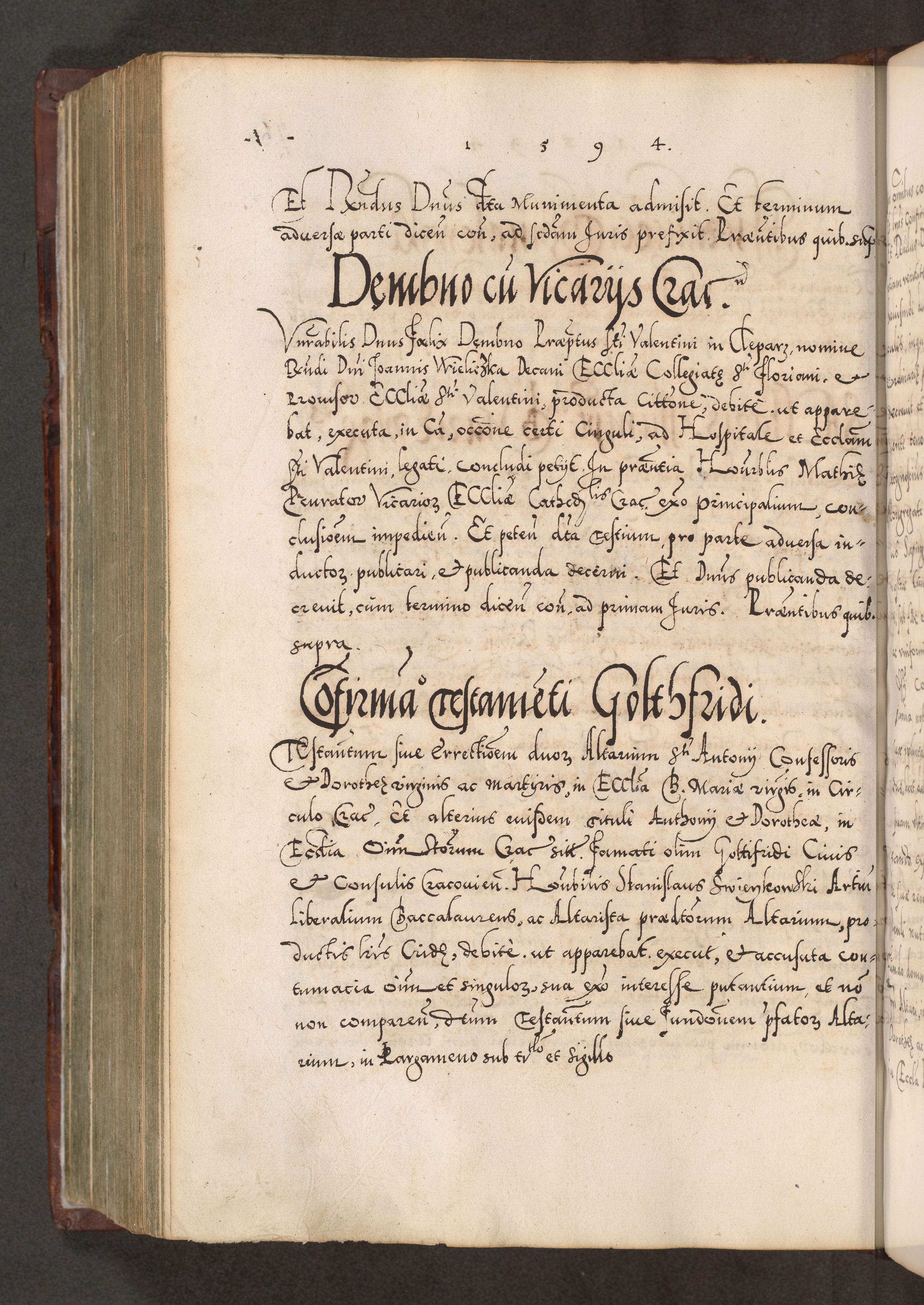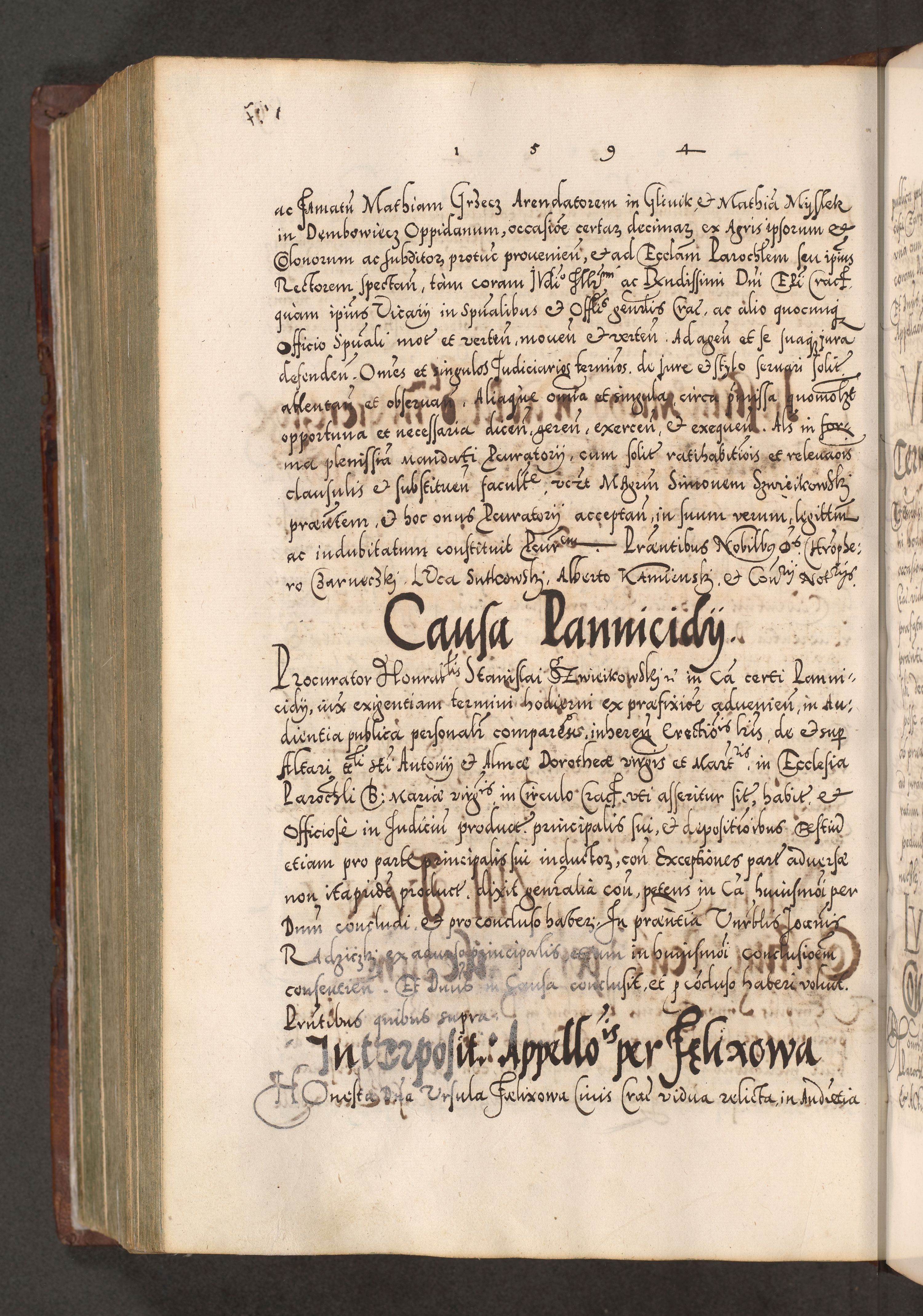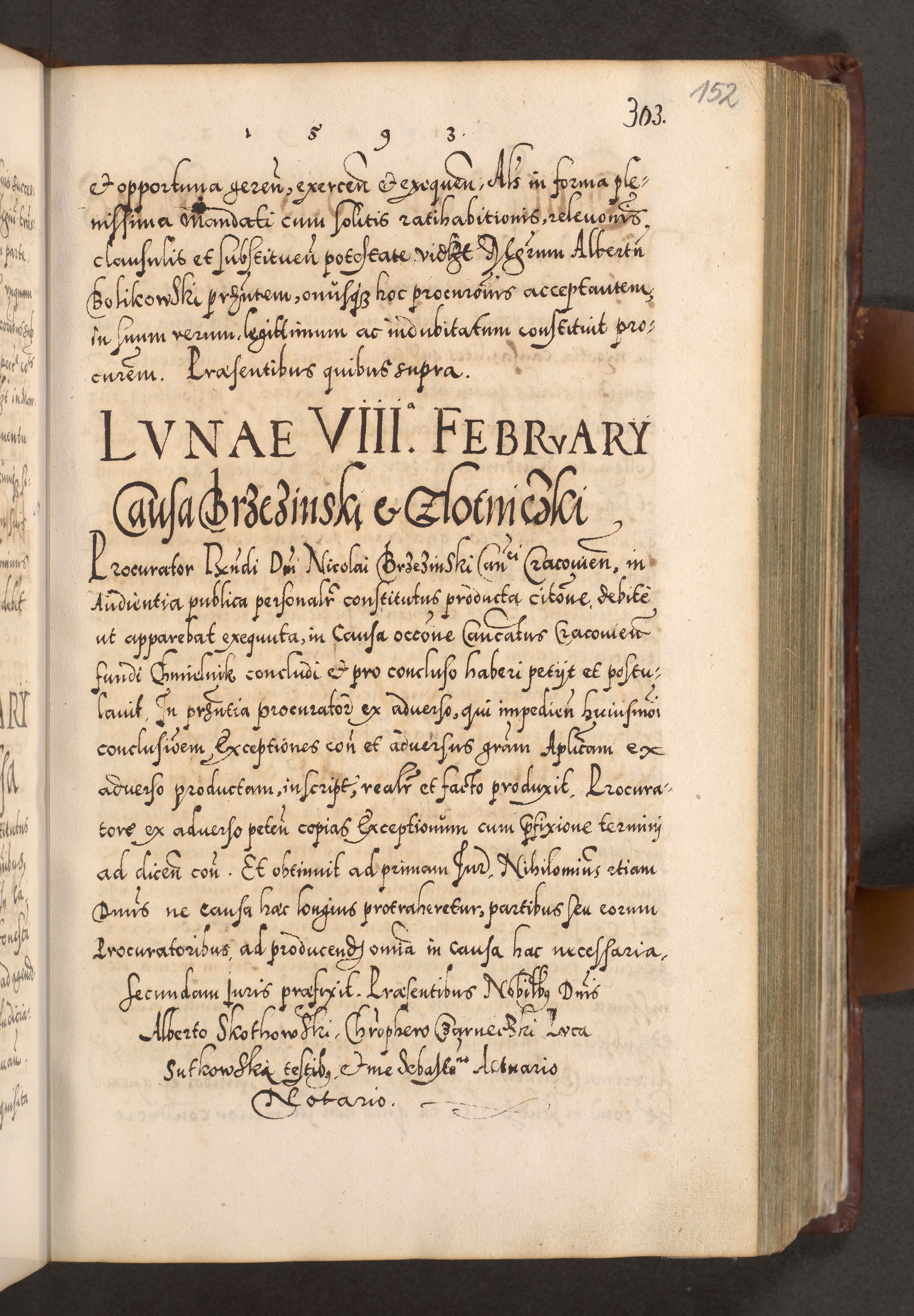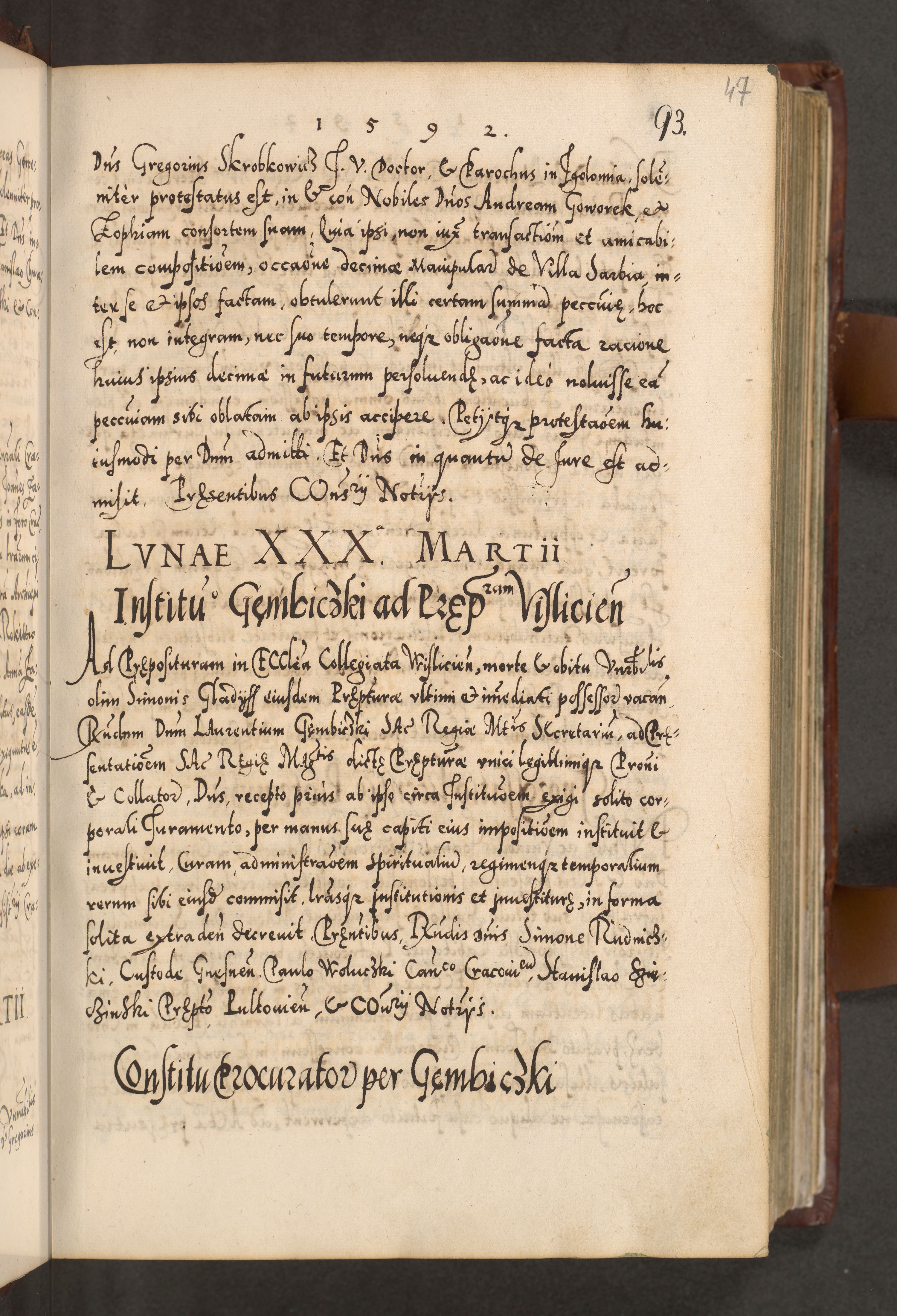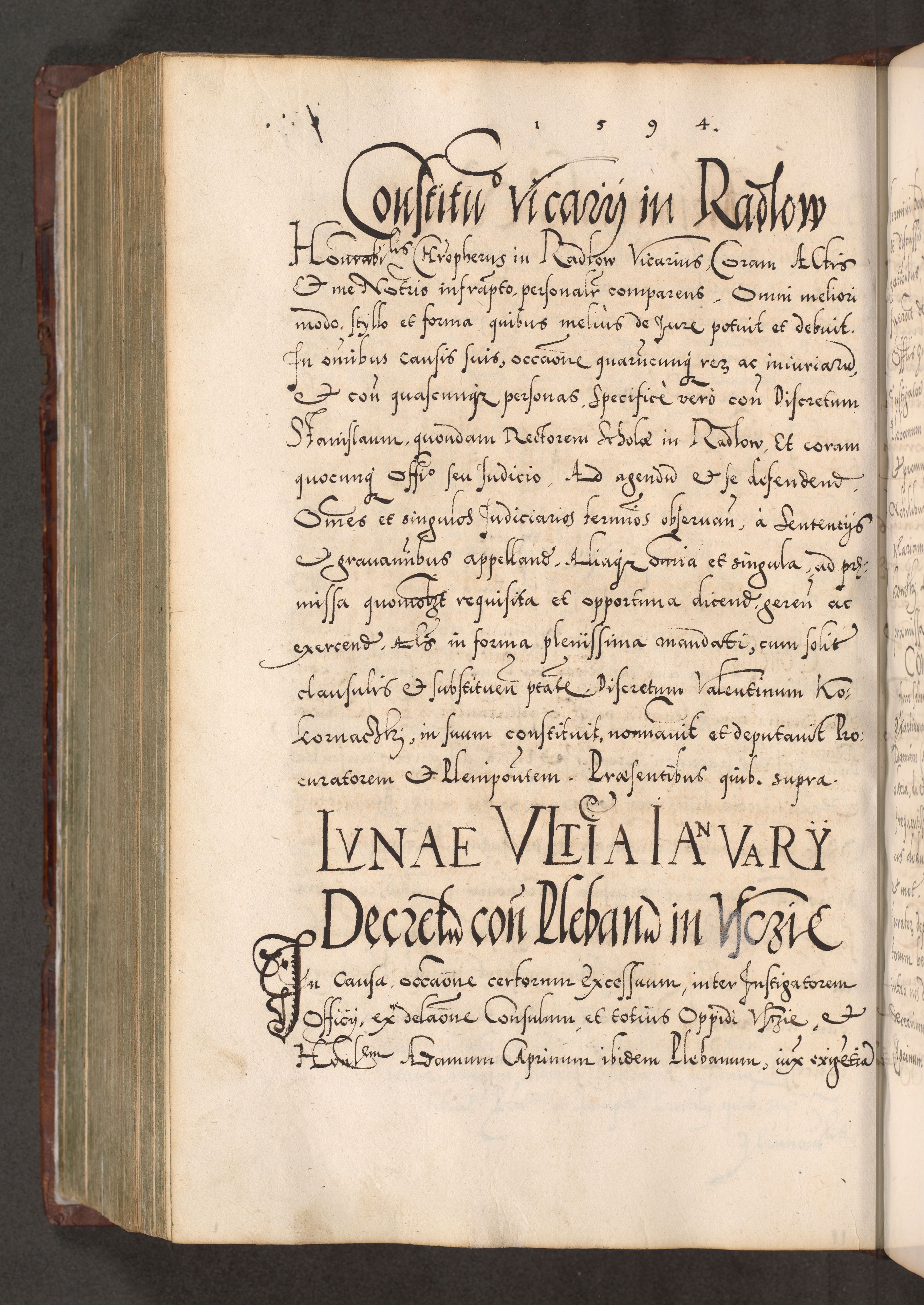 Illistrissimo et revedissimo in Christo Patre Domino Domino Georgio Rzadziwił Miserone Divina Sacrostae R. E. Tituli S. Sixti Presbitero Cardinali Duce in Olyka et Niesswiesz ad Gubernacula Ecclessiae Cracoviensis cuius administratorialem a Sancta Sede Apostolica obtinverat feliciter sedente. Acta actorum, causarum, sententiarum tam deffinitivarum quam interloquutoriarum decretorum, obligationum, quietationum, recognitionum, constitutionum procuratorum etc. coram Reverendo Domino Stanislao Crassinskz de Crasne Archidiacono Cracoviensis, Scholastico Gnesnesis, Custode Plocensis etc. Vicario et Officiali Generali Cracoviensi in Ano Domini Millesimo Quingentesimo Nonagesimo Primo cuius indictio quarta pontificatus SS. Domini Nostri Gregorii XIIII Anno I psius prio feliciter incipiut