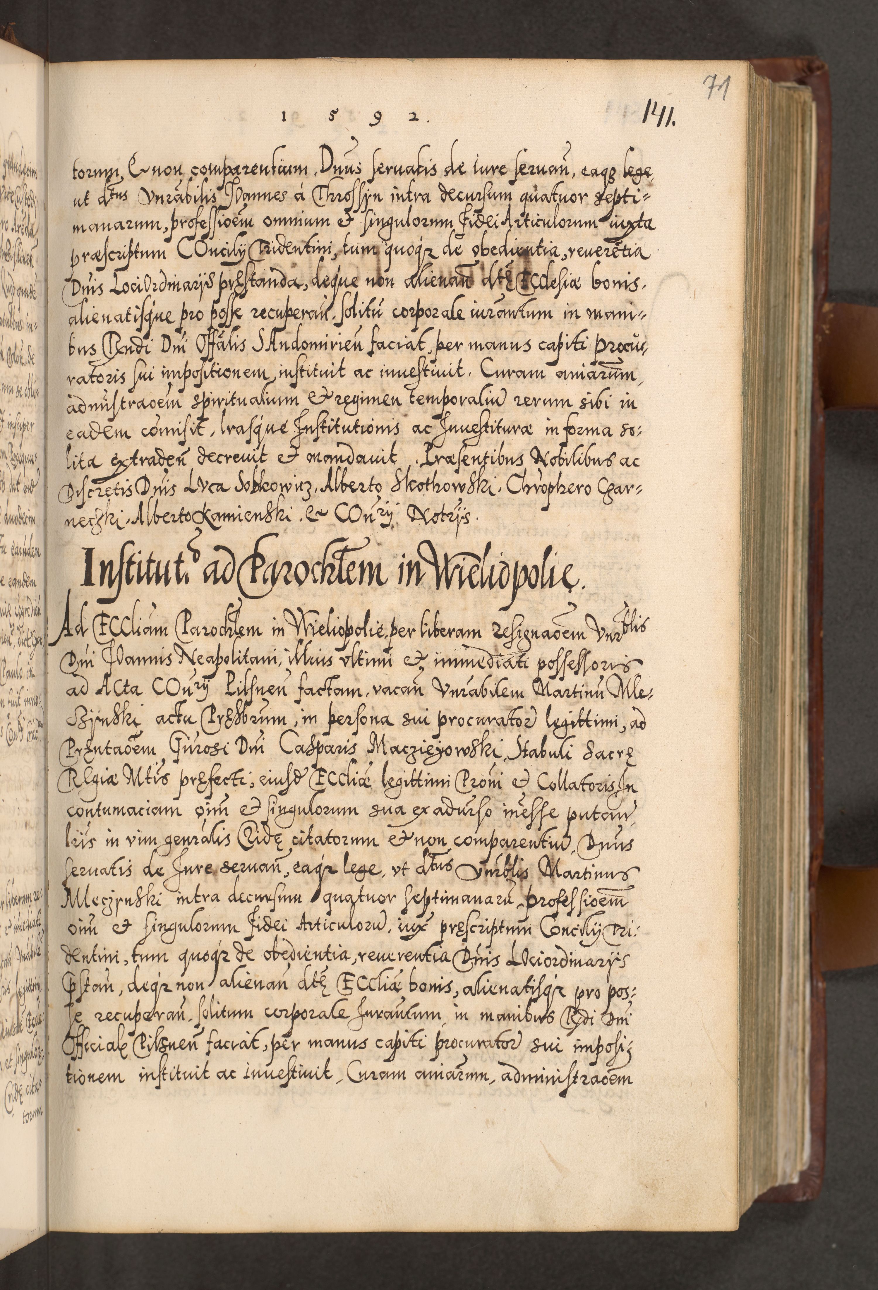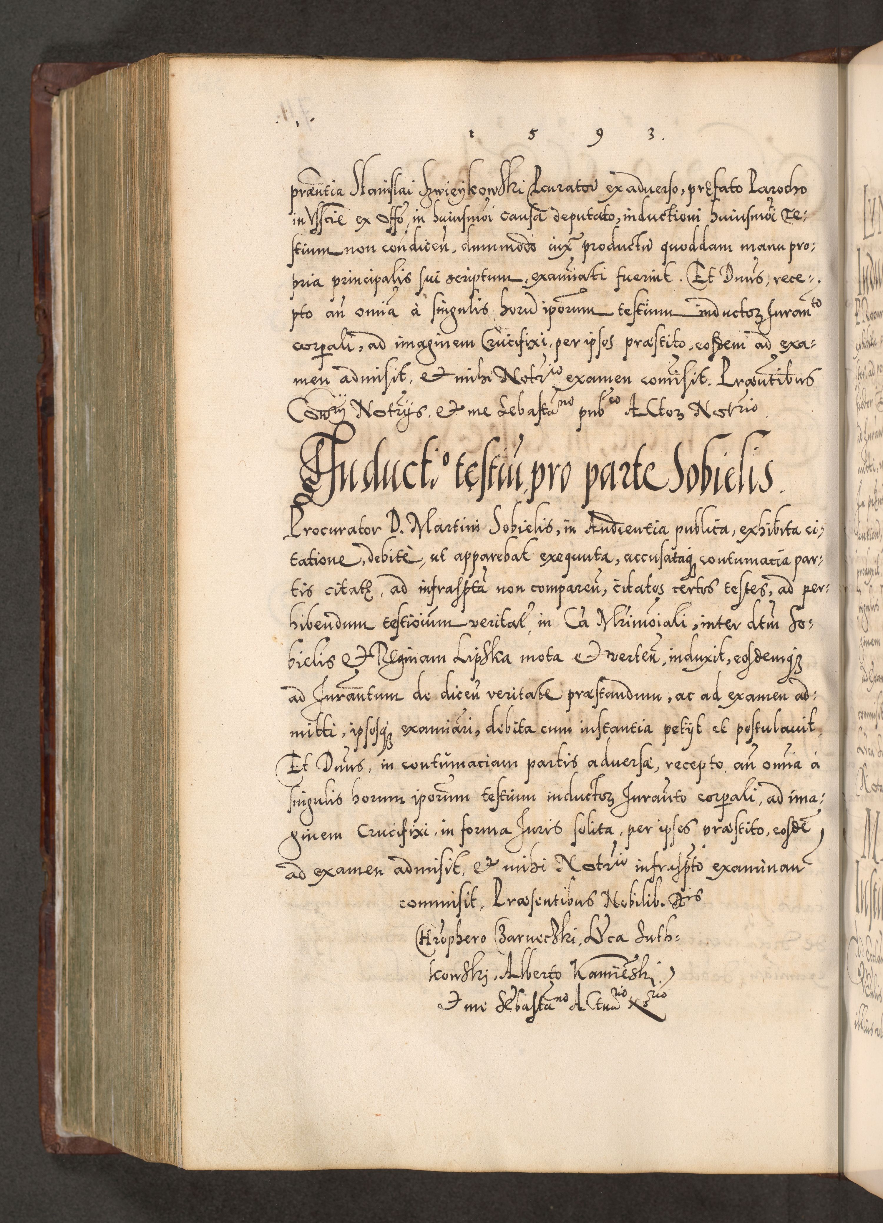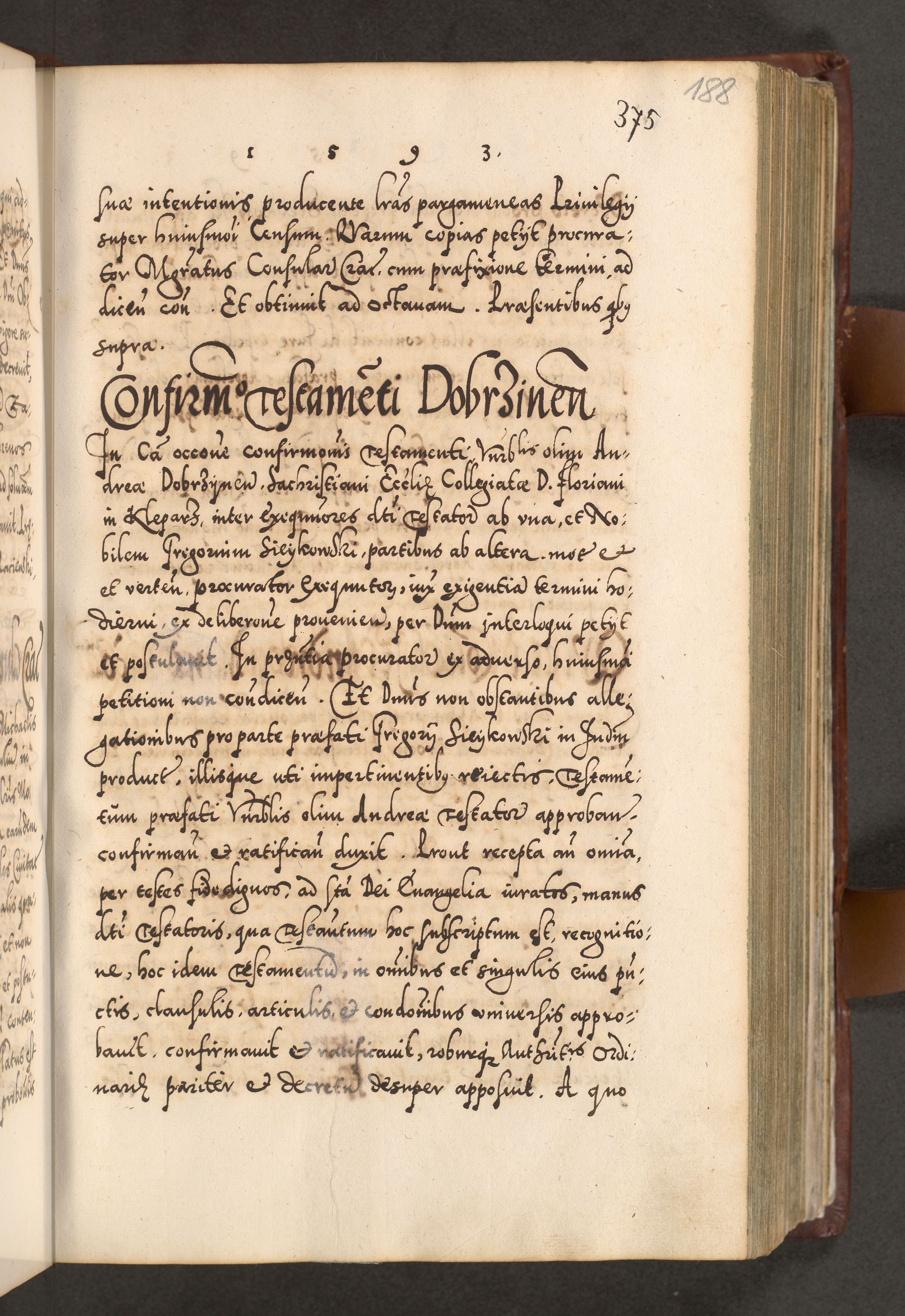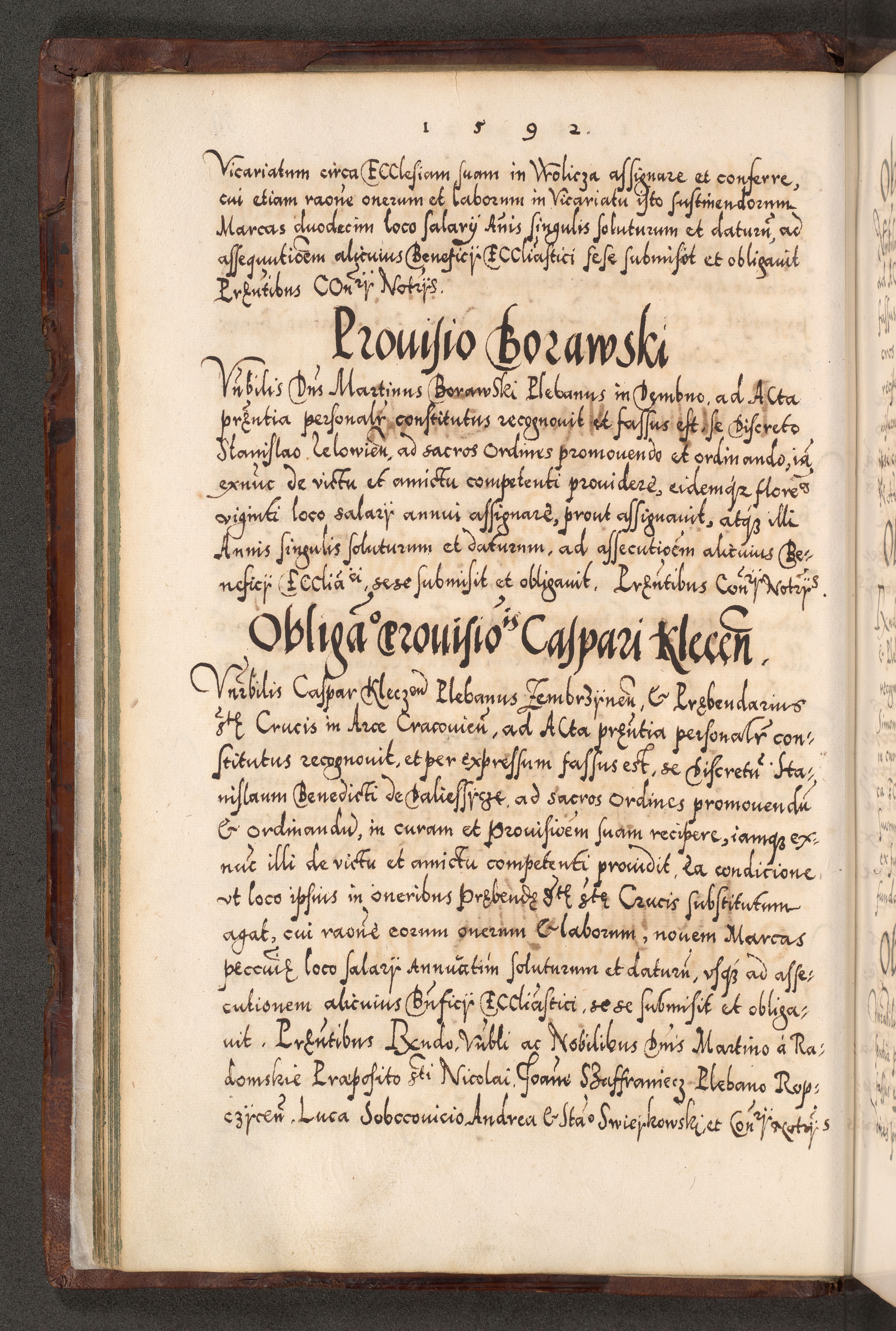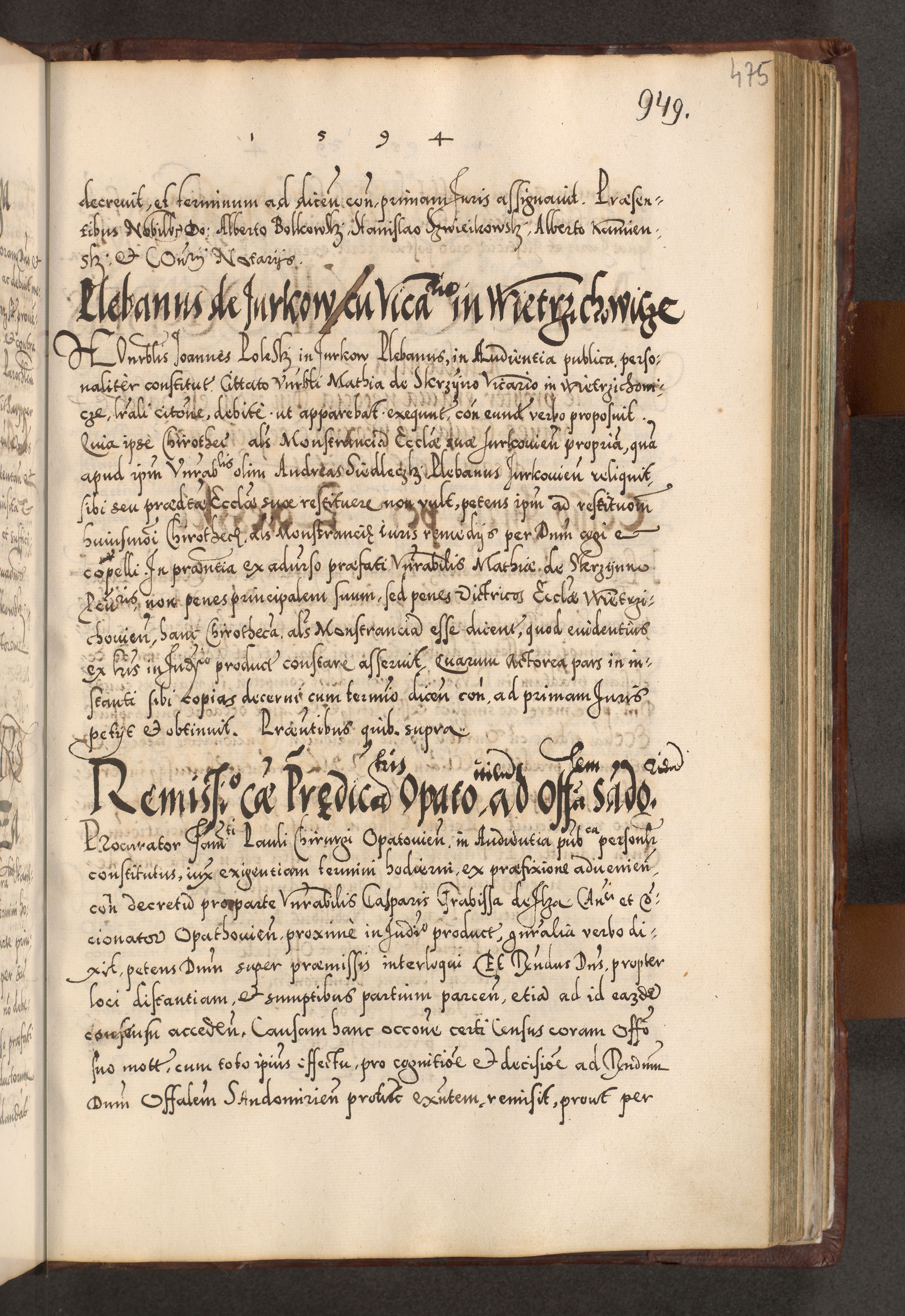 Illistrissimo et revedissimo in Christo Patre Domino Domino Georgio Rzadziwił Miserone Divina Sacrostae R. E. Tituli S. Sixti Presbitero Cardinali Duce in Olyka et Niesswiesz ad Gubernacula Ecclessiae Cracoviensis cuius administratorialem a Sancta Sede Apostolica obtinverat feliciter sedente. Acta actorum, causarum, sententiarum tam deffinitivarum quam interloquutoriarum decretorum, obligationum, quietationum, recognitionum, constitutionum procuratorum etc. coram Reverendo Domino Stanislao Crassinskz de Crasne Archidiacono Cracoviensis, Scholastico Gnesnesis, Custode Plocensis etc. Vicario et Officiali Generali Cracoviensi in Ano Domini Millesimo Quingentesimo Nonagesimo Primo cuius indictio quarta pontificatus SS. Domini Nostri Gregorii XIIII Anno I psius prio feliciter incipiut