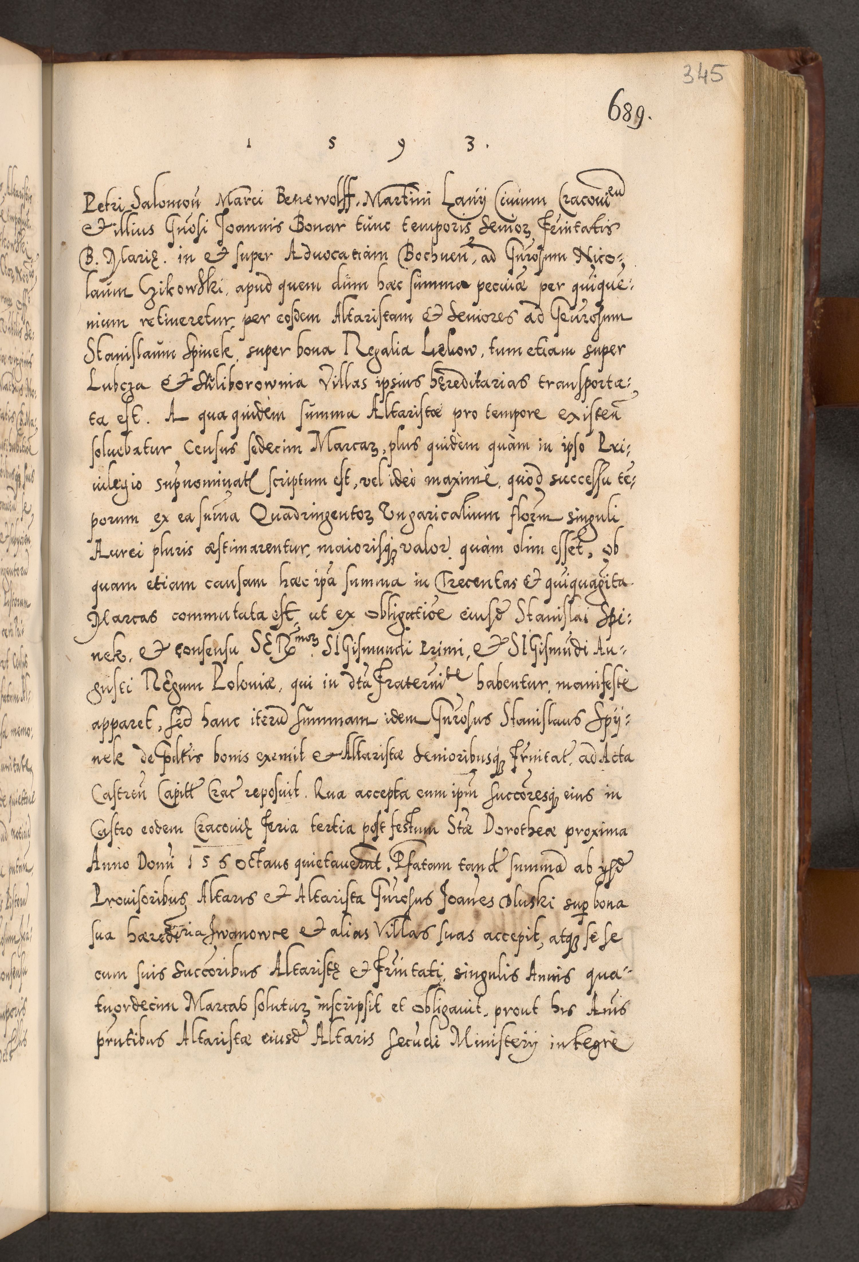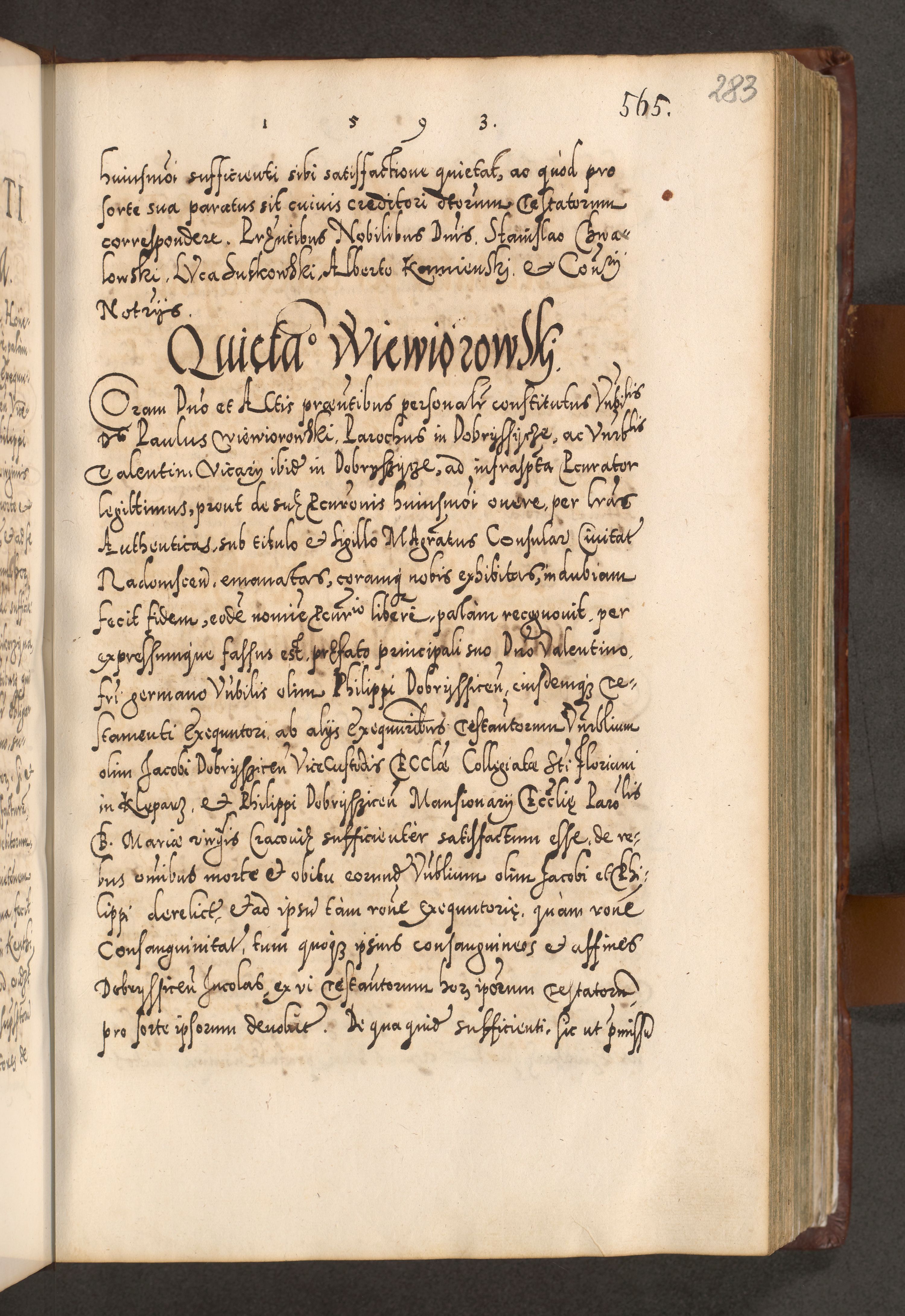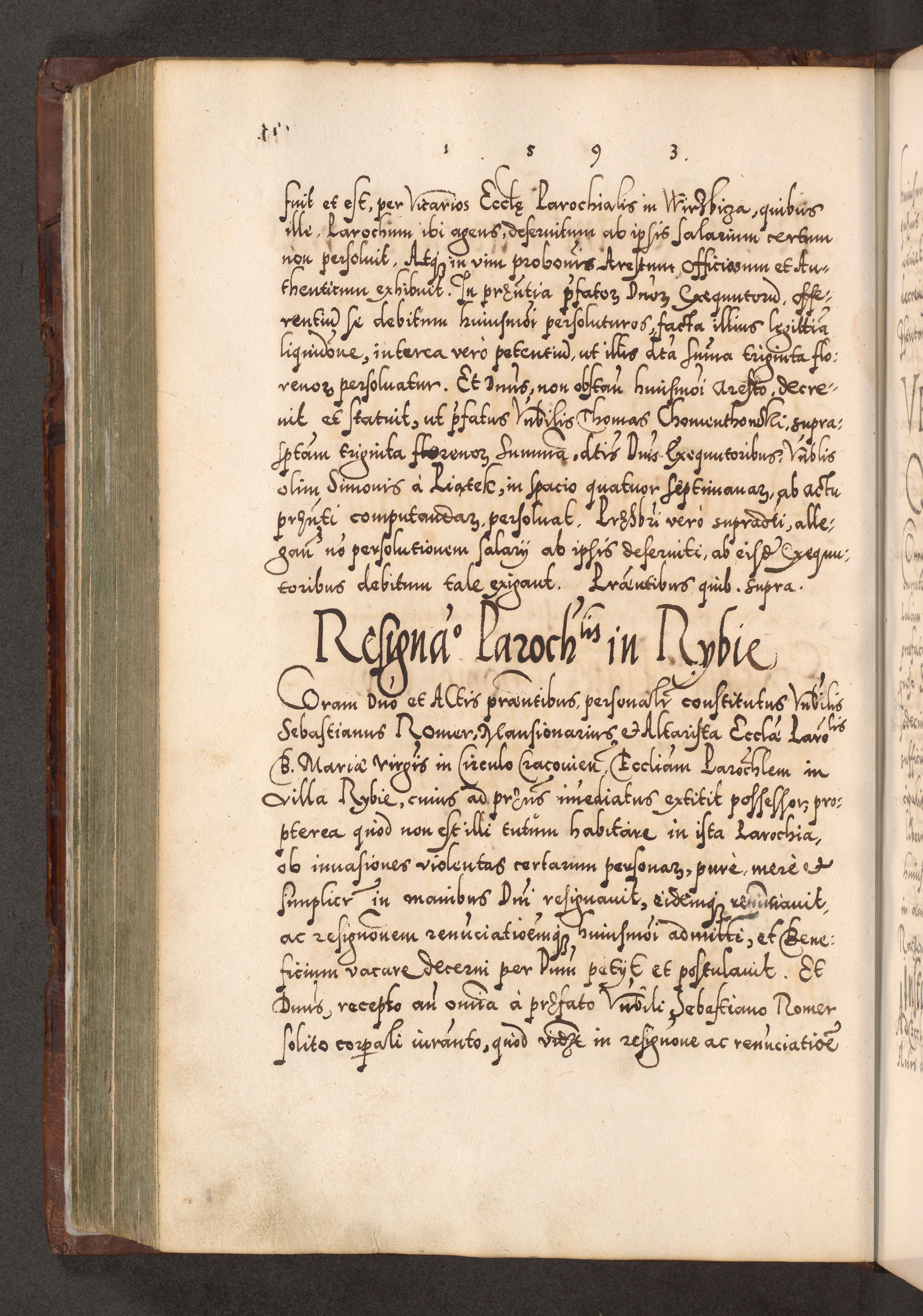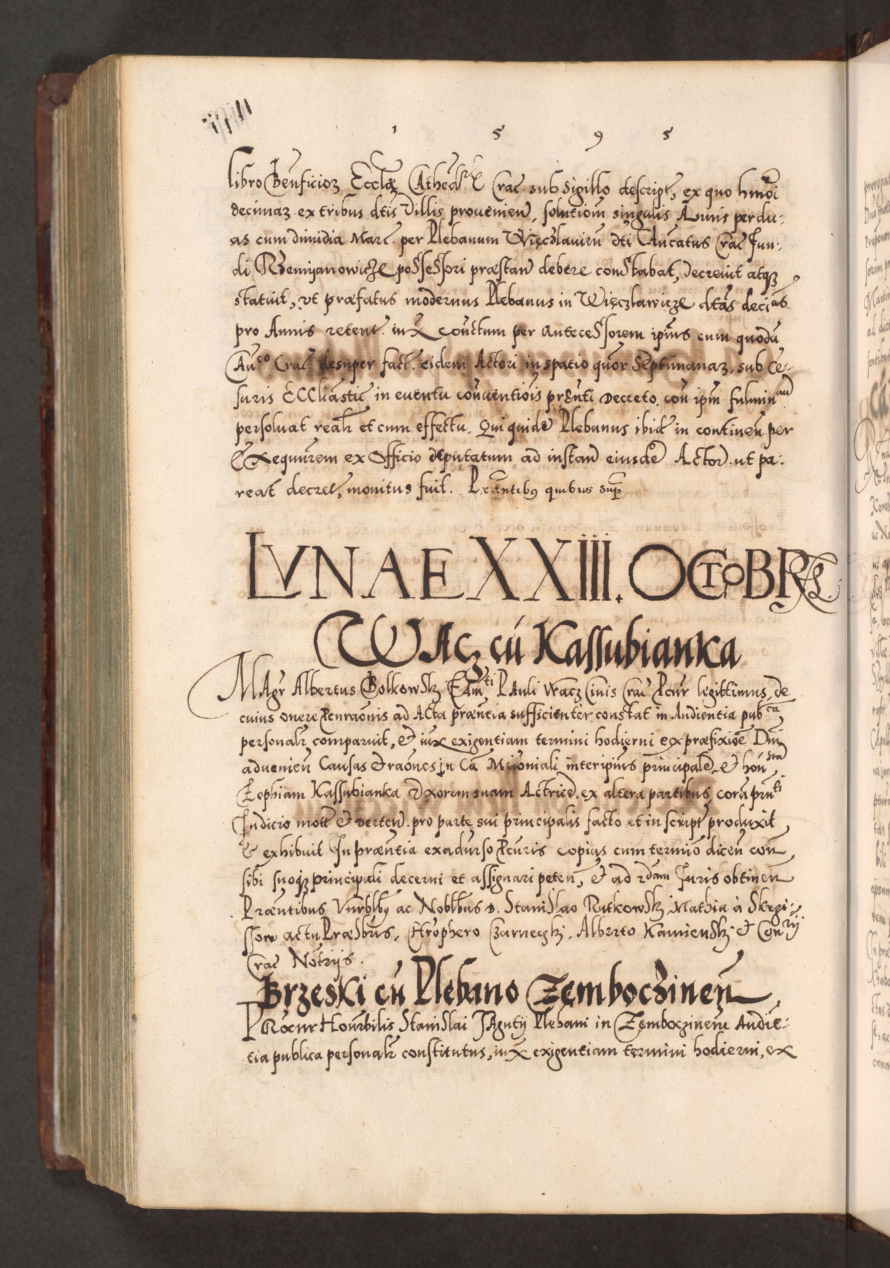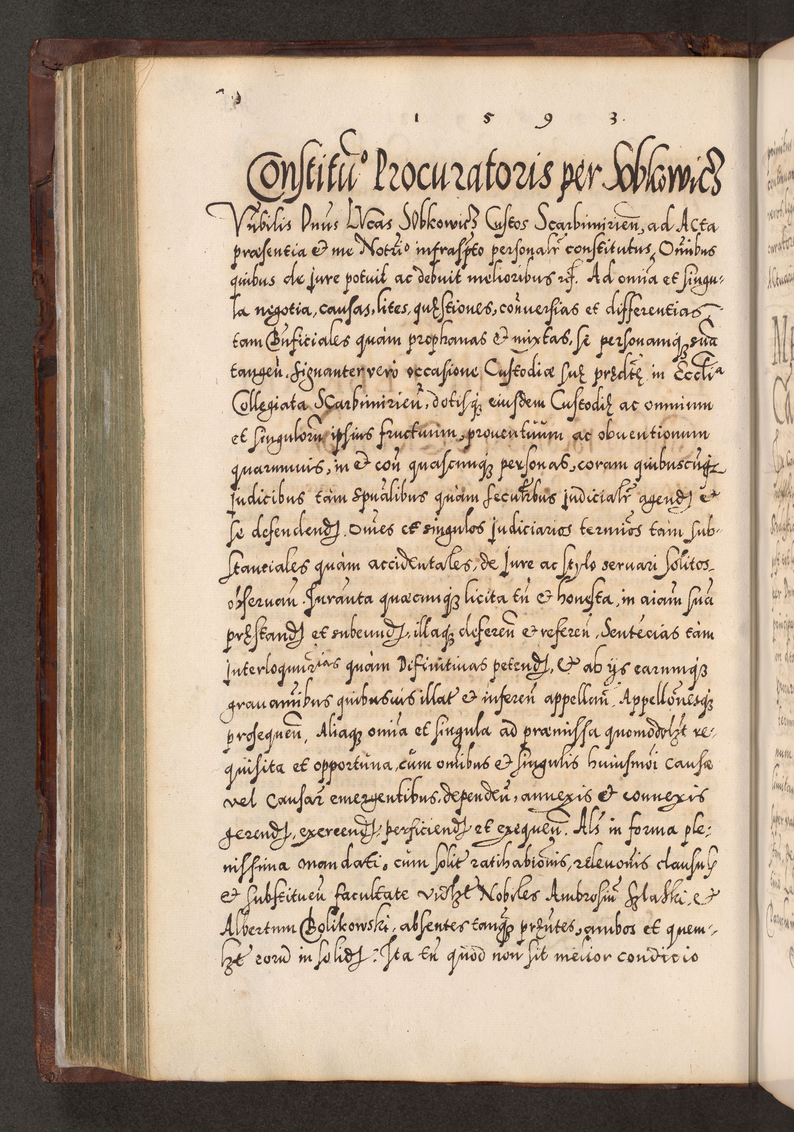 Illistrissimo et revedissimo in Christo Patre Domino Domino Georgio Rzadziwił Miserone Divina Sacrostae R. E. Tituli S. Sixti Presbitero Cardinali Duce in Olyka et Niesswiesz ad Gubernacula Ecclessiae Cracoviensis cuius administratorialem a Sancta Sede Apostolica obtinverat feliciter sedente. Acta actorum, causarum, sententiarum tam deffinitivarum quam interloquutoriarum decretorum, obligationum, quietationum, recognitionum, constitutionum procuratorum etc. coram Reverendo Domino Stanislao Crassinskz de Crasne Archidiacono Cracoviensis, Scholastico Gnesnesis, Custode Plocensis etc. Vicario et Officiali Generali Cracoviensi in Ano Domini Millesimo Quingentesimo Nonagesimo Primo cuius indictio quarta pontificatus SS. Domini Nostri Gregorii XIIII Anno I psius prio feliciter incipiut