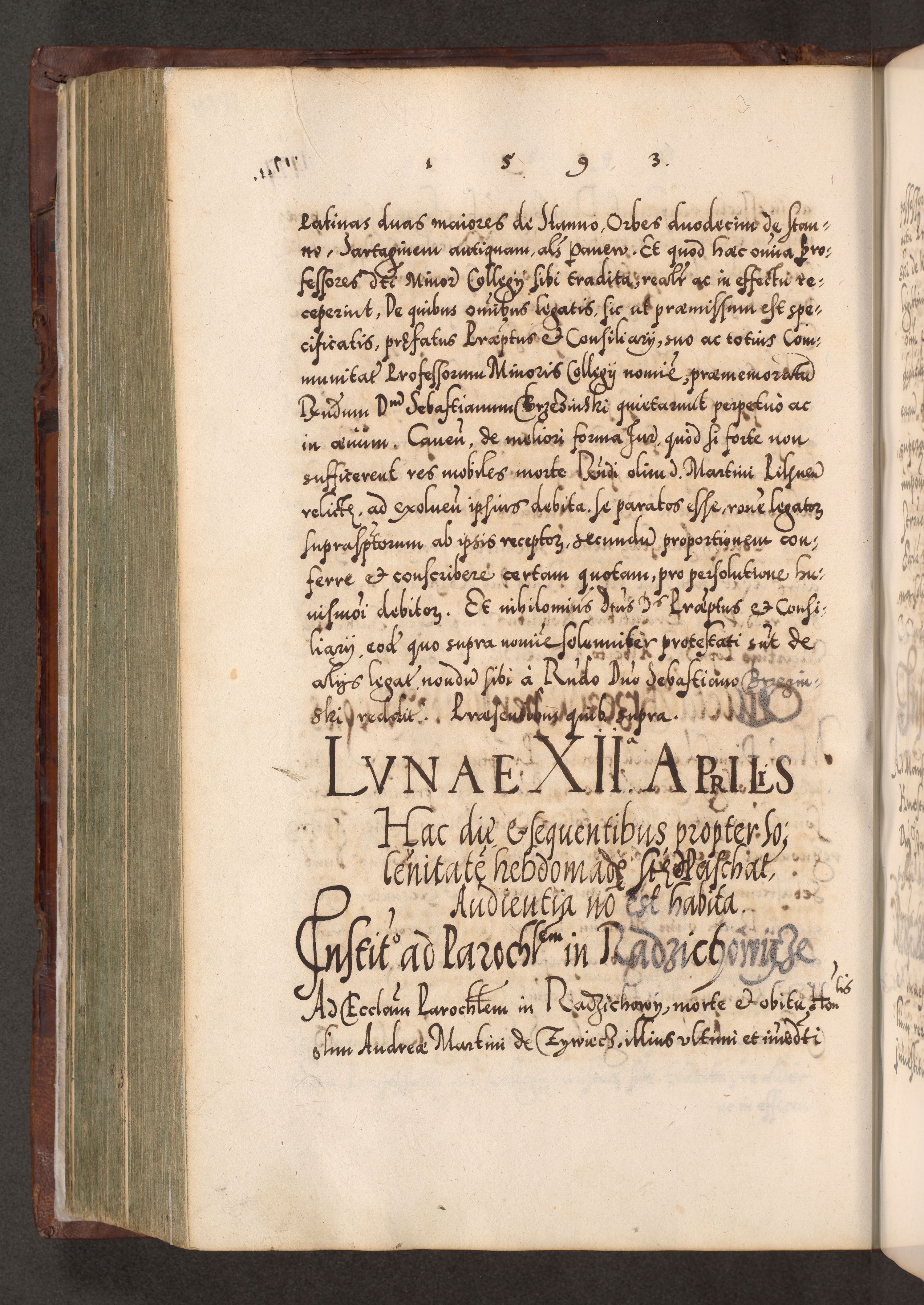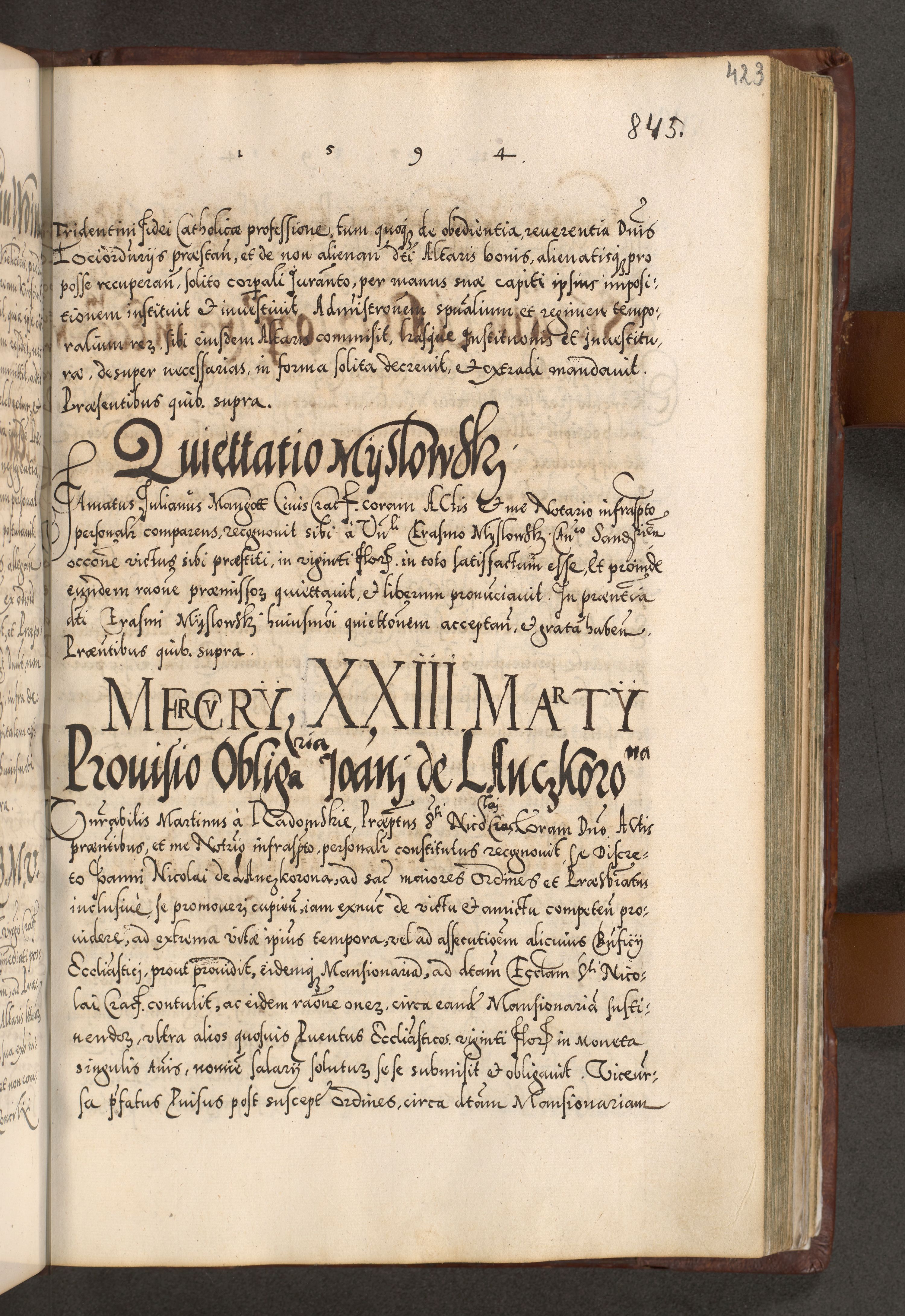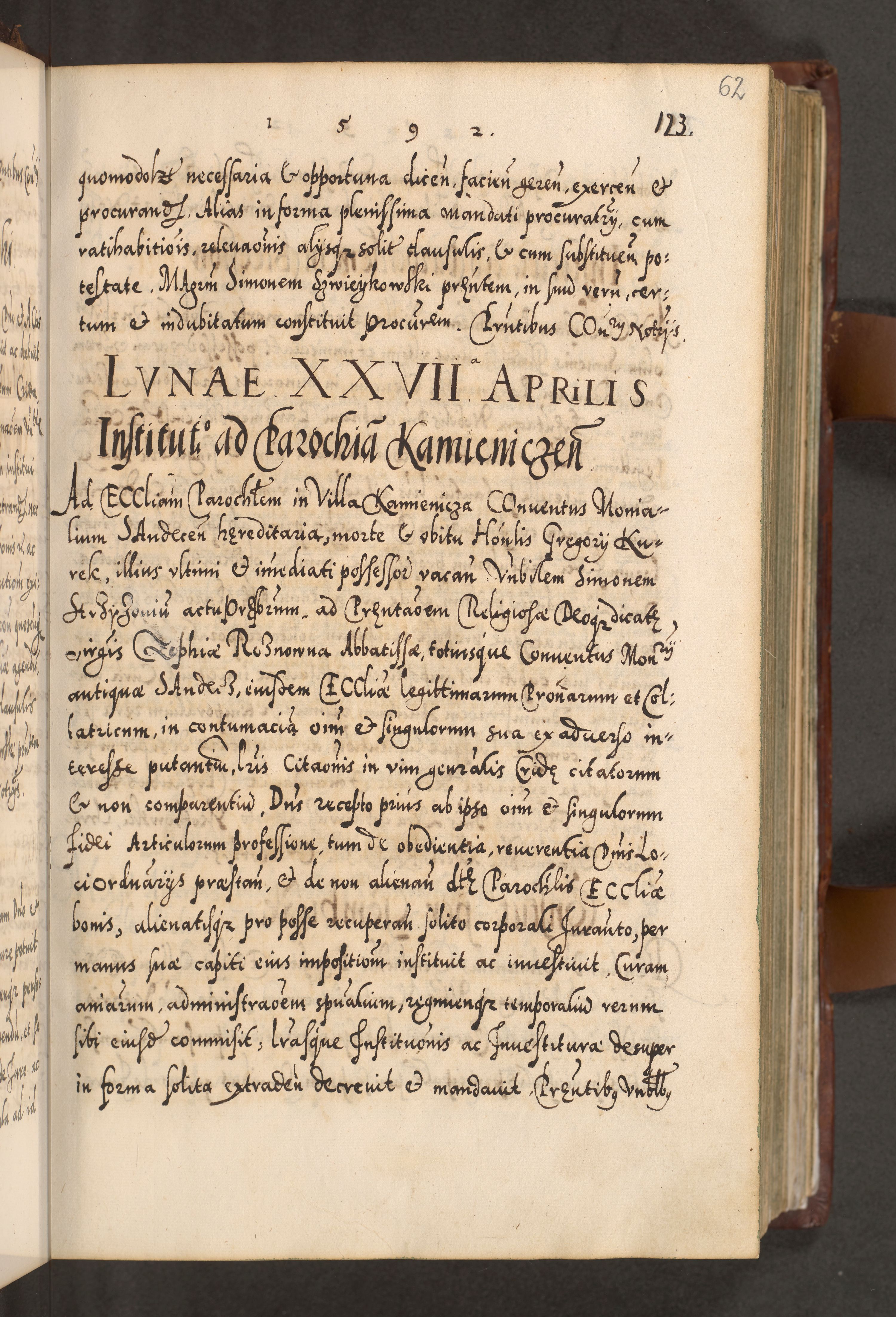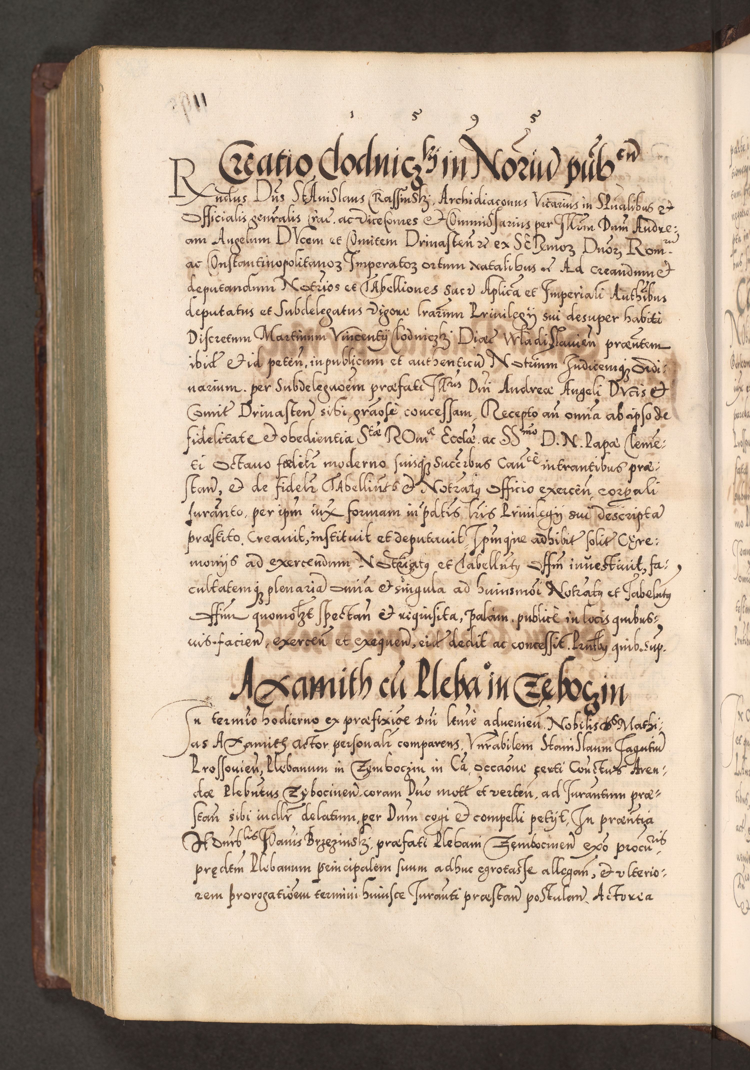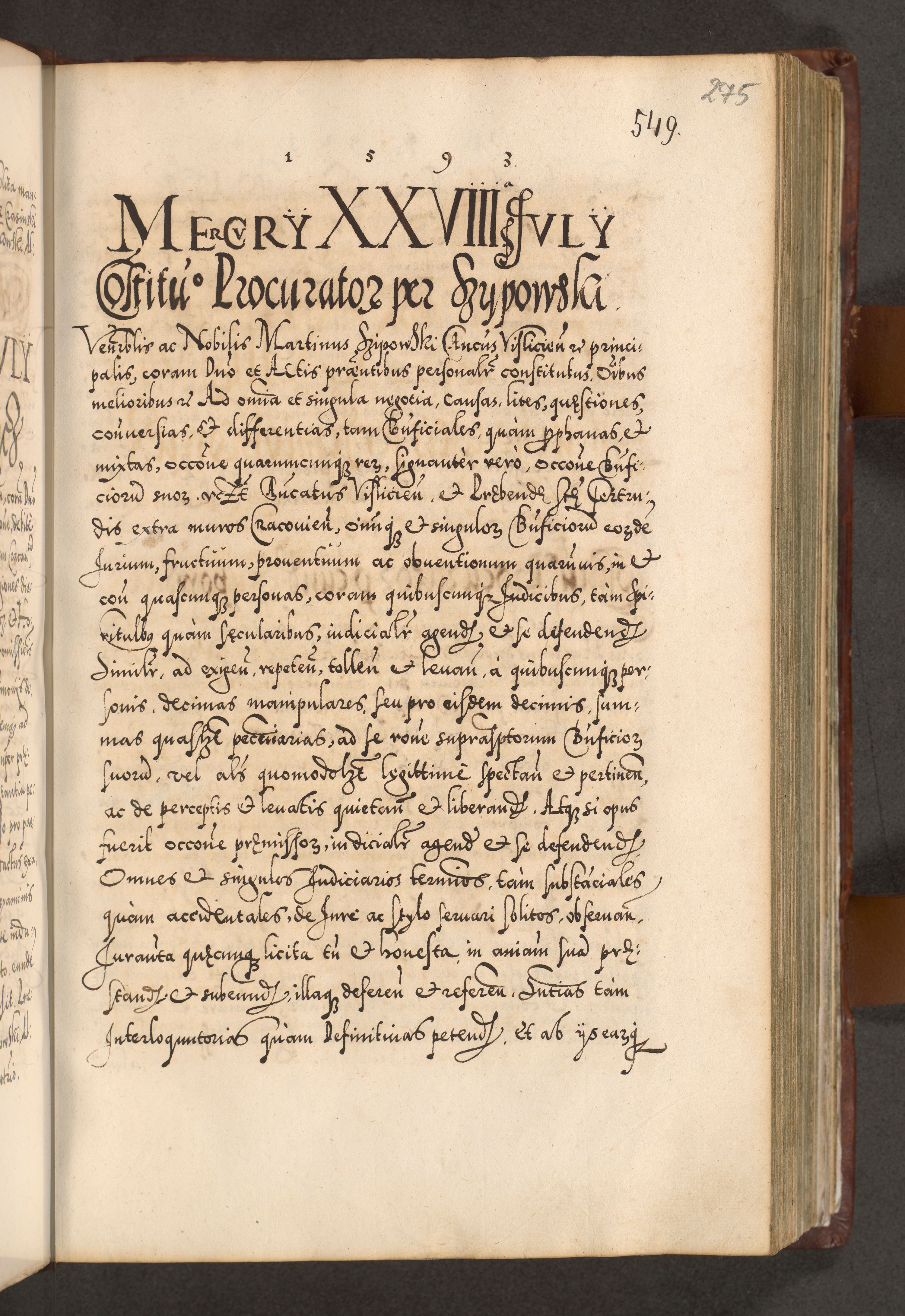 Illistrissimo et revedissimo in Christo Patre Domino Domino Georgio Rzadziwił Miserone Divina Sacrostae R. E. Tituli S. Sixti Presbitero Cardinali Duce in Olyka et Niesswiesz ad Gubernacula Ecclessiae Cracoviensis cuius administratorialem a Sancta Sede Apostolica obtinverat feliciter sedente. Acta actorum, causarum, sententiarum tam deffinitivarum quam interloquutoriarum decretorum, obligationum, quietationum, recognitionum, constitutionum procuratorum etc. coram Reverendo Domino Stanislao Crassinskz de Crasne Archidiacono Cracoviensis, Scholastico Gnesnesis, Custode Plocensis etc. Vicario et Officiali Generali Cracoviensi in Ano Domini Millesimo Quingentesimo Nonagesimo Primo cuius indictio quarta pontificatus SS. Domini Nostri Gregorii XIIII Anno I psius prio feliciter incipiut