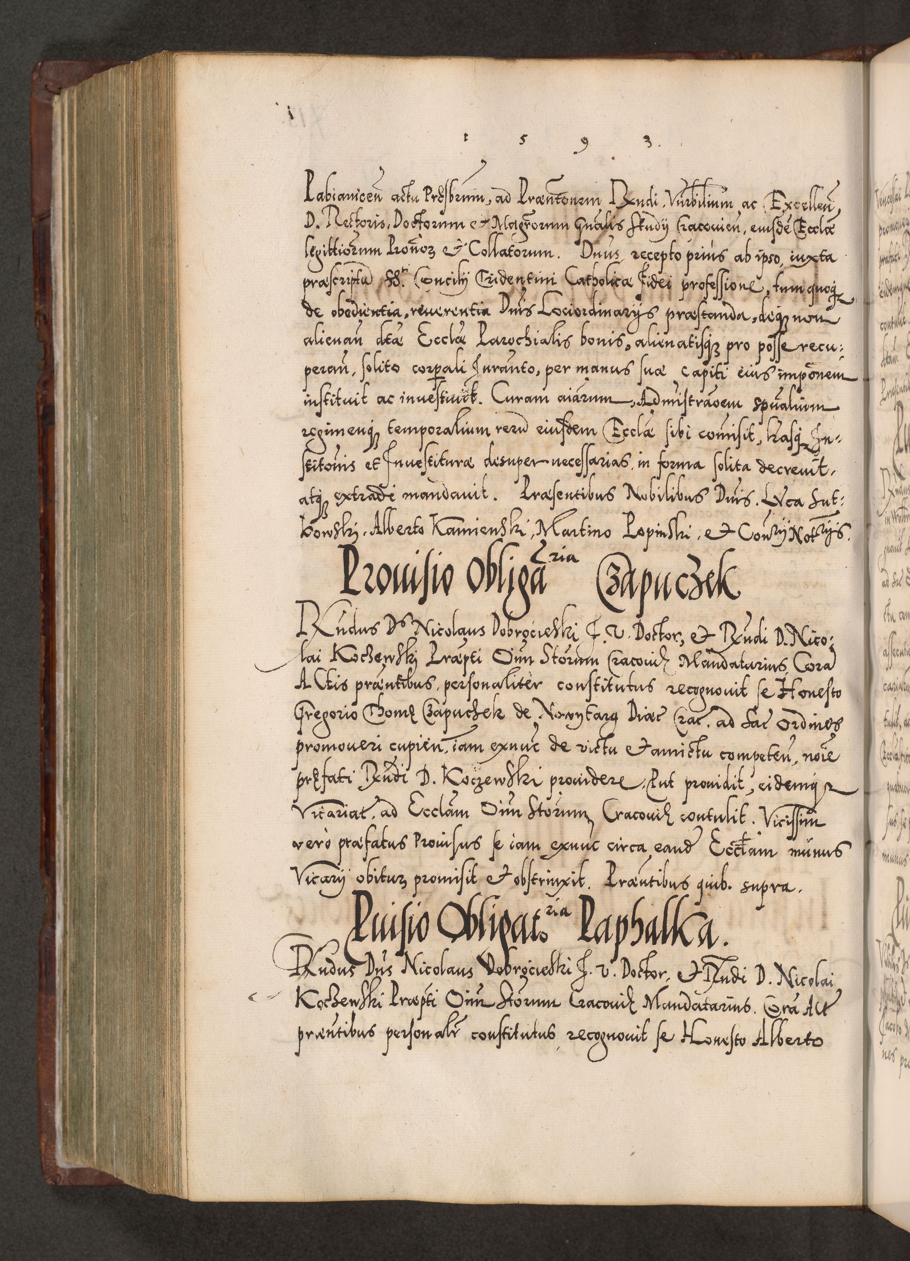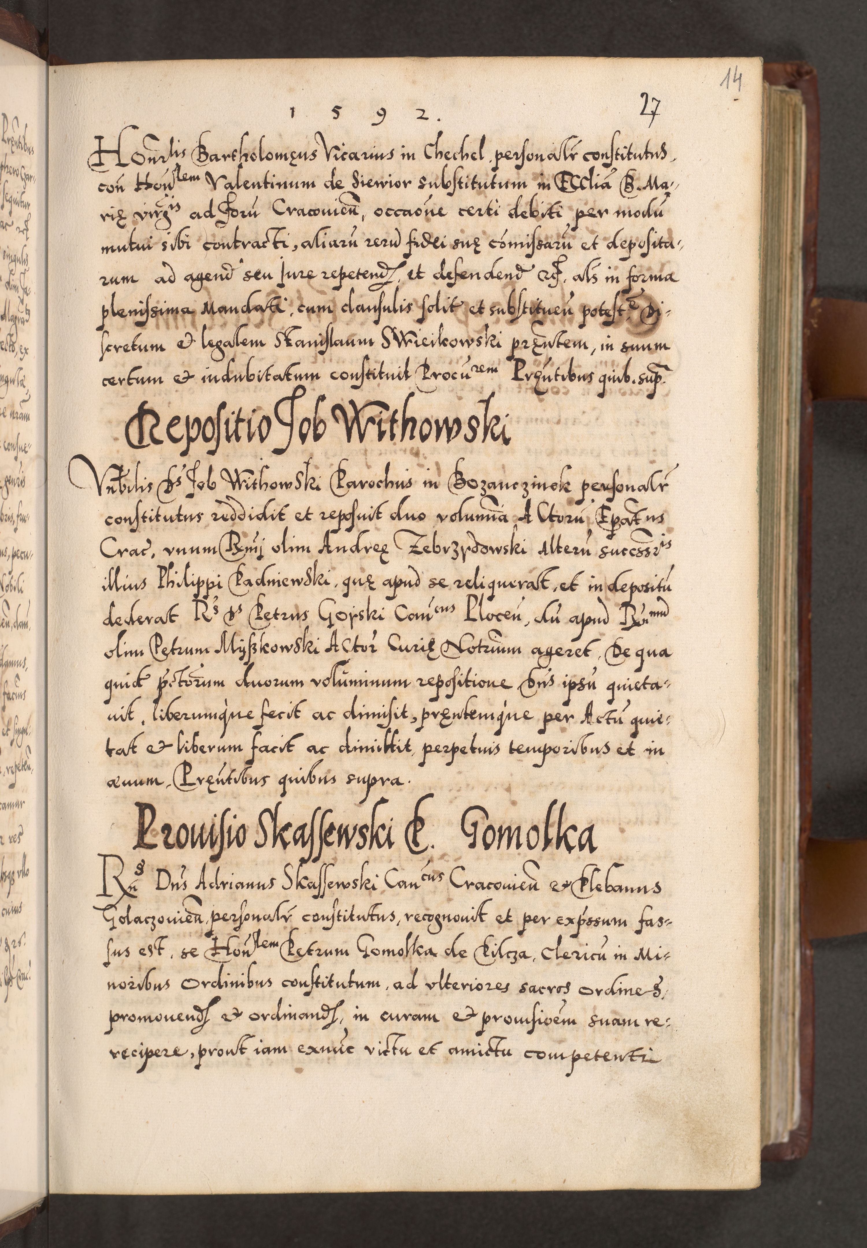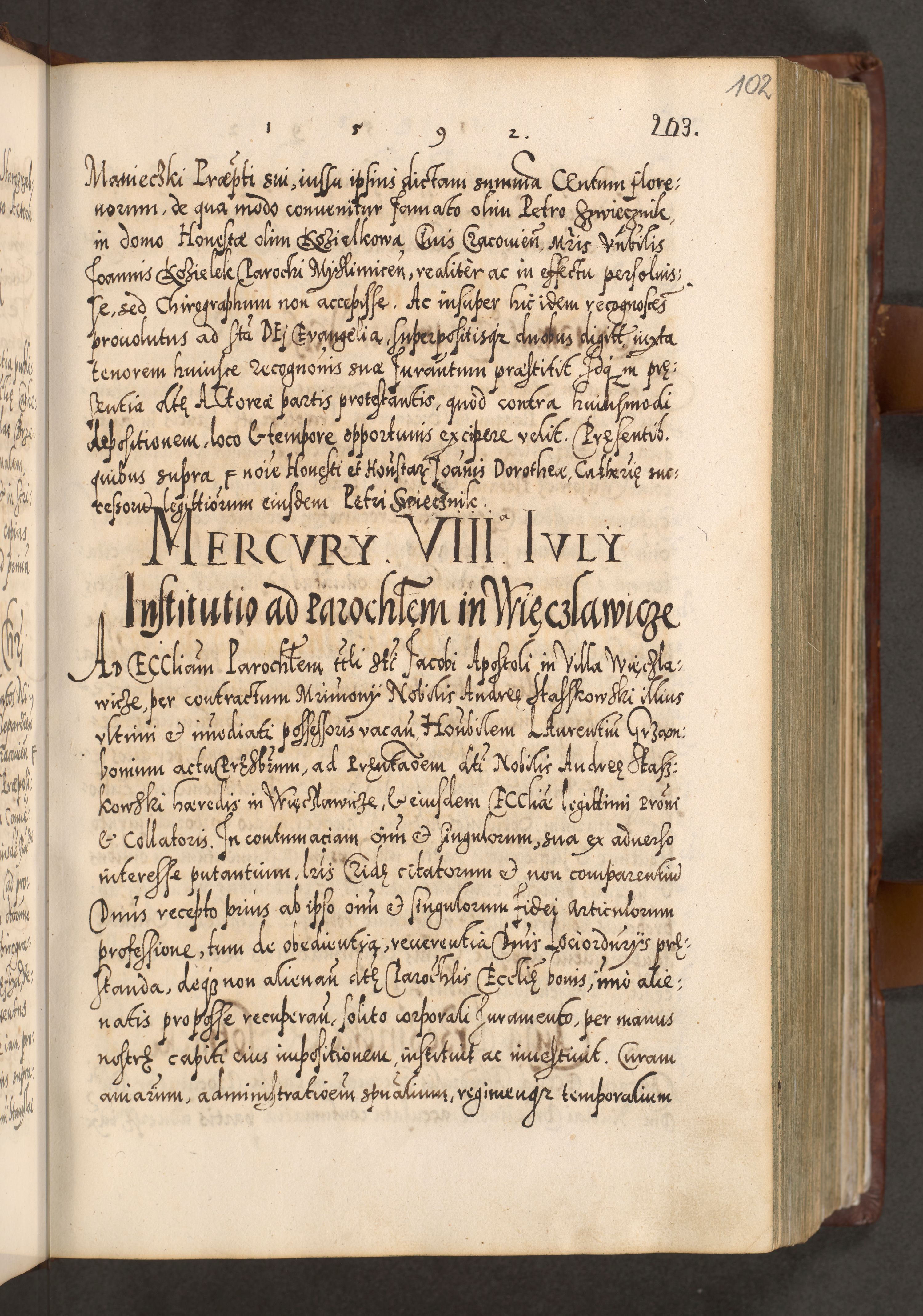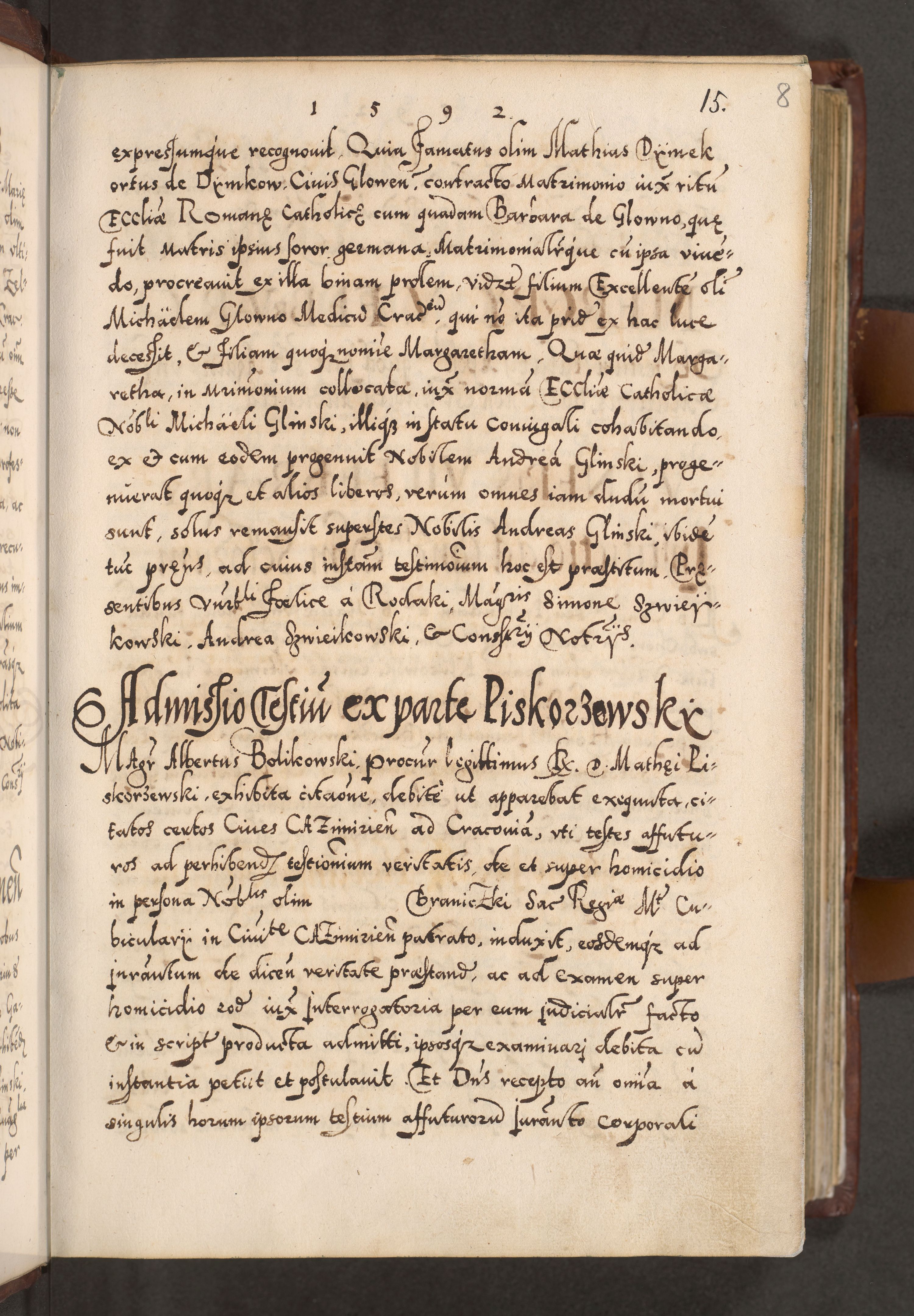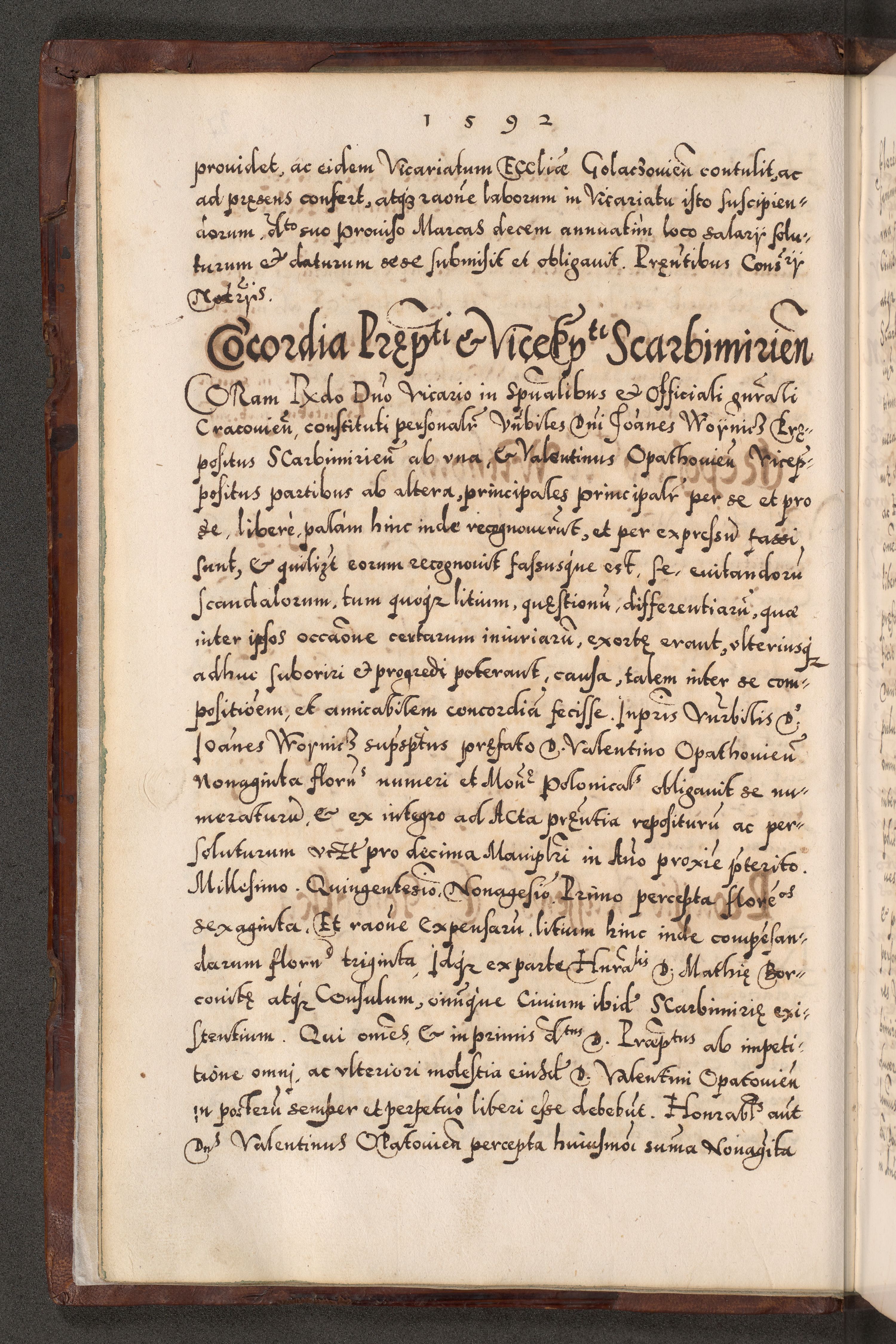 Illistrissimo et revedissimo in Christo Patre Domino Domino Georgio Rzadziwił Miserone Divina Sacrostae R. E. Tituli S. Sixti Presbitero Cardinali Duce in Olyka et Niesswiesz ad Gubernacula Ecclessiae Cracoviensis cuius administratorialem a Sancta Sede Apostolica obtinverat feliciter sedente. Acta actorum, causarum, sententiarum tam deffinitivarum quam interloquutoriarum decretorum, obligationum, quietationum, recognitionum, constitutionum procuratorum etc. coram Reverendo Domino Stanislao Crassinskz de Crasne Archidiacono Cracoviensis, Scholastico Gnesnesis, Custode Plocensis etc. Vicario et Officiali Generali Cracoviensi in Ano Domini Millesimo Quingentesimo Nonagesimo Primo cuius indictio quarta pontificatus SS. Domini Nostri Gregorii XIIII Anno I psius prio feliciter incipiut