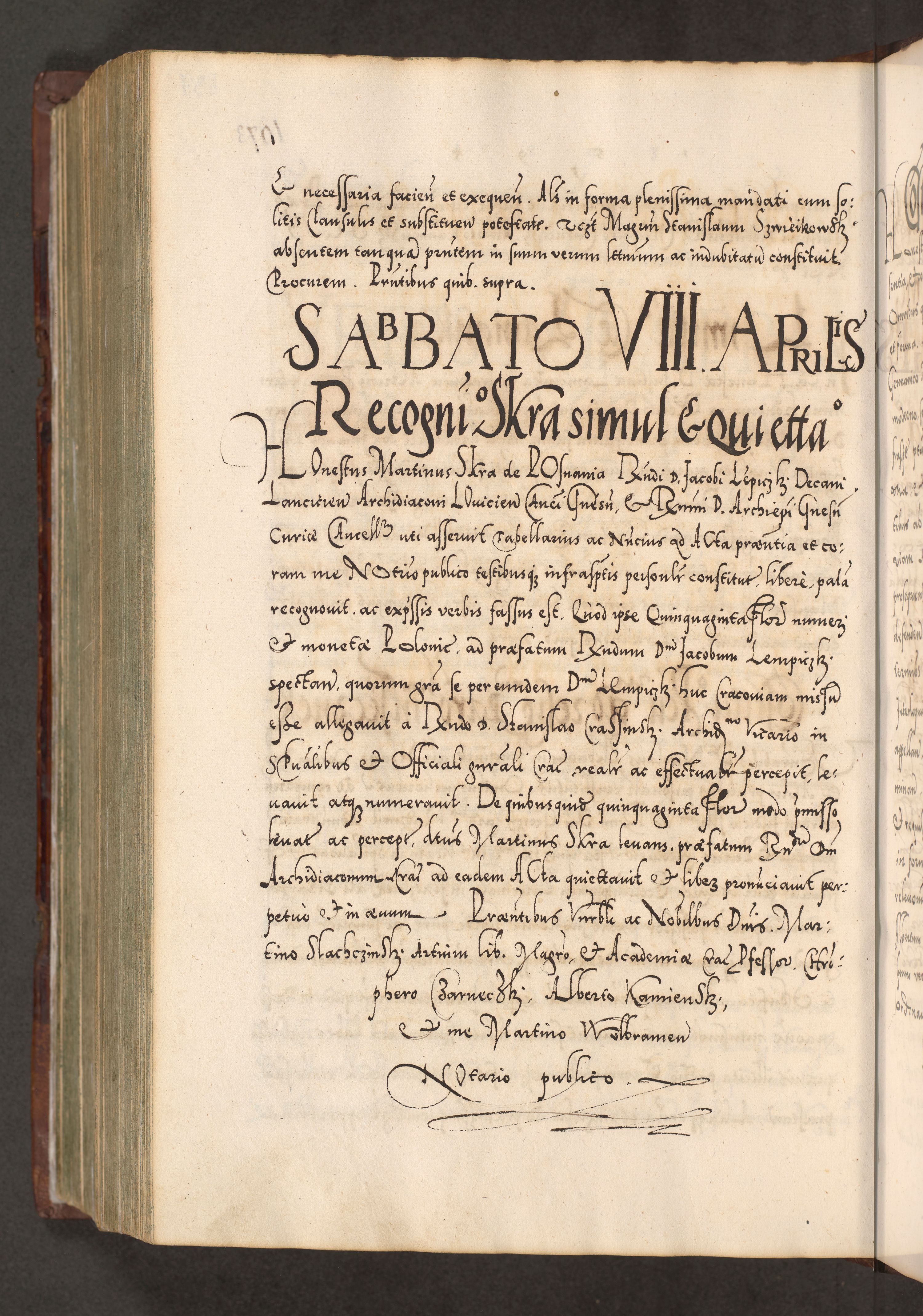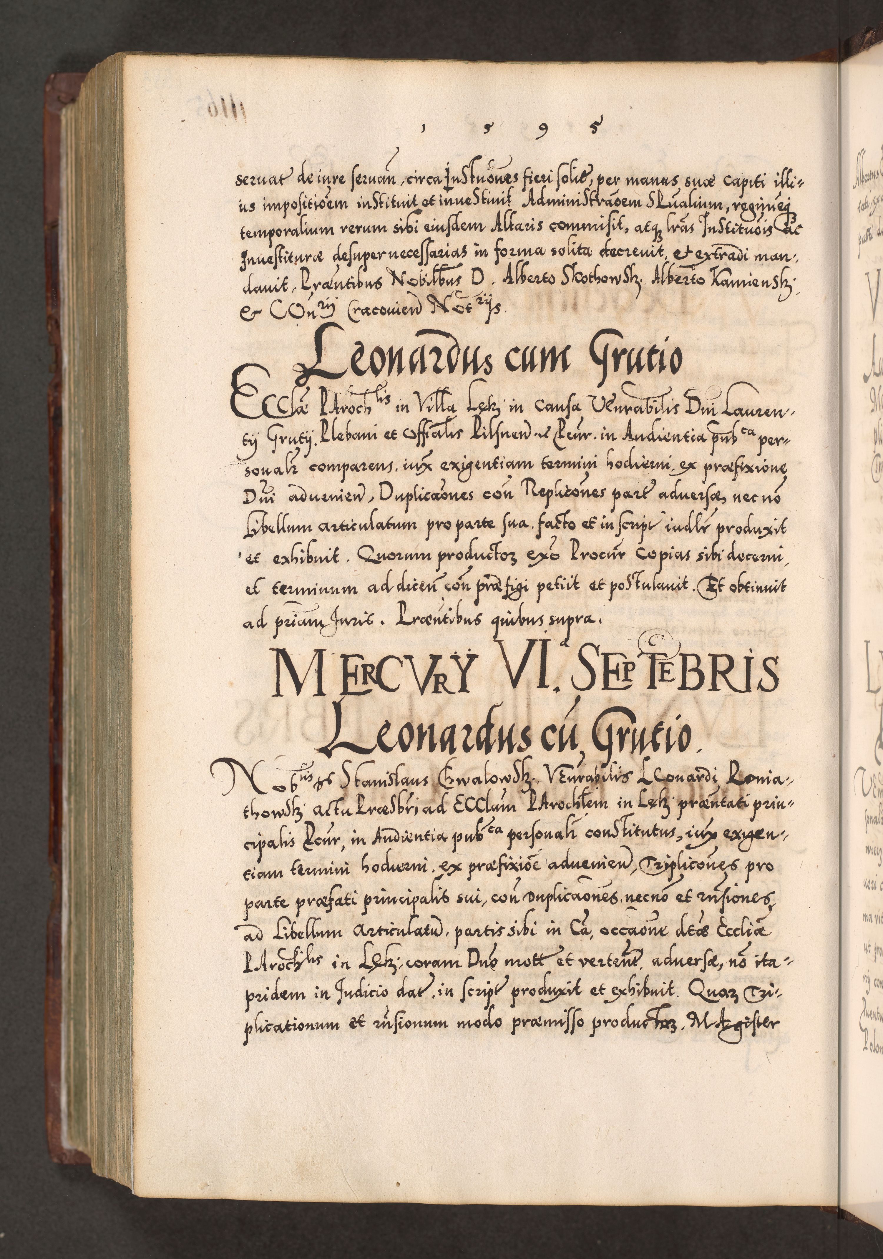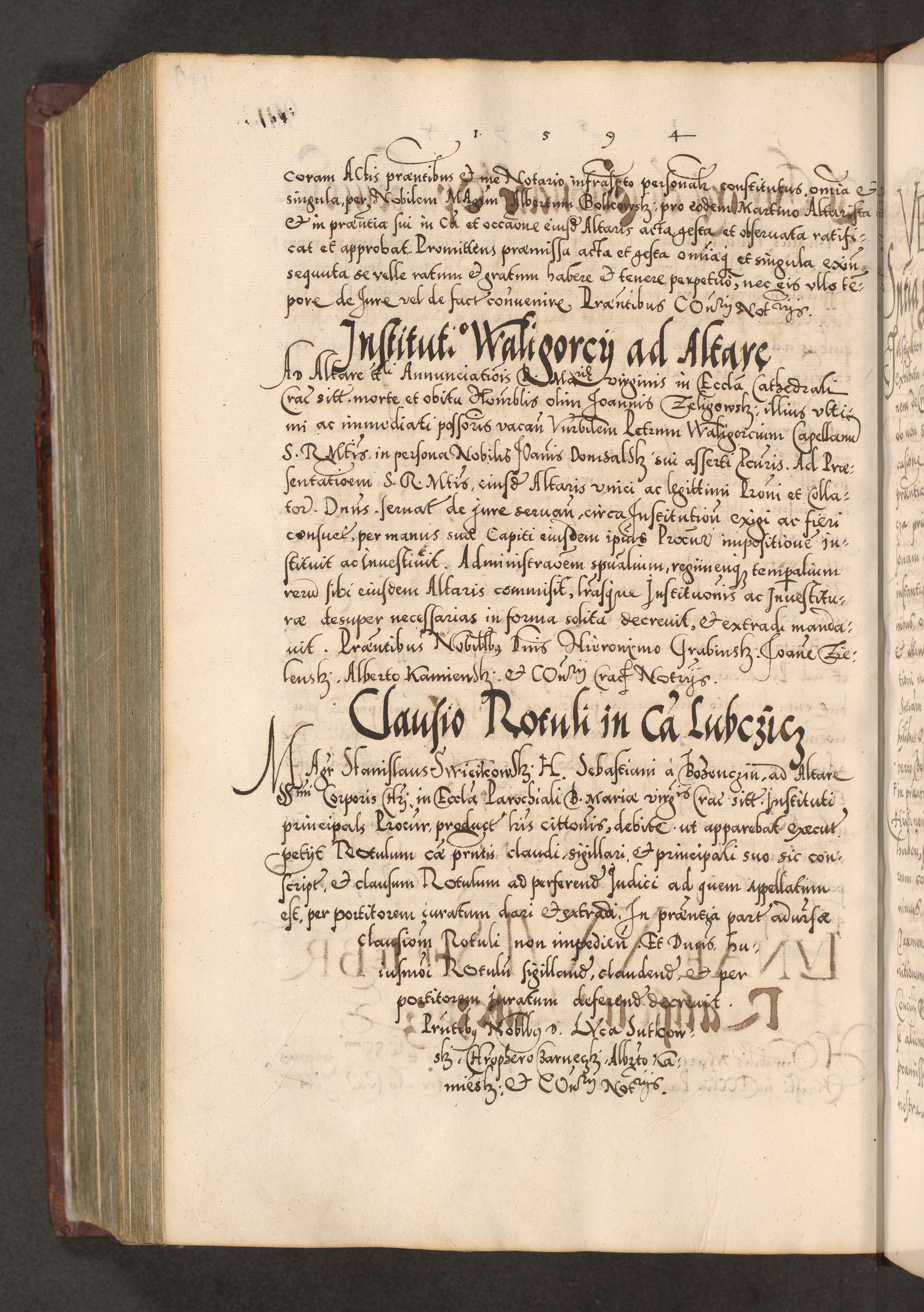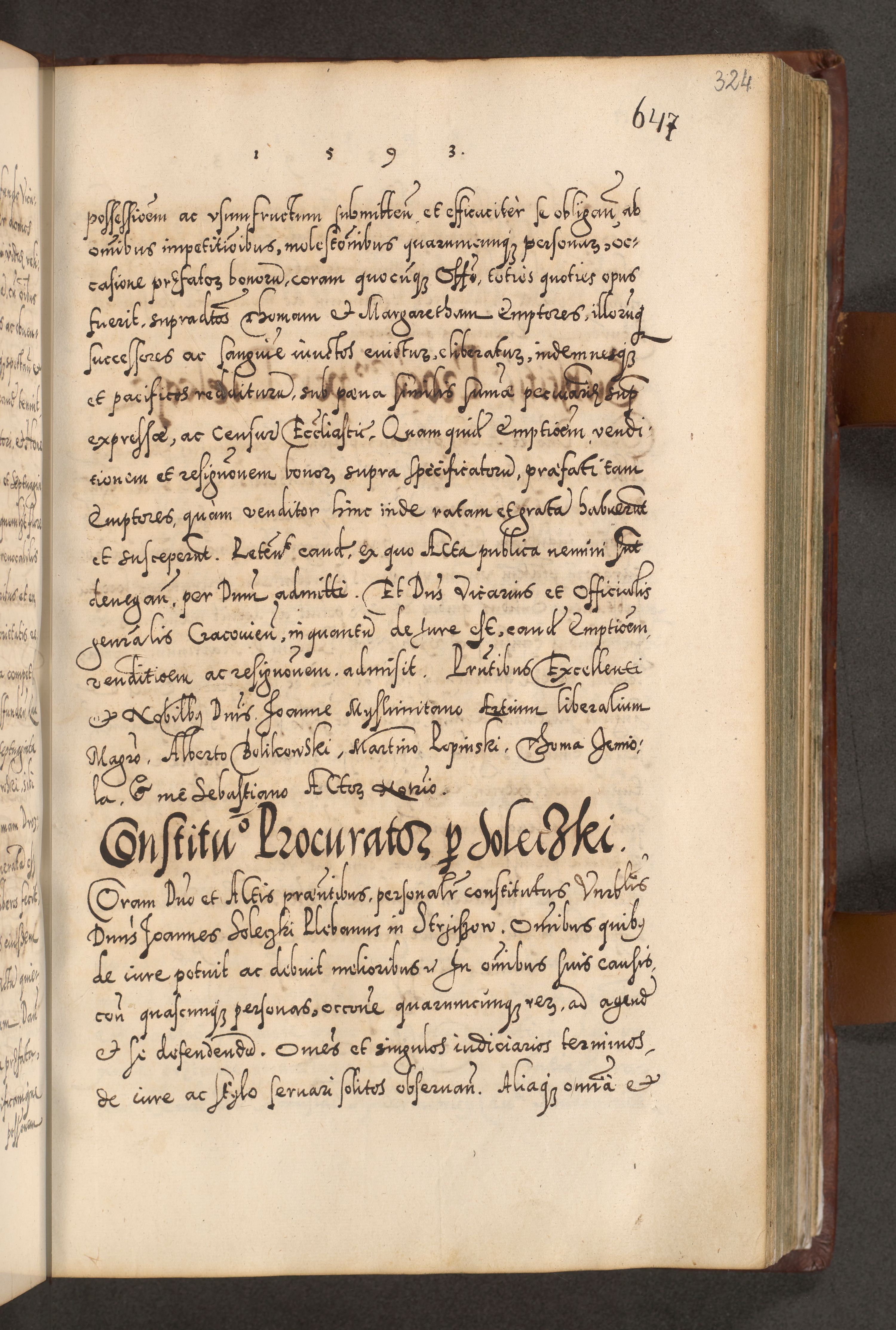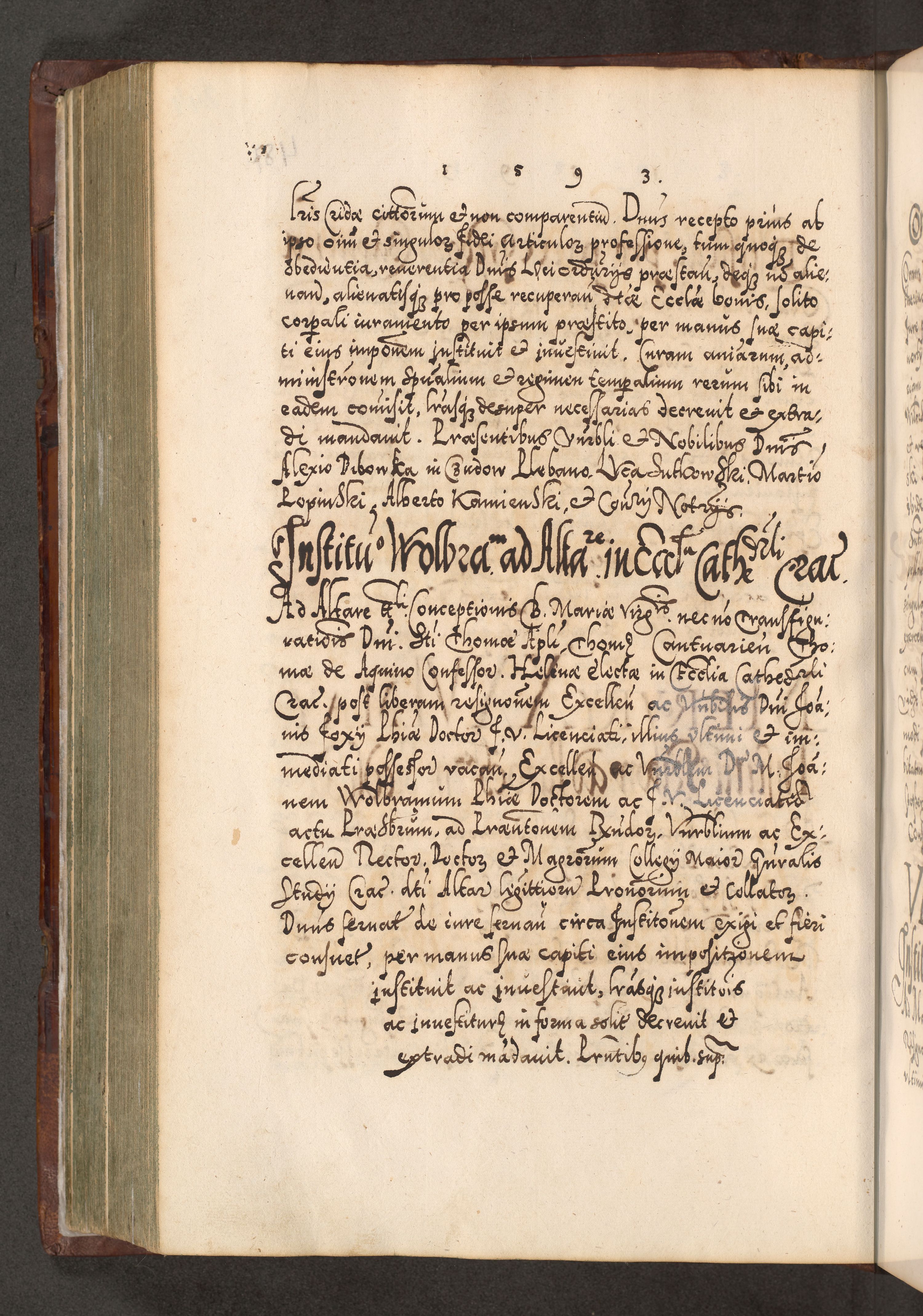 Illistrissimo et revedissimo in Christo Patre Domino Domino Georgio Rzadziwił Miserone Divina Sacrostae R. E. Tituli S. Sixti Presbitero Cardinali Duce in Olyka et Niesswiesz ad Gubernacula Ecclessiae Cracoviensis cuius administratorialem a Sancta Sede Apostolica obtinverat feliciter sedente. Acta actorum, causarum, sententiarum tam deffinitivarum quam interloquutoriarum decretorum, obligationum, quietationum, recognitionum, constitutionum procuratorum etc. coram Reverendo Domino Stanislao Crassinskz de Crasne Archidiacono Cracoviensis, Scholastico Gnesnesis, Custode Plocensis etc. Vicario et Officiali Generali Cracoviensi in Ano Domini Millesimo Quingentesimo Nonagesimo Primo cuius indictio quarta pontificatus SS. Domini Nostri Gregorii XIIII Anno I psius prio feliciter incipiut