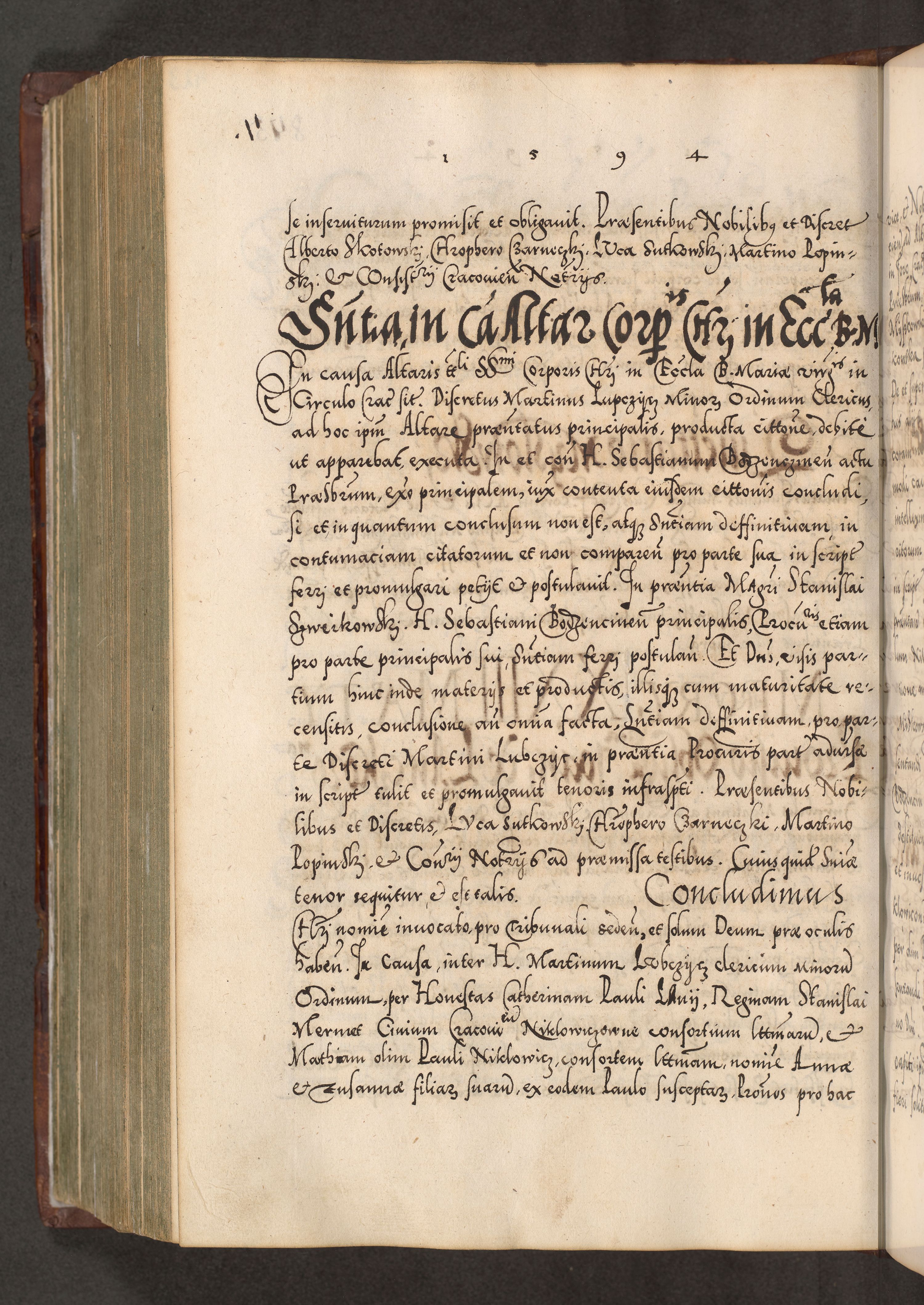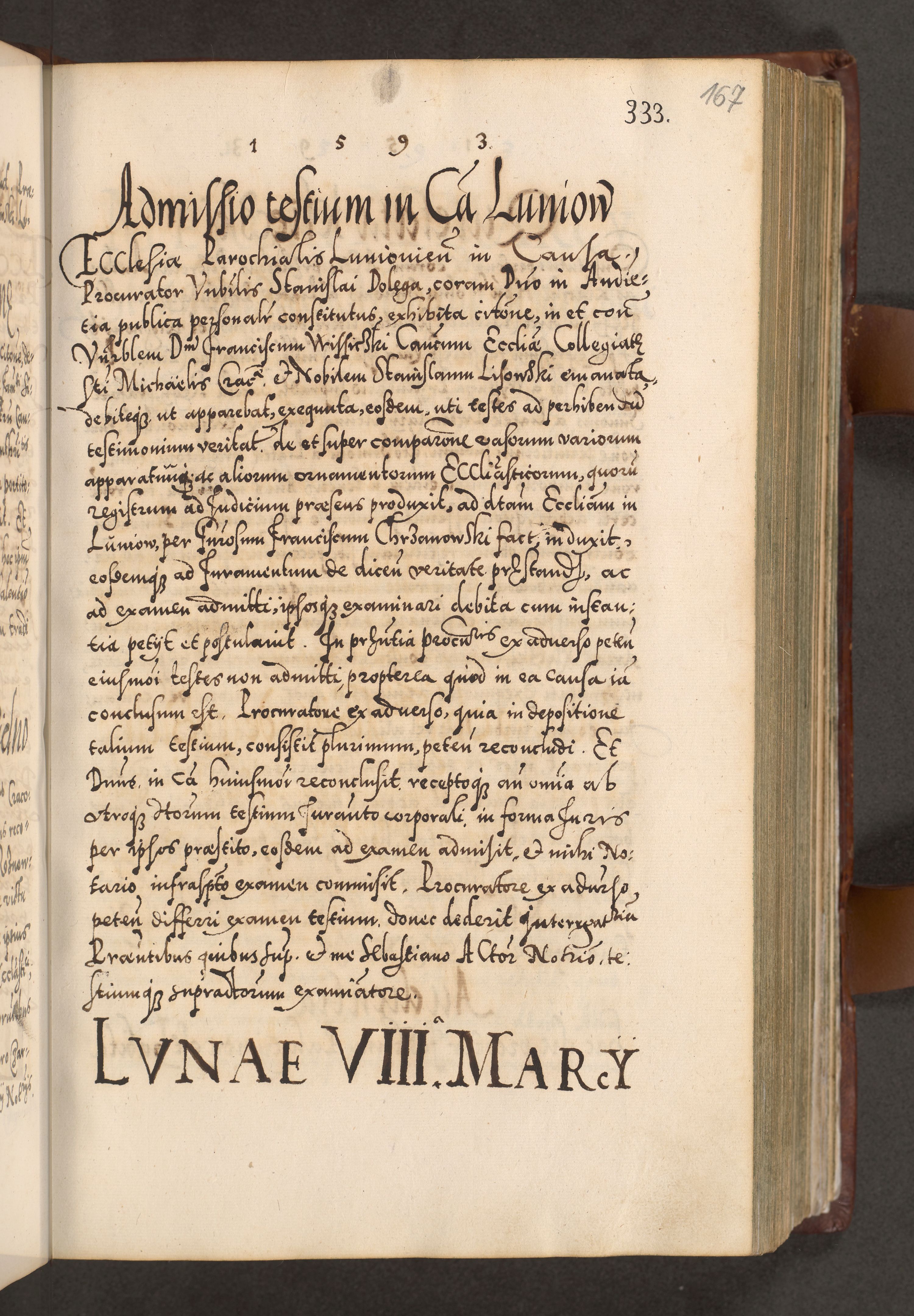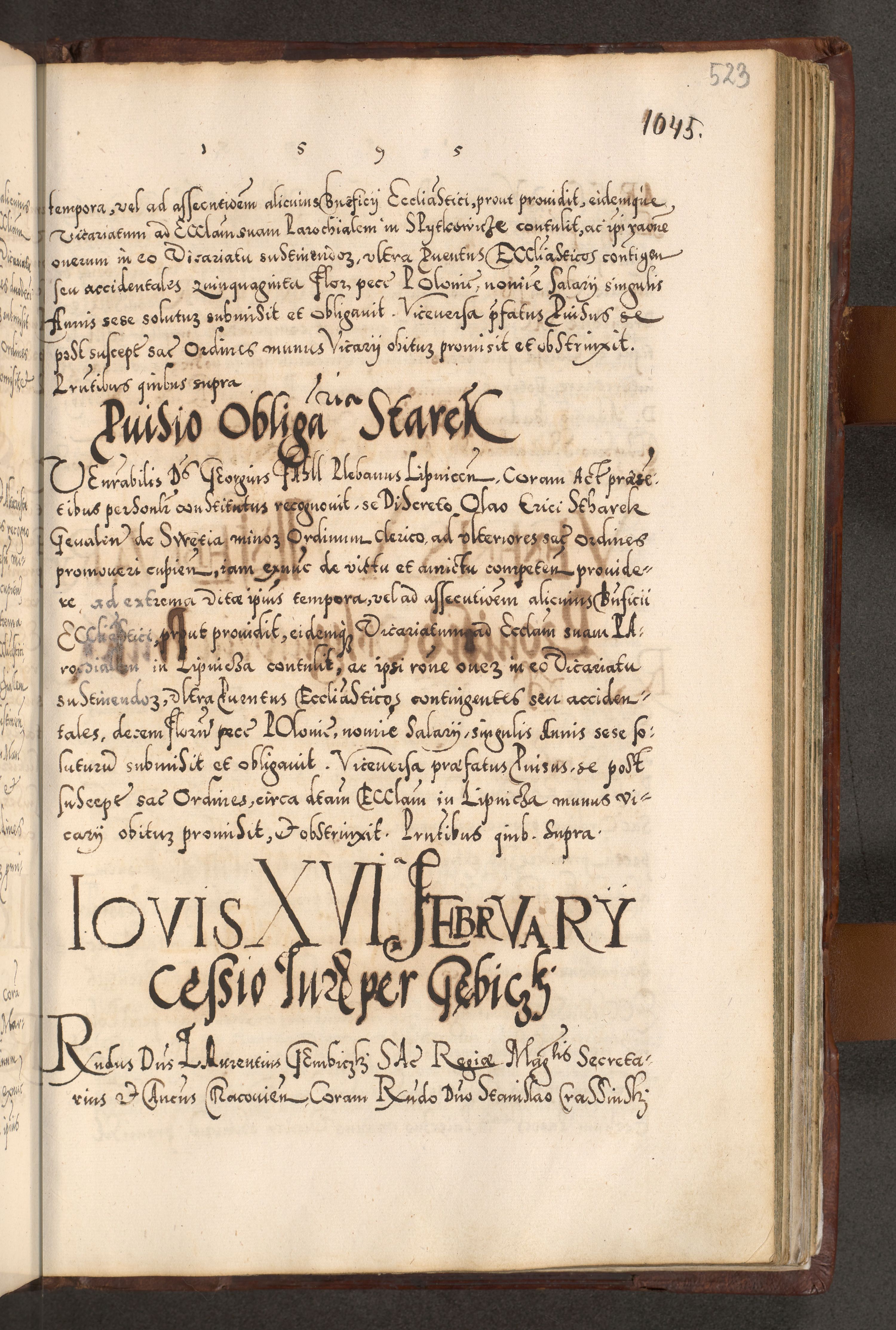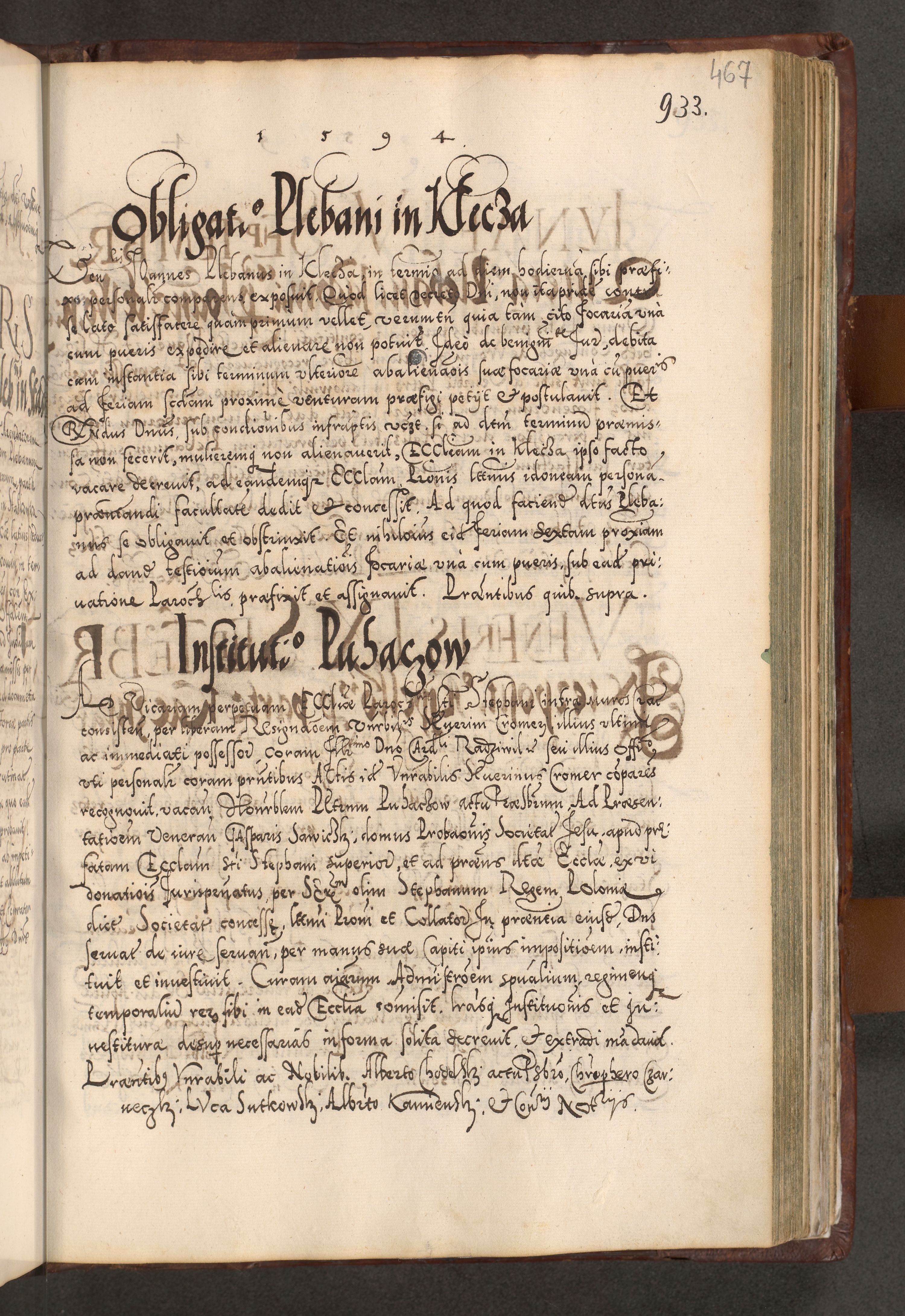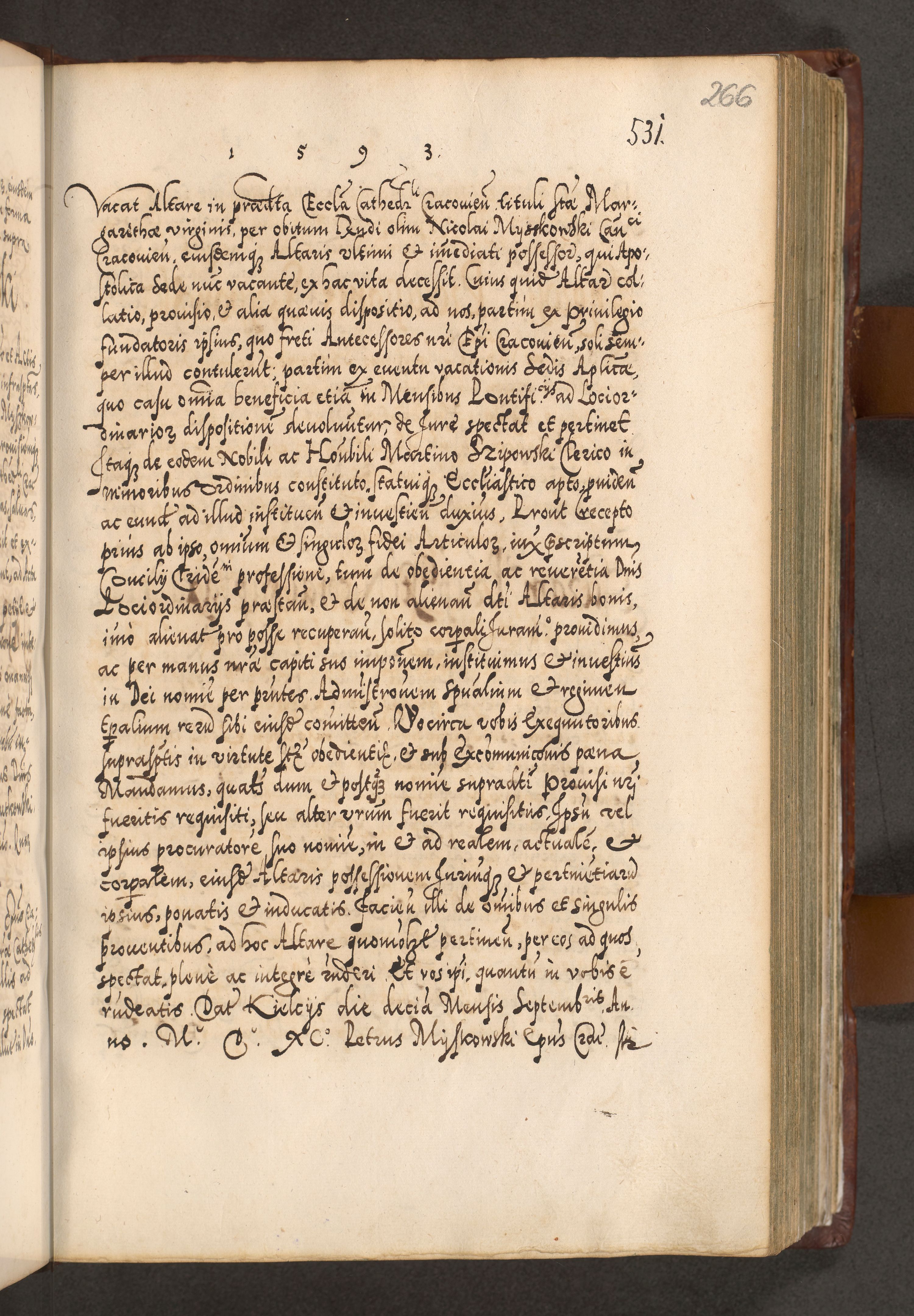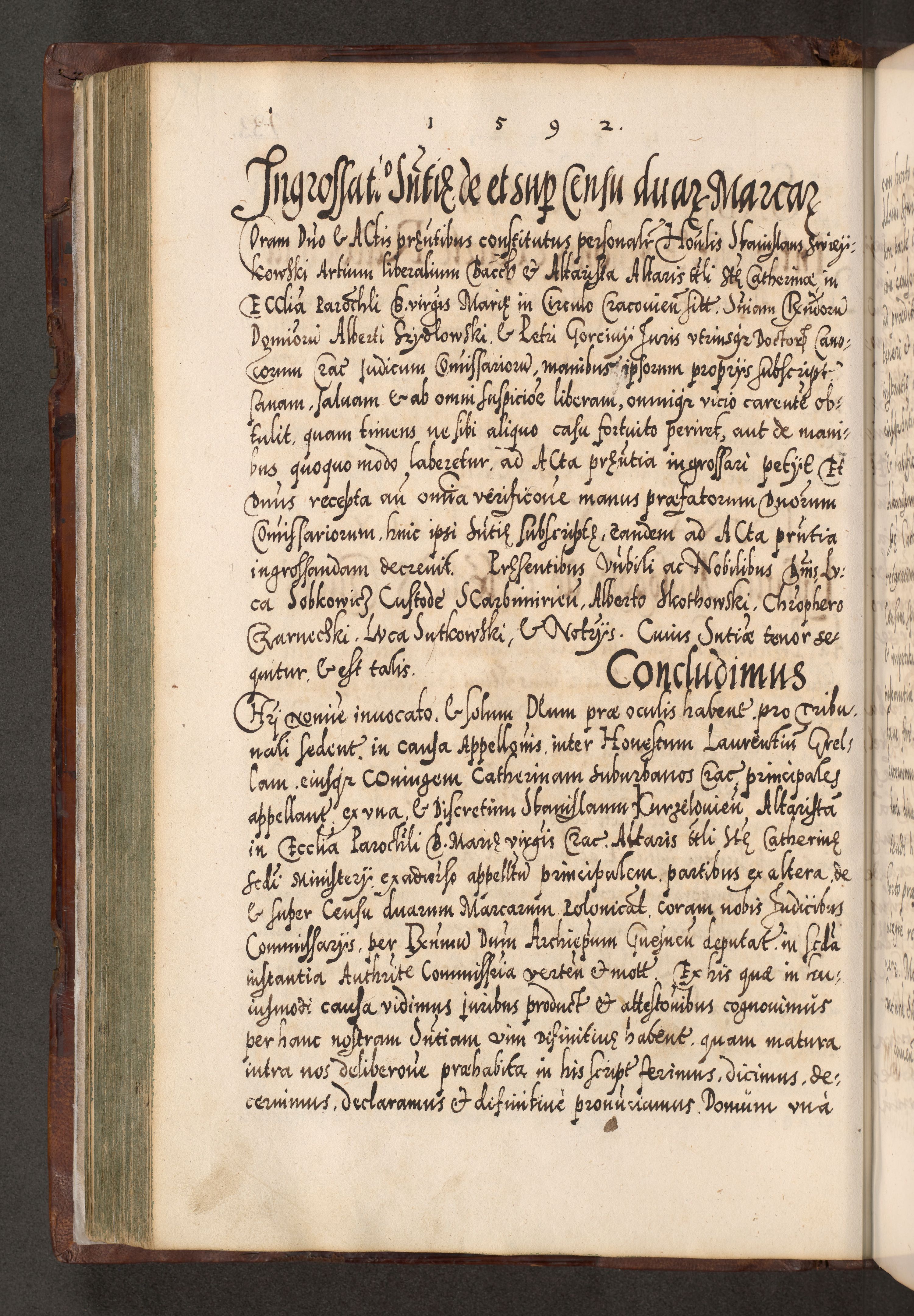 Illistrissimo et revedissimo in Christo Patre Domino Domino Georgio Rzadziwił Miserone Divina Sacrostae R. E. Tituli S. Sixti Presbitero Cardinali Duce in Olyka et Niesswiesz ad Gubernacula Ecclessiae Cracoviensis cuius administratorialem a Sancta Sede Apostolica obtinverat feliciter sedente. Acta actorum, causarum, sententiarum tam deffinitivarum quam interloquutoriarum decretorum, obligationum, quietationum, recognitionum, constitutionum procuratorum etc. coram Reverendo Domino Stanislao Crassinskz de Crasne Archidiacono Cracoviensis, Scholastico Gnesnesis, Custode Plocensis etc. Vicario et Officiali Generali Cracoviensi in Ano Domini Millesimo Quingentesimo Nonagesimo Primo cuius indictio quarta pontificatus SS. Domini Nostri Gregorii XIIII Anno I psius prio feliciter incipiut