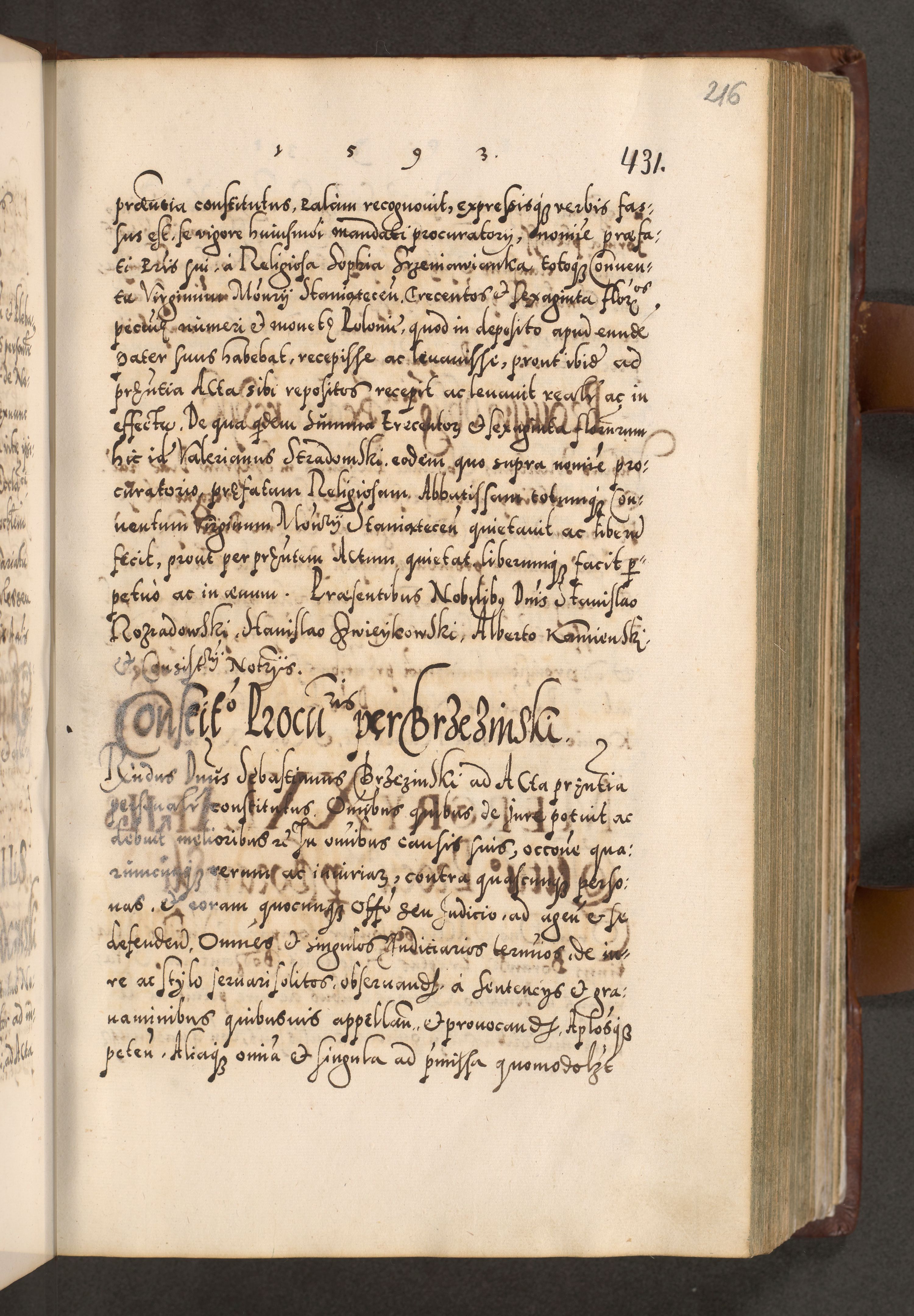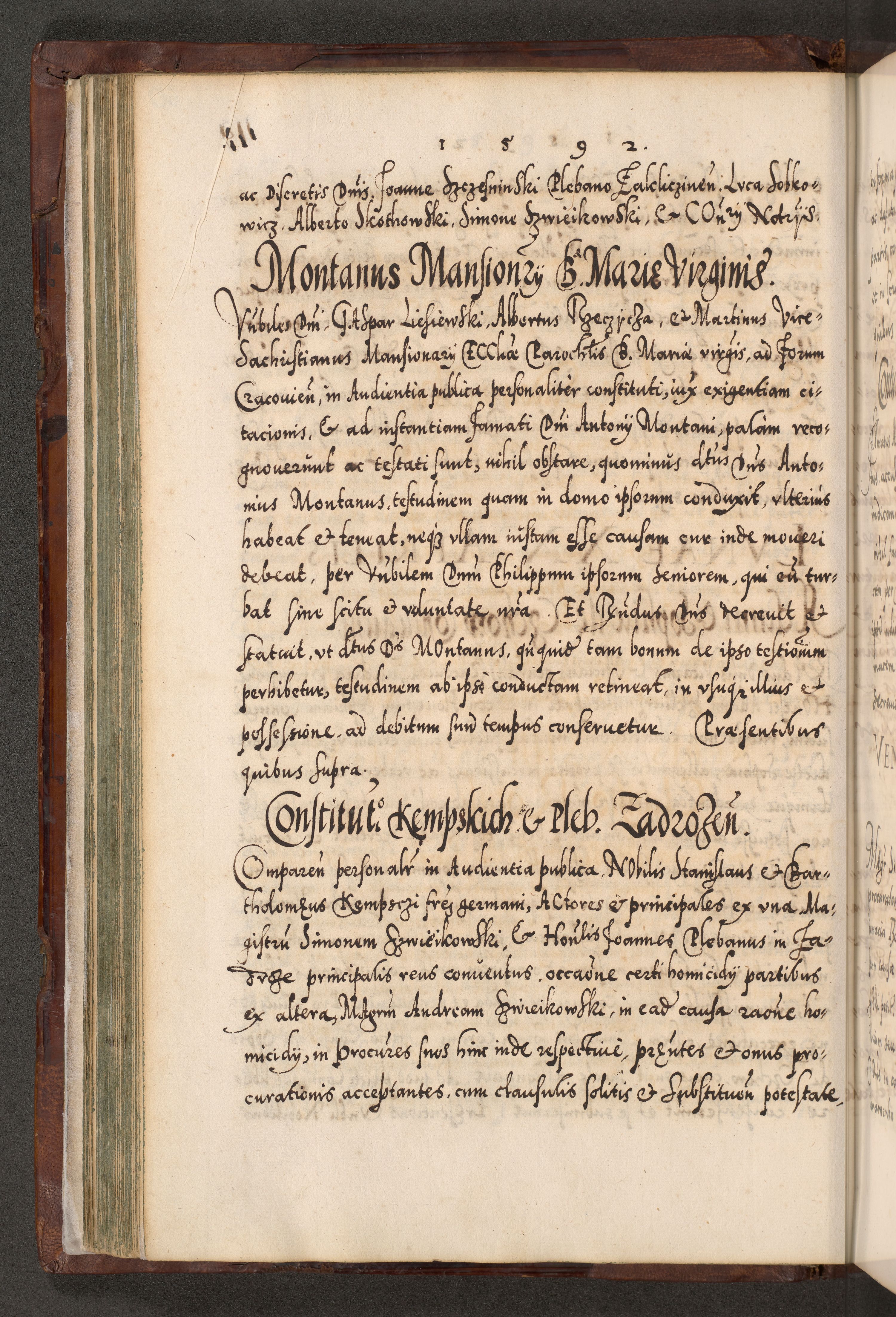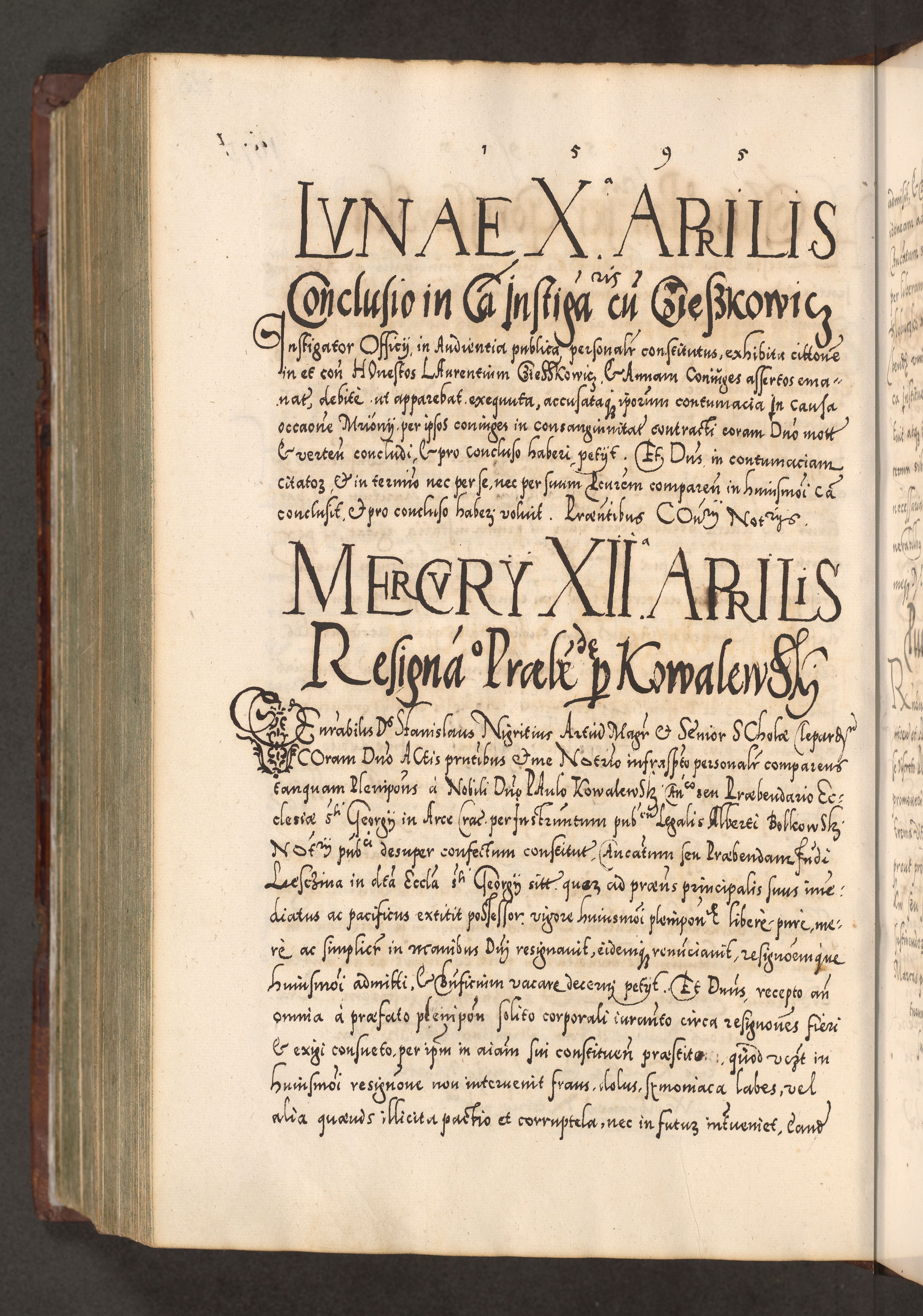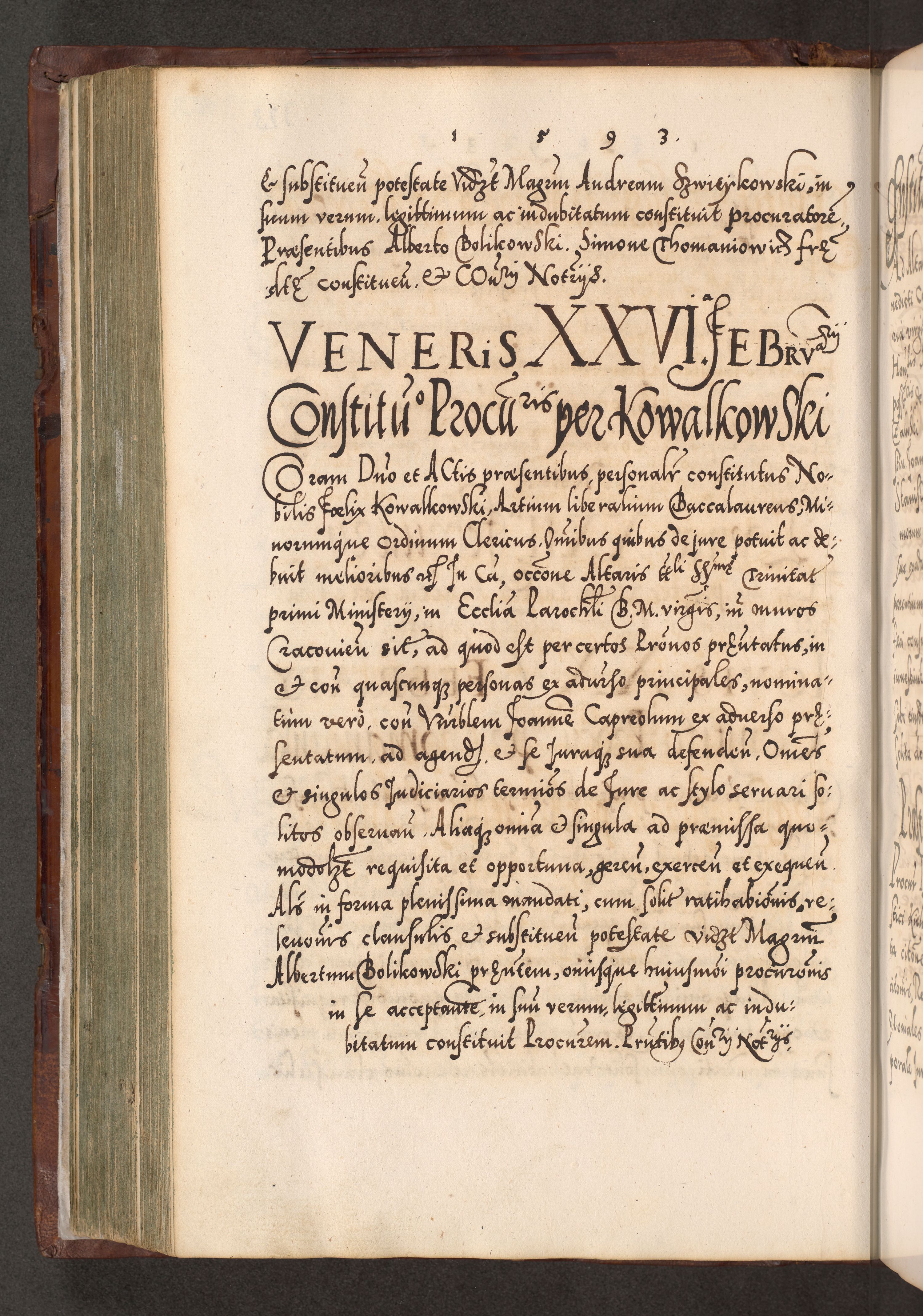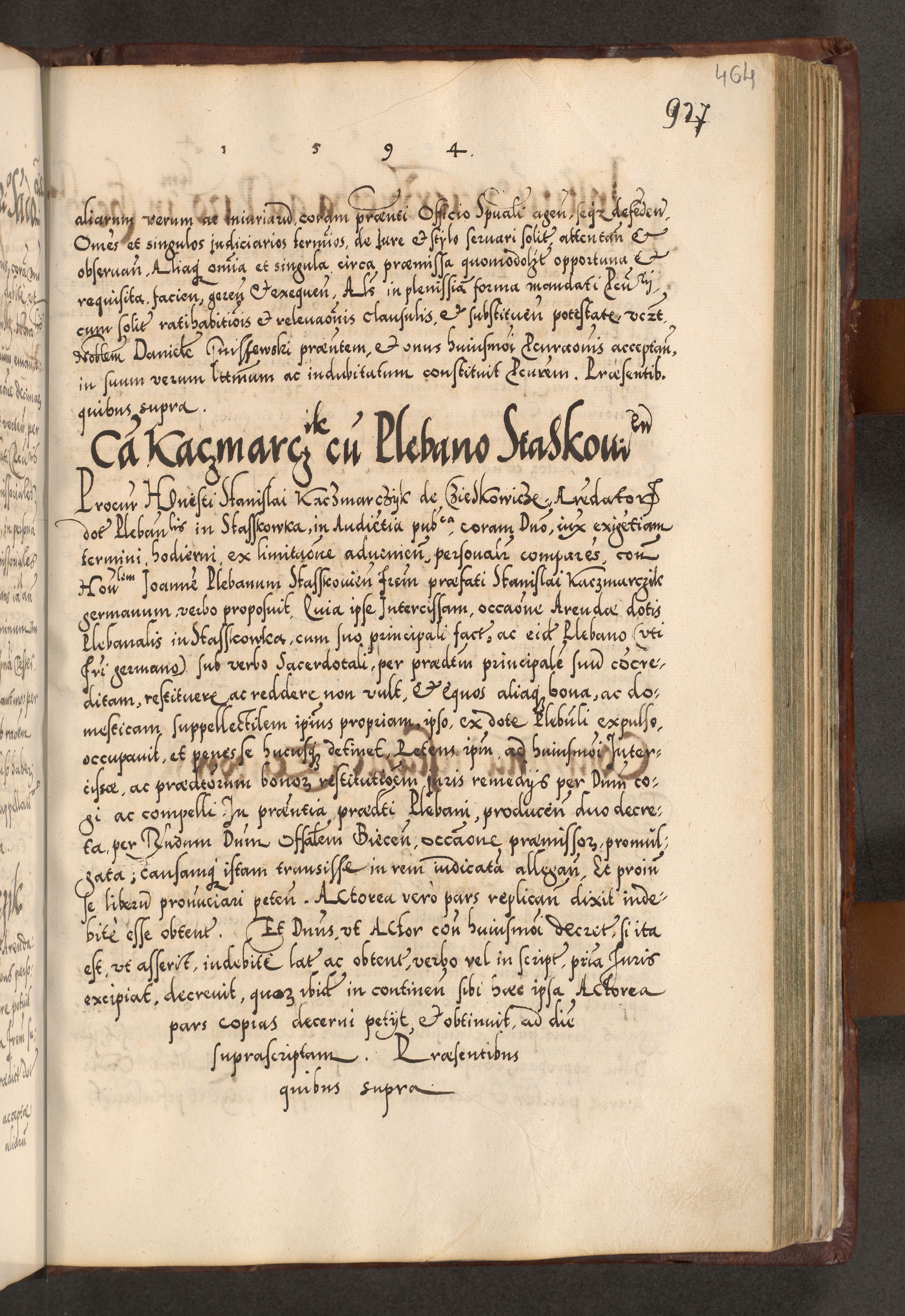 Illistrissimo et revedissimo in Christo Patre Domino Domino Georgio Rzadziwił Miserone Divina Sacrostae R. E. Tituli S. Sixti Presbitero Cardinali Duce in Olyka et Niesswiesz ad Gubernacula Ecclessiae Cracoviensis cuius administratorialem a Sancta Sede Apostolica obtinverat feliciter sedente. Acta actorum, causarum, sententiarum tam deffinitivarum quam interloquutoriarum decretorum, obligationum, quietationum, recognitionum, constitutionum procuratorum etc. coram Reverendo Domino Stanislao Crassinskz de Crasne Archidiacono Cracoviensis, Scholastico Gnesnesis, Custode Plocensis etc. Vicario et Officiali Generali Cracoviensi in Ano Domini Millesimo Quingentesimo Nonagesimo Primo cuius indictio quarta pontificatus SS. Domini Nostri Gregorii XIIII Anno I psius prio feliciter incipiut
