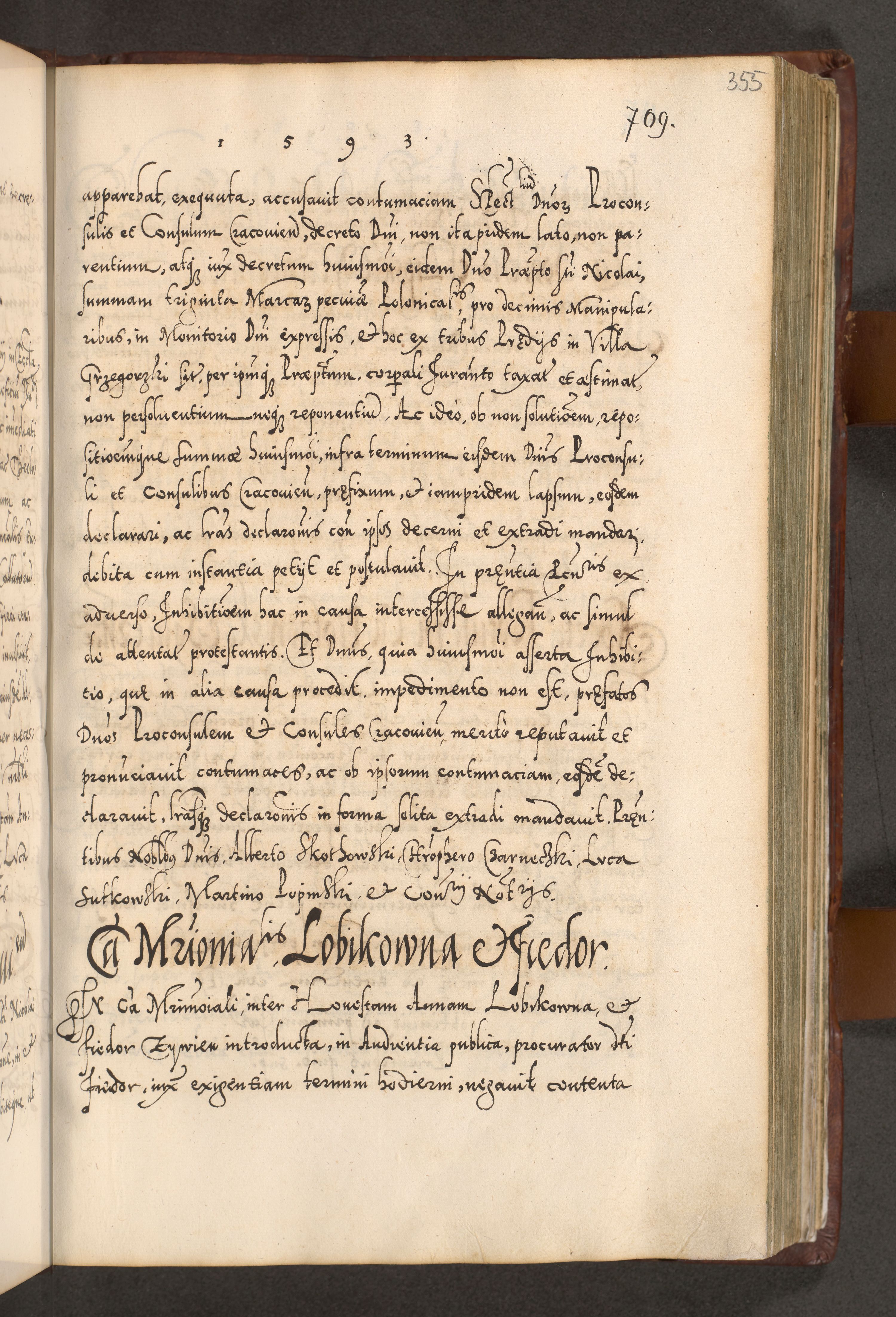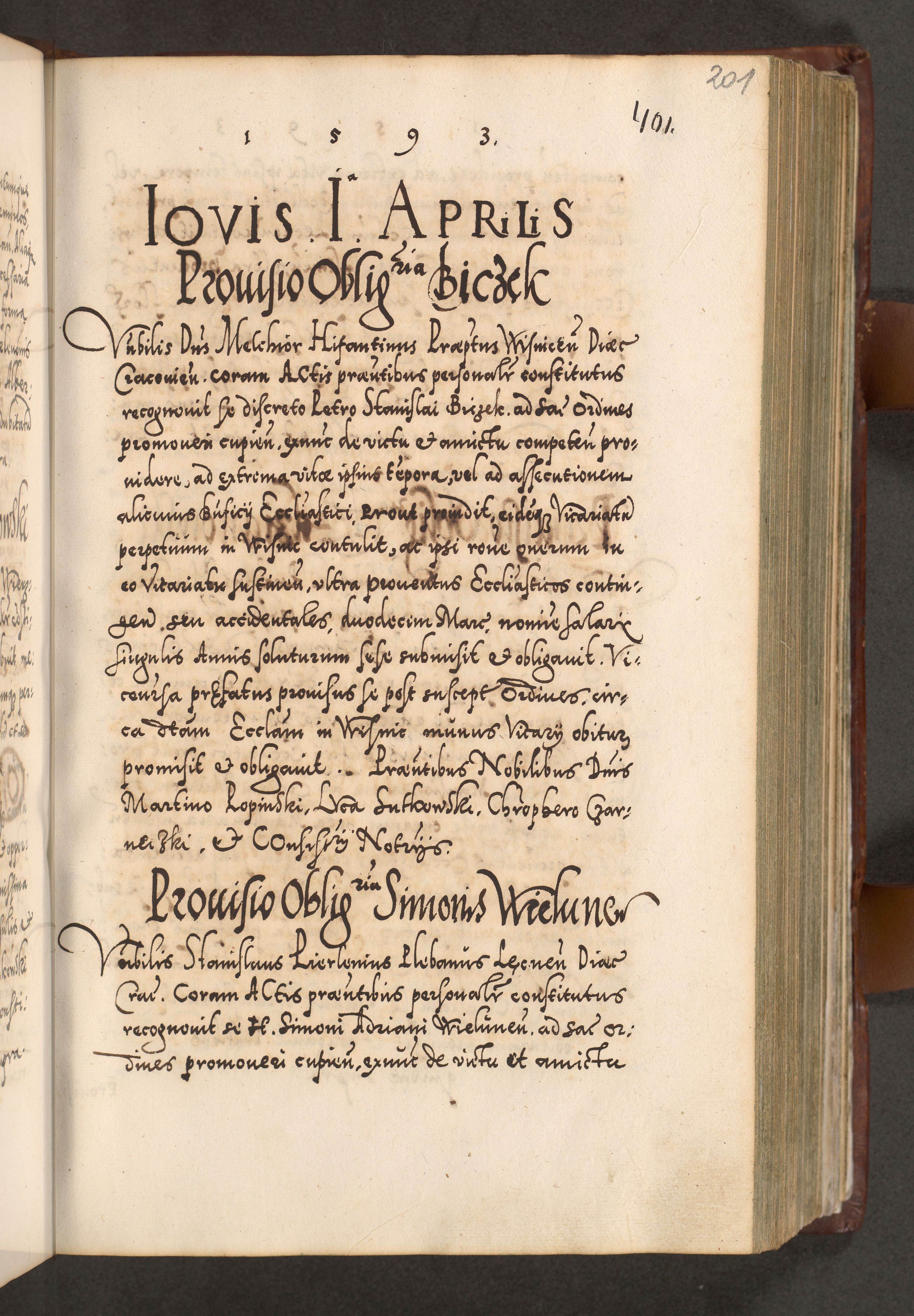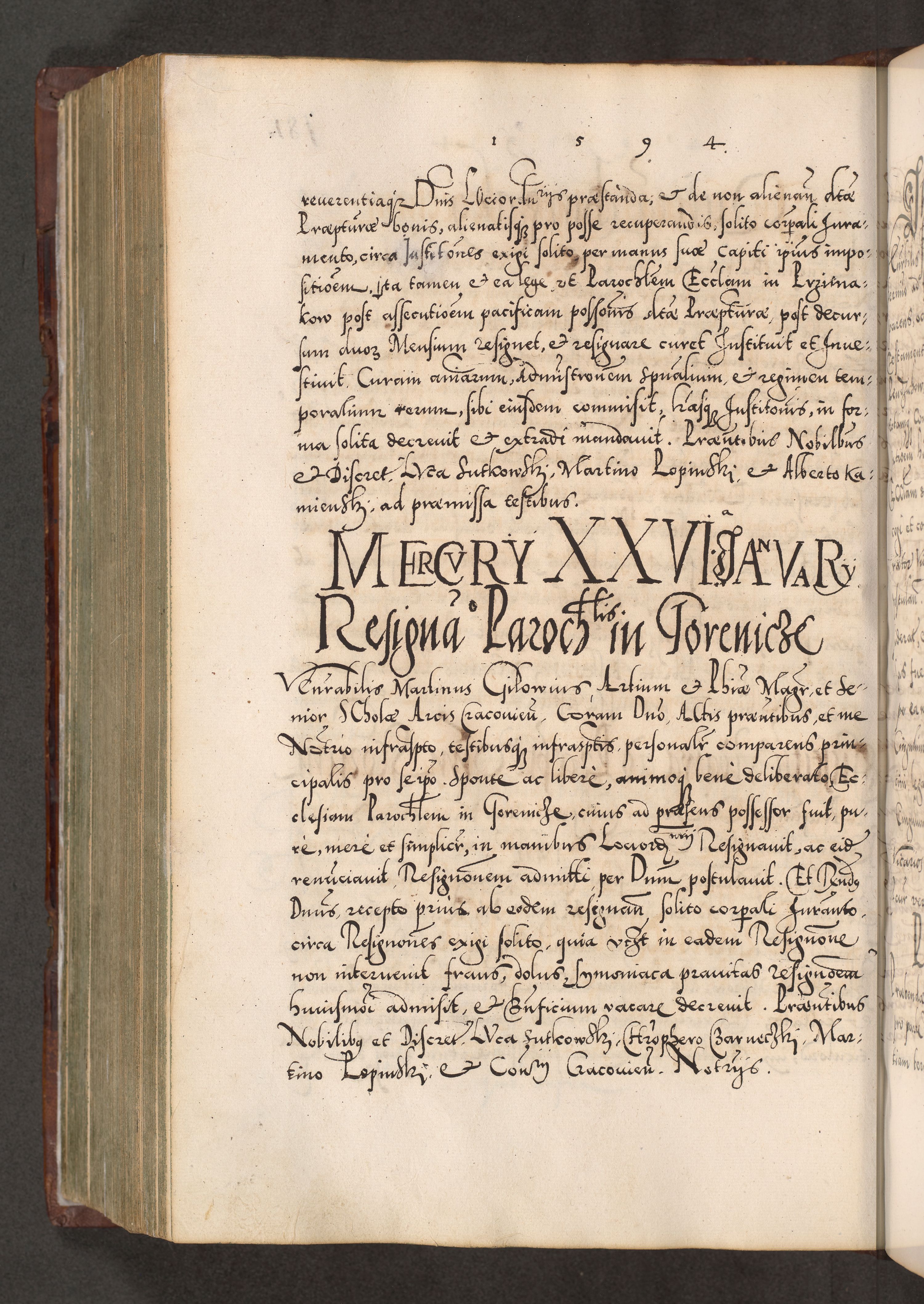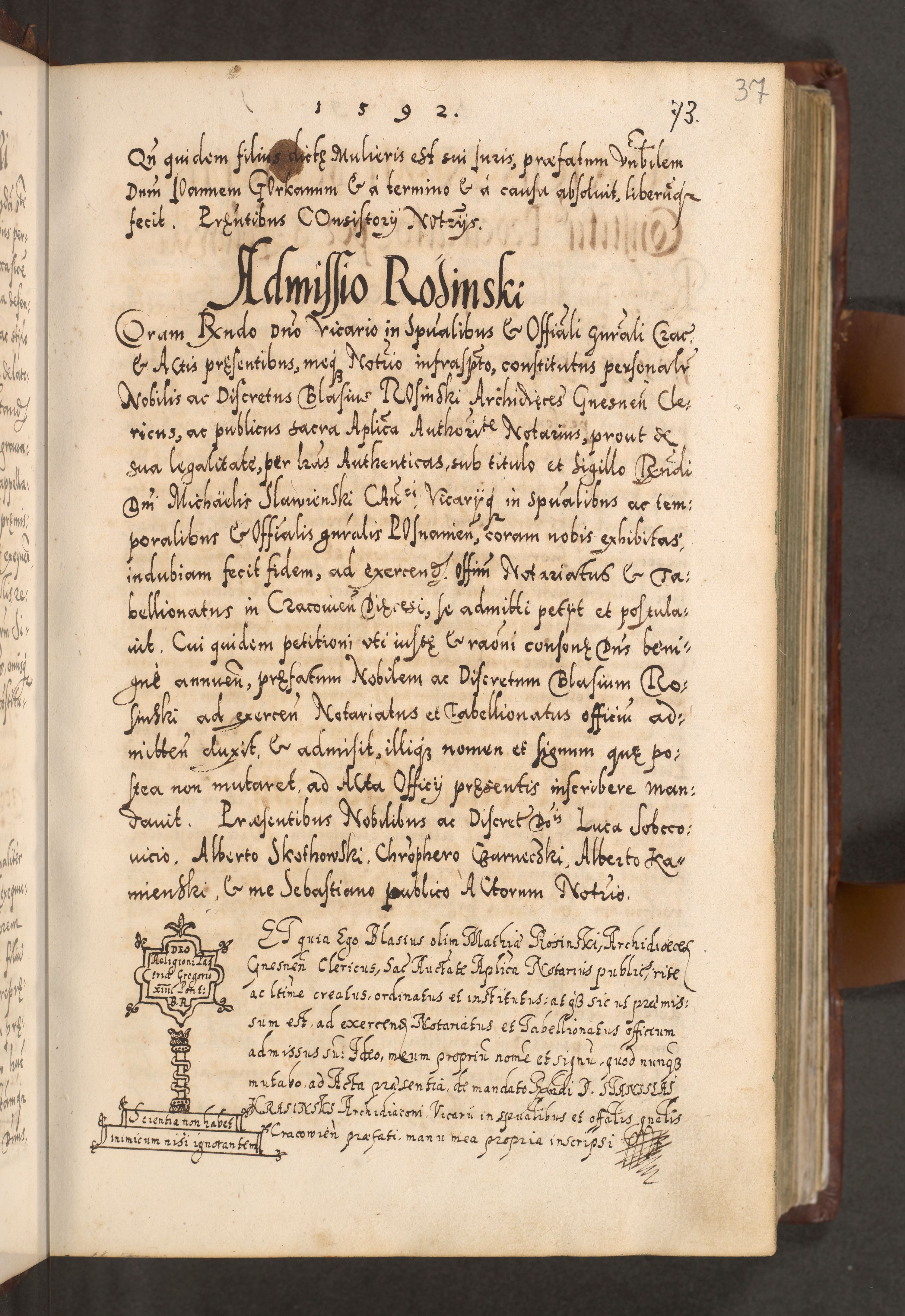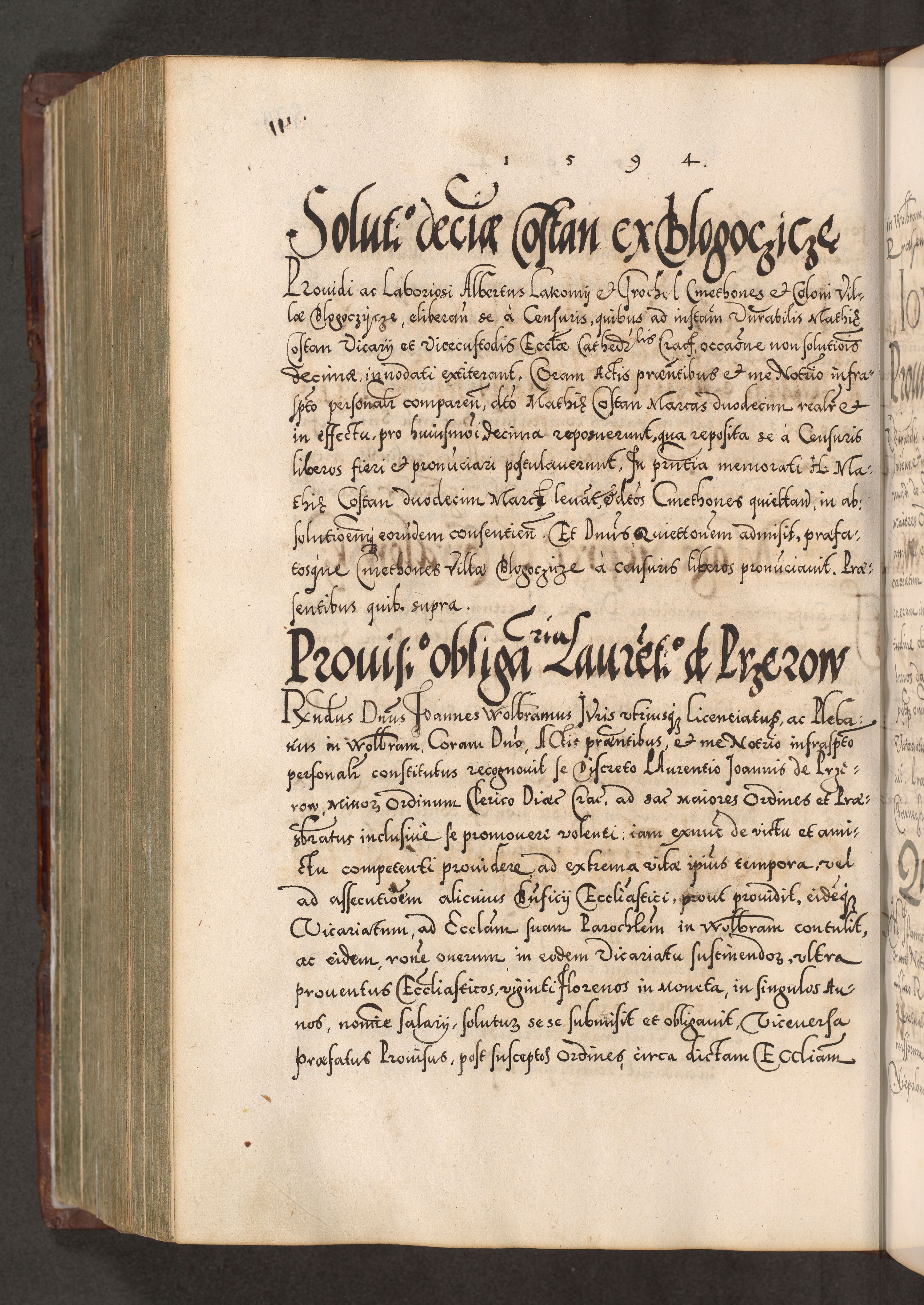 Illistrissimo et revedissimo in Christo Patre Domino Domino Georgio Rzadziwił Miserone Divina Sacrostae R. E. Tituli S. Sixti Presbitero Cardinali Duce in Olyka et Niesswiesz ad Gubernacula Ecclessiae Cracoviensis cuius administratorialem a Sancta Sede Apostolica obtinverat feliciter sedente. Acta actorum, causarum, sententiarum tam deffinitivarum quam interloquutoriarum decretorum, obligationum, quietationum, recognitionum, constitutionum procuratorum etc. coram Reverendo Domino Stanislao Crassinskz de Crasne Archidiacono Cracoviensis, Scholastico Gnesnesis, Custode Plocensis etc. Vicario et Officiali Generali Cracoviensi in Ano Domini Millesimo Quingentesimo Nonagesimo Primo cuius indictio quarta pontificatus SS. Domini Nostri Gregorii XIIII Anno I psius prio feliciter incipiut