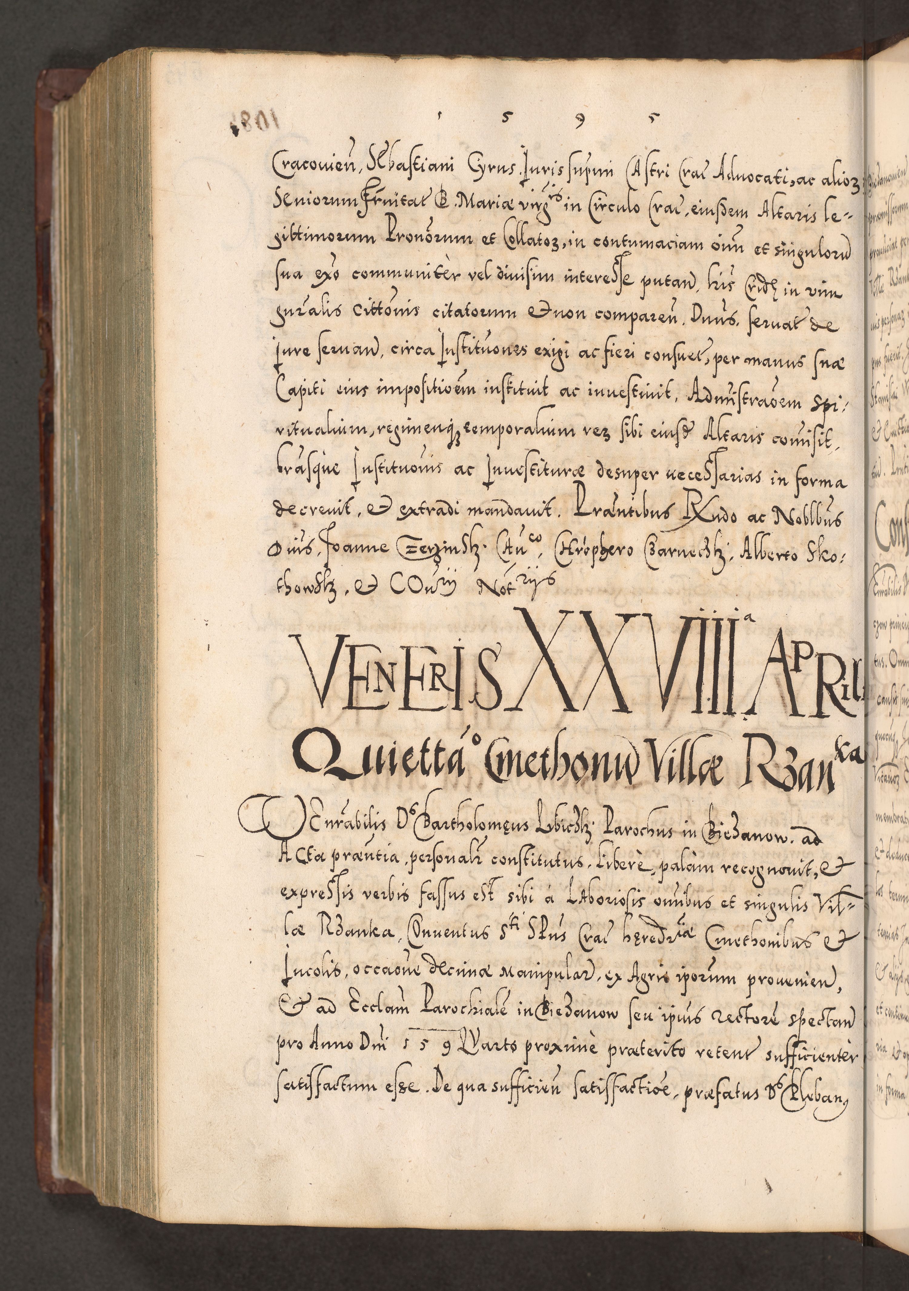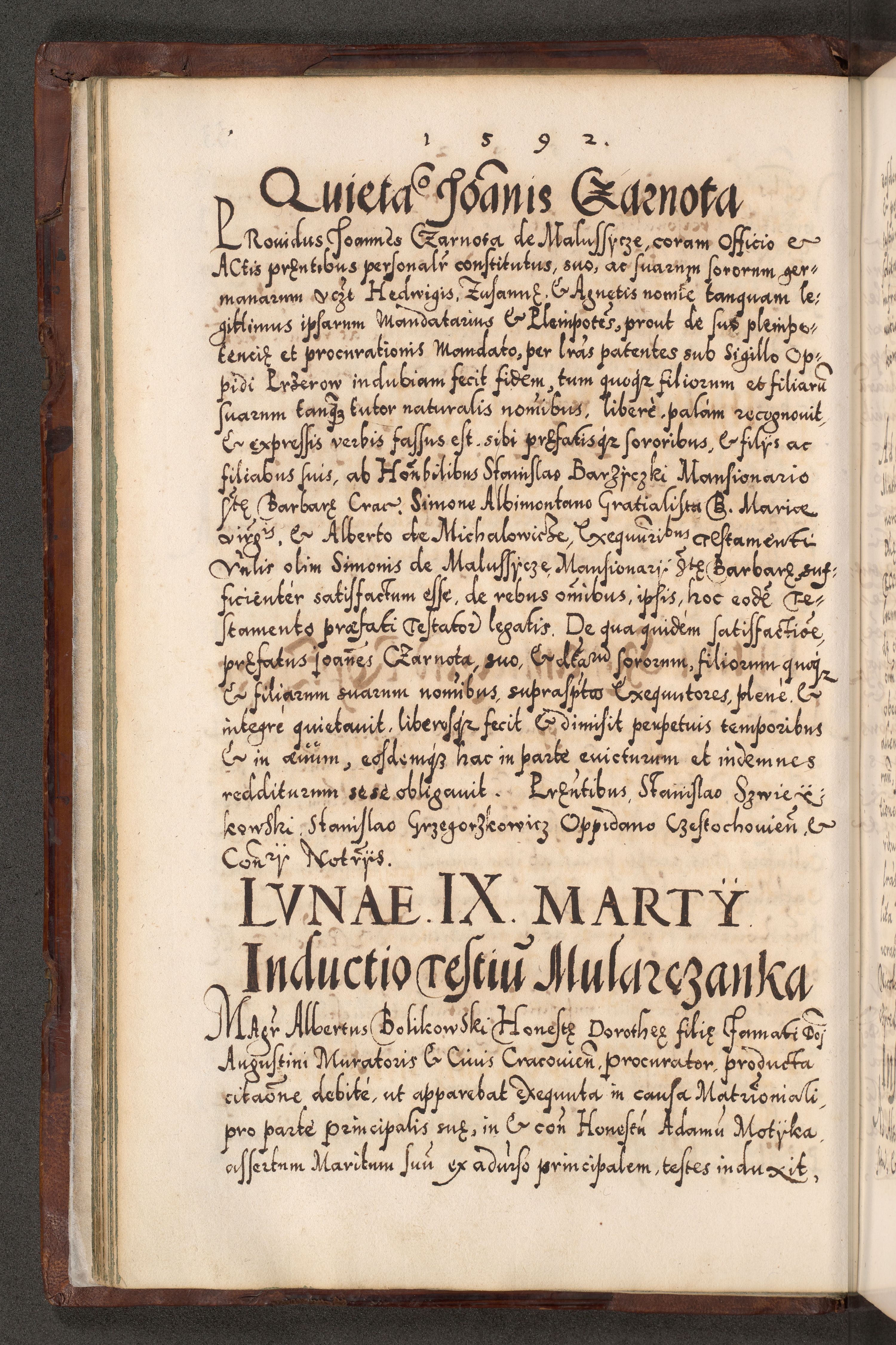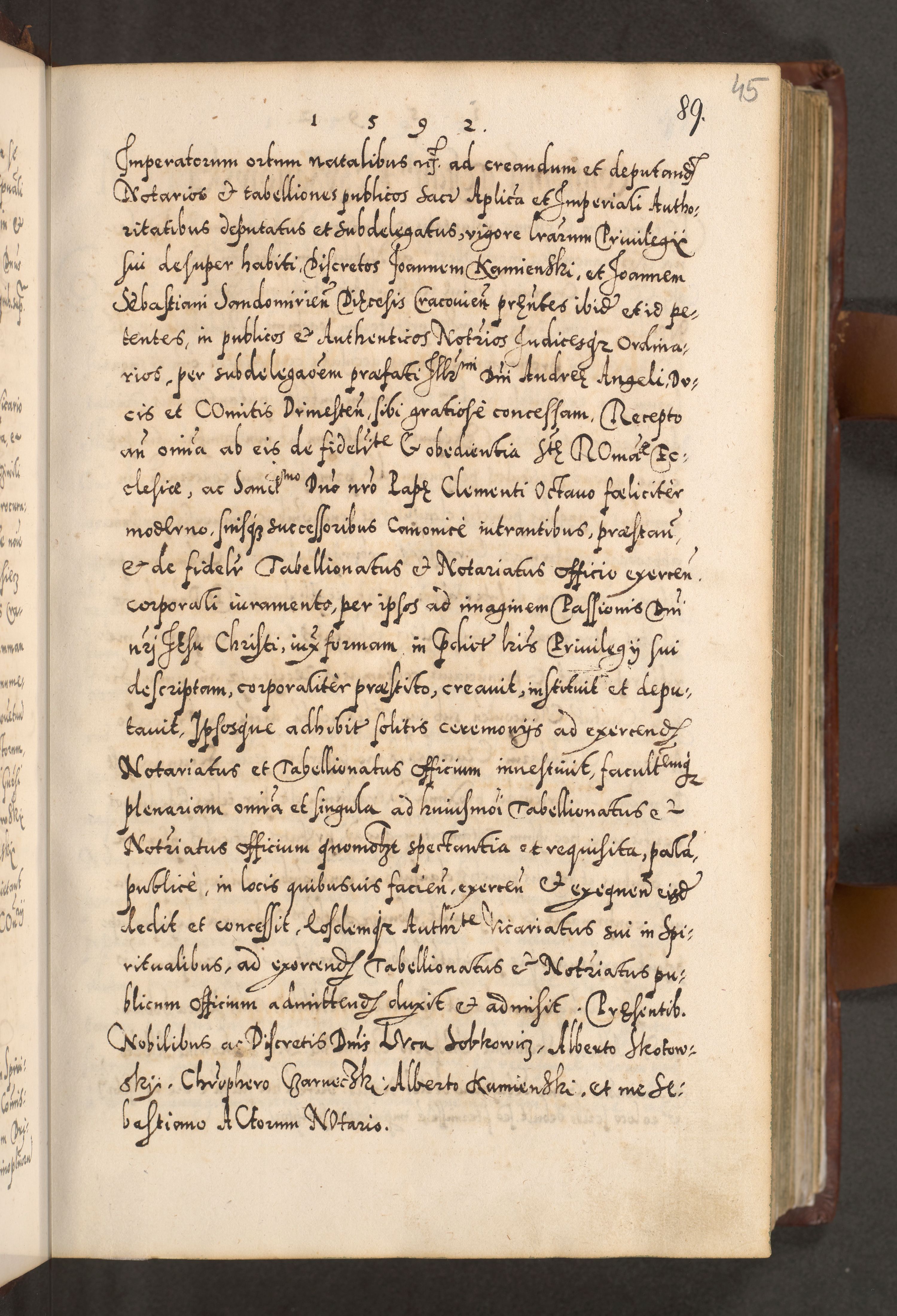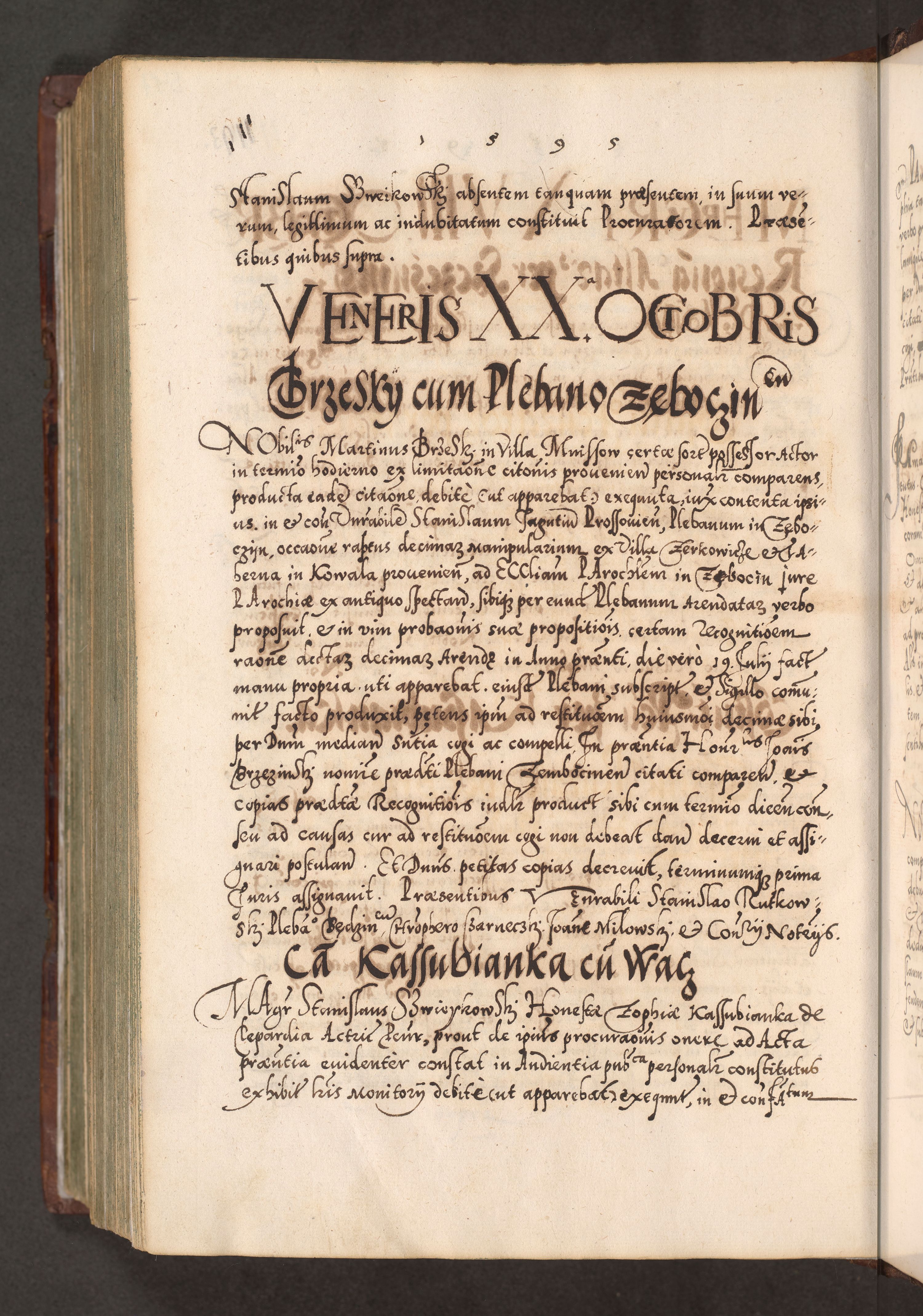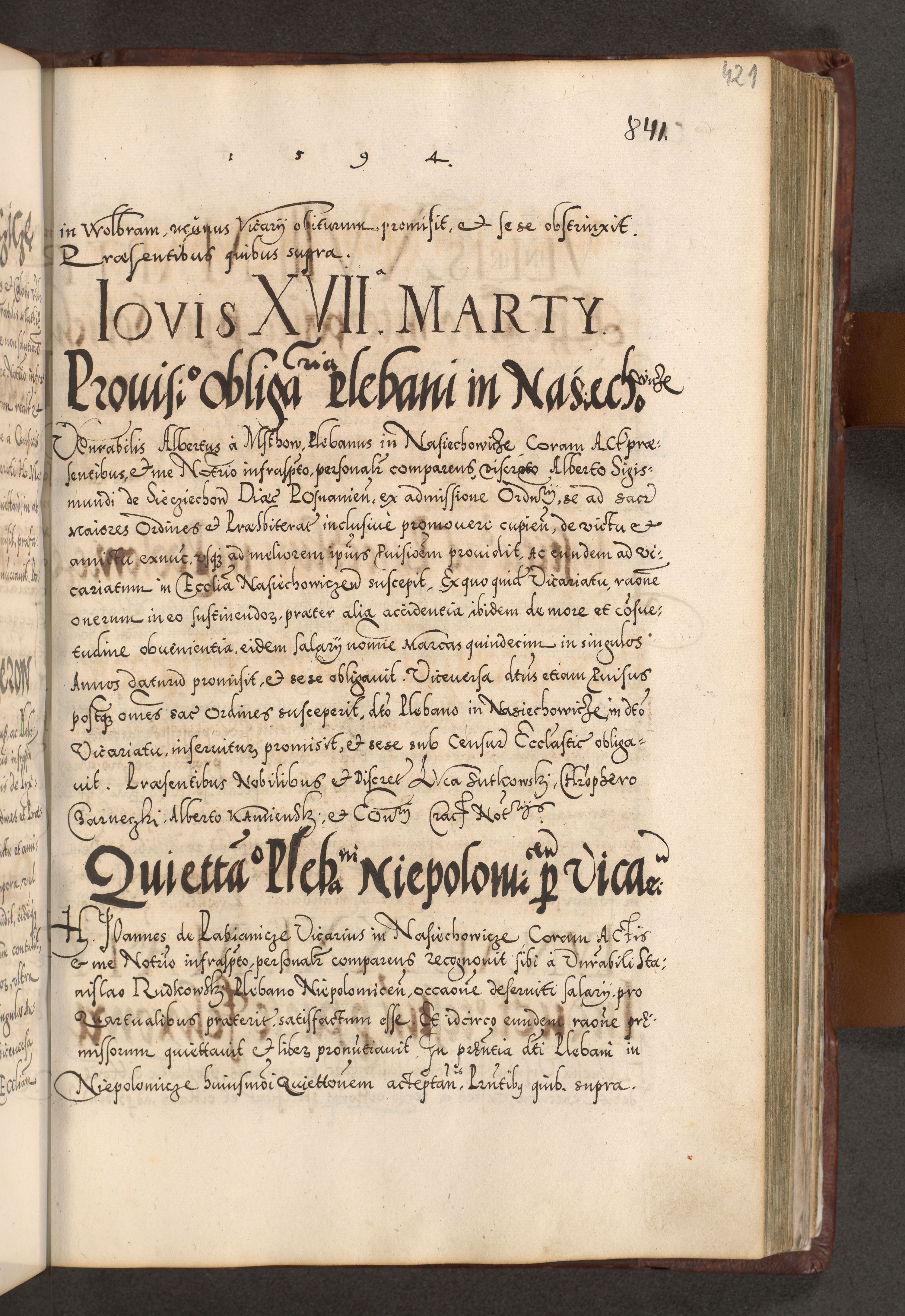 Illistrissimo et revedissimo in Christo Patre Domino Domino Georgio Rzadziwił Miserone Divina Sacrostae R. E. Tituli S. Sixti Presbitero Cardinali Duce in Olyka et Niesswiesz ad Gubernacula Ecclessiae Cracoviensis cuius administratorialem a Sancta Sede Apostolica obtinverat feliciter sedente. Acta actorum, causarum, sententiarum tam deffinitivarum quam interloquutoriarum decretorum, obligationum, quietationum, recognitionum, constitutionum procuratorum etc. coram Reverendo Domino Stanislao Crassinskz de Crasne Archidiacono Cracoviensis, Scholastico Gnesnesis, Custode Plocensis etc. Vicario et Officiali Generali Cracoviensi in Ano Domini Millesimo Quingentesimo Nonagesimo Primo cuius indictio quarta pontificatus SS. Domini Nostri Gregorii XIIII Anno I psius prio feliciter incipiut